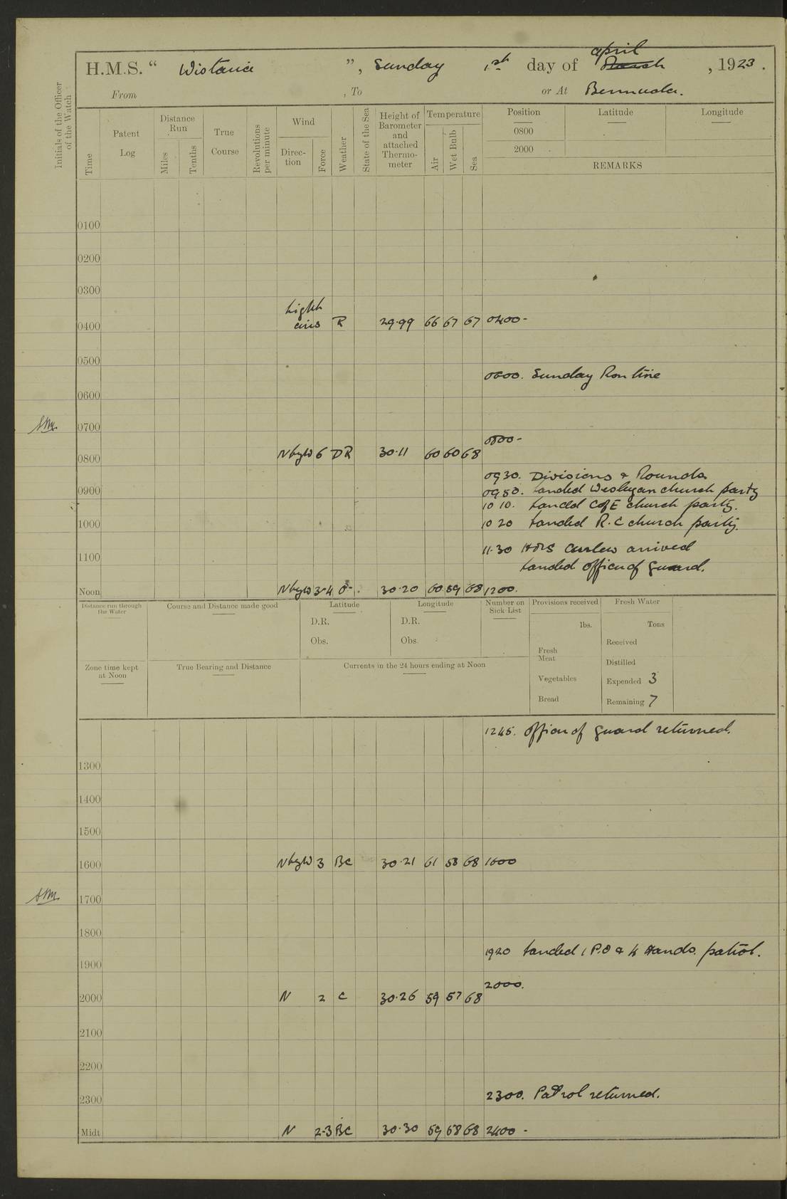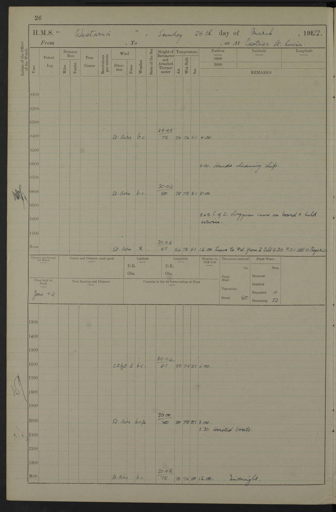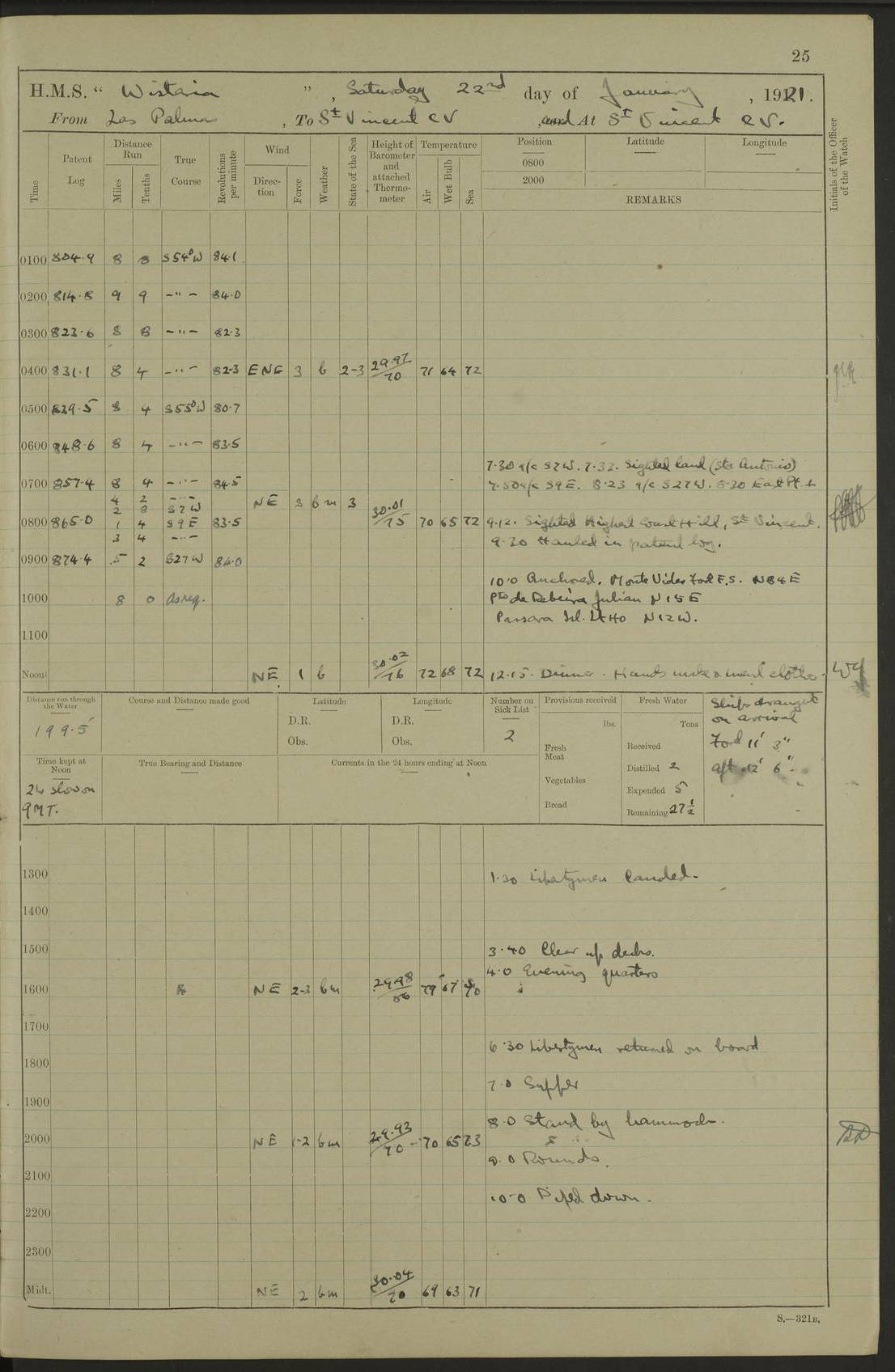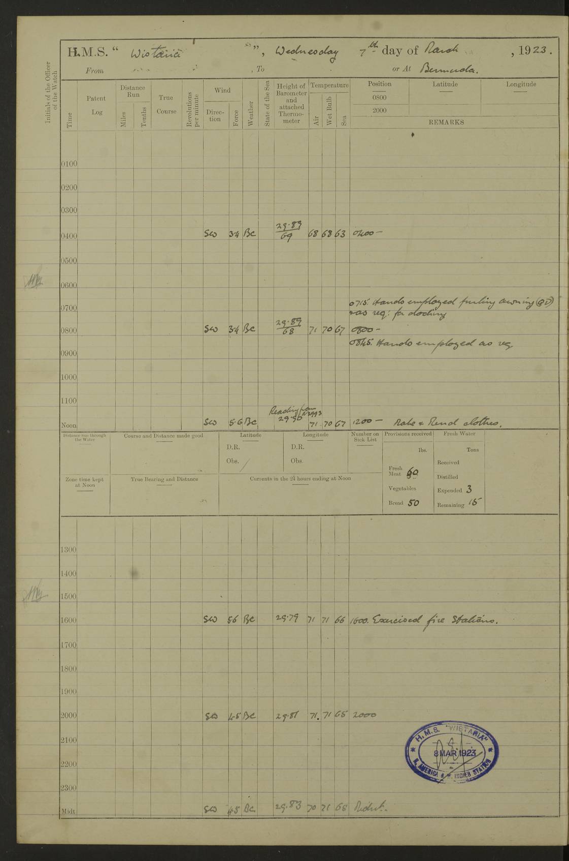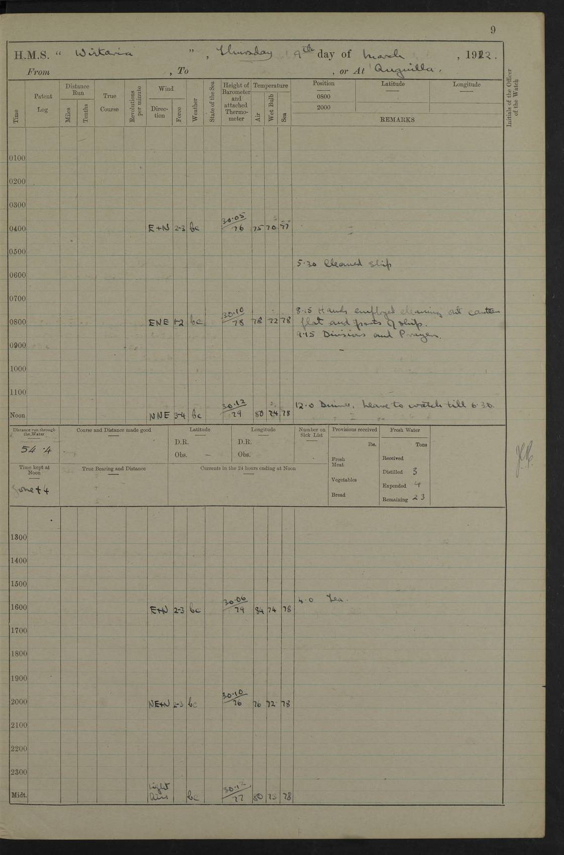 LOGS FOR MARCH 1922 4f73caa0a2fc8ea903000b56: (https://s3.amazonaws.com:443/oldweather/ADM53-93265/0033_0.jpg) 4f73caa4a2fc8ea903000b63: (https://s3.amazonaws.com:443/oldweather/ADM53-93266/0003_1.jpg) 1 March 1922 At Bermuda Lat 32.32, Long -64.8 9.30am: Hands employed preparing [securing] ship for sea 1.30pm: Left fenders 2.30pm: Proceeded as required for ship channel, 110 revs 3.37pm: Fairway Buoy abeam. Course SE 4.0pm: Reduced to 96 revs. Evening Quarters 4.55pm: Exercised sea boats crew 5.09pm: Streamed patent log 4f73caa5a2fc8ea903000b64: (https://s3.amazonaws.com:443/oldweather/ADM53-93266/0004_0.jpg) 2 March 1922 From Bermuda to Nevis Lat 28.91, Long -64.26 3.50am: Commenced working up for full power trial (8 hrs) 4.20am: Full power trial commenced 9.50am: Exercised sounding party am: Hands employed cleaning motor boat and parts of ship 12.25am: Eased to 132 revs. 3/5th power trial 4.0pm: Quarters. Exercised fire stations True Bearing and Distance: of Sombrero Island Lt 176°, 605 miles 4f73caa5a2fc8ea903000b65: (https://s3.amazonaws.com:443/oldweather/ADM53-93266/0004_1.jpg) 3 March 1922 [From Bermuda to Nevis] Lat 24.03, Long -63.78 4.26am: 3/5 power trial completed, reduced to 96 revs 7.0am: Set Fore staysail 9.30am: Divisions and Prayers. Exercised action stations 10.0am: Reset fore staysail 1.0pm: Hands mustered for monthly payment pm: Hands employed painting motor boat and parts of ship True Bearing and Distance: Sombrero 177°, 326 miles 4f73caa6a2fc8ea903000b66: (https://s3.amazonaws.com:443/oldweather/ADM53-93266/0005_0.jpg) 4 March 1922 From Bermuda to Nevis Lat 20.66, Long -63.4 2.0am: Tack of fore Staysail carried away, altered course West, “Slow” speed 2.15am: Resumed course and speed 10.0am: Passed steamer on Port beam 5.0pm: Put clocks on 20 minutes 6.02pm: Altered course S53W to lower fore staysail True Bearing and Distance: Sombrero 182°½, 124 miles 4f73caa6a2fc8ea903000b67: (https://s3.amazonaws.com:443/oldweather/ADM53-93266/0005_1.jpg) 5 March 1922 From Bermuda to Nevis and at Nevis Lat 17.0, Long -62.0 12.10am: Sighted Sombrero Island Lt S6W 1.30am: Sombrero Island Lt S17W 1.45am: Bearing S23W 2.07am: Lt 4 points on bow 2.27am: Light abeam to Starboard, 2.5 miles 2.52am: Light 4 points on quarter 6.05am: Sighted St Martin Isle 7.25am: Sighted St Eustatius S25E 8.52am: Saba Island Peak abeam 10.30am: Divisions. Sighted Nevis 1 point off Port bow 11.40am: Helden Point abeam 12.50pm: Hauled in patent log 12.55pm: Course and speed for lowering sea boat to send mails to RMSP “Caraquet” off Basse Terre 1.20pm: Proceeded. Course S33E, 96 revs 2.30pm: Anchored off Charlestown, Nevis Anchor Bearings: Lowland Church N28E, Ward Mill S46E, Fort Charles Pt S11E True Bearing and Distance: Basseterre Lt 283°, 8.3 miles 4f73caa6a2fc8ea903000b68: (https://s3.amazonaws.com:443/oldweather/ADM53-93266/0006_0.jpg) 6 March 1922 At Nevis Lat 17.14, Long -62.63 10.10am: Hands employed parts of ship and side party 11.30am: Saluting guns crews to drill 2.0pm: Hands employed cleaning ship’s side and parts of ship 8.10pm: Hoisted whaler 4f73caa7a2fc8ea903000b69: (https://s3.amazonaws.com:443/oldweather/ADM53-93266/0006_1.jpg) 7 March 1922 At Nevis Lat 17.14, Long -62.63 5.30am: Hands employed cleaning boats and ship 8.15am: Hands employed on boats and parts of ship 11.40am: Spread Q.D. awning 4f73caa7a2fc8ea903000b6a: (https://s3.amazonaws.com:443/oldweather/ADM53-93266/0007_0.jpg) 8 March 1922 From Nevis to Anguilla Lat 17.41, Long -62.95 5.30am: Cleaned ship and secured boats for sea 9.05am: Weighed and proceeded 10.0am: Stopped off Basse Terre 10.38am: Proceeded at 130 revs 2.50pm: Terre Basse Pt abeam, altered course N2E 3.19pm: Anguillita Pt abeam, altered course N37E 4.15pm: Came to with Port anchor in 6 fms & veered to 3 shackles Anchor Bearings: Custom Ho, right tangent, S40E; Point N43E; Flat Cap Pt N2E 6.40pm: Hoisted all boats True Bearing and Distance: Anguillita Island 342°½, 45.5 miles [Terre Basse Point: is the west extreme of St Martin Island] 4f73caa7a2fc8ea903000b6b: (https://s3.amazonaws.com:443/oldweather/ADM53-93266/0007_1.jpg) 9 March 1922 At Anguilla Lat 18.22, Long -63.07 8.15am: Hands employed cleaning out canteen flat and parts of ship 9.15am: Divisions and Prayers 4f73caa8a2fc8ea903000b6c: (https://s3.amazonaws.com:443/oldweather/ADM53-93266/0008_0.jpg) 10 March 1922 From Anguilla to Nevis Lat 17.6, Long -63.05 8.10am: H.E. the Governor and staff arrived on board 8.29am: Weighed and proceeded for Nevis at 120 revs. Course N83W 9.17am: Anguillita Island abeam. Altered course S5W 1.55pm: Brimstone Hill abeam 1 mile 2.35pm: Course and speed as required for anchoring 2.45pm: Came to with Starboard anchor in 4 fms 4.0pm: Anchored in 5 fms Anchor Bearings: Pier Head S72E, Fort Charles Pt S14E, Lowland Church N27E True Bearing and Distance: Basseterre Pier Lt 133°, 27 miles 4f73caa8a2fc8ea903000b6d: (https://s3.amazonaws.com:443/oldweather/ADM53-93266/0008_1.jpg) 11 March 1922 At Nevis Lat 17.14, Long -62.63 8.0am: Hands employed cleaning ship 4f73caa8a2fc8ea903000b6e: (https://s3.amazonaws.com:443/oldweather/ADM53-93266/0009_0.jpg) 12 March 1922 At Nevis Lat 17.14, Long -62.63 6.30am: Cleaned ship 9.45am: Divisions 3.0pm: Ship opened to visitors 4f73caa9a2fc8ea903000b6f: (https://s3.amazonaws.com:443/oldweather/ADM53-93266/0009_1.jpg) 13 March 1922 From Nevis to Antigua Lat 17.08, Long -62.36 8.15am: Secured boats for sea 10.10am: Weighed and proceeded 120 revs 2.30pm: Anchored in St Johns Harbour Anchor Bearings: Rat Island, right tangent, S85E; Fort James F.S. N7E; Week Pt S54E True Bearing and Distance: Sandy Island Lt Ho 085°½, 25.6 miles 4f73caa9a2fc8ea903000b70: (https://s3.amazonaws.com:443/oldweather/ADM53-93266/0010_0.jpg) 14 March 1922 At Antigua Lat 17.12, Long -61.85 8.15am: Hands employed spreading and fitting after boat deck awning and part of ship 9.25am: Carried on with work 4f73caaaa2fc8ea903000b71: (https://s3.amazonaws.com:443/o