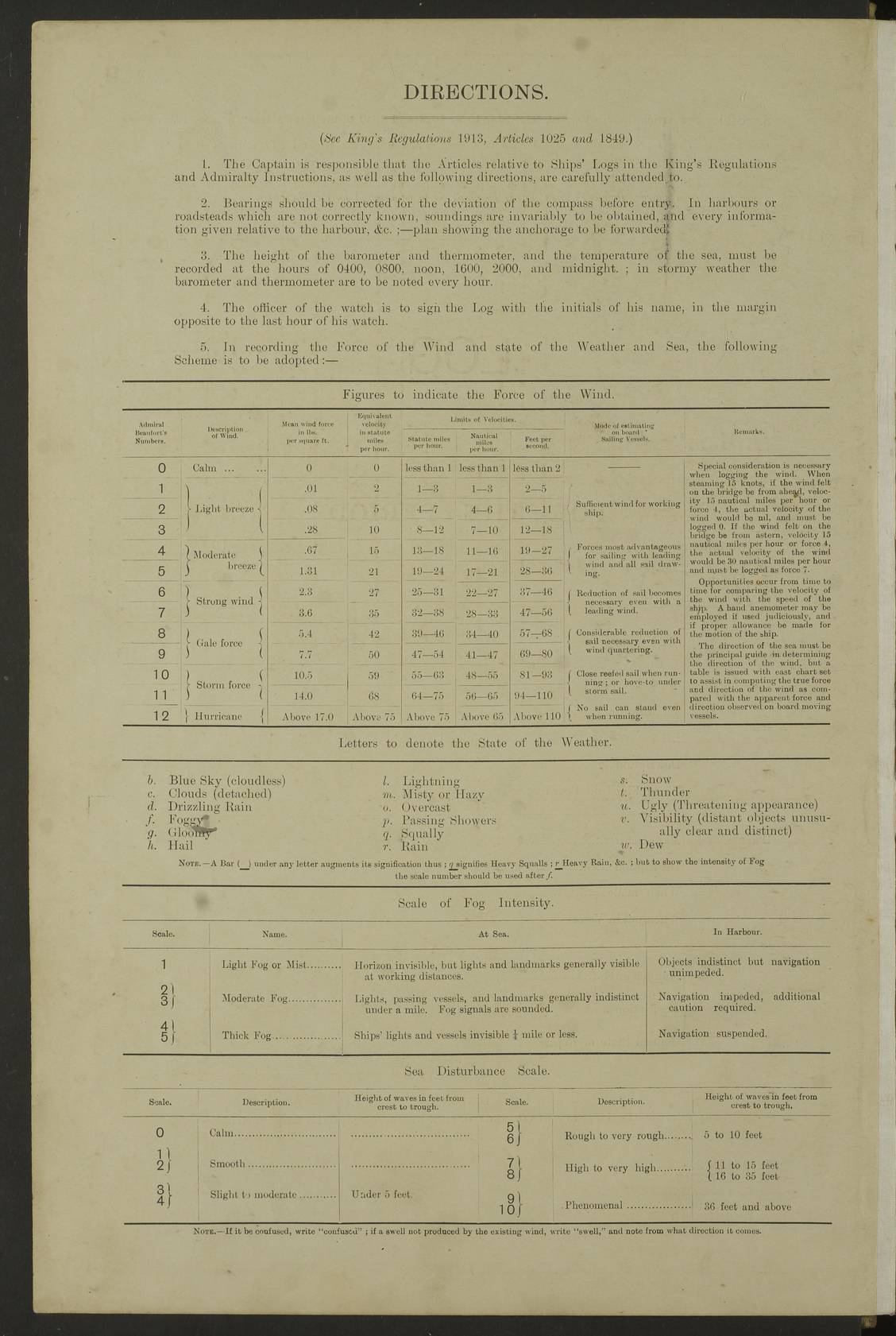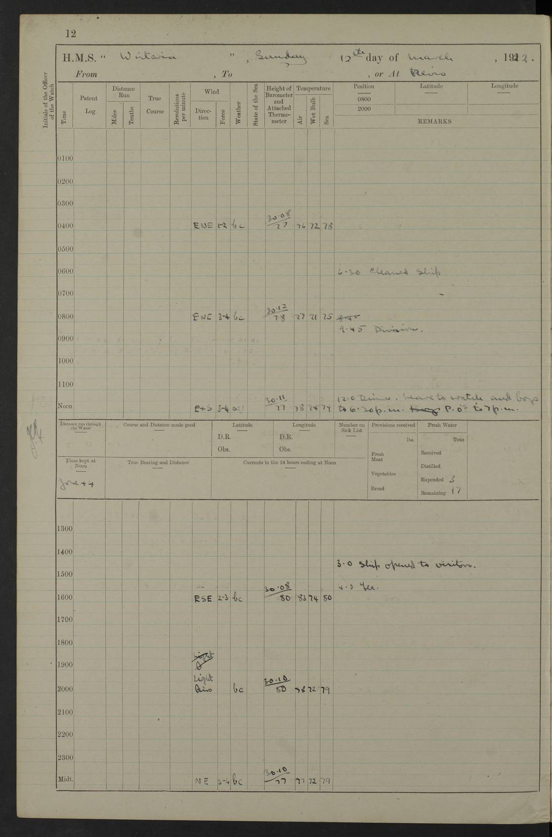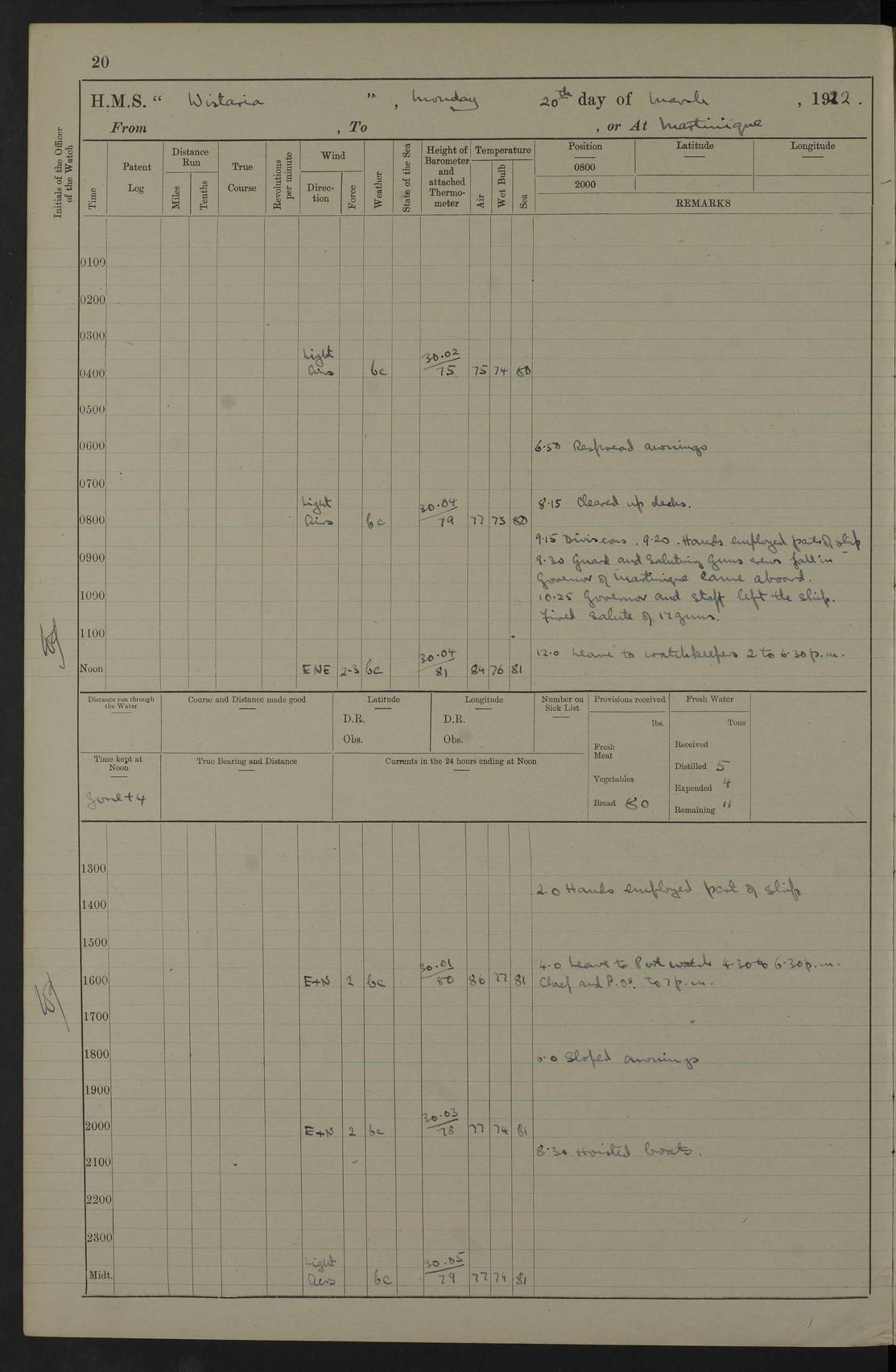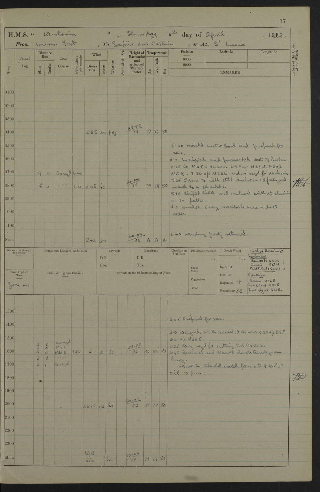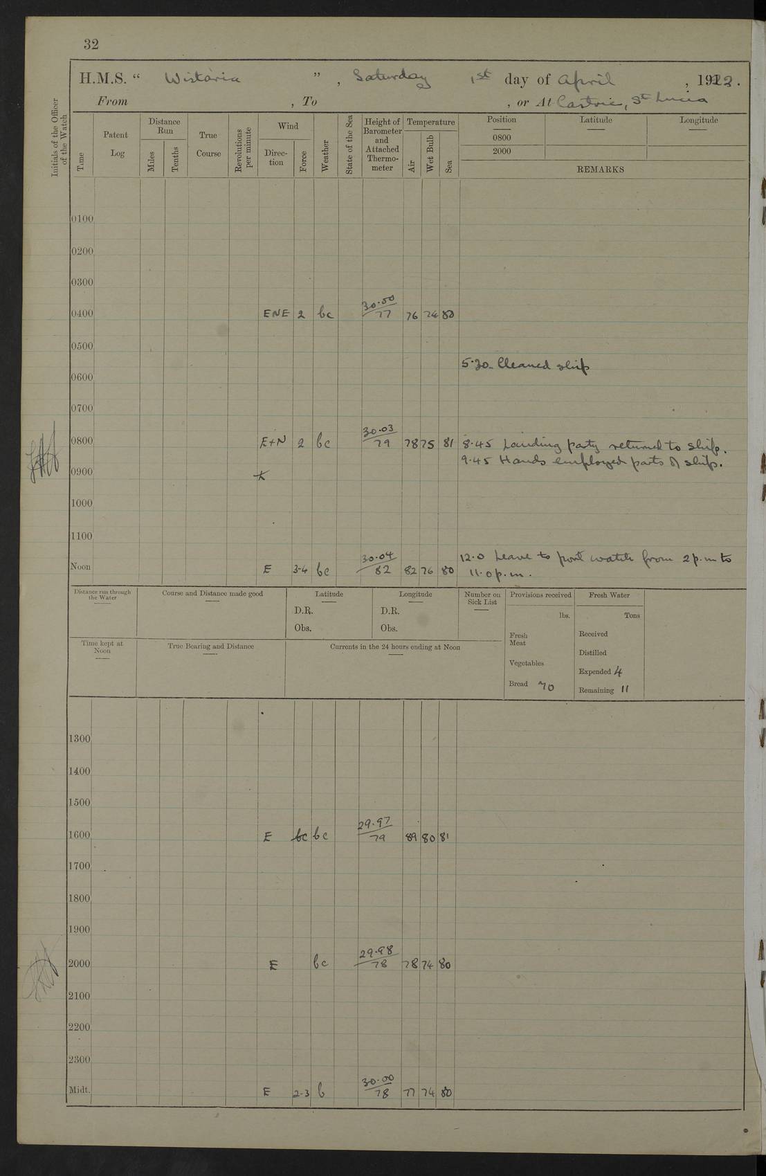 LOGS FOR MARCH 1922 4f73caa0a2fc8ea903000b56: (https://s3.amazonaws.com:443/oldweather/ADM53-93265/0033_0.jpg) 4f73caa4a2fc8ea903000b63: (https://s3.amazonaws.com:443/oldweather/ADM53-93266/0003_1.jpg) 1 March 1922 At Bermuda Lat 32.32, Long -64.8 9.30am: Hands employed preparing [securing] ship for sea 1.30pm: Left fenders 2.30pm: Proceeded as required for ship channel, 110 revs 3.37pm: Fairway Buoy abeam. Course SE 4.0pm: Reduced to 96 revs. Evening Quarters 4.55pm: Exercised sea boats crew 5.09pm: Streamed patent log 4f73caa5a2fc8ea903000b64: (https://s3.amazonaws.com:443/oldweather/ADM53-93266/0004_0.jpg) 2 March 1922 From Bermuda to Nevis Lat 28.91, Long -64.26 3.50am: Commenced working up for full power trial (8 hrs) 4.20am: Full power trial commenced 9.50am: Exercised sounding party am: Hands employed cleaning motor boat and parts of ship 12.25am: Eased to 132 revs. 3/5th power trial 4.0pm: Quarters. Exercised fire stations True Bearing and Distance: of Sombrero Island Lt 176°, 605 miles 4f73caa5a2fc8ea903000b65: (https://s3.amazonaws.com:443/oldweather/ADM53-93266/0004_1.jpg) 3 March 1922 [From Bermuda to Nevis] Lat 24.03, Long -63.78 4.26am: 3/5 power trial completed, reduced to 96 revs 7.0am: Set Fore staysail 9.30am: Divisions and Prayers. Exercised action stations 10.0am: Reset fore staysail 1.0pm: Hands mustered for monthly payment pm: Hands employed painting motor boat and parts of ship True Bearing and Distance: Sombrero 177°, 326 miles 4f73caa6a2fc8ea903000b66: (https://s3.amazonaws.com:443/oldweather/ADM53-93266/0005_0.jpg) 4 March 1922 From Bermuda to Nevis Lat 20.66, Long -63.4 2.0am: Tack of fore Staysail carried away, altered course West, “Slow” speed 2.15am: Resumed course and speed 10.0am: Passed steamer on Port beam 5.0pm: Put clocks on 20 minutes 6.02pm: Altered course S53W to lower fore staysail True Bearing and Distance: Sombrero 182°½, 124 miles 4f73caa6a2fc8ea903000b67: (https://s3.amazonaws.com:443/oldweather/ADM53-93266/0005_1.jpg) 5 March 1922 From Bermuda to Nevis and at Nevis Lat 17.0, Long -62.0 12.10am: Sighted Sombrero Island Lt S6W 1.30am: Sombrero Island Lt S17W 1.45am: Bearing S23W 2.07am: Lt 4 points on bow 2.27am: Light abeam to Starboard, 2.5 miles 2.52am: Light 4 points on quarter 6.05am: Sighted St Martin Isle 7.25am: Sighted St Eustatius S25E 8.52am: Saba Island Peak abeam 10.30am: Divisions. Sighted Nevis 1 point off Port bow 11.40am: Helden Point abeam 12.50pm: Hauled in patent log 12.55pm: Course and speed for lowering sea boat to send mails to RMSP “Caraquet” off Basse Terre 1.20pm: Proceeded. Course S33E, 96 revs 2.30pm: Anchored off Charlestown, Nevis Anchor Bearings: Lowland Church N28E, Ward Mill S46E, Fort Charles Pt S11E True Bearing and Distance: Basseterre Lt 283°, 8.3 miles 4f73caa6a2fc8ea903000b68: (https://s3.amazonaws.com:443/oldweather/ADM53-93266/0006_0.jpg) 6 March 1922 At Nevis Lat 17.14, Long -62.63 10.10am: Hands employed parts of ship and side party 11.30am: Saluting guns crews to drill 2.0pm: Hands employed cleaning ship’s side and parts of ship 8.10pm: Hoisted whaler 4f73caa7a2fc8ea903000b69: (https://s3.amazonaws.com:443/oldweather/ADM53-93266/0006_1.jpg) 7 March 1922 At Nevis Lat 17.14, Long -62.63 5.30am: Hands employed cleaning boats and ship 8.15am: Hands employed on boats and parts of ship 11.40am: Spread Q.D. awning 4f73caa7a2fc8ea903000b6a: (https://s3.amazonaws.com:443/oldweather/ADM53-93266/0007_0.jpg) 8 March 1922 From Nevis to Anguilla Lat 17.41, Long -62.95 5.30am: Cleaned ship and secured boats for sea 9.05am: Weighed and proceeded 10.0am: Stopped off Basse Terre 10.38am: Proceeded at 130 revs 2.50pm: Terre Basse Pt abeam, altered course N2E 3.19pm: Anguillita Pt abeam, altered course N37E 4.15pm: Came to with Port anchor in 6 fms & veered to 3 shackles Anchor Bearings: Custom Ho, right tangent, S40E; Point N43E; Flat Cap Pt N2E 6.40pm: Hoisted all boats True Bearing and Distance: Anguillita Island 342°½, 45.5 miles [Terre Basse Point: is the west extreme of St Martin Island] 4f73caa7a2fc8ea903000b6b: (https://s3.amazonaws.com:443/oldweather/ADM53-93266/0007_1.jpg) 9 March 1922 At Anguilla Lat 18.22, Long -63.07 8.15am: Hands employed cleaning out canteen flat and parts of ship 9.15am: Divisions and Prayers 4f73caa8a2fc8ea903000b6c: (https://s3.amazonaws.com:443/oldweather/ADM53-93266/0008_0.jpg) 10 March 1922 From Anguilla to Nevis Lat 17.6, Long -63.05 8.10am: H.E. the Governor and staff arrived on board 8.29am: Weighed and proceeded for Nevis at 120 revs. Course N83W 9.17am: Anguillita Island abeam. Altered course S5W 1.55pm: Brimstone Hill abeam 1 mile 2.35pm: Course and speed as required for anchoring 2.45pm: Came to with Starboard anchor in 4 fms 4.0pm: Anchored in 5 fms Anchor Bearings: Pier Head S72E, Fort Charles Pt S14E, Lowland Church N27E True Bearing and Distance: Basseterre Pier Lt 133°, 27 miles 4f73caa8a2fc8ea903000b6d: (https://s3.amazonaws.com:443/oldweather/ADM53-93266/0008_1.jpg) 11 March 1922 At Nevis Lat 17.14, Long -62.63 8.0am: Hands employed cleaning ship 4f73caa8a2fc8ea903000b6e: (https://s3.amazonaws.com:443/oldweather/ADM53-93266/0009_0.jpg) 12 March 1922 At Nevis Lat 17.14, Long -62.63 6.30am: Cleaned ship 9.45am: Divisions 3.0pm: Ship opened to visitors 4f73caa9a2fc8ea903000b6f: (https://s3.amazonaws.com:443/oldweather/ADM53-93266/0009_1.jpg) 13 March 1922 From Nevis to Antigua Lat 17.08, Long -62.36 8.15am: Secured boats for sea 10.10am: Weighed and proceeded 120 revs 2.30pm: Anchored in St Johns Harbour Anchor Bearings: Rat Island, right tangent, S85E; Fort James F.S. N7E; Week Pt S54E True Bearing and Distance: Sandy Island Lt Ho 085°½, 25.6 miles 4f73caa9a2fc8ea903000b70: (https://s3.amazonaws.com:443/oldweather/ADM53-93266/0010_0.jpg) 14 March 1922 At Antigua Lat 17.12, Long -61.85 8.15am: Hands employed spreading and fitting after boat deck awning and part of ship 9.25am: Carried on with work 4f73caaaa2fc8ea903000b71: (https://s3.amazonaws.com:443/o