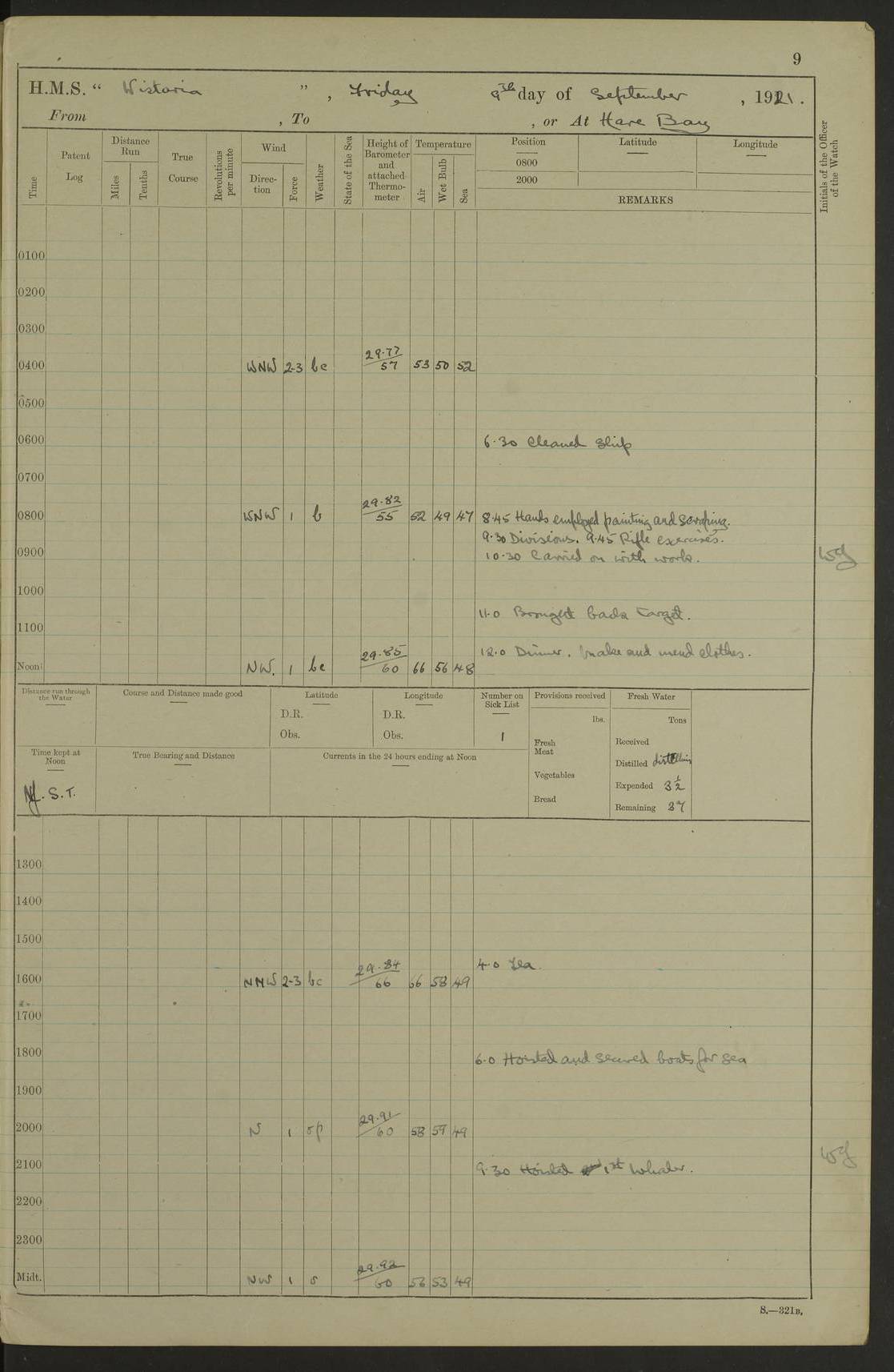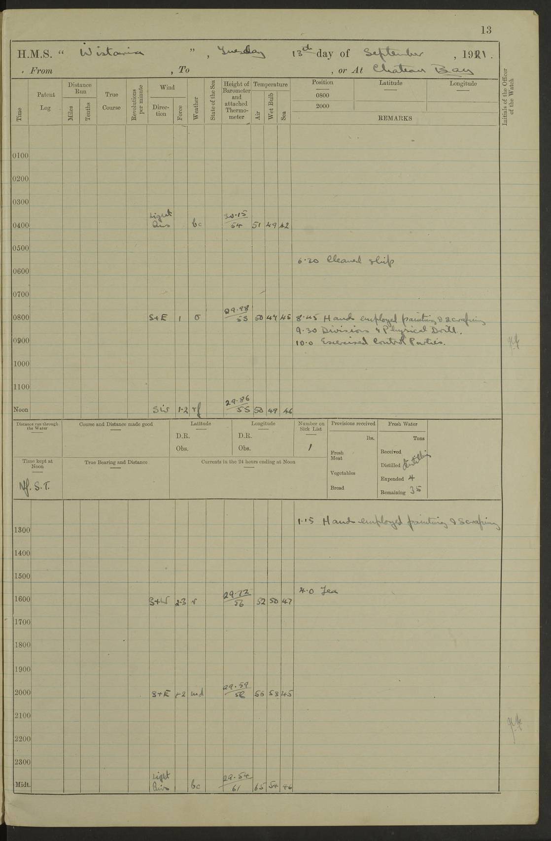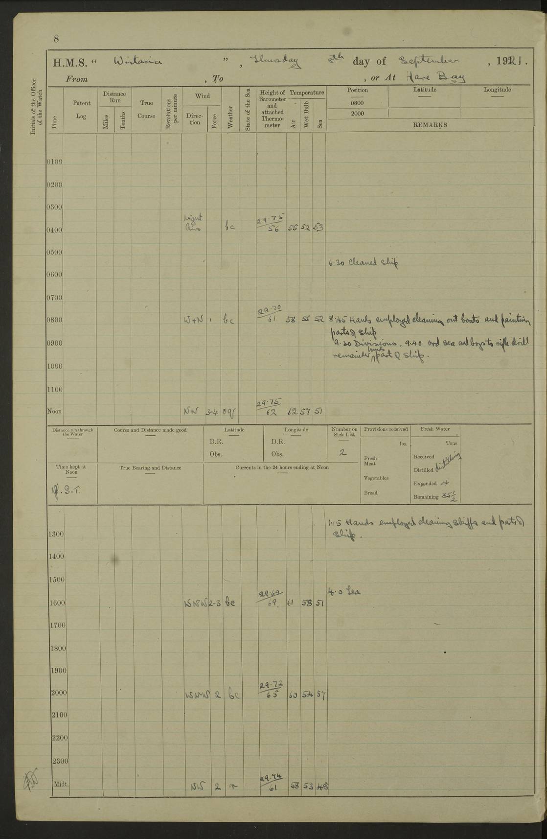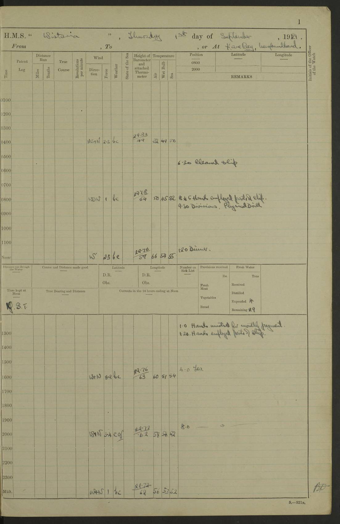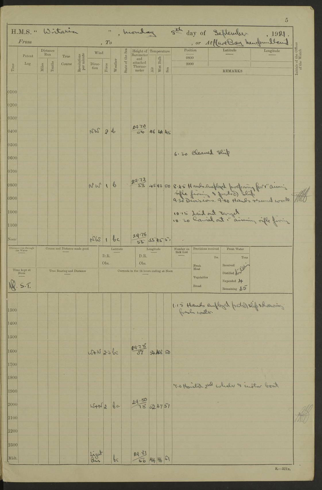 LOGS FOR SEPTEMBER 1921 4f73ca53a2fc8ea903000a89: (https://s3.amazonaws.com:443/oldweather/ADM53-93263/0003_1.jpg) 1 September 1921 At Hare Bay, Newfoundland Lat 48.85, Long -54.00 8.45am: Hands employed parts of ship 1.0pm: Hands mustered for monthly payment 1.20pm: Hands employed parts of ship 4f73ca53a2fc8ea903000a8a: (https://s3.amazonaws.com:443/oldweather/ADM53-93263/0004_0.jpg) 2 September 1921 At Hare Bay, Newfoundland Lat 48.85, Long -54.00 8.45am: Clear up decks for divisions 9.35am: Exercise Action 10.05am: Hands employed parts of ship 1.15pm: Hands employed parts of ship 4f73ca54a2fc8ea903000a8b: (https://s3.amazonaws.com:443/oldweather/ADM53-93263/0004_1.jpg) 3 September 1921 At Hare Bay, Newfoundland Lat 48.85, Long -54.00 8.45am: Cleaned ship 4.0pm: Evening Quarters 4f73ca54a2fc8ea903000a8c: (https://s3.amazonaws.com:443/oldweather/ADM53-93263/0005_0.jpg) 4 September 1921 At Hare Bay, Newfoundland Lat 48.85, Long -54.00 9.45am: Divisions & Prayers 4f73ca54a2fc8ea903000a8d: (https://s3.amazonaws.com:443/oldweather/ADM53-93263/0005_1.jpg) 5 September 1921 At Hare Bay, Newfoundland Lat 48.85, Long -54.00 8.45am: Hands employed preparing for 1” aiming rifle firing & parts of ship 9.40am: Hands resumed work 10.15am: Laid out target 10.30am: Carried out 1” aiming rifle firing 1.15pm: Hands employed parts of ship & drawing fresh water 7.0pm: Hoisted 2nd whaler & motor boat 4f73ca55a2fc8ea903000a8e: (https://s3.amazonaws.com:443/oldweather/ADM53-93263/0006_0.jpg) 6 September 1921 At Hare Bay, Newfoundland Lat 48.85, Long -54.00 9.50am: Hands employed parts of ship 1.15pm: Hands employed with parts of ship painting 4.0pm: Tea. One cell prisoner released 4f73ca55a2fc8ea903000a8f: (https://s3.amazonaws.com:443/oldweather/ADM53-93263/0006_1.jpg) 7 September 1921 At Hare Bay, Newfoundland Lat 48.85, Long -54.00 8.45am: Hands employed parts of ship 9.40am: Carried out 1” aiming rifle practice 10.40am: Hands carry on with work 1.15pm: Hands employed painting parts of ship 4f73ca55a2fc8ea903000a90: (https://s3.amazonaws.com:443/oldweather/ADM53-93263/0007_0.jpg) 8 September 1921 At Hare Bay Lat 48.85, Long -54.00 8.45am: Hands employed cleaning out boats and painting parts of ship 9.40am: Ordinary Seamen and boys to rifle drill, remainder hands part of ship 1.15pm: Hands employed cleaning skiffs and parts of ship Number on sick list: 2 4f73ca56a2fc8ea903000a91: (https://s3.amazonaws.com:443/oldweather/ADM53-93263/0007_1.jpg) 9 September 1921 At Hare Bay, Newfoundland Lat 48.85, Long -54.00 8.45am: Hands employed painting and scraping 9.45am: Rifle exercises 10.30am: Carried on with work 11.0am: Brought back target 6.0pm: Hoisted and secured boats for sea 9.30pm: Hoisted 1st whaler Number on sick list: 1 4f73ca56a2fc8ea903000a92: (https://s3.amazonaws.com:443/oldweather/ADM53-93263/0008_0.jpg) 10 September 1921 From Hare Bay to Chateau Bay Lat 51.98, Long -55.89 5.0am: Called 1st watch 5.30am: Watch fell in. Hoisted gangway 5.45am: Weighed and proceeded as requisite, 9 knots 10.40am: Sighted iceberg North 2.0pm: Course as required for entering Pitts Harbour 2.20pm: Came to with Starboard anchor 14½ faths water, veered 3 shackles Anchor bearings: East Point of Whale Island S6W; Point, right tangent, S72E; Islet, right tangent, S24E Number on sick list: 1 4f73ca57a2fc8ea903000a93: (https://s3.amazonaws.com:443/oldweather/ADM53-93263/0008_1.jpg) 11 September 1921 At Pitts Harbour, Chateau Bay Lat 51.98, Long -55.89 9.45am: Divisions 1.30pm: Libertymen landed 6.30pm: Hoisted both skiffs 8.30pm: Hoisted 1st whaler Number on sick list: 1 4f73ca57a2fc8ea903000a94: (https://s3.amazonaws.com:443/oldweather/ADM53-93263/0009_0.jpg) 12 September 1921 At Pitts Harbour, Chateau Bay Lat 51.98, Long -55.89 8.25am: Aft lower booms, clear up decks 8.45am: Weighed and proceeded as required for Temple Pass and Ship Cove Bay 9.30am: Came to Starboard anchor in 20 fths, 4 shackles 10.10am: Hands employed as required Anchor Bearings: Point, right tangent, N16W; left tangent, Whale Island S69E, Whale Island, right tangent, S35E 1.15pm: Hands employed as requisite Number on sick list: 1 4f73ca57a2fc8ea903000a95: (https://s3.amazonaws.com:443/oldweather/ADM53-93263/0009_1.jpg) 13 September 1921 At Chateau Bay Lat 51.98, Long -55.89 8.45am: Hands employed painting & scraping 10.0am: Exercised Control Parties 1.15pm: Hands employed painting & scraping Number on sick list: 1 4f73ca58a2fc8ea903000a96: (https://s3.amazonaws.com:443/oldweather/ADM53-93263/0010_0.jpg) 14 September 1921 At Chateau Bay Lat 51.98, Long -55.89 8.15am: Hands employed parts of ship and shipping .303 aiming rifles 9.45am: Ordinary Seamen & Boys & other non guns crew seamen rating to 4” drill & .303 aiming rifle practice 1.20pm: Hands employed getting up awnings, painting and scraping Number on sick list: 1 4f73ca58a2fc8ea903000a97: (https://s3.amazonaws.com:443/oldweather/ADM53-93263/0010_1.jpg) 15 September 1921 From Chateau Bay to Forteau Bay and at Chateau Bay and Forteau Bay Lat 51.61, Long -56.45 7.0am: Weighed and proceeded as required for temple pass 90 revs 9.38am: Altered course N7E and as required for firing lyddite and 1” aiming rifle shots at “growler” 11.0am: Saddle Island Lt on Starboard bow 11.52am: Saddle Island Lt on Starboard quarter 2.13pm: Amour Pt Lt Ho abeam 2.18pm: Altered course N40W and as required for anchorage 2.48pm: Came to port anchor Anchor Bearings: Admiral Pt pier, right tangent, N14W; Hawkins point, right tangent, N40E; left tangent, Coast S28W Number on sick list: 1 4f73ca58a2fc8ea903000a98: (https://s3.amazonaws.com:443/oldweather/ADM53-93263/0011_0.jpg) 16 September 1921 At Forteau Bay Lat 51.46, Long -56.93 9.0am: Clear up decks 9.45am: Landing party left ship 12.25am: Landing party returned Number on sick list: 1 4f73ca59a2fc8ea903000a99: (https://s3.amazonaws.com:443/oldweather/ADM53-93263/0011_1.jpg) 17 September 1921 At Forteau Bay Lat 51.46, Long -56.93 8.45am: Hands employed cleaning shi