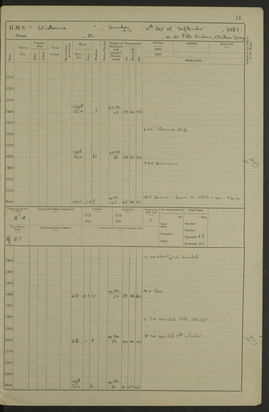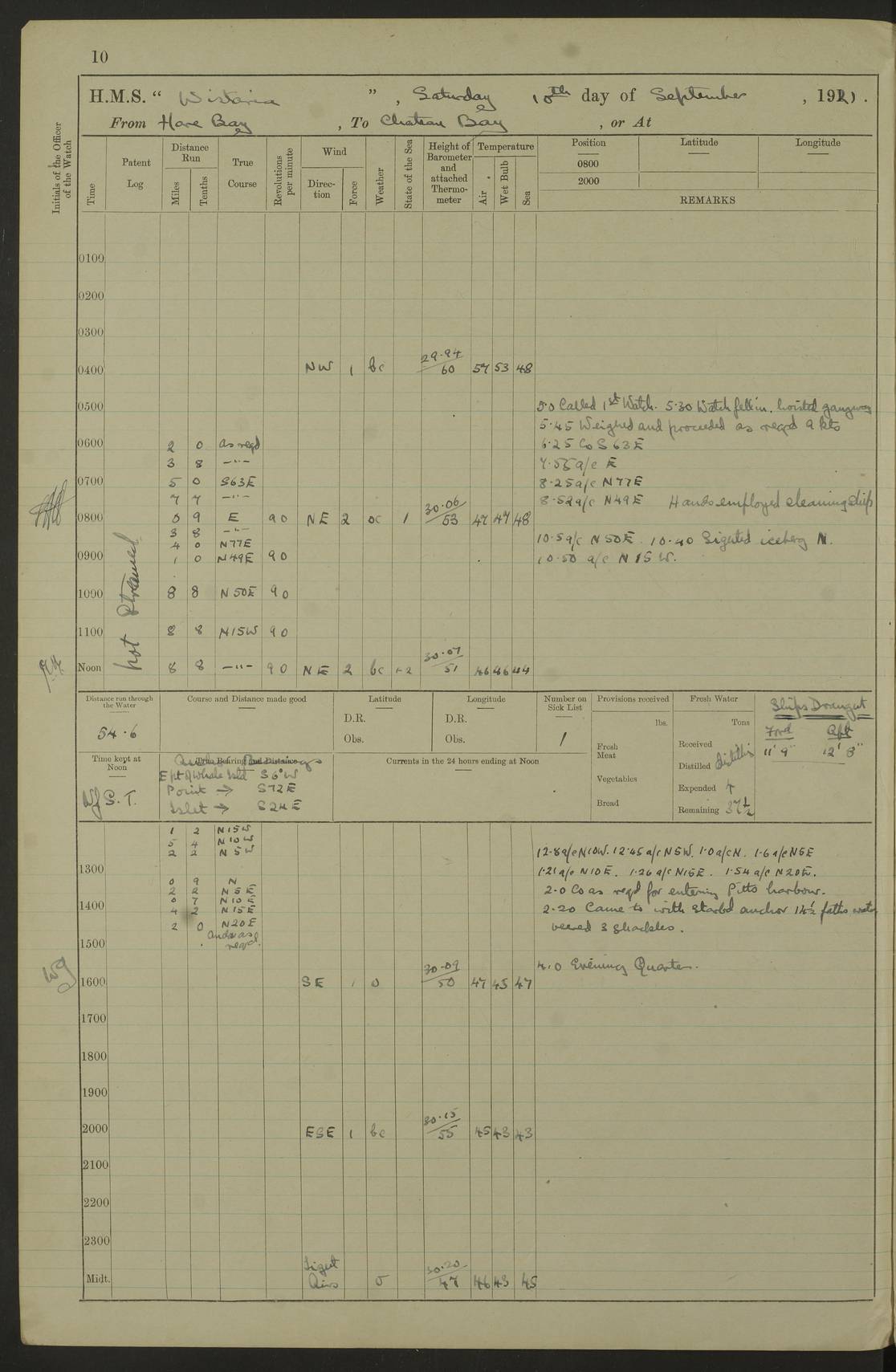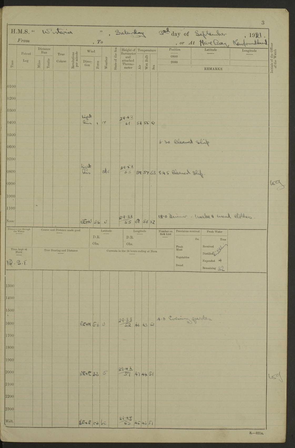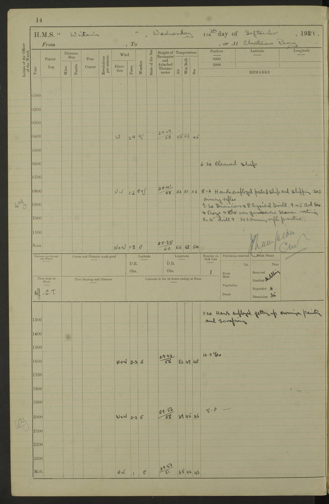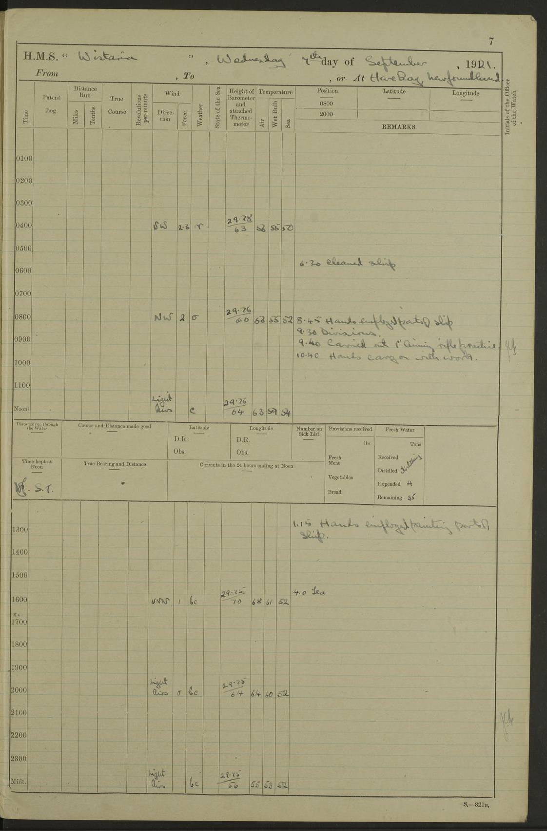 LOGS FOR SEPTEMBER 1921 4f73ca53a2fc8ea903000a89: (https://s3.amazonaws.com:443/oldweather/ADM53-93263/0003_1.jpg) 1 September 1921 At Hare Bay, Newfoundland Lat 48.85, Long -54.00 8.45am: Hands employed parts of ship 1.0pm: Hands mustered for monthly payment 1.20pm: Hands employed parts of ship 4f73ca53a2fc8ea903000a8a: (https://s3.amazonaws.com:443/oldweather/ADM53-93263/0004_0.jpg) 2 September 1921 At Hare Bay, Newfoundland Lat 48.85, Long -54.00 8.45am: Clear up decks for divisions 9.35am: Exercise Action 10.05am: Hands employed parts of ship 1.15pm: Hands employed parts of ship 4f73ca54a2fc8ea903000a8b: (https://s3.amazonaws.com:443/oldweather/ADM53-93263/0004_1.jpg) 3 September 1921 At Hare Bay, Newfoundland Lat 48.85, Long -54.00 8.45am: Cleaned ship 4.0pm: Evening Quarters 4f73ca54a2fc8ea903000a8c: (https://s3.amazonaws.com:443/oldweather/ADM53-93263/0005_0.jpg) 4 September 1921 At Hare Bay, Newfoundland Lat 48.85, Long -54.00 9.45am: Divisions & Prayers 4f73ca54a2fc8ea903000a8d: (https://s3.amazonaws.com:443/oldweather/ADM53-93263/0005_1.jpg) 5 September 1921 At Hare Bay, Newfoundland Lat 48.85, Long -54.00 8.45am: Hands employed preparing for 1” aiming rifle firing & parts of ship 9.40am: Hands resumed work 10.15am: Laid out target 10.30am: Carried out 1” aiming rifle firing 1.15pm: Hands employed parts of ship & drawing fresh water 7.0pm: Hoisted 2nd whaler & motor boat 4f73ca55a2fc8ea903000a8e: (https://s3.amazonaws.com:443/oldweather/ADM53-93263/0006_0.jpg) 6 September 1921 At Hare Bay, Newfoundland Lat 48.85, Long -54.00 9.50am: Hands employed parts of ship 1.15pm: Hands employed with parts of ship painting 4.0pm: Tea. One cell prisoner released 4f73ca55a2fc8ea903000a8f: (https://s3.amazonaws.com:443/oldweather/ADM53-93263/0006_1.jpg) 7 September 1921 At Hare Bay, Newfoundland Lat 48.85, Long -54.00 8.45am: Hands employed parts of ship 9.40am: Carried out 1” aiming rifle practice 10.40am: Hands carry on with work 1.15pm: Hands employed painting parts of ship 4f73ca55a2fc8ea903000a90: (https://s3.amazonaws.com:443/oldweather/ADM53-93263/0007_0.jpg) 8 September 1921 At Hare Bay Lat 48.85, Long -54.00 8.45am: Hands employed cleaning out boats and painting parts of ship 9.40am: Ordinary Seamen and boys to rifle drill, remainder hands part of ship 1.15pm: Hands employed cleaning skiffs and parts of ship Number on sick list: 2 4f73ca56a2fc8ea903000a91: (https://s3.amazonaws.com:443/oldweather/ADM53-93263/0007_1.jpg) 9 September 1921 At Hare Bay, Newfoundland Lat 48.85, Long -54.00 8.45am: Hands employed painting and scraping 9.45am: Rifle exercises 10.30am: Carried on with work 11.0am: Brought back target 6.0pm: Hoisted and secured boats for sea 9.30pm: Hoisted 1st whaler Number on sick list: 1 4f73ca56a2fc8ea903000a92: (https://s3.amazonaws.com:443/oldweather/ADM53-93263/0008_0.jpg) 10 September 1921 From Hare Bay to Chateau Bay Lat 51.98, Long -55.89 5.0am: Called 1st watch 5.30am: Watch fell in. Hoisted gangway 5.45am: Weighed and proceeded as requisite, 9 knots 10.40am: Sighted iceberg North 2.0pm: Course as required for entering Pitts Harbour 2.20pm: Came to with Starboard anchor 14½ faths water, veered 3 shackles Anchor bearings: East Point of Whale Island S6W; Point, right tangent, S72E; Islet, right tangent, S24E Number on sick list: 1 4f73ca57a2fc8ea903000a93: (https://s3.amazonaws.com:443/oldweather/ADM53-93263/0008_1.jpg) 11 September 1921 At Pitts Harbour, Chateau Bay Lat 51.98, Long -55.89 9.45am: Divisions 1.30pm: Libertymen landed 6.30pm: Hoisted both skiffs 8.30pm: Hoisted 1st whaler Number on sick list: 1 4f73ca57a2fc8ea903000a94: (https://s3.amazonaws.com:443/oldweather/ADM53-93263/0009_0.jpg) 12 September 1921 At Pitts Harbour, Chateau Bay Lat 51.98, Long -55.89 8.25am: Aft lower booms, clear up decks 8.45am: Weighed and proceeded as required for Temple Pass and Ship Cove Bay 9.30am: Came to Starboard anchor in 20 fths, 4 shackles 10.10am: Hands employed as required Anchor Bearings: Point, right tangent, N16W; left tangent, Whale Island S69E, Whale Island, right tangent, S35E 1.15pm: Hands employed as requisite Number on sick list: 1 4f73ca57a2fc8ea903000a95: (https://s3.amazonaws.com:443/oldweather/ADM53-93263/0009_1.jpg) 13 September 1921 At Chateau Bay Lat 51.98, Long -55.89 8.45am: Hands employed painting & scraping 10.0am: Exercised Control Parties 1.15pm: Hands employed painting & scraping Number on sick list: 1 4f73ca58a2fc8ea903000a96: (https://s3.amazonaws.com:443/oldweather/ADM53-93263/0010_0.jpg) 14 September 1921 At Chateau Bay Lat 51.98, Long -55.89 8.15am: Hands employed parts of ship and shipping .303 aiming rifles 9.45am: Ordinary Seamen & Boys & other non guns crew seamen rating to 4” drill & .303 aiming rifle practice 1.20pm: Hands employed getting up awnings, painting and scraping Number on sick list: 1 4f73ca58a2fc8ea903000a97: (https://s3.amazonaws.com:443/oldweather/ADM53-93263/0010_1.jpg) 15 September 1921 From Chateau Bay to Forteau Bay and at Chateau Bay and Forteau Bay Lat 51.61, Long -56.45 7.0am: Weighed and proceeded as required for temple pass 90 revs 9.38am: Altered course N7E and as required for firing lyddite and 1” aiming rifle shots at “growler” 11.0am: Saddle Island Lt on Starboard bow 11.52am: Saddle Island Lt on Starboard quarter 2.13pm: Amour Pt Lt Ho abeam 2.18pm: Altered course N40W and as required for anchorage 2.48pm: Came to port anchor Anchor Bearings: Admiral Pt pier, right tangent, N14W; Hawkins point, right tangent, N40E; left tangent, Coast S28W Number on sick list: 1 4f73ca58a2fc8ea903000a98: (https://s3.amazonaws.com:443/oldweather/ADM53-93263/0011_0.jpg) 16 September 1921 At Forteau Bay Lat 51.46, Long -56.93 9.0am: Clear up decks 9.45am: Landing party left ship 12.25am: Landing party returned Number on sick list: 1 4f73ca59a2fc8ea903000a99: (https://s3.amazonaws.com:443/oldweather/ADM53-93263/0011_1.jpg) 17 September 1921 At Forteau Bay Lat 51.46, Long -56.93 8.45am: Hands employed cleaning shi