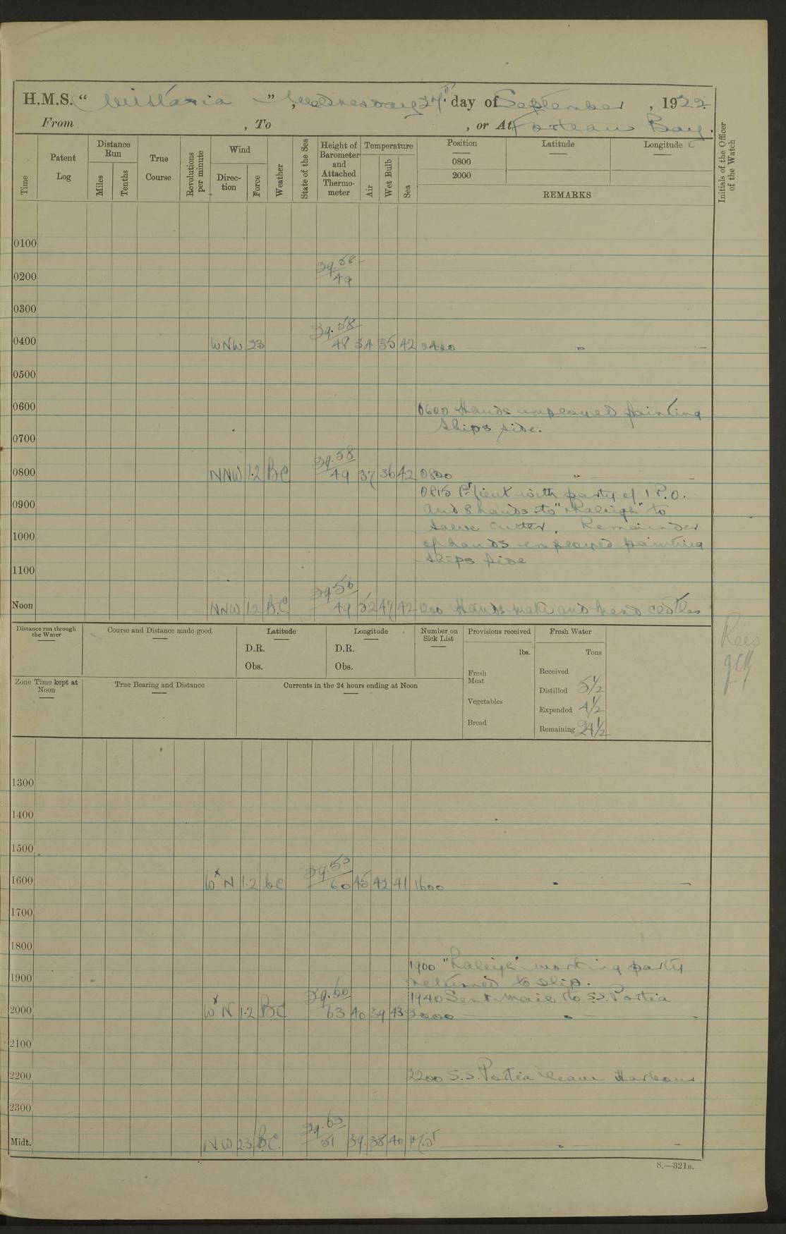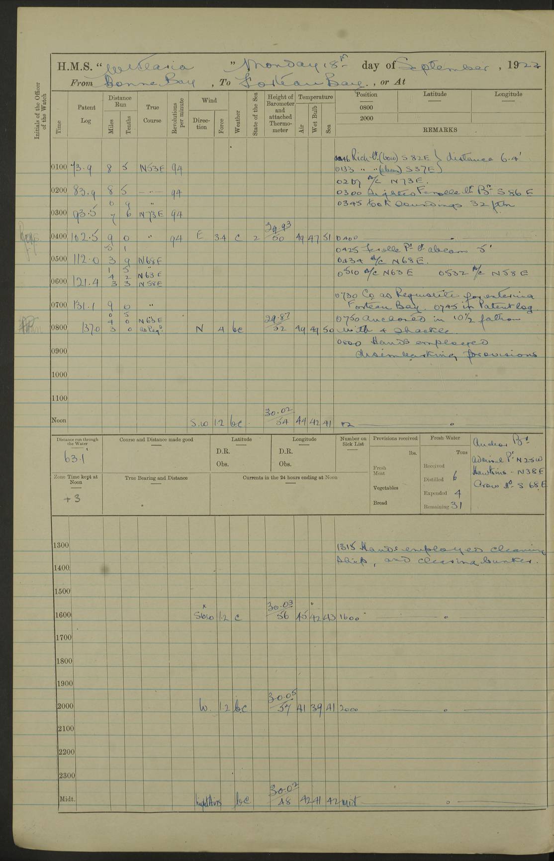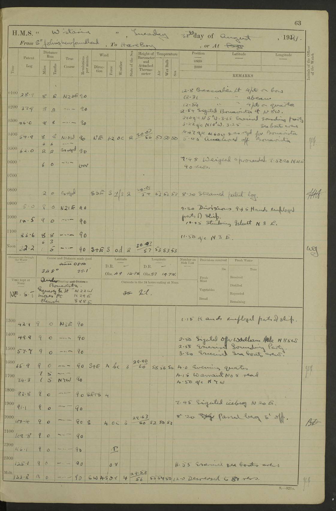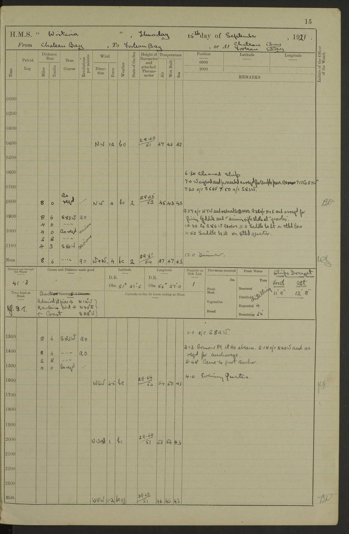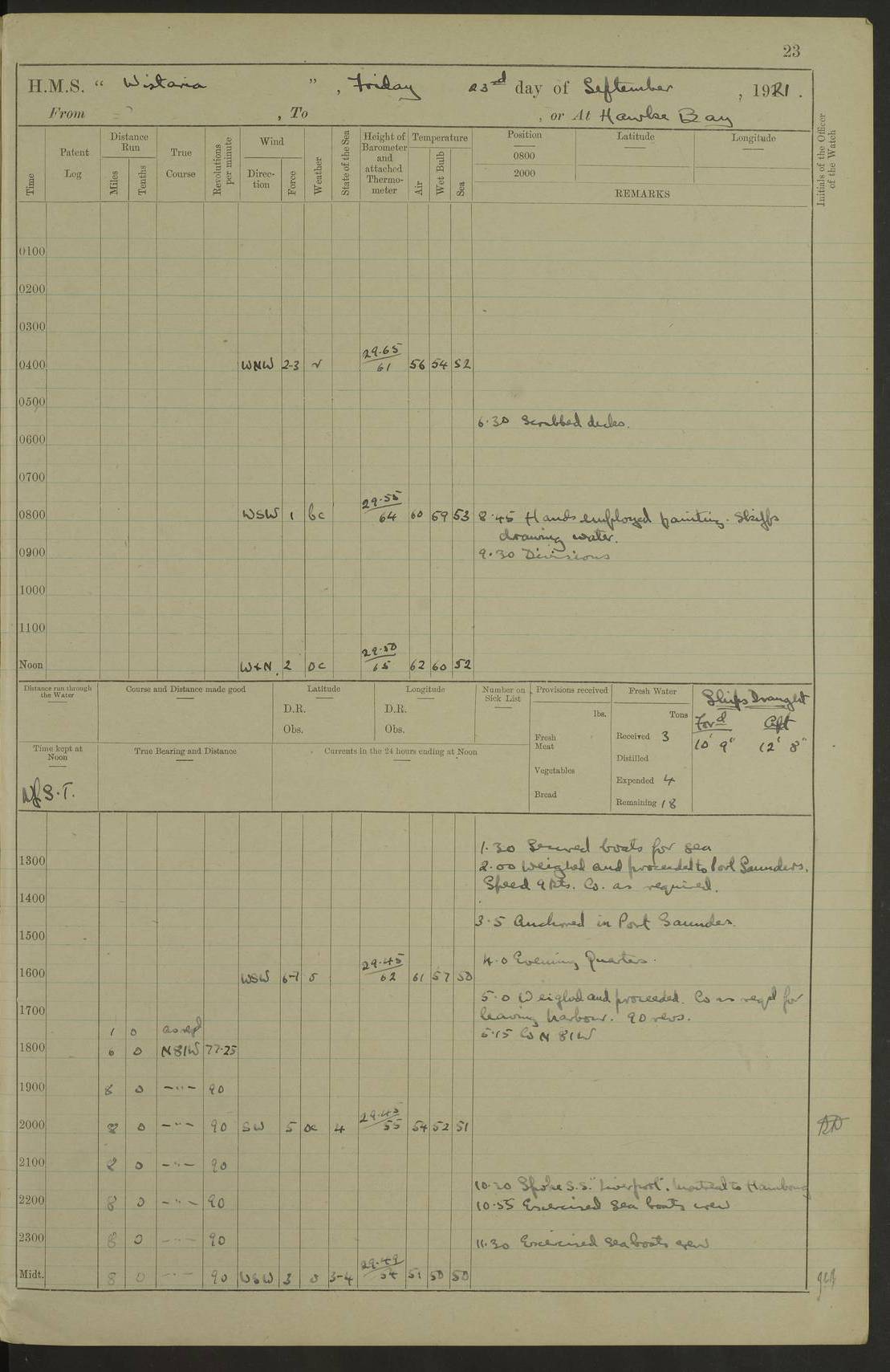 LOGS FOR SEPTEMBER 1921 4f73ca53a2fc8ea903000a89: (https://s3.amazonaws.com:443/oldweather/ADM53-93263/0003_1.jpg) 1 September 1921 At Hare Bay, Newfoundland Lat 48.85, Long -54.00 8.45am: Hands employed parts of ship 1.0pm: Hands mustered for monthly payment 1.20pm: Hands employed parts of ship 4f73ca53a2fc8ea903000a8a: (https://s3.amazonaws.com:443/oldweather/ADM53-93263/0004_0.jpg) 2 September 1921 At Hare Bay, Newfoundland Lat 48.85, Long -54.00 8.45am: Clear up decks for divisions 9.35am: Exercise Action 10.05am: Hands employed parts of ship 1.15pm: Hands employed parts of ship 4f73ca54a2fc8ea903000a8b: (https://s3.amazonaws.com:443/oldweather/ADM53-93263/0004_1.jpg) 3 September 1921 At Hare Bay, Newfoundland Lat 48.85, Long -54.00 8.45am: Cleaned ship 4.0pm: Evening Quarters 4f73ca54a2fc8ea903000a8c: (https://s3.amazonaws.com:443/oldweather/ADM53-93263/0005_0.jpg) 4 September 1921 At Hare Bay, Newfoundland Lat 48.85, Long -54.00 9.45am: Divisions & Prayers 4f73ca54a2fc8ea903000a8d: (https://s3.amazonaws.com:443/oldweather/ADM53-93263/0005_1.jpg) 5 September 1921 At Hare Bay, Newfoundland Lat 48.85, Long -54.00 8.45am: Hands employed preparing for 1” aiming rifle firing & parts of ship 9.40am: Hands resumed work 10.15am: Laid out target 10.30am: Carried out 1” aiming rifle firing 1.15pm: Hands employed parts of ship & drawing fresh water 7.0pm: Hoisted 2nd whaler & motor boat 4f73ca55a2fc8ea903000a8e: (https://s3.amazonaws.com:443/oldweather/ADM53-93263/0006_0.jpg) 6 September 1921 At Hare Bay, Newfoundland Lat 48.85, Long -54.00 9.50am: Hands employed parts of ship 1.15pm: Hands employed with parts of ship painting 4.0pm: Tea. One cell prisoner released 4f73ca55a2fc8ea903000a8f: (https://s3.amazonaws.com:443/oldweather/ADM53-93263/0006_1.jpg) 7 September 1921 At Hare Bay, Newfoundland Lat 48.85, Long -54.00 8.45am: Hands employed parts of ship 9.40am: Carried out 1” aiming rifle practice 10.40am: Hands carry on with work 1.15pm: Hands employed painting parts of ship 4f73ca55a2fc8ea903000a90: (https://s3.amazonaws.com:443/oldweather/ADM53-93263/0007_0.jpg) 8 September 1921 At Hare Bay Lat 48.85, Long -54.00 8.45am: Hands employed cleaning out boats and painting parts of ship 9.40am: Ordinary Seamen and boys to rifle drill, remainder hands part of ship 1.15pm: Hands employed cleaning skiffs and parts of ship Number on sick list: 2 4f73ca56a2fc8ea903000a91: (https://s3.amazonaws.com:443/oldweather/ADM53-93263/0007_1.jpg) 9 September 1921 At Hare Bay, Newfoundland Lat 48.85, Long -54.00 8.45am: Hands employed painting and scraping 9.45am: Rifle exercises 10.30am: Carried on with work 11.0am: Brought back target 6.0pm: Hoisted and secured boats for sea 9.30pm: Hoisted 1st whaler Number on sick list: 1 4f73ca56a2fc8ea903000a92: (https://s3.amazonaws.com:443/oldweather/ADM53-93263/0008_0.jpg) 10 September 1921 From Hare Bay to Chateau Bay Lat 51.98, Long -55.89 5.0am: Called 1st watch 5.30am: Watch fell in. Hoisted gangway 5.45am: Weighed and proceeded as requisite, 9 knots 10.40am: Sighted iceberg North 2.0pm: Course as required for entering Pitts Harbour 2.20pm: Came to with Starboard anchor 14½ faths water, veered 3 shackles Anchor bearings: East Point of Whale Island S6W; Point, right tangent, S72E; Islet, right tangent, S24E Number on sick list: 1 4f73ca57a2fc8ea903000a93: (https://s3.amazonaws.com:443/oldweather/ADM53-93263/0008_1.jpg) 11 September 1921 At Pitts Harbour, Chateau Bay Lat 51.98, Long -55.89 9.45am: Divisions 1.30pm: Libertymen landed 6.30pm: Hoisted both skiffs 8.30pm: Hoisted 1st whaler Number on sick list: 1 4f73ca57a2fc8ea903000a94: (https://s3.amazonaws.com:443/oldweather/ADM53-93263/0009_0.jpg) 12 September 1921 At Pitts Harbour, Chateau Bay Lat 51.98, Long -55.89 8.25am: Aft lower booms, clear up decks 8.45am: Weighed and proceeded as required for Temple Pass and Ship Cove Bay 9.30am: Came to Starboard anchor in 20 fths, 4 shackles 10.10am: Hands employed as required Anchor Bearings: Point, right tangent, N16W; left tangent, Whale Island S69E, Whale Island, right tangent, S35E 1.15pm: Hands employed as requisite Number on sick list: 1 4f73ca57a2fc8ea903000a95: (https://s3.amazonaws.com:443/oldweather/ADM53-93263/0009_1.jpg) 13 September 1921 At Chateau Bay Lat 51.98, Long -55.89 8.45am: Hands employed painting & scraping 10.0am: Exercised Control Parties 1.15pm: Hands employed painting & scraping Number on sick list: 1 4f73ca58a2fc8ea903000a96: (https://s3.amazonaws.com:443/oldweather/ADM53-93263/0010_0.jpg) 14 September 1921 At Chateau Bay Lat 51.98, Long -55.89 8.15am: Hands employed parts of ship and shipping .303 aiming rifles 9.45am: Ordinary Seamen & Boys & other non guns crew seamen rating to 4” drill & .303 aiming rifle practice 1.20pm: Hands employed getting up awnings, painting and scraping Number on sick list: 1 4f73ca58a2fc8ea903000a97: (https://s3.amazonaws.com:443/oldweather/ADM53-93263/0010_1.jpg) 15 September 1921 From Chateau Bay to Forteau Bay and at Chateau Bay and Forteau Bay Lat 51.61, Long -56.45 7.0am: Weighed and proceeded as required for temple pass 90 revs 9.38am: Altered course N7E and as required for firing lyddite and 1” aiming rifle shots at “growler” 11.0am: Saddle Island Lt on Starboard bow 11.52am: Saddle Island Lt on Starboard quarter 2.13pm: Amour Pt Lt Ho abeam 2.18pm: Altered course N40W and as required for anchorage 2.48pm: Came to port anchor Anchor Bearings: Admiral Pt pier, right tangent, N14W; Hawkins point, right tangent, N40E; left tangent, Coast S28W Number on sick list: 1 4f73ca58a2fc8ea903000a98: (https://s3.amazonaws.com:443/oldweather/ADM53-93263/0011_0.jpg) 16 September 1921 At Forteau Bay Lat 51.46, Long -56.93 9.0am: Clear up decks 9.45am: Landing party left ship 12.25am: Landing party returned Number on sick list: 1 4f73ca59a2fc8ea903000a99: (https://s3.amazonaws.com:443/oldweather/ADM53-93263/0011_1.jpg) 17 September 1921 At Forteau Bay Lat 51.46, Long -56.93 8.45am: Hands employed cleaning shi