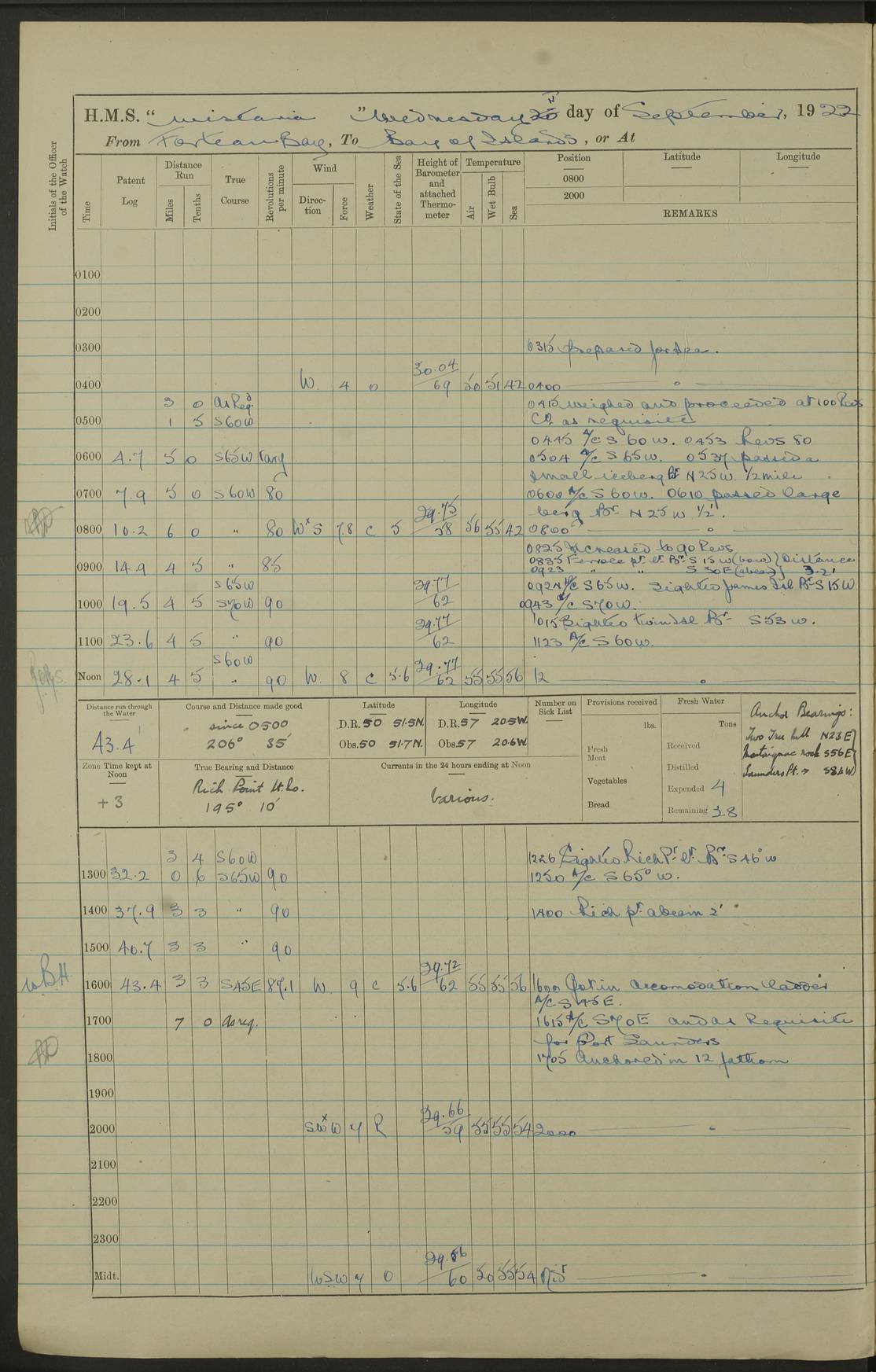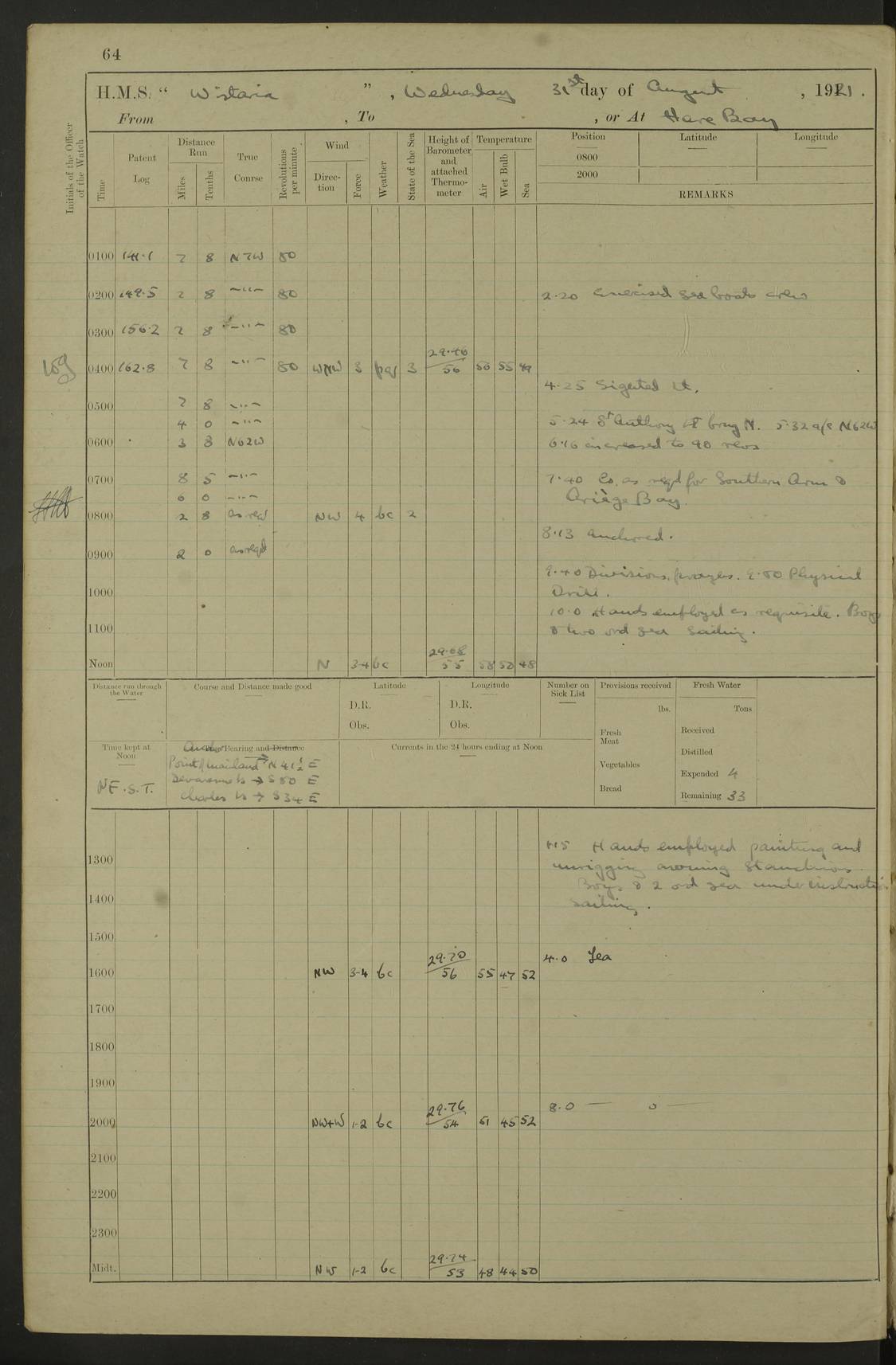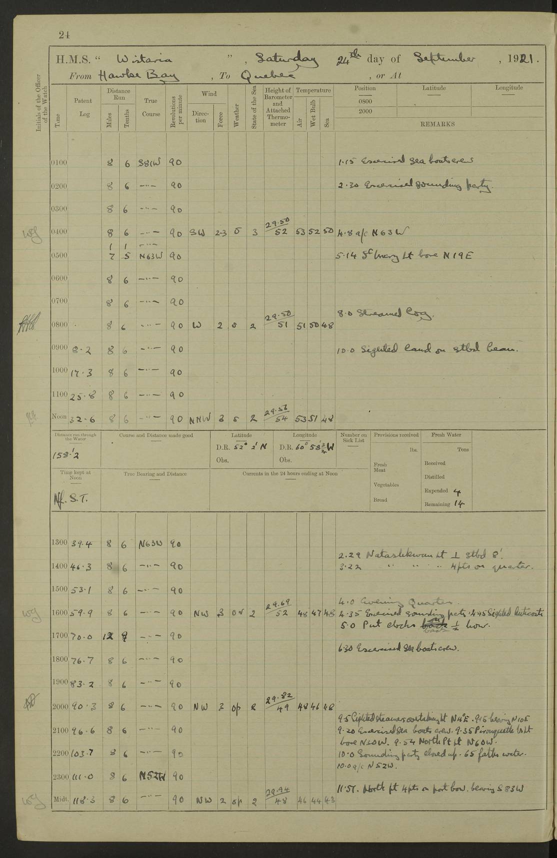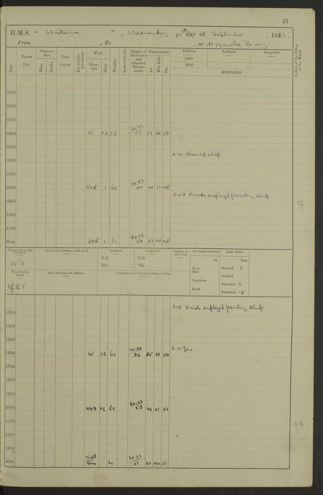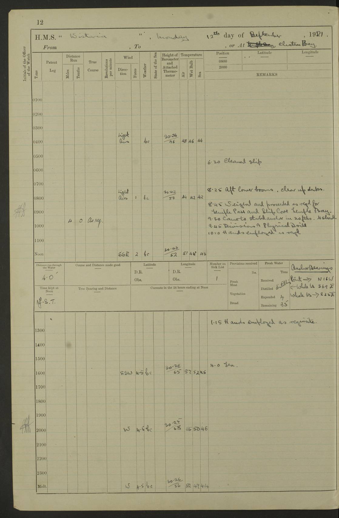 LOGS FOR SEPTEMBER 1921 4f73ca53a2fc8ea903000a89: (https://s3.amazonaws.com:443/oldweather/ADM53-93263/0003_1.jpg) 1 September 1921 At Hare Bay, Newfoundland Lat 48.85, Long -54.00 8.45am: Hands employed parts of ship 1.0pm: Hands mustered for monthly payment 1.20pm: Hands employed parts of ship 4f73ca53a2fc8ea903000a8a: (https://s3.amazonaws.com:443/oldweather/ADM53-93263/0004_0.jpg) 2 September 1921 At Hare Bay, Newfoundland Lat 48.85, Long -54.00 8.45am: Clear up decks for divisions 9.35am: Exercise Action 10.05am: Hands employed parts of ship 1.15pm: Hands employed parts of ship 4f73ca54a2fc8ea903000a8b: (https://s3.amazonaws.com:443/oldweather/ADM53-93263/0004_1.jpg) 3 September 1921 At Hare Bay, Newfoundland Lat 48.85, Long -54.00 8.45am: Cleaned ship 4.0pm: Evening Quarters 4f73ca54a2fc8ea903000a8c: (https://s3.amazonaws.com:443/oldweather/ADM53-93263/0005_0.jpg) 4 September 1921 At Hare Bay, Newfoundland Lat 48.85, Long -54.00 9.45am: Divisions & Prayers 4f73ca54a2fc8ea903000a8d: (https://s3.amazonaws.com:443/oldweather/ADM53-93263/0005_1.jpg) 5 September 1921 At Hare Bay, Newfoundland Lat 48.85, Long -54.00 8.45am: Hands employed preparing for 1” aiming rifle firing & parts of ship 9.40am: Hands resumed work 10.15am: Laid out target 10.30am: Carried out 1” aiming rifle firing 1.15pm: Hands employed parts of ship & drawing fresh water 7.0pm: Hoisted 2nd whaler & motor boat 4f73ca55a2fc8ea903000a8e: (https://s3.amazonaws.com:443/oldweather/ADM53-93263/0006_0.jpg) 6 September 1921 At Hare Bay, Newfoundland Lat 48.85, Long -54.00 9.50am: Hands employed parts of ship 1.15pm: Hands employed with parts of ship painting 4.0pm: Tea. One cell prisoner released 4f73ca55a2fc8ea903000a8f: (https://s3.amazonaws.com:443/oldweather/ADM53-93263/0006_1.jpg) 7 September 1921 At Hare Bay, Newfoundland Lat 48.85, Long -54.00 8.45am: Hands employed parts of ship 9.40am: Carried out 1” aiming rifle practice 10.40am: Hands carry on with work 1.15pm: Hands employed painting parts of ship 4f73ca55a2fc8ea903000a90: (https://s3.amazonaws.com:443/oldweather/ADM53-93263/0007_0.jpg) 8 September 1921 At Hare Bay Lat 48.85, Long -54.00 8.45am: Hands employed cleaning out boats and painting parts of ship 9.40am: Ordinary Seamen and boys to rifle drill, remainder hands part of ship 1.15pm: Hands employed cleaning skiffs and parts of ship Number on sick list: 2 4f73ca56a2fc8ea903000a91: (https://s3.amazonaws.com:443/oldweather/ADM53-93263/0007_1.jpg) 9 September 1921 At Hare Bay, Newfoundland Lat 48.85, Long -54.00 8.45am: Hands employed painting and scraping 9.45am: Rifle exercises 10.30am: Carried on with work 11.0am: Brought back target 6.0pm: Hoisted and secured boats for sea 9.30pm: Hoisted 1st whaler Number on sick list: 1 4f73ca56a2fc8ea903000a92: (https://s3.amazonaws.com:443/oldweather/ADM53-93263/0008_0.jpg) 10 September 1921 From Hare Bay to Chateau Bay Lat 51.98, Long -55.89 5.0am: Called 1st watch 5.30am: Watch fell in. Hoisted gangway 5.45am: Weighed and proceeded as requisite, 9 knots 10.40am: Sighted iceberg North 2.0pm: Course as required for entering Pitts Harbour 2.20pm: Came to with Starboard anchor 14½ faths water, veered 3 shackles Anchor bearings: East Point of Whale Island S6W; Point, right tangent, S72E; Islet, right tangent, S24E Number on sick list: 1 4f73ca57a2fc8ea903000a93: (https://s3.amazonaws.com:443/oldweather/ADM53-93263/0008_1.jpg) 11 September 1921 At Pitts Harbour, Chateau Bay Lat 51.98, Long -55.89 9.45am: Divisions 1.30pm: Libertymen landed 6.30pm: Hoisted both skiffs 8.30pm: Hoisted 1st whaler Number on sick list: 1 4f73ca57a2fc8ea903000a94: (https://s3.amazonaws.com:443/oldweather/ADM53-93263/0009_0.jpg) 12 September 1921 At Pitts Harbour, Chateau Bay Lat 51.98, Long -55.89 8.25am: Aft lower booms, clear up decks 8.45am: Weighed and proceeded as required for Temple Pass and Ship Cove Bay 9.30am: Came to Starboard anchor in 20 fths, 4 shackles 10.10am: Hands employed as required Anchor Bearings: Point, right tangent, N16W; left tangent, Whale Island S69E, Whale Island, right tangent, S35E 1.15pm: Hands employed as requisite Number on sick list: 1 4f73ca57a2fc8ea903000a95: (https://s3.amazonaws.com:443/oldweather/ADM53-93263/0009_1.jpg) 13 September 1921 At Chateau Bay Lat 51.98, Long -55.89 8.45am: Hands employed painting & scraping 10.0am: Exercised Control Parties 1.15pm: Hands employed painting & scraping Number on sick list: 1 4f73ca58a2fc8ea903000a96: (https://s3.amazonaws.com:443/oldweather/ADM53-93263/0010_0.jpg) 14 September 1921 At Chateau Bay Lat 51.98, Long -55.89 8.15am: Hands employed parts of ship and shipping .303 aiming rifles 9.45am: Ordinary Seamen & Boys & other non guns crew seamen rating to 4” drill & .303 aiming rifle practice 1.20pm: Hands employed getting up awnings, painting and scraping Number on sick list: 1 4f73ca58a2fc8ea903000a97: (https://s3.amazonaws.com:443/oldweather/ADM53-93263/0010_1.jpg) 15 September 1921 From Chateau Bay to Forteau Bay and at Chateau Bay and Forteau Bay Lat 51.61, Long -56.45 7.0am: Weighed and proceeded as required for temple pass 90 revs 9.38am: Altered course N7E and as required for firing lyddite and 1” aiming rifle shots at “growler” 11.0am: Saddle Island Lt on Starboard bow 11.52am: Saddle Island Lt on Starboard quarter 2.13pm: Amour Pt Lt Ho abeam 2.18pm: Altered course N40W and as required for anchorage 2.48pm: Came to port anchor Anchor Bearings: Admiral Pt pier, right tangent, N14W; Hawkins point, right tangent, N40E; left tangent, Coast S28W Number on sick list: 1 4f73ca58a2fc8ea903000a98: (https://s3.amazonaws.com:443/oldweather/ADM53-93263/0011_0.jpg) 16 September 1921 At Forteau Bay Lat 51.46, Long -56.93 9.0am: Clear up decks 9.45am: Landing party left ship 12.25am: Landing party returned Number on sick list: 1 4f73ca59a2fc8ea903000a99: (https://s3.amazonaws.com:443/oldweather/ADM53-93263/0011_1.jpg) 17 September 1921 At Forteau Bay Lat 51.46, Long -56.93 8.45am: Hands employed cleaning shi