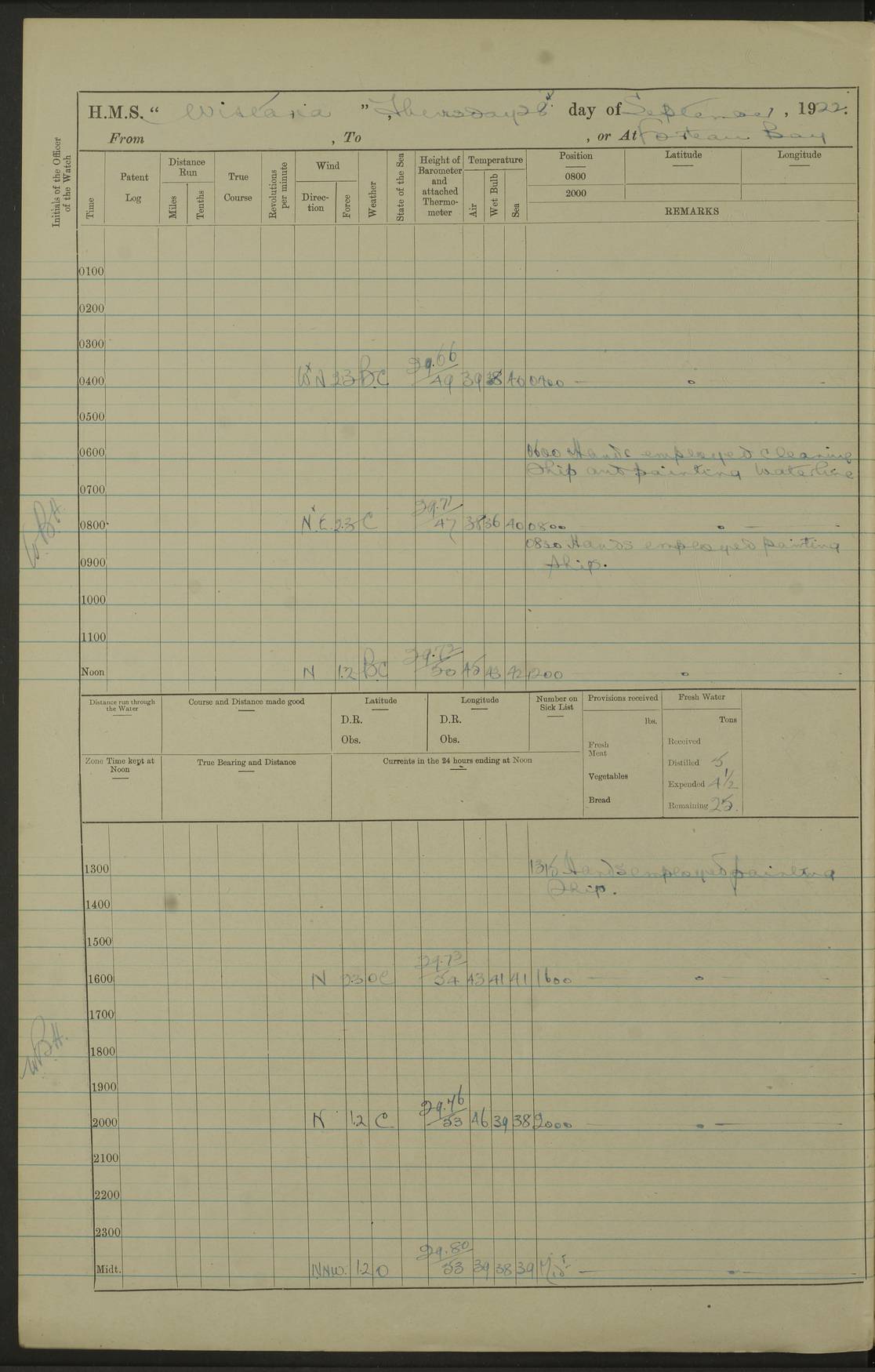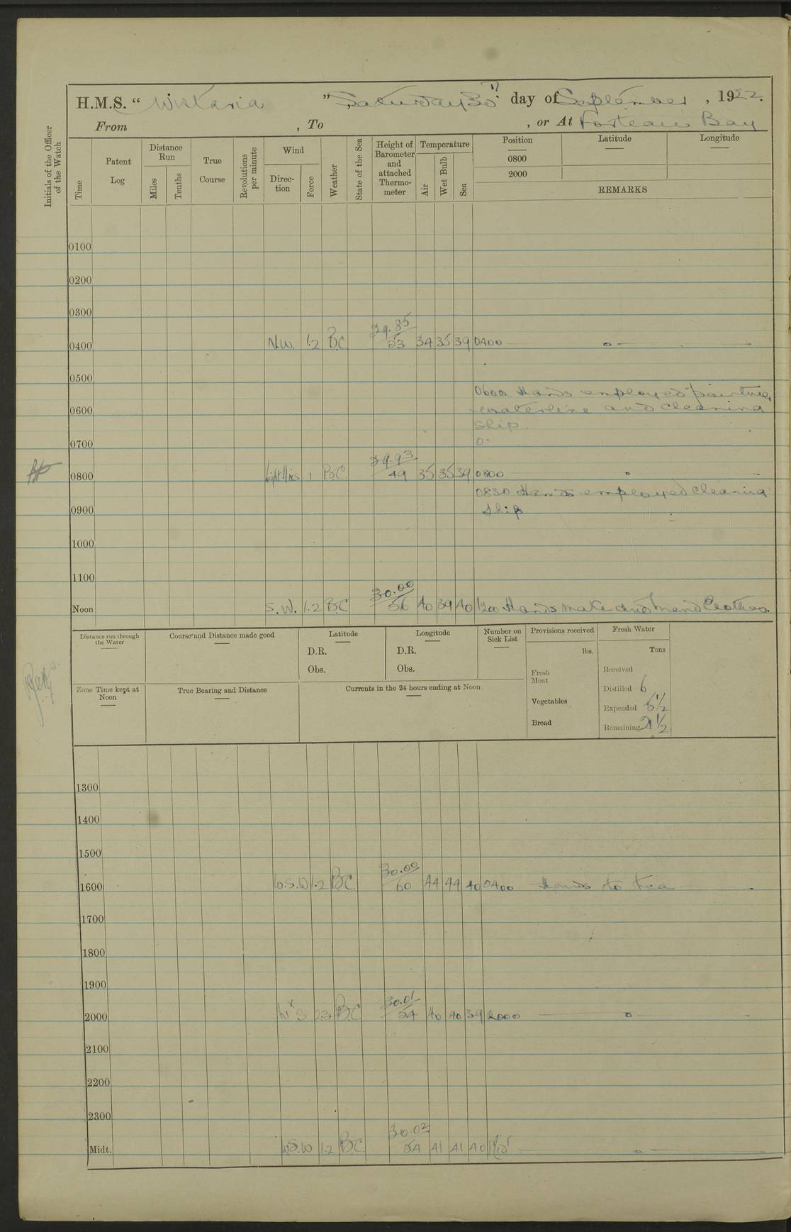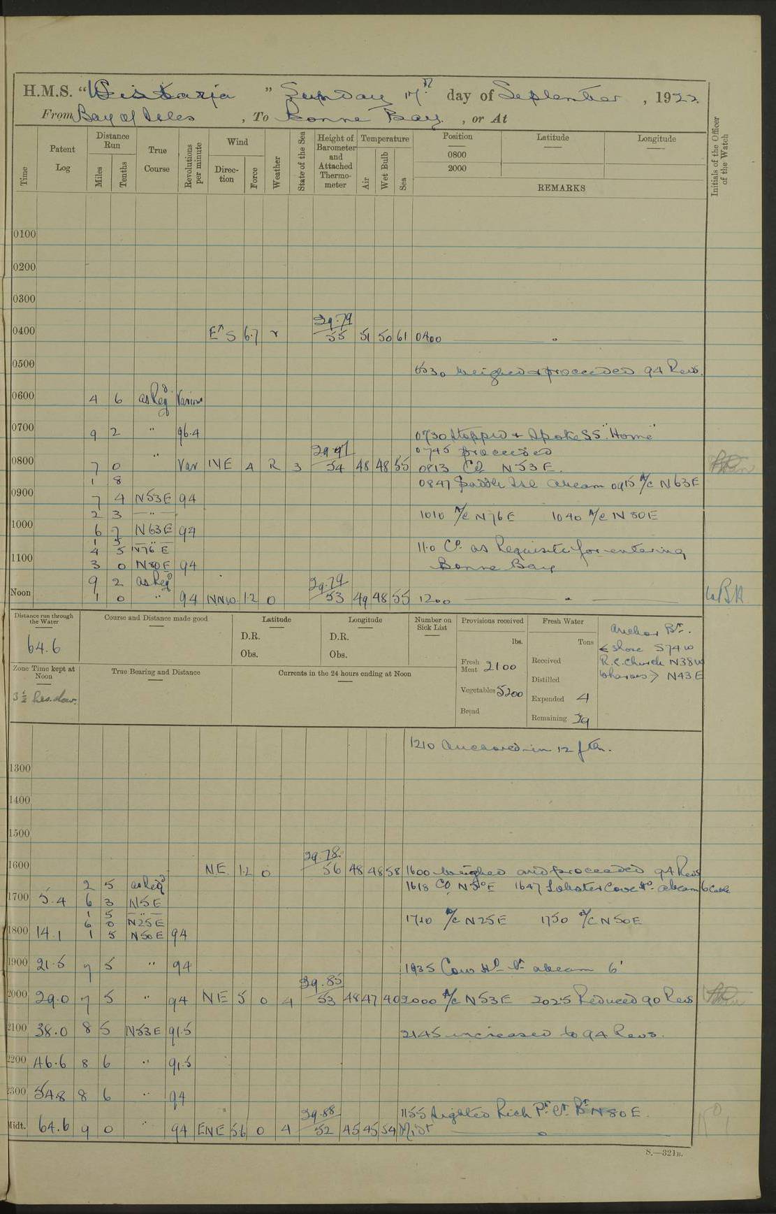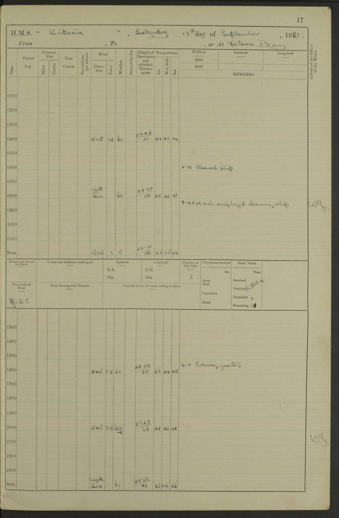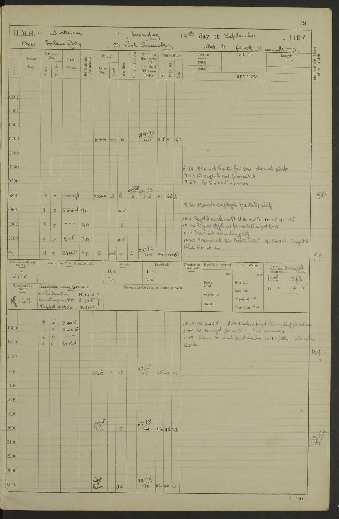 LOGS FOR SEPTEMBER 1921 4f73ca53a2fc8ea903000a89: (https://s3.amazonaws.com:443/oldweather/ADM53-93263/0003_1.jpg) 1 September 1921 At Hare Bay, Newfoundland Lat 48.85, Long -54.00 8.45am: Hands employed parts of ship 1.0pm: Hands mustered for monthly payment 1.20pm: Hands employed parts of ship 4f73ca53a2fc8ea903000a8a: (https://s3.amazonaws.com:443/oldweather/ADM53-93263/0004_0.jpg) 2 September 1921 At Hare Bay, Newfoundland Lat 48.85, Long -54.00 8.45am: Clear up decks for divisions 9.35am: Exercise Action 10.05am: Hands employed parts of ship 1.15pm: Hands employed parts of ship 4f73ca54a2fc8ea903000a8b: (https://s3.amazonaws.com:443/oldweather/ADM53-93263/0004_1.jpg) 3 September 1921 At Hare Bay, Newfoundland Lat 48.85, Long -54.00 8.45am: Cleaned ship 4.0pm: Evening Quarters 4f73ca54a2fc8ea903000a8c: (https://s3.amazonaws.com:443/oldweather/ADM53-93263/0005_0.jpg) 4 September 1921 At Hare Bay, Newfoundland Lat 48.85, Long -54.00 9.45am: Divisions & Prayers 4f73ca54a2fc8ea903000a8d: (https://s3.amazonaws.com:443/oldweather/ADM53-93263/0005_1.jpg) 5 September 1921 At Hare Bay, Newfoundland Lat 48.85, Long -54.00 8.45am: Hands employed preparing for 1” aiming rifle firing & parts of ship 9.40am: Hands resumed work 10.15am: Laid out target 10.30am: Carried out 1” aiming rifle firing 1.15pm: Hands employed parts of ship & drawing fresh water 7.0pm: Hoisted 2nd whaler & motor boat 4f73ca55a2fc8ea903000a8e: (https://s3.amazonaws.com:443/oldweather/ADM53-93263/0006_0.jpg) 6 September 1921 At Hare Bay, Newfoundland Lat 48.85, Long -54.00 9.50am: Hands employed parts of ship 1.15pm: Hands employed with parts of ship painting 4.0pm: Tea. One cell prisoner released 4f73ca55a2fc8ea903000a8f: (https://s3.amazonaws.com:443/oldweather/ADM53-93263/0006_1.jpg) 7 September 1921 At Hare Bay, Newfoundland Lat 48.85, Long -54.00 8.45am: Hands employed parts of ship 9.40am: Carried out 1” aiming rifle practice 10.40am: Hands carry on with work 1.15pm: Hands employed painting parts of ship 4f73ca55a2fc8ea903000a90: (https://s3.amazonaws.com:443/oldweather/ADM53-93263/0007_0.jpg) 8 September 1921 At Hare Bay Lat 48.85, Long -54.00 8.45am: Hands employed cleaning out boats and painting parts of ship 9.40am: Ordinary Seamen and boys to rifle drill, remainder hands part of ship 1.15pm: Hands employed cleaning skiffs and parts of ship Number on sick list: 2 4f73ca56a2fc8ea903000a91: (https://s3.amazonaws.com:443/oldweather/ADM53-93263/0007_1.jpg) 9 September 1921 At Hare Bay, Newfoundland Lat 48.85, Long -54.00 8.45am: Hands employed painting and scraping 9.45am: Rifle exercises 10.30am: Carried on with work 11.0am: Brought back target 6.0pm: Hoisted and secured boats for sea 9.30pm: Hoisted 1st whaler Number on sick list: 1 4f73ca56a2fc8ea903000a92: (https://s3.amazonaws.com:443/oldweather/ADM53-93263/0008_0.jpg) 10 September 1921 From Hare Bay to Chateau Bay Lat 51.98, Long -55.89 5.0am: Called 1st watch 5.30am: Watch fell in. Hoisted gangway 5.45am: Weighed and proceeded as requisite, 9 knots 10.40am: Sighted iceberg North 2.0pm: Course as required for entering Pitts Harbour 2.20pm: Came to with Starboard anchor 14½ faths water, veered 3 shackles Anchor bearings: East Point of Whale Island S6W; Point, right tangent, S72E; Islet, right tangent, S24E Number on sick list: 1 4f73ca57a2fc8ea903000a93: (https://s3.amazonaws.com:443/oldweather/ADM53-93263/0008_1.jpg) 11 September 1921 At Pitts Harbour, Chateau Bay Lat 51.98, Long -55.89 9.45am: Divisions 1.30pm: Libertymen landed 6.30pm: Hoisted both skiffs 8.30pm: Hoisted 1st whaler Number on sick list: 1 4f73ca57a2fc8ea903000a94: (https://s3.amazonaws.com:443/oldweather/ADM53-93263/0009_0.jpg) 12 September 1921 At Pitts Harbour, Chateau Bay Lat 51.98, Long -55.89 8.25am: Aft lower booms, clear up decks 8.45am: Weighed and proceeded as required for Temple Pass and Ship Cove Bay 9.30am: Came to Starboard anchor in 20 fths, 4 shackles 10.10am: Hands employed as required Anchor Bearings: Point, right tangent, N16W; left tangent, Whale Island S69E, Whale Island, right tangent, S35E 1.15pm: Hands employed as requisite Number on sick list: 1 4f73ca57a2fc8ea903000a95: (https://s3.amazonaws.com:443/oldweather/ADM53-93263/0009_1.jpg) 13 September 1921 At Chateau Bay Lat 51.98, Long -55.89 8.45am: Hands employed painting & scraping 10.0am: Exercised Control Parties 1.15pm: Hands employed painting & scraping Number on sick list: 1 4f73ca58a2fc8ea903000a96: (https://s3.amazonaws.com:443/oldweather/ADM53-93263/0010_0.jpg) 14 September 1921 At Chateau Bay Lat 51.98, Long -55.89 8.15am: Hands employed parts of ship and shipping .303 aiming rifles 9.45am: Ordinary Seamen & Boys & other non guns crew seamen rating to 4” drill & .303 aiming rifle practice 1.20pm: Hands employed getting up awnings, painting and scraping Number on sick list: 1 4f73ca58a2fc8ea903000a97: (https://s3.amazonaws.com:443/oldweather/ADM53-93263/0010_1.jpg) 15 September 1921 From Chateau Bay to Forteau Bay and at Chateau Bay and Forteau Bay Lat 51.61, Long -56.45 7.0am: Weighed and proceeded as required for temple pass 90 revs 9.38am: Altered course N7E and as required for firing lyddite and 1” aiming rifle shots at “growler” 11.0am: Saddle Island Lt on Starboard bow 11.52am: Saddle Island Lt on Starboard quarter 2.13pm: Amour Pt Lt Ho abeam 2.18pm: Altered course N40W and as required for anchorage 2.48pm: Came to port anchor Anchor Bearings: Admiral Pt pier, right tangent, N14W; Hawkins point, right tangent, N40E; left tangent, Coast S28W Number on sick list: 1 4f73ca58a2fc8ea903000a98: (https://s3.amazonaws.com:443/oldweather/ADM53-93263/0011_0.jpg) 16 September 1921 At Forteau Bay Lat 51.46, Long -56.93 9.0am: Clear up decks 9.45am: Landing party left ship 12.25am: Landing party returned Number on sick list: 1 4f73ca59a2fc8ea903000a99: (https://s3.amazonaws.com:443/oldweather/ADM53-93263/0011_1.jpg) 17 September 1921 At Forteau Bay Lat 51.46, Long -56.93 8.45am: Hands employed cleaning shi