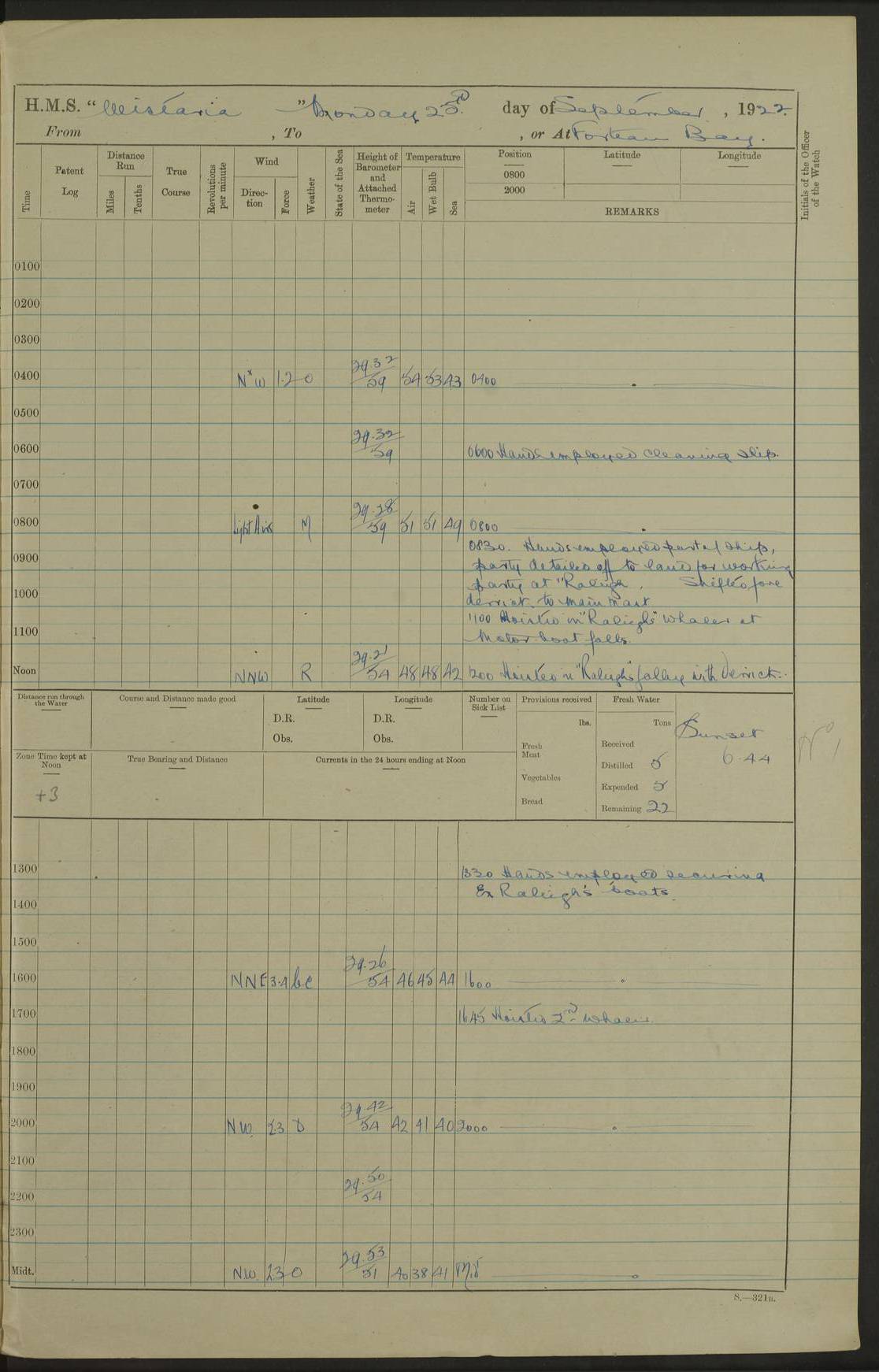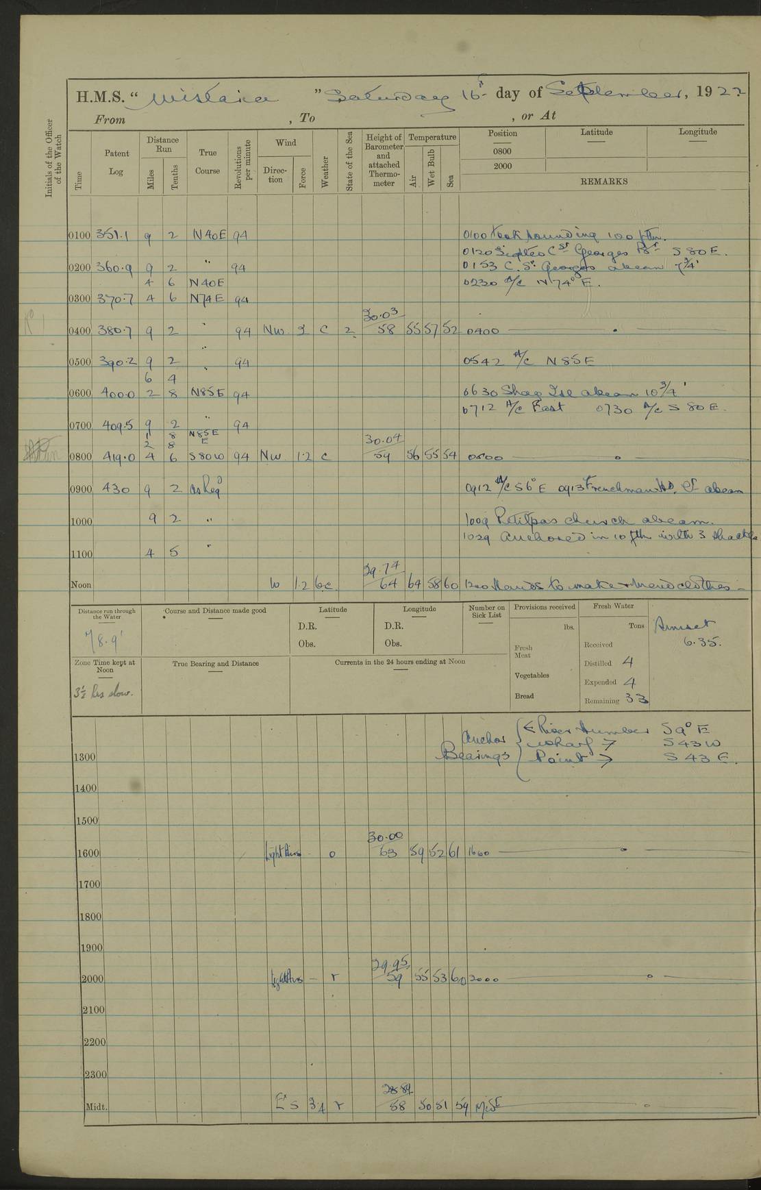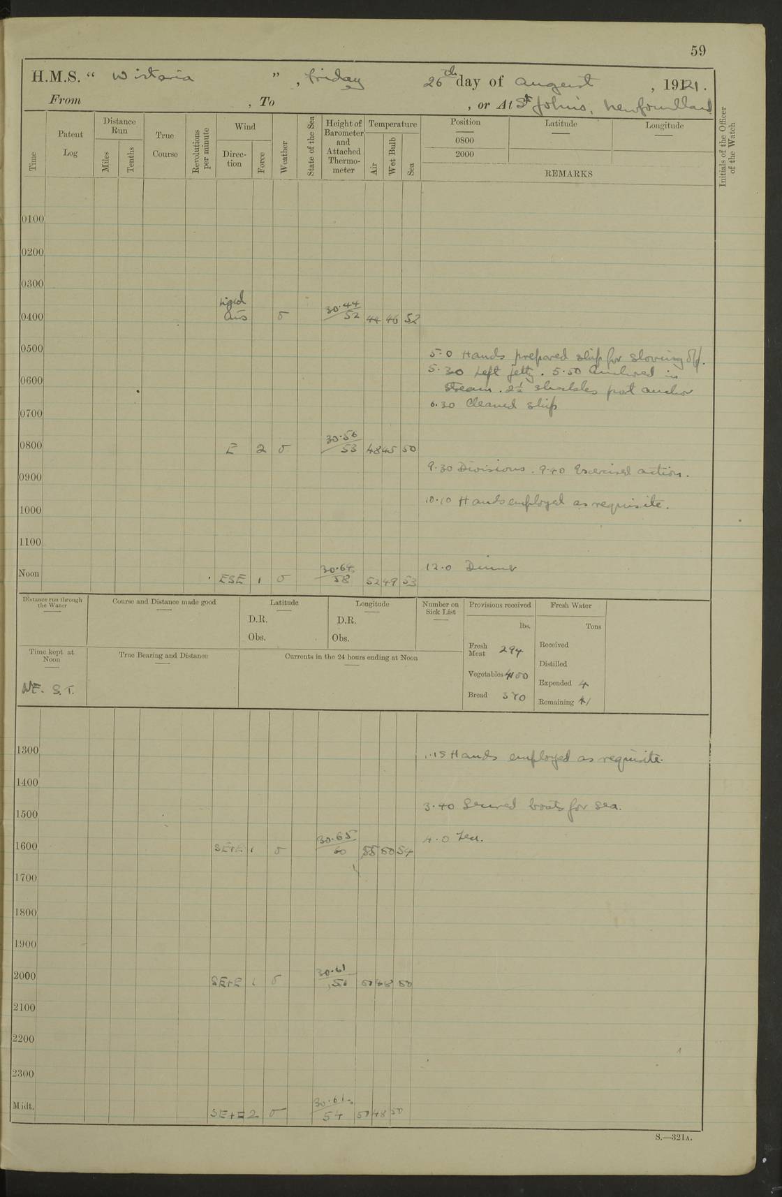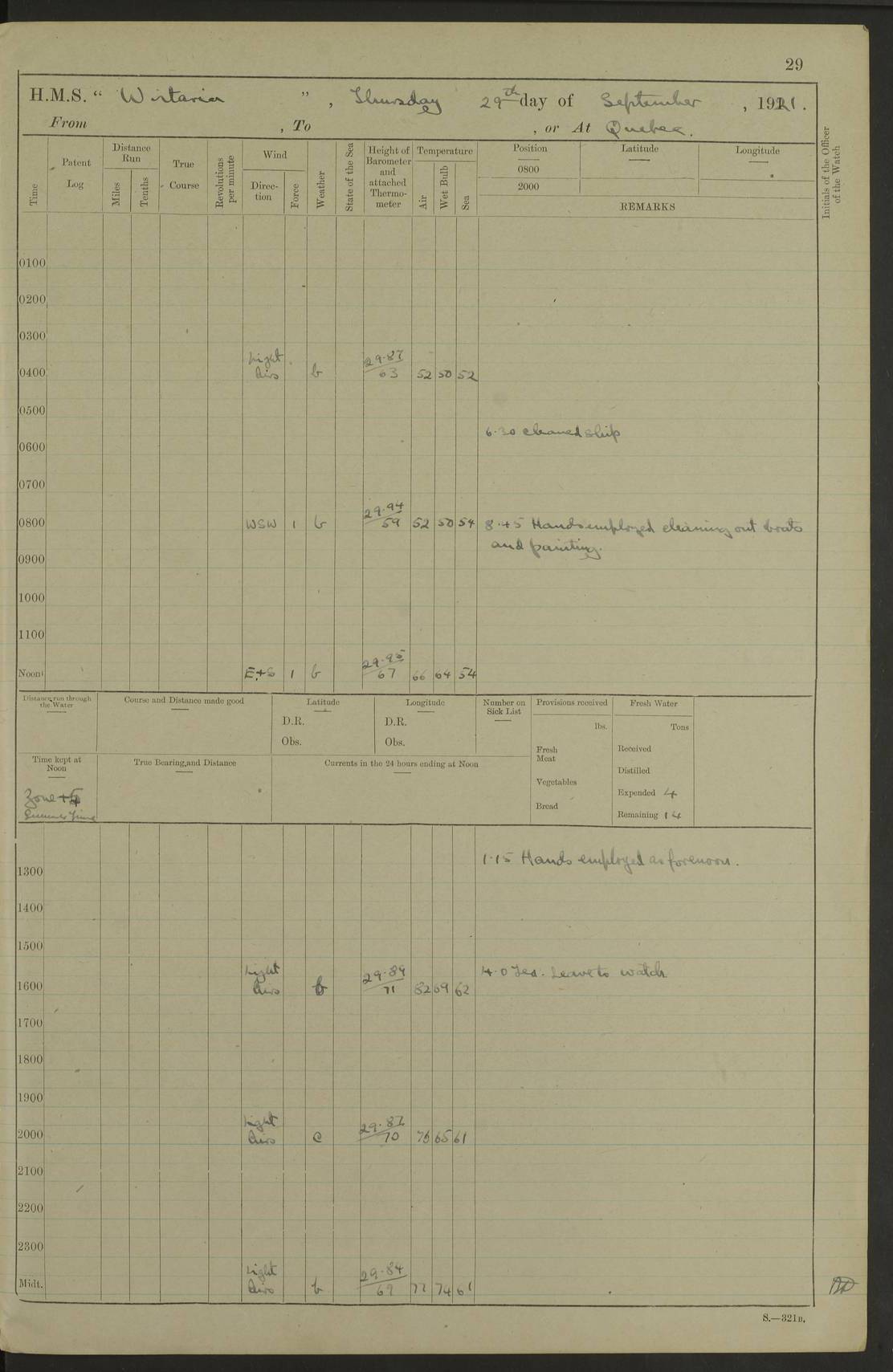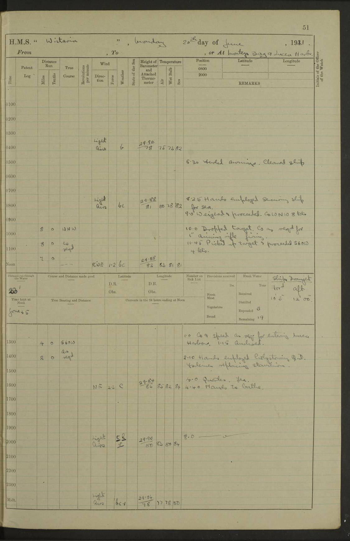 LOGS FOR SEPTEMBER 1921 4f73ca53a2fc8ea903000a89: (https://s3.amazonaws.com:443/oldweather/ADM53-93263/0003_1.jpg) 1 September 1921 At Hare Bay, Newfoundland Lat 48.85, Long -54.00 8.45am: Hands employed parts of ship 1.0pm: Hands mustered for monthly payment 1.20pm: Hands employed parts of ship 4f73ca53a2fc8ea903000a8a: (https://s3.amazonaws.com:443/oldweather/ADM53-93263/0004_0.jpg) 2 September 1921 At Hare Bay, Newfoundland Lat 48.85, Long -54.00 8.45am: Clear up decks for divisions 9.35am: Exercise Action 10.05am: Hands employed parts of ship 1.15pm: Hands employed parts of ship 4f73ca54a2fc8ea903000a8b: (https://s3.amazonaws.com:443/oldweather/ADM53-93263/0004_1.jpg) 3 September 1921 At Hare Bay, Newfoundland Lat 48.85, Long -54.00 8.45am: Cleaned ship 4.0pm: Evening Quarters 4f73ca54a2fc8ea903000a8c: (https://s3.amazonaws.com:443/oldweather/ADM53-93263/0005_0.jpg) 4 September 1921 At Hare Bay, Newfoundland Lat 48.85, Long -54.00 9.45am: Divisions & Prayers 4f73ca54a2fc8ea903000a8d: (https://s3.amazonaws.com:443/oldweather/ADM53-93263/0005_1.jpg) 5 September 1921 At Hare Bay, Newfoundland Lat 48.85, Long -54.00 8.45am: Hands employed preparing for 1” aiming rifle firing & parts of ship 9.40am: Hands resumed work 10.15am: Laid out target 10.30am: Carried out 1” aiming rifle firing 1.15pm: Hands employed parts of ship & drawing fresh water 7.0pm: Hoisted 2nd whaler & motor boat 4f73ca55a2fc8ea903000a8e: (https://s3.amazonaws.com:443/oldweather/ADM53-93263/0006_0.jpg) 6 September 1921 At Hare Bay, Newfoundland Lat 48.85, Long -54.00 9.50am: Hands employed parts of ship 1.15pm: Hands employed with parts of ship painting 4.0pm: Tea. One cell prisoner released 4f73ca55a2fc8ea903000a8f: (https://s3.amazonaws.com:443/oldweather/ADM53-93263/0006_1.jpg) 7 September 1921 At Hare Bay, Newfoundland Lat 48.85, Long -54.00 8.45am: Hands employed parts of ship 9.40am: Carried out 1” aiming rifle practice 10.40am: Hands carry on with work 1.15pm: Hands employed painting parts of ship 4f73ca55a2fc8ea903000a90: (https://s3.amazonaws.com:443/oldweather/ADM53-93263/0007_0.jpg) 8 September 1921 At Hare Bay Lat 48.85, Long -54.00 8.45am: Hands employed cleaning out boats and painting parts of ship 9.40am: Ordinary Seamen and boys to rifle drill, remainder hands part of ship 1.15pm: Hands employed cleaning skiffs and parts of ship Number on sick list: 2 4f73ca56a2fc8ea903000a91: (https://s3.amazonaws.com:443/oldweather/ADM53-93263/0007_1.jpg) 9 September 1921 At Hare Bay, Newfoundland Lat 48.85, Long -54.00 8.45am: Hands employed painting and scraping 9.45am: Rifle exercises 10.30am: Carried on with work 11.0am: Brought back target 6.0pm: Hoisted and secured boats for sea 9.30pm: Hoisted 1st whaler Number on sick list: 1 4f73ca56a2fc8ea903000a92: (https://s3.amazonaws.com:443/oldweather/ADM53-93263/0008_0.jpg) 10 September 1921 From Hare Bay to Chateau Bay Lat 51.98, Long -55.89 5.0am: Called 1st watch 5.30am: Watch fell in. Hoisted gangway 5.45am: Weighed and proceeded as requisite, 9 knots 10.40am: Sighted iceberg North 2.0pm: Course as required for entering Pitts Harbour 2.20pm: Came to with Starboard anchor 14½ faths water, veered 3 shackles Anchor bearings: East Point of Whale Island S6W; Point, right tangent, S72E; Islet, right tangent, S24E Number on sick list: 1 4f73ca57a2fc8ea903000a93: (https://s3.amazonaws.com:443/oldweather/ADM53-93263/0008_1.jpg) 11 September 1921 At Pitts Harbour, Chateau Bay Lat 51.98, Long -55.89 9.45am: Divisions 1.30pm: Libertymen landed 6.30pm: Hoisted both skiffs 8.30pm: Hoisted 1st whaler Number on sick list: 1 4f73ca57a2fc8ea903000a94: (https://s3.amazonaws.com:443/oldweather/ADM53-93263/0009_0.jpg) 12 September 1921 At Pitts Harbour, Chateau Bay Lat 51.98, Long -55.89 8.25am: Aft lower booms, clear up decks 8.45am: Weighed and proceeded as required for Temple Pass and Ship Cove Bay 9.30am: Came to Starboard anchor in 20 fths, 4 shackles 10.10am: Hands employed as required Anchor Bearings: Point, right tangent, N16W; left tangent, Whale Island S69E, Whale Island, right tangent, S35E 1.15pm: Hands employed as requisite Number on sick list: 1 4f73ca57a2fc8ea903000a95: (https://s3.amazonaws.com:443/oldweather/ADM53-93263/0009_1.jpg) 13 September 1921 At Chateau Bay Lat 51.98, Long -55.89 8.45am: Hands employed painting & scraping 10.0am: Exercised Control Parties 1.15pm: Hands employed painting & scraping Number on sick list: 1 4f73ca58a2fc8ea903000a96: (https://s3.amazonaws.com:443/oldweather/ADM53-93263/0010_0.jpg) 14 September 1921 At Chateau Bay Lat 51.98, Long -55.89 8.15am: Hands employed parts of ship and shipping .303 aiming rifles 9.45am: Ordinary Seamen & Boys & other non guns crew seamen rating to 4” drill & .303 aiming rifle practice 1.20pm: Hands employed getting up awnings, painting and scraping Number on sick list: 1 4f73ca58a2fc8ea903000a97: (https://s3.amazonaws.com:443/oldweather/ADM53-93263/0010_1.jpg) 15 September 1921 From Chateau Bay to Forteau Bay and at Chateau Bay and Forteau Bay Lat 51.61, Long -56.45 7.0am: Weighed and proceeded as required for temple pass 90 revs 9.38am: Altered course N7E and as required for firing lyddite and 1” aiming rifle shots at “growler” 11.0am: Saddle Island Lt on Starboard bow 11.52am: Saddle Island Lt on Starboard quarter 2.13pm: Amour Pt Lt Ho abeam 2.18pm: Altered course N40W and as required for anchorage 2.48pm: Came to port anchor Anchor Bearings: Admiral Pt pier, right tangent, N14W; Hawkins point, right tangent, N40E; left tangent, Coast S28W Number on sick list: 1 4f73ca58a2fc8ea903000a98: (https://s3.amazonaws.com:443/oldweather/ADM53-93263/0011_0.jpg) 16 September 1921 At Forteau Bay Lat 51.46, Long -56.93 9.0am: Clear up decks 9.45am: Landing party left ship 12.25am: Landing party returned Number on sick list: 1 4f73ca59a2fc8ea903000a99: (https://s3.amazonaws.com:443/oldweather/ADM53-93263/0011_1.jpg) 17 September 1921 At Forteau Bay Lat 51.46, Long -56.93 8.45am: Hands employed cleaning shi