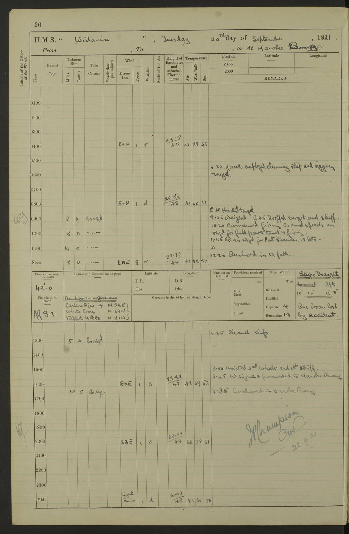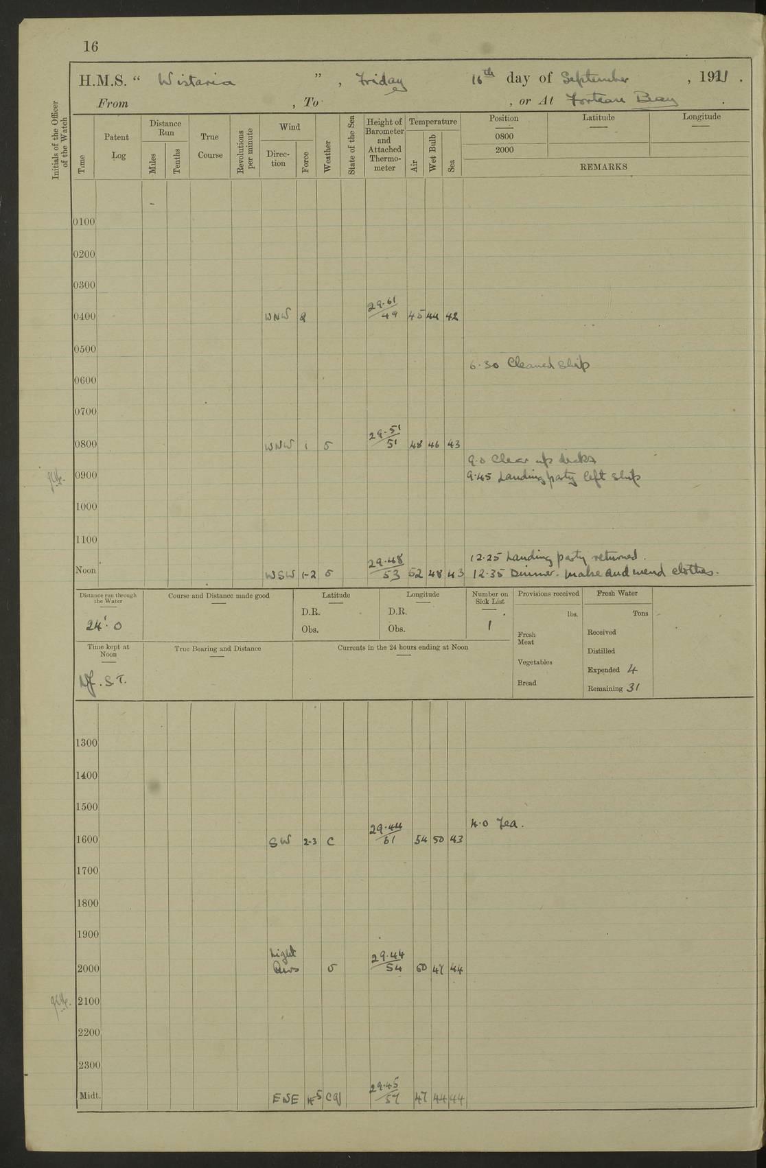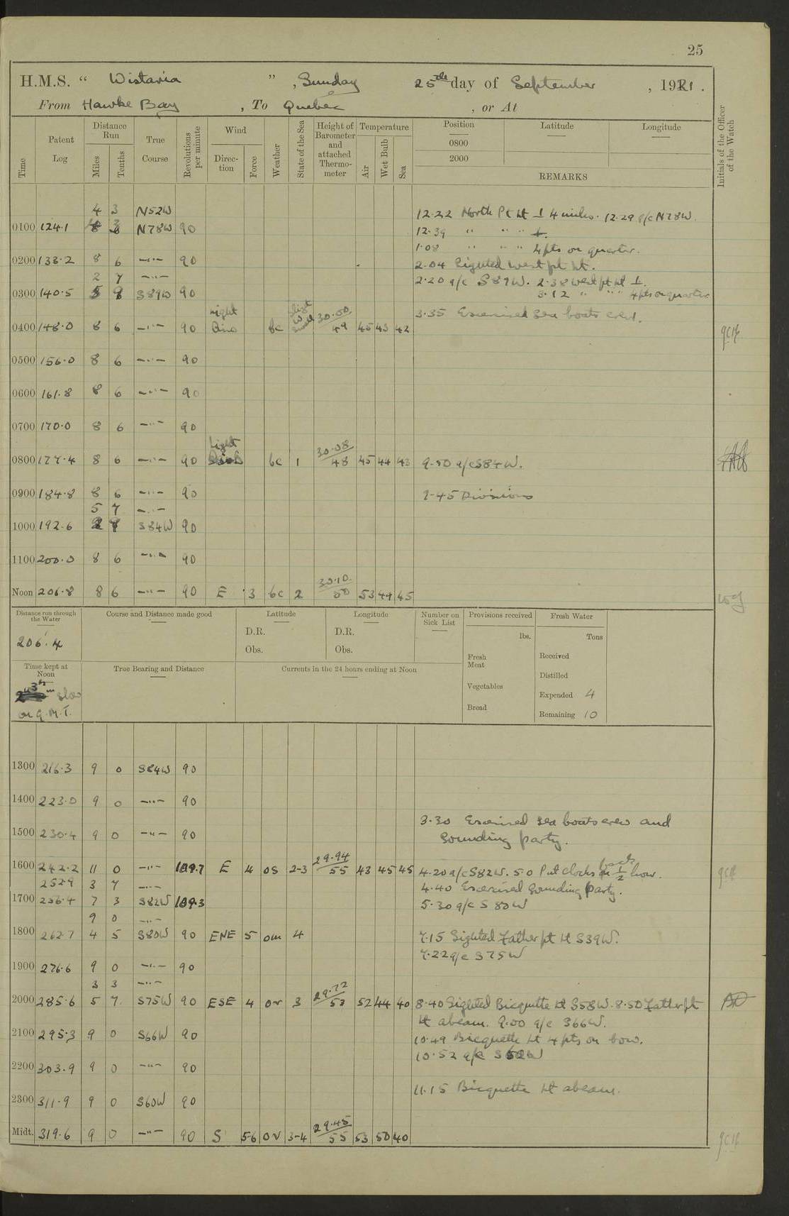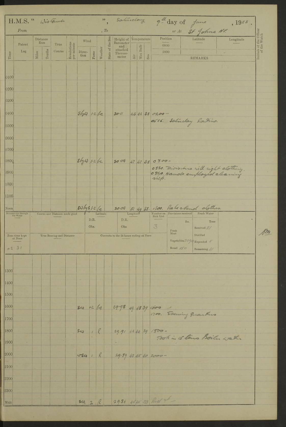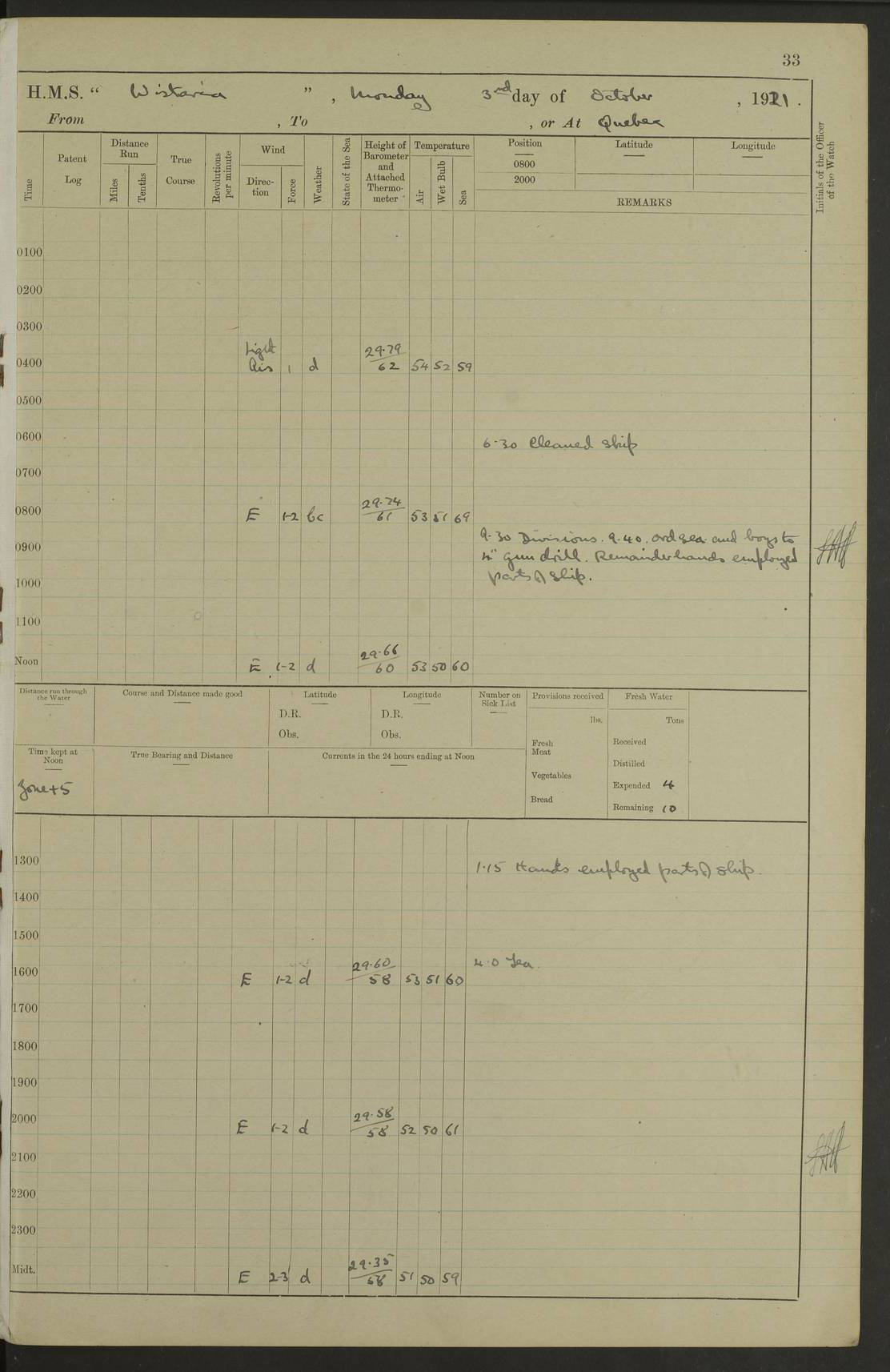 LOGS FOR SEPTEMBER 1921 4f73ca53a2fc8ea903000a89: (https://s3.amazonaws.com:443/oldweather/ADM53-93263/0003_1.jpg) 1 September 1921 At Hare Bay, Newfoundland Lat 48.85, Long -54.00 8.45am: Hands employed parts of ship 1.0pm: Hands mustered for monthly payment 1.20pm: Hands employed parts of ship 4f73ca53a2fc8ea903000a8a: (https://s3.amazonaws.com:443/oldweather/ADM53-93263/0004_0.jpg) 2 September 1921 At Hare Bay, Newfoundland Lat 48.85, Long -54.00 8.45am: Clear up decks for divisions 9.35am: Exercise Action 10.05am: Hands employed parts of ship 1.15pm: Hands employed parts of ship 4f73ca54a2fc8ea903000a8b: (https://s3.amazonaws.com:443/oldweather/ADM53-93263/0004_1.jpg) 3 September 1921 At Hare Bay, Newfoundland Lat 48.85, Long -54.00 8.45am: Cleaned ship 4.0pm: Evening Quarters 4f73ca54a2fc8ea903000a8c: (https://s3.amazonaws.com:443/oldweather/ADM53-93263/0005_0.jpg) 4 September 1921 At Hare Bay, Newfoundland Lat 48.85, Long -54.00 9.45am: Divisions & Prayers 4f73ca54a2fc8ea903000a8d: (https://s3.amazonaws.com:443/oldweather/ADM53-93263/0005_1.jpg) 5 September 1921 At Hare Bay, Newfoundland Lat 48.85, Long -54.00 8.45am: Hands employed preparing for 1” aiming rifle firing & parts of ship 9.40am: Hands resumed work 10.15am: Laid out target 10.30am: Carried out 1” aiming rifle firing 1.15pm: Hands employed parts of ship & drawing fresh water 7.0pm: Hoisted 2nd whaler & motor boat 4f73ca55a2fc8ea903000a8e: (https://s3.amazonaws.com:443/oldweather/ADM53-93263/0006_0.jpg) 6 September 1921 At Hare Bay, Newfoundland Lat 48.85, Long -54.00 9.50am: Hands employed parts of ship 1.15pm: Hands employed with parts of ship painting 4.0pm: Tea. One cell prisoner released 4f73ca55a2fc8ea903000a8f: (https://s3.amazonaws.com:443/oldweather/ADM53-93263/0006_1.jpg) 7 September 1921 At Hare Bay, Newfoundland Lat 48.85, Long -54.00 8.45am: Hands employed parts of ship 9.40am: Carried out 1” aiming rifle practice 10.40am: Hands carry on with work 1.15pm: Hands employed painting parts of ship 4f73ca55a2fc8ea903000a90: (https://s3.amazonaws.com:443/oldweather/ADM53-93263/0007_0.jpg) 8 September 1921 At Hare Bay Lat 48.85, Long -54.00 8.45am: Hands employed cleaning out boats and painting parts of ship 9.40am: Ordinary Seamen and boys to rifle drill, remainder hands part of ship 1.15pm: Hands employed cleaning skiffs and parts of ship Number on sick list: 2 4f73ca56a2fc8ea903000a91: (https://s3.amazonaws.com:443/oldweather/ADM53-93263/0007_1.jpg) 9 September 1921 At Hare Bay, Newfoundland Lat 48.85, Long -54.00 8.45am: Hands employed painting and scraping 9.45am: Rifle exercises 10.30am: Carried on with work 11.0am: Brought back target 6.0pm: Hoisted and secured boats for sea 9.30pm: Hoisted 1st whaler Number on sick list: 1 4f73ca56a2fc8ea903000a92: (https://s3.amazonaws.com:443/oldweather/ADM53-93263/0008_0.jpg) 10 September 1921 From Hare Bay to Chateau Bay Lat 51.98, Long -55.89 5.0am: Called 1st watch 5.30am: Watch fell in. Hoisted gangway 5.45am: Weighed and proceeded as requisite, 9 knots 10.40am: Sighted iceberg North 2.0pm: Course as required for entering Pitts Harbour 2.20pm: Came to with Starboard anchor 14½ faths water, veered 3 shackles Anchor bearings: East Point of Whale Island S6W; Point, right tangent, S72E; Islet, right tangent, S24E Number on sick list: 1 4f73ca57a2fc8ea903000a93: (https://s3.amazonaws.com:443/oldweather/ADM53-93263/0008_1.jpg) 11 September 1921 At Pitts Harbour, Chateau Bay Lat 51.98, Long -55.89 9.45am: Divisions 1.30pm: Libertymen landed 6.30pm: Hoisted both skiffs 8.30pm: Hoisted 1st whaler Number on sick list: 1 4f73ca57a2fc8ea903000a94: (https://s3.amazonaws.com:443/oldweather/ADM53-93263/0009_0.jpg) 12 September 1921 At Pitts Harbour, Chateau Bay Lat 51.98, Long -55.89 8.25am: Aft lower booms, clear up decks 8.45am: Weighed and proceeded as required for Temple Pass and Ship Cove Bay 9.30am: Came to Starboard anchor in 20 fths, 4 shackles 10.10am: Hands employed as required Anchor Bearings: Point, right tangent, N16W; left tangent, Whale Island S69E, Whale Island, right tangent, S35E 1.15pm: Hands employed as requisite Number on sick list: 1 4f73ca57a2fc8ea903000a95: (https://s3.amazonaws.com:443/oldweather/ADM53-93263/0009_1.jpg) 13 September 1921 At Chateau Bay Lat 51.98, Long -55.89 8.45am: Hands employed painting & scraping 10.0am: Exercised Control Parties 1.15pm: Hands employed painting & scraping Number on sick list: 1 4f73ca58a2fc8ea903000a96: (https://s3.amazonaws.com:443/oldweather/ADM53-93263/0010_0.jpg) 14 September 1921 At Chateau Bay Lat 51.98, Long -55.89 8.15am: Hands employed parts of ship and shipping .303 aiming rifles 9.45am: Ordinary Seamen & Boys & other non guns crew seamen rating to 4” drill & .303 aiming rifle practice 1.20pm: Hands employed getting up awnings, painting and scraping Number on sick list: 1 4f73ca58a2fc8ea903000a97: (https://s3.amazonaws.com:443/oldweather/ADM53-93263/0010_1.jpg) 15 September 1921 From Chateau Bay to Forteau Bay and at Chateau Bay and Forteau Bay Lat 51.61, Long -56.45 7.0am: Weighed and proceeded as required for temple pass 90 revs 9.38am: Altered course N7E and as required for firing lyddite and 1” aiming rifle shots at “growler” 11.0am: Saddle Island Lt on Starboard bow 11.52am: Saddle Island Lt on Starboard quarter 2.13pm: Amour Pt Lt Ho abeam 2.18pm: Altered course N40W and as required for anchorage 2.48pm: Came to port anchor Anchor Bearings: Admiral Pt pier, right tangent, N14W; Hawkins point, right tangent, N40E; left tangent, Coast S28W Number on sick list: 1 4f73ca58a2fc8ea903000a98: (https://s3.amazonaws.com:443/oldweather/ADM53-93263/0011_0.jpg) 16 September 1921 At Forteau Bay Lat 51.46, Long -56.93 9.0am: Clear up decks 9.45am: Landing party left ship 12.25am: Landing party returned Number on sick list: 1 4f73ca59a2fc8ea903000a99: (https://s3.amazonaws.com:443/oldweather/ADM53-93263/0011_1.jpg) 17 September 1921 At Forteau Bay Lat 51.46, Long -56.93 8.45am: Hands employed cleaning shi
