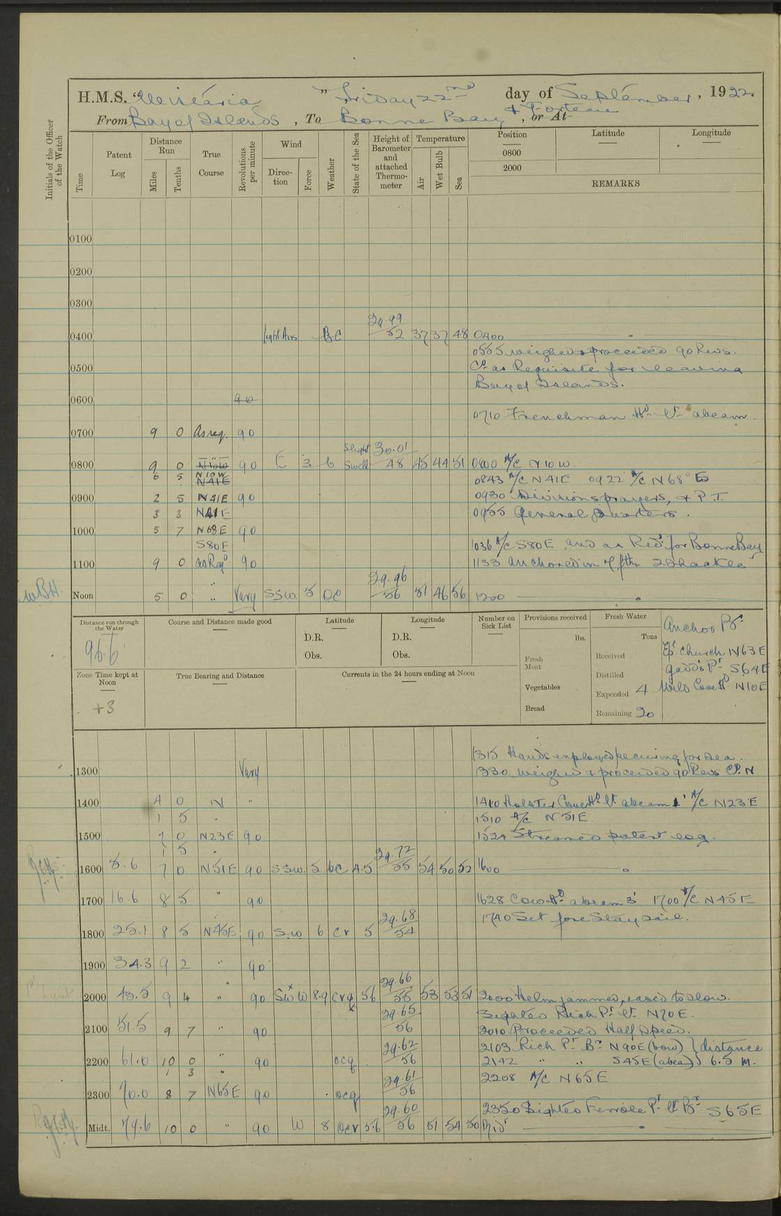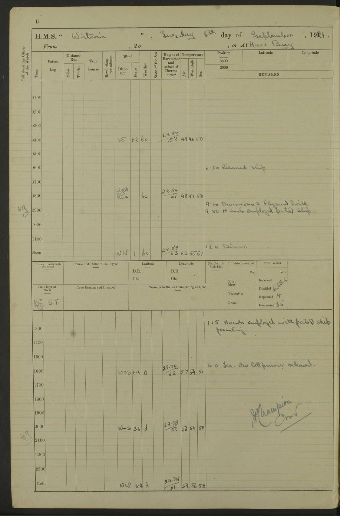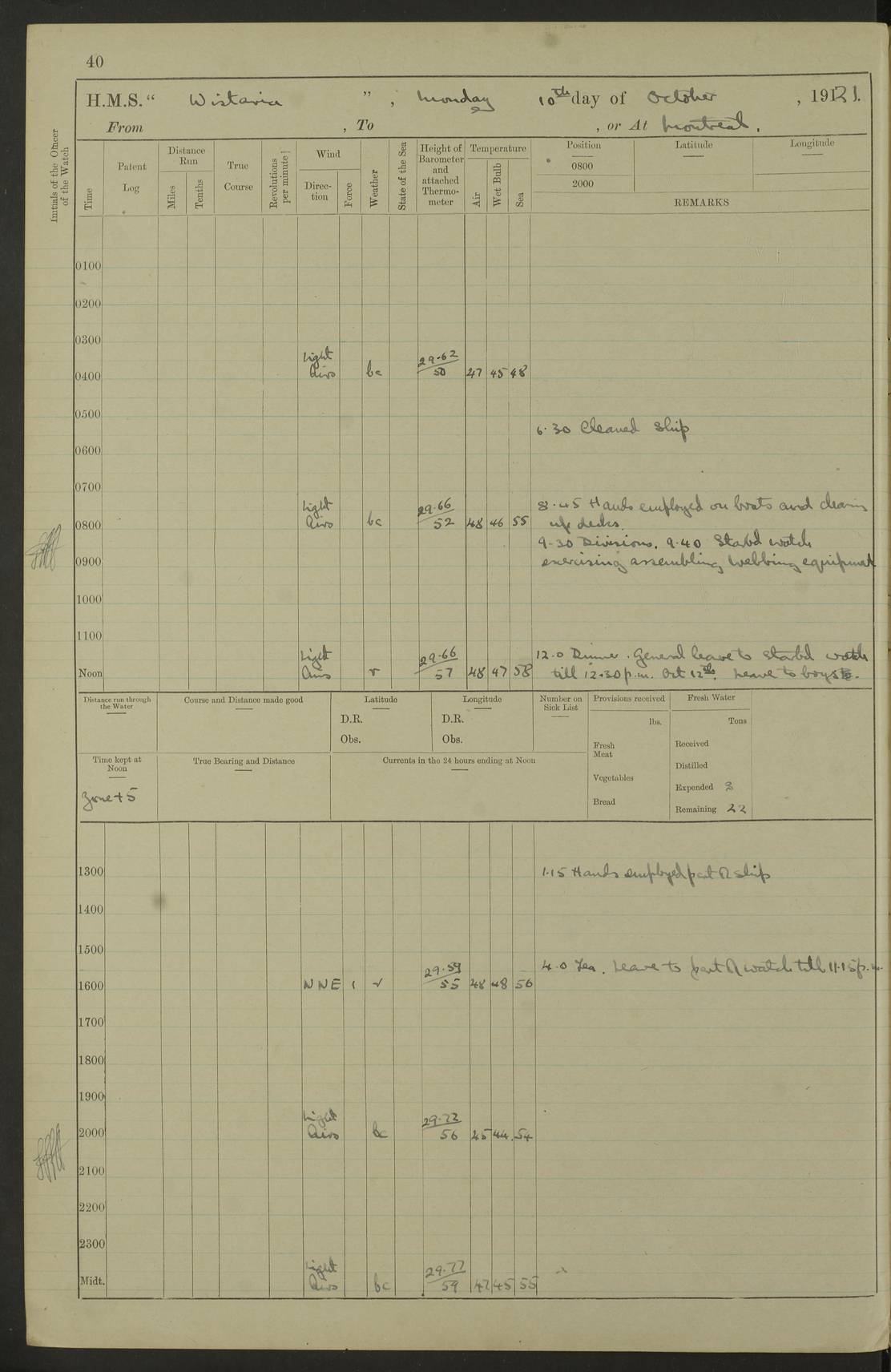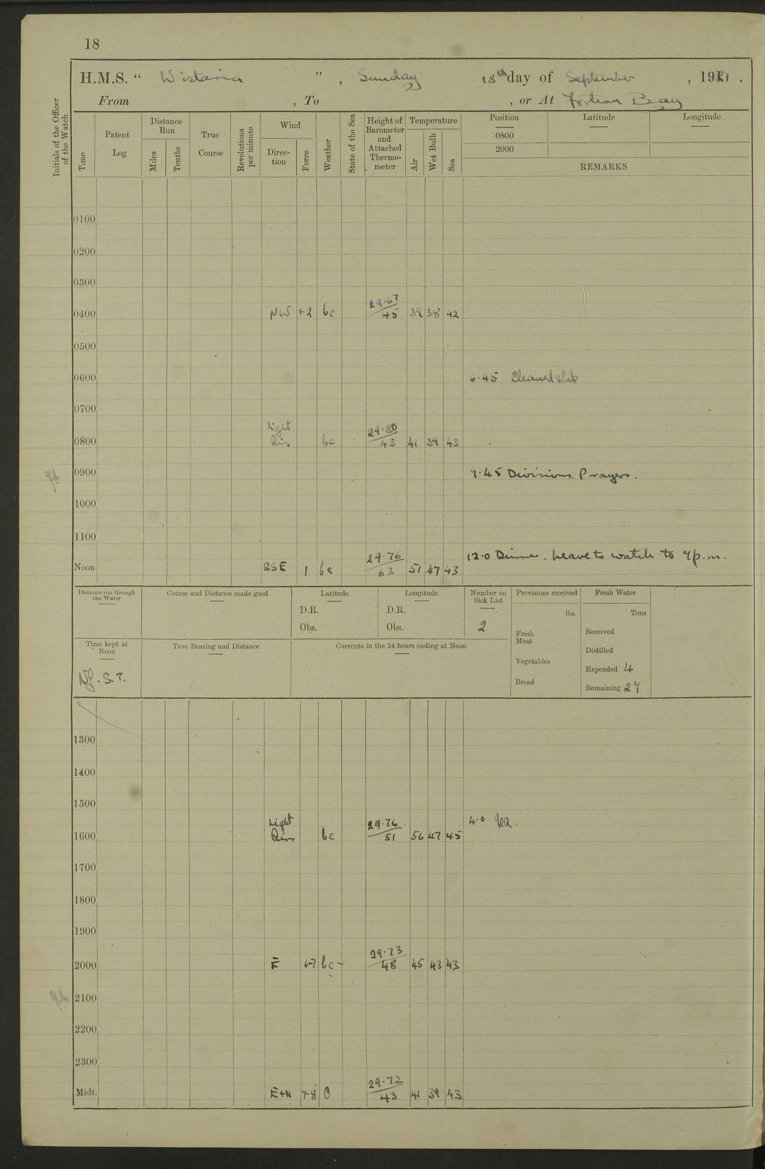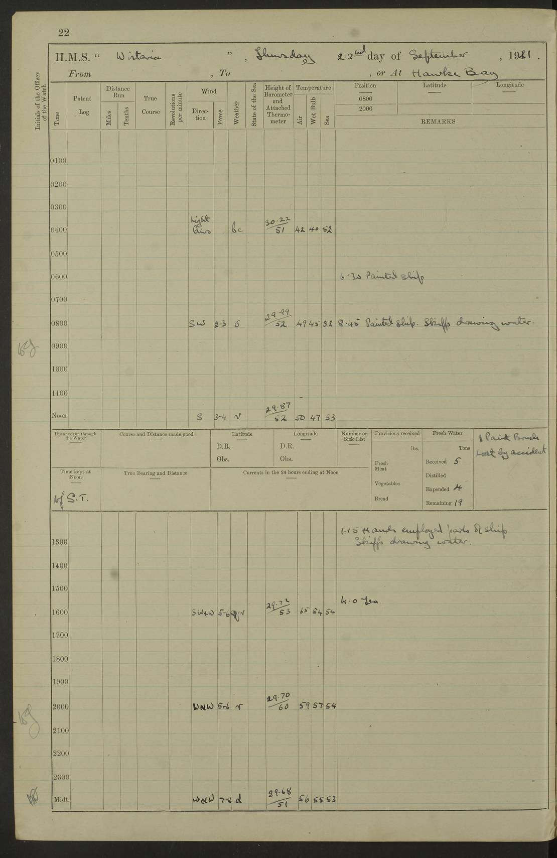 LOGS FOR SEPTEMBER 1921 4f73ca53a2fc8ea903000a89: (https://s3.amazonaws.com:443/oldweather/ADM53-93263/0003_1.jpg) 1 September 1921 At Hare Bay, Newfoundland Lat 48.85, Long -54.00 8.45am: Hands employed parts of ship 1.0pm: Hands mustered for monthly payment 1.20pm: Hands employed parts of ship 4f73ca53a2fc8ea903000a8a: (https://s3.amazonaws.com:443/oldweather/ADM53-93263/0004_0.jpg) 2 September 1921 At Hare Bay, Newfoundland Lat 48.85, Long -54.00 8.45am: Clear up decks for divisions 9.35am: Exercise Action 10.05am: Hands employed parts of ship 1.15pm: Hands employed parts of ship 4f73ca54a2fc8ea903000a8b: (https://s3.amazonaws.com:443/oldweather/ADM53-93263/0004_1.jpg) 3 September 1921 At Hare Bay, Newfoundland Lat 48.85, Long -54.00 8.45am: Cleaned ship 4.0pm: Evening Quarters 4f73ca54a2fc8ea903000a8c: (https://s3.amazonaws.com:443/oldweather/ADM53-93263/0005_0.jpg) 4 September 1921 At Hare Bay, Newfoundland Lat 48.85, Long -54.00 9.45am: Divisions & Prayers 4f73ca54a2fc8ea903000a8d: (https://s3.amazonaws.com:443/oldweather/ADM53-93263/0005_1.jpg) 5 September 1921 At Hare Bay, Newfoundland Lat 48.85, Long -54.00 8.45am: Hands employed preparing for 1” aiming rifle firing & parts of ship 9.40am: Hands resumed work 10.15am: Laid out target 10.30am: Carried out 1” aiming rifle firing 1.15pm: Hands employed parts of ship & drawing fresh water 7.0pm: Hoisted 2nd whaler & motor boat 4f73ca55a2fc8ea903000a8e: (https://s3.amazonaws.com:443/oldweather/ADM53-93263/0006_0.jpg) 6 September 1921 At Hare Bay, Newfoundland Lat 48.85, Long -54.00 9.50am: Hands employed parts of ship 1.15pm: Hands employed with parts of ship painting 4.0pm: Tea. One cell prisoner released 4f73ca55a2fc8ea903000a8f: (https://s3.amazonaws.com:443/oldweather/ADM53-93263/0006_1.jpg) 7 September 1921 At Hare Bay, Newfoundland Lat 48.85, Long -54.00 8.45am: Hands employed parts of ship 9.40am: Carried out 1” aiming rifle practice 10.40am: Hands carry on with work 1.15pm: Hands employed painting parts of ship 4f73ca55a2fc8ea903000a90: (https://s3.amazonaws.com:443/oldweather/ADM53-93263/0007_0.jpg) 8 September 1921 At Hare Bay Lat 48.85, Long -54.00 8.45am: Hands employed cleaning out boats and painting parts of ship 9.40am: Ordinary Seamen and boys to rifle drill, remainder hands part of ship 1.15pm: Hands employed cleaning skiffs and parts of ship Number on sick list: 2 4f73ca56a2fc8ea903000a91: (https://s3.amazonaws.com:443/oldweather/ADM53-93263/0007_1.jpg) 9 September 1921 At Hare Bay, Newfoundland Lat 48.85, Long -54.00 8.45am: Hands employed painting and scraping 9.45am: Rifle exercises 10.30am: Carried on with work 11.0am: Brought back target 6.0pm: Hoisted and secured boats for sea 9.30pm: Hoisted 1st whaler Number on sick list: 1 4f73ca56a2fc8ea903000a92: (https://s3.amazonaws.com:443/oldweather/ADM53-93263/0008_0.jpg) 10 September 1921 From Hare Bay to Chateau Bay Lat 51.98, Long -55.89 5.0am: Called 1st watch 5.30am: Watch fell in. Hoisted gangway 5.45am: Weighed and proceeded as requisite, 9 knots 10.40am: Sighted iceberg North 2.0pm: Course as required for entering Pitts Harbour 2.20pm: Came to with Starboard anchor 14½ faths water, veered 3 shackles Anchor bearings: East Point of Whale Island S6W; Point, right tangent, S72E; Islet, right tangent, S24E Number on sick list: 1 4f73ca57a2fc8ea903000a93: (https://s3.amazonaws.com:443/oldweather/ADM53-93263/0008_1.jpg) 11 September 1921 At Pitts Harbour, Chateau Bay Lat 51.98, Long -55.89 9.45am: Divisions 1.30pm: Libertymen landed 6.30pm: Hoisted both skiffs 8.30pm: Hoisted 1st whaler Number on sick list: 1 4f73ca57a2fc8ea903000a94: (https://s3.amazonaws.com:443/oldweather/ADM53-93263/0009_0.jpg) 12 September 1921 At Pitts Harbour, Chateau Bay Lat 51.98, Long -55.89 8.25am: Aft lower booms, clear up decks 8.45am: Weighed and proceeded as required for Temple Pass and Ship Cove Bay 9.30am: Came to Starboard anchor in 20 fths, 4 shackles 10.10am: Hands employed as required Anchor Bearings: Point, right tangent, N16W; left tangent, Whale Island S69E, Whale Island, right tangent, S35E 1.15pm: Hands employed as requisite Number on sick list: 1 4f73ca57a2fc8ea903000a95: (https://s3.amazonaws.com:443/oldweather/ADM53-93263/0009_1.jpg) 13 September 1921 At Chateau Bay Lat 51.98, Long -55.89 8.45am: Hands employed painting & scraping 10.0am: Exercised Control Parties 1.15pm: Hands employed painting & scraping Number on sick list: 1 4f73ca58a2fc8ea903000a96: (https://s3.amazonaws.com:443/oldweather/ADM53-93263/0010_0.jpg) 14 September 1921 At Chateau Bay Lat 51.98, Long -55.89 8.15am: Hands employed parts of ship and shipping .303 aiming rifles 9.45am: Ordinary Seamen & Boys & other non guns crew seamen rating to 4” drill & .303 aiming rifle practice 1.20pm: Hands employed getting up awnings, painting and scraping Number on sick list: 1 4f73ca58a2fc8ea903000a97: (https://s3.amazonaws.com:443/oldweather/ADM53-93263/0010_1.jpg) 15 September 1921 From Chateau Bay to Forteau Bay and at Chateau Bay and Forteau Bay Lat 51.61, Long -56.45 7.0am: Weighed and proceeded as required for temple pass 90 revs 9.38am: Altered course N7E and as required for firing lyddite and 1” aiming rifle shots at “growler” 11.0am: Saddle Island Lt on Starboard bow 11.52am: Saddle Island Lt on Starboard quarter 2.13pm: Amour Pt Lt Ho abeam 2.18pm: Altered course N40W and as required for anchorage 2.48pm: Came to port anchor Anchor Bearings: Admiral Pt pier, right tangent, N14W; Hawkins point, right tangent, N40E; left tangent, Coast S28W Number on sick list: 1 4f73ca58a2fc8ea903000a98: (https://s3.amazonaws.com:443/oldweather/ADM53-93263/0011_0.jpg) 16 September 1921 At Forteau Bay Lat 51.46, Long -56.93 9.0am: Clear up decks 9.45am: Landing party left ship 12.25am: Landing party returned Number on sick list: 1 4f73ca59a2fc8ea903000a99: (https://s3.amazonaws.com:443/oldweather/ADM53-93263/0011_1.jpg) 17 September 1921 At Forteau Bay Lat 51.46, Long -56.93 8.45am: Hands employed cleaning shi