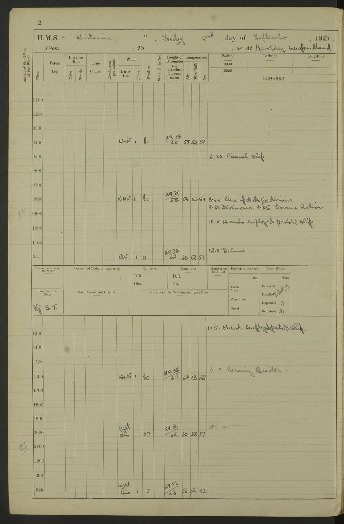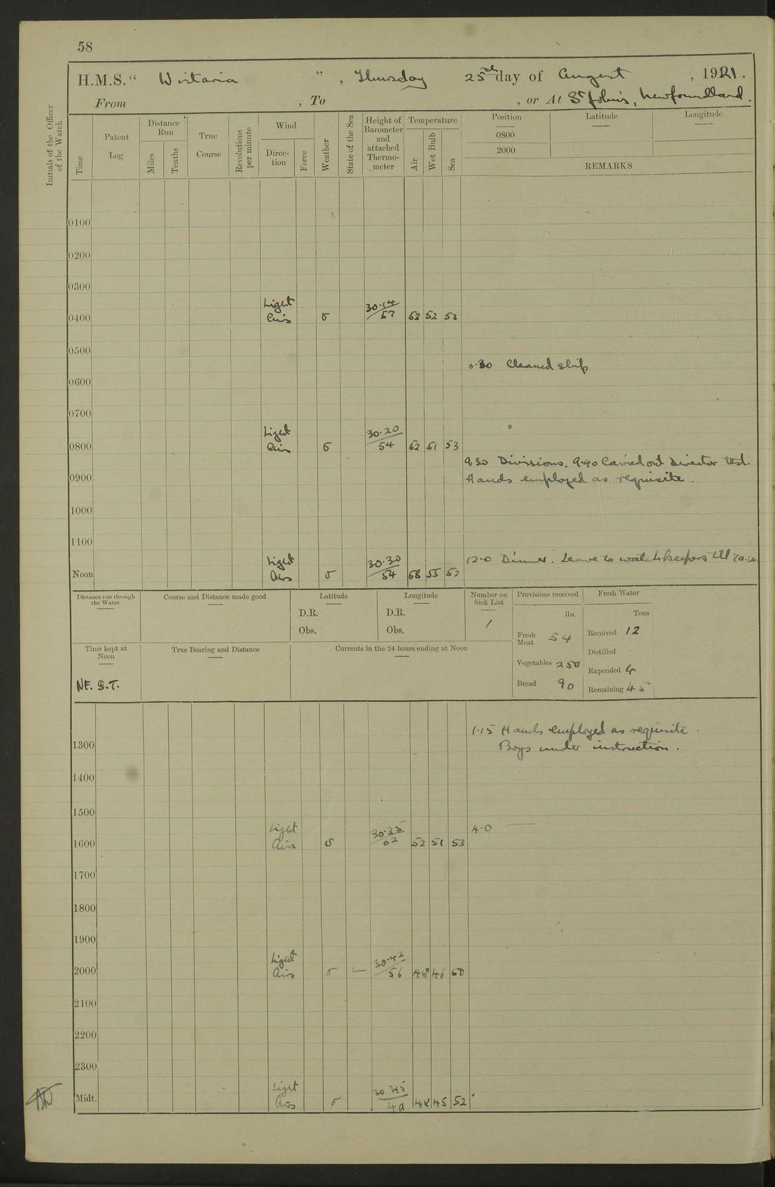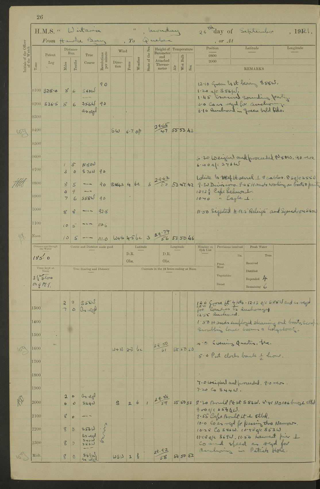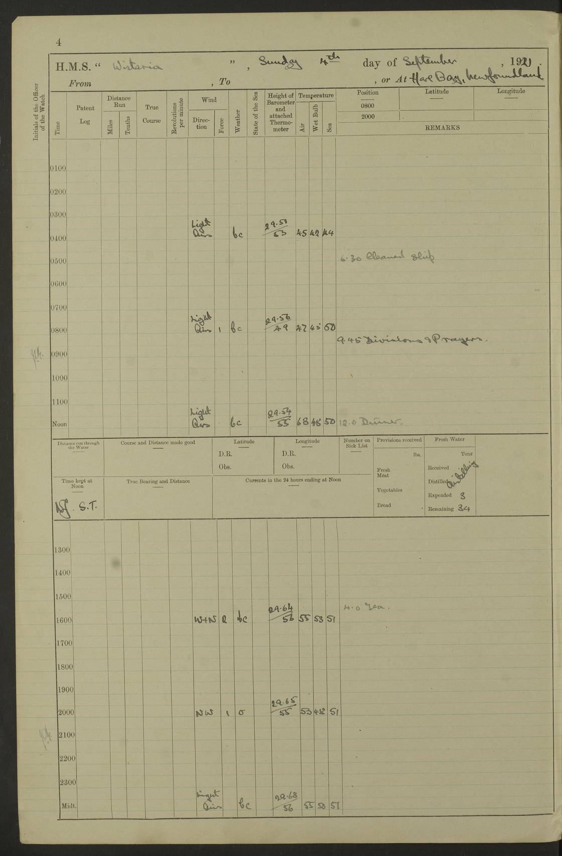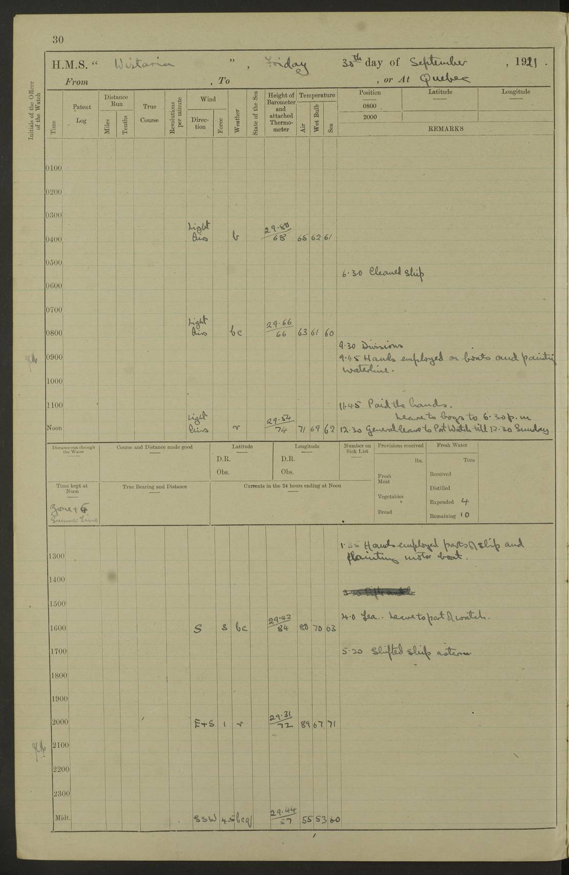 LOGS FOR SEPTEMBER 1921 4f73ca53a2fc8ea903000a89: (https://s3.amazonaws.com:443/oldweather/ADM53-93263/0003_1.jpg) 1 September 1921 At Hare Bay, Newfoundland Lat 48.85, Long -54.00 8.45am: Hands employed parts of ship 1.0pm: Hands mustered for monthly payment 1.20pm: Hands employed parts of ship 4f73ca53a2fc8ea903000a8a: (https://s3.amazonaws.com:443/oldweather/ADM53-93263/0004_0.jpg) 2 September 1921 At Hare Bay, Newfoundland Lat 48.85, Long -54.00 8.45am: Clear up decks for divisions 9.35am: Exercise Action 10.05am: Hands employed parts of ship 1.15pm: Hands employed parts of ship 4f73ca54a2fc8ea903000a8b: (https://s3.amazonaws.com:443/oldweather/ADM53-93263/0004_1.jpg) 3 September 1921 At Hare Bay, Newfoundland Lat 48.85, Long -54.00 8.45am: Cleaned ship 4.0pm: Evening Quarters 4f73ca54a2fc8ea903000a8c: (https://s3.amazonaws.com:443/oldweather/ADM53-93263/0005_0.jpg) 4 September 1921 At Hare Bay, Newfoundland Lat 48.85, Long -54.00 9.45am: Divisions & Prayers 4f73ca54a2fc8ea903000a8d: (https://s3.amazonaws.com:443/oldweather/ADM53-93263/0005_1.jpg) 5 September 1921 At Hare Bay, Newfoundland Lat 48.85, Long -54.00 8.45am: Hands employed preparing for 1” aiming rifle firing & parts of ship 9.40am: Hands resumed work 10.15am: Laid out target 10.30am: Carried out 1” aiming rifle firing 1.15pm: Hands employed parts of ship & drawing fresh water 7.0pm: Hoisted 2nd whaler & motor boat 4f73ca55a2fc8ea903000a8e: (https://s3.amazonaws.com:443/oldweather/ADM53-93263/0006_0.jpg) 6 September 1921 At Hare Bay, Newfoundland Lat 48.85, Long -54.00 9.50am: Hands employed parts of ship 1.15pm: Hands employed with parts of ship painting 4.0pm: Tea. One cell prisoner released 4f73ca55a2fc8ea903000a8f: (https://s3.amazonaws.com:443/oldweather/ADM53-93263/0006_1.jpg) 7 September 1921 At Hare Bay, Newfoundland Lat 48.85, Long -54.00 8.45am: Hands employed parts of ship 9.40am: Carried out 1” aiming rifle practice 10.40am: Hands carry on with work 1.15pm: Hands employed painting parts of ship 4f73ca55a2fc8ea903000a90: (https://s3.amazonaws.com:443/oldweather/ADM53-93263/0007_0.jpg) 8 September 1921 At Hare Bay Lat 48.85, Long -54.00 8.45am: Hands employed cleaning out boats and painting parts of ship 9.40am: Ordinary Seamen and boys to rifle drill, remainder hands part of ship 1.15pm: Hands employed cleaning skiffs and parts of ship Number on sick list: 2 4f73ca56a2fc8ea903000a91: (https://s3.amazonaws.com:443/oldweather/ADM53-93263/0007_1.jpg) 9 September 1921 At Hare Bay, Newfoundland Lat 48.85, Long -54.00 8.45am: Hands employed painting and scraping 9.45am: Rifle exercises 10.30am: Carried on with work 11.0am: Brought back target 6.0pm: Hoisted and secured boats for sea 9.30pm: Hoisted 1st whaler Number on sick list: 1 4f73ca56a2fc8ea903000a92: (https://s3.amazonaws.com:443/oldweather/ADM53-93263/0008_0.jpg) 10 September 1921 From Hare Bay to Chateau Bay Lat 51.98, Long -55.89 5.0am: Called 1st watch 5.30am: Watch fell in. Hoisted gangway 5.45am: Weighed and proceeded as requisite, 9 knots 10.40am: Sighted iceberg North 2.0pm: Course as required for entering Pitts Harbour 2.20pm: Came to with Starboard anchor 14½ faths water, veered 3 shackles Anchor bearings: East Point of Whale Island S6W; Point, right tangent, S72E; Islet, right tangent, S24E Number on sick list: 1 4f73ca57a2fc8ea903000a93: (https://s3.amazonaws.com:443/oldweather/ADM53-93263/0008_1.jpg) 11 September 1921 At Pitts Harbour, Chateau Bay Lat 51.98, Long -55.89 9.45am: Divisions 1.30pm: Libertymen landed 6.30pm: Hoisted both skiffs 8.30pm: Hoisted 1st whaler Number on sick list: 1 4f73ca57a2fc8ea903000a94: (https://s3.amazonaws.com:443/oldweather/ADM53-93263/0009_0.jpg) 12 September 1921 At Pitts Harbour, Chateau Bay Lat 51.98, Long -55.89 8.25am: Aft lower booms, clear up decks 8.45am: Weighed and proceeded as required for Temple Pass and Ship Cove Bay 9.30am: Came to Starboard anchor in 20 fths, 4 shackles 10.10am: Hands employed as required Anchor Bearings: Point, right tangent, N16W; left tangent, Whale Island S69E, Whale Island, right tangent, S35E 1.15pm: Hands employed as requisite Number on sick list: 1 4f73ca57a2fc8ea903000a95: (https://s3.amazonaws.com:443/oldweather/ADM53-93263/0009_1.jpg) 13 September 1921 At Chateau Bay Lat 51.98, Long -55.89 8.45am: Hands employed painting & scraping 10.0am: Exercised Control Parties 1.15pm: Hands employed painting & scraping Number on sick list: 1 4f73ca58a2fc8ea903000a96: (https://s3.amazonaws.com:443/oldweather/ADM53-93263/0010_0.jpg) 14 September 1921 At Chateau Bay Lat 51.98, Long -55.89 8.15am: Hands employed parts of ship and shipping .303 aiming rifles 9.45am: Ordinary Seamen & Boys & other non guns crew seamen rating to 4” drill & .303 aiming rifle practice 1.20pm: Hands employed getting up awnings, painting and scraping Number on sick list: 1 4f73ca58a2fc8ea903000a97: (https://s3.amazonaws.com:443/oldweather/ADM53-93263/0010_1.jpg) 15 September 1921 From Chateau Bay to Forteau Bay and at Chateau Bay and Forteau Bay Lat 51.61, Long -56.45 7.0am: Weighed and proceeded as required for temple pass 90 revs 9.38am: Altered course N7E and as required for firing lyddite and 1” aiming rifle shots at “growler” 11.0am: Saddle Island Lt on Starboard bow 11.52am: Saddle Island Lt on Starboard quarter 2.13pm: Amour Pt Lt Ho abeam 2.18pm: Altered course N40W and as required for anchorage 2.48pm: Came to port anchor Anchor Bearings: Admiral Pt pier, right tangent, N14W; Hawkins point, right tangent, N40E; left tangent, Coast S28W Number on sick list: 1 4f73ca58a2fc8ea903000a98: (https://s3.amazonaws.com:443/oldweather/ADM53-93263/0011_0.jpg) 16 September 1921 At Forteau Bay Lat 51.46, Long -56.93 9.0am: Clear up decks 9.45am: Landing party left ship 12.25am: Landing party returned Number on sick list: 1 4f73ca59a2fc8ea903000a99: (https://s3.amazonaws.com:443/oldweather/ADM53-93263/0011_1.jpg) 17 September 1921 At Forteau Bay Lat 51.46, Long -56.93 8.45am: Hands employed cleaning shi