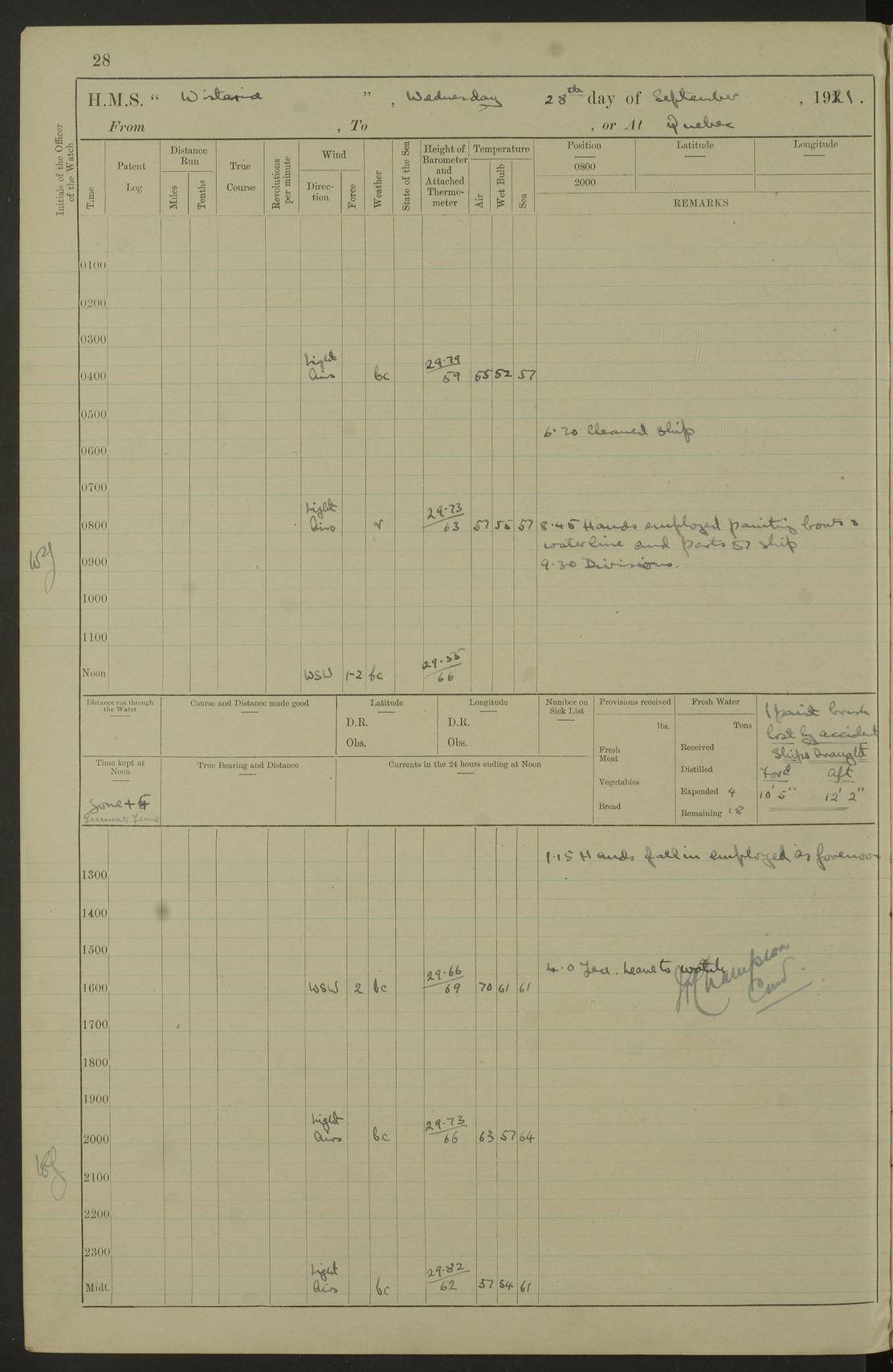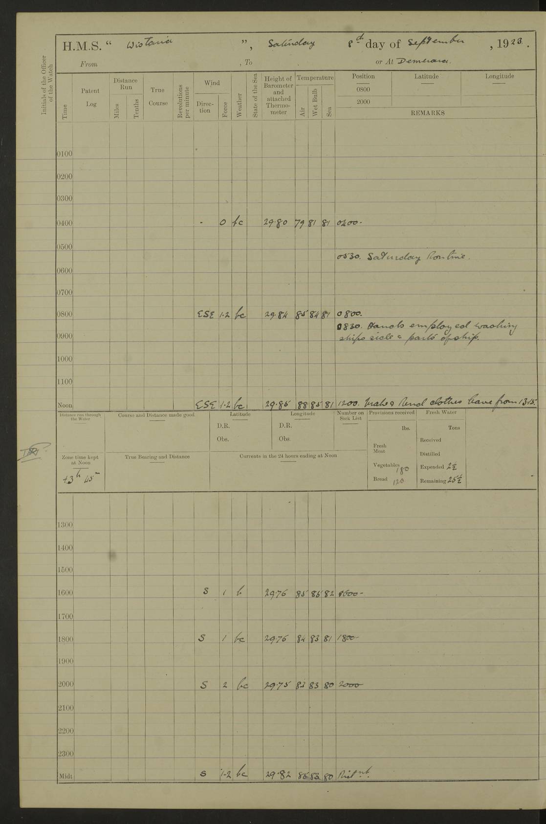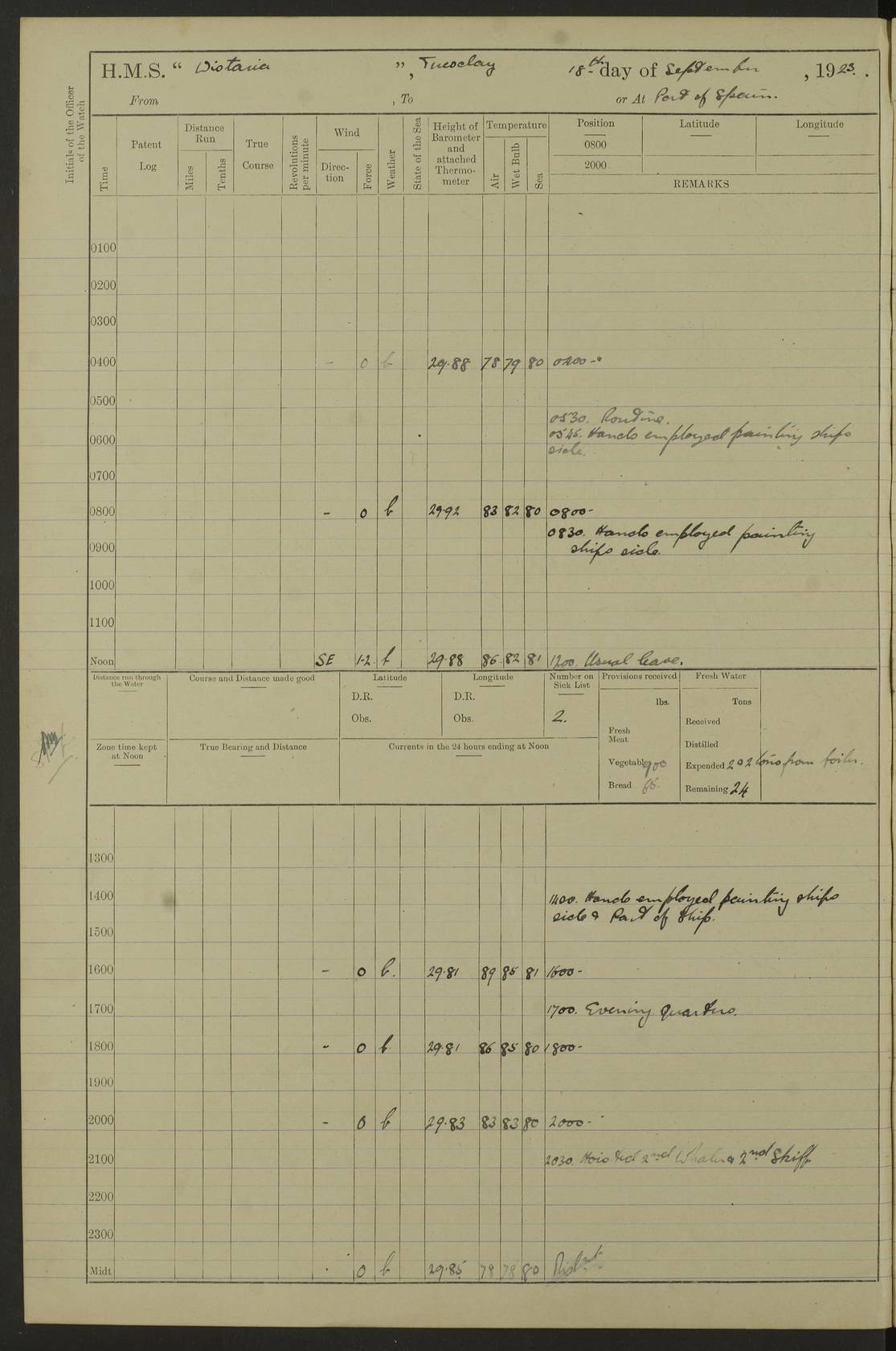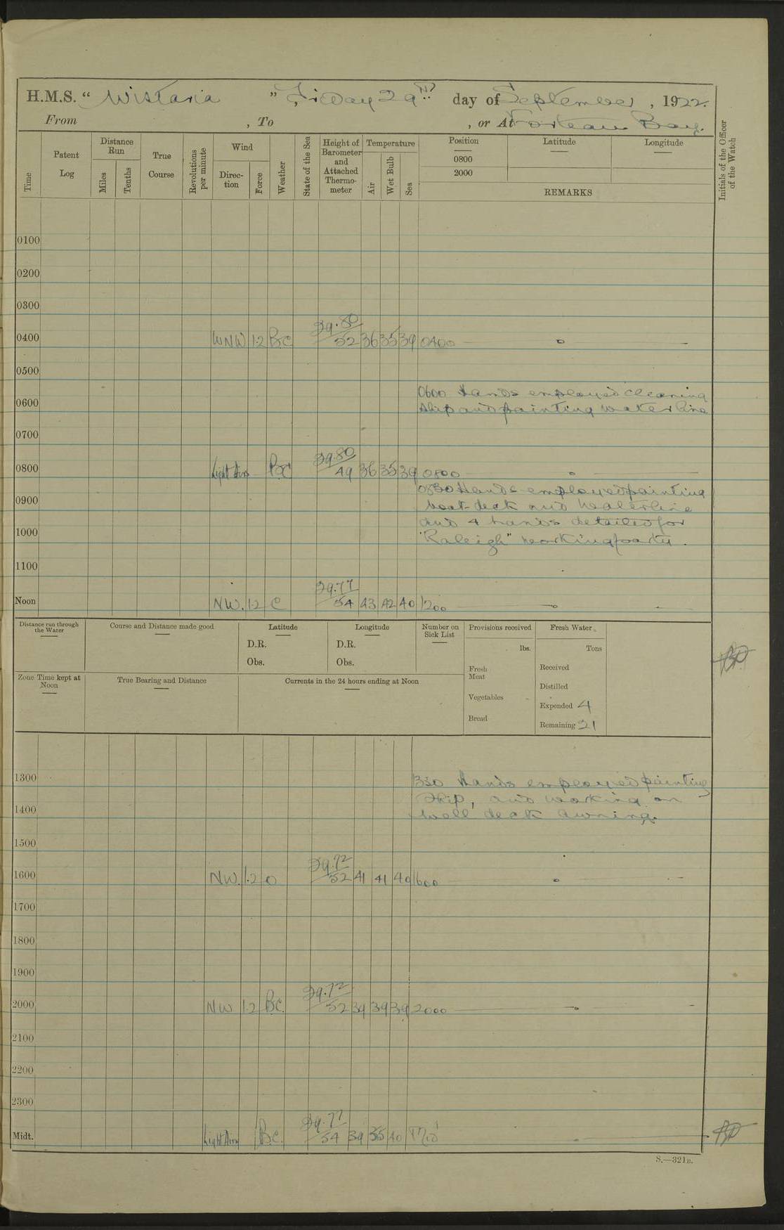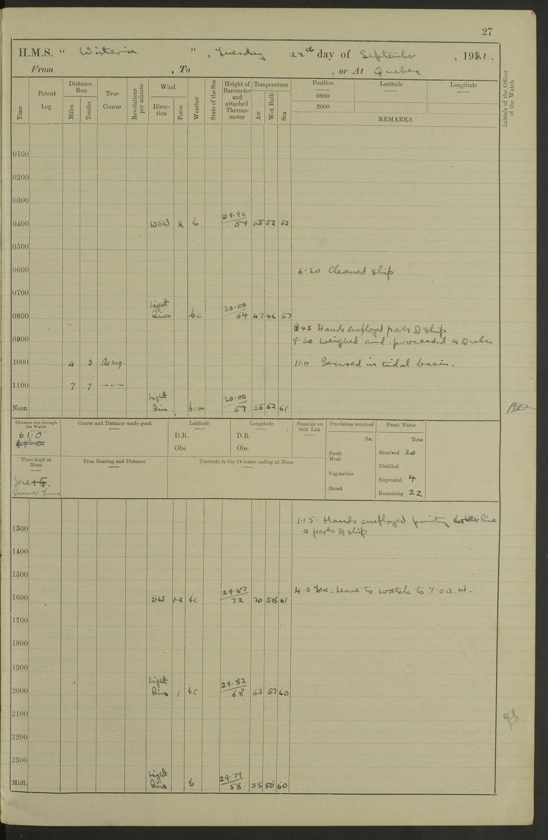 LOGS FOR SEPTEMBER 1921 4f73ca53a2fc8ea903000a89: (https://s3.amazonaws.com:443/oldweather/ADM53-93263/0003_1.jpg) 1 September 1921 At Hare Bay, Newfoundland Lat 48.85, Long -54.00 8.45am: Hands employed parts of ship 1.0pm: Hands mustered for monthly payment 1.20pm: Hands employed parts of ship 4f73ca53a2fc8ea903000a8a: (https://s3.amazonaws.com:443/oldweather/ADM53-93263/0004_0.jpg) 2 September 1921 At Hare Bay, Newfoundland Lat 48.85, Long -54.00 8.45am: Clear up decks for divisions 9.35am: Exercise Action 10.05am: Hands employed parts of ship 1.15pm: Hands employed parts of ship 4f73ca54a2fc8ea903000a8b: (https://s3.amazonaws.com:443/oldweather/ADM53-93263/0004_1.jpg) 3 September 1921 At Hare Bay, Newfoundland Lat 48.85, Long -54.00 8.45am: Cleaned ship 4.0pm: Evening Quarters 4f73ca54a2fc8ea903000a8c: (https://s3.amazonaws.com:443/oldweather/ADM53-93263/0005_0.jpg) 4 September 1921 At Hare Bay, Newfoundland Lat 48.85, Long -54.00 9.45am: Divisions & Prayers 4f73ca54a2fc8ea903000a8d: (https://s3.amazonaws.com:443/oldweather/ADM53-93263/0005_1.jpg) 5 September 1921 At Hare Bay, Newfoundland Lat 48.85, Long -54.00 8.45am: Hands employed preparing for 1” aiming rifle firing & parts of ship 9.40am: Hands resumed work 10.15am: Laid out target 10.30am: Carried out 1” aiming rifle firing 1.15pm: Hands employed parts of ship & drawing fresh water 7.0pm: Hoisted 2nd whaler & motor boat 4f73ca55a2fc8ea903000a8e: (https://s3.amazonaws.com:443/oldweather/ADM53-93263/0006_0.jpg) 6 September 1921 At Hare Bay, Newfoundland Lat 48.85, Long -54.00 9.50am: Hands employed parts of ship 1.15pm: Hands employed with parts of ship painting 4.0pm: Tea. One cell prisoner released 4f73ca55a2fc8ea903000a8f: (https://s3.amazonaws.com:443/oldweather/ADM53-93263/0006_1.jpg) 7 September 1921 At Hare Bay, Newfoundland Lat 48.85, Long -54.00 8.45am: Hands employed parts of ship 9.40am: Carried out 1” aiming rifle practice 10.40am: Hands carry on with work 1.15pm: Hands employed painting parts of ship 4f73ca55a2fc8ea903000a90: (https://s3.amazonaws.com:443/oldweather/ADM53-93263/0007_0.jpg) 8 September 1921 At Hare Bay Lat 48.85, Long -54.00 8.45am: Hands employed cleaning out boats and painting parts of ship 9.40am: Ordinary Seamen and boys to rifle drill, remainder hands part of ship 1.15pm: Hands employed cleaning skiffs and parts of ship Number on sick list: 2 4f73ca56a2fc8ea903000a91: (https://s3.amazonaws.com:443/oldweather/ADM53-93263/0007_1.jpg) 9 September 1921 At Hare Bay, Newfoundland Lat 48.85, Long -54.00 8.45am: Hands employed painting and scraping 9.45am: Rifle exercises 10.30am: Carried on with work 11.0am: Brought back target 6.0pm: Hoisted and secured boats for sea 9.30pm: Hoisted 1st whaler Number on sick list: 1 4f73ca56a2fc8ea903000a92: (https://s3.amazonaws.com:443/oldweather/ADM53-93263/0008_0.jpg) 10 September 1921 From Hare Bay to Chateau Bay Lat 51.98, Long -55.89 5.0am: Called 1st watch 5.30am: Watch fell in. Hoisted gangway 5.45am: Weighed and proceeded as requisite, 9 knots 10.40am: Sighted iceberg North 2.0pm: Course as required for entering Pitts Harbour 2.20pm: Came to with Starboard anchor 14½ faths water, veered 3 shackles Anchor bearings: East Point of Whale Island S6W; Point, right tangent, S72E; Islet, right tangent, S24E Number on sick list: 1 4f73ca57a2fc8ea903000a93: (https://s3.amazonaws.com:443/oldweather/ADM53-93263/0008_1.jpg) 11 September 1921 At Pitts Harbour, Chateau Bay Lat 51.98, Long -55.89 9.45am: Divisions 1.30pm: Libertymen landed 6.30pm: Hoisted both skiffs 8.30pm: Hoisted 1st whaler Number on sick list: 1 4f73ca57a2fc8ea903000a94: (https://s3.amazonaws.com:443/oldweather/ADM53-93263/0009_0.jpg) 12 September 1921 At Pitts Harbour, Chateau Bay Lat 51.98, Long -55.89 8.25am: Aft lower booms, clear up decks 8.45am: Weighed and proceeded as required for Temple Pass and Ship Cove Bay 9.30am: Came to Starboard anchor in 20 fths, 4 shackles 10.10am: Hands employed as required Anchor Bearings: Point, right tangent, N16W; left tangent, Whale Island S69E, Whale Island, right tangent, S35E 1.15pm: Hands employed as requisite Number on sick list: 1 4f73ca57a2fc8ea903000a95: (https://s3.amazonaws.com:443/oldweather/ADM53-93263/0009_1.jpg) 13 September 1921 At Chateau Bay Lat 51.98, Long -55.89 8.45am: Hands employed painting & scraping 10.0am: Exercised Control Parties 1.15pm: Hands employed painting & scraping Number on sick list: 1 4f73ca58a2fc8ea903000a96: (https://s3.amazonaws.com:443/oldweather/ADM53-93263/0010_0.jpg) 14 September 1921 At Chateau Bay Lat 51.98, Long -55.89 8.15am: Hands employed parts of ship and shipping .303 aiming rifles 9.45am: Ordinary Seamen & Boys & other non guns crew seamen rating to 4” drill & .303 aiming rifle practice 1.20pm: Hands employed getting up awnings, painting and scraping Number on sick list: 1 4f73ca58a2fc8ea903000a97: (https://s3.amazonaws.com:443/oldweather/ADM53-93263/0010_1.jpg) 15 September 1921 From Chateau Bay to Forteau Bay and at Chateau Bay and Forteau Bay Lat 51.61, Long -56.45 7.0am: Weighed and proceeded as required for temple pass 90 revs 9.38am: Altered course N7E and as required for firing lyddite and 1” aiming rifle shots at “growler” 11.0am: Saddle Island Lt on Starboard bow 11.52am: Saddle Island Lt on Starboard quarter 2.13pm: Amour Pt Lt Ho abeam 2.18pm: Altered course N40W and as required for anchorage 2.48pm: Came to port anchor Anchor Bearings: Admiral Pt pier, right tangent, N14W; Hawkins point, right tangent, N40E; left tangent, Coast S28W Number on sick list: 1 4f73ca58a2fc8ea903000a98: (https://s3.amazonaws.com:443/oldweather/ADM53-93263/0011_0.jpg) 16 September 1921 At Forteau Bay Lat 51.46, Long -56.93 9.0am: Clear up decks 9.45am: Landing party left ship 12.25am: Landing party returned Number on sick list: 1 4f73ca59a2fc8ea903000a99: (https://s3.amazonaws.com:443/oldweather/ADM53-93263/0011_1.jpg) 17 September 1921 At Forteau Bay Lat 51.46, Long -56.93 8.45am: Hands employed cleaning shi