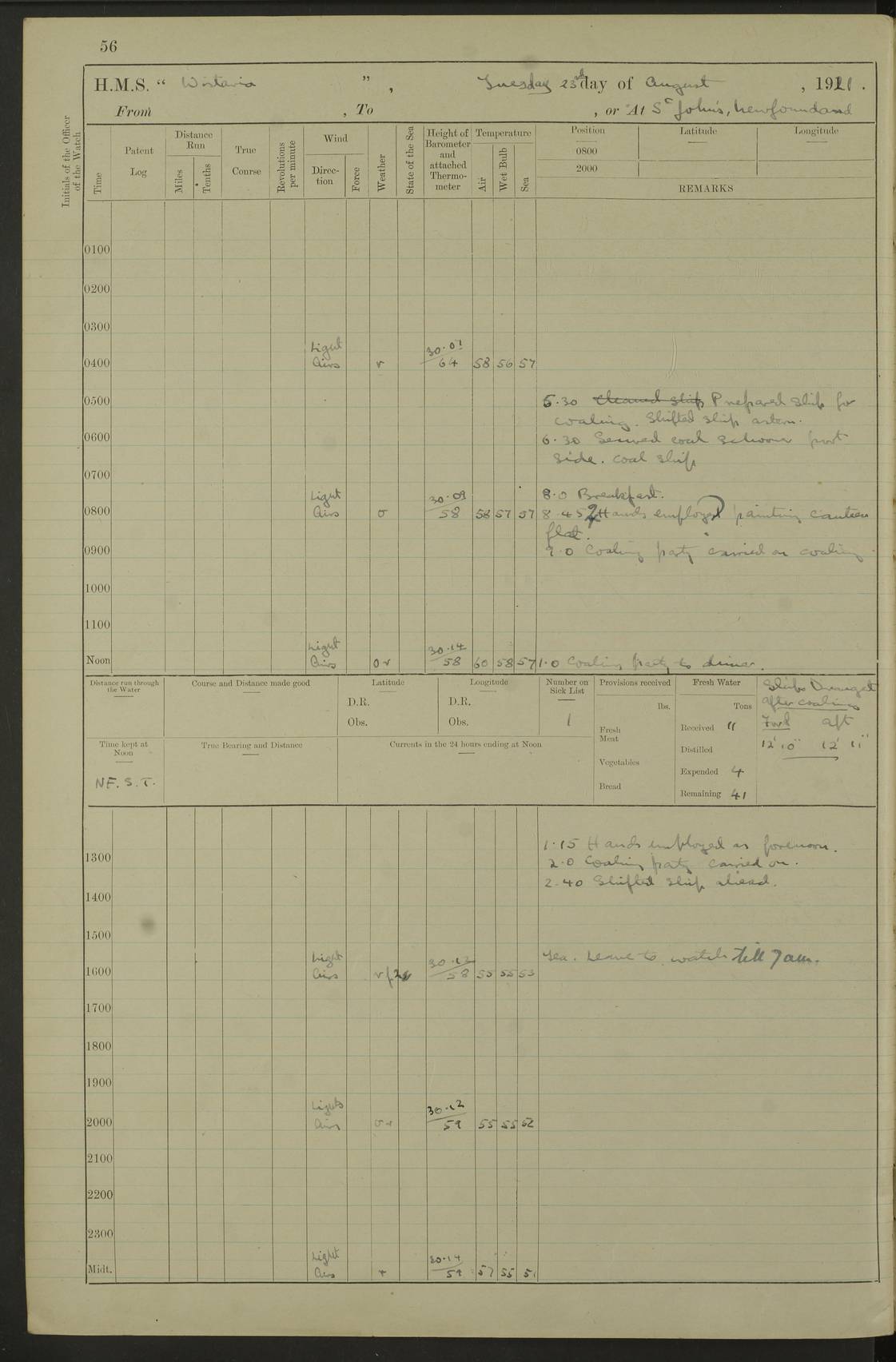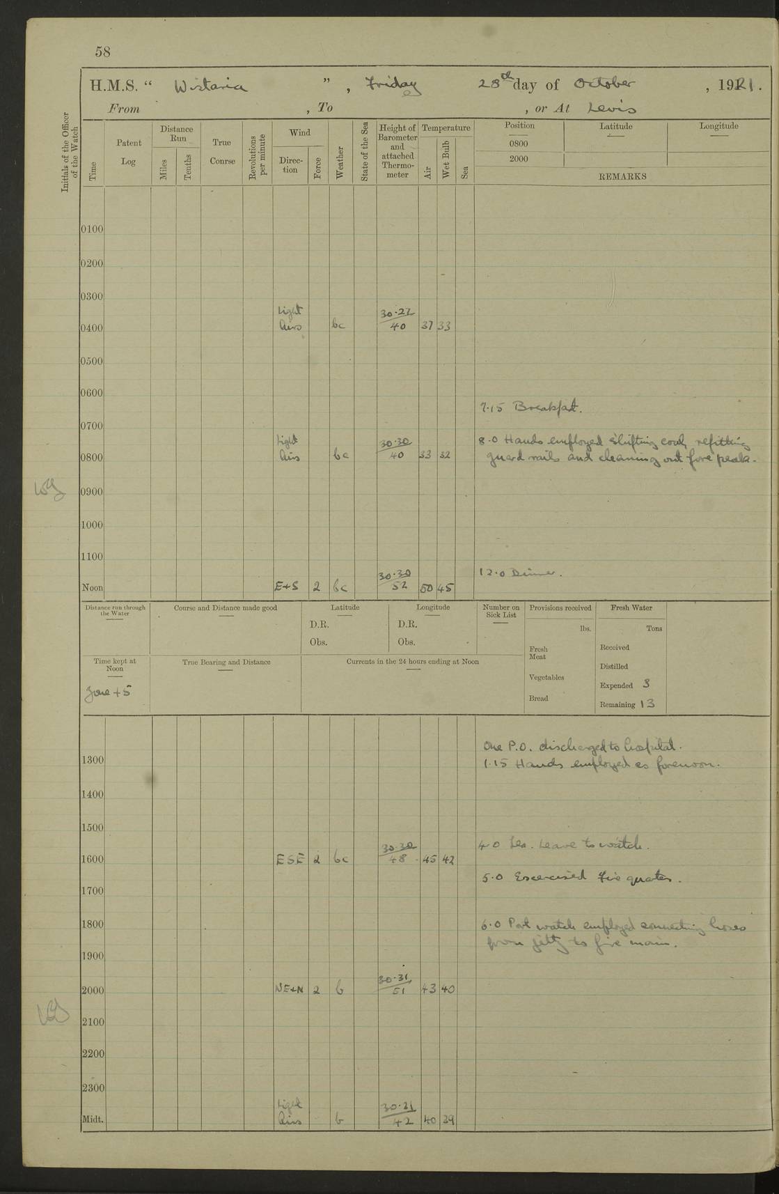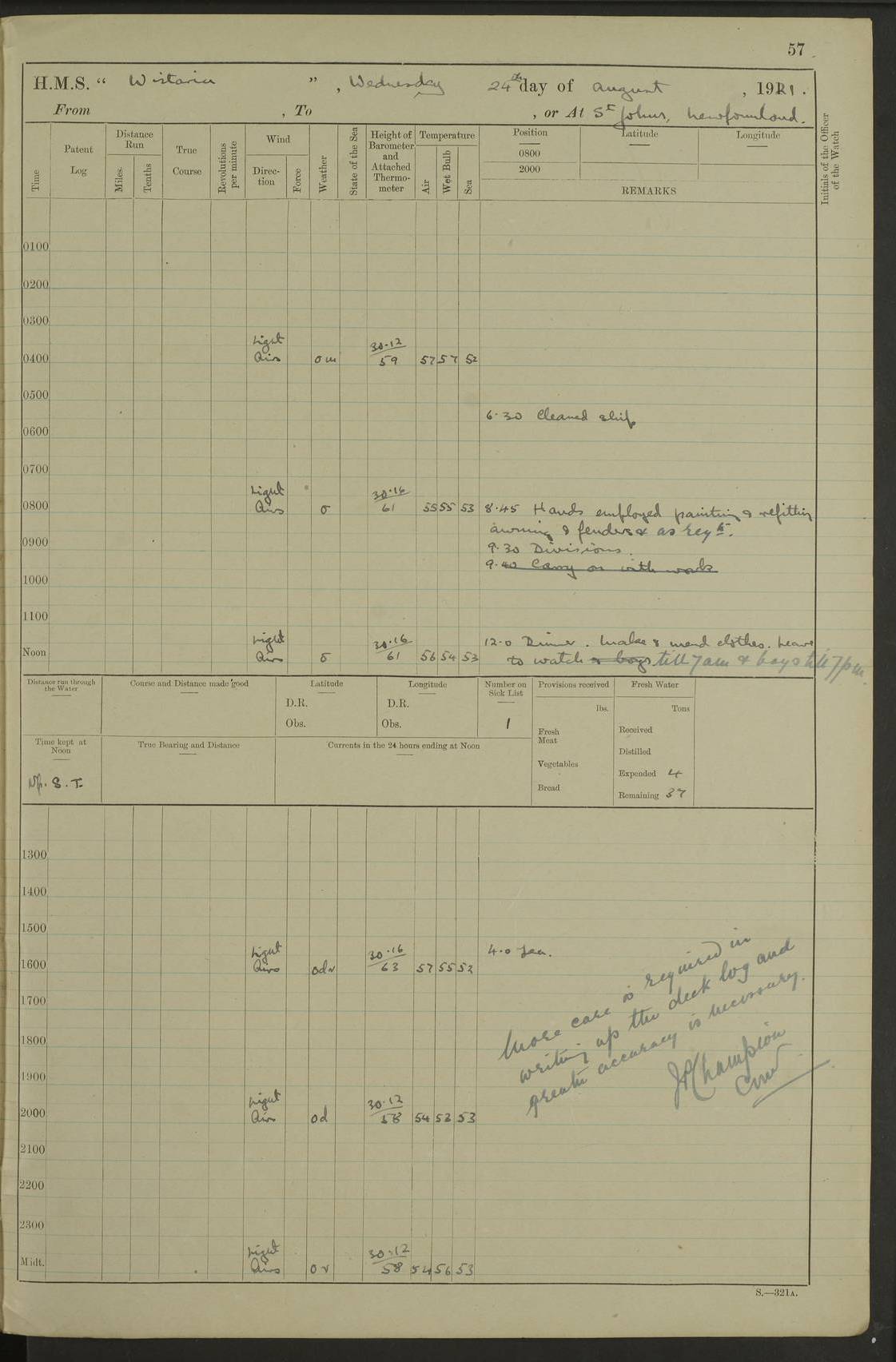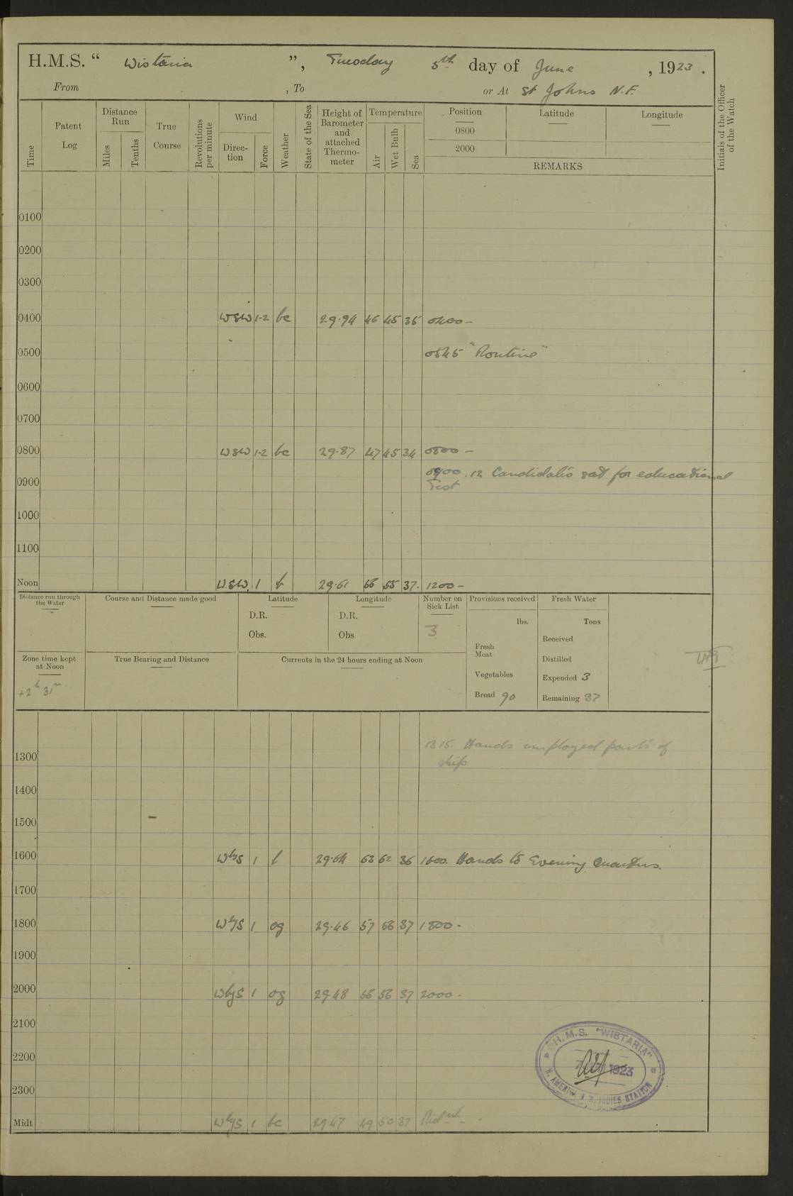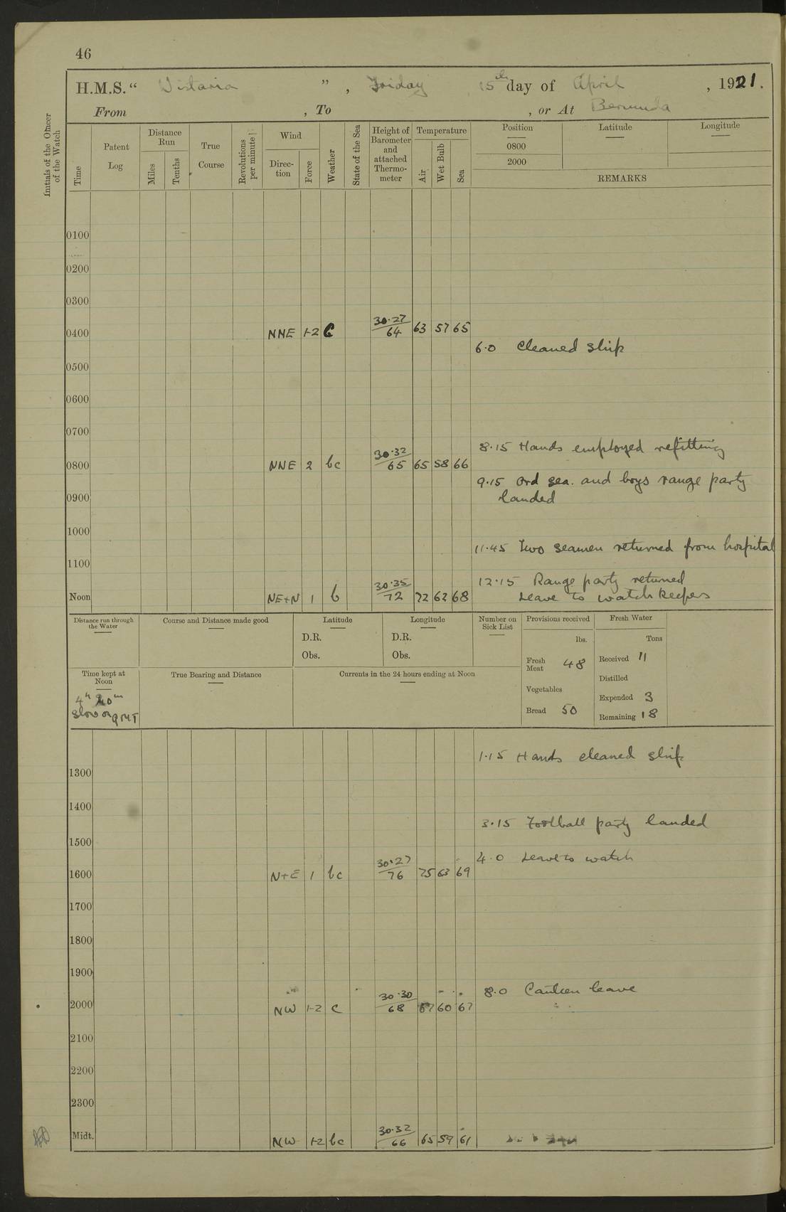 LOGS FOR SEPTEMBER 1921 4f73ca53a2fc8ea903000a89: (https://s3.amazonaws.com:443/oldweather/ADM53-93263/0003_1.jpg) 1 September 1921 At Hare Bay, Newfoundland Lat 48.85, Long -54.00 8.45am: Hands employed parts of ship 1.0pm: Hands mustered for monthly payment 1.20pm: Hands employed parts of ship 4f73ca53a2fc8ea903000a8a: (https://s3.amazonaws.com:443/oldweather/ADM53-93263/0004_0.jpg) 2 September 1921 At Hare Bay, Newfoundland Lat 48.85, Long -54.00 8.45am: Clear up decks for divisions 9.35am: Exercise Action 10.05am: Hands employed parts of ship 1.15pm: Hands employed parts of ship 4f73ca54a2fc8ea903000a8b: (https://s3.amazonaws.com:443/oldweather/ADM53-93263/0004_1.jpg) 3 September 1921 At Hare Bay, Newfoundland Lat 48.85, Long -54.00 8.45am: Cleaned ship 4.0pm: Evening Quarters 4f73ca54a2fc8ea903000a8c: (https://s3.amazonaws.com:443/oldweather/ADM53-93263/0005_0.jpg) 4 September 1921 At Hare Bay, Newfoundland Lat 48.85, Long -54.00 9.45am: Divisions & Prayers 4f73ca54a2fc8ea903000a8d: (https://s3.amazonaws.com:443/oldweather/ADM53-93263/0005_1.jpg) 5 September 1921 At Hare Bay, Newfoundland Lat 48.85, Long -54.00 8.45am: Hands employed preparing for 1” aiming rifle firing & parts of ship 9.40am: Hands resumed work 10.15am: Laid out target 10.30am: Carried out 1” aiming rifle firing 1.15pm: Hands employed parts of ship & drawing fresh water 7.0pm: Hoisted 2nd whaler & motor boat 4f73ca55a2fc8ea903000a8e: (https://s3.amazonaws.com:443/oldweather/ADM53-93263/0006_0.jpg) 6 September 1921 At Hare Bay, Newfoundland Lat 48.85, Long -54.00 9.50am: Hands employed parts of ship 1.15pm: Hands employed with parts of ship painting 4.0pm: Tea. One cell prisoner released 4f73ca55a2fc8ea903000a8f: (https://s3.amazonaws.com:443/oldweather/ADM53-93263/0006_1.jpg) 7 September 1921 At Hare Bay, Newfoundland Lat 48.85, Long -54.00 8.45am: Hands employed parts of ship 9.40am: Carried out 1” aiming rifle practice 10.40am: Hands carry on with work 1.15pm: Hands employed painting parts of ship 4f73ca55a2fc8ea903000a90: (https://s3.amazonaws.com:443/oldweather/ADM53-93263/0007_0.jpg) 8 September 1921 At Hare Bay Lat 48.85, Long -54.00 8.45am: Hands employed cleaning out boats and painting parts of ship 9.40am: Ordinary Seamen and boys to rifle drill, remainder hands part of ship 1.15pm: Hands employed cleaning skiffs and parts of ship Number on sick list: 2 4f73ca56a2fc8ea903000a91: (https://s3.amazonaws.com:443/oldweather/ADM53-93263/0007_1.jpg) 9 September 1921 At Hare Bay, Newfoundland Lat 48.85, Long -54.00 8.45am: Hands employed painting and scraping 9.45am: Rifle exercises 10.30am: Carried on with work 11.0am: Brought back target 6.0pm: Hoisted and secured boats for sea 9.30pm: Hoisted 1st whaler Number on sick list: 1 4f73ca56a2fc8ea903000a92: (https://s3.amazonaws.com:443/oldweather/ADM53-93263/0008_0.jpg) 10 September 1921 From Hare Bay to Chateau Bay Lat 51.98, Long -55.89 5.0am: Called 1st watch 5.30am: Watch fell in. Hoisted gangway 5.45am: Weighed and proceeded as requisite, 9 knots 10.40am: Sighted iceberg North 2.0pm: Course as required for entering Pitts Harbour 2.20pm: Came to with Starboard anchor 14½ faths water, veered 3 shackles Anchor bearings: East Point of Whale Island S6W; Point, right tangent, S72E; Islet, right tangent, S24E Number on sick list: 1 4f73ca57a2fc8ea903000a93: (https://s3.amazonaws.com:443/oldweather/ADM53-93263/0008_1.jpg) 11 September 1921 At Pitts Harbour, Chateau Bay Lat 51.98, Long -55.89 9.45am: Divisions 1.30pm: Libertymen landed 6.30pm: Hoisted both skiffs 8.30pm: Hoisted 1st whaler Number on sick list: 1 4f73ca57a2fc8ea903000a94: (https://s3.amazonaws.com:443/oldweather/ADM53-93263/0009_0.jpg) 12 September 1921 At Pitts Harbour, Chateau Bay Lat 51.98, Long -55.89 8.25am: Aft lower booms, clear up decks 8.45am: Weighed and proceeded as required for Temple Pass and Ship Cove Bay 9.30am: Came to Starboard anchor in 20 fths, 4 shackles 10.10am: Hands employed as required Anchor Bearings: Point, right tangent, N16W; left tangent, Whale Island S69E, Whale Island, right tangent, S35E 1.15pm: Hands employed as requisite Number on sick list: 1 4f73ca57a2fc8ea903000a95: (https://s3.amazonaws.com:443/oldweather/ADM53-93263/0009_1.jpg) 13 September 1921 At Chateau Bay Lat 51.98, Long -55.89 8.45am: Hands employed painting & scraping 10.0am: Exercised Control Parties 1.15pm: Hands employed painting & scraping Number on sick list: 1 4f73ca58a2fc8ea903000a96: (https://s3.amazonaws.com:443/oldweather/ADM53-93263/0010_0.jpg) 14 September 1921 At Chateau Bay Lat 51.98, Long -55.89 8.15am: Hands employed parts of ship and shipping .303 aiming rifles 9.45am: Ordinary Seamen & Boys & other non guns crew seamen rating to 4” drill & .303 aiming rifle practice 1.20pm: Hands employed getting up awnings, painting and scraping Number on sick list: 1 4f73ca58a2fc8ea903000a97: (https://s3.amazonaws.com:443/oldweather/ADM53-93263/0010_1.jpg) 15 September 1921 From Chateau Bay to Forteau Bay and at Chateau Bay and Forteau Bay Lat 51.61, Long -56.45 7.0am: Weighed and proceeded as required for temple pass 90 revs 9.38am: Altered course N7E and as required for firing lyddite and 1” aiming rifle shots at “growler” 11.0am: Saddle Island Lt on Starboard bow 11.52am: Saddle Island Lt on Starboard quarter 2.13pm: Amour Pt Lt Ho abeam 2.18pm: Altered course N40W and as required for anchorage 2.48pm: Came to port anchor Anchor Bearings: Admiral Pt pier, right tangent, N14W; Hawkins point, right tangent, N40E; left tangent, Coast S28W Number on sick list: 1 4f73ca58a2fc8ea903000a98: (https://s3.amazonaws.com:443/oldweather/ADM53-93263/0011_0.jpg) 16 September 1921 At Forteau Bay Lat 51.46, Long -56.93 9.0am: Clear up decks 9.45am: Landing party left ship 12.25am: Landing party returned Number on sick list: 1 4f73ca59a2fc8ea903000a99: (https://s3.amazonaws.com:443/oldweather/ADM53-93263/0011_1.jpg) 17 September 1921 At Forteau Bay Lat 51.46, Long -56.93 8.45am: Hands employed cleaning shi