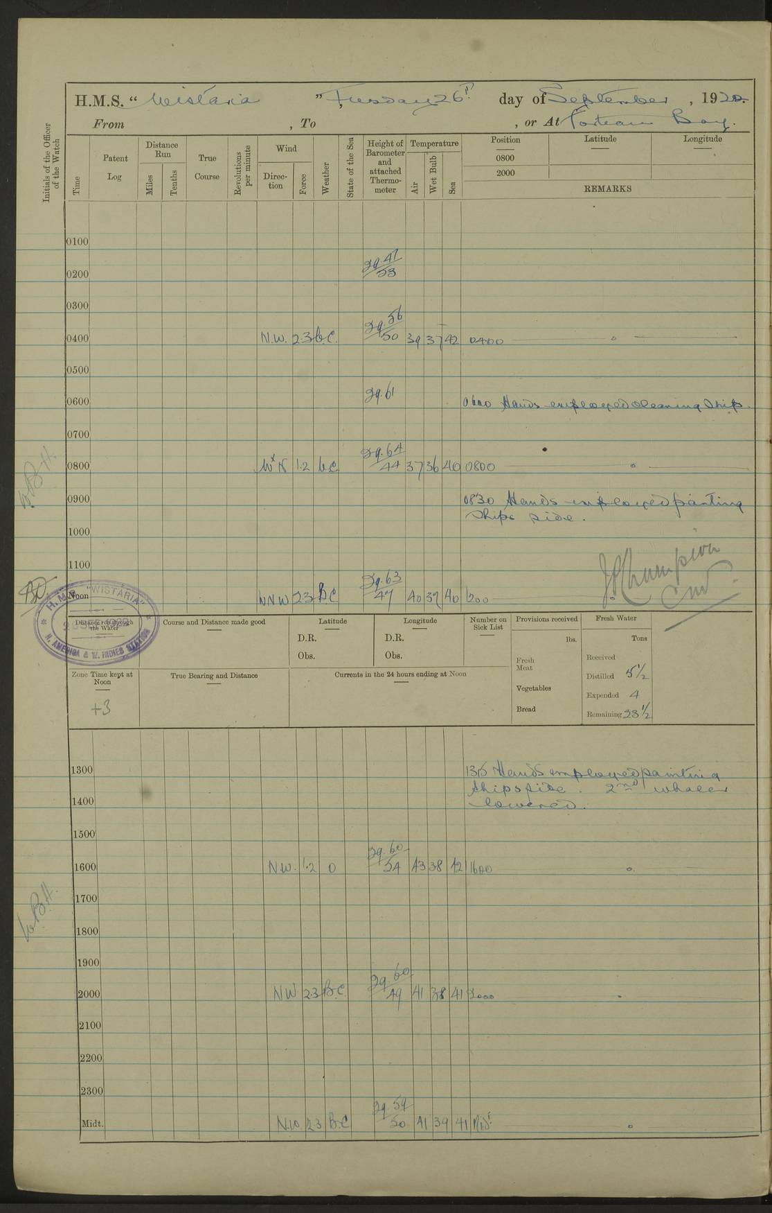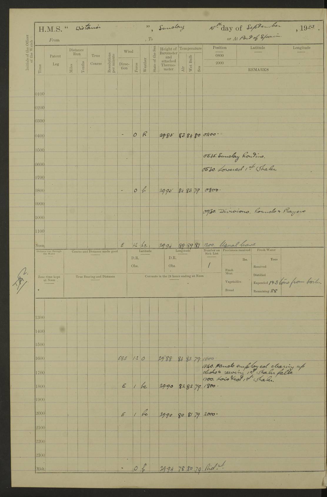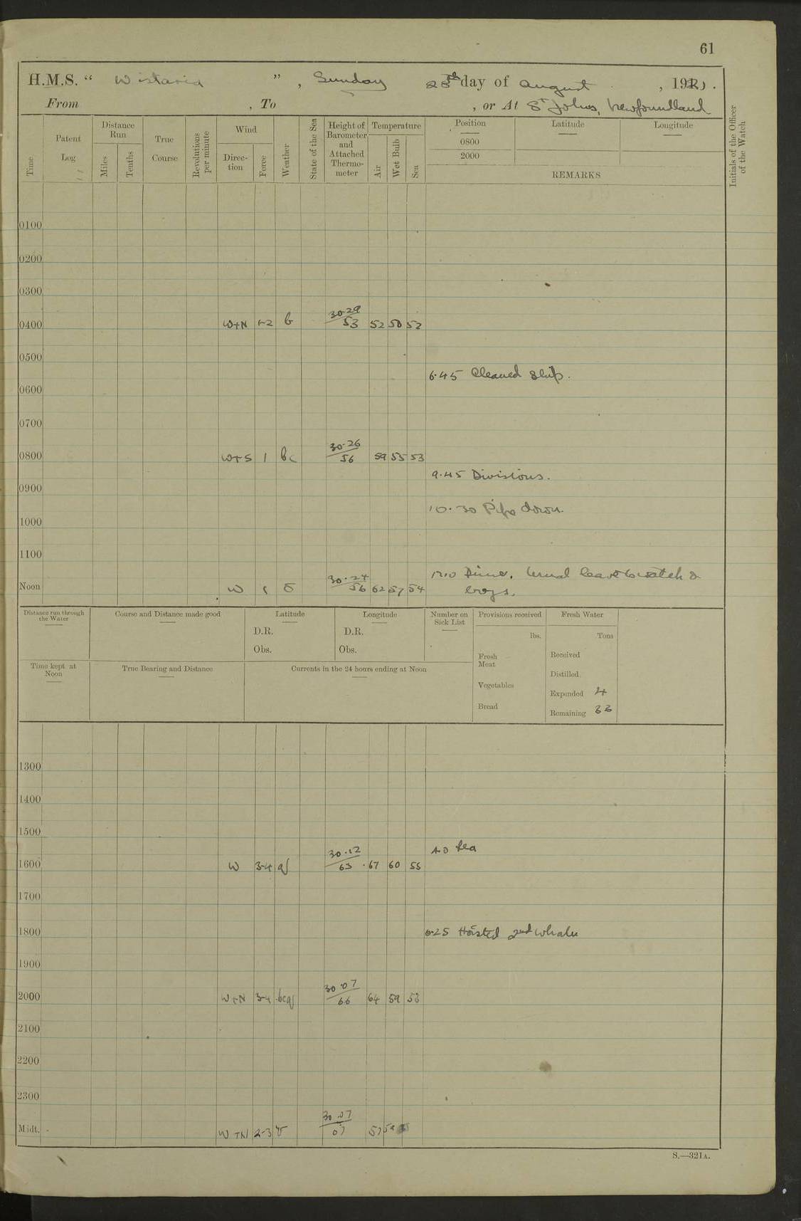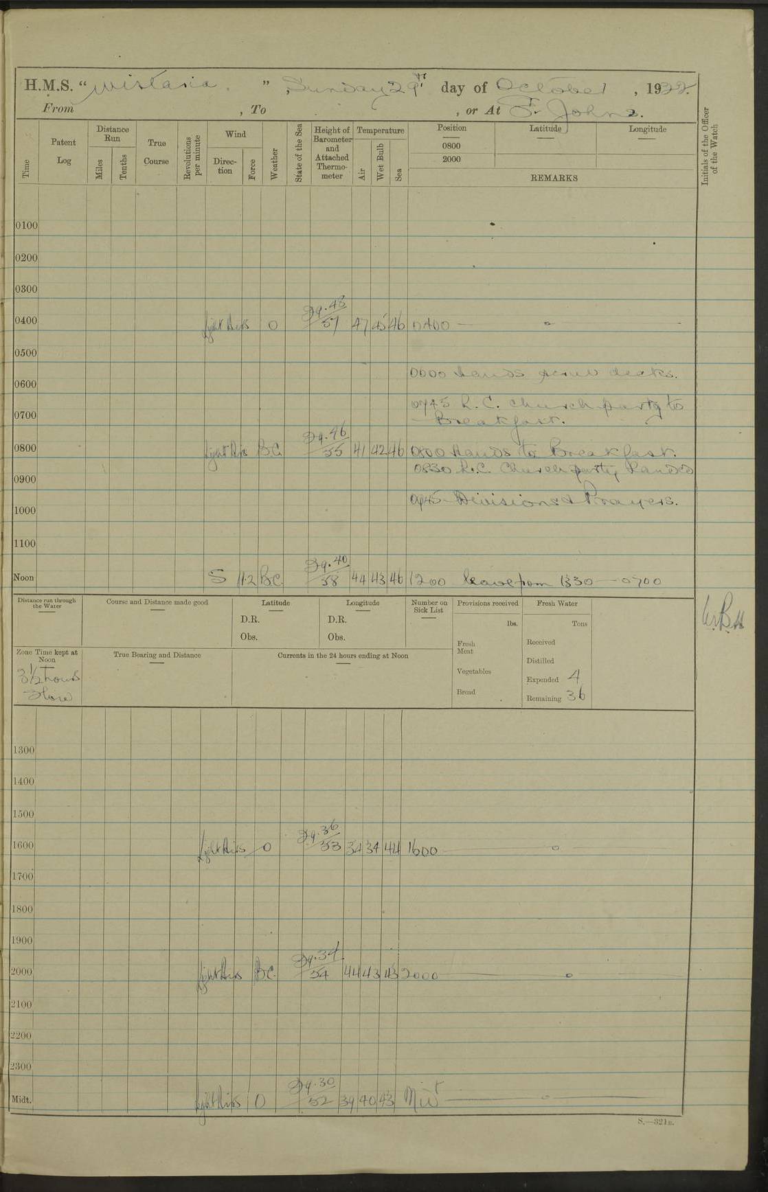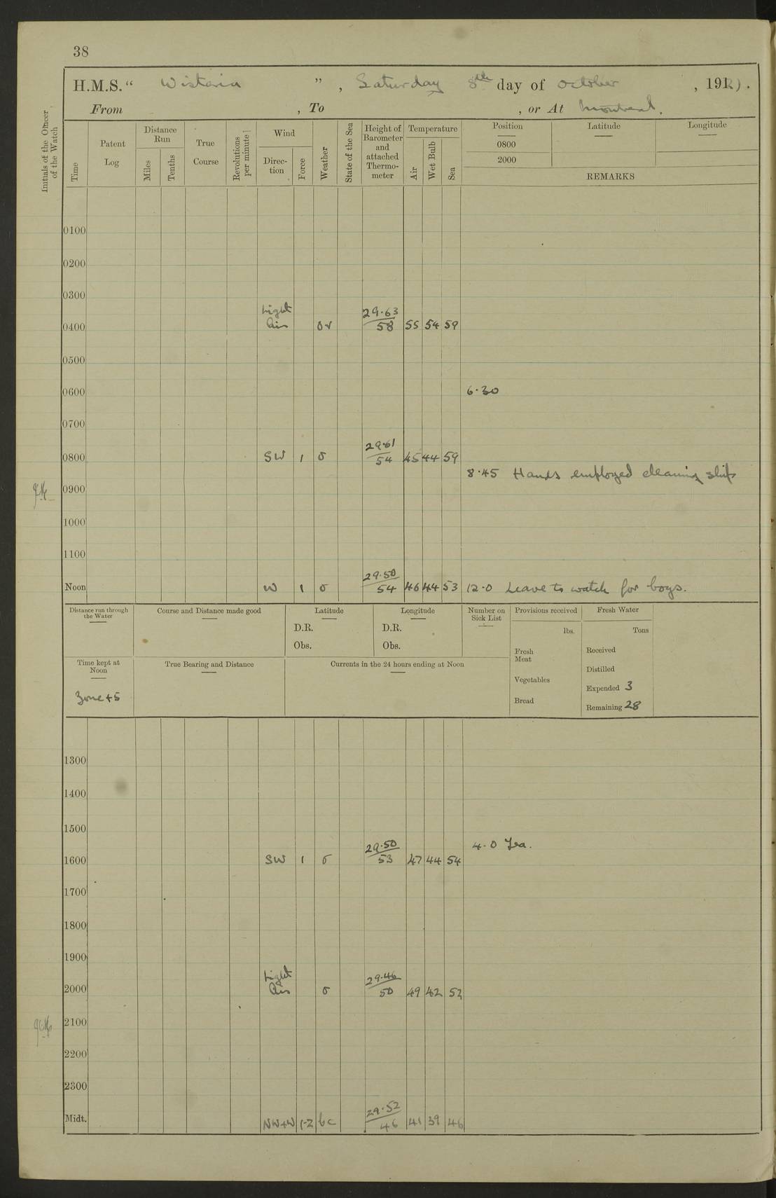 LOGS FOR SEPTEMBER 1921 4f73ca53a2fc8ea903000a89: (https://s3.amazonaws.com:443/oldweather/ADM53-93263/0003_1.jpg) 1 September 1921 At Hare Bay, Newfoundland Lat 48.85, Long -54.00 8.45am: Hands employed parts of ship 1.0pm: Hands mustered for monthly payment 1.20pm: Hands employed parts of ship 4f73ca53a2fc8ea903000a8a: (https://s3.amazonaws.com:443/oldweather/ADM53-93263/0004_0.jpg) 2 September 1921 At Hare Bay, Newfoundland Lat 48.85, Long -54.00 8.45am: Clear up decks for divisions 9.35am: Exercise Action 10.05am: Hands employed parts of ship 1.15pm: Hands employed parts of ship 4f73ca54a2fc8ea903000a8b: (https://s3.amazonaws.com:443/oldweather/ADM53-93263/0004_1.jpg) 3 September 1921 At Hare Bay, Newfoundland Lat 48.85, Long -54.00 8.45am: Cleaned ship 4.0pm: Evening Quarters 4f73ca54a2fc8ea903000a8c: (https://s3.amazonaws.com:443/oldweather/ADM53-93263/0005_0.jpg) 4 September 1921 At Hare Bay, Newfoundland Lat 48.85, Long -54.00 9.45am: Divisions & Prayers 4f73ca54a2fc8ea903000a8d: (https://s3.amazonaws.com:443/oldweather/ADM53-93263/0005_1.jpg) 5 September 1921 At Hare Bay, Newfoundland Lat 48.85, Long -54.00 8.45am: Hands employed preparing for 1” aiming rifle firing & parts of ship 9.40am: Hands resumed work 10.15am: Laid out target 10.30am: Carried out 1” aiming rifle firing 1.15pm: Hands employed parts of ship & drawing fresh water 7.0pm: Hoisted 2nd whaler & motor boat 4f73ca55a2fc8ea903000a8e: (https://s3.amazonaws.com:443/oldweather/ADM53-93263/0006_0.jpg) 6 September 1921 At Hare Bay, Newfoundland Lat 48.85, Long -54.00 9.50am: Hands employed parts of ship 1.15pm: Hands employed with parts of ship painting 4.0pm: Tea. One cell prisoner released 4f73ca55a2fc8ea903000a8f: (https://s3.amazonaws.com:443/oldweather/ADM53-93263/0006_1.jpg) 7 September 1921 At Hare Bay, Newfoundland Lat 48.85, Long -54.00 8.45am: Hands employed parts of ship 9.40am: Carried out 1” aiming rifle practice 10.40am: Hands carry on with work 1.15pm: Hands employed painting parts of ship 4f73ca55a2fc8ea903000a90: (https://s3.amazonaws.com:443/oldweather/ADM53-93263/0007_0.jpg) 8 September 1921 At Hare Bay Lat 48.85, Long -54.00 8.45am: Hands employed cleaning out boats and painting parts of ship 9.40am: Ordinary Seamen and boys to rifle drill, remainder hands part of ship 1.15pm: Hands employed cleaning skiffs and parts of ship Number on sick list: 2 4f73ca56a2fc8ea903000a91: (https://s3.amazonaws.com:443/oldweather/ADM53-93263/0007_1.jpg) 9 September 1921 At Hare Bay, Newfoundland Lat 48.85, Long -54.00 8.45am: Hands employed painting and scraping 9.45am: Rifle exercises 10.30am: Carried on with work 11.0am: Brought back target 6.0pm: Hoisted and secured boats for sea 9.30pm: Hoisted 1st whaler Number on sick list: 1 4f73ca56a2fc8ea903000a92: (https://s3.amazonaws.com:443/oldweather/ADM53-93263/0008_0.jpg) 10 September 1921 From Hare Bay to Chateau Bay Lat 51.98, Long -55.89 5.0am: Called 1st watch 5.30am: Watch fell in. Hoisted gangway 5.45am: Weighed and proceeded as requisite, 9 knots 10.40am: Sighted iceberg North 2.0pm: Course as required for entering Pitts Harbour 2.20pm: Came to with Starboard anchor 14½ faths water, veered 3 shackles Anchor bearings: East Point of Whale Island S6W; Point, right tangent, S72E; Islet, right tangent, S24E Number on sick list: 1 4f73ca57a2fc8ea903000a93: (https://s3.amazonaws.com:443/oldweather/ADM53-93263/0008_1.jpg) 11 September 1921 At Pitts Harbour, Chateau Bay Lat 51.98, Long -55.89 9.45am: Divisions 1.30pm: Libertymen landed 6.30pm: Hoisted both skiffs 8.30pm: Hoisted 1st whaler Number on sick list: 1 4f73ca57a2fc8ea903000a94: (https://s3.amazonaws.com:443/oldweather/ADM53-93263/0009_0.jpg) 12 September 1921 At Pitts Harbour, Chateau Bay Lat 51.98, Long -55.89 8.25am: Aft lower booms, clear up decks 8.45am: Weighed and proceeded as required for Temple Pass and Ship Cove Bay 9.30am: Came to Starboard anchor in 20 fths, 4 shackles 10.10am: Hands employed as required Anchor Bearings: Point, right tangent, N16W; left tangent, Whale Island S69E, Whale Island, right tangent, S35E 1.15pm: Hands employed as requisite Number on sick list: 1 4f73ca57a2fc8ea903000a95: (https://s3.amazonaws.com:443/oldweather/ADM53-93263/0009_1.jpg) 13 September 1921 At Chateau Bay Lat 51.98, Long -55.89 8.45am: Hands employed painting & scraping 10.0am: Exercised Control Parties 1.15pm: Hands employed painting & scraping Number on sick list: 1 4f73ca58a2fc8ea903000a96: (https://s3.amazonaws.com:443/oldweather/ADM53-93263/0010_0.jpg) 14 September 1921 At Chateau Bay Lat 51.98, Long -55.89 8.15am: Hands employed parts of ship and shipping .303 aiming rifles 9.45am: Ordinary Seamen & Boys & other non guns crew seamen rating to 4” drill & .303 aiming rifle practice 1.20pm: Hands employed getting up awnings, painting and scraping Number on sick list: 1 4f73ca58a2fc8ea903000a97: (https://s3.amazonaws.com:443/oldweather/ADM53-93263/0010_1.jpg) 15 September 1921 From Chateau Bay to Forteau Bay and at Chateau Bay and Forteau Bay Lat 51.61, Long -56.45 7.0am: Weighed and proceeded as required for temple pass 90 revs 9.38am: Altered course N7E and as required for firing lyddite and 1” aiming rifle shots at “growler” 11.0am: Saddle Island Lt on Starboard bow 11.52am: Saddle Island Lt on Starboard quarter 2.13pm: Amour Pt Lt Ho abeam 2.18pm: Altered course N40W and as required for anchorage 2.48pm: Came to port anchor Anchor Bearings: Admiral Pt pier, right tangent, N14W; Hawkins point, right tangent, N40E; left tangent, Coast S28W Number on sick list: 1 4f73ca58a2fc8ea903000a98: (https://s3.amazonaws.com:443/oldweather/ADM53-93263/0011_0.jpg) 16 September 1921 At Forteau Bay Lat 51.46, Long -56.93 9.0am: Clear up decks 9.45am: Landing party left ship 12.25am: Landing party returned Number on sick list: 1 4f73ca59a2fc8ea903000a99: (https://s3.amazonaws.com:443/oldweather/ADM53-93263/0011_1.jpg) 17 September 1921 At Forteau Bay Lat 51.46, Long -56.93 8.45am: Hands employed cleaning shi