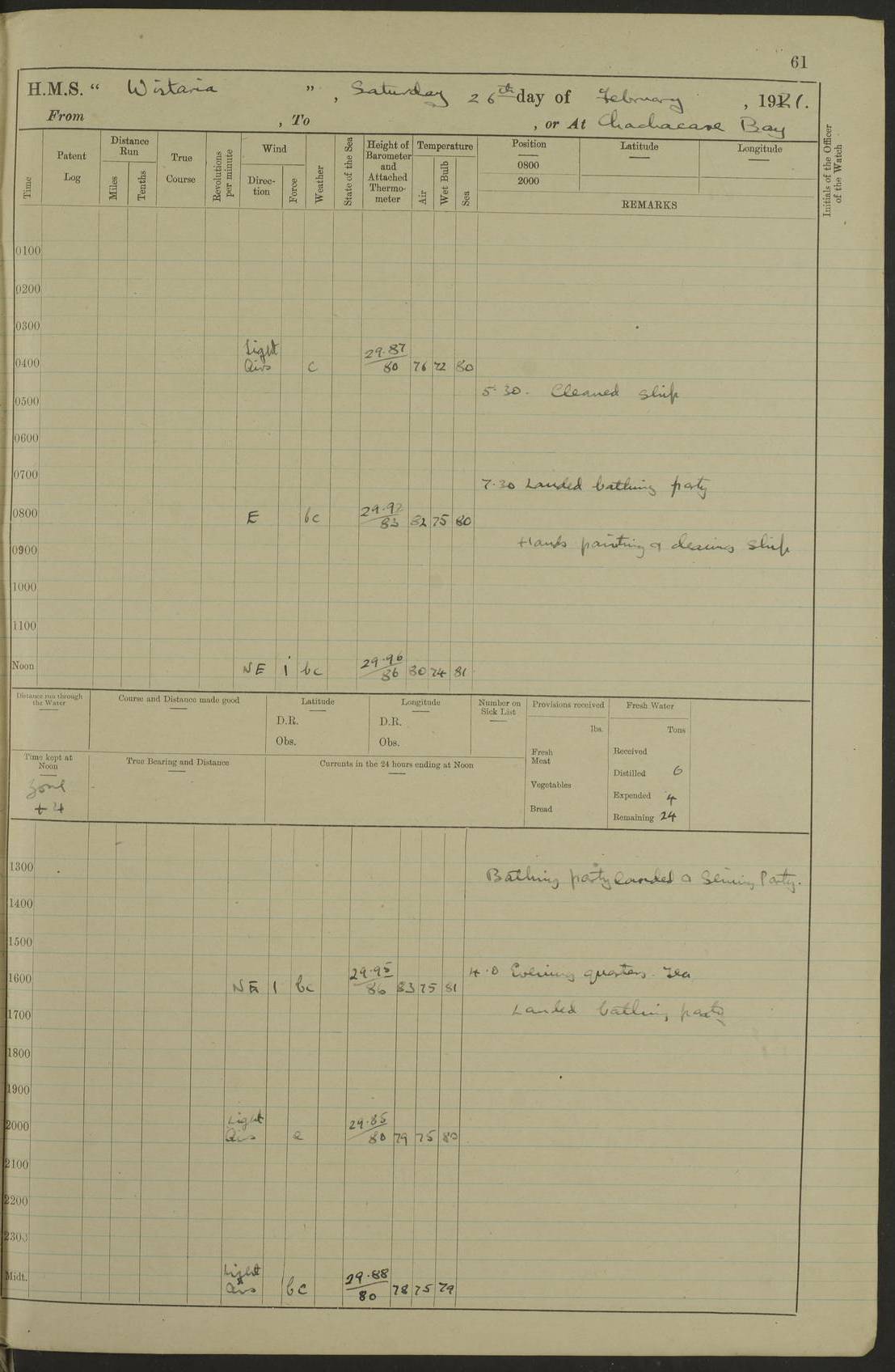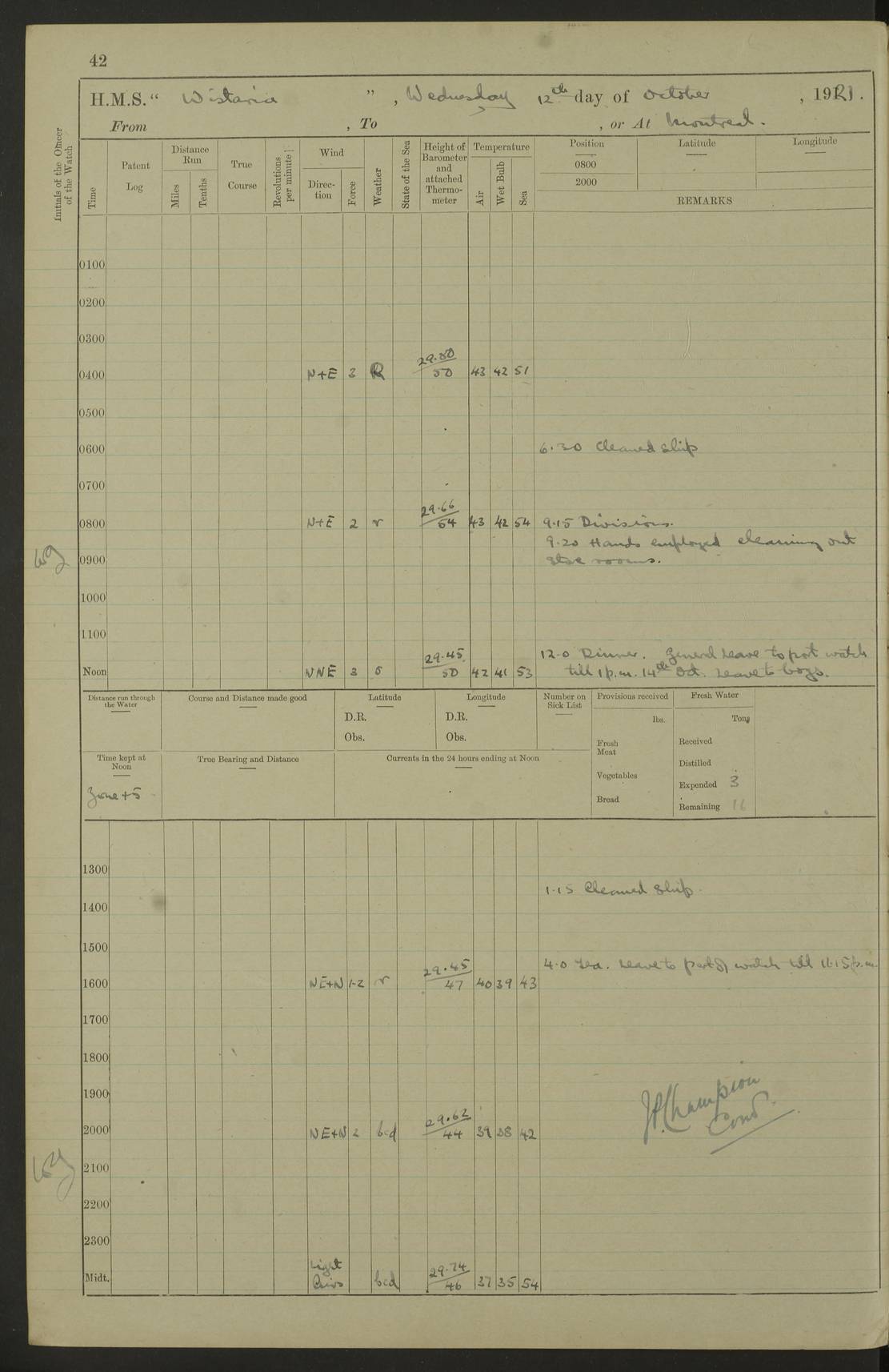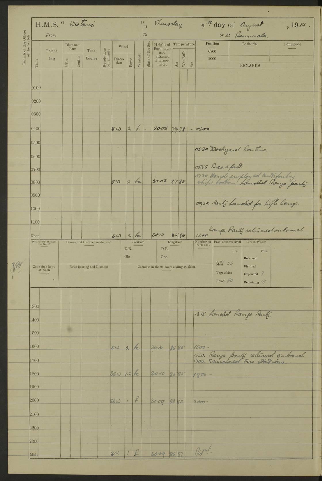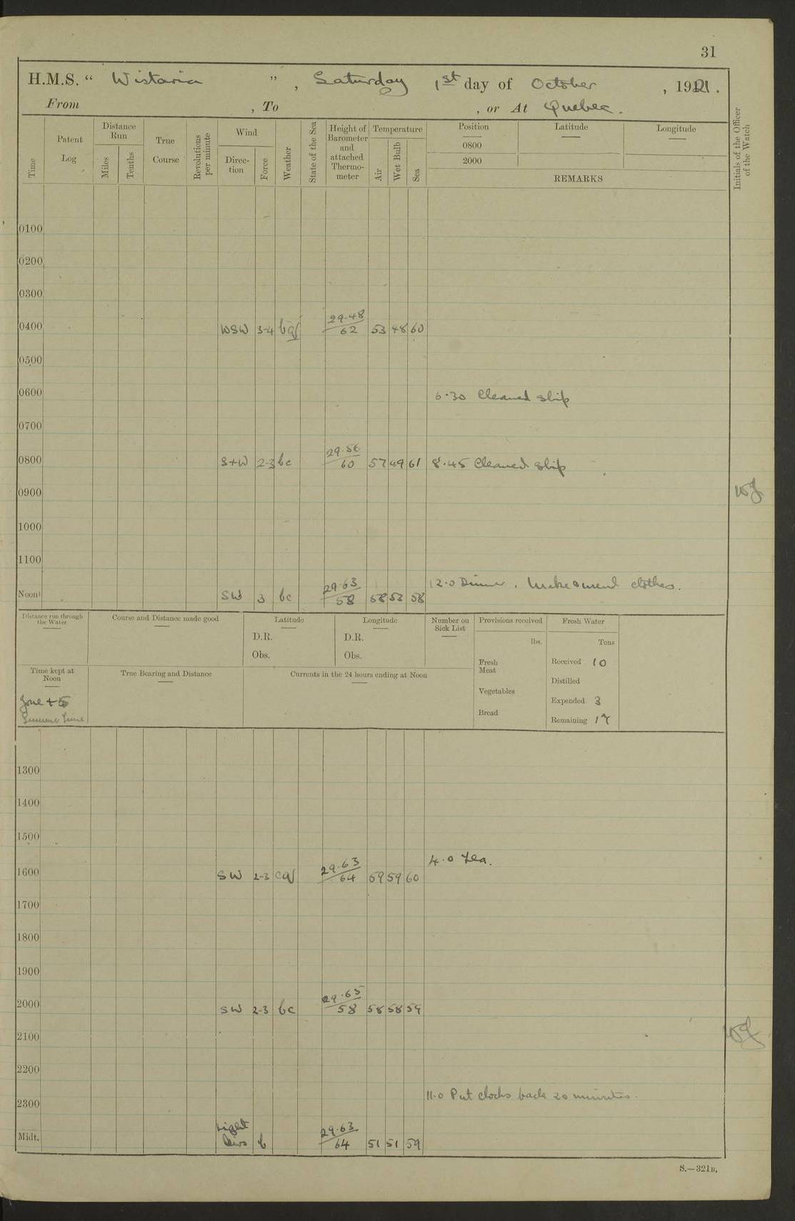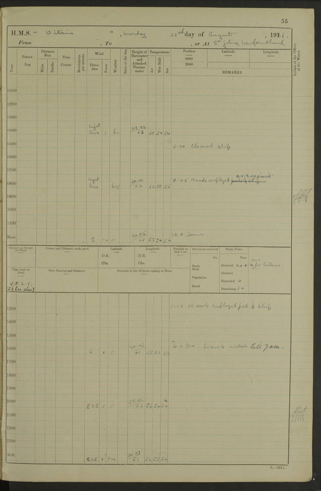 LOGS FOR SEPTEMBER 1921 4f73ca53a2fc8ea903000a89: (https://s3.amazonaws.com:443/oldweather/ADM53-93263/0003_1.jpg) 1 September 1921 At Hare Bay, Newfoundland Lat 48.85, Long -54.00 8.45am: Hands employed parts of ship 1.0pm: Hands mustered for monthly payment 1.20pm: Hands employed parts of ship 4f73ca53a2fc8ea903000a8a: (https://s3.amazonaws.com:443/oldweather/ADM53-93263/0004_0.jpg) 2 September 1921 At Hare Bay, Newfoundland Lat 48.85, Long -54.00 8.45am: Clear up decks for divisions 9.35am: Exercise Action 10.05am: Hands employed parts of ship 1.15pm: Hands employed parts of ship 4f73ca54a2fc8ea903000a8b: (https://s3.amazonaws.com:443/oldweather/ADM53-93263/0004_1.jpg) 3 September 1921 At Hare Bay, Newfoundland Lat 48.85, Long -54.00 8.45am: Cleaned ship 4.0pm: Evening Quarters 4f73ca54a2fc8ea903000a8c: (https://s3.amazonaws.com:443/oldweather/ADM53-93263/0005_0.jpg) 4 September 1921 At Hare Bay, Newfoundland Lat 48.85, Long -54.00 9.45am: Divisions & Prayers 4f73ca54a2fc8ea903000a8d: (https://s3.amazonaws.com:443/oldweather/ADM53-93263/0005_1.jpg) 5 September 1921 At Hare Bay, Newfoundland Lat 48.85, Long -54.00 8.45am: Hands employed preparing for 1” aiming rifle firing & parts of ship 9.40am: Hands resumed work 10.15am: Laid out target 10.30am: Carried out 1” aiming rifle firing 1.15pm: Hands employed parts of ship & drawing fresh water 7.0pm: Hoisted 2nd whaler & motor boat 4f73ca55a2fc8ea903000a8e: (https://s3.amazonaws.com:443/oldweather/ADM53-93263/0006_0.jpg) 6 September 1921 At Hare Bay, Newfoundland Lat 48.85, Long -54.00 9.50am: Hands employed parts of ship 1.15pm: Hands employed with parts of ship painting 4.0pm: Tea. One cell prisoner released 4f73ca55a2fc8ea903000a8f: (https://s3.amazonaws.com:443/oldweather/ADM53-93263/0006_1.jpg) 7 September 1921 At Hare Bay, Newfoundland Lat 48.85, Long -54.00 8.45am: Hands employed parts of ship 9.40am: Carried out 1” aiming rifle practice 10.40am: Hands carry on with work 1.15pm: Hands employed painting parts of ship 4f73ca55a2fc8ea903000a90: (https://s3.amazonaws.com:443/oldweather/ADM53-93263/0007_0.jpg) 8 September 1921 At Hare Bay Lat 48.85, Long -54.00 8.45am: Hands employed cleaning out boats and painting parts of ship 9.40am: Ordinary Seamen and boys to rifle drill, remainder hands part of ship 1.15pm: Hands employed cleaning skiffs and parts of ship Number on sick list: 2 4f73ca56a2fc8ea903000a91: (https://s3.amazonaws.com:443/oldweather/ADM53-93263/0007_1.jpg) 9 September 1921 At Hare Bay, Newfoundland Lat 48.85, Long -54.00 8.45am: Hands employed painting and scraping 9.45am: Rifle exercises 10.30am: Carried on with work 11.0am: Brought back target 6.0pm: Hoisted and secured boats for sea 9.30pm: Hoisted 1st whaler Number on sick list: 1 4f73ca56a2fc8ea903000a92: (https://s3.amazonaws.com:443/oldweather/ADM53-93263/0008_0.jpg) 10 September 1921 From Hare Bay to Chateau Bay Lat 51.98, Long -55.89 5.0am: Called 1st watch 5.30am: Watch fell in. Hoisted gangway 5.45am: Weighed and proceeded as requisite, 9 knots 10.40am: Sighted iceberg North 2.0pm: Course as required for entering Pitts Harbour 2.20pm: Came to with Starboard anchor 14½ faths water, veered 3 shackles Anchor bearings: East Point of Whale Island S6W; Point, right tangent, S72E; Islet, right tangent, S24E Number on sick list: 1 4f73ca57a2fc8ea903000a93: (https://s3.amazonaws.com:443/oldweather/ADM53-93263/0008_1.jpg) 11 September 1921 At Pitts Harbour, Chateau Bay Lat 51.98, Long -55.89 9.45am: Divisions 1.30pm: Libertymen landed 6.30pm: Hoisted both skiffs 8.30pm: Hoisted 1st whaler Number on sick list: 1 4f73ca57a2fc8ea903000a94: (https://s3.amazonaws.com:443/oldweather/ADM53-93263/0009_0.jpg) 12 September 1921 At Pitts Harbour, Chateau Bay Lat 51.98, Long -55.89 8.25am: Aft lower booms, clear up decks 8.45am: Weighed and proceeded as required for Temple Pass and Ship Cove Bay 9.30am: Came to Starboard anchor in 20 fths, 4 shackles 10.10am: Hands employed as required Anchor Bearings: Point, right tangent, N16W; left tangent, Whale Island S69E, Whale Island, right tangent, S35E 1.15pm: Hands employed as requisite Number on sick list: 1 4f73ca57a2fc8ea903000a95: (https://s3.amazonaws.com:443/oldweather/ADM53-93263/0009_1.jpg) 13 September 1921 At Chateau Bay Lat 51.98, Long -55.89 8.45am: Hands employed painting & scraping 10.0am: Exercised Control Parties 1.15pm: Hands employed painting & scraping Number on sick list: 1 4f73ca58a2fc8ea903000a96: (https://s3.amazonaws.com:443/oldweather/ADM53-93263/0010_0.jpg) 14 September 1921 At Chateau Bay Lat 51.98, Long -55.89 8.15am: Hands employed parts of ship and shipping .303 aiming rifles 9.45am: Ordinary Seamen & Boys & other non guns crew seamen rating to 4” drill & .303 aiming rifle practice 1.20pm: Hands employed getting up awnings, painting and scraping Number on sick list: 1 4f73ca58a2fc8ea903000a97: (https://s3.amazonaws.com:443/oldweather/ADM53-93263/0010_1.jpg) 15 September 1921 From Chateau Bay to Forteau Bay and at Chateau Bay and Forteau Bay Lat 51.61, Long -56.45 7.0am: Weighed and proceeded as required for temple pass 90 revs 9.38am: Altered course N7E and as required for firing lyddite and 1” aiming rifle shots at “growler” 11.0am: Saddle Island Lt on Starboard bow 11.52am: Saddle Island Lt on Starboard quarter 2.13pm: Amour Pt Lt Ho abeam 2.18pm: Altered course N40W and as required for anchorage 2.48pm: Came to port anchor Anchor Bearings: Admiral Pt pier, right tangent, N14W; Hawkins point, right tangent, N40E; left tangent, Coast S28W Number on sick list: 1 4f73ca58a2fc8ea903000a98: (https://s3.amazonaws.com:443/oldweather/ADM53-93263/0011_0.jpg) 16 September 1921 At Forteau Bay Lat 51.46, Long -56.93 9.0am: Clear up decks 9.45am: Landing party left ship 12.25am: Landing party returned Number on sick list: 1 4f73ca59a2fc8ea903000a99: (https://s3.amazonaws.com:443/oldweather/ADM53-93263/0011_1.jpg) 17 September 1921 At Forteau Bay Lat 51.46, Long -56.93 8.45am: Hands employed cleaning shi