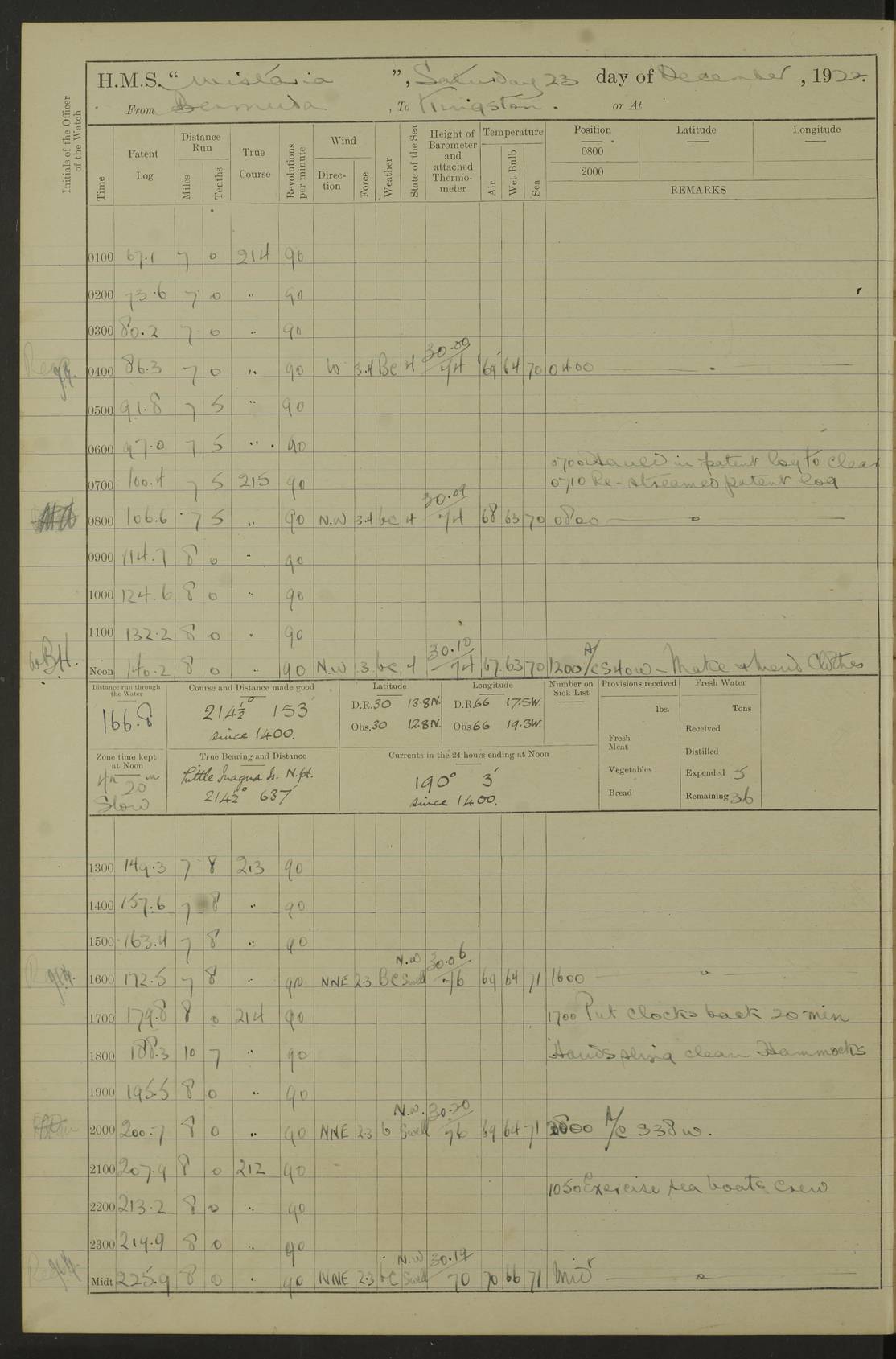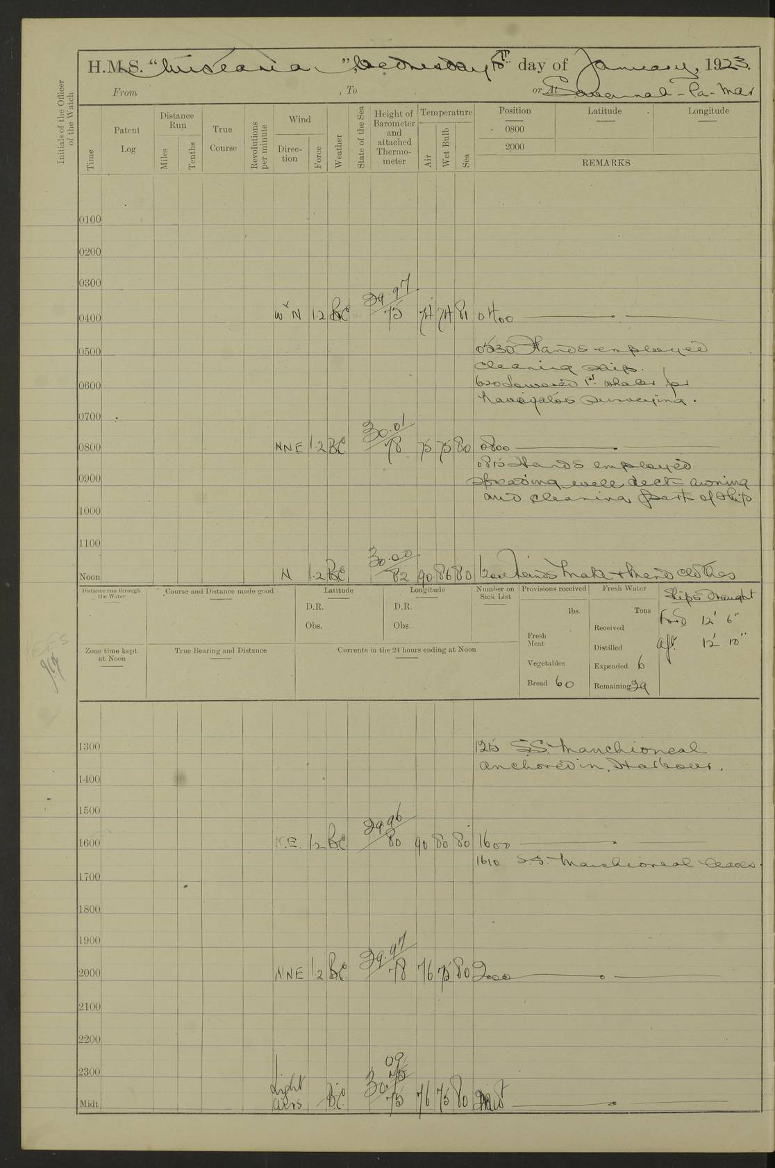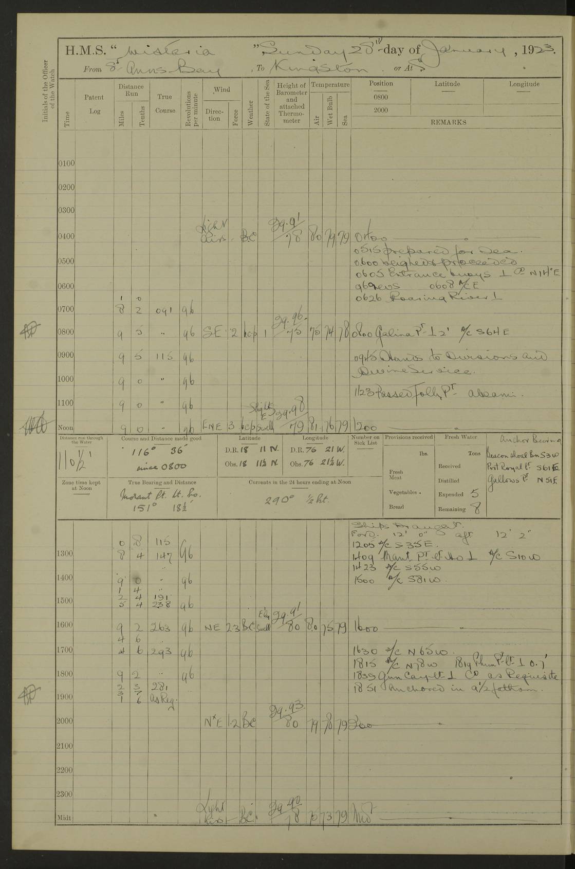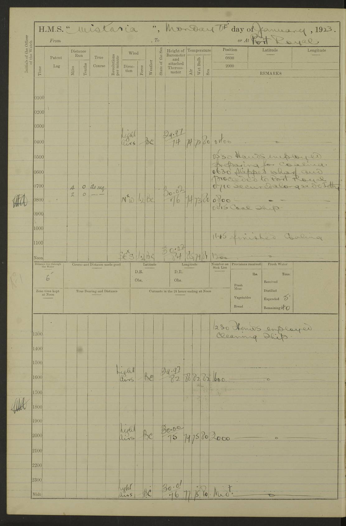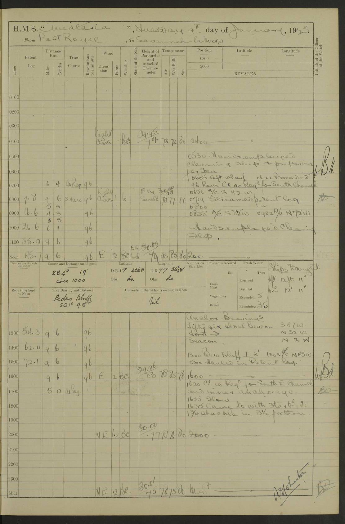 LOGS FOR JANUARY 1923 4f73cb2ca2fc8ea903000cd1: (https://s3.amazonaws.com:443/oldweather/ADM53-93271/0036_1.jpg) 1 January 1923 At Kingston (Jamaica) Lat 17.95, Long -76.76 8.15am: Hands employed painting parts of ship and dismantling after port 3 pdr 11.45am: Paid monthly wages 4f73cb2da2fc8ea903000cd2: (https://s3.amazonaws.com:443/oldweather/ADM53-93271/0037_0.jpg) 2 January 1923 At Kingston (Jamaica) Lat 17.95, Long -76.76 8.15am: Hands employed refitting whalers’ falls and dismantling 3 pdr 4f73cb2da2fc8ea903000cd3: (https://s3.amazonaws.com:443/oldweather/ADM53-93271/0037_1.jpg) 3 January 1923 At Kingston (Jamaica) Lat 17.95, Long -76.76 8.15am: Hands employed refitting skiff & motor boat falls, painting 1st & 2nd whalers, ship’s side, and dismantling 3 pdrs pm: 1 rating discharged to Hospital pm: Received 50 tons of boiler water 4f73cb2da2fc8ea903000cd4: (https://s3.amazonaws.com:443/oldweather/ADM53-93271/0038_0.jpg) 4 January 1923 At Kingston (Jamaica) Lat 17.95, Long -76.76 8.15am: Hands employed refitting boats falls and life lines 9.10am: HMS “Calcutta” came to anchor 2.0pm: Starboard watch employed painting 2nd whaler, motor boat 4f73cb2ea2fc8ea903000cd5: (https://s3.amazonaws.com:443/oldweather/ADM53-93271/0038_1.jpg) 5 January 1923 At Kingston (Jamaica) Lat 17.95, Long -76.76 8.15am: Hands employed about boats & parts of ship 2.0pm: Port watch employed painting waterways 2.30pm: 1 rating from Hospital returned onboard 4f73cb2ea2fc8ea903000cd6: (https://s3.amazonaws.com:443/oldweather/ADM53-93271/0039_0.jpg) 6 January 1923 At Kingston (Jamaica) Lat 17.95, Long -76.76 8.15am: Hands employed cleaning ship 9.05am: Air night clothing 2.0pm: Shifted billet from RMSP wharf to Number 6 wharf 8.40pm: SS “Bridgetown” arrived in harbour 10.0pm: SS “Bogota” arrived in harbour [SS “Bridgetown”: built 1920 as “Lake Fillmore”, 1923 purchased by Colombian Steamship Company, 1933 sold to Republic of Colombia, renamed “Boyaca”] [SS “Bogota”: perhaps SS “Bogota” (III) built 1919 and owned by the Pacific Steam Navigation Company] 4f73cb2ea2fc8ea903000cd7: (https://s3.amazonaws.com:443/oldweather/ADM53-93271/0039_1.jpg) 7 January 1923 At Kingston (Jamaica) Lat 17.95, Long -76.76 6.0am: Hands employed out accommodation ladder & cleaning ship 10.0am: Admiral Packenham inspects ship pm: 2 ratings discharged to hospital 4f73cb2fa2fc8ea903000cd8: (https://s3.amazonaws.com:443/oldweather/ADM53-93271/0040_0.jpg) 8 January 1923 At Port Royal Lat 17.93, Long -76.84 5.30am: Hands employed preparing for coaling 6.30am: Slipped wharf and proceeded to Port Royal 7.10am: Secured alongside jetty 8.15am: Coal ship 11.45am: Finished coaling 12.30pm: Hands employed cleaning ship 4f73cb2fa2fc8ea903000cd9: (https://s3.amazonaws.com:443/oldweather/ADM53-93271/0040_1.jpg) 9 January 1923 From Port Royal to Savannah-la-Mar Lat 17.76, Long -77.6 5.30am: Hands employed cleaning ship & preparing for sea 6.05am: Left wharf 6.22am: Proceeded 96 revs. Course as required for South Channel 7.19am: Streamed patent log Anchor Bearings: Fifty six shoal beacon S47W; Fort, right tangent, N32W; Beacon N2W 1.0pm: Pedro Bluff abeam 3 miles 3.0pm: Hauled in Patent log 4.20pm: Course as required for South E Channel and inner anchorage 4.25pm: Slow 4.35pm: Came to with Starboard anchor 1 ¾ shackle in 3½ fathoms True Bearing and Distance: Pedro Bluff 301°, 9.5 miles 4f73cb30a2fc8ea903000cda: (https://s3.amazonaws.com:443/oldweather/ADM53-93271/0041_0.jpg) 10 January 1923 At Savannah-la-Mar Lat 18.21, Long -78.13 6.20am: Lowered 1st whaler for Navigators Surveying 8.15am: Hands employed preparing well deck awning and cleaning parts of ship 12.15pm: SS “Manchioneal” anchored in harbour 4.10pm: SS “Manchioneal” leaves [SS “Manchioneal”: Norwegian steamer built 1911, chartered to United Fruit Company, 1933 sold to Iceland, renamed “Katla”] 4f73cb30a2fc8ea903000cdb: (https://s3.amazonaws.com:443/oldweather/ADM53-93271/0041_1.jpg) 11 January 1923 At Savannah-la-Mar Lat 18.21, Long -78.13 9.15am: Hands to divisions and employed refitting ridge ropes & screen 4f73cb30a2fc8ea903000cdc: (https://s3.amazonaws.com:443/oldweather/ADM53-93271/0042_0.jpg) 12 January 1923 At Savannah-la-Mar Lat 18.21, Long -78.13 8.15am: Hands employed cleaning ship 10.0am: Hands employed painting ship’s side and parts of ship 2.0pm: Starboard watch cleaning ship’s side. Leave to Port watch 3.15 to 6.30pm 4f73cb31a2fc8ea903000cdd: (https://s3.amazonaws.com:443/oldweather/ADM53-93271/0042_1.jpg) 13 January 1923 At Savannah-la-Mar Lat 18.21, Long -78.13 am: Hands employed cleaning ship and painting ship’s side 11.35am: Hoisted 1st whaler & lowered 2nd whaler 4f73cb31a2fc8ea903000cde: (https://s3.amazonaws.com:443/oldweather/ADM53-93271/0043_0.jpg) 14 January 1923 From Savannah-la-Mar to Lucea and at Lucea Lat 18.45, Long -78.16 6.0am: Hands preparing ship for sea 7.0am: Weighed, turned ship and proceeded. Course as requisite for lee passage 7.28am: Long Stag beacon abeam 9.05am: South Negril Lt Ho abeam, 15 miles. Altered course N30W 11.25am: Pedro Pt abeam. Altered course East 11.50am: Course as requires for entering Lucea Harbour 12.03pm: Anchored in 5 fathoms with 2 shackles Anchor Bearings: SW Pit Bank Beacon S78W, NE Pit Bank Beacon N82W, Flagstaff Reef N5W 1.30pm: Starboard Watch turned out motor boat and skiff [Pit Bank Beacons: Two red pole beacons, each with a triangular topmark, indicate the edge of Pit Bank. which extends 200 yards from the shore southward of Antonio Point. The northern one lies 500 yards 73° from the courthouse; the southern 300 yards 89° from the courthouse] [Flagstaff Reef: which breaks, runs 200 yards 126° from Point Antonio on the western side. An iron stake beacon, with a conical red topmark, marks the eastern extremity of this reef, with the fort bearing 283° distant 300 yards] 4f73cb31a2fc8ea903000cdf: (https://s3.amazonaws.com:443/oldweather/ADM53-93271/0043_1.jpg) 15 Ja