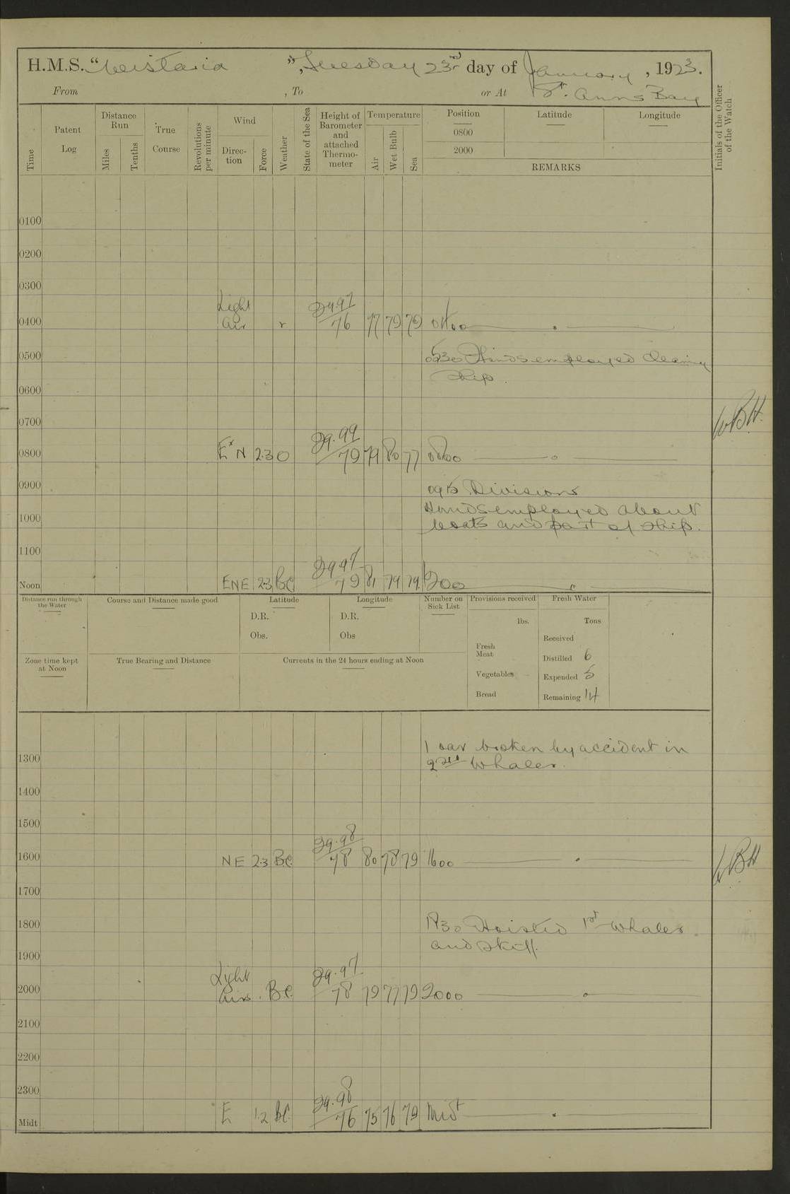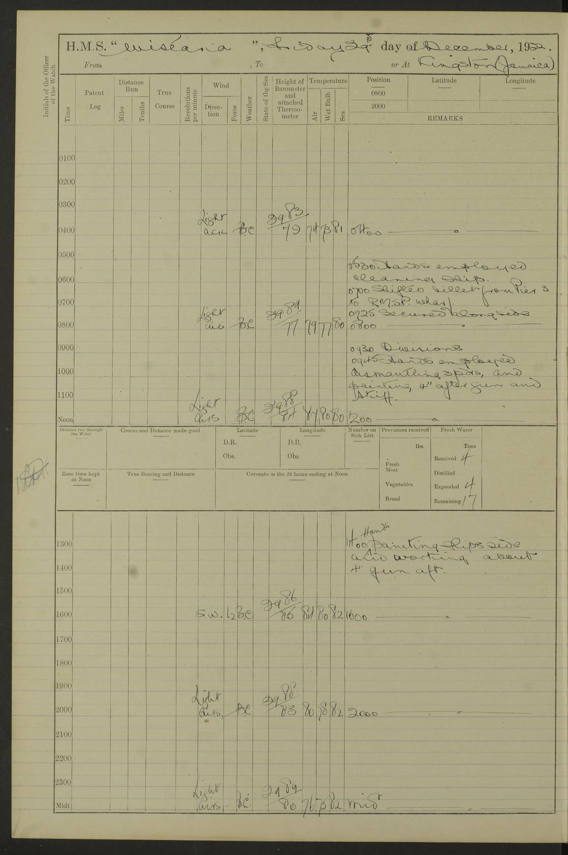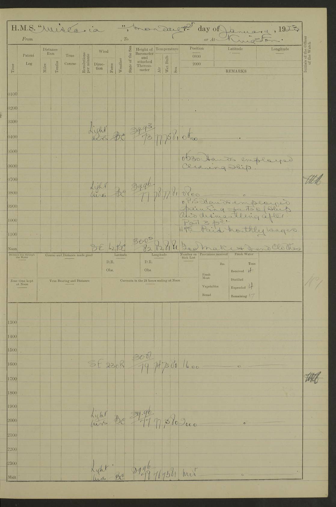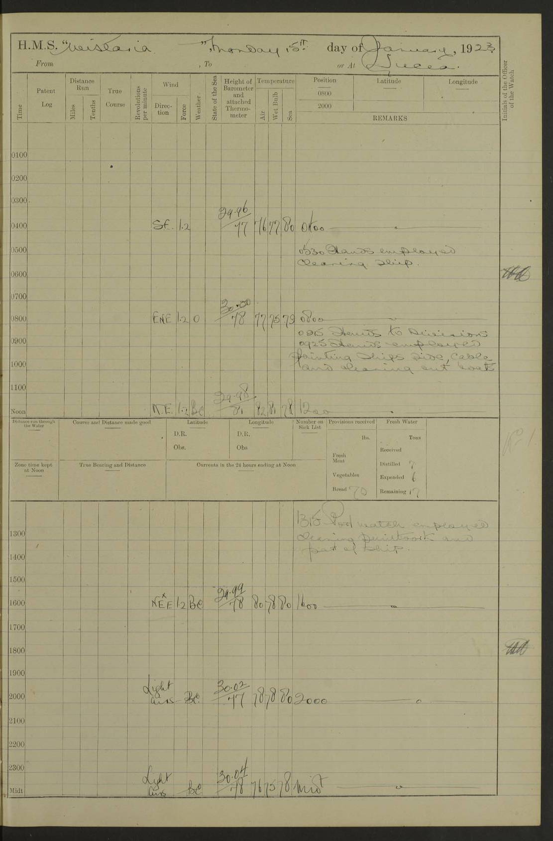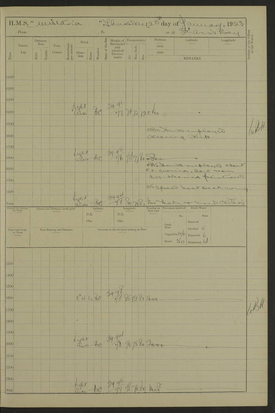 LOGS FOR JANUARY 1923 4f73cb2ca2fc8ea903000cd1: (https://s3.amazonaws.com:443/oldweather/ADM53-93271/0036_1.jpg) 1 January 1923 At Kingston (Jamaica) Lat 17.95, Long -76.76 8.15am: Hands employed painting parts of ship and dismantling after port 3 pdr 11.45am: Paid monthly wages 4f73cb2da2fc8ea903000cd2: (https://s3.amazonaws.com:443/oldweather/ADM53-93271/0037_0.jpg) 2 January 1923 At Kingston (Jamaica) Lat 17.95, Long -76.76 8.15am: Hands employed refitting whalers’ falls and dismantling 3 pdr 4f73cb2da2fc8ea903000cd3: (https://s3.amazonaws.com:443/oldweather/ADM53-93271/0037_1.jpg) 3 January 1923 At Kingston (Jamaica) Lat 17.95, Long -76.76 8.15am: Hands employed refitting skiff & motor boat falls, painting 1st & 2nd whalers, ship’s side, and dismantling 3 pdrs pm: 1 rating discharged to Hospital pm: Received 50 tons of boiler water 4f73cb2da2fc8ea903000cd4: (https://s3.amazonaws.com:443/oldweather/ADM53-93271/0038_0.jpg) 4 January 1923 At Kingston (Jamaica) Lat 17.95, Long -76.76 8.15am: Hands employed refitting boats falls and life lines 9.10am: HMS “Calcutta” came to anchor 2.0pm: Starboard watch employed painting 2nd whaler, motor boat 4f73cb2ea2fc8ea903000cd5: (https://s3.amazonaws.com:443/oldweather/ADM53-93271/0038_1.jpg) 5 January 1923 At Kingston (Jamaica) Lat 17.95, Long -76.76 8.15am: Hands employed about boats & parts of ship 2.0pm: Port watch employed painting waterways 2.30pm: 1 rating from Hospital returned onboard 4f73cb2ea2fc8ea903000cd6: (https://s3.amazonaws.com:443/oldweather/ADM53-93271/0039_0.jpg) 6 January 1923 At Kingston (Jamaica) Lat 17.95, Long -76.76 8.15am: Hands employed cleaning ship 9.05am: Air night clothing 2.0pm: Shifted billet from RMSP wharf to Number 6 wharf 8.40pm: SS “Bridgetown” arrived in harbour 10.0pm: SS “Bogota” arrived in harbour [SS “Bridgetown”: built 1920 as “Lake Fillmore”, 1923 purchased by Colombian Steamship Company, 1933 sold to Republic of Colombia, renamed “Boyaca”] [SS “Bogota”: perhaps SS “Bogota” (III) built 1919 and owned by the Pacific Steam Navigation Company] 4f73cb2ea2fc8ea903000cd7: (https://s3.amazonaws.com:443/oldweather/ADM53-93271/0039_1.jpg) 7 January 1923 At Kingston (Jamaica) Lat 17.95, Long -76.76 6.0am: Hands employed out accommodation ladder & cleaning ship 10.0am: Admiral Packenham inspects ship pm: 2 ratings discharged to hospital 4f73cb2fa2fc8ea903000cd8: (https://s3.amazonaws.com:443/oldweather/ADM53-93271/0040_0.jpg) 8 January 1923 At Port Royal Lat 17.93, Long -76.84 5.30am: Hands employed preparing for coaling 6.30am: Slipped wharf and proceeded to Port Royal 7.10am: Secured alongside jetty 8.15am: Coal ship 11.45am: Finished coaling 12.30pm: Hands employed cleaning ship 4f73cb2fa2fc8ea903000cd9: (https://s3.amazonaws.com:443/oldweather/ADM53-93271/0040_1.jpg) 9 January 1923 From Port Royal to Savannah-la-Mar Lat 17.76, Long -77.6 5.30am: Hands employed cleaning ship & preparing for sea 6.05am: Left wharf 6.22am: Proceeded 96 revs. Course as required for South Channel 7.19am: Streamed patent log Anchor Bearings: Fifty six shoal beacon S47W; Fort, right tangent, N32W; Beacon N2W 1.0pm: Pedro Bluff abeam 3 miles 3.0pm: Hauled in Patent log 4.20pm: Course as required for South E Channel and inner anchorage 4.25pm: Slow 4.35pm: Came to with Starboard anchor 1 ¾ shackle in 3½ fathoms True Bearing and Distance: Pedro Bluff 301°, 9.5 miles 4f73cb30a2fc8ea903000cda: (https://s3.amazonaws.com:443/oldweather/ADM53-93271/0041_0.jpg) 10 January 1923 At Savannah-la-Mar Lat 18.21, Long -78.13 6.20am: Lowered 1st whaler for Navigators Surveying 8.15am: Hands employed preparing well deck awning and cleaning parts of ship 12.15pm: SS “Manchioneal” anchored in harbour 4.10pm: SS “Manchioneal” leaves [SS “Manchioneal”: Norwegian steamer built 1911, chartered to United Fruit Company, 1933 sold to Iceland, renamed “Katla”] 4f73cb30a2fc8ea903000cdb: (https://s3.amazonaws.com:443/oldweather/ADM53-93271/0041_1.jpg) 11 January 1923 At Savannah-la-Mar Lat 18.21, Long -78.13 9.15am: Hands to divisions and employed refitting ridge ropes & screen 4f73cb30a2fc8ea903000cdc: (https://s3.amazonaws.com:443/oldweather/ADM53-93271/0042_0.jpg) 12 January 1923 At Savannah-la-Mar Lat 18.21, Long -78.13 8.15am: Hands employed cleaning ship 10.0am: Hands employed painting ship’s side and parts of ship 2.0pm: Starboard watch cleaning ship’s side. Leave to Port watch 3.15 to 6.30pm 4f73cb31a2fc8ea903000cdd: (https://s3.amazonaws.com:443/oldweather/ADM53-93271/0042_1.jpg) 13 January 1923 At Savannah-la-Mar Lat 18.21, Long -78.13 am: Hands employed cleaning ship and painting ship’s side 11.35am: Hoisted 1st whaler & lowered 2nd whaler 4f73cb31a2fc8ea903000cde: (https://s3.amazonaws.com:443/oldweather/ADM53-93271/0043_0.jpg) 14 January 1923 From Savannah-la-Mar to Lucea and at Lucea Lat 18.45, Long -78.16 6.0am: Hands preparing ship for sea 7.0am: Weighed, turned ship and proceeded. Course as requisite for lee passage 7.28am: Long Stag beacon abeam 9.05am: South Negril Lt Ho abeam, 15 miles. Altered course N30W 11.25am: Pedro Pt abeam. Altered course East 11.50am: Course as requires for entering Lucea Harbour 12.03pm: Anchored in 5 fathoms with 2 shackles Anchor Bearings: SW Pit Bank Beacon S78W, NE Pit Bank Beacon N82W, Flagstaff Reef N5W 1.30pm: Starboard Watch turned out motor boat and skiff [Pit Bank Beacons: Two red pole beacons, each with a triangular topmark, indicate the edge of Pit Bank. which extends 200 yards from the shore southward of Antonio Point. The northern one lies 500 yards 73° from the courthouse; the southern 300 yards 89° from the courthouse] [Flagstaff Reef: which breaks, runs 200 yards 126° from Point Antonio on the western side. An iron stake beacon, with a conical red topmark, marks the eastern extremity of this reef, with the fort bearing 283° distant 300 yards] 4f73cb31a2fc8ea903000cdf: (https://s3.amazonaws.com:443/oldweather/ADM53-93271/0043_1.jpg) 15 Ja