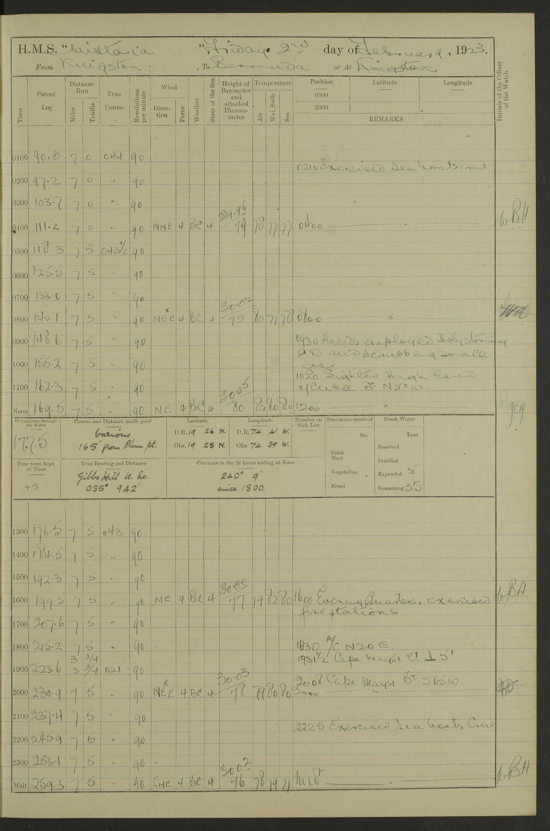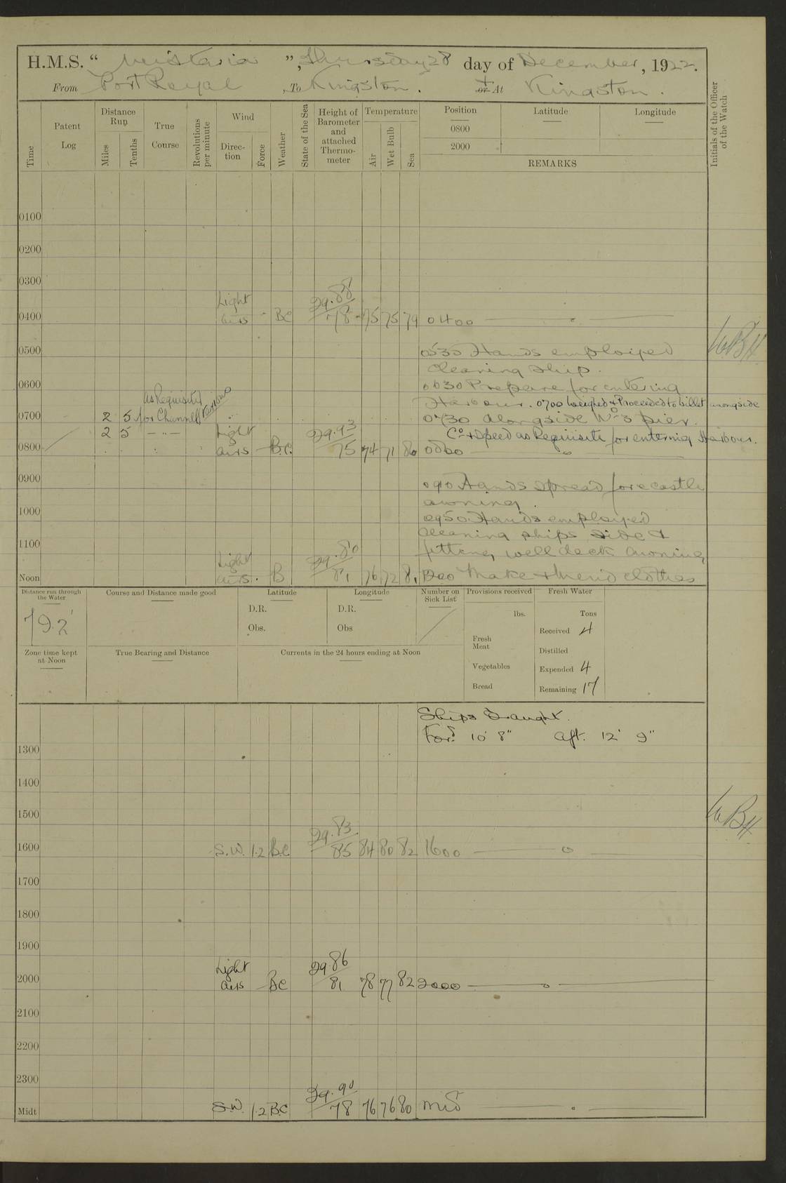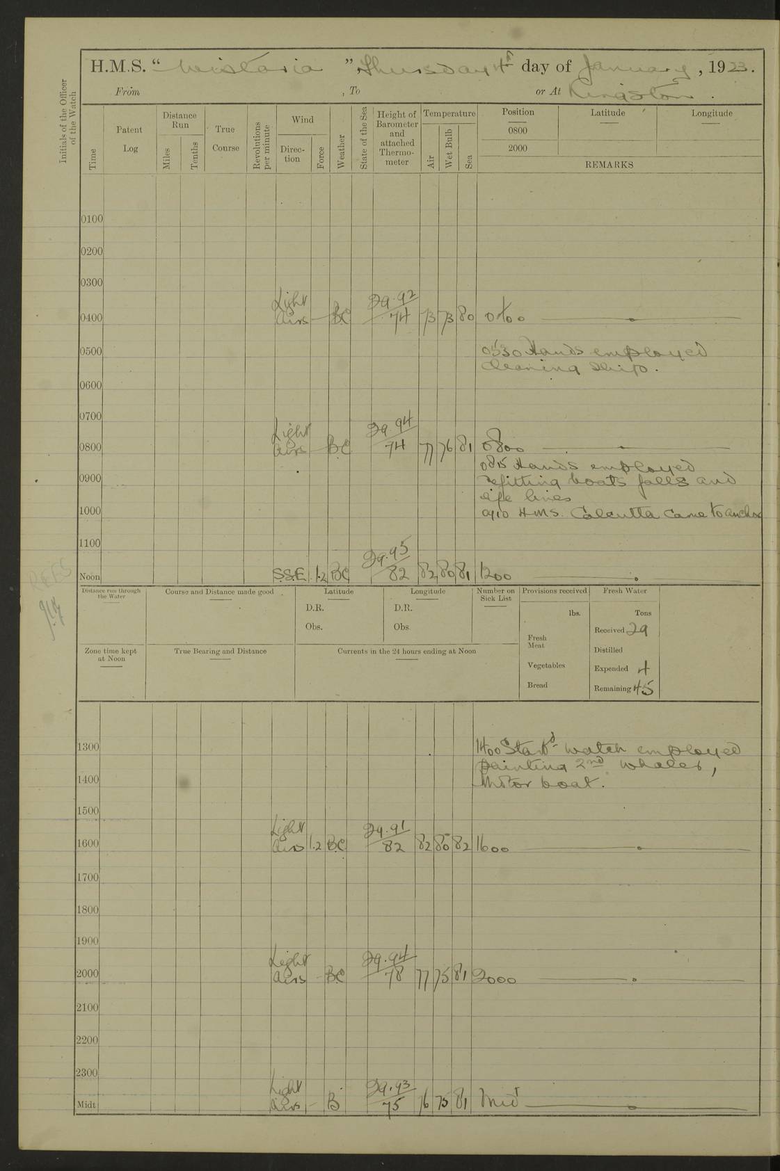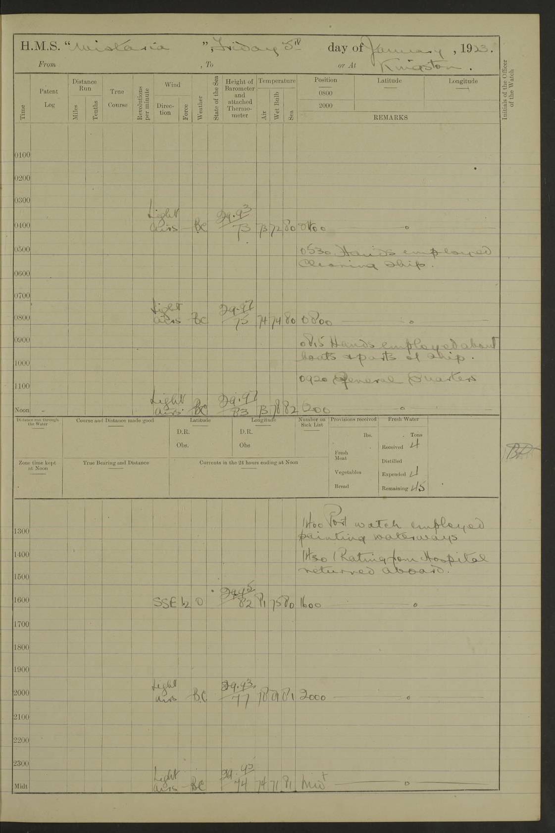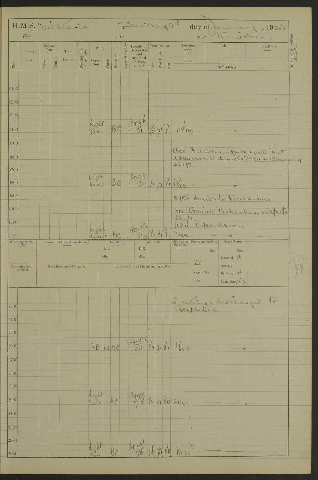 LOGS FOR JANUARY 1923 4f73cb2ca2fc8ea903000cd1: (https://s3.amazonaws.com:443/oldweather/ADM53-93271/0036_1.jpg) 1 January 1923 At Kingston (Jamaica) Lat 17.95, Long -76.76 8.15am: Hands employed painting parts of ship and dismantling after port 3 pdr 11.45am: Paid monthly wages 4f73cb2da2fc8ea903000cd2: (https://s3.amazonaws.com:443/oldweather/ADM53-93271/0037_0.jpg) 2 January 1923 At Kingston (Jamaica) Lat 17.95, Long -76.76 8.15am: Hands employed refitting whalers’ falls and dismantling 3 pdr 4f73cb2da2fc8ea903000cd3: (https://s3.amazonaws.com:443/oldweather/ADM53-93271/0037_1.jpg) 3 January 1923 At Kingston (Jamaica) Lat 17.95, Long -76.76 8.15am: Hands employed refitting skiff & motor boat falls, painting 1st & 2nd whalers, ship’s side, and dismantling 3 pdrs pm: 1 rating discharged to Hospital pm: Received 50 tons of boiler water 4f73cb2da2fc8ea903000cd4: (https://s3.amazonaws.com:443/oldweather/ADM53-93271/0038_0.jpg) 4 January 1923 At Kingston (Jamaica) Lat 17.95, Long -76.76 8.15am: Hands employed refitting boats falls and life lines 9.10am: HMS “Calcutta” came to anchor 2.0pm: Starboard watch employed painting 2nd whaler, motor boat 4f73cb2ea2fc8ea903000cd5: (https://s3.amazonaws.com:443/oldweather/ADM53-93271/0038_1.jpg) 5 January 1923 At Kingston (Jamaica) Lat 17.95, Long -76.76 8.15am: Hands employed about boats & parts of ship 2.0pm: Port watch employed painting waterways 2.30pm: 1 rating from Hospital returned onboard 4f73cb2ea2fc8ea903000cd6: (https://s3.amazonaws.com:443/oldweather/ADM53-93271/0039_0.jpg) 6 January 1923 At Kingston (Jamaica) Lat 17.95, Long -76.76 8.15am: Hands employed cleaning ship 9.05am: Air night clothing 2.0pm: Shifted billet from RMSP wharf to Number 6 wharf 8.40pm: SS “Bridgetown” arrived in harbour 10.0pm: SS “Bogota” arrived in harbour [SS “Bridgetown”: built 1920 as “Lake Fillmore”, 1923 purchased by Colombian Steamship Company, 1933 sold to Republic of Colombia, renamed “Boyaca”] [SS “Bogota”: perhaps SS “Bogota” (III) built 1919 and owned by the Pacific Steam Navigation Company] 4f73cb2ea2fc8ea903000cd7: (https://s3.amazonaws.com:443/oldweather/ADM53-93271/0039_1.jpg) 7 January 1923 At Kingston (Jamaica) Lat 17.95, Long -76.76 6.0am: Hands employed out accommodation ladder & cleaning ship 10.0am: Admiral Packenham inspects ship pm: 2 ratings discharged to hospital 4f73cb2fa2fc8ea903000cd8: (https://s3.amazonaws.com:443/oldweather/ADM53-93271/0040_0.jpg) 8 January 1923 At Port Royal Lat 17.93, Long -76.84 5.30am: Hands employed preparing for coaling 6.30am: Slipped wharf and proceeded to Port Royal 7.10am: Secured alongside jetty 8.15am: Coal ship 11.45am: Finished coaling 12.30pm: Hands employed cleaning ship 4f73cb2fa2fc8ea903000cd9: (https://s3.amazonaws.com:443/oldweather/ADM53-93271/0040_1.jpg) 9 January 1923 From Port Royal to Savannah-la-Mar Lat 17.76, Long -77.6 5.30am: Hands employed cleaning ship & preparing for sea 6.05am: Left wharf 6.22am: Proceeded 96 revs. Course as required for South Channel 7.19am: Streamed patent log Anchor Bearings: Fifty six shoal beacon S47W; Fort, right tangent, N32W; Beacon N2W 1.0pm: Pedro Bluff abeam 3 miles 3.0pm: Hauled in Patent log 4.20pm: Course as required for South E Channel and inner anchorage 4.25pm: Slow 4.35pm: Came to with Starboard anchor 1 ¾ shackle in 3½ fathoms True Bearing and Distance: Pedro Bluff 301°, 9.5 miles 4f73cb30a2fc8ea903000cda: (https://s3.amazonaws.com:443/oldweather/ADM53-93271/0041_0.jpg) 10 January 1923 At Savannah-la-Mar Lat 18.21, Long -78.13 6.20am: Lowered 1st whaler for Navigators Surveying 8.15am: Hands employed preparing well deck awning and cleaning parts of ship 12.15pm: SS “Manchioneal” anchored in harbour 4.10pm: SS “Manchioneal” leaves [SS “Manchioneal”: Norwegian steamer built 1911, chartered to United Fruit Company, 1933 sold to Iceland, renamed “Katla”] 4f73cb30a2fc8ea903000cdb: (https://s3.amazonaws.com:443/oldweather/ADM53-93271/0041_1.jpg) 11 January 1923 At Savannah-la-Mar Lat 18.21, Long -78.13 9.15am: Hands to divisions and employed refitting ridge ropes & screen 4f73cb30a2fc8ea903000cdc: (https://s3.amazonaws.com:443/oldweather/ADM53-93271/0042_0.jpg) 12 January 1923 At Savannah-la-Mar Lat 18.21, Long -78.13 8.15am: Hands employed cleaning ship 10.0am: Hands employed painting ship’s side and parts of ship 2.0pm: Starboard watch cleaning ship’s side. Leave to Port watch 3.15 to 6.30pm 4f73cb31a2fc8ea903000cdd: (https://s3.amazonaws.com:443/oldweather/ADM53-93271/0042_1.jpg) 13 January 1923 At Savannah-la-Mar Lat 18.21, Long -78.13 am: Hands employed cleaning ship and painting ship’s side 11.35am: Hoisted 1st whaler & lowered 2nd whaler 4f73cb31a2fc8ea903000cde: (https://s3.amazonaws.com:443/oldweather/ADM53-93271/0043_0.jpg) 14 January 1923 From Savannah-la-Mar to Lucea and at Lucea Lat 18.45, Long -78.16 6.0am: Hands preparing ship for sea 7.0am: Weighed, turned ship and proceeded. Course as requisite for lee passage 7.28am: Long Stag beacon abeam 9.05am: South Negril Lt Ho abeam, 15 miles. Altered course N30W 11.25am: Pedro Pt abeam. Altered course East 11.50am: Course as requires for entering Lucea Harbour 12.03pm: Anchored in 5 fathoms with 2 shackles Anchor Bearings: SW Pit Bank Beacon S78W, NE Pit Bank Beacon N82W, Flagstaff Reef N5W 1.30pm: Starboard Watch turned out motor boat and skiff [Pit Bank Beacons: Two red pole beacons, each with a triangular topmark, indicate the edge of Pit Bank. which extends 200 yards from the shore southward of Antonio Point. The northern one lies 500 yards 73° from the courthouse; the southern 300 yards 89° from the courthouse] [Flagstaff Reef: which breaks, runs 200 yards 126° from Point Antonio on the western side. An iron stake beacon, with a conical red topmark, marks the eastern extremity of this reef, with the fort bearing 283° distant 300 yards] 4f73cb31a2fc8ea903000cdf: (https://s3.amazonaws.com:443/oldweather/ADM53-93271/0043_1.jpg) 15 Ja