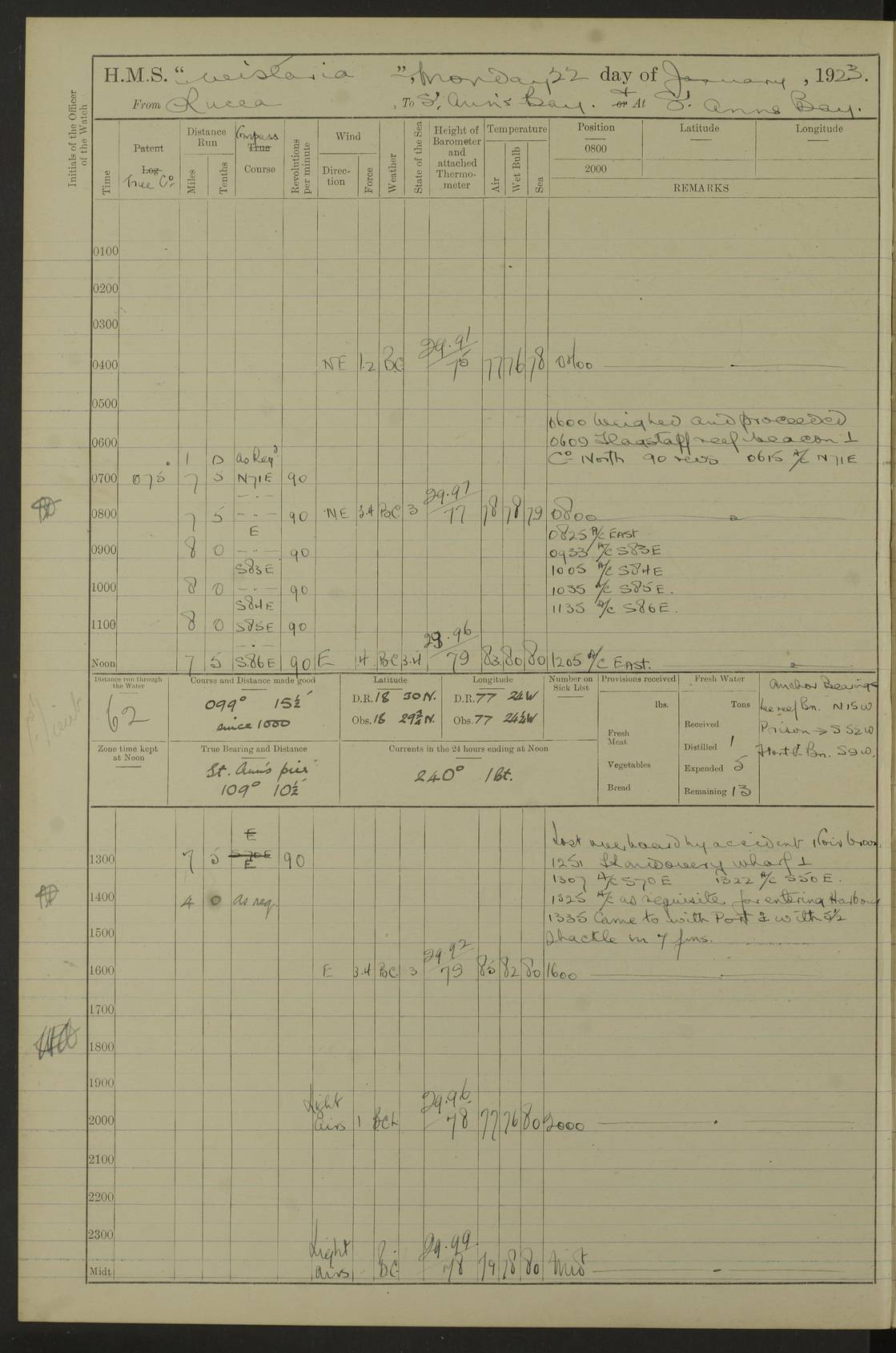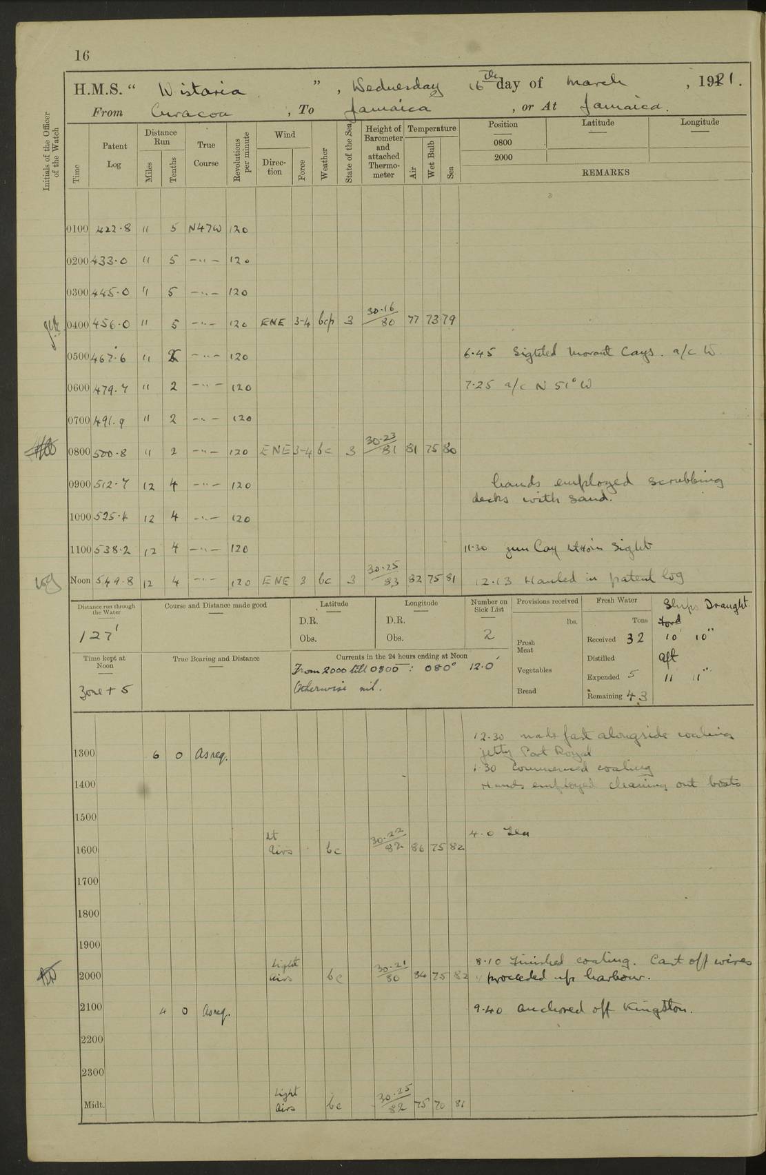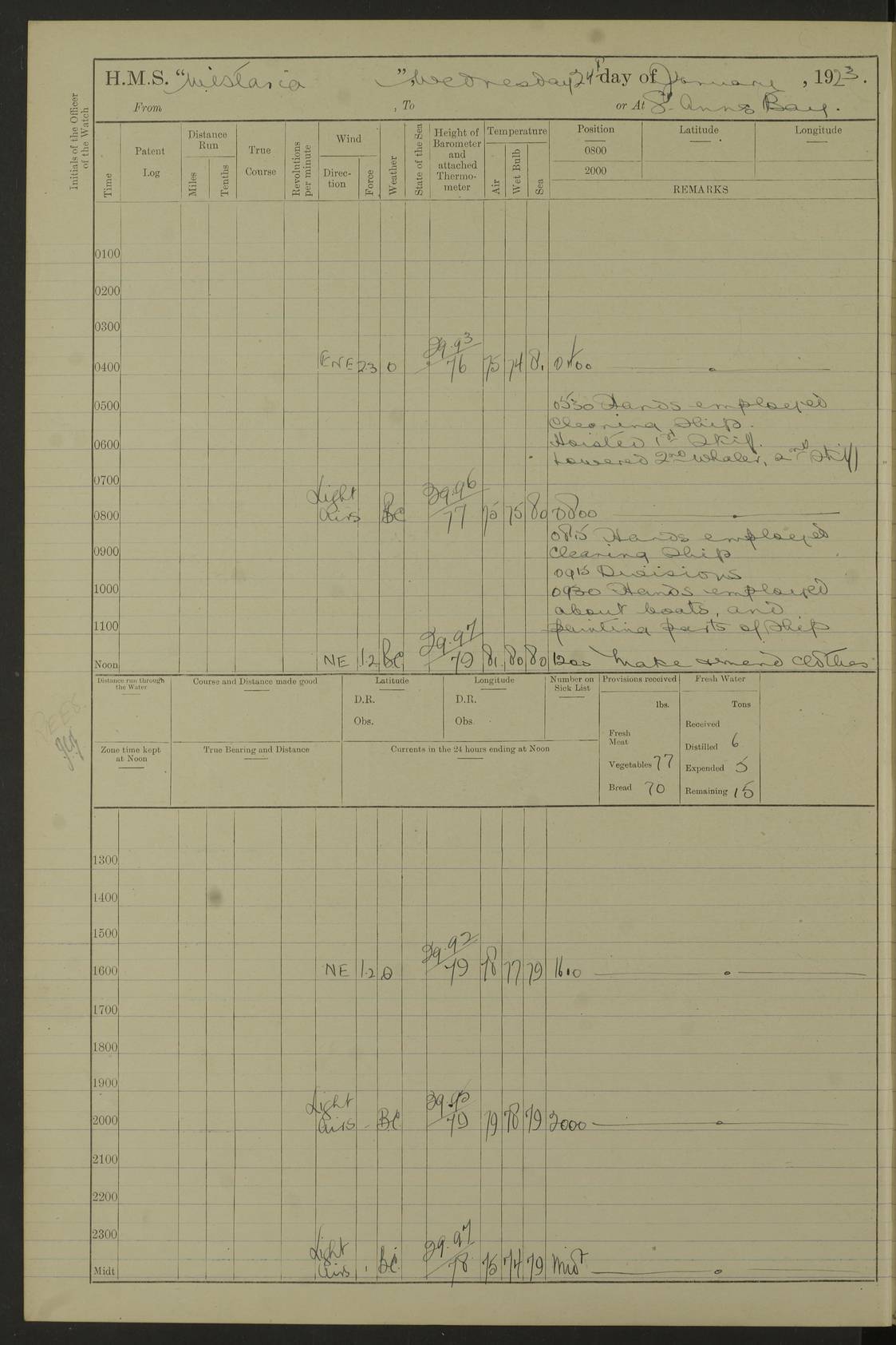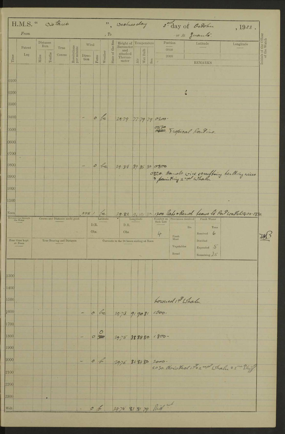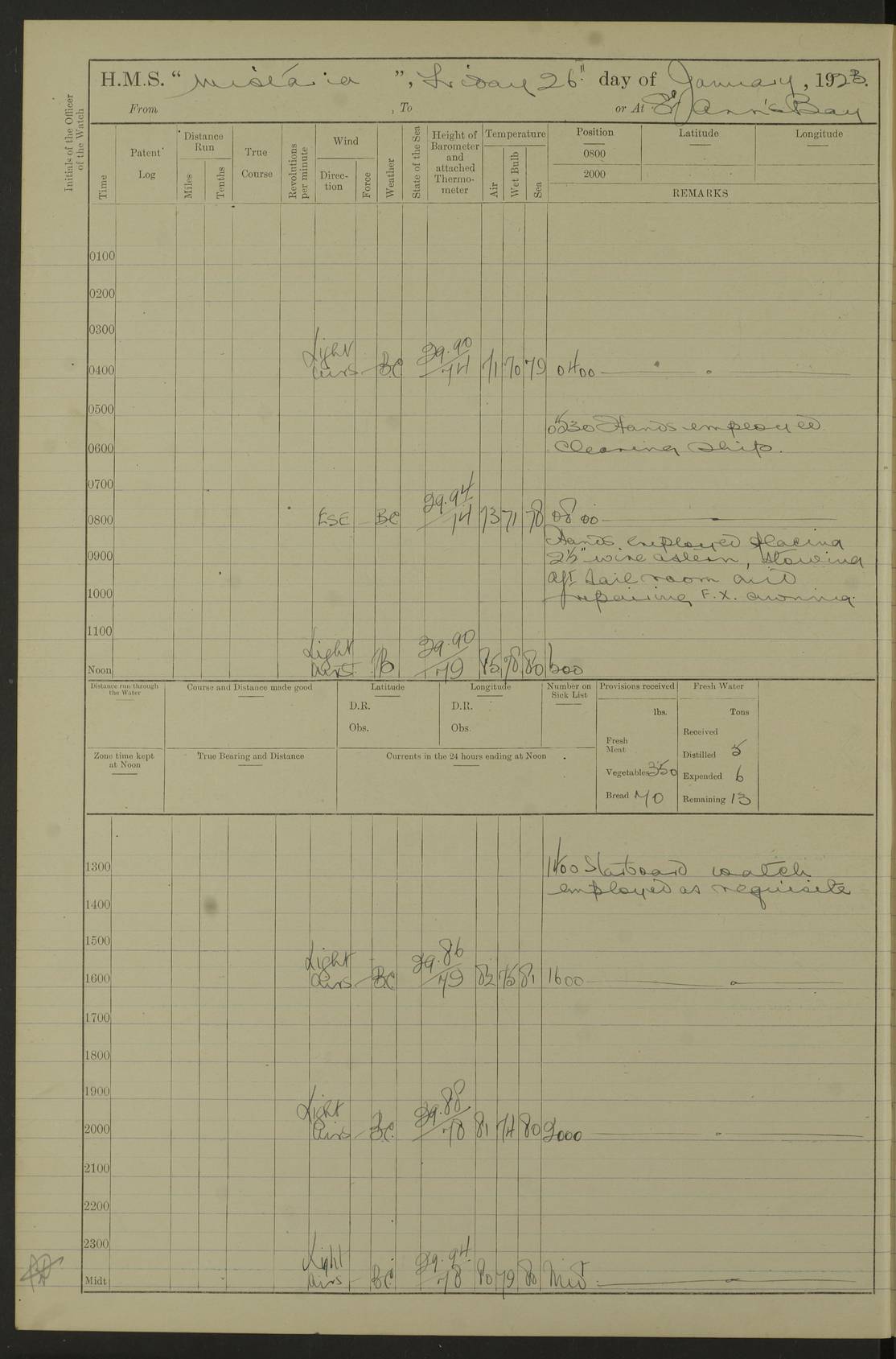 LOGS FOR JANUARY 1923 4f73cb2ca2fc8ea903000cd1: (https://s3.amazonaws.com:443/oldweather/ADM53-93271/0036_1.jpg) 1 January 1923 At Kingston (Jamaica) Lat 17.95, Long -76.76 8.15am: Hands employed painting parts of ship and dismantling after port 3 pdr 11.45am: Paid monthly wages 4f73cb2da2fc8ea903000cd2: (https://s3.amazonaws.com:443/oldweather/ADM53-93271/0037_0.jpg) 2 January 1923 At Kingston (Jamaica) Lat 17.95, Long -76.76 8.15am: Hands employed refitting whalers’ falls and dismantling 3 pdr 4f73cb2da2fc8ea903000cd3: (https://s3.amazonaws.com:443/oldweather/ADM53-93271/0037_1.jpg) 3 January 1923 At Kingston (Jamaica) Lat 17.95, Long -76.76 8.15am: Hands employed refitting skiff & motor boat falls, painting 1st & 2nd whalers, ship’s side, and dismantling 3 pdrs pm: 1 rating discharged to Hospital pm: Received 50 tons of boiler water 4f73cb2da2fc8ea903000cd4: (https://s3.amazonaws.com:443/oldweather/ADM53-93271/0038_0.jpg) 4 January 1923 At Kingston (Jamaica) Lat 17.95, Long -76.76 8.15am: Hands employed refitting boats falls and life lines 9.10am: HMS “Calcutta” came to anchor 2.0pm: Starboard watch employed painting 2nd whaler, motor boat 4f73cb2ea2fc8ea903000cd5: (https://s3.amazonaws.com:443/oldweather/ADM53-93271/0038_1.jpg) 5 January 1923 At Kingston (Jamaica) Lat 17.95, Long -76.76 8.15am: Hands employed about boats & parts of ship 2.0pm: Port watch employed painting waterways 2.30pm: 1 rating from Hospital returned onboard 4f73cb2ea2fc8ea903000cd6: (https://s3.amazonaws.com:443/oldweather/ADM53-93271/0039_0.jpg) 6 January 1923 At Kingston (Jamaica) Lat 17.95, Long -76.76 8.15am: Hands employed cleaning ship 9.05am: Air night clothing 2.0pm: Shifted billet from RMSP wharf to Number 6 wharf 8.40pm: SS “Bridgetown” arrived in harbour 10.0pm: SS “Bogota” arrived in harbour [SS “Bridgetown”: built 1920 as “Lake Fillmore”, 1923 purchased by Colombian Steamship Company, 1933 sold to Republic of Colombia, renamed “Boyaca”] [SS “Bogota”: perhaps SS “Bogota” (III) built 1919 and owned by the Pacific Steam Navigation Company] 4f73cb2ea2fc8ea903000cd7: (https://s3.amazonaws.com:443/oldweather/ADM53-93271/0039_1.jpg) 7 January 1923 At Kingston (Jamaica) Lat 17.95, Long -76.76 6.0am: Hands employed out accommodation ladder & cleaning ship 10.0am: Admiral Packenham inspects ship pm: 2 ratings discharged to hospital 4f73cb2fa2fc8ea903000cd8: (https://s3.amazonaws.com:443/oldweather/ADM53-93271/0040_0.jpg) 8 January 1923 At Port Royal Lat 17.93, Long -76.84 5.30am: Hands employed preparing for coaling 6.30am: Slipped wharf and proceeded to Port Royal 7.10am: Secured alongside jetty 8.15am: Coal ship 11.45am: Finished coaling 12.30pm: Hands employed cleaning ship 4f73cb2fa2fc8ea903000cd9: (https://s3.amazonaws.com:443/oldweather/ADM53-93271/0040_1.jpg) 9 January 1923 From Port Royal to Savannah-la-Mar Lat 17.76, Long -77.6 5.30am: Hands employed cleaning ship & preparing for sea 6.05am: Left wharf 6.22am: Proceeded 96 revs. Course as required for South Channel 7.19am: Streamed patent log Anchor Bearings: Fifty six shoal beacon S47W; Fort, right tangent, N32W; Beacon N2W 1.0pm: Pedro Bluff abeam 3 miles 3.0pm: Hauled in Patent log 4.20pm: Course as required for South E Channel and inner anchorage 4.25pm: Slow 4.35pm: Came to with Starboard anchor 1 ¾ shackle in 3½ fathoms True Bearing and Distance: Pedro Bluff 301°, 9.5 miles 4f73cb30a2fc8ea903000cda: (https://s3.amazonaws.com:443/oldweather/ADM53-93271/0041_0.jpg) 10 January 1923 At Savannah-la-Mar Lat 18.21, Long -78.13 6.20am: Lowered 1st whaler for Navigators Surveying 8.15am: Hands employed preparing well deck awning and cleaning parts of ship 12.15pm: SS “Manchioneal” anchored in harbour 4.10pm: SS “Manchioneal” leaves [SS “Manchioneal”: Norwegian steamer built 1911, chartered to United Fruit Company, 1933 sold to Iceland, renamed “Katla”] 4f73cb30a2fc8ea903000cdb: (https://s3.amazonaws.com:443/oldweather/ADM53-93271/0041_1.jpg) 11 January 1923 At Savannah-la-Mar Lat 18.21, Long -78.13 9.15am: Hands to divisions and employed refitting ridge ropes & screen 4f73cb30a2fc8ea903000cdc: (https://s3.amazonaws.com:443/oldweather/ADM53-93271/0042_0.jpg) 12 January 1923 At Savannah-la-Mar Lat 18.21, Long -78.13 8.15am: Hands employed cleaning ship 10.0am: Hands employed painting ship’s side and parts of ship 2.0pm: Starboard watch cleaning ship’s side. Leave to Port watch 3.15 to 6.30pm 4f73cb31a2fc8ea903000cdd: (https://s3.amazonaws.com:443/oldweather/ADM53-93271/0042_1.jpg) 13 January 1923 At Savannah-la-Mar Lat 18.21, Long -78.13 am: Hands employed cleaning ship and painting ship’s side 11.35am: Hoisted 1st whaler & lowered 2nd whaler 4f73cb31a2fc8ea903000cde: (https://s3.amazonaws.com:443/oldweather/ADM53-93271/0043_0.jpg) 14 January 1923 From Savannah-la-Mar to Lucea and at Lucea Lat 18.45, Long -78.16 6.0am: Hands preparing ship for sea 7.0am: Weighed, turned ship and proceeded. Course as requisite for lee passage 7.28am: Long Stag beacon abeam 9.05am: South Negril Lt Ho abeam, 15 miles. Altered course N30W 11.25am: Pedro Pt abeam. Altered course East 11.50am: Course as requires for entering Lucea Harbour 12.03pm: Anchored in 5 fathoms with 2 shackles Anchor Bearings: SW Pit Bank Beacon S78W, NE Pit Bank Beacon N82W, Flagstaff Reef N5W 1.30pm: Starboard Watch turned out motor boat and skiff [Pit Bank Beacons: Two red pole beacons, each with a triangular topmark, indicate the edge of Pit Bank. which extends 200 yards from the shore southward of Antonio Point. The northern one lies 500 yards 73° from the courthouse; the southern 300 yards 89° from the courthouse] [Flagstaff Reef: which breaks, runs 200 yards 126° from Point Antonio on the western side. An iron stake beacon, with a conical red topmark, marks the eastern extremity of this reef, with the fort bearing 283° distant 300 yards] 4f73cb31a2fc8ea903000cdf: (https://s3.amazonaws.com:443/oldweather/ADM53-93271/0043_1.jpg) 15 Ja