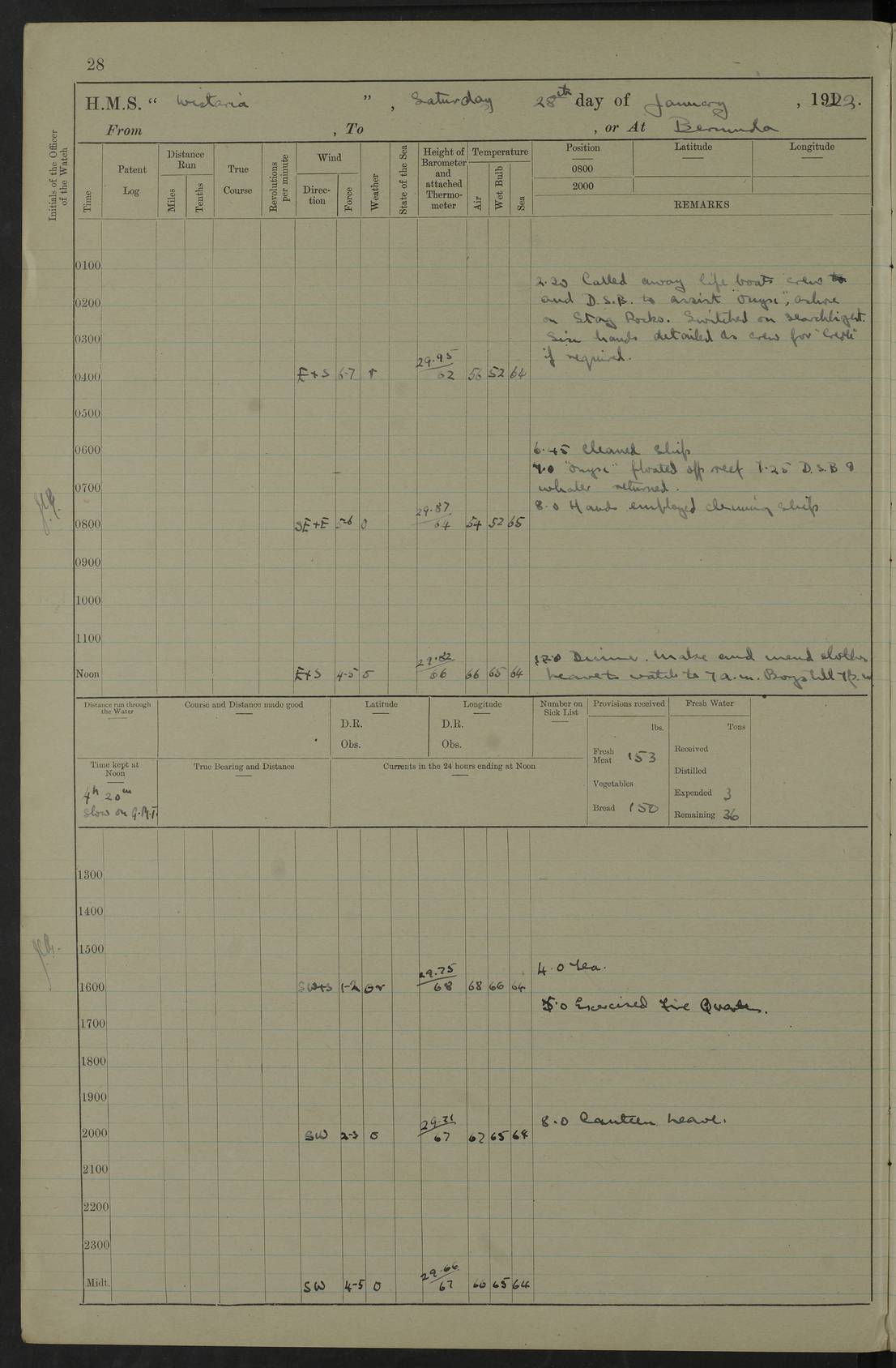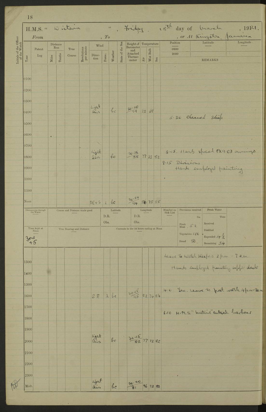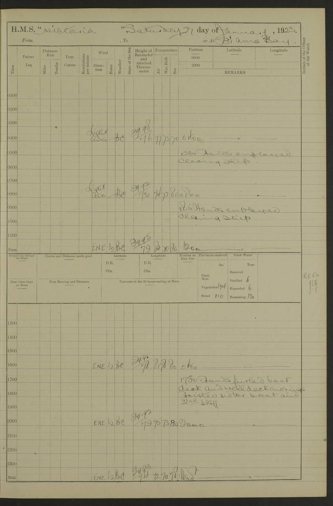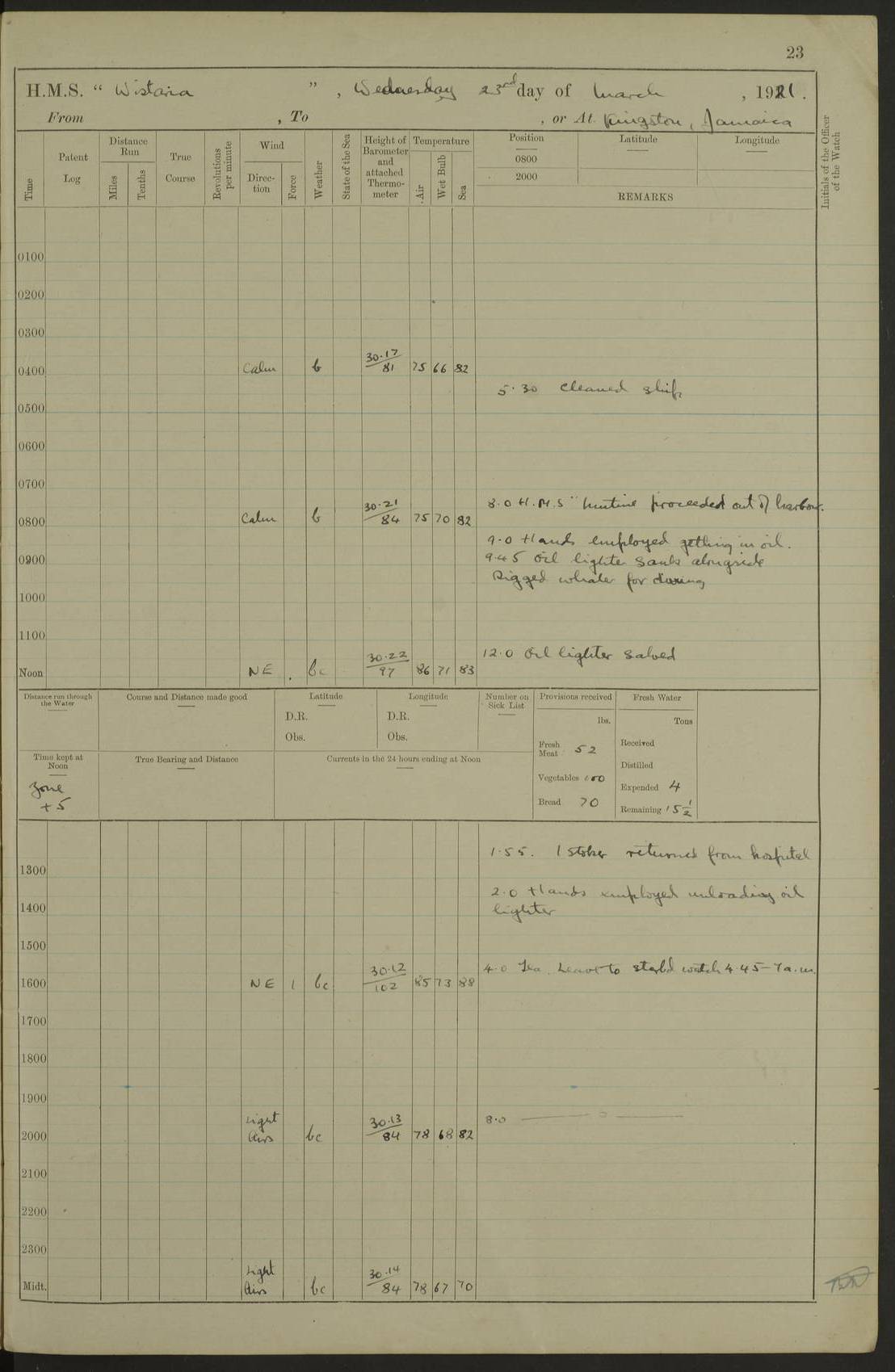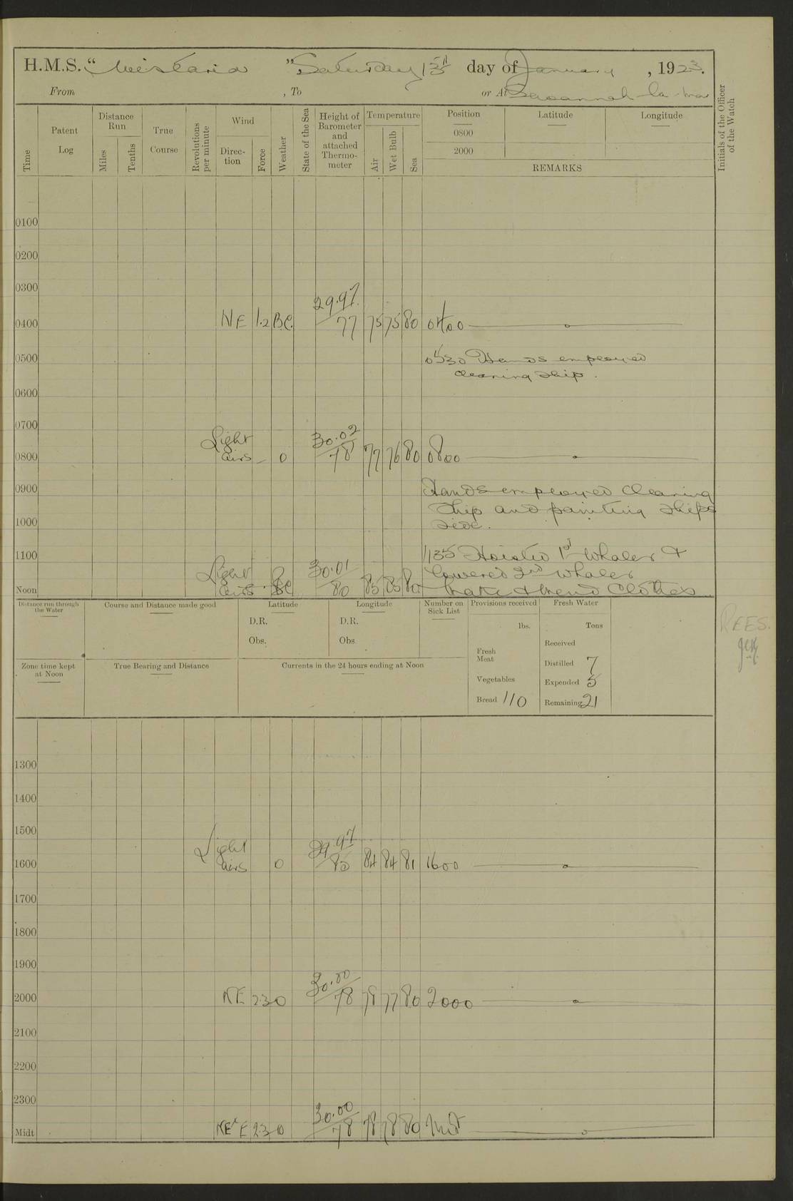 LOGS FOR JANUARY 1923 4f73cb2ca2fc8ea903000cd1: (https://s3.amazonaws.com:443/oldweather/ADM53-93271/0036_1.jpg) 1 January 1923 At Kingston (Jamaica) Lat 17.95, Long -76.76 8.15am: Hands employed painting parts of ship and dismantling after port 3 pdr 11.45am: Paid monthly wages 4f73cb2da2fc8ea903000cd2: (https://s3.amazonaws.com:443/oldweather/ADM53-93271/0037_0.jpg) 2 January 1923 At Kingston (Jamaica) Lat 17.95, Long -76.76 8.15am: Hands employed refitting whalers’ falls and dismantling 3 pdr 4f73cb2da2fc8ea903000cd3: (https://s3.amazonaws.com:443/oldweather/ADM53-93271/0037_1.jpg) 3 January 1923 At Kingston (Jamaica) Lat 17.95, Long -76.76 8.15am: Hands employed refitting skiff & motor boat falls, painting 1st & 2nd whalers, ship’s side, and dismantling 3 pdrs pm: 1 rating discharged to Hospital pm: Received 50 tons of boiler water 4f73cb2da2fc8ea903000cd4: (https://s3.amazonaws.com:443/oldweather/ADM53-93271/0038_0.jpg) 4 January 1923 At Kingston (Jamaica) Lat 17.95, Long -76.76 8.15am: Hands employed refitting boats falls and life lines 9.10am: HMS “Calcutta” came to anchor 2.0pm: Starboard watch employed painting 2nd whaler, motor boat 4f73cb2ea2fc8ea903000cd5: (https://s3.amazonaws.com:443/oldweather/ADM53-93271/0038_1.jpg) 5 January 1923 At Kingston (Jamaica) Lat 17.95, Long -76.76 8.15am: Hands employed about boats & parts of ship 2.0pm: Port watch employed painting waterways 2.30pm: 1 rating from Hospital returned onboard 4f73cb2ea2fc8ea903000cd6: (https://s3.amazonaws.com:443/oldweather/ADM53-93271/0039_0.jpg) 6 January 1923 At Kingston (Jamaica) Lat 17.95, Long -76.76 8.15am: Hands employed cleaning ship 9.05am: Air night clothing 2.0pm: Shifted billet from RMSP wharf to Number 6 wharf 8.40pm: SS “Bridgetown” arrived in harbour 10.0pm: SS “Bogota” arrived in harbour [SS “Bridgetown”: built 1920 as “Lake Fillmore”, 1923 purchased by Colombian Steamship Company, 1933 sold to Republic of Colombia, renamed “Boyaca”] [SS “Bogota”: perhaps SS “Bogota” (III) built 1919 and owned by the Pacific Steam Navigation Company] 4f73cb2ea2fc8ea903000cd7: (https://s3.amazonaws.com:443/oldweather/ADM53-93271/0039_1.jpg) 7 January 1923 At Kingston (Jamaica) Lat 17.95, Long -76.76 6.0am: Hands employed out accommodation ladder & cleaning ship 10.0am: Admiral Packenham inspects ship pm: 2 ratings discharged to hospital 4f73cb2fa2fc8ea903000cd8: (https://s3.amazonaws.com:443/oldweather/ADM53-93271/0040_0.jpg) 8 January 1923 At Port Royal Lat 17.93, Long -76.84 5.30am: Hands employed preparing for coaling 6.30am: Slipped wharf and proceeded to Port Royal 7.10am: Secured alongside jetty 8.15am: Coal ship 11.45am: Finished coaling 12.30pm: Hands employed cleaning ship 4f73cb2fa2fc8ea903000cd9: (https://s3.amazonaws.com:443/oldweather/ADM53-93271/0040_1.jpg) 9 January 1923 From Port Royal to Savannah-la-Mar Lat 17.76, Long -77.6 5.30am: Hands employed cleaning ship & preparing for sea 6.05am: Left wharf 6.22am: Proceeded 96 revs. Course as required for South Channel 7.19am: Streamed patent log Anchor Bearings: Fifty six shoal beacon S47W; Fort, right tangent, N32W; Beacon N2W 1.0pm: Pedro Bluff abeam 3 miles 3.0pm: Hauled in Patent log 4.20pm: Course as required for South E Channel and inner anchorage 4.25pm: Slow 4.35pm: Came to with Starboard anchor 1 ¾ shackle in 3½ fathoms True Bearing and Distance: Pedro Bluff 301°, 9.5 miles 4f73cb30a2fc8ea903000cda: (https://s3.amazonaws.com:443/oldweather/ADM53-93271/0041_0.jpg) 10 January 1923 At Savannah-la-Mar Lat 18.21, Long -78.13 6.20am: Lowered 1st whaler for Navigators Surveying 8.15am: Hands employed preparing well deck awning and cleaning parts of ship 12.15pm: SS “Manchioneal” anchored in harbour 4.10pm: SS “Manchioneal” leaves [SS “Manchioneal”: Norwegian steamer built 1911, chartered to United Fruit Company, 1933 sold to Iceland, renamed “Katla”] 4f73cb30a2fc8ea903000cdb: (https://s3.amazonaws.com:443/oldweather/ADM53-93271/0041_1.jpg) 11 January 1923 At Savannah-la-Mar Lat 18.21, Long -78.13 9.15am: Hands to divisions and employed refitting ridge ropes & screen 4f73cb30a2fc8ea903000cdc: (https://s3.amazonaws.com:443/oldweather/ADM53-93271/0042_0.jpg) 12 January 1923 At Savannah-la-Mar Lat 18.21, Long -78.13 8.15am: Hands employed cleaning ship 10.0am: Hands employed painting ship’s side and parts of ship 2.0pm: Starboard watch cleaning ship’s side. Leave to Port watch 3.15 to 6.30pm 4f73cb31a2fc8ea903000cdd: (https://s3.amazonaws.com:443/oldweather/ADM53-93271/0042_1.jpg) 13 January 1923 At Savannah-la-Mar Lat 18.21, Long -78.13 am: Hands employed cleaning ship and painting ship’s side 11.35am: Hoisted 1st whaler & lowered 2nd whaler 4f73cb31a2fc8ea903000cde: (https://s3.amazonaws.com:443/oldweather/ADM53-93271/0043_0.jpg) 14 January 1923 From Savannah-la-Mar to Lucea and at Lucea Lat 18.45, Long -78.16 6.0am: Hands preparing ship for sea 7.0am: Weighed, turned ship and proceeded. Course as requisite for lee passage 7.28am: Long Stag beacon abeam 9.05am: South Negril Lt Ho abeam, 15 miles. Altered course N30W 11.25am: Pedro Pt abeam. Altered course East 11.50am: Course as requires for entering Lucea Harbour 12.03pm: Anchored in 5 fathoms with 2 shackles Anchor Bearings: SW Pit Bank Beacon S78W, NE Pit Bank Beacon N82W, Flagstaff Reef N5W 1.30pm: Starboard Watch turned out motor boat and skiff [Pit Bank Beacons: Two red pole beacons, each with a triangular topmark, indicate the edge of Pit Bank. which extends 200 yards from the shore southward of Antonio Point. The northern one lies 500 yards 73° from the courthouse; the southern 300 yards 89° from the courthouse] [Flagstaff Reef: which breaks, runs 200 yards 126° from Point Antonio on the western side. An iron stake beacon, with a conical red topmark, marks the eastern extremity of this reef, with the fort bearing 283° distant 300 yards] 4f73cb31a2fc8ea903000cdf: (https://s3.amazonaws.com:443/oldweather/ADM53-93271/0043_1.jpg) 15 Ja