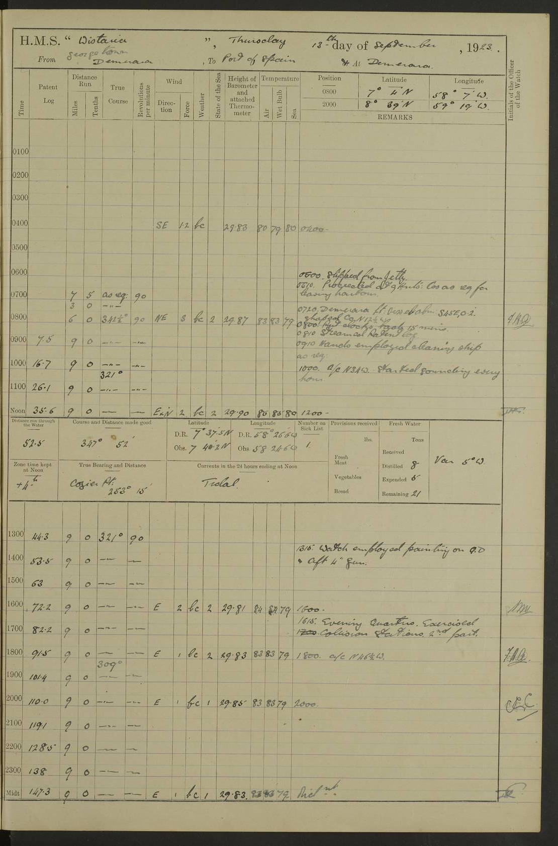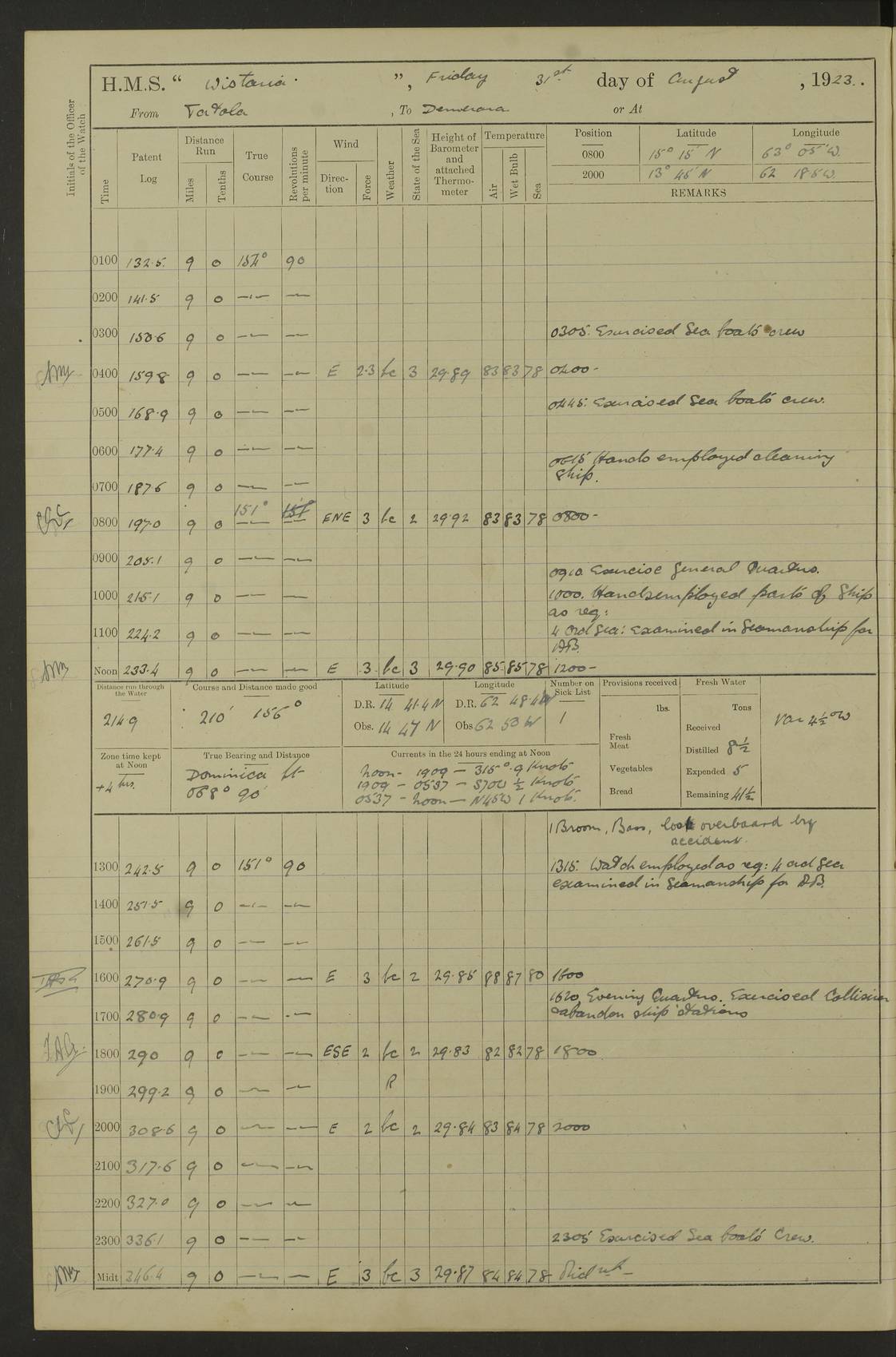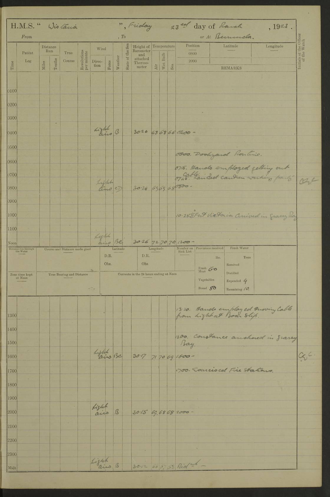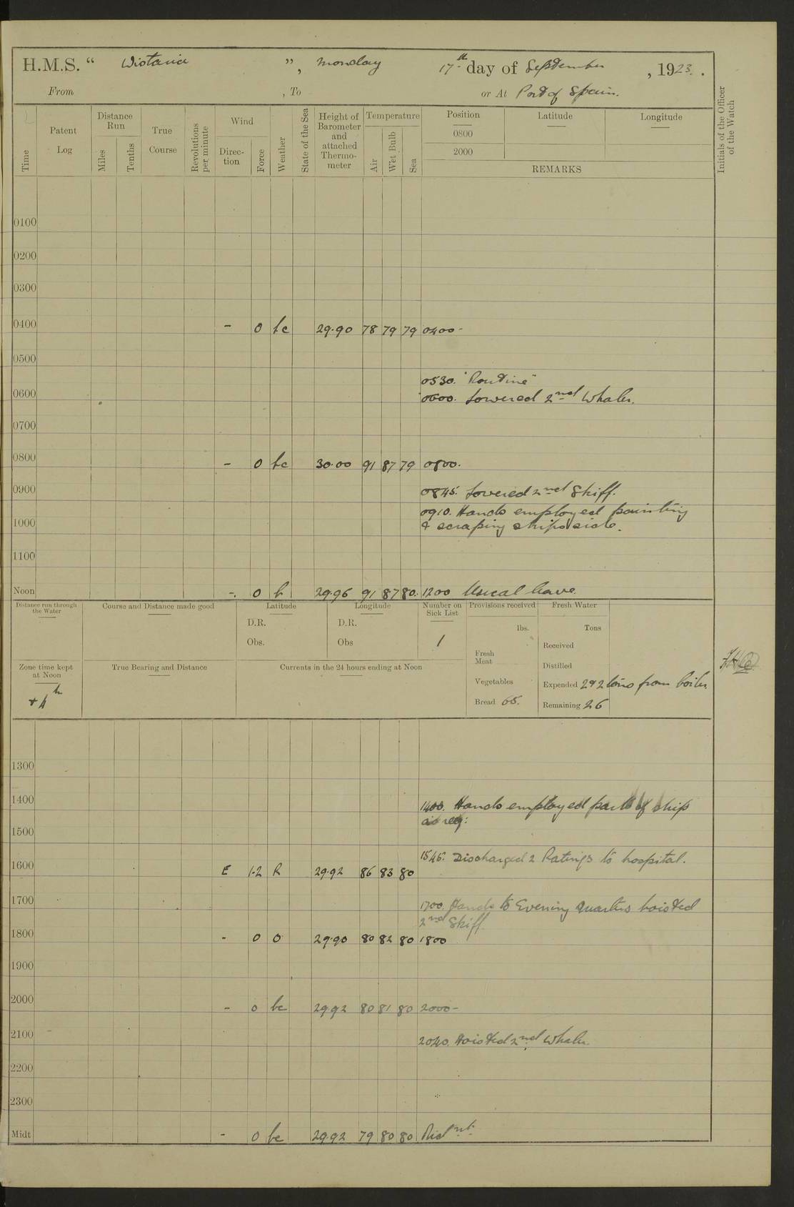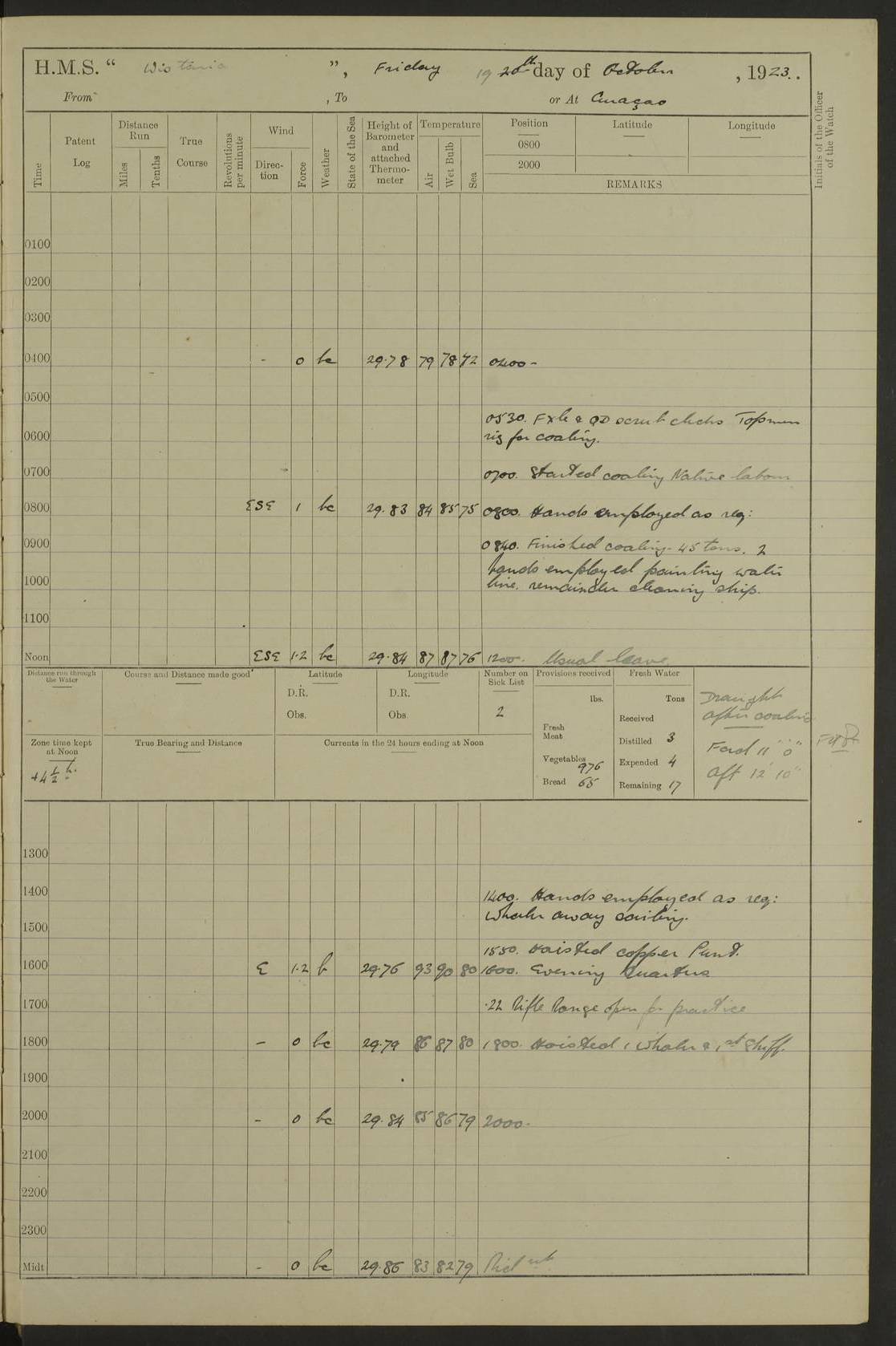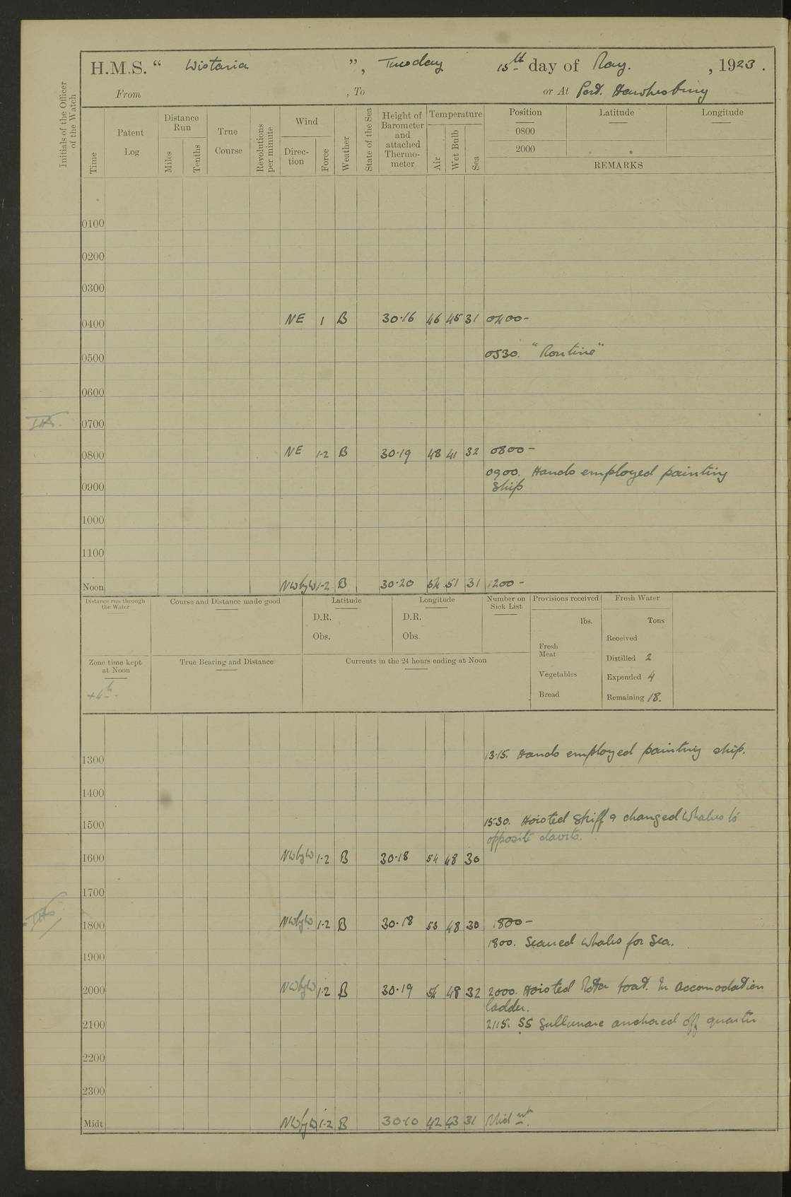 LOGS FOR JANUARY 1923 4f73cb2ca2fc8ea903000cd1: (https://s3.amazonaws.com:443/oldweather/ADM53-93271/0036_1.jpg) 1 January 1923 At Kingston (Jamaica) Lat 17.95, Long -76.76 8.15am: Hands employed painting parts of ship and dismantling after port 3 pdr 11.45am: Paid monthly wages 4f73cb2da2fc8ea903000cd2: (https://s3.amazonaws.com:443/oldweather/ADM53-93271/0037_0.jpg) 2 January 1923 At Kingston (Jamaica) Lat 17.95, Long -76.76 8.15am: Hands employed refitting whalers’ falls and dismantling 3 pdr 4f73cb2da2fc8ea903000cd3: (https://s3.amazonaws.com:443/oldweather/ADM53-93271/0037_1.jpg) 3 January 1923 At Kingston (Jamaica) Lat 17.95, Long -76.76 8.15am: Hands employed refitting skiff & motor boat falls, painting 1st & 2nd whalers, ship’s side, and dismantling 3 pdrs pm: 1 rating discharged to Hospital pm: Received 50 tons of boiler water 4f73cb2da2fc8ea903000cd4: (https://s3.amazonaws.com:443/oldweather/ADM53-93271/0038_0.jpg) 4 January 1923 At Kingston (Jamaica) Lat 17.95, Long -76.76 8.15am: Hands employed refitting boats falls and life lines 9.10am: HMS “Calcutta” came to anchor 2.0pm: Starboard watch employed painting 2nd whaler, motor boat 4f73cb2ea2fc8ea903000cd5: (https://s3.amazonaws.com:443/oldweather/ADM53-93271/0038_1.jpg) 5 January 1923 At Kingston (Jamaica) Lat 17.95, Long -76.76 8.15am: Hands employed about boats & parts of ship 2.0pm: Port watch employed painting waterways 2.30pm: 1 rating from Hospital returned onboard 4f73cb2ea2fc8ea903000cd6: (https://s3.amazonaws.com:443/oldweather/ADM53-93271/0039_0.jpg) 6 January 1923 At Kingston (Jamaica) Lat 17.95, Long -76.76 8.15am: Hands employed cleaning ship 9.05am: Air night clothing 2.0pm: Shifted billet from RMSP wharf to Number 6 wharf 8.40pm: SS “Bridgetown” arrived in harbour 10.0pm: SS “Bogota” arrived in harbour [SS “Bridgetown”: built 1920 as “Lake Fillmore”, 1923 purchased by Colombian Steamship Company, 1933 sold to Republic of Colombia, renamed “Boyaca”] [SS “Bogota”: perhaps SS “Bogota” (III) built 1919 and owned by the Pacific Steam Navigation Company] 4f73cb2ea2fc8ea903000cd7: (https://s3.amazonaws.com:443/oldweather/ADM53-93271/0039_1.jpg) 7 January 1923 At Kingston (Jamaica) Lat 17.95, Long -76.76 6.0am: Hands employed out accommodation ladder & cleaning ship 10.0am: Admiral Packenham inspects ship pm: 2 ratings discharged to hospital 4f73cb2fa2fc8ea903000cd8: (https://s3.amazonaws.com:443/oldweather/ADM53-93271/0040_0.jpg) 8 January 1923 At Port Royal Lat 17.93, Long -76.84 5.30am: Hands employed preparing for coaling 6.30am: Slipped wharf and proceeded to Port Royal 7.10am: Secured alongside jetty 8.15am: Coal ship 11.45am: Finished coaling 12.30pm: Hands employed cleaning ship 4f73cb2fa2fc8ea903000cd9: (https://s3.amazonaws.com:443/oldweather/ADM53-93271/0040_1.jpg) 9 January 1923 From Port Royal to Savannah-la-Mar Lat 17.76, Long -77.6 5.30am: Hands employed cleaning ship & preparing for sea 6.05am: Left wharf 6.22am: Proceeded 96 revs. Course as required for South Channel 7.19am: Streamed patent log Anchor Bearings: Fifty six shoal beacon S47W; Fort, right tangent, N32W; Beacon N2W 1.0pm: Pedro Bluff abeam 3 miles 3.0pm: Hauled in Patent log 4.20pm: Course as required for South E Channel and inner anchorage 4.25pm: Slow 4.35pm: Came to with Starboard anchor 1 ¾ shackle in 3½ fathoms True Bearing and Distance: Pedro Bluff 301°, 9.5 miles 4f73cb30a2fc8ea903000cda: (https://s3.amazonaws.com:443/oldweather/ADM53-93271/0041_0.jpg) 10 January 1923 At Savannah-la-Mar Lat 18.21, Long -78.13 6.20am: Lowered 1st whaler for Navigators Surveying 8.15am: Hands employed preparing well deck awning and cleaning parts of ship 12.15pm: SS “Manchioneal” anchored in harbour 4.10pm: SS “Manchioneal” leaves [SS “Manchioneal”: Norwegian steamer built 1911, chartered to United Fruit Company, 1933 sold to Iceland, renamed “Katla”] 4f73cb30a2fc8ea903000cdb: (https://s3.amazonaws.com:443/oldweather/ADM53-93271/0041_1.jpg) 11 January 1923 At Savannah-la-Mar Lat 18.21, Long -78.13 9.15am: Hands to divisions and employed refitting ridge ropes & screen 4f73cb30a2fc8ea903000cdc: (https://s3.amazonaws.com:443/oldweather/ADM53-93271/0042_0.jpg) 12 January 1923 At Savannah-la-Mar Lat 18.21, Long -78.13 8.15am: Hands employed cleaning ship 10.0am: Hands employed painting ship’s side and parts of ship 2.0pm: Starboard watch cleaning ship’s side. Leave to Port watch 3.15 to 6.30pm 4f73cb31a2fc8ea903000cdd: (https://s3.amazonaws.com:443/oldweather/ADM53-93271/0042_1.jpg) 13 January 1923 At Savannah-la-Mar Lat 18.21, Long -78.13 am: Hands employed cleaning ship and painting ship’s side 11.35am: Hoisted 1st whaler & lowered 2nd whaler 4f73cb31a2fc8ea903000cde: (https://s3.amazonaws.com:443/oldweather/ADM53-93271/0043_0.jpg) 14 January 1923 From Savannah-la-Mar to Lucea and at Lucea Lat 18.45, Long -78.16 6.0am: Hands preparing ship for sea 7.0am: Weighed, turned ship and proceeded. Course as requisite for lee passage 7.28am: Long Stag beacon abeam 9.05am: South Negril Lt Ho abeam, 15 miles. Altered course N30W 11.25am: Pedro Pt abeam. Altered course East 11.50am: Course as requires for entering Lucea Harbour 12.03pm: Anchored in 5 fathoms with 2 shackles Anchor Bearings: SW Pit Bank Beacon S78W, NE Pit Bank Beacon N82W, Flagstaff Reef N5W 1.30pm: Starboard Watch turned out motor boat and skiff [Pit Bank Beacons: Two red pole beacons, each with a triangular topmark, indicate the edge of Pit Bank. which extends 200 yards from the shore southward of Antonio Point. The northern one lies 500 yards 73° from the courthouse; the southern 300 yards 89° from the courthouse] [Flagstaff Reef: which breaks, runs 200 yards 126° from Point Antonio on the western side. An iron stake beacon, with a conical red topmark, marks the eastern extremity of this reef, with the fort bearing 283° distant 300 yards] 4f73cb31a2fc8ea903000cdf: (https://s3.amazonaws.com:443/oldweather/ADM53-93271/0043_1.jpg) 15 Ja