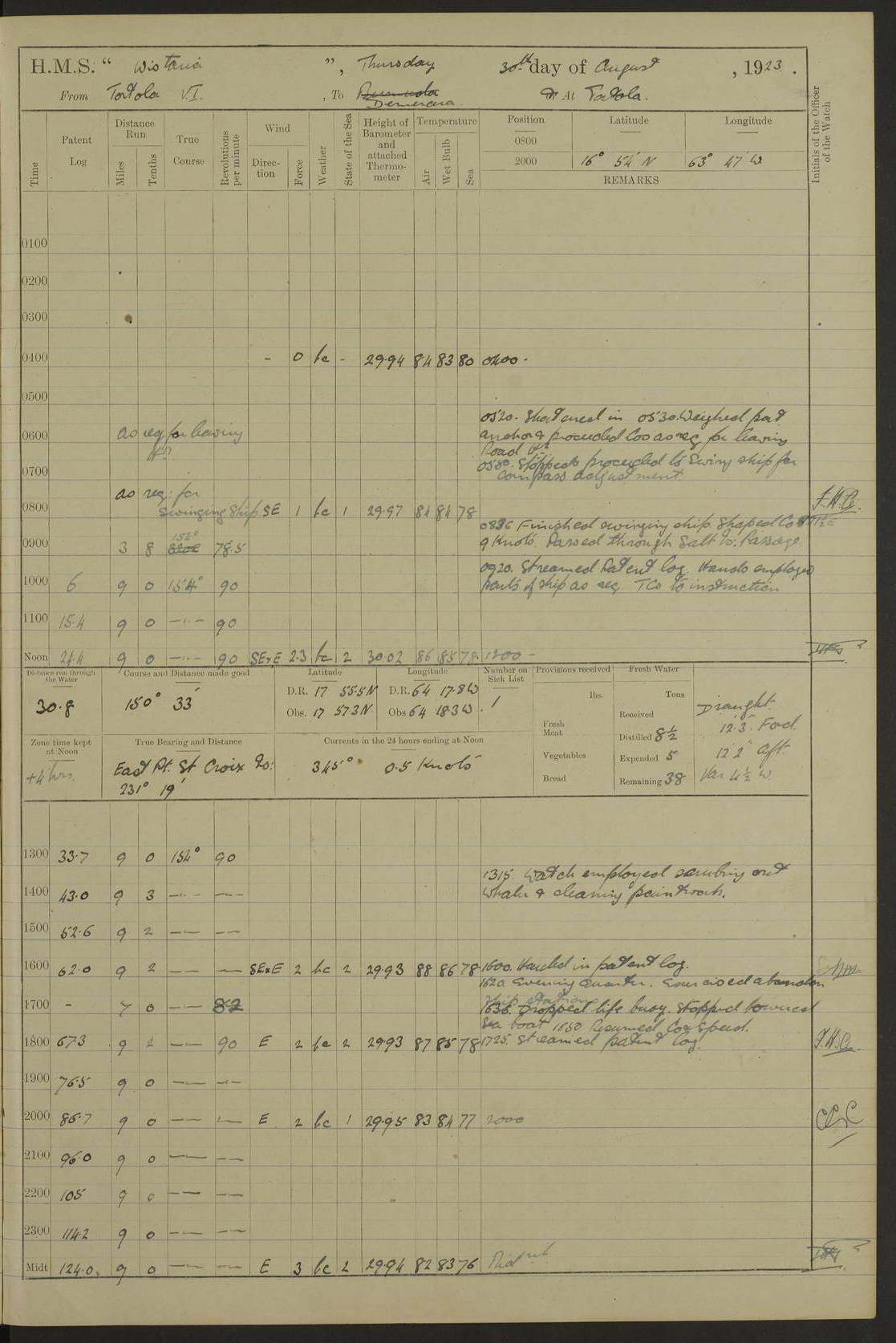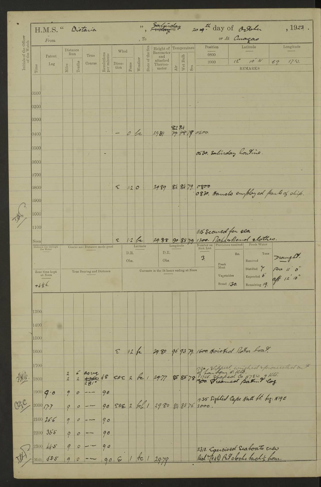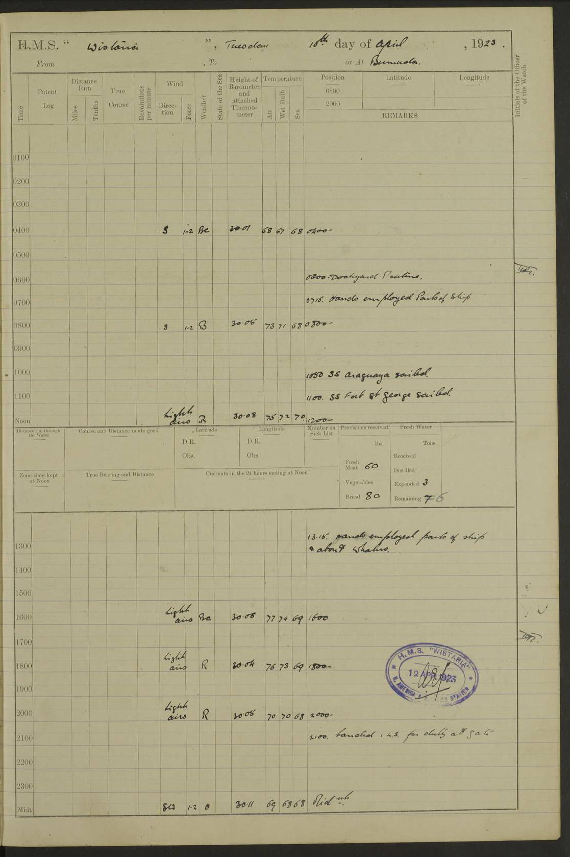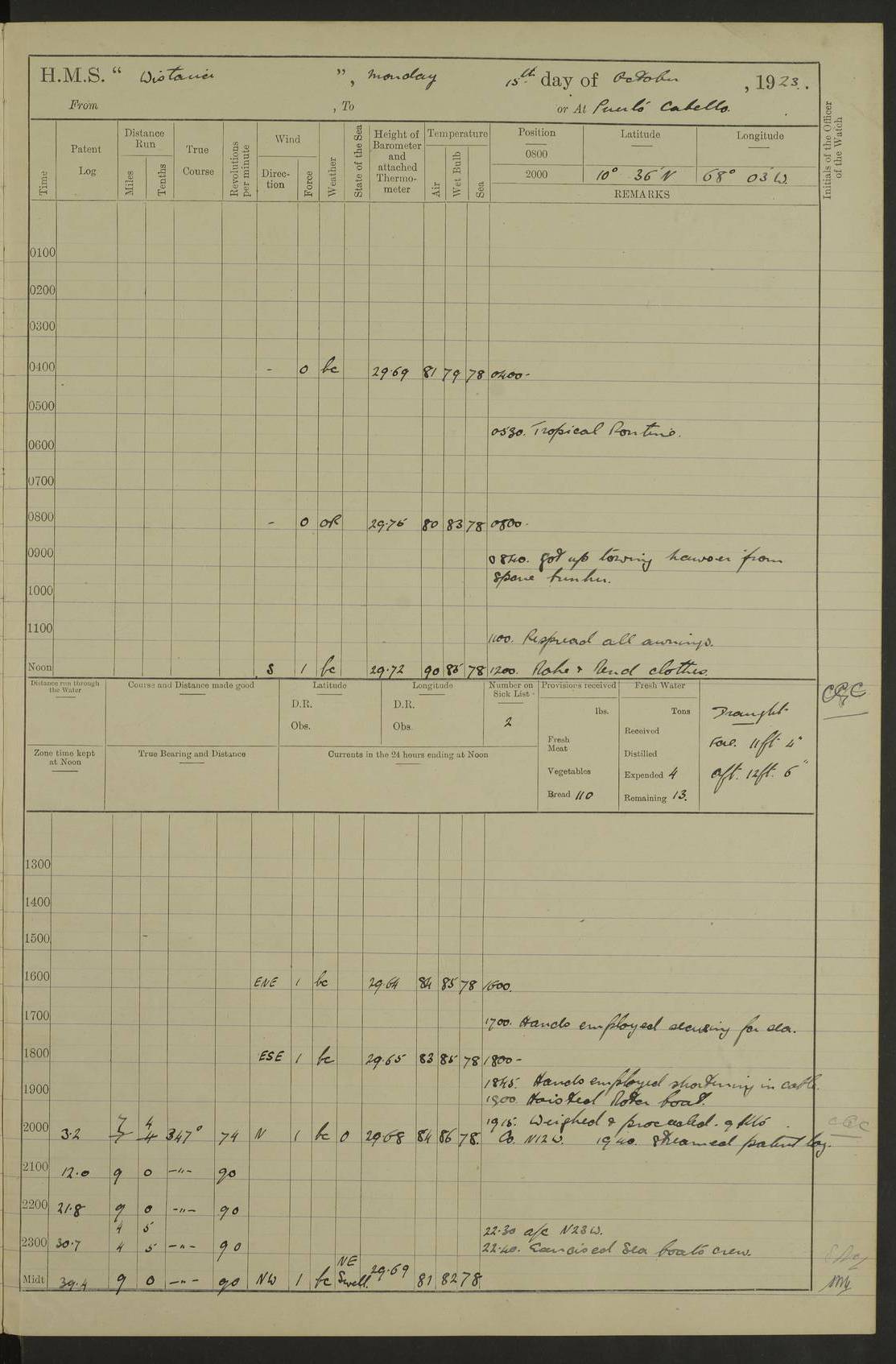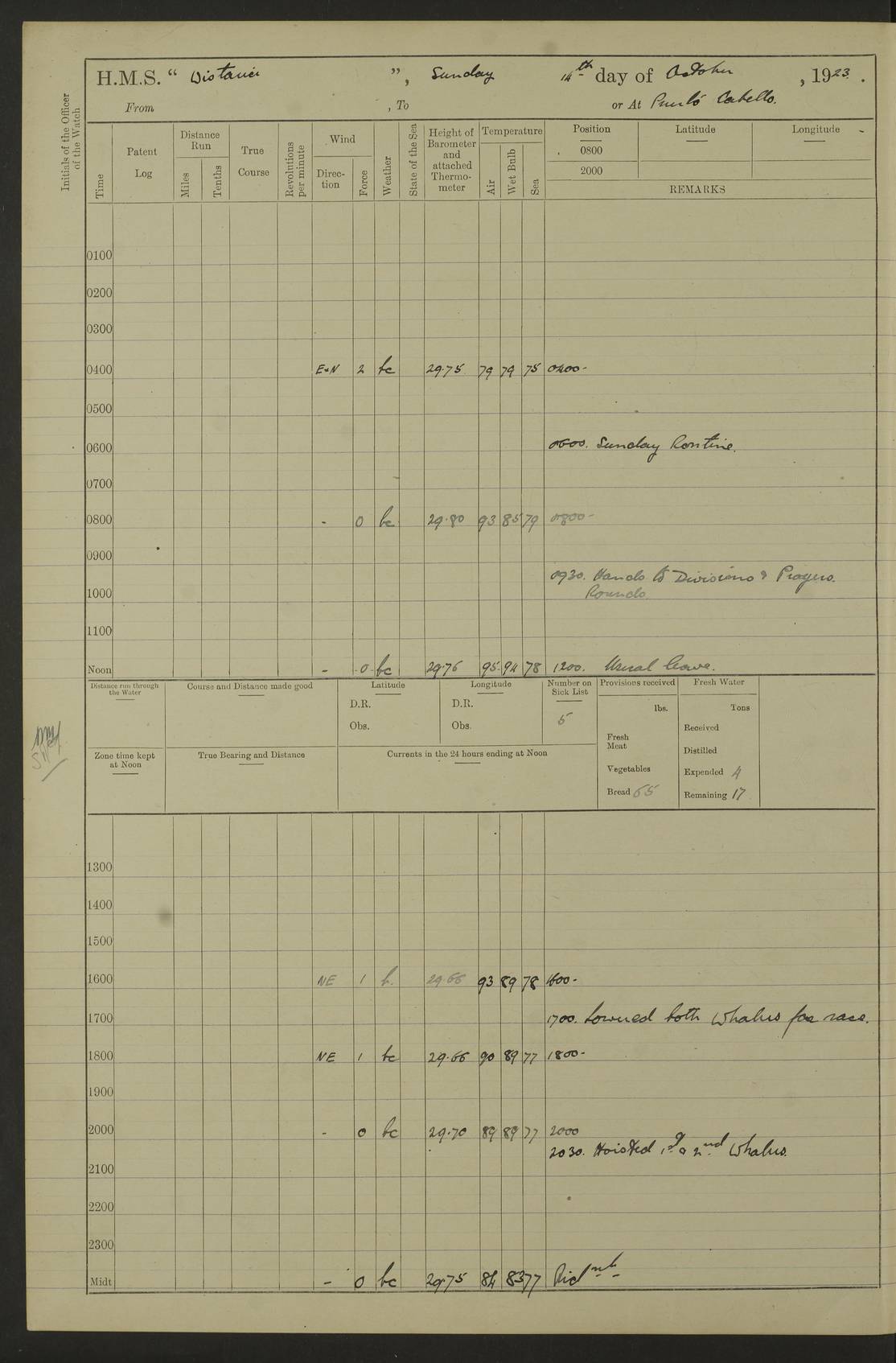 LOGS FOR JANUARY 1923 4f73cb2ca2fc8ea903000cd1: (https://s3.amazonaws.com:443/oldweather/ADM53-93271/0036_1.jpg) 1 January 1923 At Kingston (Jamaica) Lat 17.95, Long -76.76 8.15am: Hands employed painting parts of ship and dismantling after port 3 pdr 11.45am: Paid monthly wages 4f73cb2da2fc8ea903000cd2: (https://s3.amazonaws.com:443/oldweather/ADM53-93271/0037_0.jpg) 2 January 1923 At Kingston (Jamaica) Lat 17.95, Long -76.76 8.15am: Hands employed refitting whalers’ falls and dismantling 3 pdr 4f73cb2da2fc8ea903000cd3: (https://s3.amazonaws.com:443/oldweather/ADM53-93271/0037_1.jpg) 3 January 1923 At Kingston (Jamaica) Lat 17.95, Long -76.76 8.15am: Hands employed refitting skiff & motor boat falls, painting 1st & 2nd whalers, ship’s side, and dismantling 3 pdrs pm: 1 rating discharged to Hospital pm: Received 50 tons of boiler water 4f73cb2da2fc8ea903000cd4: (https://s3.amazonaws.com:443/oldweather/ADM53-93271/0038_0.jpg) 4 January 1923 At Kingston (Jamaica) Lat 17.95, Long -76.76 8.15am: Hands employed refitting boats falls and life lines 9.10am: HMS “Calcutta” came to anchor 2.0pm: Starboard watch employed painting 2nd whaler, motor boat 4f73cb2ea2fc8ea903000cd5: (https://s3.amazonaws.com:443/oldweather/ADM53-93271/0038_1.jpg) 5 January 1923 At Kingston (Jamaica) Lat 17.95, Long -76.76 8.15am: Hands employed about boats & parts of ship 2.0pm: Port watch employed painting waterways 2.30pm: 1 rating from Hospital returned onboard 4f73cb2ea2fc8ea903000cd6: (https://s3.amazonaws.com:443/oldweather/ADM53-93271/0039_0.jpg) 6 January 1923 At Kingston (Jamaica) Lat 17.95, Long -76.76 8.15am: Hands employed cleaning ship 9.05am: Air night clothing 2.0pm: Shifted billet from RMSP wharf to Number 6 wharf 8.40pm: SS “Bridgetown” arrived in harbour 10.0pm: SS “Bogota” arrived in harbour [SS “Bridgetown”: built 1920 as “Lake Fillmore”, 1923 purchased by Colombian Steamship Company, 1933 sold to Republic of Colombia, renamed “Boyaca”] [SS “Bogota”: perhaps SS “Bogota” (III) built 1919 and owned by the Pacific Steam Navigation Company] 4f73cb2ea2fc8ea903000cd7: (https://s3.amazonaws.com:443/oldweather/ADM53-93271/0039_1.jpg) 7 January 1923 At Kingston (Jamaica) Lat 17.95, Long -76.76 6.0am: Hands employed out accommodation ladder & cleaning ship 10.0am: Admiral Packenham inspects ship pm: 2 ratings discharged to hospital 4f73cb2fa2fc8ea903000cd8: (https://s3.amazonaws.com:443/oldweather/ADM53-93271/0040_0.jpg) 8 January 1923 At Port Royal Lat 17.93, Long -76.84 5.30am: Hands employed preparing for coaling 6.30am: Slipped wharf and proceeded to Port Royal 7.10am: Secured alongside jetty 8.15am: Coal ship 11.45am: Finished coaling 12.30pm: Hands employed cleaning ship 4f73cb2fa2fc8ea903000cd9: (https://s3.amazonaws.com:443/oldweather/ADM53-93271/0040_1.jpg) 9 January 1923 From Port Royal to Savannah-la-Mar Lat 17.76, Long -77.6 5.30am: Hands employed cleaning ship & preparing for sea 6.05am: Left wharf 6.22am: Proceeded 96 revs. Course as required for South Channel 7.19am: Streamed patent log Anchor Bearings: Fifty six shoal beacon S47W; Fort, right tangent, N32W; Beacon N2W 1.0pm: Pedro Bluff abeam 3 miles 3.0pm: Hauled in Patent log 4.20pm: Course as required for South E Channel and inner anchorage 4.25pm: Slow 4.35pm: Came to with Starboard anchor 1 ¾ shackle in 3½ fathoms True Bearing and Distance: Pedro Bluff 301°, 9.5 miles 4f73cb30a2fc8ea903000cda: (https://s3.amazonaws.com:443/oldweather/ADM53-93271/0041_0.jpg) 10 January 1923 At Savannah-la-Mar Lat 18.21, Long -78.13 6.20am: Lowered 1st whaler for Navigators Surveying 8.15am: Hands employed preparing well deck awning and cleaning parts of ship 12.15pm: SS “Manchioneal” anchored in harbour 4.10pm: SS “Manchioneal” leaves [SS “Manchioneal”: Norwegian steamer built 1911, chartered to United Fruit Company, 1933 sold to Iceland, renamed “Katla”] 4f73cb30a2fc8ea903000cdb: (https://s3.amazonaws.com:443/oldweather/ADM53-93271/0041_1.jpg) 11 January 1923 At Savannah-la-Mar Lat 18.21, Long -78.13 9.15am: Hands to divisions and employed refitting ridge ropes & screen 4f73cb30a2fc8ea903000cdc: (https://s3.amazonaws.com:443/oldweather/ADM53-93271/0042_0.jpg) 12 January 1923 At Savannah-la-Mar Lat 18.21, Long -78.13 8.15am: Hands employed cleaning ship 10.0am: Hands employed painting ship’s side and parts of ship 2.0pm: Starboard watch cleaning ship’s side. Leave to Port watch 3.15 to 6.30pm 4f73cb31a2fc8ea903000cdd: (https://s3.amazonaws.com:443/oldweather/ADM53-93271/0042_1.jpg) 13 January 1923 At Savannah-la-Mar Lat 18.21, Long -78.13 am: Hands employed cleaning ship and painting ship’s side 11.35am: Hoisted 1st whaler & lowered 2nd whaler 4f73cb31a2fc8ea903000cde: (https://s3.amazonaws.com:443/oldweather/ADM53-93271/0043_0.jpg) 14 January 1923 From Savannah-la-Mar to Lucea and at Lucea Lat 18.45, Long -78.16 6.0am: Hands preparing ship for sea 7.0am: Weighed, turned ship and proceeded. Course as requisite for lee passage 7.28am: Long Stag beacon abeam 9.05am: South Negril Lt Ho abeam, 15 miles. Altered course N30W 11.25am: Pedro Pt abeam. Altered course East 11.50am: Course as requires for entering Lucea Harbour 12.03pm: Anchored in 5 fathoms with 2 shackles Anchor Bearings: SW Pit Bank Beacon S78W, NE Pit Bank Beacon N82W, Flagstaff Reef N5W 1.30pm: Starboard Watch turned out motor boat and skiff [Pit Bank Beacons: Two red pole beacons, each with a triangular topmark, indicate the edge of Pit Bank. which extends 200 yards from the shore southward of Antonio Point. The northern one lies 500 yards 73° from the courthouse; the southern 300 yards 89° from the courthouse] [Flagstaff Reef: which breaks, runs 200 yards 126° from Point Antonio on the western side. An iron stake beacon, with a conical red topmark, marks the eastern extremity of this reef, with the fort bearing 283° distant 300 yards] 4f73cb31a2fc8ea903000cdf: (https://s3.amazonaws.com:443/oldweather/ADM53-93271/0043_1.jpg) 15 Ja