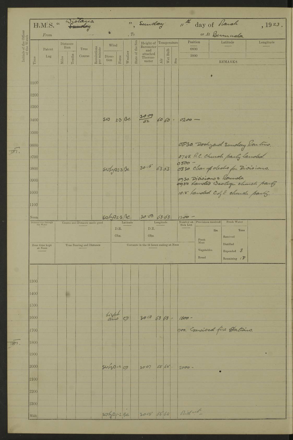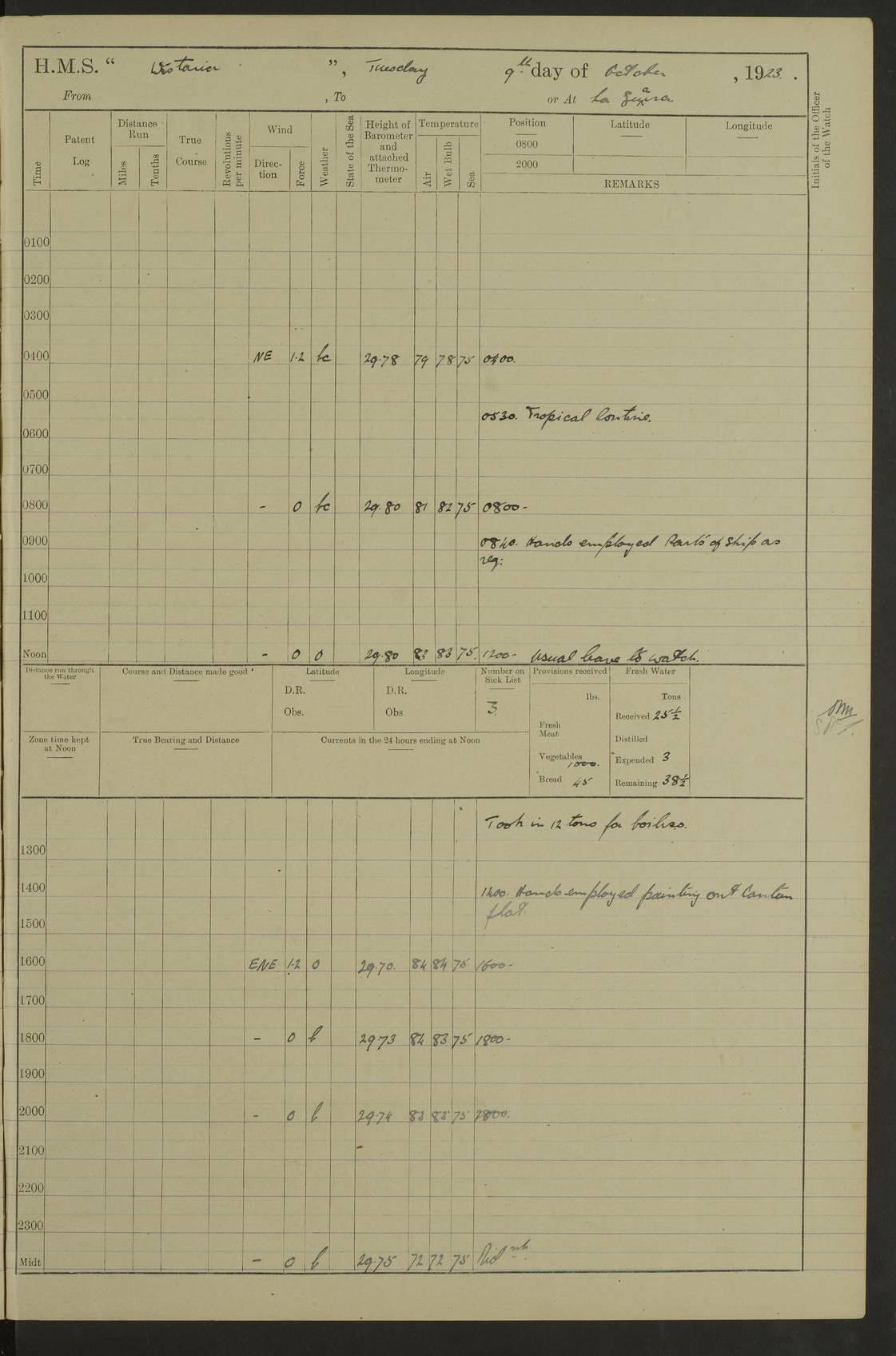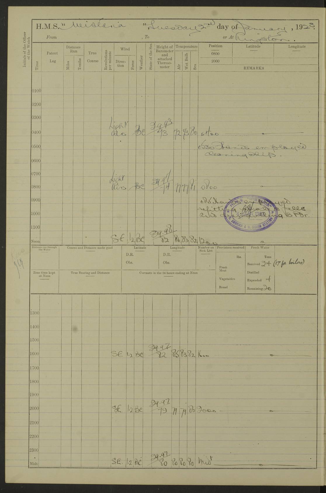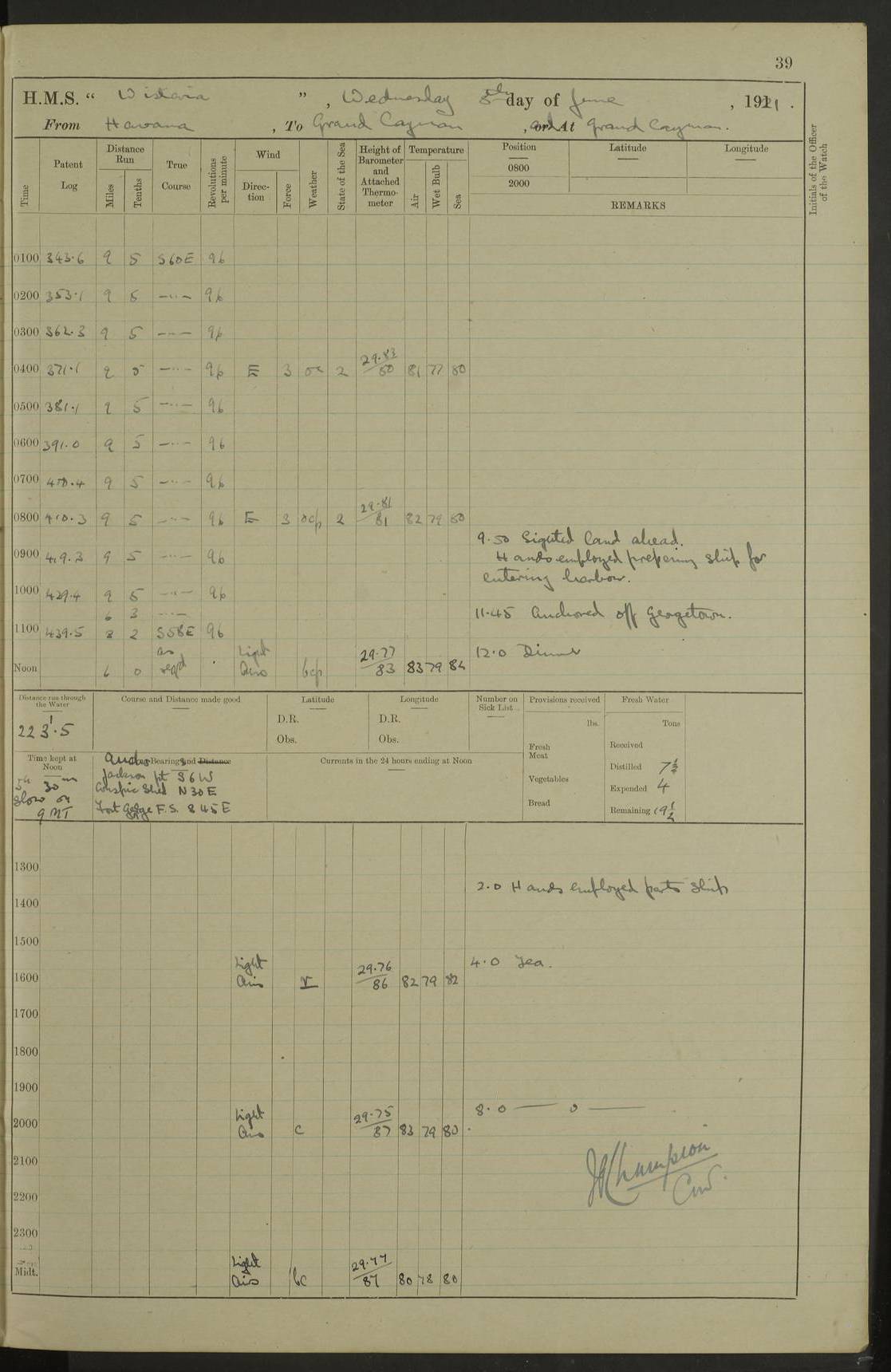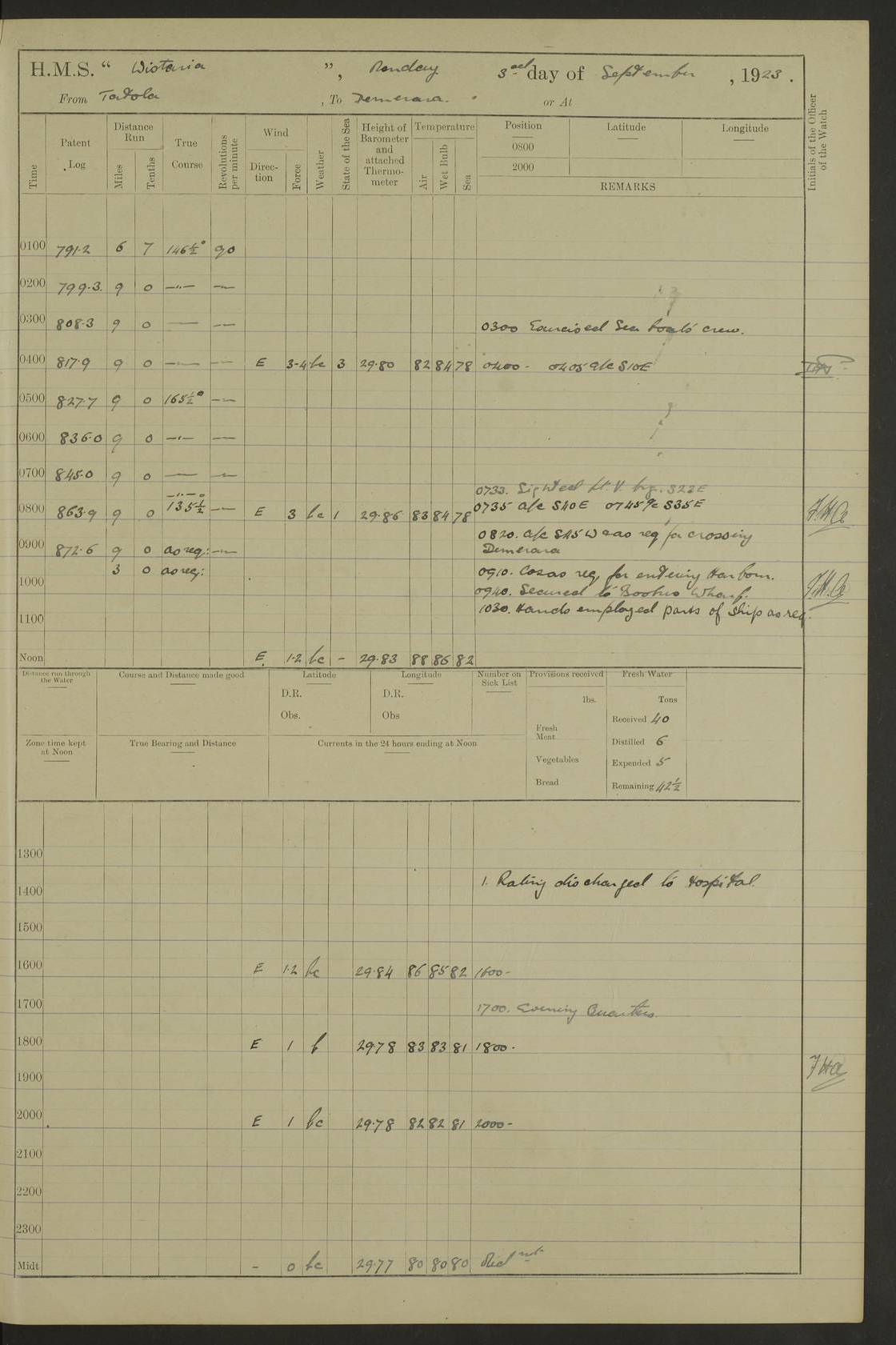 LOGS FOR JANUARY 1923 4f73cb2ca2fc8ea903000cd1: (https://s3.amazonaws.com:443/oldweather/ADM53-93271/0036_1.jpg) 1 January 1923 At Kingston (Jamaica) Lat 17.95, Long -76.76 8.15am: Hands employed painting parts of ship and dismantling after port 3 pdr 11.45am: Paid monthly wages 4f73cb2da2fc8ea903000cd2: (https://s3.amazonaws.com:443/oldweather/ADM53-93271/0037_0.jpg) 2 January 1923 At Kingston (Jamaica) Lat 17.95, Long -76.76 8.15am: Hands employed refitting whalers’ falls and dismantling 3 pdr 4f73cb2da2fc8ea903000cd3: (https://s3.amazonaws.com:443/oldweather/ADM53-93271/0037_1.jpg) 3 January 1923 At Kingston (Jamaica) Lat 17.95, Long -76.76 8.15am: Hands employed refitting skiff & motor boat falls, painting 1st & 2nd whalers, ship’s side, and dismantling 3 pdrs pm: 1 rating discharged to Hospital pm: Received 50 tons of boiler water 4f73cb2da2fc8ea903000cd4: (https://s3.amazonaws.com:443/oldweather/ADM53-93271/0038_0.jpg) 4 January 1923 At Kingston (Jamaica) Lat 17.95, Long -76.76 8.15am: Hands employed refitting boats falls and life lines 9.10am: HMS “Calcutta” came to anchor 2.0pm: Starboard watch employed painting 2nd whaler, motor boat 4f73cb2ea2fc8ea903000cd5: (https://s3.amazonaws.com:443/oldweather/ADM53-93271/0038_1.jpg) 5 January 1923 At Kingston (Jamaica) Lat 17.95, Long -76.76 8.15am: Hands employed about boats & parts of ship 2.0pm: Port watch employed painting waterways 2.30pm: 1 rating from Hospital returned onboard 4f73cb2ea2fc8ea903000cd6: (https://s3.amazonaws.com:443/oldweather/ADM53-93271/0039_0.jpg) 6 January 1923 At Kingston (Jamaica) Lat 17.95, Long -76.76 8.15am: Hands employed cleaning ship 9.05am: Air night clothing 2.0pm: Shifted billet from RMSP wharf to Number 6 wharf 8.40pm: SS “Bridgetown” arrived in harbour 10.0pm: SS “Bogota” arrived in harbour [SS “Bridgetown”: built 1920 as “Lake Fillmore”, 1923 purchased by Colombian Steamship Company, 1933 sold to Republic of Colombia, renamed “Boyaca”] [SS “Bogota”: perhaps SS “Bogota” (III) built 1919 and owned by the Pacific Steam Navigation Company] 4f73cb2ea2fc8ea903000cd7: (https://s3.amazonaws.com:443/oldweather/ADM53-93271/0039_1.jpg) 7 January 1923 At Kingston (Jamaica) Lat 17.95, Long -76.76 6.0am: Hands employed out accommodation ladder & cleaning ship 10.0am: Admiral Packenham inspects ship pm: 2 ratings discharged to hospital 4f73cb2fa2fc8ea903000cd8: (https://s3.amazonaws.com:443/oldweather/ADM53-93271/0040_0.jpg) 8 January 1923 At Port Royal Lat 17.93, Long -76.84 5.30am: Hands employed preparing for coaling 6.30am: Slipped wharf and proceeded to Port Royal 7.10am: Secured alongside jetty 8.15am: Coal ship 11.45am: Finished coaling 12.30pm: Hands employed cleaning ship 4f73cb2fa2fc8ea903000cd9: (https://s3.amazonaws.com:443/oldweather/ADM53-93271/0040_1.jpg) 9 January 1923 From Port Royal to Savannah-la-Mar Lat 17.76, Long -77.6 5.30am: Hands employed cleaning ship & preparing for sea 6.05am: Left wharf 6.22am: Proceeded 96 revs. Course as required for South Channel 7.19am: Streamed patent log Anchor Bearings: Fifty six shoal beacon S47W; Fort, right tangent, N32W; Beacon N2W 1.0pm: Pedro Bluff abeam 3 miles 3.0pm: Hauled in Patent log 4.20pm: Course as required for South E Channel and inner anchorage 4.25pm: Slow 4.35pm: Came to with Starboard anchor 1 ¾ shackle in 3½ fathoms True Bearing and Distance: Pedro Bluff 301°, 9.5 miles 4f73cb30a2fc8ea903000cda: (https://s3.amazonaws.com:443/oldweather/ADM53-93271/0041_0.jpg) 10 January 1923 At Savannah-la-Mar Lat 18.21, Long -78.13 6.20am: Lowered 1st whaler for Navigators Surveying 8.15am: Hands employed preparing well deck awning and cleaning parts of ship 12.15pm: SS “Manchioneal” anchored in harbour 4.10pm: SS “Manchioneal” leaves [SS “Manchioneal”: Norwegian steamer built 1911, chartered to United Fruit Company, 1933 sold to Iceland, renamed “Katla”] 4f73cb30a2fc8ea903000cdb: (https://s3.amazonaws.com:443/oldweather/ADM53-93271/0041_1.jpg) 11 January 1923 At Savannah-la-Mar Lat 18.21, Long -78.13 9.15am: Hands to divisions and employed refitting ridge ropes & screen 4f73cb30a2fc8ea903000cdc: (https://s3.amazonaws.com:443/oldweather/ADM53-93271/0042_0.jpg) 12 January 1923 At Savannah-la-Mar Lat 18.21, Long -78.13 8.15am: Hands employed cleaning ship 10.0am: Hands employed painting ship’s side and parts of ship 2.0pm: Starboard watch cleaning ship’s side. Leave to Port watch 3.15 to 6.30pm 4f73cb31a2fc8ea903000cdd: (https://s3.amazonaws.com:443/oldweather/ADM53-93271/0042_1.jpg) 13 January 1923 At Savannah-la-Mar Lat 18.21, Long -78.13 am: Hands employed cleaning ship and painting ship’s side 11.35am: Hoisted 1st whaler & lowered 2nd whaler 4f73cb31a2fc8ea903000cde: (https://s3.amazonaws.com:443/oldweather/ADM53-93271/0043_0.jpg) 14 January 1923 From Savannah-la-Mar to Lucea and at Lucea Lat 18.45, Long -78.16 6.0am: Hands preparing ship for sea 7.0am: Weighed, turned ship and proceeded. Course as requisite for lee passage 7.28am: Long Stag beacon abeam 9.05am: South Negril Lt Ho abeam, 15 miles. Altered course N30W 11.25am: Pedro Pt abeam. Altered course East 11.50am: Course as requires for entering Lucea Harbour 12.03pm: Anchored in 5 fathoms with 2 shackles Anchor Bearings: SW Pit Bank Beacon S78W, NE Pit Bank Beacon N82W, Flagstaff Reef N5W 1.30pm: Starboard Watch turned out motor boat and skiff [Pit Bank Beacons: Two red pole beacons, each with a triangular topmark, indicate the edge of Pit Bank. which extends 200 yards from the shore southward of Antonio Point. The northern one lies 500 yards 73° from the courthouse; the southern 300 yards 89° from the courthouse] [Flagstaff Reef: which breaks, runs 200 yards 126° from Point Antonio on the western side. An iron stake beacon, with a conical red topmark, marks the eastern extremity of this reef, with the fort bearing 283° distant 300 yards] 4f73cb31a2fc8ea903000cdf: (https://s3.amazonaws.com:443/oldweather/ADM53-93271/0043_1.jpg) 15 Ja