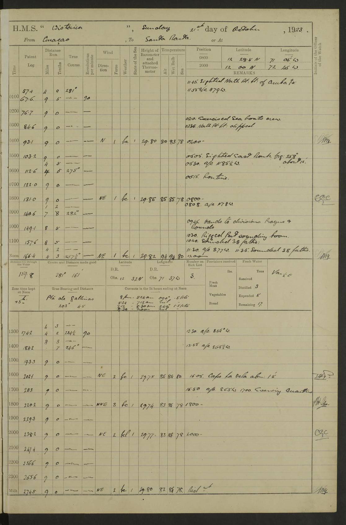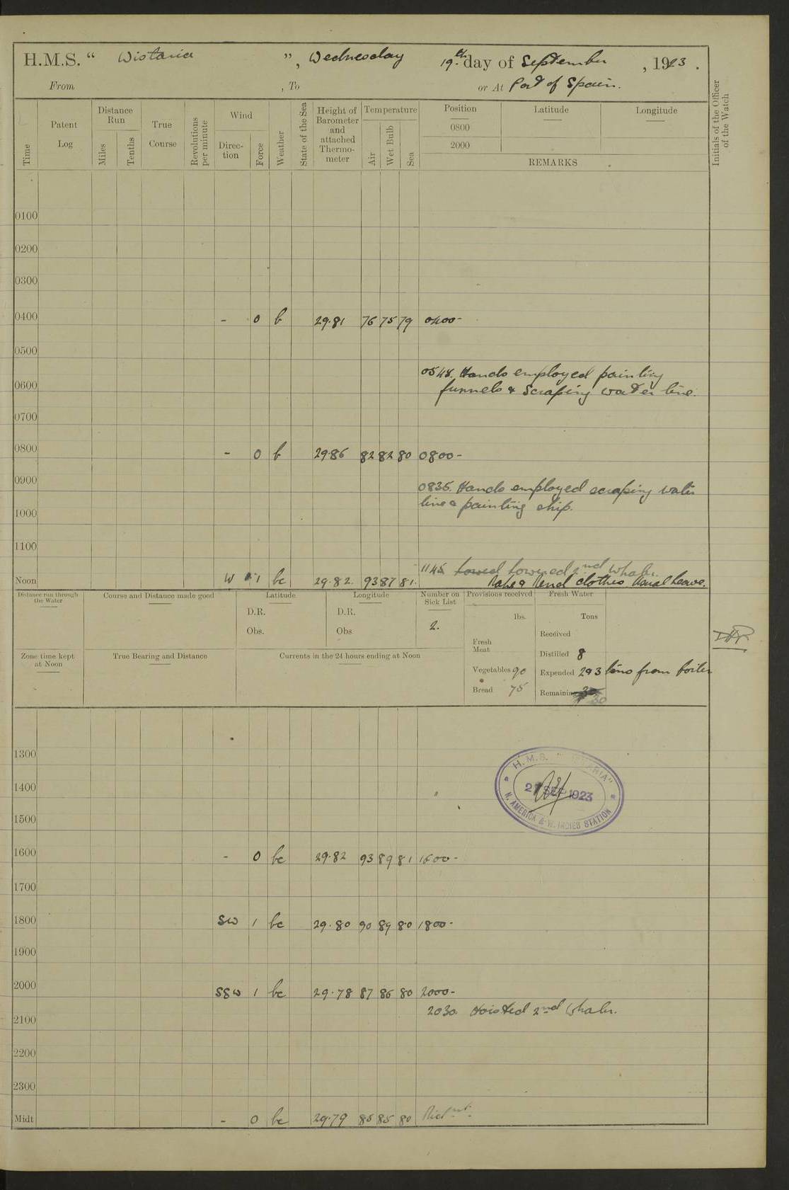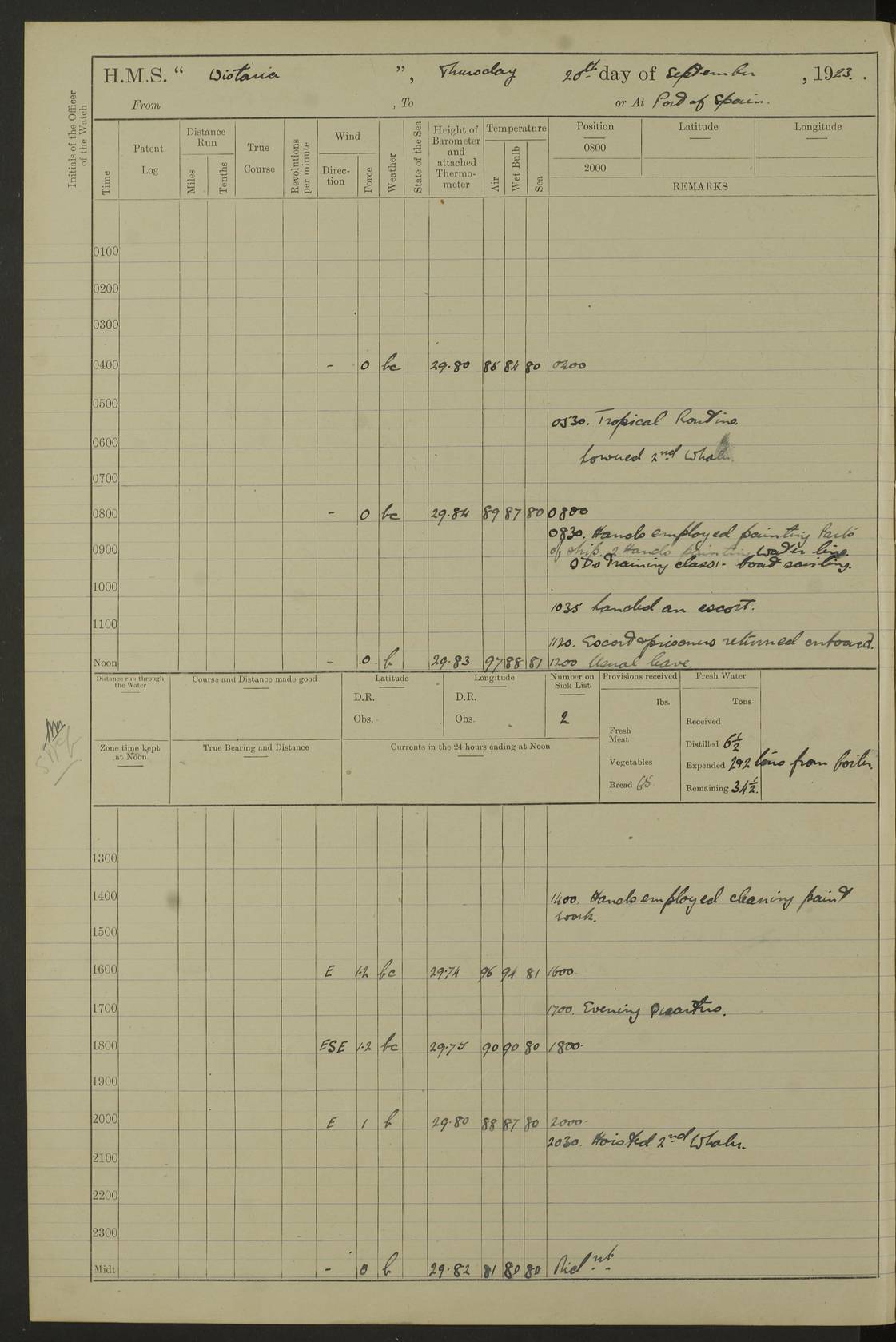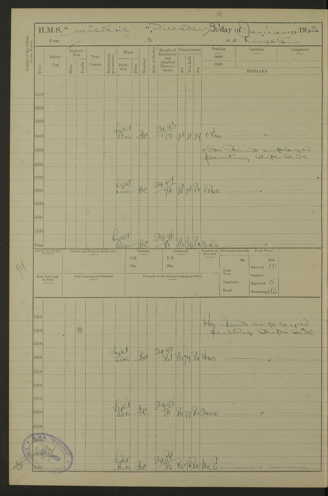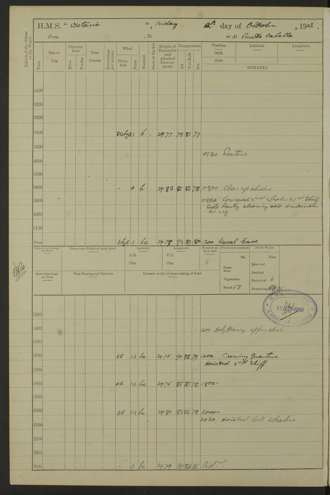 LOGS FOR JANUARY 1923 4f73cb2ca2fc8ea903000cd1: (https://s3.amazonaws.com:443/oldweather/ADM53-93271/0036_1.jpg) 1 January 1923 At Kingston (Jamaica) Lat 17.95, Long -76.76 8.15am: Hands employed painting parts of ship and dismantling after port 3 pdr 11.45am: Paid monthly wages 4f73cb2da2fc8ea903000cd2: (https://s3.amazonaws.com:443/oldweather/ADM53-93271/0037_0.jpg) 2 January 1923 At Kingston (Jamaica) Lat 17.95, Long -76.76 8.15am: Hands employed refitting whalers’ falls and dismantling 3 pdr 4f73cb2da2fc8ea903000cd3: (https://s3.amazonaws.com:443/oldweather/ADM53-93271/0037_1.jpg) 3 January 1923 At Kingston (Jamaica) Lat 17.95, Long -76.76 8.15am: Hands employed refitting skiff & motor boat falls, painting 1st & 2nd whalers, ship’s side, and dismantling 3 pdrs pm: 1 rating discharged to Hospital pm: Received 50 tons of boiler water 4f73cb2da2fc8ea903000cd4: (https://s3.amazonaws.com:443/oldweather/ADM53-93271/0038_0.jpg) 4 January 1923 At Kingston (Jamaica) Lat 17.95, Long -76.76 8.15am: Hands employed refitting boats falls and life lines 9.10am: HMS “Calcutta” came to anchor 2.0pm: Starboard watch employed painting 2nd whaler, motor boat 4f73cb2ea2fc8ea903000cd5: (https://s3.amazonaws.com:443/oldweather/ADM53-93271/0038_1.jpg) 5 January 1923 At Kingston (Jamaica) Lat 17.95, Long -76.76 8.15am: Hands employed about boats & parts of ship 2.0pm: Port watch employed painting waterways 2.30pm: 1 rating from Hospital returned onboard 4f73cb2ea2fc8ea903000cd6: (https://s3.amazonaws.com:443/oldweather/ADM53-93271/0039_0.jpg) 6 January 1923 At Kingston (Jamaica) Lat 17.95, Long -76.76 8.15am: Hands employed cleaning ship 9.05am: Air night clothing 2.0pm: Shifted billet from RMSP wharf to Number 6 wharf 8.40pm: SS “Bridgetown” arrived in harbour 10.0pm: SS “Bogota” arrived in harbour [SS “Bridgetown”: built 1920 as “Lake Fillmore”, 1923 purchased by Colombian Steamship Company, 1933 sold to Republic of Colombia, renamed “Boyaca”] [SS “Bogota”: perhaps SS “Bogota” (III) built 1919 and owned by the Pacific Steam Navigation Company] 4f73cb2ea2fc8ea903000cd7: (https://s3.amazonaws.com:443/oldweather/ADM53-93271/0039_1.jpg) 7 January 1923 At Kingston (Jamaica) Lat 17.95, Long -76.76 6.0am: Hands employed out accommodation ladder & cleaning ship 10.0am: Admiral Packenham inspects ship pm: 2 ratings discharged to hospital 4f73cb2fa2fc8ea903000cd8: (https://s3.amazonaws.com:443/oldweather/ADM53-93271/0040_0.jpg) 8 January 1923 At Port Royal Lat 17.93, Long -76.84 5.30am: Hands employed preparing for coaling 6.30am: Slipped wharf and proceeded to Port Royal 7.10am: Secured alongside jetty 8.15am: Coal ship 11.45am: Finished coaling 12.30pm: Hands employed cleaning ship 4f73cb2fa2fc8ea903000cd9: (https://s3.amazonaws.com:443/oldweather/ADM53-93271/0040_1.jpg) 9 January 1923 From Port Royal to Savannah-la-Mar Lat 17.76, Long -77.6 5.30am: Hands employed cleaning ship & preparing for sea 6.05am: Left wharf 6.22am: Proceeded 96 revs. Course as required for South Channel 7.19am: Streamed patent log Anchor Bearings: Fifty six shoal beacon S47W; Fort, right tangent, N32W; Beacon N2W 1.0pm: Pedro Bluff abeam 3 miles 3.0pm: Hauled in Patent log 4.20pm: Course as required for South E Channel and inner anchorage 4.25pm: Slow 4.35pm: Came to with Starboard anchor 1 ¾ shackle in 3½ fathoms True Bearing and Distance: Pedro Bluff 301°, 9.5 miles 4f73cb30a2fc8ea903000cda: (https://s3.amazonaws.com:443/oldweather/ADM53-93271/0041_0.jpg) 10 January 1923 At Savannah-la-Mar Lat 18.21, Long -78.13 6.20am: Lowered 1st whaler for Navigators Surveying 8.15am: Hands employed preparing well deck awning and cleaning parts of ship 12.15pm: SS “Manchioneal” anchored in harbour 4.10pm: SS “Manchioneal” leaves [SS “Manchioneal”: Norwegian steamer built 1911, chartered to United Fruit Company, 1933 sold to Iceland, renamed “Katla”] 4f73cb30a2fc8ea903000cdb: (https://s3.amazonaws.com:443/oldweather/ADM53-93271/0041_1.jpg) 11 January 1923 At Savannah-la-Mar Lat 18.21, Long -78.13 9.15am: Hands to divisions and employed refitting ridge ropes & screen 4f73cb30a2fc8ea903000cdc: (https://s3.amazonaws.com:443/oldweather/ADM53-93271/0042_0.jpg) 12 January 1923 At Savannah-la-Mar Lat 18.21, Long -78.13 8.15am: Hands employed cleaning ship 10.0am: Hands employed painting ship’s side and parts of ship 2.0pm: Starboard watch cleaning ship’s side. Leave to Port watch 3.15 to 6.30pm 4f73cb31a2fc8ea903000cdd: (https://s3.amazonaws.com:443/oldweather/ADM53-93271/0042_1.jpg) 13 January 1923 At Savannah-la-Mar Lat 18.21, Long -78.13 am: Hands employed cleaning ship and painting ship’s side 11.35am: Hoisted 1st whaler & lowered 2nd whaler 4f73cb31a2fc8ea903000cde: (https://s3.amazonaws.com:443/oldweather/ADM53-93271/0043_0.jpg) 14 January 1923 From Savannah-la-Mar to Lucea and at Lucea Lat 18.45, Long -78.16 6.0am: Hands preparing ship for sea 7.0am: Weighed, turned ship and proceeded. Course as requisite for lee passage 7.28am: Long Stag beacon abeam 9.05am: South Negril Lt Ho abeam, 15 miles. Altered course N30W 11.25am: Pedro Pt abeam. Altered course East 11.50am: Course as requires for entering Lucea Harbour 12.03pm: Anchored in 5 fathoms with 2 shackles Anchor Bearings: SW Pit Bank Beacon S78W, NE Pit Bank Beacon N82W, Flagstaff Reef N5W 1.30pm: Starboard Watch turned out motor boat and skiff [Pit Bank Beacons: Two red pole beacons, each with a triangular topmark, indicate the edge of Pit Bank. which extends 200 yards from the shore southward of Antonio Point. The northern one lies 500 yards 73° from the courthouse; the southern 300 yards 89° from the courthouse] [Flagstaff Reef: which breaks, runs 200 yards 126° from Point Antonio on the western side. An iron stake beacon, with a conical red topmark, marks the eastern extremity of this reef, with the fort bearing 283° distant 300 yards] 4f73cb31a2fc8ea903000cdf: (https://s3.amazonaws.com:443/oldweather/ADM53-93271/0043_1.jpg) 15 Ja
