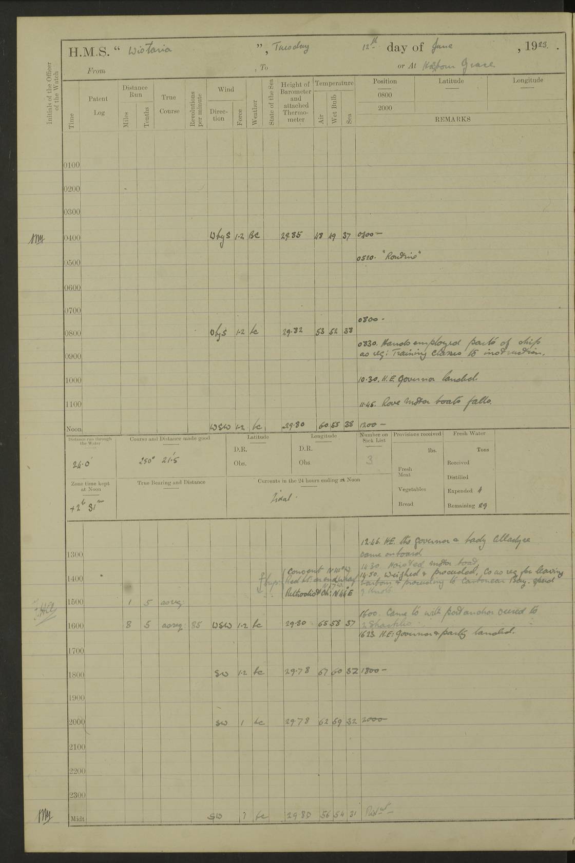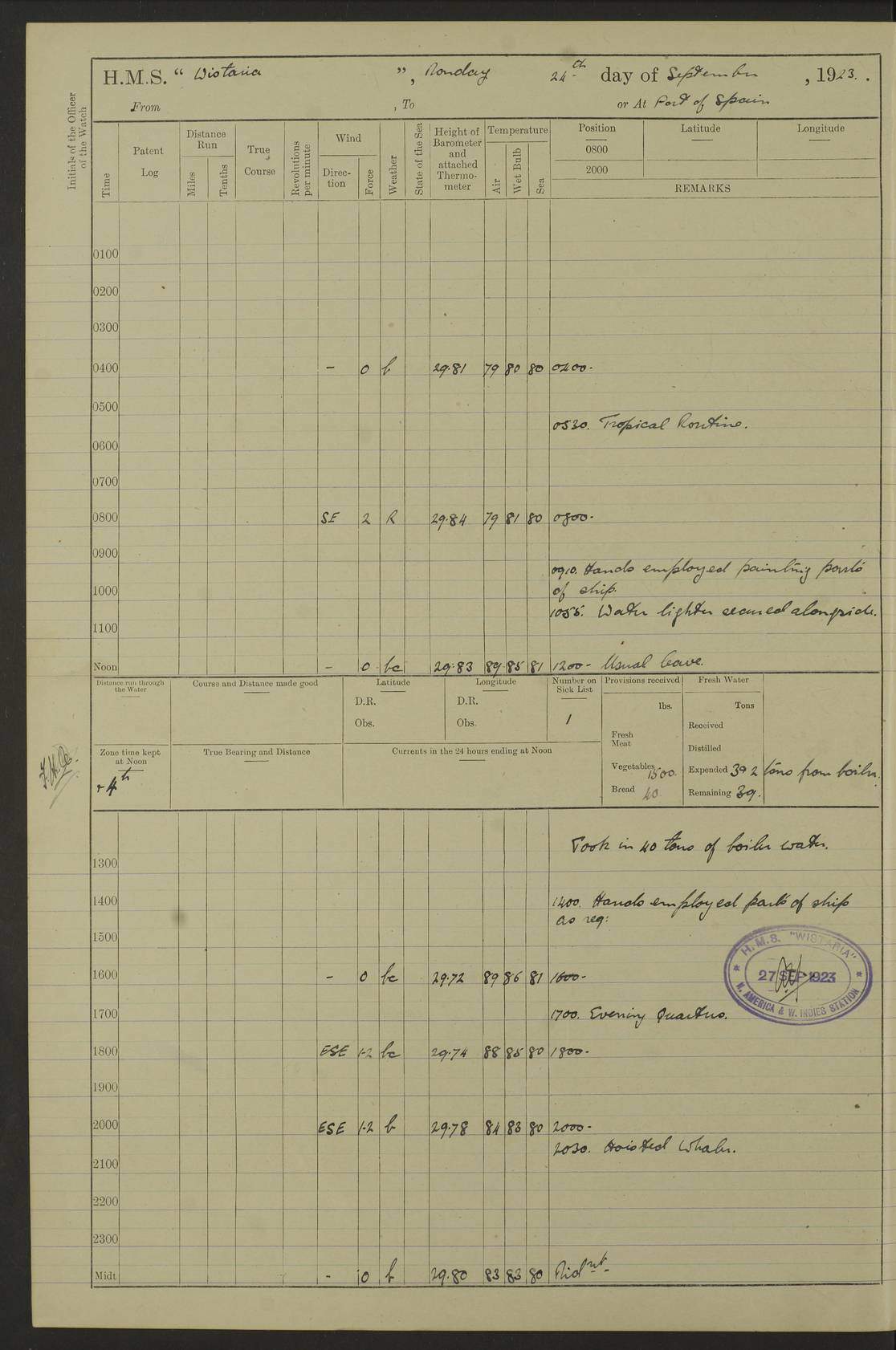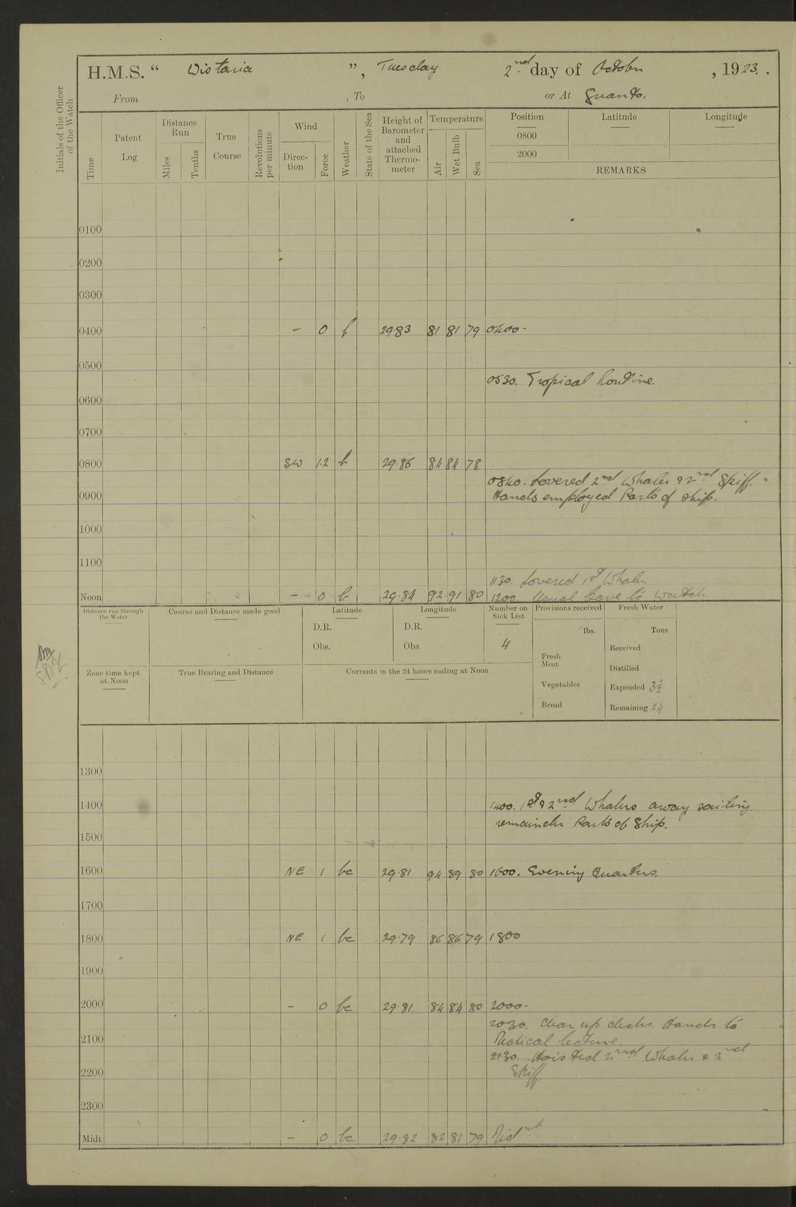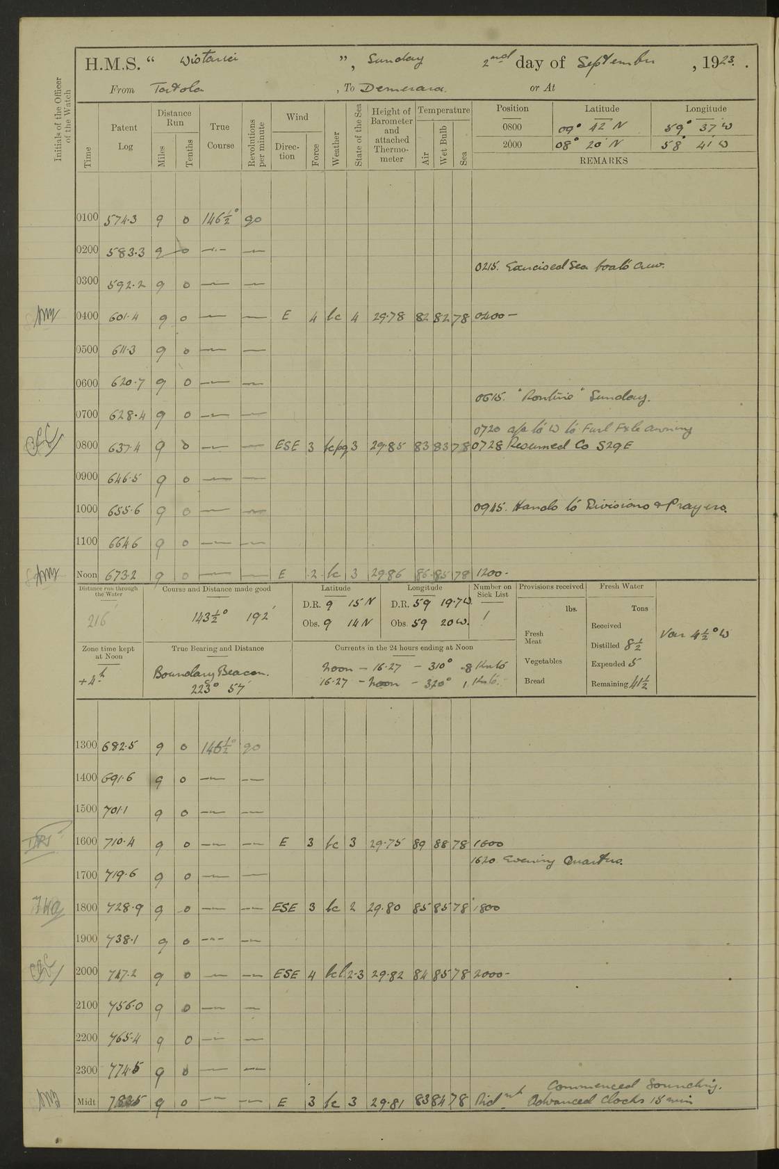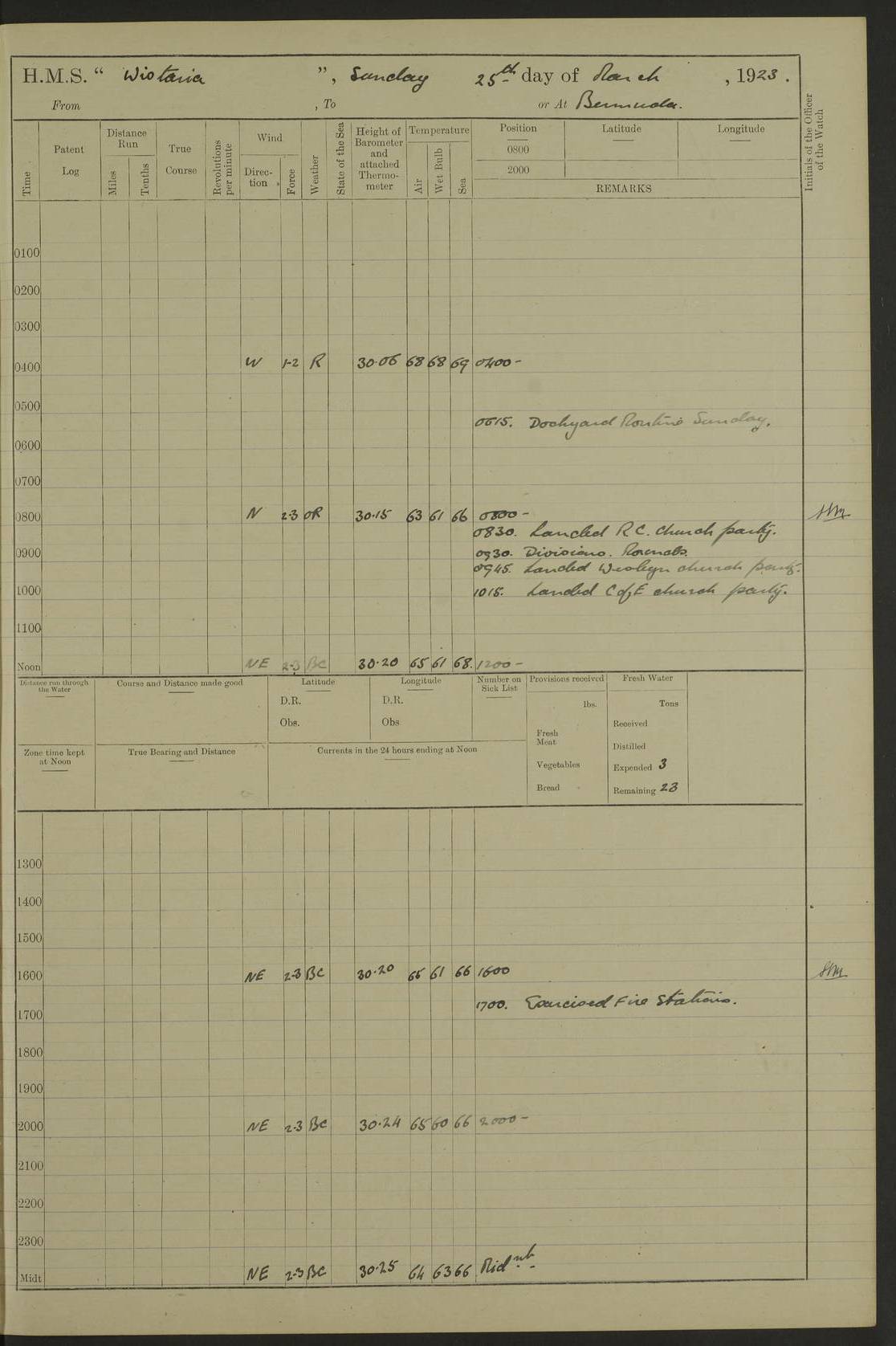 LOGS FOR JANUARY 1923 4f73cb2ca2fc8ea903000cd1: (https://s3.amazonaws.com:443/oldweather/ADM53-93271/0036_1.jpg) 1 January 1923 At Kingston (Jamaica) Lat 17.95, Long -76.76 8.15am: Hands employed painting parts of ship and dismantling after port 3 pdr 11.45am: Paid monthly wages 4f73cb2da2fc8ea903000cd2: (https://s3.amazonaws.com:443/oldweather/ADM53-93271/0037_0.jpg) 2 January 1923 At Kingston (Jamaica) Lat 17.95, Long -76.76 8.15am: Hands employed refitting whalers’ falls and dismantling 3 pdr 4f73cb2da2fc8ea903000cd3: (https://s3.amazonaws.com:443/oldweather/ADM53-93271/0037_1.jpg) 3 January 1923 At Kingston (Jamaica) Lat 17.95, Long -76.76 8.15am: Hands employed refitting skiff & motor boat falls, painting 1st & 2nd whalers, ship’s side, and dismantling 3 pdrs pm: 1 rating discharged to Hospital pm: Received 50 tons of boiler water 4f73cb2da2fc8ea903000cd4: (https://s3.amazonaws.com:443/oldweather/ADM53-93271/0038_0.jpg) 4 January 1923 At Kingston (Jamaica) Lat 17.95, Long -76.76 8.15am: Hands employed refitting boats falls and life lines 9.10am: HMS “Calcutta” came to anchor 2.0pm: Starboard watch employed painting 2nd whaler, motor boat 4f73cb2ea2fc8ea903000cd5: (https://s3.amazonaws.com:443/oldweather/ADM53-93271/0038_1.jpg) 5 January 1923 At Kingston (Jamaica) Lat 17.95, Long -76.76 8.15am: Hands employed about boats & parts of ship 2.0pm: Port watch employed painting waterways 2.30pm: 1 rating from Hospital returned onboard 4f73cb2ea2fc8ea903000cd6: (https://s3.amazonaws.com:443/oldweather/ADM53-93271/0039_0.jpg) 6 January 1923 At Kingston (Jamaica) Lat 17.95, Long -76.76 8.15am: Hands employed cleaning ship 9.05am: Air night clothing 2.0pm: Shifted billet from RMSP wharf to Number 6 wharf 8.40pm: SS “Bridgetown” arrived in harbour 10.0pm: SS “Bogota” arrived in harbour [SS “Bridgetown”: built 1920 as “Lake Fillmore”, 1923 purchased by Colombian Steamship Company, 1933 sold to Republic of Colombia, renamed “Boyaca”] [SS “Bogota”: perhaps SS “Bogota” (III) built 1919 and owned by the Pacific Steam Navigation Company] 4f73cb2ea2fc8ea903000cd7: (https://s3.amazonaws.com:443/oldweather/ADM53-93271/0039_1.jpg) 7 January 1923 At Kingston (Jamaica) Lat 17.95, Long -76.76 6.0am: Hands employed out accommodation ladder & cleaning ship 10.0am: Admiral Packenham inspects ship pm: 2 ratings discharged to hospital 4f73cb2fa2fc8ea903000cd8: (https://s3.amazonaws.com:443/oldweather/ADM53-93271/0040_0.jpg) 8 January 1923 At Port Royal Lat 17.93, Long -76.84 5.30am: Hands employed preparing for coaling 6.30am: Slipped wharf and proceeded to Port Royal 7.10am: Secured alongside jetty 8.15am: Coal ship 11.45am: Finished coaling 12.30pm: Hands employed cleaning ship 4f73cb2fa2fc8ea903000cd9: (https://s3.amazonaws.com:443/oldweather/ADM53-93271/0040_1.jpg) 9 January 1923 From Port Royal to Savannah-la-Mar Lat 17.76, Long -77.6 5.30am: Hands employed cleaning ship & preparing for sea 6.05am: Left wharf 6.22am: Proceeded 96 revs. Course as required for South Channel 7.19am: Streamed patent log Anchor Bearings: Fifty six shoal beacon S47W; Fort, right tangent, N32W; Beacon N2W 1.0pm: Pedro Bluff abeam 3 miles 3.0pm: Hauled in Patent log 4.20pm: Course as required for South E Channel and inner anchorage 4.25pm: Slow 4.35pm: Came to with Starboard anchor 1 ¾ shackle in 3½ fathoms True Bearing and Distance: Pedro Bluff 301°, 9.5 miles 4f73cb30a2fc8ea903000cda: (https://s3.amazonaws.com:443/oldweather/ADM53-93271/0041_0.jpg) 10 January 1923 At Savannah-la-Mar Lat 18.21, Long -78.13 6.20am: Lowered 1st whaler for Navigators Surveying 8.15am: Hands employed preparing well deck awning and cleaning parts of ship 12.15pm: SS “Manchioneal” anchored in harbour 4.10pm: SS “Manchioneal” leaves [SS “Manchioneal”: Norwegian steamer built 1911, chartered to United Fruit Company, 1933 sold to Iceland, renamed “Katla”] 4f73cb30a2fc8ea903000cdb: (https://s3.amazonaws.com:443/oldweather/ADM53-93271/0041_1.jpg) 11 January 1923 At Savannah-la-Mar Lat 18.21, Long -78.13 9.15am: Hands to divisions and employed refitting ridge ropes & screen 4f73cb30a2fc8ea903000cdc: (https://s3.amazonaws.com:443/oldweather/ADM53-93271/0042_0.jpg) 12 January 1923 At Savannah-la-Mar Lat 18.21, Long -78.13 8.15am: Hands employed cleaning ship 10.0am: Hands employed painting ship’s side and parts of ship 2.0pm: Starboard watch cleaning ship’s side. Leave to Port watch 3.15 to 6.30pm 4f73cb31a2fc8ea903000cdd: (https://s3.amazonaws.com:443/oldweather/ADM53-93271/0042_1.jpg) 13 January 1923 At Savannah-la-Mar Lat 18.21, Long -78.13 am: Hands employed cleaning ship and painting ship’s side 11.35am: Hoisted 1st whaler & lowered 2nd whaler 4f73cb31a2fc8ea903000cde: (https://s3.amazonaws.com:443/oldweather/ADM53-93271/0043_0.jpg) 14 January 1923 From Savannah-la-Mar to Lucea and at Lucea Lat 18.45, Long -78.16 6.0am: Hands preparing ship for sea 7.0am: Weighed, turned ship and proceeded. Course as requisite for lee passage 7.28am: Long Stag beacon abeam 9.05am: South Negril Lt Ho abeam, 15 miles. Altered course N30W 11.25am: Pedro Pt abeam. Altered course East 11.50am: Course as requires for entering Lucea Harbour 12.03pm: Anchored in 5 fathoms with 2 shackles Anchor Bearings: SW Pit Bank Beacon S78W, NE Pit Bank Beacon N82W, Flagstaff Reef N5W 1.30pm: Starboard Watch turned out motor boat and skiff [Pit Bank Beacons: Two red pole beacons, each with a triangular topmark, indicate the edge of Pit Bank. which extends 200 yards from the shore southward of Antonio Point. The northern one lies 500 yards 73° from the courthouse; the southern 300 yards 89° from the courthouse] [Flagstaff Reef: which breaks, runs 200 yards 126° from Point Antonio on the western side. An iron stake beacon, with a conical red topmark, marks the eastern extremity of this reef, with the fort bearing 283° distant 300 yards] 4f73cb31a2fc8ea903000cdf: (https://s3.amazonaws.com:443/oldweather/ADM53-93271/0043_1.jpg) 15 Ja