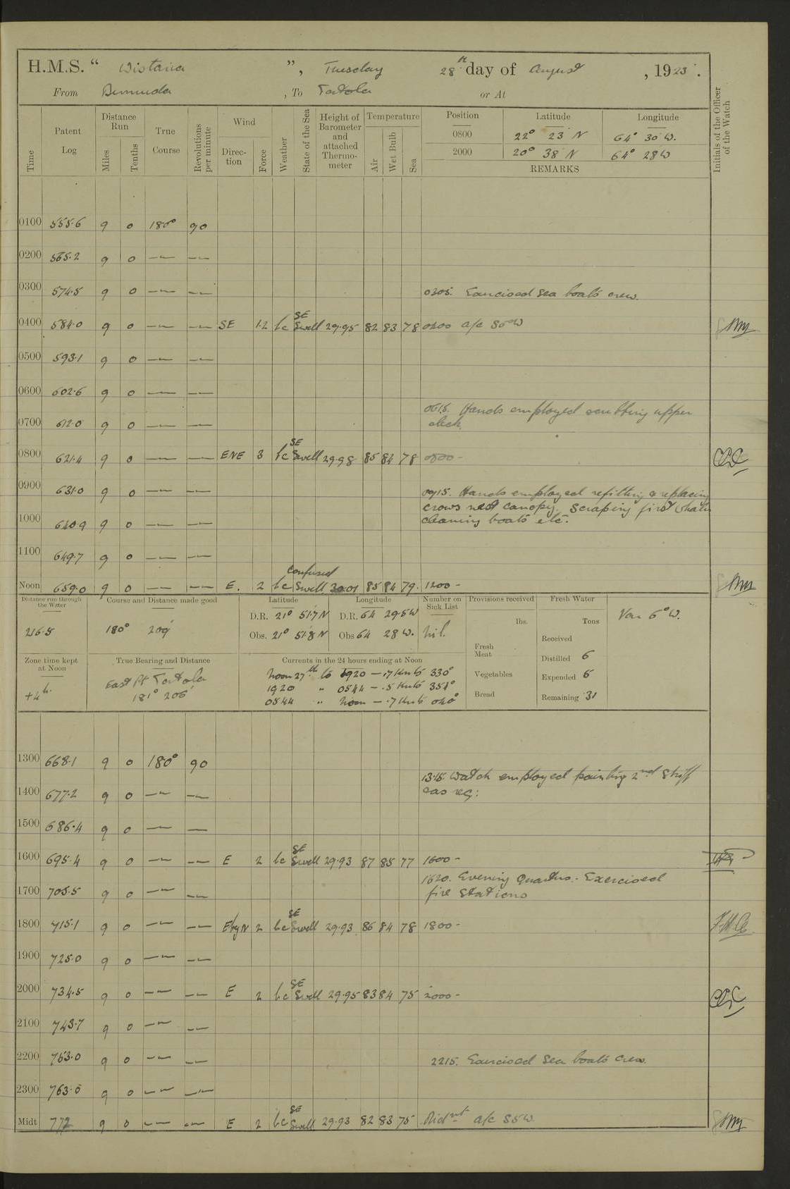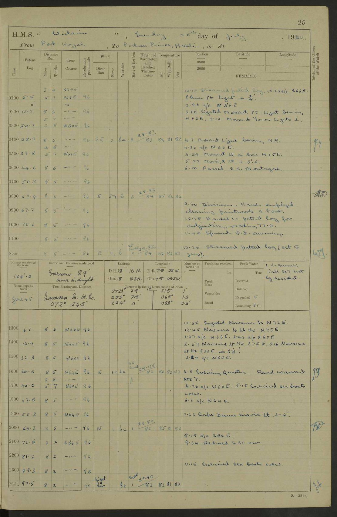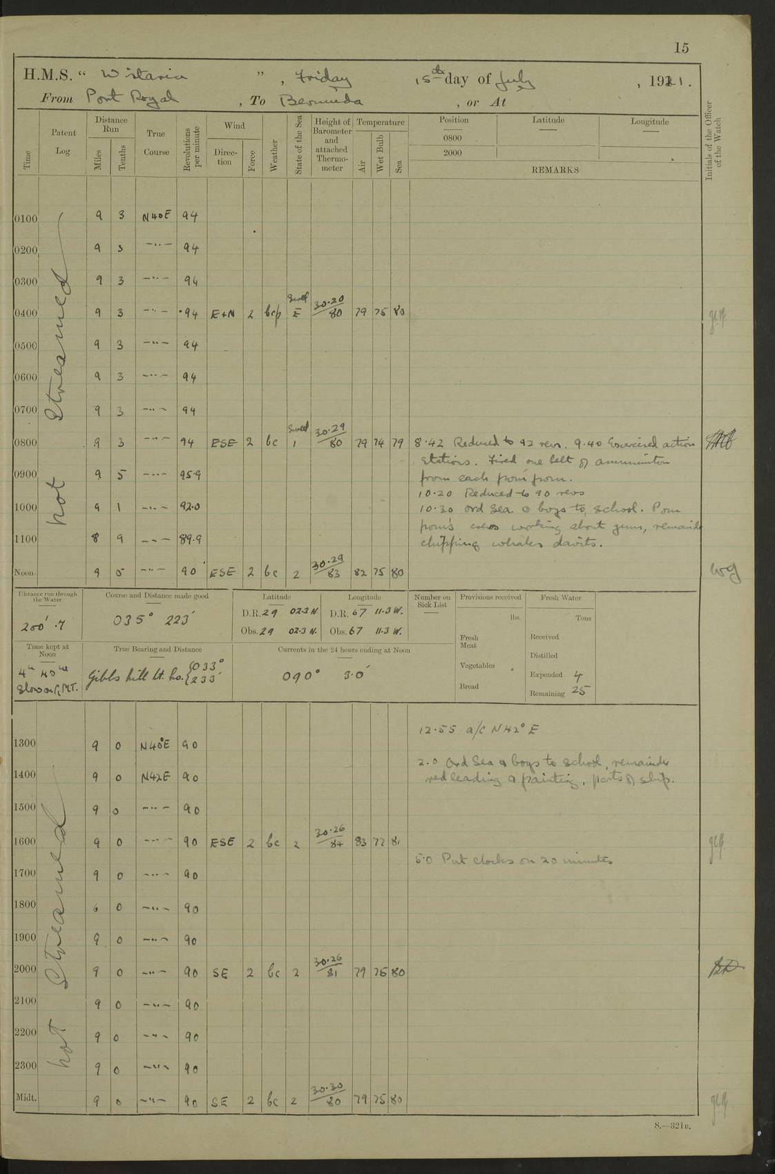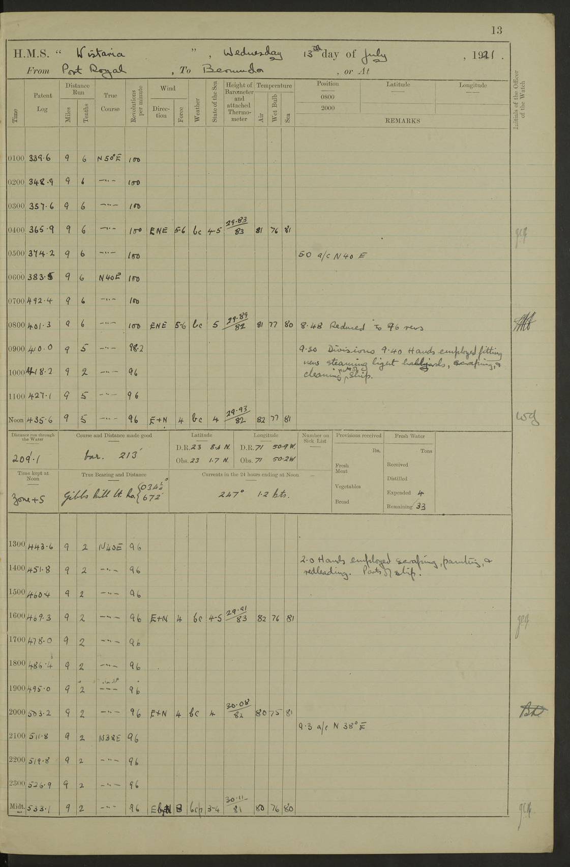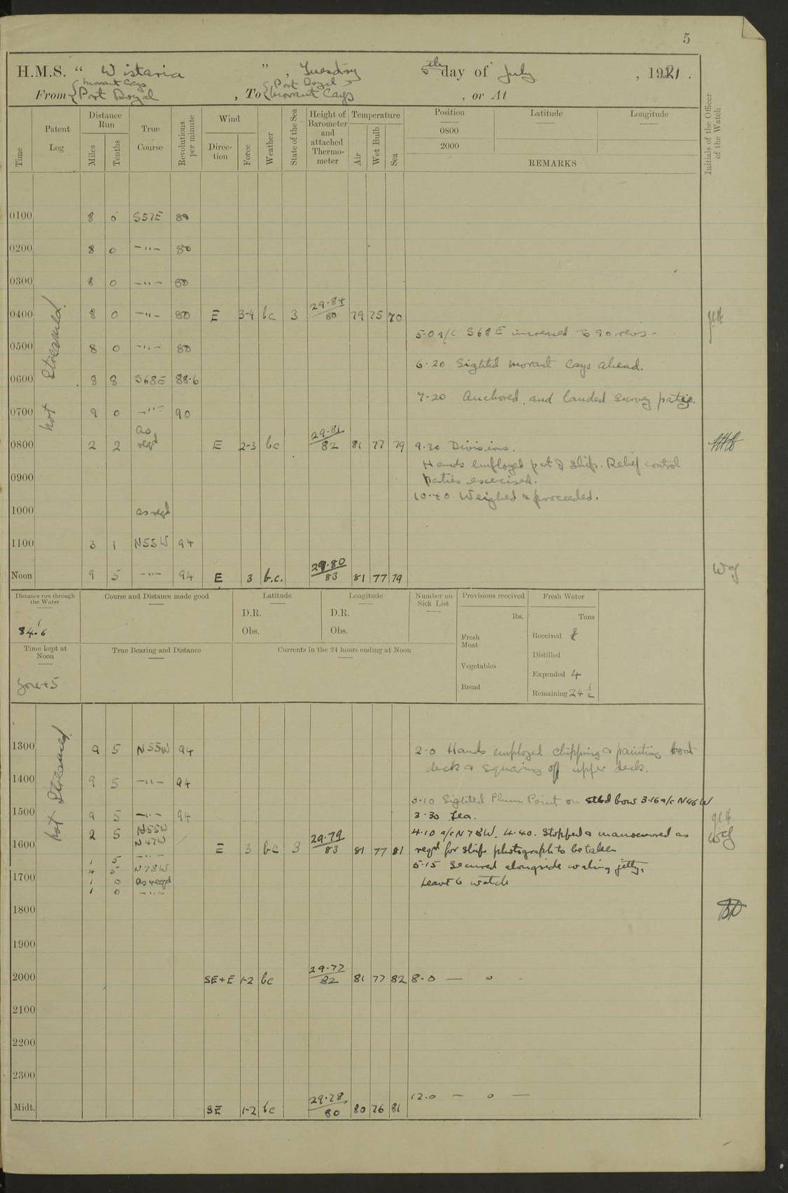 LOGS FOR JULY 1921 4f73ca38a2fc8ea903000a41: (https://s3.amazonaws.com:443/oldweather/ADM53-93262/0003_1.jpg) 1 July 1921 At Port Royal Lat 17.93, Long -76.83 8.15am: 1st whaler diving party. Clear up decks 9.30am: Ord. Seamen & boys muster bags. Remainder part of ship 1.45pm: Hands mustered for monthly payment 2.15pm: Diving party & side party employed. Rest part of ship 4f73ca38a2fc8ea903000a42: (https://s3.amazonaws.com:443/oldweather/ADM53-93262/0004_0.jpg) 2 July 1921 At Port Royal Lat 17.93, Long -76.83 8.15am: Cleaned ship 8.0pm: Concert party landed 8.45pm: Fire party landed 9.45pm: Fire party returned 10.40pm: Fire party landed 4f73ca39a2fc8ea903000a43: (https://s3.amazonaws.com:443/oldweather/ADM53-93262/0004_1.jpg) 3 July 1921 At Port Royal Lat 17.93, Long -76.83 6.30am: Cleaned ship 10.0am: Divisions Number on sick list: 2 4f73ca39a2fc8ea903000a44: (https://s3.amazonaws.com:443/oldweather/ADM53-93262/0005_0.jpg) 4 July 1921 At Port Royal Lat 17.93, Long -76.83 8.15am: Hands employed on boats & part of ship 2.0pm: Embarked 6” projectiles 10.30pm: Left harbour for Morant Cays. Course & speed as requisite 11.20pm: Dumped ammunition Number on sick list: 1 4f73ca39a2fc8ea903000a45: (https://s3.amazonaws.com:443/oldweather/ADM53-93262/0005_1.jpg) 5 July 1921 From Morant Cays-Port Royal to Port Royal-Morant Cays Lat 17.93, Long -76.83 6.20am: Sighted Morant Cays ahead 7.20am: Anchored and landed survey party am: Hands employed part of ship. Relief control parties exercised 10.40am: Weighed & proceeded 2.0pm: Hands employed chipping & painting boat deck & squaring off upper deck 3.10pm: Sighted Plum Point on Starboard bow 4.40pm: Stopped & manoeuvred as required for ship photograph to be taken 5.15pm: Secured alongside waling jetty. Leave to watch 4f73ca3aa2fc8ea903000a46: (https://s3.amazonaws.com:443/oldweather/ADM53-93262/0006_0.jpg) 6 July 1921 At Port Royal Lat 17.93, Long -76.83 9.25am: Hands employed parts of ship and six hands at small arm drill 2.0pm: Hands employed preparing ship for coaling 4.20pm: O.S. III Seabrook rejoined ship from hospital Number on sick list: 2 4f73ca3aa2fc8ea903000a47: (https://s3.amazonaws.com:443/oldweather/ADM53-93262/0006_1.jpg) 7 July 1921 At Port Royal Lat 17.93, Long -76.83 5.30am: Sanded decks 7.0am: Coaled ship with native labour 8.15am: Hands employed cleaning boats 11.20am: Finished coaling. Wash down & scrub upper deck Number on sick list: 4 4f73ca3aa2fc8ea903000a48: (https://s3.amazonaws.com:443/oldweather/ADM53-93262/0007_0.jpg) 8 July 1921 At Port Royal Lat 17.93, Long -76.83 8.15am: Hands employed cleaning paintwork & 3 hands about seine net 1.40pm: Starboard watch employed getting mine sweeping gear inboard 2.0pm: Port watch employed part of ship 3.0pm: Starboard watch employed part of ship 4.0pm: Tea. Ship put in quarantine 5.10pm: Surgeon McCallum left ship for military hospital Number on sick list: 1 [Surgeon McCallum: perhaps Surgeon Archie McCallum] 4f73ca3ba2fc8ea903000a49: (https://s3.amazonaws.com:443/oldweather/ADM53-93262/0007_1.jpg) 9 July 1921 At Port Royal Lat 17.93, Long -76.83 6.45am: Party left for isolation hospital to fumigate gear 11.50am: Air bedding 2.40pm: Bathing party landed 3.30pm: Bathing party returned 5.0pm: All hands vaccinated 4f73ca3ba2fc8ea903000a4a: (https://s3.amazonaws.com:443/oldweather/ADM53-93262/0008_0.jpg) 10 July 1921 At Port Royal Lat 17.93, Long -76.83 am: Parties sent to isolation hospital for fumigation 9.0am: Hands employed clearing mess decks & clearing up decks am: Parties sent for fumigation 1.0pm: All fumigation parties returned 5.15pm: Watch coaled picket boat Number on sick list: 1 4f73ca3ca2fc8ea903000a4b: (https://s3.amazonaws.com:443/oldweather/ADM53-93262/0008_1.jpg) 11 July 1921 From Port Royal to Bermuda and at Port Royal Lat 17.86, Long -76.63 8.15am: Furled forecastle awning 9.25am: Secured ship for sea 10.15am: Left Jetty 11.0am: Streamed patent log 11.01am: Plum Pt bearing N20E. Altered course S71E 3.15pm: Morant Pt bore N7W 3.30pm: Morant Pt bore N73W 6.45pm: Morant Pt bore S69W 9.35pm: Navassa Lt bearing S37E 10.32pm: Navassa Lt abeam 11.30pm: Navassa Lt bearing S24E True Bearing and Distance: Plum Pt Lt 294½°, 90 miles 4f73ca3ca2fc8ea903000a4c: (https://s3.amazonaws.com:443/oldweather/ADM53-93262/0009_0.jpg) 12 July 1921 From Port Royal to Bermuda Lat 20.18, Long -74.01 7.0am: Sighted Cuban mountains on Port bow 8.50am: Furled boat deck awning 9.35am: Exercised control parties, hands employed turning motor boats falls end for end, scarping & painting 2.0pm: Hands employed as forenoon 4.02pm: Sighted Great Inagua Lt Ho N48E 5.15pm: Course as required for re-charging telemotor system 5.38pm: Great Inagua Lt Ho abeam, 7 miles 6.30pm: N.W. Pt abeam, 1 mile True Bearing and Distance: Cape Maysi Lt Ho 299½°, 7¼ miles 4f73ca3ca2fc8ea903000a4d: (https://s3.amazonaws.com:443/oldweather/ADM53-93262/0009_1.jpg) 13 July 1921 From Port Royal to Bermuda Lat 23.13, Long -71.83 9.40am: Hands employed fitting new streaming light halliyards, scraping & cleaning part of ship 2.0pm: Hands employed scraping, painting & redleading parts of ship True Bearing and Distance: Gibbs Hill Lt Ho 034¼°, 672 miles 4f73ca3da2fc8ea903000a4e: (https://s3.amazonaws.com:443/oldweather/ADM53-93262/0010_0.jpg) 14 July 1921 From Port Royal to Bermuda Lat 25.91, Long -69.55 2.10am: Hauled in Patent log to clear it 2.15am: Log streamed 9.0am: Hauled in patent log 9.30am: Hands employed mustering bags & hammocks 2.0pm: Hands scrub hammocks 4.0pm: Evening Quarters. Exercised collision stations 5.0pm: Put clocks on 20 minutes True Bearing and Distance: Gibbs Hill Lt Ho 034°, 452 miles 4f73ca3da2fc8ea903000a4f: (https://s3.amazonaws.com:443/oldweather/ADM53-93262/0010_1.jpg) 15 July 1921 From Port Royal to Bermuda Lat 29.03, Long -67.18 9.40am: Exercised action stations. Fired one belt of ammunition from each pom pom 10.30am: Ord. Sea & boys to school. Pom Pom’s crews working about guns, remainders chip
