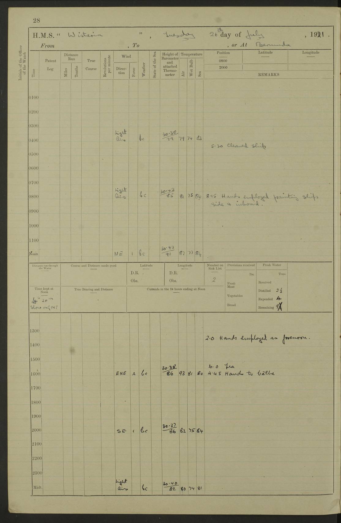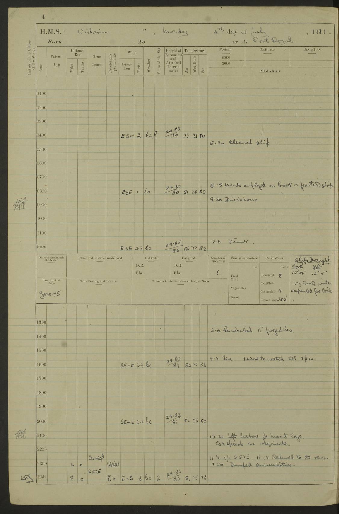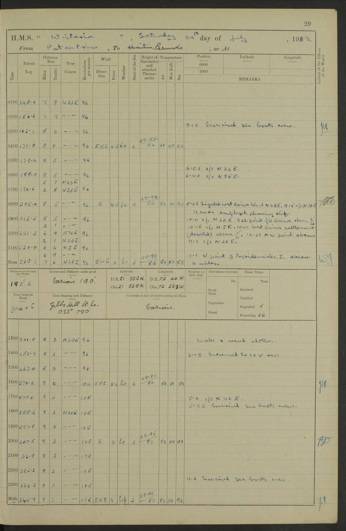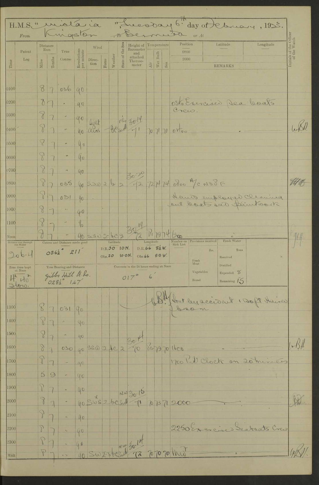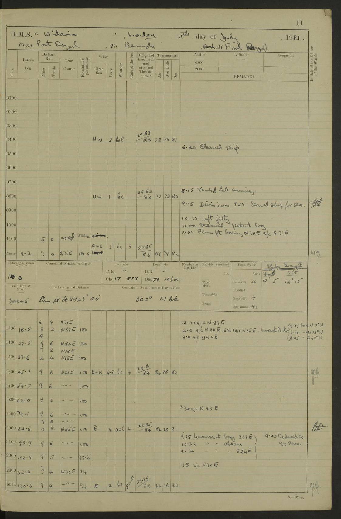 LOGS FOR JULY 1921 4f73ca38a2fc8ea903000a41: (https://s3.amazonaws.com:443/oldweather/ADM53-93262/0003_1.jpg) 1 July 1921 At Port Royal Lat 17.93, Long -76.83 8.15am: 1st whaler diving party. Clear up decks 9.30am: Ord. Seamen & boys muster bags. Remainder part of ship 1.45pm: Hands mustered for monthly payment 2.15pm: Diving party & side party employed. Rest part of ship 4f73ca38a2fc8ea903000a42: (https://s3.amazonaws.com:443/oldweather/ADM53-93262/0004_0.jpg) 2 July 1921 At Port Royal Lat 17.93, Long -76.83 8.15am: Cleaned ship 8.0pm: Concert party landed 8.45pm: Fire party landed 9.45pm: Fire party returned 10.40pm: Fire party landed 4f73ca39a2fc8ea903000a43: (https://s3.amazonaws.com:443/oldweather/ADM53-93262/0004_1.jpg) 3 July 1921 At Port Royal Lat 17.93, Long -76.83 6.30am: Cleaned ship 10.0am: Divisions Number on sick list: 2 4f73ca39a2fc8ea903000a44: (https://s3.amazonaws.com:443/oldweather/ADM53-93262/0005_0.jpg) 4 July 1921 At Port Royal Lat 17.93, Long -76.83 8.15am: Hands employed on boats & part of ship 2.0pm: Embarked 6” projectiles 10.30pm: Left harbour for Morant Cays. Course & speed as requisite 11.20pm: Dumped ammunition Number on sick list: 1 4f73ca39a2fc8ea903000a45: (https://s3.amazonaws.com:443/oldweather/ADM53-93262/0005_1.jpg) 5 July 1921 From Morant Cays-Port Royal to Port Royal-Morant Cays Lat 17.93, Long -76.83 6.20am: Sighted Morant Cays ahead 7.20am: Anchored and landed survey party am: Hands employed part of ship. Relief control parties exercised 10.40am: Weighed & proceeded 2.0pm: Hands employed chipping & painting boat deck & squaring off upper deck 3.10pm: Sighted Plum Point on Starboard bow 4.40pm: Stopped & manoeuvred as required for ship photograph to be taken 5.15pm: Secured alongside waling jetty. Leave to watch 4f73ca3aa2fc8ea903000a46: (https://s3.amazonaws.com:443/oldweather/ADM53-93262/0006_0.jpg) 6 July 1921 At Port Royal Lat 17.93, Long -76.83 9.25am: Hands employed parts of ship and six hands at small arm drill 2.0pm: Hands employed preparing ship for coaling 4.20pm: O.S. III Seabrook rejoined ship from hospital Number on sick list: 2 4f73ca3aa2fc8ea903000a47: (https://s3.amazonaws.com:443/oldweather/ADM53-93262/0006_1.jpg) 7 July 1921 At Port Royal Lat 17.93, Long -76.83 5.30am: Sanded decks 7.0am: Coaled ship with native labour 8.15am: Hands employed cleaning boats 11.20am: Finished coaling. Wash down & scrub upper deck Number on sick list: 4 4f73ca3aa2fc8ea903000a48: (https://s3.amazonaws.com:443/oldweather/ADM53-93262/0007_0.jpg) 8 July 1921 At Port Royal Lat 17.93, Long -76.83 8.15am: Hands employed cleaning paintwork & 3 hands about seine net 1.40pm: Starboard watch employed getting mine sweeping gear inboard 2.0pm: Port watch employed part of ship 3.0pm: Starboard watch employed part of ship 4.0pm: Tea. Ship put in quarantine 5.10pm: Surgeon McCallum left ship for military hospital Number on sick list: 1 [Surgeon McCallum: perhaps Surgeon Archie McCallum] 4f73ca3ba2fc8ea903000a49: (https://s3.amazonaws.com:443/oldweather/ADM53-93262/0007_1.jpg) 9 July 1921 At Port Royal Lat 17.93, Long -76.83 6.45am: Party left for isolation hospital to fumigate gear 11.50am: Air bedding 2.40pm: Bathing party landed 3.30pm: Bathing party returned 5.0pm: All hands vaccinated 4f73ca3ba2fc8ea903000a4a: (https://s3.amazonaws.com:443/oldweather/ADM53-93262/0008_0.jpg) 10 July 1921 At Port Royal Lat 17.93, Long -76.83 am: Parties sent to isolation hospital for fumigation 9.0am: Hands employed clearing mess decks & clearing up decks am: Parties sent for fumigation 1.0pm: All fumigation parties returned 5.15pm: Watch coaled picket boat Number on sick list: 1 4f73ca3ca2fc8ea903000a4b: (https://s3.amazonaws.com:443/oldweather/ADM53-93262/0008_1.jpg) 11 July 1921 From Port Royal to Bermuda and at Port Royal Lat 17.86, Long -76.63 8.15am: Furled forecastle awning 9.25am: Secured ship for sea 10.15am: Left Jetty 11.0am: Streamed patent log 11.01am: Plum Pt bearing N20E. Altered course S71E 3.15pm: Morant Pt bore N7W 3.30pm: Morant Pt bore N73W 6.45pm: Morant Pt bore S69W 9.35pm: Navassa Lt bearing S37E 10.32pm: Navassa Lt abeam 11.30pm: Navassa Lt bearing S24E True Bearing and Distance: Plum Pt Lt 294½°, 90 miles 4f73ca3ca2fc8ea903000a4c: (https://s3.amazonaws.com:443/oldweather/ADM53-93262/0009_0.jpg) 12 July 1921 From Port Royal to Bermuda Lat 20.18, Long -74.01 7.0am: Sighted Cuban mountains on Port bow 8.50am: Furled boat deck awning 9.35am: Exercised control parties, hands employed turning motor boats falls end for end, scarping & painting 2.0pm: Hands employed as forenoon 4.02pm: Sighted Great Inagua Lt Ho N48E 5.15pm: Course as required for re-charging telemotor system 5.38pm: Great Inagua Lt Ho abeam, 7 miles 6.30pm: N.W. Pt abeam, 1 mile True Bearing and Distance: Cape Maysi Lt Ho 299½°, 7¼ miles 4f73ca3ca2fc8ea903000a4d: (https://s3.amazonaws.com:443/oldweather/ADM53-93262/0009_1.jpg) 13 July 1921 From Port Royal to Bermuda Lat 23.13, Long -71.83 9.40am: Hands employed fitting new streaming light halliyards, scraping & cleaning part of ship 2.0pm: Hands employed scraping, painting & redleading parts of ship True Bearing and Distance: Gibbs Hill Lt Ho 034¼°, 672 miles 4f73ca3da2fc8ea903000a4e: (https://s3.amazonaws.com:443/oldweather/ADM53-93262/0010_0.jpg) 14 July 1921 From Port Royal to Bermuda Lat 25.91, Long -69.55 2.10am: Hauled in Patent log to clear it 2.15am: Log streamed 9.0am: Hauled in patent log 9.30am: Hands employed mustering bags & hammocks 2.0pm: Hands scrub hammocks 4.0pm: Evening Quarters. Exercised collision stations 5.0pm: Put clocks on 20 minutes True Bearing and Distance: Gibbs Hill Lt Ho 034°, 452 miles 4f73ca3da2fc8ea903000a4f: (https://s3.amazonaws.com:443/oldweather/ADM53-93262/0010_1.jpg) 15 July 1921 From Port Royal to Bermuda Lat 29.03, Long -67.18 9.40am: Exercised action stations. Fired one belt of ammunition from each pom pom 10.30am: Ord. Sea & boys to school. Pom Pom’s crews working about guns, remainders chip