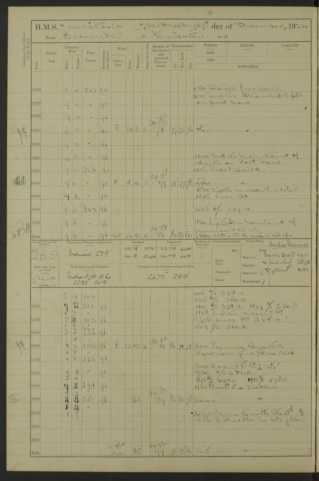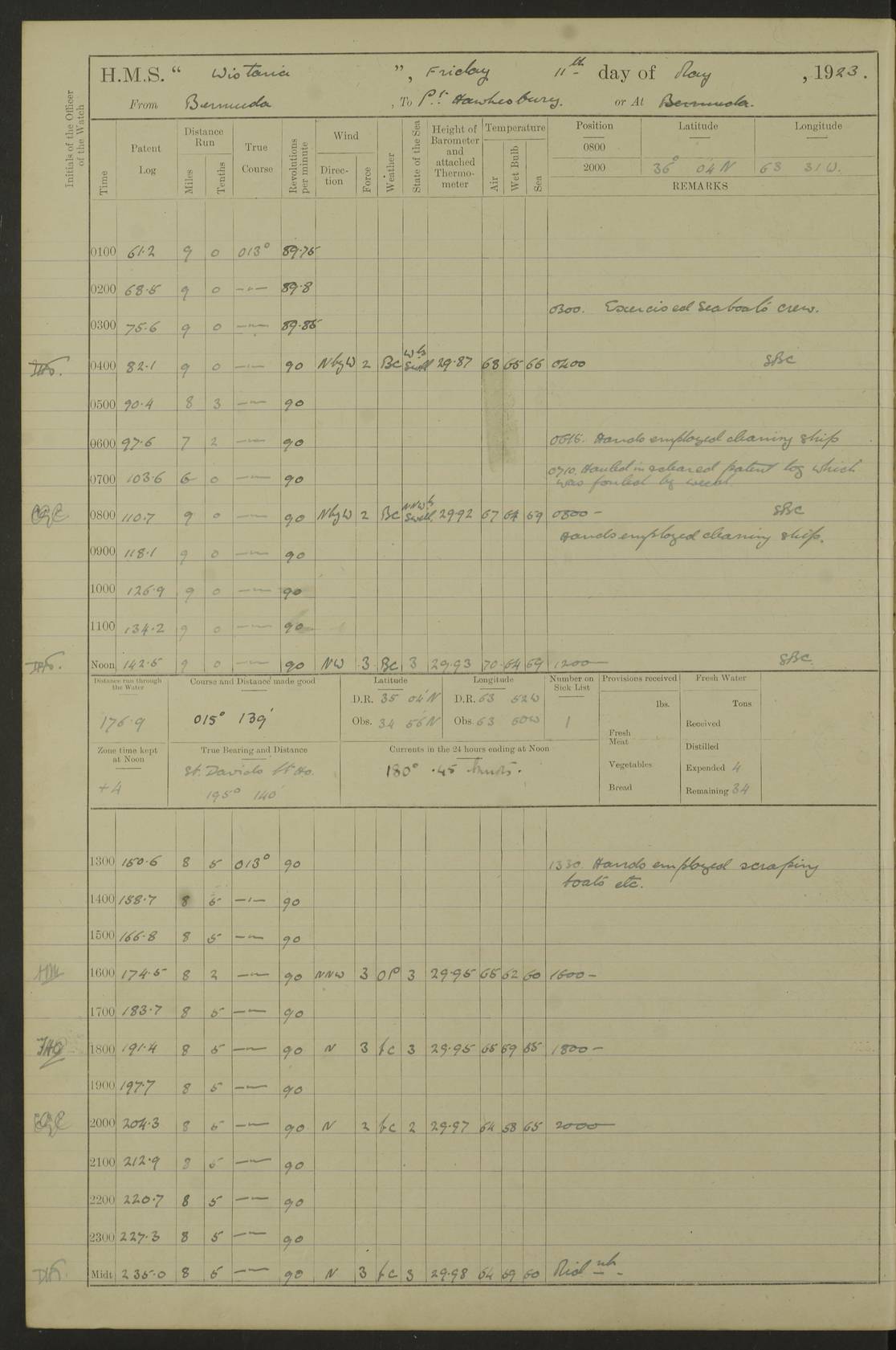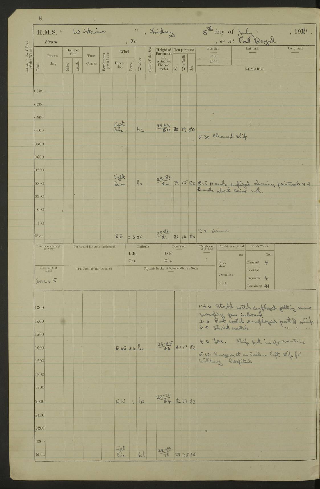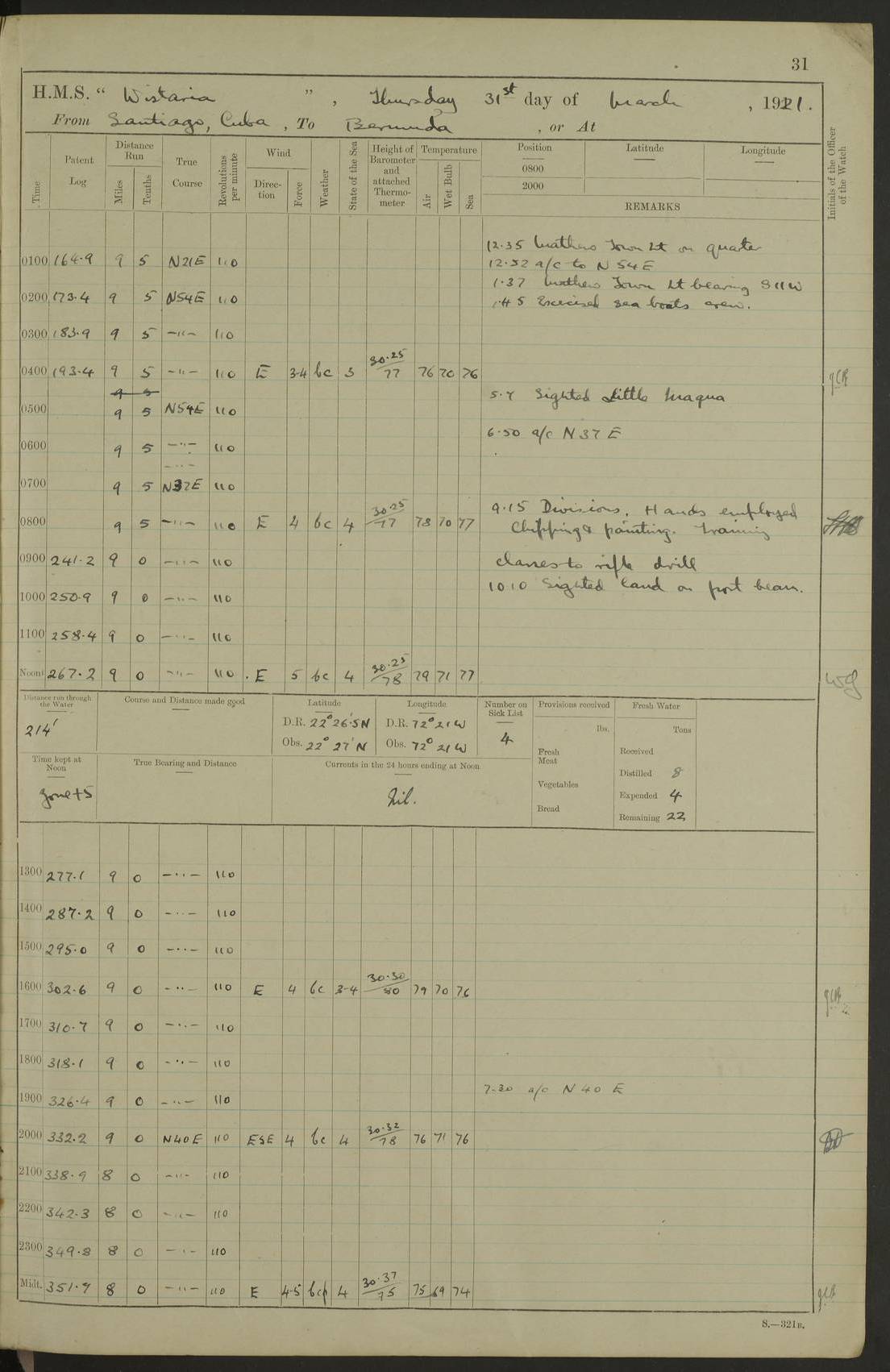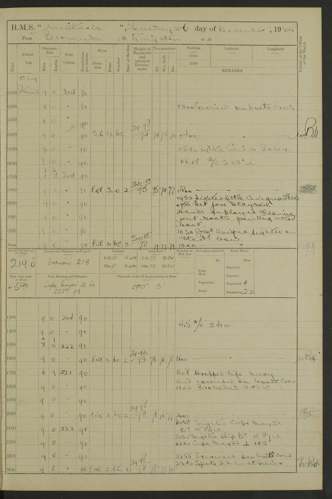 LOGS FOR JULY 1921 4f73ca38a2fc8ea903000a41: (https://s3.amazonaws.com:443/oldweather/ADM53-93262/0003_1.jpg) 1 July 1921 At Port Royal Lat 17.93, Long -76.83 8.15am: 1st whaler diving party. Clear up decks 9.30am: Ord. Seamen & boys muster bags. Remainder part of ship 1.45pm: Hands mustered for monthly payment 2.15pm: Diving party & side party employed. Rest part of ship 4f73ca38a2fc8ea903000a42: (https://s3.amazonaws.com:443/oldweather/ADM53-93262/0004_0.jpg) 2 July 1921 At Port Royal Lat 17.93, Long -76.83 8.15am: Cleaned ship 8.0pm: Concert party landed 8.45pm: Fire party landed 9.45pm: Fire party returned 10.40pm: Fire party landed 4f73ca39a2fc8ea903000a43: (https://s3.amazonaws.com:443/oldweather/ADM53-93262/0004_1.jpg) 3 July 1921 At Port Royal Lat 17.93, Long -76.83 6.30am: Cleaned ship 10.0am: Divisions Number on sick list: 2 4f73ca39a2fc8ea903000a44: (https://s3.amazonaws.com:443/oldweather/ADM53-93262/0005_0.jpg) 4 July 1921 At Port Royal Lat 17.93, Long -76.83 8.15am: Hands employed on boats & part of ship 2.0pm: Embarked 6” projectiles 10.30pm: Left harbour for Morant Cays. Course & speed as requisite 11.20pm: Dumped ammunition Number on sick list: 1 4f73ca39a2fc8ea903000a45: (https://s3.amazonaws.com:443/oldweather/ADM53-93262/0005_1.jpg) 5 July 1921 From Morant Cays-Port Royal to Port Royal-Morant Cays Lat 17.93, Long -76.83 6.20am: Sighted Morant Cays ahead 7.20am: Anchored and landed survey party am: Hands employed part of ship. Relief control parties exercised 10.40am: Weighed & proceeded 2.0pm: Hands employed chipping & painting boat deck & squaring off upper deck 3.10pm: Sighted Plum Point on Starboard bow 4.40pm: Stopped & manoeuvred as required for ship photograph to be taken 5.15pm: Secured alongside waling jetty. Leave to watch 4f73ca3aa2fc8ea903000a46: (https://s3.amazonaws.com:443/oldweather/ADM53-93262/0006_0.jpg) 6 July 1921 At Port Royal Lat 17.93, Long -76.83 9.25am: Hands employed parts of ship and six hands at small arm drill 2.0pm: Hands employed preparing ship for coaling 4.20pm: O.S. III Seabrook rejoined ship from hospital Number on sick list: 2 4f73ca3aa2fc8ea903000a47: (https://s3.amazonaws.com:443/oldweather/ADM53-93262/0006_1.jpg) 7 July 1921 At Port Royal Lat 17.93, Long -76.83 5.30am: Sanded decks 7.0am: Coaled ship with native labour 8.15am: Hands employed cleaning boats 11.20am: Finished coaling. Wash down & scrub upper deck Number on sick list: 4 4f73ca3aa2fc8ea903000a48: (https://s3.amazonaws.com:443/oldweather/ADM53-93262/0007_0.jpg) 8 July 1921 At Port Royal Lat 17.93, Long -76.83 8.15am: Hands employed cleaning paintwork & 3 hands about seine net 1.40pm: Starboard watch employed getting mine sweeping gear inboard 2.0pm: Port watch employed part of ship 3.0pm: Starboard watch employed part of ship 4.0pm: Tea. Ship put in quarantine 5.10pm: Surgeon McCallum left ship for military hospital Number on sick list: 1 [Surgeon McCallum: perhaps Surgeon Archie McCallum] 4f73ca3ba2fc8ea903000a49: (https://s3.amazonaws.com:443/oldweather/ADM53-93262/0007_1.jpg) 9 July 1921 At Port Royal Lat 17.93, Long -76.83 6.45am: Party left for isolation hospital to fumigate gear 11.50am: Air bedding 2.40pm: Bathing party landed 3.30pm: Bathing party returned 5.0pm: All hands vaccinated 4f73ca3ba2fc8ea903000a4a: (https://s3.amazonaws.com:443/oldweather/ADM53-93262/0008_0.jpg) 10 July 1921 At Port Royal Lat 17.93, Long -76.83 am: Parties sent to isolation hospital for fumigation 9.0am: Hands employed clearing mess decks & clearing up decks am: Parties sent for fumigation 1.0pm: All fumigation parties returned 5.15pm: Watch coaled picket boat Number on sick list: 1 4f73ca3ca2fc8ea903000a4b: (https://s3.amazonaws.com:443/oldweather/ADM53-93262/0008_1.jpg) 11 July 1921 From Port Royal to Bermuda and at Port Royal Lat 17.86, Long -76.63 8.15am: Furled forecastle awning 9.25am: Secured ship for sea 10.15am: Left Jetty 11.0am: Streamed patent log 11.01am: Plum Pt bearing N20E. Altered course S71E 3.15pm: Morant Pt bore N7W 3.30pm: Morant Pt bore N73W 6.45pm: Morant Pt bore S69W 9.35pm: Navassa Lt bearing S37E 10.32pm: Navassa Lt abeam 11.30pm: Navassa Lt bearing S24E True Bearing and Distance: Plum Pt Lt 294½°, 90 miles 4f73ca3ca2fc8ea903000a4c: (https://s3.amazonaws.com:443/oldweather/ADM53-93262/0009_0.jpg) 12 July 1921 From Port Royal to Bermuda Lat 20.18, Long -74.01 7.0am: Sighted Cuban mountains on Port bow 8.50am: Furled boat deck awning 9.35am: Exercised control parties, hands employed turning motor boats falls end for end, scarping & painting 2.0pm: Hands employed as forenoon 4.02pm: Sighted Great Inagua Lt Ho N48E 5.15pm: Course as required for re-charging telemotor system 5.38pm: Great Inagua Lt Ho abeam, 7 miles 6.30pm: N.W. Pt abeam, 1 mile True Bearing and Distance: Cape Maysi Lt Ho 299½°, 7¼ miles 4f73ca3ca2fc8ea903000a4d: (https://s3.amazonaws.com:443/oldweather/ADM53-93262/0009_1.jpg) 13 July 1921 From Port Royal to Bermuda Lat 23.13, Long -71.83 9.40am: Hands employed fitting new streaming light halliyards, scraping & cleaning part of ship 2.0pm: Hands employed scraping, painting & redleading parts of ship True Bearing and Distance: Gibbs Hill Lt Ho 034¼°, 672 miles 4f73ca3da2fc8ea903000a4e: (https://s3.amazonaws.com:443/oldweather/ADM53-93262/0010_0.jpg) 14 July 1921 From Port Royal to Bermuda Lat 25.91, Long -69.55 2.10am: Hauled in Patent log to clear it 2.15am: Log streamed 9.0am: Hauled in patent log 9.30am: Hands employed mustering bags & hammocks 2.0pm: Hands scrub hammocks 4.0pm: Evening Quarters. Exercised collision stations 5.0pm: Put clocks on 20 minutes True Bearing and Distance: Gibbs Hill Lt Ho 034°, 452 miles 4f73ca3da2fc8ea903000a4f: (https://s3.amazonaws.com:443/oldweather/ADM53-93262/0010_1.jpg) 15 July 1921 From Port Royal to Bermuda Lat 29.03, Long -67.18 9.40am: Exercised action stations. Fired one belt of ammunition from each pom pom 10.30am: Ord. Sea & boys to school. Pom Pom’s crews working about guns, remainders chip