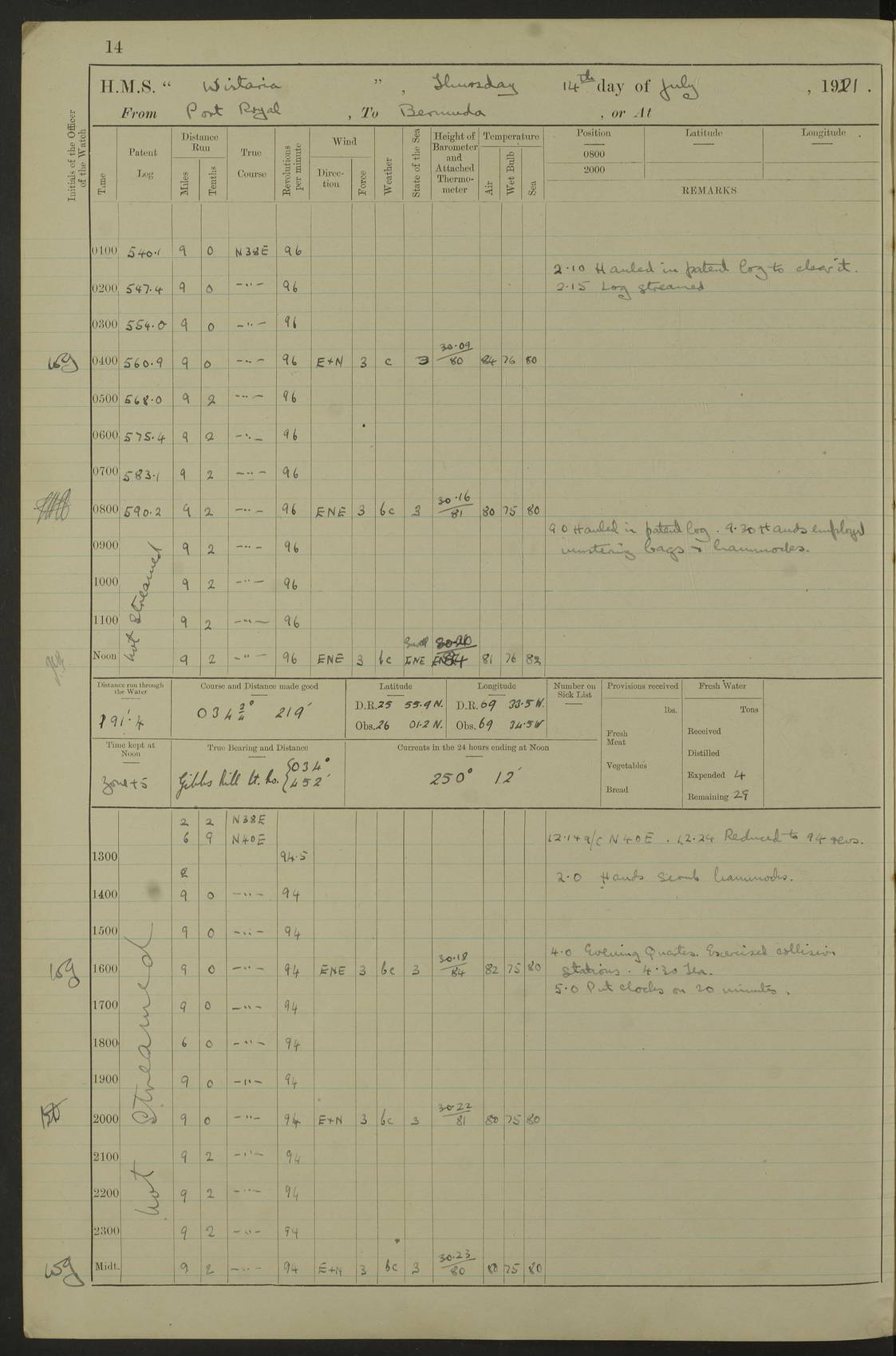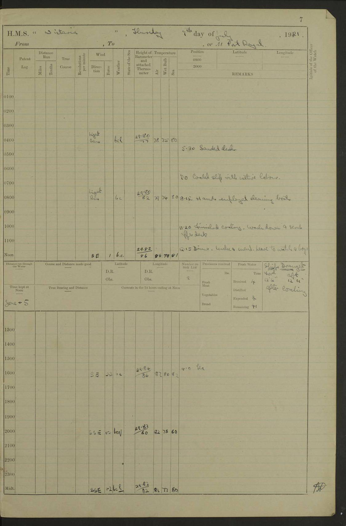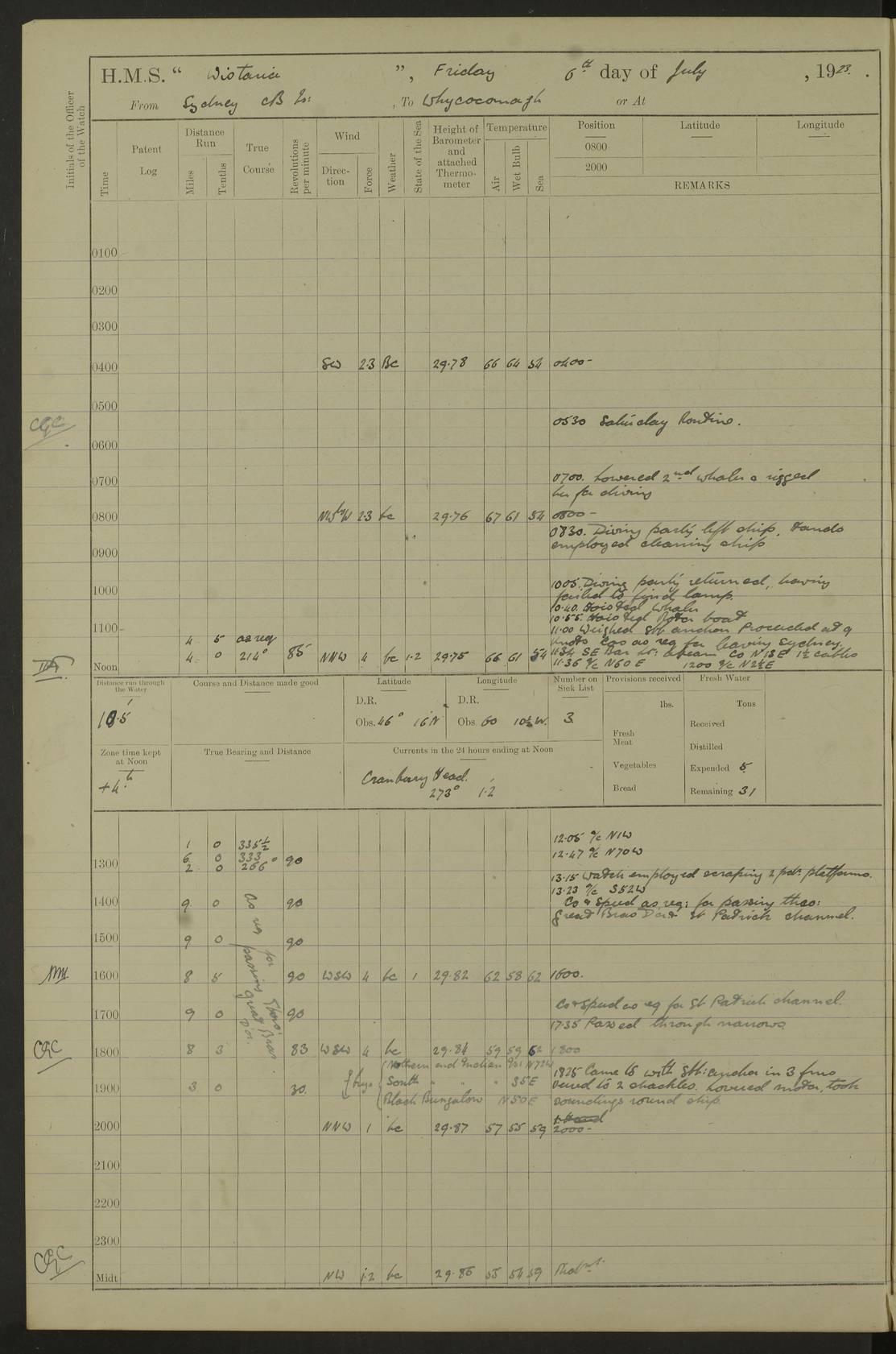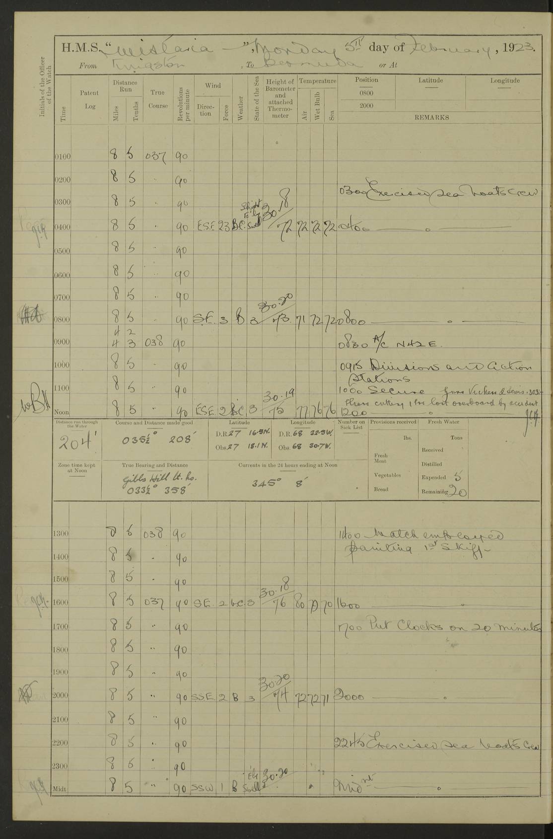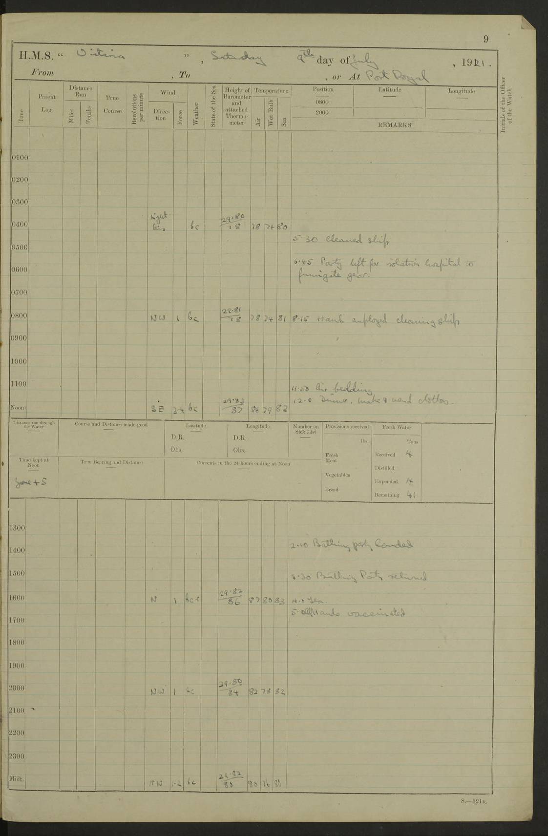 LOGS FOR JULY 1921 4f73ca38a2fc8ea903000a41: (https://s3.amazonaws.com:443/oldweather/ADM53-93262/0003_1.jpg) 1 July 1921 At Port Royal Lat 17.93, Long -76.83 8.15am: 1st whaler diving party. Clear up decks 9.30am: Ord. Seamen & boys muster bags. Remainder part of ship 1.45pm: Hands mustered for monthly payment 2.15pm: Diving party & side party employed. Rest part of ship 4f73ca38a2fc8ea903000a42: (https://s3.amazonaws.com:443/oldweather/ADM53-93262/0004_0.jpg) 2 July 1921 At Port Royal Lat 17.93, Long -76.83 8.15am: Cleaned ship 8.0pm: Concert party landed 8.45pm: Fire party landed 9.45pm: Fire party returned 10.40pm: Fire party landed 4f73ca39a2fc8ea903000a43: (https://s3.amazonaws.com:443/oldweather/ADM53-93262/0004_1.jpg) 3 July 1921 At Port Royal Lat 17.93, Long -76.83 6.30am: Cleaned ship 10.0am: Divisions Number on sick list: 2 4f73ca39a2fc8ea903000a44: (https://s3.amazonaws.com:443/oldweather/ADM53-93262/0005_0.jpg) 4 July 1921 At Port Royal Lat 17.93, Long -76.83 8.15am: Hands employed on boats & part of ship 2.0pm: Embarked 6” projectiles 10.30pm: Left harbour for Morant Cays. Course & speed as requisite 11.20pm: Dumped ammunition Number on sick list: 1 4f73ca39a2fc8ea903000a45: (https://s3.amazonaws.com:443/oldweather/ADM53-93262/0005_1.jpg) 5 July 1921 From Morant Cays-Port Royal to Port Royal-Morant Cays Lat 17.93, Long -76.83 6.20am: Sighted Morant Cays ahead 7.20am: Anchored and landed survey party am: Hands employed part of ship. Relief control parties exercised 10.40am: Weighed & proceeded 2.0pm: Hands employed chipping & painting boat deck & squaring off upper deck 3.10pm: Sighted Plum Point on Starboard bow 4.40pm: Stopped & manoeuvred as required for ship photograph to be taken 5.15pm: Secured alongside waling jetty. Leave to watch 4f73ca3aa2fc8ea903000a46: (https://s3.amazonaws.com:443/oldweather/ADM53-93262/0006_0.jpg) 6 July 1921 At Port Royal Lat 17.93, Long -76.83 9.25am: Hands employed parts of ship and six hands at small arm drill 2.0pm: Hands employed preparing ship for coaling 4.20pm: O.S. III Seabrook rejoined ship from hospital Number on sick list: 2 4f73ca3aa2fc8ea903000a47: (https://s3.amazonaws.com:443/oldweather/ADM53-93262/0006_1.jpg) 7 July 1921 At Port Royal Lat 17.93, Long -76.83 5.30am: Sanded decks 7.0am: Coaled ship with native labour 8.15am: Hands employed cleaning boats 11.20am: Finished coaling. Wash down & scrub upper deck Number on sick list: 4 4f73ca3aa2fc8ea903000a48: (https://s3.amazonaws.com:443/oldweather/ADM53-93262/0007_0.jpg) 8 July 1921 At Port Royal Lat 17.93, Long -76.83 8.15am: Hands employed cleaning paintwork & 3 hands about seine net 1.40pm: Starboard watch employed getting mine sweeping gear inboard 2.0pm: Port watch employed part of ship 3.0pm: Starboard watch employed part of ship 4.0pm: Tea. Ship put in quarantine 5.10pm: Surgeon McCallum left ship for military hospital Number on sick list: 1 [Surgeon McCallum: perhaps Surgeon Archie McCallum] 4f73ca3ba2fc8ea903000a49: (https://s3.amazonaws.com:443/oldweather/ADM53-93262/0007_1.jpg) 9 July 1921 At Port Royal Lat 17.93, Long -76.83 6.45am: Party left for isolation hospital to fumigate gear 11.50am: Air bedding 2.40pm: Bathing party landed 3.30pm: Bathing party returned 5.0pm: All hands vaccinated 4f73ca3ba2fc8ea903000a4a: (https://s3.amazonaws.com:443/oldweather/ADM53-93262/0008_0.jpg) 10 July 1921 At Port Royal Lat 17.93, Long -76.83 am: Parties sent to isolation hospital for fumigation 9.0am: Hands employed clearing mess decks & clearing up decks am: Parties sent for fumigation 1.0pm: All fumigation parties returned 5.15pm: Watch coaled picket boat Number on sick list: 1 4f73ca3ca2fc8ea903000a4b: (https://s3.amazonaws.com:443/oldweather/ADM53-93262/0008_1.jpg) 11 July 1921 From Port Royal to Bermuda and at Port Royal Lat 17.86, Long -76.63 8.15am: Furled forecastle awning 9.25am: Secured ship for sea 10.15am: Left Jetty 11.0am: Streamed patent log 11.01am: Plum Pt bearing N20E. Altered course S71E 3.15pm: Morant Pt bore N7W 3.30pm: Morant Pt bore N73W 6.45pm: Morant Pt bore S69W 9.35pm: Navassa Lt bearing S37E 10.32pm: Navassa Lt abeam 11.30pm: Navassa Lt bearing S24E True Bearing and Distance: Plum Pt Lt 294½°, 90 miles 4f73ca3ca2fc8ea903000a4c: (https://s3.amazonaws.com:443/oldweather/ADM53-93262/0009_0.jpg) 12 July 1921 From Port Royal to Bermuda Lat 20.18, Long -74.01 7.0am: Sighted Cuban mountains on Port bow 8.50am: Furled boat deck awning 9.35am: Exercised control parties, hands employed turning motor boats falls end for end, scarping & painting 2.0pm: Hands employed as forenoon 4.02pm: Sighted Great Inagua Lt Ho N48E 5.15pm: Course as required for re-charging telemotor system 5.38pm: Great Inagua Lt Ho abeam, 7 miles 6.30pm: N.W. Pt abeam, 1 mile True Bearing and Distance: Cape Maysi Lt Ho 299½°, 7¼ miles 4f73ca3ca2fc8ea903000a4d: (https://s3.amazonaws.com:443/oldweather/ADM53-93262/0009_1.jpg) 13 July 1921 From Port Royal to Bermuda Lat 23.13, Long -71.83 9.40am: Hands employed fitting new streaming light halliyards, scraping & cleaning part of ship 2.0pm: Hands employed scraping, painting & redleading parts of ship True Bearing and Distance: Gibbs Hill Lt Ho 034¼°, 672 miles 4f73ca3da2fc8ea903000a4e: (https://s3.amazonaws.com:443/oldweather/ADM53-93262/0010_0.jpg) 14 July 1921 From Port Royal to Bermuda Lat 25.91, Long -69.55 2.10am: Hauled in Patent log to clear it 2.15am: Log streamed 9.0am: Hauled in patent log 9.30am: Hands employed mustering bags & hammocks 2.0pm: Hands scrub hammocks 4.0pm: Evening Quarters. Exercised collision stations 5.0pm: Put clocks on 20 minutes True Bearing and Distance: Gibbs Hill Lt Ho 034°, 452 miles 4f73ca3da2fc8ea903000a4f: (https://s3.amazonaws.com:443/oldweather/ADM53-93262/0010_1.jpg) 15 July 1921 From Port Royal to Bermuda Lat 29.03, Long -67.18 9.40am: Exercised action stations. Fired one belt of ammunition from each pom pom 10.30am: Ord. Sea & boys to school. Pom Pom’s crews working about guns, remainders chip