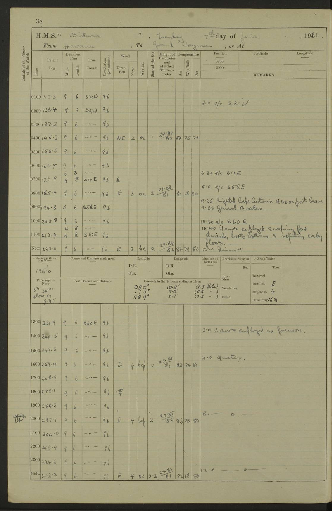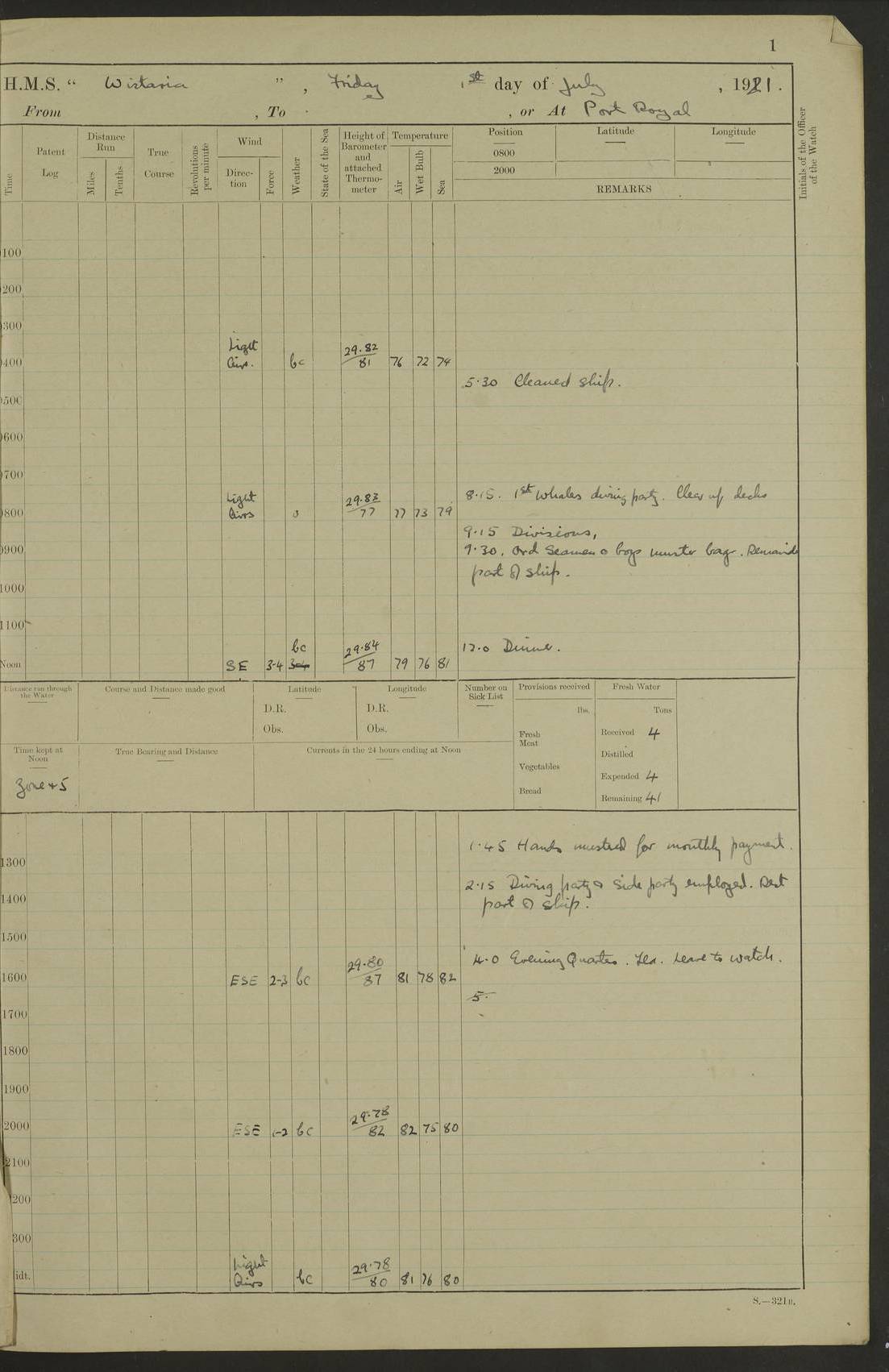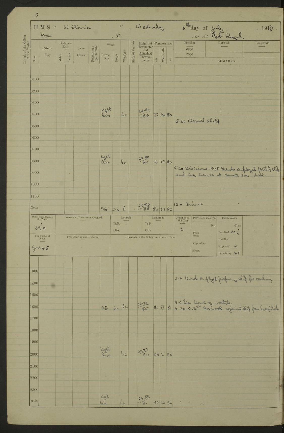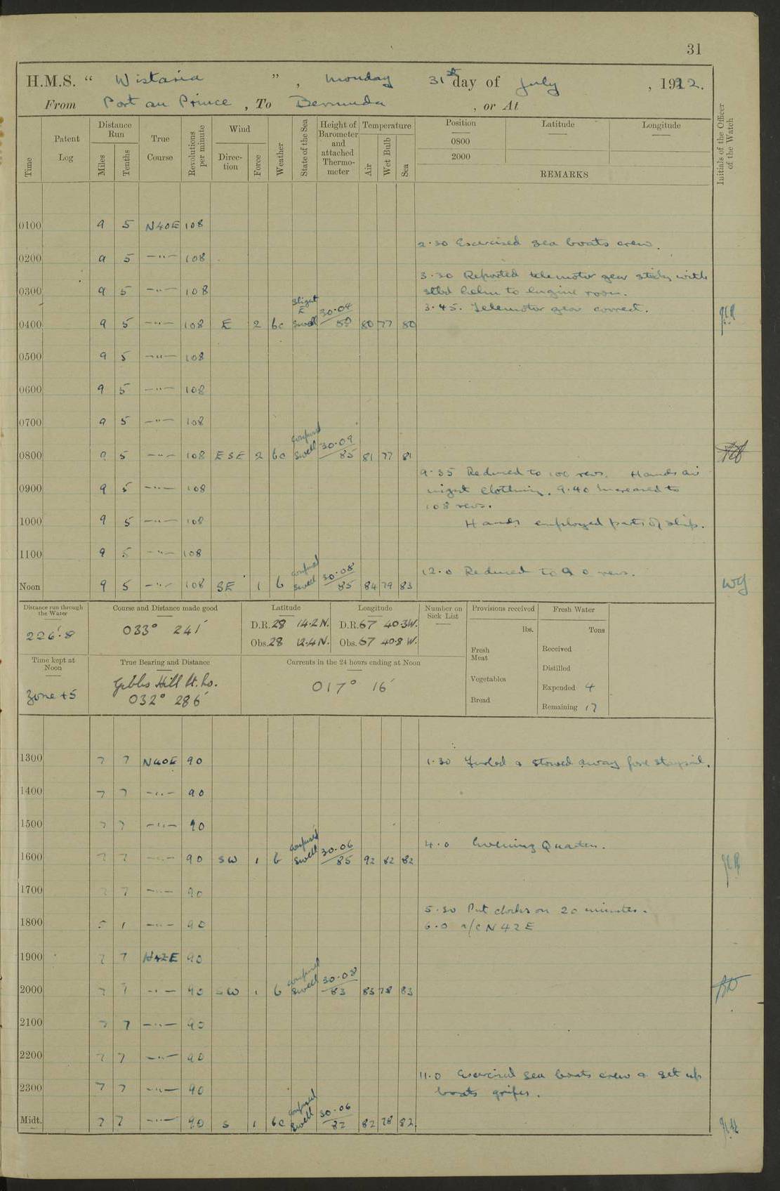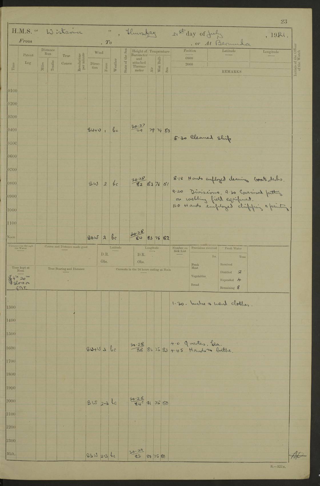 LOGS FOR JULY 1921 4f73ca38a2fc8ea903000a41: (https://s3.amazonaws.com:443/oldweather/ADM53-93262/0003_1.jpg) 1 July 1921 At Port Royal Lat 17.93, Long -76.83 8.15am: 1st whaler diving party. Clear up decks 9.30am: Ord. Seamen & boys muster bags. Remainder part of ship 1.45pm: Hands mustered for monthly payment 2.15pm: Diving party & side party employed. Rest part of ship 4f73ca38a2fc8ea903000a42: (https://s3.amazonaws.com:443/oldweather/ADM53-93262/0004_0.jpg) 2 July 1921 At Port Royal Lat 17.93, Long -76.83 8.15am: Cleaned ship 8.0pm: Concert party landed 8.45pm: Fire party landed 9.45pm: Fire party returned 10.40pm: Fire party landed 4f73ca39a2fc8ea903000a43: (https://s3.amazonaws.com:443/oldweather/ADM53-93262/0004_1.jpg) 3 July 1921 At Port Royal Lat 17.93, Long -76.83 6.30am: Cleaned ship 10.0am: Divisions Number on sick list: 2 4f73ca39a2fc8ea903000a44: (https://s3.amazonaws.com:443/oldweather/ADM53-93262/0005_0.jpg) 4 July 1921 At Port Royal Lat 17.93, Long -76.83 8.15am: Hands employed on boats & part of ship 2.0pm: Embarked 6” projectiles 10.30pm: Left harbour for Morant Cays. Course & speed as requisite 11.20pm: Dumped ammunition Number on sick list: 1 4f73ca39a2fc8ea903000a45: (https://s3.amazonaws.com:443/oldweather/ADM53-93262/0005_1.jpg) 5 July 1921 From Morant Cays-Port Royal to Port Royal-Morant Cays Lat 17.93, Long -76.83 6.20am: Sighted Morant Cays ahead 7.20am: Anchored and landed survey party am: Hands employed part of ship. Relief control parties exercised 10.40am: Weighed & proceeded 2.0pm: Hands employed chipping & painting boat deck & squaring off upper deck 3.10pm: Sighted Plum Point on Starboard bow 4.40pm: Stopped & manoeuvred as required for ship photograph to be taken 5.15pm: Secured alongside waling jetty. Leave to watch 4f73ca3aa2fc8ea903000a46: (https://s3.amazonaws.com:443/oldweather/ADM53-93262/0006_0.jpg) 6 July 1921 At Port Royal Lat 17.93, Long -76.83 9.25am: Hands employed parts of ship and six hands at small arm drill 2.0pm: Hands employed preparing ship for coaling 4.20pm: O.S. III Seabrook rejoined ship from hospital Number on sick list: 2 4f73ca3aa2fc8ea903000a47: (https://s3.amazonaws.com:443/oldweather/ADM53-93262/0006_1.jpg) 7 July 1921 At Port Royal Lat 17.93, Long -76.83 5.30am: Sanded decks 7.0am: Coaled ship with native labour 8.15am: Hands employed cleaning boats 11.20am: Finished coaling. Wash down & scrub upper deck Number on sick list: 4 4f73ca3aa2fc8ea903000a48: (https://s3.amazonaws.com:443/oldweather/ADM53-93262/0007_0.jpg) 8 July 1921 At Port Royal Lat 17.93, Long -76.83 8.15am: Hands employed cleaning paintwork & 3 hands about seine net 1.40pm: Starboard watch employed getting mine sweeping gear inboard 2.0pm: Port watch employed part of ship 3.0pm: Starboard watch employed part of ship 4.0pm: Tea. Ship put in quarantine 5.10pm: Surgeon McCallum left ship for military hospital Number on sick list: 1 [Surgeon McCallum: perhaps Surgeon Archie McCallum] 4f73ca3ba2fc8ea903000a49: (https://s3.amazonaws.com:443/oldweather/ADM53-93262/0007_1.jpg) 9 July 1921 At Port Royal Lat 17.93, Long -76.83 6.45am: Party left for isolation hospital to fumigate gear 11.50am: Air bedding 2.40pm: Bathing party landed 3.30pm: Bathing party returned 5.0pm: All hands vaccinated 4f73ca3ba2fc8ea903000a4a: (https://s3.amazonaws.com:443/oldweather/ADM53-93262/0008_0.jpg) 10 July 1921 At Port Royal Lat 17.93, Long -76.83 am: Parties sent to isolation hospital for fumigation 9.0am: Hands employed clearing mess decks & clearing up decks am: Parties sent for fumigation 1.0pm: All fumigation parties returned 5.15pm: Watch coaled picket boat Number on sick list: 1 4f73ca3ca2fc8ea903000a4b: (https://s3.amazonaws.com:443/oldweather/ADM53-93262/0008_1.jpg) 11 July 1921 From Port Royal to Bermuda and at Port Royal Lat 17.86, Long -76.63 8.15am: Furled forecastle awning 9.25am: Secured ship for sea 10.15am: Left Jetty 11.0am: Streamed patent log 11.01am: Plum Pt bearing N20E. Altered course S71E 3.15pm: Morant Pt bore N7W 3.30pm: Morant Pt bore N73W 6.45pm: Morant Pt bore S69W 9.35pm: Navassa Lt bearing S37E 10.32pm: Navassa Lt abeam 11.30pm: Navassa Lt bearing S24E True Bearing and Distance: Plum Pt Lt 294½°, 90 miles 4f73ca3ca2fc8ea903000a4c: (https://s3.amazonaws.com:443/oldweather/ADM53-93262/0009_0.jpg) 12 July 1921 From Port Royal to Bermuda Lat 20.18, Long -74.01 7.0am: Sighted Cuban mountains on Port bow 8.50am: Furled boat deck awning 9.35am: Exercised control parties, hands employed turning motor boats falls end for end, scarping & painting 2.0pm: Hands employed as forenoon 4.02pm: Sighted Great Inagua Lt Ho N48E 5.15pm: Course as required for re-charging telemotor system 5.38pm: Great Inagua Lt Ho abeam, 7 miles 6.30pm: N.W. Pt abeam, 1 mile True Bearing and Distance: Cape Maysi Lt Ho 299½°, 7¼ miles 4f73ca3ca2fc8ea903000a4d: (https://s3.amazonaws.com:443/oldweather/ADM53-93262/0009_1.jpg) 13 July 1921 From Port Royal to Bermuda Lat 23.13, Long -71.83 9.40am: Hands employed fitting new streaming light halliyards, scraping & cleaning part of ship 2.0pm: Hands employed scraping, painting & redleading parts of ship True Bearing and Distance: Gibbs Hill Lt Ho 034¼°, 672 miles 4f73ca3da2fc8ea903000a4e: (https://s3.amazonaws.com:443/oldweather/ADM53-93262/0010_0.jpg) 14 July 1921 From Port Royal to Bermuda Lat 25.91, Long -69.55 2.10am: Hauled in Patent log to clear it 2.15am: Log streamed 9.0am: Hauled in patent log 9.30am: Hands employed mustering bags & hammocks 2.0pm: Hands scrub hammocks 4.0pm: Evening Quarters. Exercised collision stations 5.0pm: Put clocks on 20 minutes True Bearing and Distance: Gibbs Hill Lt Ho 034°, 452 miles 4f73ca3da2fc8ea903000a4f: (https://s3.amazonaws.com:443/oldweather/ADM53-93262/0010_1.jpg) 15 July 1921 From Port Royal to Bermuda Lat 29.03, Long -67.18 9.40am: Exercised action stations. Fired one belt of ammunition from each pom pom 10.30am: Ord. Sea & boys to school. Pom Pom’s crews working about guns, remainders chip