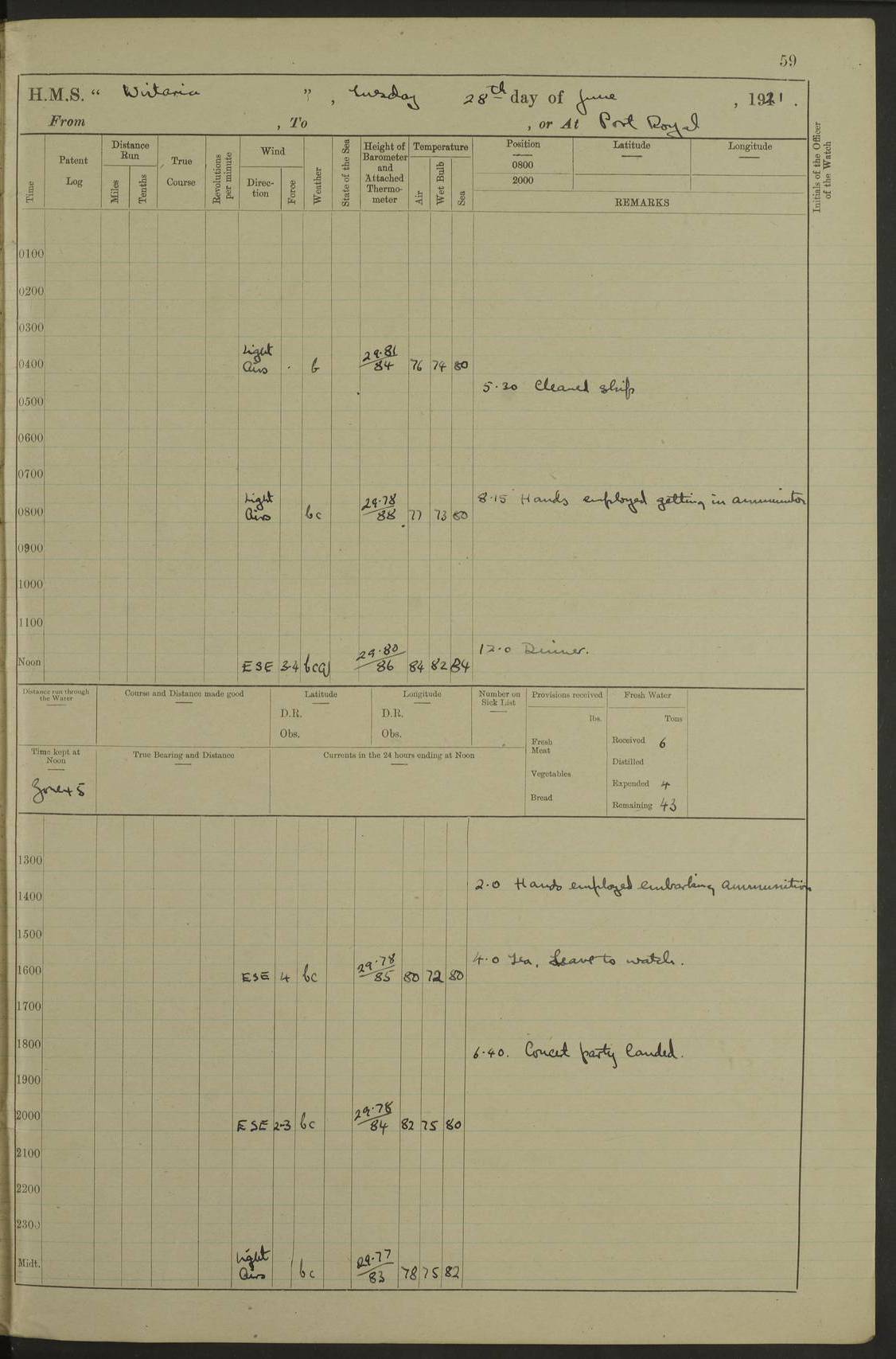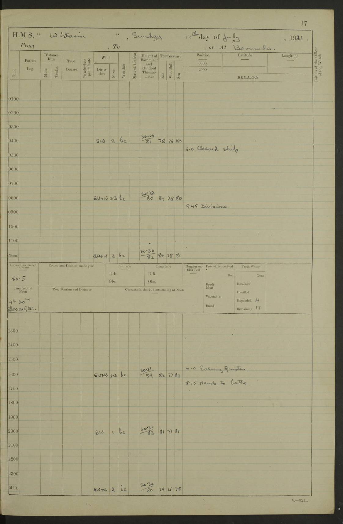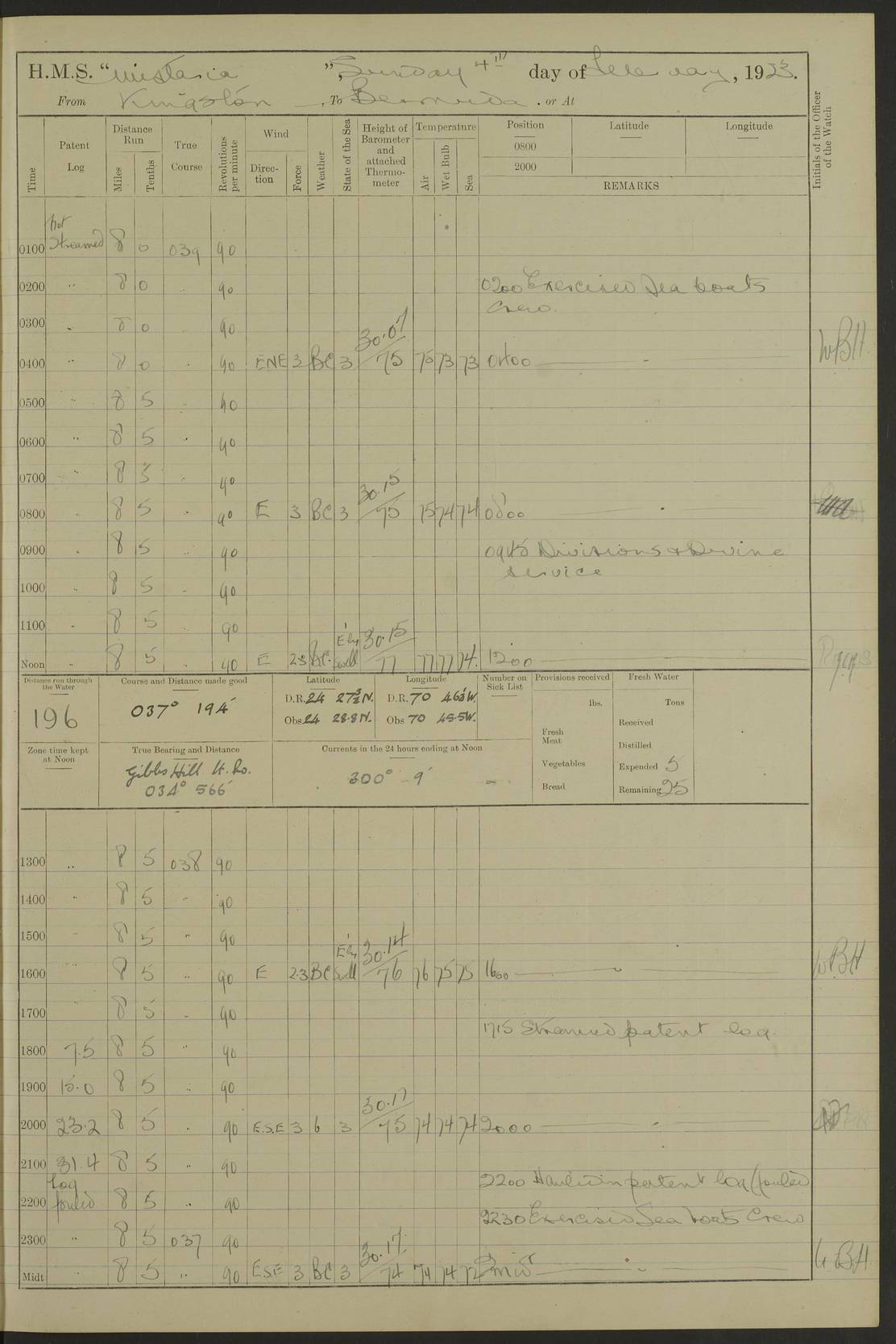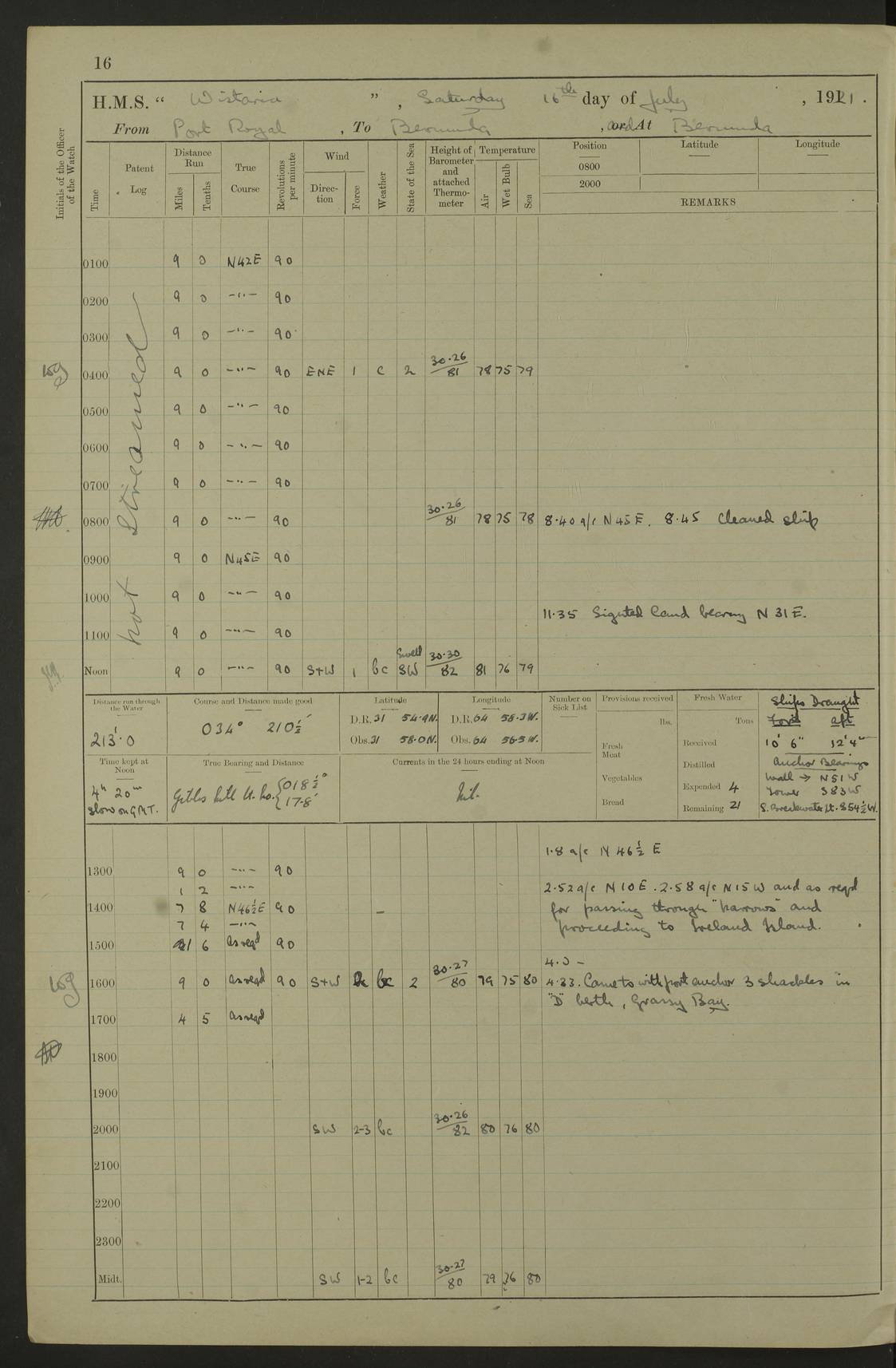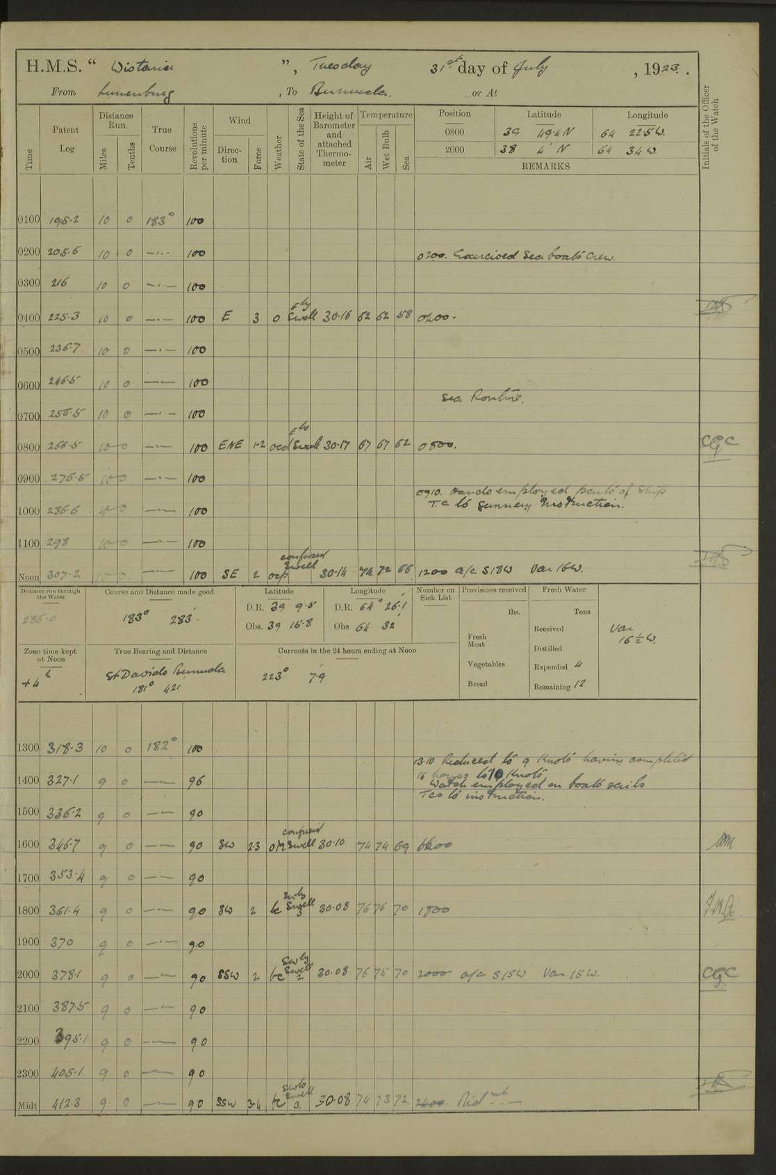 LOGS FOR JULY 1921 4f73ca38a2fc8ea903000a41: (https://s3.amazonaws.com:443/oldweather/ADM53-93262/0003_1.jpg) 1 July 1921 At Port Royal Lat 17.93, Long -76.83 8.15am: 1st whaler diving party. Clear up decks 9.30am: Ord. Seamen & boys muster bags. Remainder part of ship 1.45pm: Hands mustered for monthly payment 2.15pm: Diving party & side party employed. Rest part of ship 4f73ca38a2fc8ea903000a42: (https://s3.amazonaws.com:443/oldweather/ADM53-93262/0004_0.jpg) 2 July 1921 At Port Royal Lat 17.93, Long -76.83 8.15am: Cleaned ship 8.0pm: Concert party landed 8.45pm: Fire party landed 9.45pm: Fire party returned 10.40pm: Fire party landed 4f73ca39a2fc8ea903000a43: (https://s3.amazonaws.com:443/oldweather/ADM53-93262/0004_1.jpg) 3 July 1921 At Port Royal Lat 17.93, Long -76.83 6.30am: Cleaned ship 10.0am: Divisions Number on sick list: 2 4f73ca39a2fc8ea903000a44: (https://s3.amazonaws.com:443/oldweather/ADM53-93262/0005_0.jpg) 4 July 1921 At Port Royal Lat 17.93, Long -76.83 8.15am: Hands employed on boats & part of ship 2.0pm: Embarked 6” projectiles 10.30pm: Left harbour for Morant Cays. Course & speed as requisite 11.20pm: Dumped ammunition Number on sick list: 1 4f73ca39a2fc8ea903000a45: (https://s3.amazonaws.com:443/oldweather/ADM53-93262/0005_1.jpg) 5 July 1921 From Morant Cays-Port Royal to Port Royal-Morant Cays Lat 17.93, Long -76.83 6.20am: Sighted Morant Cays ahead 7.20am: Anchored and landed survey party am: Hands employed part of ship. Relief control parties exercised 10.40am: Weighed & proceeded 2.0pm: Hands employed chipping & painting boat deck & squaring off upper deck 3.10pm: Sighted Plum Point on Starboard bow 4.40pm: Stopped & manoeuvred as required for ship photograph to be taken 5.15pm: Secured alongside waling jetty. Leave to watch 4f73ca3aa2fc8ea903000a46: (https://s3.amazonaws.com:443/oldweather/ADM53-93262/0006_0.jpg) 6 July 1921 At Port Royal Lat 17.93, Long -76.83 9.25am: Hands employed parts of ship and six hands at small arm drill 2.0pm: Hands employed preparing ship for coaling 4.20pm: O.S. III Seabrook rejoined ship from hospital Number on sick list: 2 4f73ca3aa2fc8ea903000a47: (https://s3.amazonaws.com:443/oldweather/ADM53-93262/0006_1.jpg) 7 July 1921 At Port Royal Lat 17.93, Long -76.83 5.30am: Sanded decks 7.0am: Coaled ship with native labour 8.15am: Hands employed cleaning boats 11.20am: Finished coaling. Wash down & scrub upper deck Number on sick list: 4 4f73ca3aa2fc8ea903000a48: (https://s3.amazonaws.com:443/oldweather/ADM53-93262/0007_0.jpg) 8 July 1921 At Port Royal Lat 17.93, Long -76.83 8.15am: Hands employed cleaning paintwork & 3 hands about seine net 1.40pm: Starboard watch employed getting mine sweeping gear inboard 2.0pm: Port watch employed part of ship 3.0pm: Starboard watch employed part of ship 4.0pm: Tea. Ship put in quarantine 5.10pm: Surgeon McCallum left ship for military hospital Number on sick list: 1 [Surgeon McCallum: perhaps Surgeon Archie McCallum] 4f73ca3ba2fc8ea903000a49: (https://s3.amazonaws.com:443/oldweather/ADM53-93262/0007_1.jpg) 9 July 1921 At Port Royal Lat 17.93, Long -76.83 6.45am: Party left for isolation hospital to fumigate gear 11.50am: Air bedding 2.40pm: Bathing party landed 3.30pm: Bathing party returned 5.0pm: All hands vaccinated 4f73ca3ba2fc8ea903000a4a: (https://s3.amazonaws.com:443/oldweather/ADM53-93262/0008_0.jpg) 10 July 1921 At Port Royal Lat 17.93, Long -76.83 am: Parties sent to isolation hospital for fumigation 9.0am: Hands employed clearing mess decks & clearing up decks am: Parties sent for fumigation 1.0pm: All fumigation parties returned 5.15pm: Watch coaled picket boat Number on sick list: 1 4f73ca3ca2fc8ea903000a4b: (https://s3.amazonaws.com:443/oldweather/ADM53-93262/0008_1.jpg) 11 July 1921 From Port Royal to Bermuda and at Port Royal Lat 17.86, Long -76.63 8.15am: Furled forecastle awning 9.25am: Secured ship for sea 10.15am: Left Jetty 11.0am: Streamed patent log 11.01am: Plum Pt bearing N20E. Altered course S71E 3.15pm: Morant Pt bore N7W 3.30pm: Morant Pt bore N73W 6.45pm: Morant Pt bore S69W 9.35pm: Navassa Lt bearing S37E 10.32pm: Navassa Lt abeam 11.30pm: Navassa Lt bearing S24E True Bearing and Distance: Plum Pt Lt 294½°, 90 miles 4f73ca3ca2fc8ea903000a4c: (https://s3.amazonaws.com:443/oldweather/ADM53-93262/0009_0.jpg) 12 July 1921 From Port Royal to Bermuda Lat 20.18, Long -74.01 7.0am: Sighted Cuban mountains on Port bow 8.50am: Furled boat deck awning 9.35am: Exercised control parties, hands employed turning motor boats falls end for end, scarping & painting 2.0pm: Hands employed as forenoon 4.02pm: Sighted Great Inagua Lt Ho N48E 5.15pm: Course as required for re-charging telemotor system 5.38pm: Great Inagua Lt Ho abeam, 7 miles 6.30pm: N.W. Pt abeam, 1 mile True Bearing and Distance: Cape Maysi Lt Ho 299½°, 7¼ miles 4f73ca3ca2fc8ea903000a4d: (https://s3.amazonaws.com:443/oldweather/ADM53-93262/0009_1.jpg) 13 July 1921 From Port Royal to Bermuda Lat 23.13, Long -71.83 9.40am: Hands employed fitting new streaming light halliyards, scraping & cleaning part of ship 2.0pm: Hands employed scraping, painting & redleading parts of ship True Bearing and Distance: Gibbs Hill Lt Ho 034¼°, 672 miles 4f73ca3da2fc8ea903000a4e: (https://s3.amazonaws.com:443/oldweather/ADM53-93262/0010_0.jpg) 14 July 1921 From Port Royal to Bermuda Lat 25.91, Long -69.55 2.10am: Hauled in Patent log to clear it 2.15am: Log streamed 9.0am: Hauled in patent log 9.30am: Hands employed mustering bags & hammocks 2.0pm: Hands scrub hammocks 4.0pm: Evening Quarters. Exercised collision stations 5.0pm: Put clocks on 20 minutes True Bearing and Distance: Gibbs Hill Lt Ho 034°, 452 miles 4f73ca3da2fc8ea903000a4f: (https://s3.amazonaws.com:443/oldweather/ADM53-93262/0010_1.jpg) 15 July 1921 From Port Royal to Bermuda Lat 29.03, Long -67.18 9.40am: Exercised action stations. Fired one belt of ammunition from each pom pom 10.30am: Ord. Sea & boys to school. Pom Pom’s crews working about guns, remainders chip