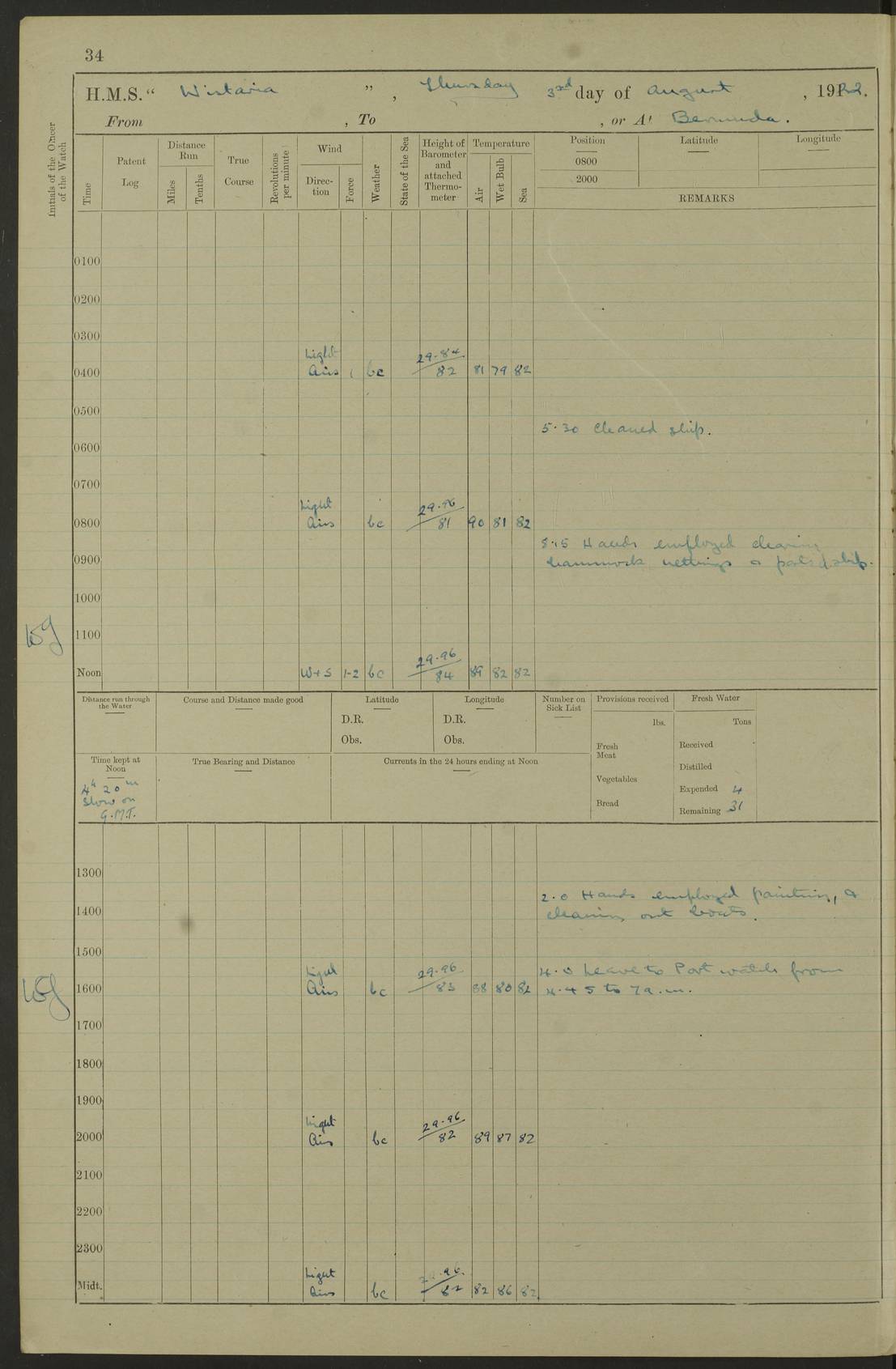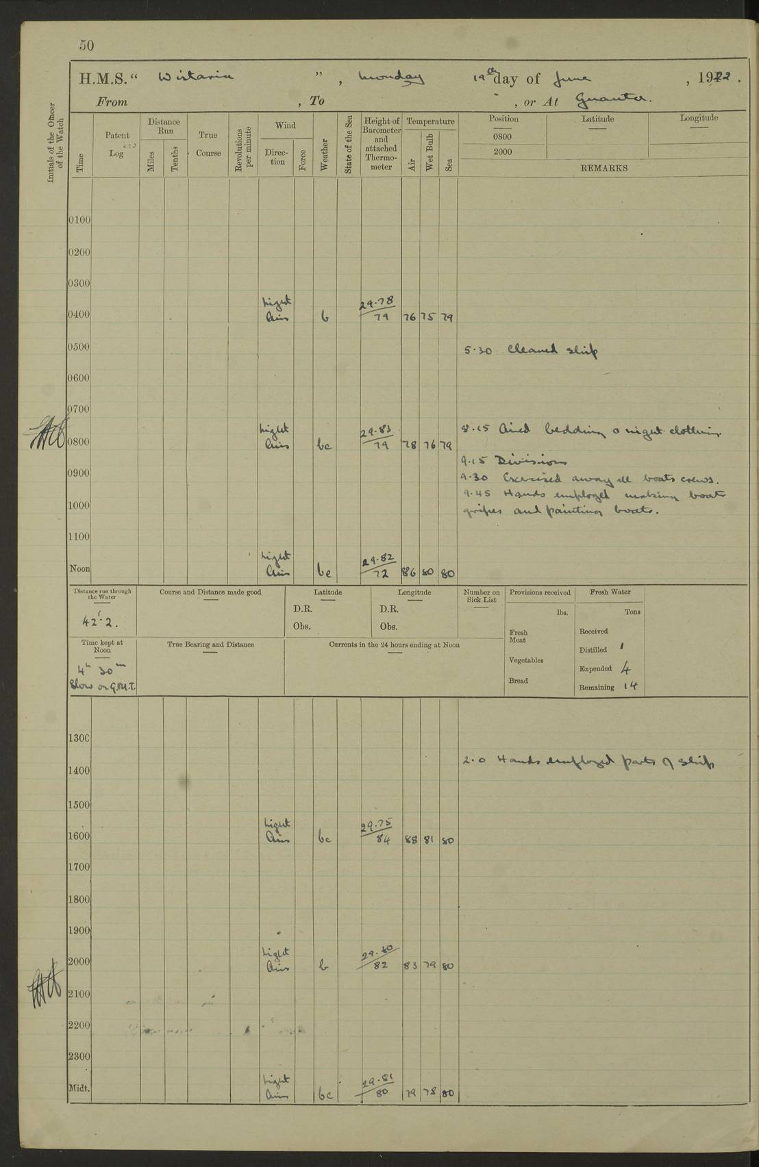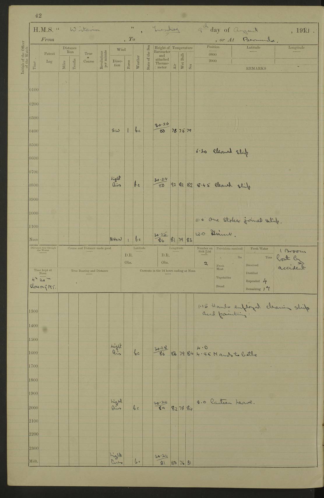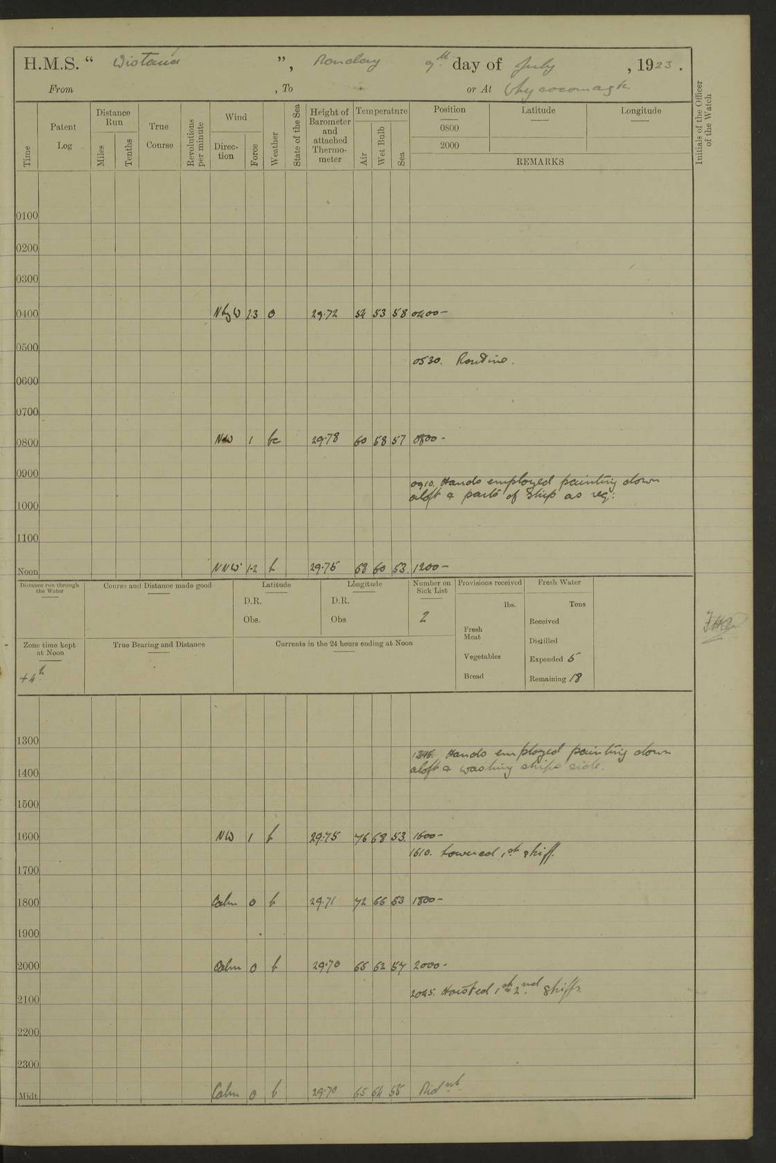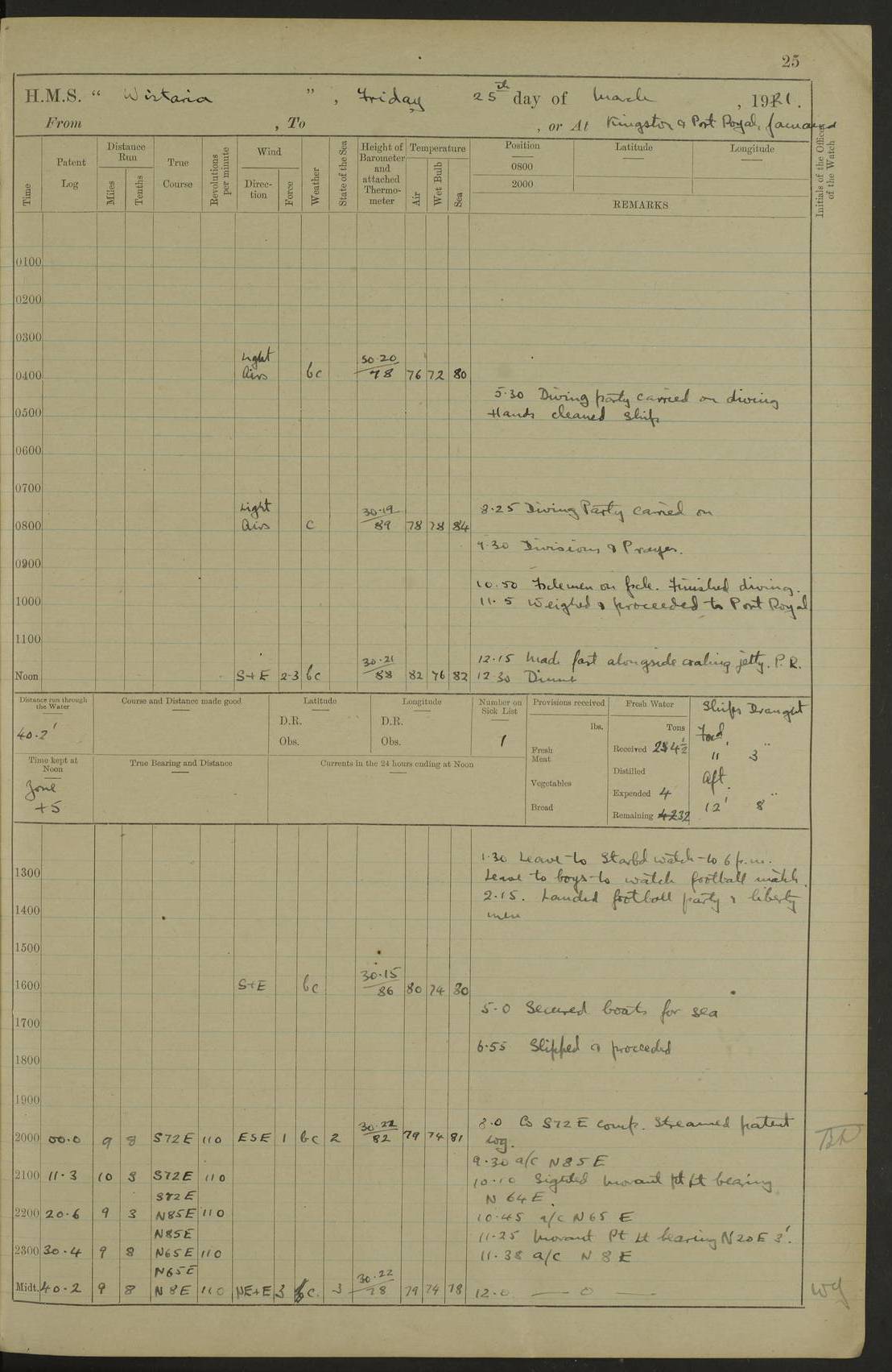LOGS FOR JULY 1921 4f73ca38a2fc8ea903000a41: (https://s3.amazonaws.com:443/oldweather/ADM53-93262/0003_1.jpg) 1 July 1921 At Port Royal Lat 17.93, Long -76.83 8.15am: 1st whaler diving party. Clear up decks 9.30am: Ord. Seamen & boys muster bags. Remainder part of ship 1.45pm: Hands mustered for monthly payment 2.15pm: Diving party & side party employed. Rest part of ship 4f73ca38a2fc8ea903000a42: (https://s3.amazonaws.com:443/oldweather/ADM53-93262/0004_0.jpg) 2 July 1921 At Port Royal Lat 17.93, Long -76.83 8.15am: Cleaned ship 8.0pm: Concert party landed 8.45pm: Fire party landed 9.45pm: Fire party returned 10.40pm: Fire party landed 4f73ca39a2fc8ea903000a43: (https://s3.amazonaws.com:443/oldweather/ADM53-93262/0004_1.jpg) 3 July 1921 At Port Royal Lat 17.93, Long -76.83 6.30am: Cleaned ship 10.0am: Divisions Number on sick list: 2 4f73ca39a2fc8ea903000a44: (https://s3.amazonaws.com:443/oldweather/ADM53-93262/0005_0.jpg) 4 July 1921 At Port Royal Lat 17.93, Long -76.83 8.15am: Hands employed on boats & part of ship 2.0pm: Embarked 6” projectiles 10.30pm: Left harbour for Morant Cays. Course & speed as requisite 11.20pm: Dumped ammunition Number on sick list: 1 4f73ca39a2fc8ea903000a45: (https://s3.amazonaws.com:443/oldweather/ADM53-93262/0005_1.jpg) 5 July 1921 From Morant Cays-Port Royal to Port Royal-Morant Cays Lat 17.93, Long -76.83 6.20am: Sighted Morant Cays ahead 7.20am: Anchored and landed survey party am: Hands employed part of ship. Relief control parties exercised 10.40am: Weighed & proceeded 2.0pm: Hands employed chipping & painting boat deck & squaring off upper deck 3.10pm: Sighted Plum Point on Starboard bow 4.40pm: Stopped & manoeuvred as required for ship photograph to be taken 5.15pm: Secured alongside waling jetty. Leave to watch 4f73ca3aa2fc8ea903000a46: (https://s3.amazonaws.com:443/oldweather/ADM53-93262/0006_0.jpg) 6 July 1921 At Port Royal Lat 17.93, Long -76.83 9.25am: Hands employed parts of ship and six hands at small arm drill 2.0pm: Hands employed preparing ship for coaling 4.20pm: O.S. III Seabrook rejoined ship from hospital Number on sick list: 2 4f73ca3aa2fc8ea903000a47: (https://s3.amazonaws.com:443/oldweather/ADM53-93262/0006_1.jpg) 7 July 1921 At Port Royal Lat 17.93, Long -76.83 5.30am: Sanded decks 7.0am: Coaled ship with native labour 8.15am: Hands employed cleaning boats 11.20am: Finished coaling. Wash down & scrub upper deck Number on sick list: 4 4f73ca3aa2fc8ea903000a48: (https://s3.amazonaws.com:443/oldweather/ADM53-93262/0007_0.jpg) 8 July 1921 At Port Royal Lat 17.93, Long -76.83 8.15am: Hands employed cleaning paintwork & 3 hands about seine net 1.40pm: Starboard watch employed getting mine sweeping gear inboard 2.0pm: Port watch employed part of ship 3.0pm: Starboard watch employed part of ship 4.0pm: Tea. Ship put in quarantine 5.10pm: Surgeon McCallum left ship for military hospital Number on sick list: 1 [Surgeon McCallum: perhaps Surgeon Archie McCallum] 4f73ca3ba2fc8ea903000a49: (https://s3.amazonaws.com:443/oldweather/ADM53-93262/0007_1.jpg) 9 July 1921 At Port Royal Lat 17.93, Long -76.83 6.45am: Party left for isolation hospital to fumigate gear 11.50am: Air bedding 2.40pm: Bathing party landed 3.30pm: Bathing party returned 5.0pm: All hands vaccinated 4f73ca3ba2fc8ea903000a4a: (https://s3.amazonaws.com:443/oldweather/ADM53-93262/0008_0.jpg) 10 July 1921 At Port Royal Lat 17.93, Long -76.83 am: Parties sent to isolation hospital for fumigation 9.0am: Hands employed clearing mess decks & clearing up decks am: Parties sent for fumigation 1.0pm: All fumigation parties returned 5.15pm: Watch coaled picket boat Number on sick list: 1 4f73ca3ca2fc8ea903000a4b: (https://s3.amazonaws.com:443/oldweather/ADM53-93262/0008_1.jpg) 11 July 1921 From Port Royal to Bermuda and at Port Royal Lat 17.86, Long -76.63 8.15am: Furled forecastle awning 9.25am: Secured ship for sea 10.15am: Left Jetty 11.0am: Streamed patent log 11.01am: Plum Pt bearing N20E. Altered course S71E 3.15pm: Morant Pt bore N7W 3.30pm: Morant Pt bore N73W 6.45pm: Morant Pt bore S69W 9.35pm: Navassa Lt bearing S37E 10.32pm: Navassa Lt abeam 11.30pm: Navassa Lt bearing S24E True Bearing and Distance: Plum Pt Lt 294½°, 90 miles 4f73ca3ca2fc8ea903000a4c: (https://s3.amazonaws.com:443/oldweather/ADM53-93262/0009_0.jpg) 12 July 1921 From Port Royal to Bermuda Lat 20.18, Long -74.01 7.0am: Sighted Cuban mountains on Port bow 8.50am: Furled boat deck awning 9.35am: Exercised control parties, hands employed turning motor boats falls end for end, scarping & painting 2.0pm: Hands employed as forenoon 4.02pm: Sighted Great Inagua Lt Ho N48E 5.15pm: Course as required for re-charging telemotor system 5.38pm: Great Inagua Lt Ho abeam, 7 miles 6.30pm: N.W. Pt abeam, 1 mile True Bearing and Distance: Cape Maysi Lt Ho 299½°, 7¼ miles 4f73ca3ca2fc8ea903000a4d: (https://s3.amazonaws.com:443/oldweather/ADM53-93262/0009_1.jpg) 13 July 1921 From Port Royal to Bermuda Lat 23.13, Long -71.83 9.40am: Hands employed fitting new streaming light halliyards, scraping & cleaning part of ship 2.0pm: Hands employed scraping, painting & redleading parts of ship True Bearing and Distance: Gibbs Hill Lt Ho 034¼°, 672 miles 4f73ca3da2fc8ea903000a4e: (https://s3.amazonaws.com:443/oldweather/ADM53-93262/0010_0.jpg) 14 July 1921 From Port Royal to Bermuda Lat 25.91, Long -69.55 2.10am: Hauled in Patent log to clear it 2.15am: Log streamed 9.0am: Hauled in patent log 9.30am: Hands employed mustering bags & hammocks 2.0pm: Hands scrub hammocks 4.0pm: Evening Quarters. Exercised collision stations 5.0pm: Put clocks on 20 minutes True Bearing and Distance: Gibbs Hill Lt Ho 034°, 452 miles 4f73ca3da2fc8ea903000a4f: (https://s3.amazonaws.com:443/oldweather/ADM53-93262/0010_1.jpg) 15 July 1921 From Port Royal to Bermuda Lat 29.03, Long -67.18 9.40am: Exercised action stations. Fired one belt of ammunition from each pom pom 10.30am: Ord. Sea & boys to school. Pom Pom’s crews working about guns, remainders chip