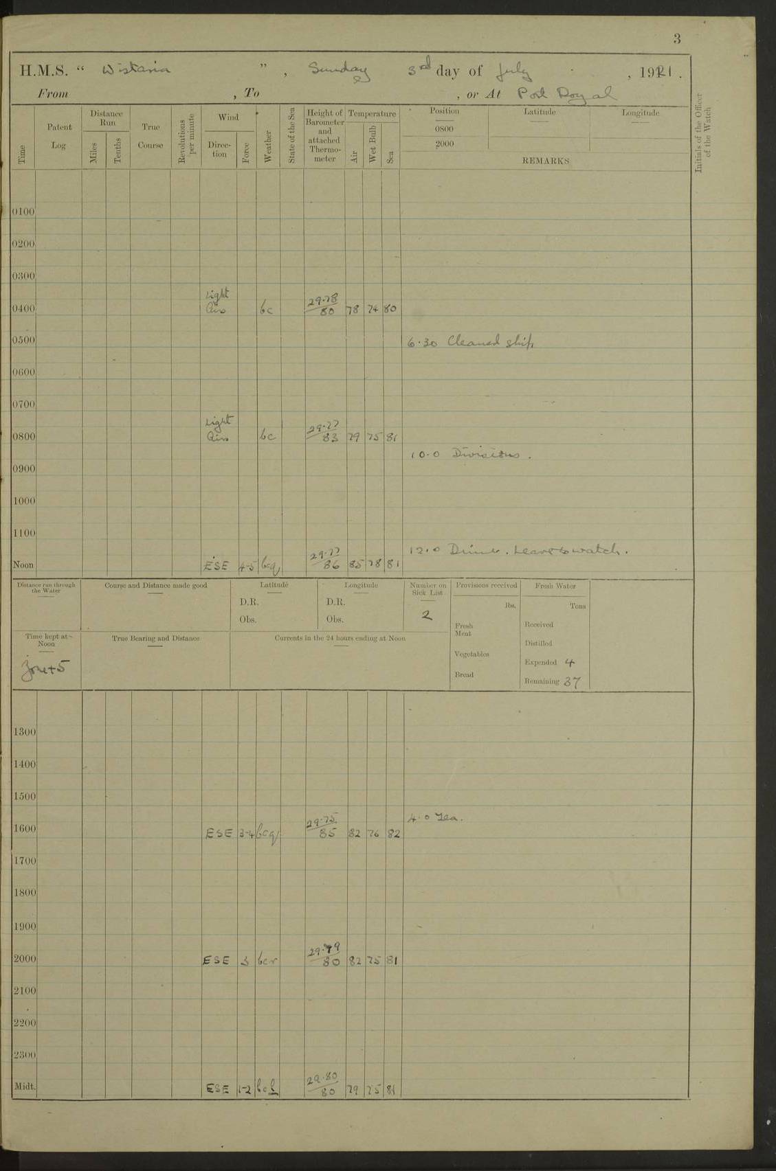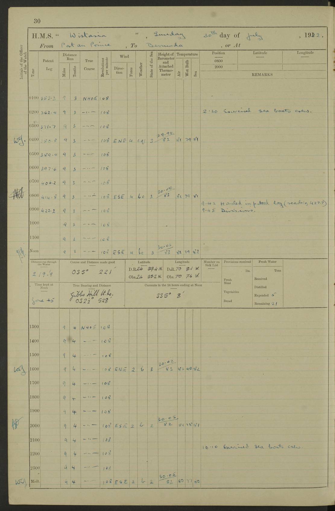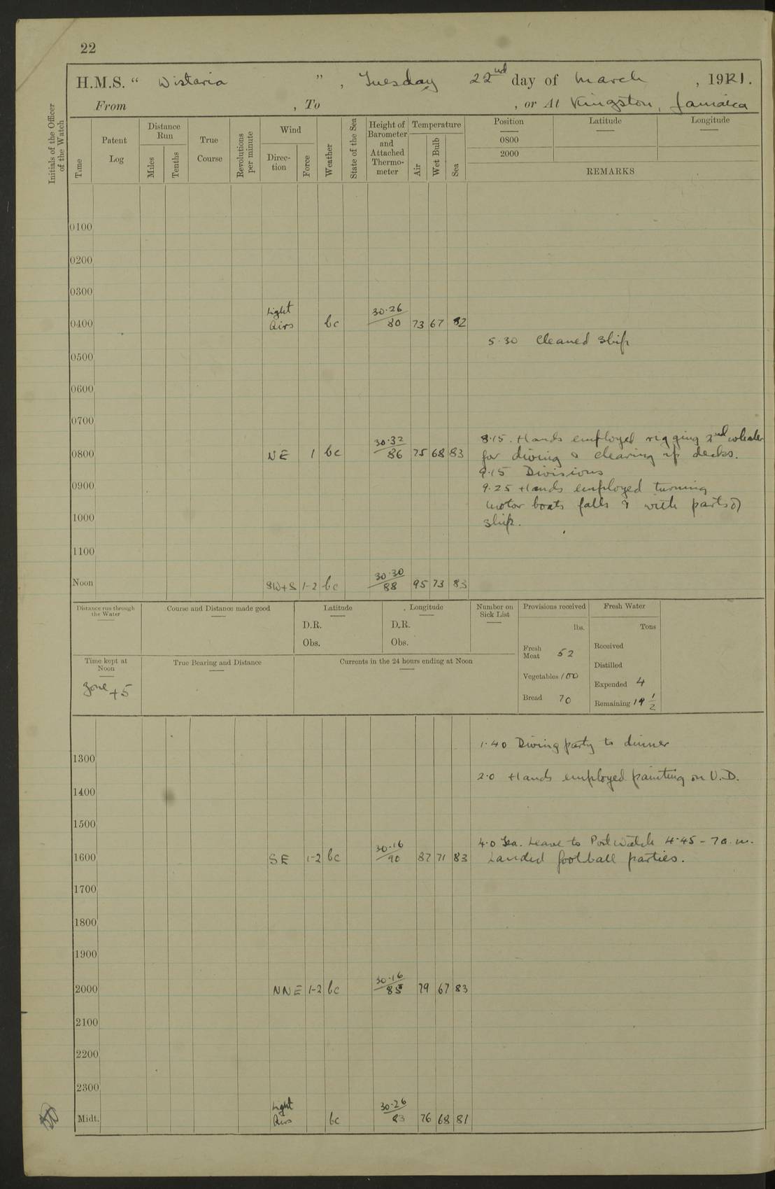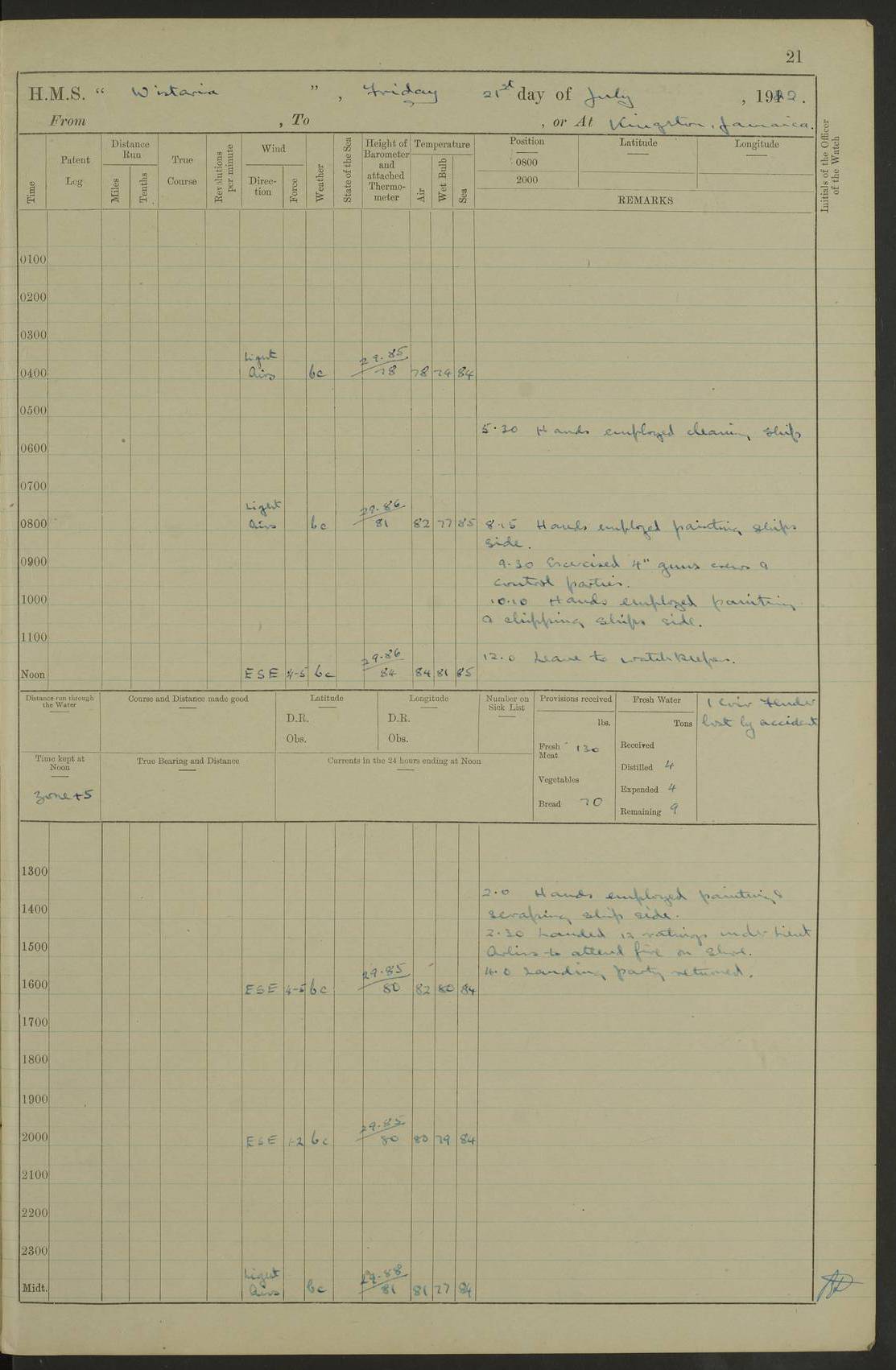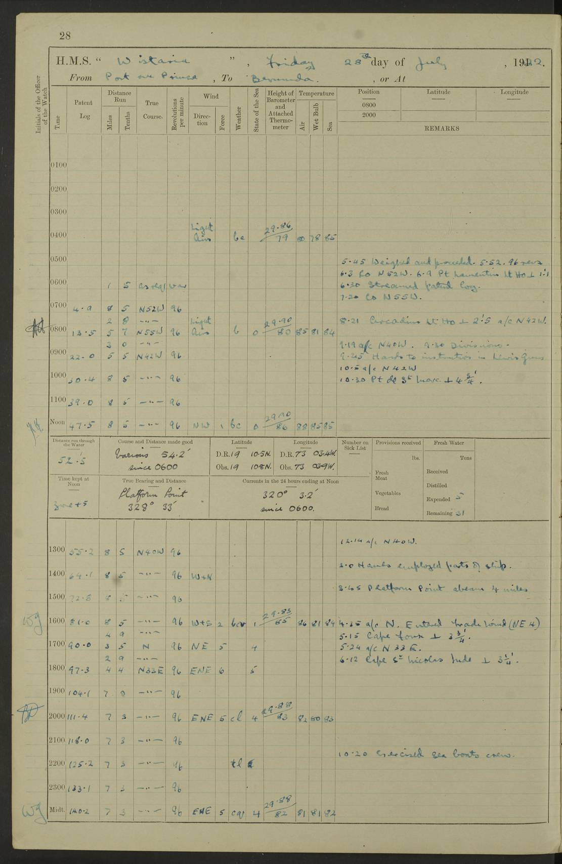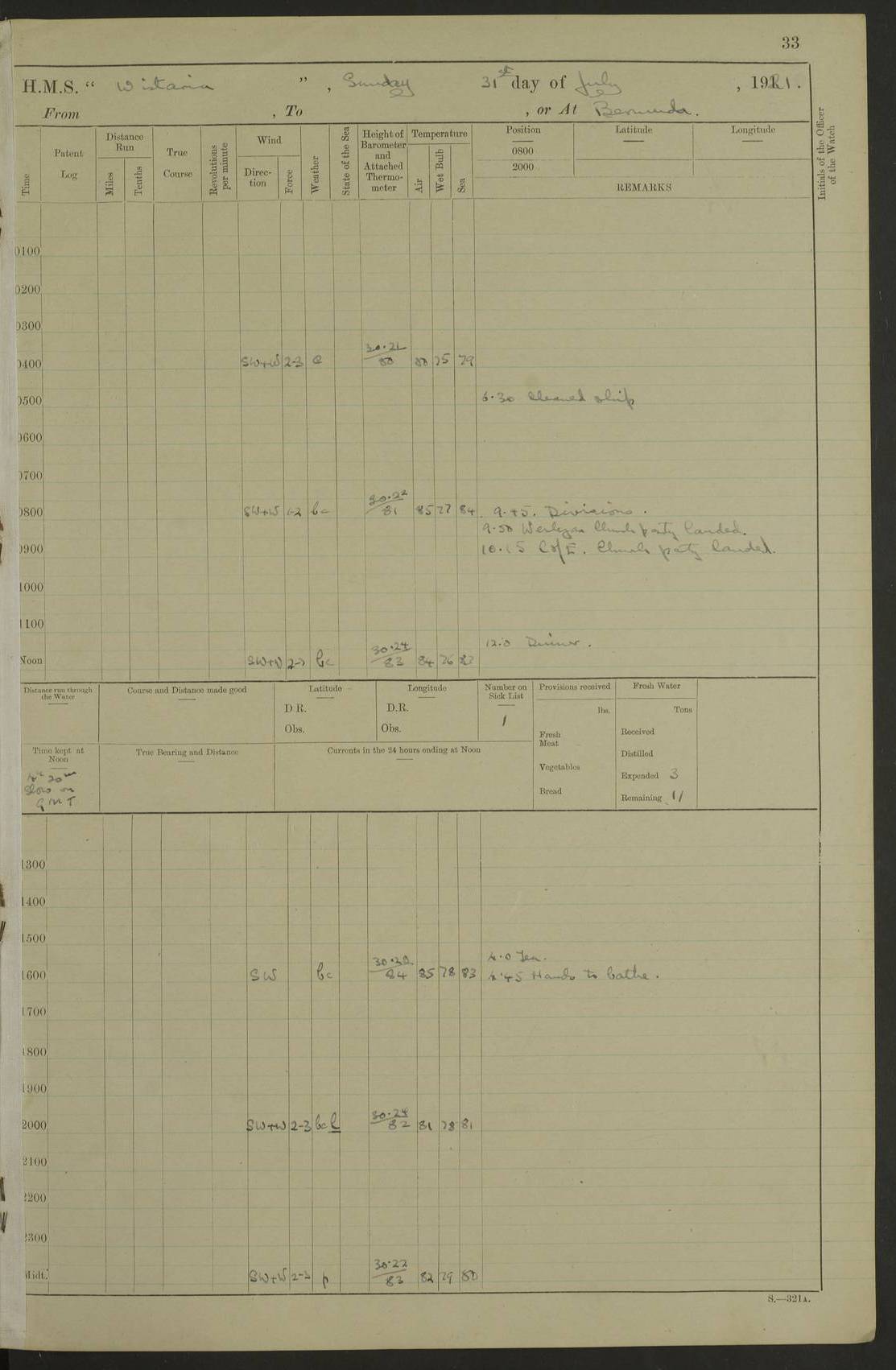 LOGS FOR JULY 1921 4f73ca38a2fc8ea903000a41: (https://s3.amazonaws.com:443/oldweather/ADM53-93262/0003_1.jpg) 1 July 1921 At Port Royal Lat 17.93, Long -76.83 8.15am: 1st whaler diving party. Clear up decks 9.30am: Ord. Seamen & boys muster bags. Remainder part of ship 1.45pm: Hands mustered for monthly payment 2.15pm: Diving party & side party employed. Rest part of ship 4f73ca38a2fc8ea903000a42: (https://s3.amazonaws.com:443/oldweather/ADM53-93262/0004_0.jpg) 2 July 1921 At Port Royal Lat 17.93, Long -76.83 8.15am: Cleaned ship 8.0pm: Concert party landed 8.45pm: Fire party landed 9.45pm: Fire party returned 10.40pm: Fire party landed 4f73ca39a2fc8ea903000a43: (https://s3.amazonaws.com:443/oldweather/ADM53-93262/0004_1.jpg) 3 July 1921 At Port Royal Lat 17.93, Long -76.83 6.30am: Cleaned ship 10.0am: Divisions Number on sick list: 2 4f73ca39a2fc8ea903000a44: (https://s3.amazonaws.com:443/oldweather/ADM53-93262/0005_0.jpg) 4 July 1921 At Port Royal Lat 17.93, Long -76.83 8.15am: Hands employed on boats & part of ship 2.0pm: Embarked 6” projectiles 10.30pm: Left harbour for Morant Cays. Course & speed as requisite 11.20pm: Dumped ammunition Number on sick list: 1 4f73ca39a2fc8ea903000a45: (https://s3.amazonaws.com:443/oldweather/ADM53-93262/0005_1.jpg) 5 July 1921 From Morant Cays-Port Royal to Port Royal-Morant Cays Lat 17.93, Long -76.83 6.20am: Sighted Morant Cays ahead 7.20am: Anchored and landed survey party am: Hands employed part of ship. Relief control parties exercised 10.40am: Weighed & proceeded 2.0pm: Hands employed chipping & painting boat deck & squaring off upper deck 3.10pm: Sighted Plum Point on Starboard bow 4.40pm: Stopped & manoeuvred as required for ship photograph to be taken 5.15pm: Secured alongside waling jetty. Leave to watch 4f73ca3aa2fc8ea903000a46: (https://s3.amazonaws.com:443/oldweather/ADM53-93262/0006_0.jpg) 6 July 1921 At Port Royal Lat 17.93, Long -76.83 9.25am: Hands employed parts of ship and six hands at small arm drill 2.0pm: Hands employed preparing ship for coaling 4.20pm: O.S. III Seabrook rejoined ship from hospital Number on sick list: 2 4f73ca3aa2fc8ea903000a47: (https://s3.amazonaws.com:443/oldweather/ADM53-93262/0006_1.jpg) 7 July 1921 At Port Royal Lat 17.93, Long -76.83 5.30am: Sanded decks 7.0am: Coaled ship with native labour 8.15am: Hands employed cleaning boats 11.20am: Finished coaling. Wash down & scrub upper deck Number on sick list: 4 4f73ca3aa2fc8ea903000a48: (https://s3.amazonaws.com:443/oldweather/ADM53-93262/0007_0.jpg) 8 July 1921 At Port Royal Lat 17.93, Long -76.83 8.15am: Hands employed cleaning paintwork & 3 hands about seine net 1.40pm: Starboard watch employed getting mine sweeping gear inboard 2.0pm: Port watch employed part of ship 3.0pm: Starboard watch employed part of ship 4.0pm: Tea. Ship put in quarantine 5.10pm: Surgeon McCallum left ship for military hospital Number on sick list: 1 [Surgeon McCallum: perhaps Surgeon Archie McCallum] 4f73ca3ba2fc8ea903000a49: (https://s3.amazonaws.com:443/oldweather/ADM53-93262/0007_1.jpg) 9 July 1921 At Port Royal Lat 17.93, Long -76.83 6.45am: Party left for isolation hospital to fumigate gear 11.50am: Air bedding 2.40pm: Bathing party landed 3.30pm: Bathing party returned 5.0pm: All hands vaccinated 4f73ca3ba2fc8ea903000a4a: (https://s3.amazonaws.com:443/oldweather/ADM53-93262/0008_0.jpg) 10 July 1921 At Port Royal Lat 17.93, Long -76.83 am: Parties sent to isolation hospital for fumigation 9.0am: Hands employed clearing mess decks & clearing up decks am: Parties sent for fumigation 1.0pm: All fumigation parties returned 5.15pm: Watch coaled picket boat Number on sick list: 1 4f73ca3ca2fc8ea903000a4b: (https://s3.amazonaws.com:443/oldweather/ADM53-93262/0008_1.jpg) 11 July 1921 From Port Royal to Bermuda and at Port Royal Lat 17.86, Long -76.63 8.15am: Furled forecastle awning 9.25am: Secured ship for sea 10.15am: Left Jetty 11.0am: Streamed patent log 11.01am: Plum Pt bearing N20E. Altered course S71E 3.15pm: Morant Pt bore N7W 3.30pm: Morant Pt bore N73W 6.45pm: Morant Pt bore S69W 9.35pm: Navassa Lt bearing S37E 10.32pm: Navassa Lt abeam 11.30pm: Navassa Lt bearing S24E True Bearing and Distance: Plum Pt Lt 294½°, 90 miles 4f73ca3ca2fc8ea903000a4c: (https://s3.amazonaws.com:443/oldweather/ADM53-93262/0009_0.jpg) 12 July 1921 From Port Royal to Bermuda Lat 20.18, Long -74.01 7.0am: Sighted Cuban mountains on Port bow 8.50am: Furled boat deck awning 9.35am: Exercised control parties, hands employed turning motor boats falls end for end, scarping & painting 2.0pm: Hands employed as forenoon 4.02pm: Sighted Great Inagua Lt Ho N48E 5.15pm: Course as required for re-charging telemotor system 5.38pm: Great Inagua Lt Ho abeam, 7 miles 6.30pm: N.W. Pt abeam, 1 mile True Bearing and Distance: Cape Maysi Lt Ho 299½°, 7¼ miles 4f73ca3ca2fc8ea903000a4d: (https://s3.amazonaws.com:443/oldweather/ADM53-93262/0009_1.jpg) 13 July 1921 From Port Royal to Bermuda Lat 23.13, Long -71.83 9.40am: Hands employed fitting new streaming light halliyards, scraping & cleaning part of ship 2.0pm: Hands employed scraping, painting & redleading parts of ship True Bearing and Distance: Gibbs Hill Lt Ho 034¼°, 672 miles 4f73ca3da2fc8ea903000a4e: (https://s3.amazonaws.com:443/oldweather/ADM53-93262/0010_0.jpg) 14 July 1921 From Port Royal to Bermuda Lat 25.91, Long -69.55 2.10am: Hauled in Patent log to clear it 2.15am: Log streamed 9.0am: Hauled in patent log 9.30am: Hands employed mustering bags & hammocks 2.0pm: Hands scrub hammocks 4.0pm: Evening Quarters. Exercised collision stations 5.0pm: Put clocks on 20 minutes True Bearing and Distance: Gibbs Hill Lt Ho 034°, 452 miles 4f73ca3da2fc8ea903000a4f: (https://s3.amazonaws.com:443/oldweather/ADM53-93262/0010_1.jpg) 15 July 1921 From Port Royal to Bermuda Lat 29.03, Long -67.18 9.40am: Exercised action stations. Fired one belt of ammunition from each pom pom 10.30am: Ord. Sea & boys to school. Pom Pom’s crews working about guns, remainders chip