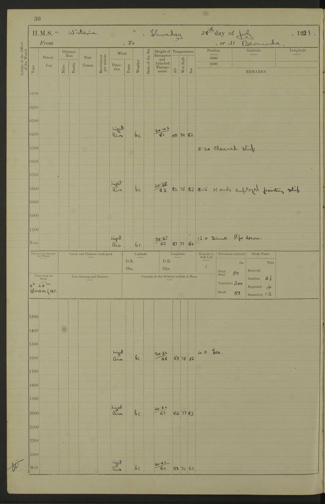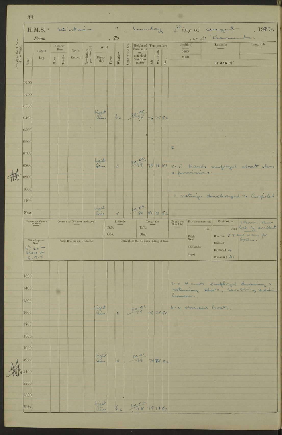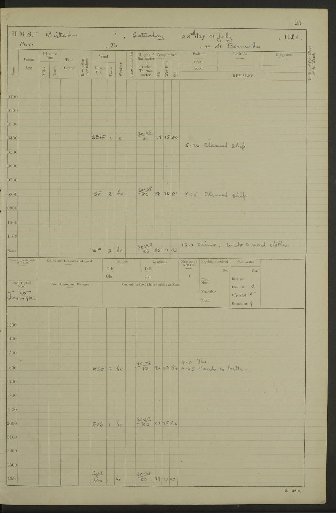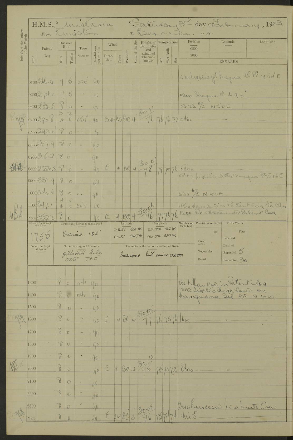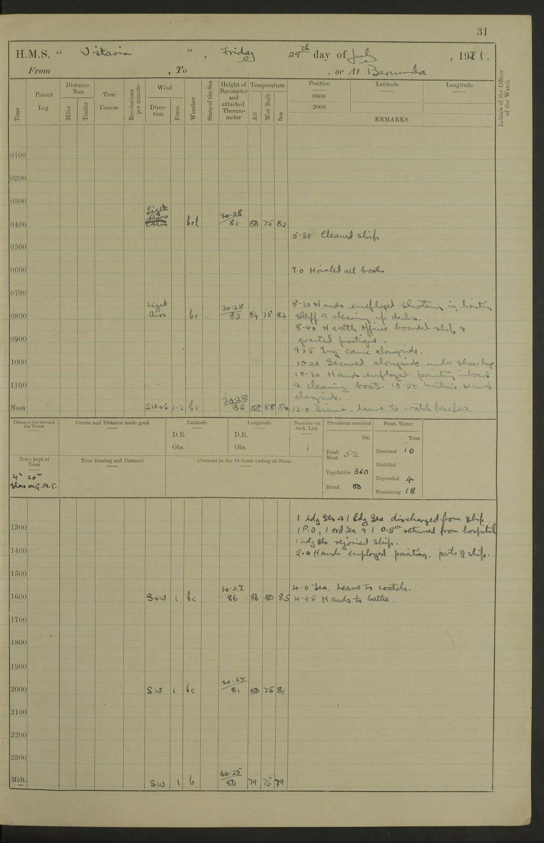 LOGS FOR JULY 1921 4f73ca38a2fc8ea903000a41: (https://s3.amazonaws.com:443/oldweather/ADM53-93262/0003_1.jpg) 1 July 1921 At Port Royal Lat 17.93, Long -76.83 8.15am: 1st whaler diving party. Clear up decks 9.30am: Ord. Seamen & boys muster bags. Remainder part of ship 1.45pm: Hands mustered for monthly payment 2.15pm: Diving party & side party employed. Rest part of ship 4f73ca38a2fc8ea903000a42: (https://s3.amazonaws.com:443/oldweather/ADM53-93262/0004_0.jpg) 2 July 1921 At Port Royal Lat 17.93, Long -76.83 8.15am: Cleaned ship 8.0pm: Concert party landed 8.45pm: Fire party landed 9.45pm: Fire party returned 10.40pm: Fire party landed 4f73ca39a2fc8ea903000a43: (https://s3.amazonaws.com:443/oldweather/ADM53-93262/0004_1.jpg) 3 July 1921 At Port Royal Lat 17.93, Long -76.83 6.30am: Cleaned ship 10.0am: Divisions Number on sick list: 2 4f73ca39a2fc8ea903000a44: (https://s3.amazonaws.com:443/oldweather/ADM53-93262/0005_0.jpg) 4 July 1921 At Port Royal Lat 17.93, Long -76.83 8.15am: Hands employed on boats & part of ship 2.0pm: Embarked 6” projectiles 10.30pm: Left harbour for Morant Cays. Course & speed as requisite 11.20pm: Dumped ammunition Number on sick list: 1 4f73ca39a2fc8ea903000a45: (https://s3.amazonaws.com:443/oldweather/ADM53-93262/0005_1.jpg) 5 July 1921 From Morant Cays-Port Royal to Port Royal-Morant Cays Lat 17.93, Long -76.83 6.20am: Sighted Morant Cays ahead 7.20am: Anchored and landed survey party am: Hands employed part of ship. Relief control parties exercised 10.40am: Weighed & proceeded 2.0pm: Hands employed chipping & painting boat deck & squaring off upper deck 3.10pm: Sighted Plum Point on Starboard bow 4.40pm: Stopped & manoeuvred as required for ship photograph to be taken 5.15pm: Secured alongside waling jetty. Leave to watch 4f73ca3aa2fc8ea903000a46: (https://s3.amazonaws.com:443/oldweather/ADM53-93262/0006_0.jpg) 6 July 1921 At Port Royal Lat 17.93, Long -76.83 9.25am: Hands employed parts of ship and six hands at small arm drill 2.0pm: Hands employed preparing ship for coaling 4.20pm: O.S. III Seabrook rejoined ship from hospital Number on sick list: 2 4f73ca3aa2fc8ea903000a47: (https://s3.amazonaws.com:443/oldweather/ADM53-93262/0006_1.jpg) 7 July 1921 At Port Royal Lat 17.93, Long -76.83 5.30am: Sanded decks 7.0am: Coaled ship with native labour 8.15am: Hands employed cleaning boats 11.20am: Finished coaling. Wash down & scrub upper deck Number on sick list: 4 4f73ca3aa2fc8ea903000a48: (https://s3.amazonaws.com:443/oldweather/ADM53-93262/0007_0.jpg) 8 July 1921 At Port Royal Lat 17.93, Long -76.83 8.15am: Hands employed cleaning paintwork & 3 hands about seine net 1.40pm: Starboard watch employed getting mine sweeping gear inboard 2.0pm: Port watch employed part of ship 3.0pm: Starboard watch employed part of ship 4.0pm: Tea. Ship put in quarantine 5.10pm: Surgeon McCallum left ship for military hospital Number on sick list: 1 [Surgeon McCallum: perhaps Surgeon Archie McCallum] 4f73ca3ba2fc8ea903000a49: (https://s3.amazonaws.com:443/oldweather/ADM53-93262/0007_1.jpg) 9 July 1921 At Port Royal Lat 17.93, Long -76.83 6.45am: Party left for isolation hospital to fumigate gear 11.50am: Air bedding 2.40pm: Bathing party landed 3.30pm: Bathing party returned 5.0pm: All hands vaccinated 4f73ca3ba2fc8ea903000a4a: (https://s3.amazonaws.com:443/oldweather/ADM53-93262/0008_0.jpg) 10 July 1921 At Port Royal Lat 17.93, Long -76.83 am: Parties sent to isolation hospital for fumigation 9.0am: Hands employed clearing mess decks & clearing up decks am: Parties sent for fumigation 1.0pm: All fumigation parties returned 5.15pm: Watch coaled picket boat Number on sick list: 1 4f73ca3ca2fc8ea903000a4b: (https://s3.amazonaws.com:443/oldweather/ADM53-93262/0008_1.jpg) 11 July 1921 From Port Royal to Bermuda and at Port Royal Lat 17.86, Long -76.63 8.15am: Furled forecastle awning 9.25am: Secured ship for sea 10.15am: Left Jetty 11.0am: Streamed patent log 11.01am: Plum Pt bearing N20E. Altered course S71E 3.15pm: Morant Pt bore N7W 3.30pm: Morant Pt bore N73W 6.45pm: Morant Pt bore S69W 9.35pm: Navassa Lt bearing S37E 10.32pm: Navassa Lt abeam 11.30pm: Navassa Lt bearing S24E True Bearing and Distance: Plum Pt Lt 294½°, 90 miles 4f73ca3ca2fc8ea903000a4c: (https://s3.amazonaws.com:443/oldweather/ADM53-93262/0009_0.jpg) 12 July 1921 From Port Royal to Bermuda Lat 20.18, Long -74.01 7.0am: Sighted Cuban mountains on Port bow 8.50am: Furled boat deck awning 9.35am: Exercised control parties, hands employed turning motor boats falls end for end, scarping & painting 2.0pm: Hands employed as forenoon 4.02pm: Sighted Great Inagua Lt Ho N48E 5.15pm: Course as required for re-charging telemotor system 5.38pm: Great Inagua Lt Ho abeam, 7 miles 6.30pm: N.W. Pt abeam, 1 mile True Bearing and Distance: Cape Maysi Lt Ho 299½°, 7¼ miles 4f73ca3ca2fc8ea903000a4d: (https://s3.amazonaws.com:443/oldweather/ADM53-93262/0009_1.jpg) 13 July 1921 From Port Royal to Bermuda Lat 23.13, Long -71.83 9.40am: Hands employed fitting new streaming light halliyards, scraping & cleaning part of ship 2.0pm: Hands employed scraping, painting & redleading parts of ship True Bearing and Distance: Gibbs Hill Lt Ho 034¼°, 672 miles 4f73ca3da2fc8ea903000a4e: (https://s3.amazonaws.com:443/oldweather/ADM53-93262/0010_0.jpg) 14 July 1921 From Port Royal to Bermuda Lat 25.91, Long -69.55 2.10am: Hauled in Patent log to clear it 2.15am: Log streamed 9.0am: Hauled in patent log 9.30am: Hands employed mustering bags & hammocks 2.0pm: Hands scrub hammocks 4.0pm: Evening Quarters. Exercised collision stations 5.0pm: Put clocks on 20 minutes True Bearing and Distance: Gibbs Hill Lt Ho 034°, 452 miles 4f73ca3da2fc8ea903000a4f: (https://s3.amazonaws.com:443/oldweather/ADM53-93262/0010_1.jpg) 15 July 1921 From Port Royal to Bermuda Lat 29.03, Long -67.18 9.40am: Exercised action stations. Fired one belt of ammunition from each pom pom 10.30am: Ord. Sea & boys to school. Pom Pom’s crews working about guns, remainders chip