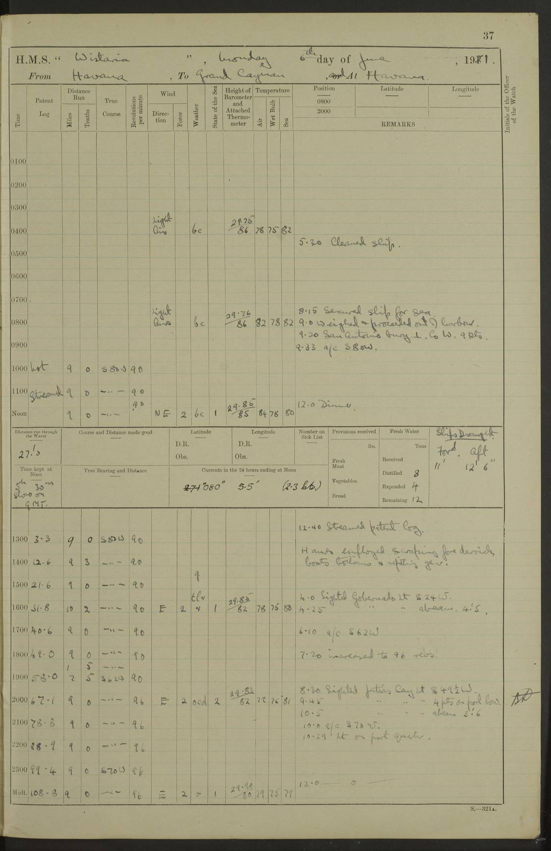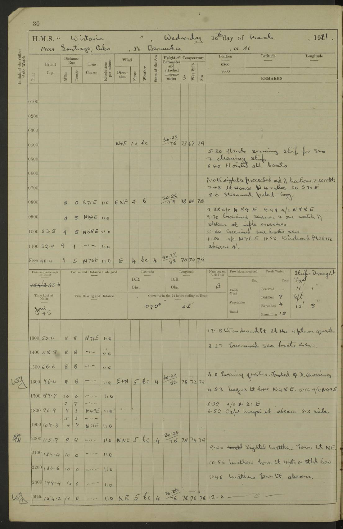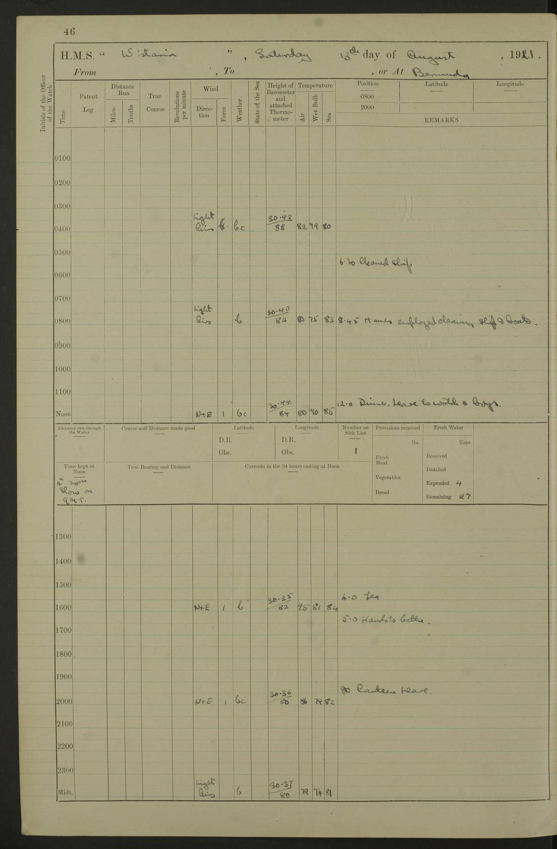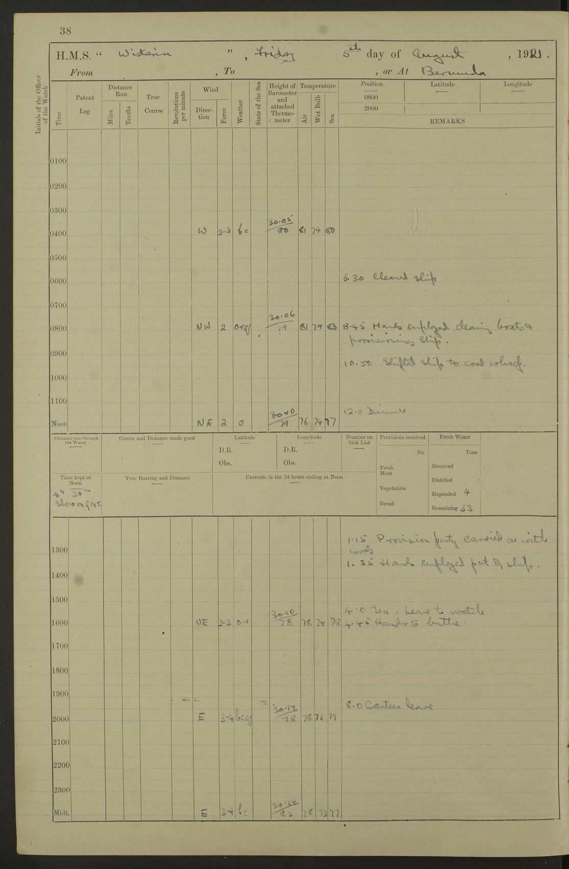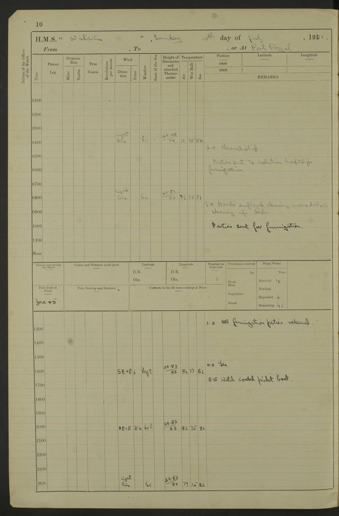 LOGS FOR JULY 1921 4f73ca38a2fc8ea903000a41: (https://s3.amazonaws.com:443/oldweather/ADM53-93262/0003_1.jpg) 1 July 1921 At Port Royal Lat 17.93, Long -76.83 8.15am: 1st whaler diving party. Clear up decks 9.30am: Ord. Seamen & boys muster bags. Remainder part of ship 1.45pm: Hands mustered for monthly payment 2.15pm: Diving party & side party employed. Rest part of ship 4f73ca38a2fc8ea903000a42: (https://s3.amazonaws.com:443/oldweather/ADM53-93262/0004_0.jpg) 2 July 1921 At Port Royal Lat 17.93, Long -76.83 8.15am: Cleaned ship 8.0pm: Concert party landed 8.45pm: Fire party landed 9.45pm: Fire party returned 10.40pm: Fire party landed 4f73ca39a2fc8ea903000a43: (https://s3.amazonaws.com:443/oldweather/ADM53-93262/0004_1.jpg) 3 July 1921 At Port Royal Lat 17.93, Long -76.83 6.30am: Cleaned ship 10.0am: Divisions Number on sick list: 2 4f73ca39a2fc8ea903000a44: (https://s3.amazonaws.com:443/oldweather/ADM53-93262/0005_0.jpg) 4 July 1921 At Port Royal Lat 17.93, Long -76.83 8.15am: Hands employed on boats & part of ship 2.0pm: Embarked 6” projectiles 10.30pm: Left harbour for Morant Cays. Course & speed as requisite 11.20pm: Dumped ammunition Number on sick list: 1 4f73ca39a2fc8ea903000a45: (https://s3.amazonaws.com:443/oldweather/ADM53-93262/0005_1.jpg) 5 July 1921 From Morant Cays-Port Royal to Port Royal-Morant Cays Lat 17.93, Long -76.83 6.20am: Sighted Morant Cays ahead 7.20am: Anchored and landed survey party am: Hands employed part of ship. Relief control parties exercised 10.40am: Weighed & proceeded 2.0pm: Hands employed chipping & painting boat deck & squaring off upper deck 3.10pm: Sighted Plum Point on Starboard bow 4.40pm: Stopped & manoeuvred as required for ship photograph to be taken 5.15pm: Secured alongside waling jetty. Leave to watch 4f73ca3aa2fc8ea903000a46: (https://s3.amazonaws.com:443/oldweather/ADM53-93262/0006_0.jpg) 6 July 1921 At Port Royal Lat 17.93, Long -76.83 9.25am: Hands employed parts of ship and six hands at small arm drill 2.0pm: Hands employed preparing ship for coaling 4.20pm: O.S. III Seabrook rejoined ship from hospital Number on sick list: 2 4f73ca3aa2fc8ea903000a47: (https://s3.amazonaws.com:443/oldweather/ADM53-93262/0006_1.jpg) 7 July 1921 At Port Royal Lat 17.93, Long -76.83 5.30am: Sanded decks 7.0am: Coaled ship with native labour 8.15am: Hands employed cleaning boats 11.20am: Finished coaling. Wash down & scrub upper deck Number on sick list: 4 4f73ca3aa2fc8ea903000a48: (https://s3.amazonaws.com:443/oldweather/ADM53-93262/0007_0.jpg) 8 July 1921 At Port Royal Lat 17.93, Long -76.83 8.15am: Hands employed cleaning paintwork & 3 hands about seine net 1.40pm: Starboard watch employed getting mine sweeping gear inboard 2.0pm: Port watch employed part of ship 3.0pm: Starboard watch employed part of ship 4.0pm: Tea. Ship put in quarantine 5.10pm: Surgeon McCallum left ship for military hospital Number on sick list: 1 [Surgeon McCallum: perhaps Surgeon Archie McCallum] 4f73ca3ba2fc8ea903000a49: (https://s3.amazonaws.com:443/oldweather/ADM53-93262/0007_1.jpg) 9 July 1921 At Port Royal Lat 17.93, Long -76.83 6.45am: Party left for isolation hospital to fumigate gear 11.50am: Air bedding 2.40pm: Bathing party landed 3.30pm: Bathing party returned 5.0pm: All hands vaccinated 4f73ca3ba2fc8ea903000a4a: (https://s3.amazonaws.com:443/oldweather/ADM53-93262/0008_0.jpg) 10 July 1921 At Port Royal Lat 17.93, Long -76.83 am: Parties sent to isolation hospital for fumigation 9.0am: Hands employed clearing mess decks & clearing up decks am: Parties sent for fumigation 1.0pm: All fumigation parties returned 5.15pm: Watch coaled picket boat Number on sick list: 1 4f73ca3ca2fc8ea903000a4b: (https://s3.amazonaws.com:443/oldweather/ADM53-93262/0008_1.jpg) 11 July 1921 From Port Royal to Bermuda and at Port Royal Lat 17.86, Long -76.63 8.15am: Furled forecastle awning 9.25am: Secured ship for sea 10.15am: Left Jetty 11.0am: Streamed patent log 11.01am: Plum Pt bearing N20E. Altered course S71E 3.15pm: Morant Pt bore N7W 3.30pm: Morant Pt bore N73W 6.45pm: Morant Pt bore S69W 9.35pm: Navassa Lt bearing S37E 10.32pm: Navassa Lt abeam 11.30pm: Navassa Lt bearing S24E True Bearing and Distance: Plum Pt Lt 294½°, 90 miles 4f73ca3ca2fc8ea903000a4c: (https://s3.amazonaws.com:443/oldweather/ADM53-93262/0009_0.jpg) 12 July 1921 From Port Royal to Bermuda Lat 20.18, Long -74.01 7.0am: Sighted Cuban mountains on Port bow 8.50am: Furled boat deck awning 9.35am: Exercised control parties, hands employed turning motor boats falls end for end, scarping & painting 2.0pm: Hands employed as forenoon 4.02pm: Sighted Great Inagua Lt Ho N48E 5.15pm: Course as required for re-charging telemotor system 5.38pm: Great Inagua Lt Ho abeam, 7 miles 6.30pm: N.W. Pt abeam, 1 mile True Bearing and Distance: Cape Maysi Lt Ho 299½°, 7¼ miles 4f73ca3ca2fc8ea903000a4d: (https://s3.amazonaws.com:443/oldweather/ADM53-93262/0009_1.jpg) 13 July 1921 From Port Royal to Bermuda Lat 23.13, Long -71.83 9.40am: Hands employed fitting new streaming light halliyards, scraping & cleaning part of ship 2.0pm: Hands employed scraping, painting & redleading parts of ship True Bearing and Distance: Gibbs Hill Lt Ho 034¼°, 672 miles 4f73ca3da2fc8ea903000a4e: (https://s3.amazonaws.com:443/oldweather/ADM53-93262/0010_0.jpg) 14 July 1921 From Port Royal to Bermuda Lat 25.91, Long -69.55 2.10am: Hauled in Patent log to clear it 2.15am: Log streamed 9.0am: Hauled in patent log 9.30am: Hands employed mustering bags & hammocks 2.0pm: Hands scrub hammocks 4.0pm: Evening Quarters. Exercised collision stations 5.0pm: Put clocks on 20 minutes True Bearing and Distance: Gibbs Hill Lt Ho 034°, 452 miles 4f73ca3da2fc8ea903000a4f: (https://s3.amazonaws.com:443/oldweather/ADM53-93262/0010_1.jpg) 15 July 1921 From Port Royal to Bermuda Lat 29.03, Long -67.18 9.40am: Exercised action stations. Fired one belt of ammunition from each pom pom 10.30am: Ord. Sea & boys to school. Pom Pom’s crews working about guns, remainders chip