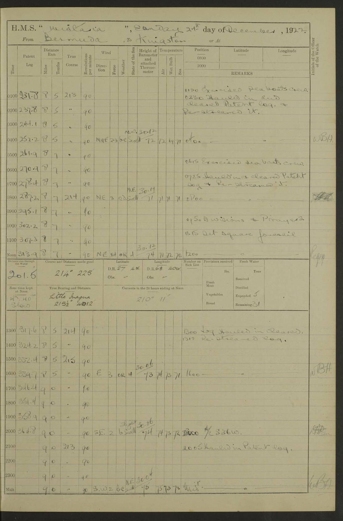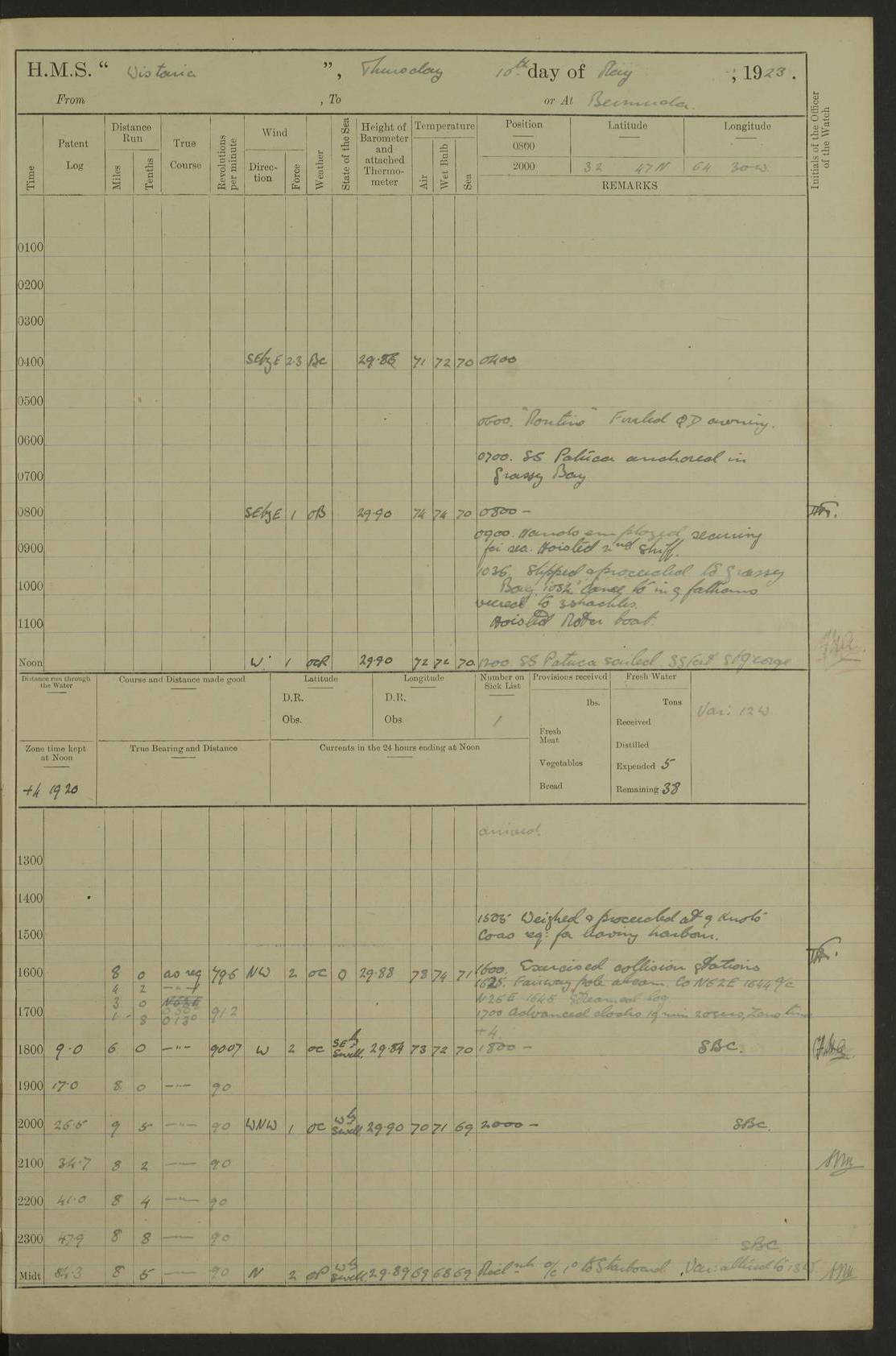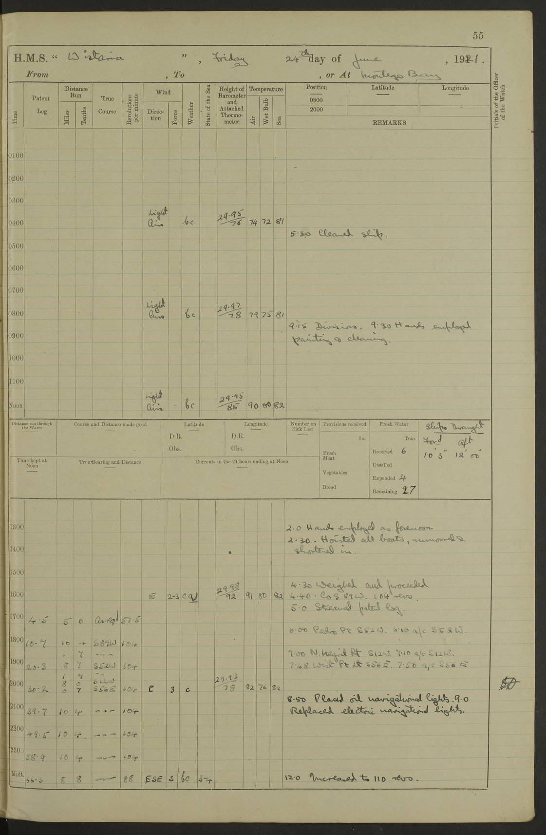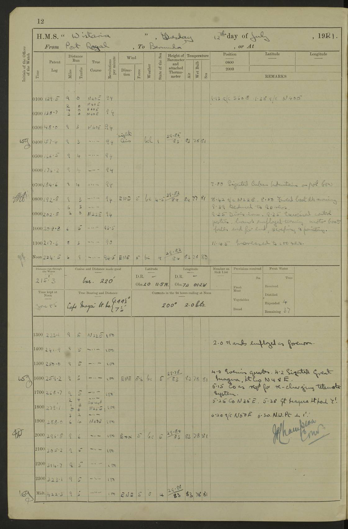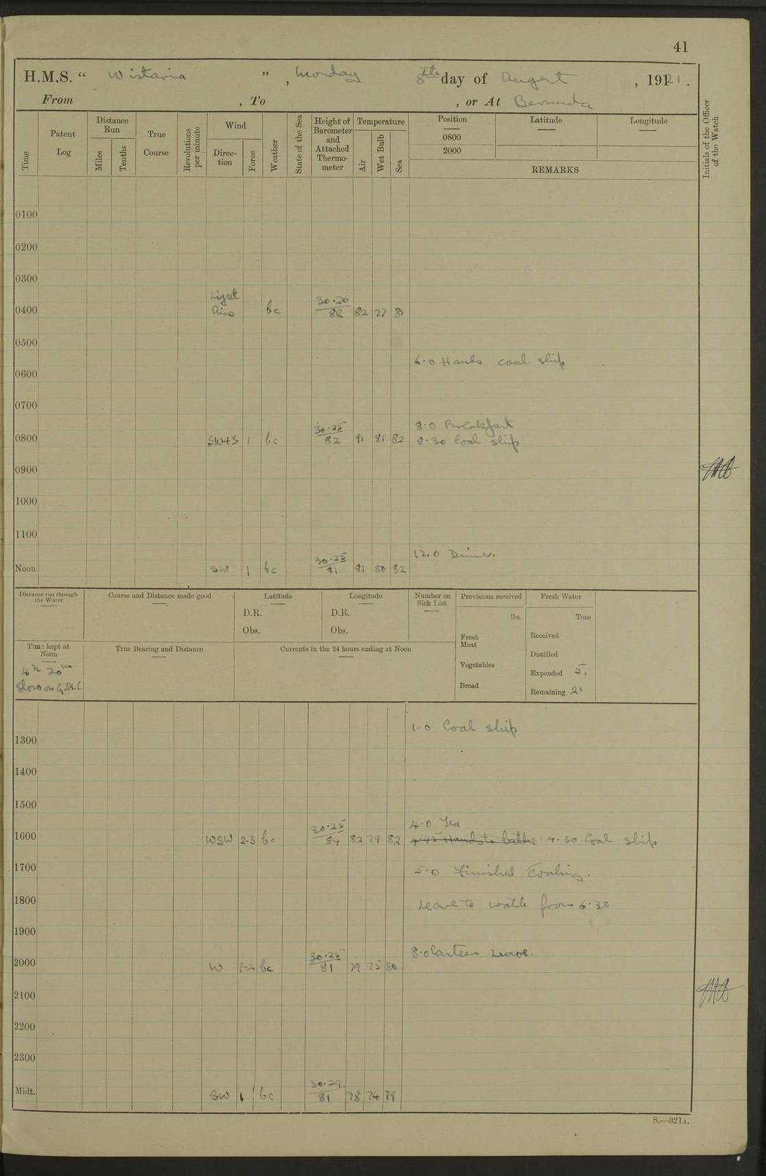 LOGS FOR JULY 1921 4f73ca38a2fc8ea903000a41: (https://s3.amazonaws.com:443/oldweather/ADM53-93262/0003_1.jpg) 1 July 1921 At Port Royal Lat 17.93, Long -76.83 8.15am: 1st whaler diving party. Clear up decks 9.30am: Ord. Seamen & boys muster bags. Remainder part of ship 1.45pm: Hands mustered for monthly payment 2.15pm: Diving party & side party employed. Rest part of ship 4f73ca38a2fc8ea903000a42: (https://s3.amazonaws.com:443/oldweather/ADM53-93262/0004_0.jpg) 2 July 1921 At Port Royal Lat 17.93, Long -76.83 8.15am: Cleaned ship 8.0pm: Concert party landed 8.45pm: Fire party landed 9.45pm: Fire party returned 10.40pm: Fire party landed 4f73ca39a2fc8ea903000a43: (https://s3.amazonaws.com:443/oldweather/ADM53-93262/0004_1.jpg) 3 July 1921 At Port Royal Lat 17.93, Long -76.83 6.30am: Cleaned ship 10.0am: Divisions Number on sick list: 2 4f73ca39a2fc8ea903000a44: (https://s3.amazonaws.com:443/oldweather/ADM53-93262/0005_0.jpg) 4 July 1921 At Port Royal Lat 17.93, Long -76.83 8.15am: Hands employed on boats & part of ship 2.0pm: Embarked 6” projectiles 10.30pm: Left harbour for Morant Cays. Course & speed as requisite 11.20pm: Dumped ammunition Number on sick list: 1 4f73ca39a2fc8ea903000a45: (https://s3.amazonaws.com:443/oldweather/ADM53-93262/0005_1.jpg) 5 July 1921 From Morant Cays-Port Royal to Port Royal-Morant Cays Lat 17.93, Long -76.83 6.20am: Sighted Morant Cays ahead 7.20am: Anchored and landed survey party am: Hands employed part of ship. Relief control parties exercised 10.40am: Weighed & proceeded 2.0pm: Hands employed chipping & painting boat deck & squaring off upper deck 3.10pm: Sighted Plum Point on Starboard bow 4.40pm: Stopped & manoeuvred as required for ship photograph to be taken 5.15pm: Secured alongside waling jetty. Leave to watch 4f73ca3aa2fc8ea903000a46: (https://s3.amazonaws.com:443/oldweather/ADM53-93262/0006_0.jpg) 6 July 1921 At Port Royal Lat 17.93, Long -76.83 9.25am: Hands employed parts of ship and six hands at small arm drill 2.0pm: Hands employed preparing ship for coaling 4.20pm: O.S. III Seabrook rejoined ship from hospital Number on sick list: 2 4f73ca3aa2fc8ea903000a47: (https://s3.amazonaws.com:443/oldweather/ADM53-93262/0006_1.jpg) 7 July 1921 At Port Royal Lat 17.93, Long -76.83 5.30am: Sanded decks 7.0am: Coaled ship with native labour 8.15am: Hands employed cleaning boats 11.20am: Finished coaling. Wash down & scrub upper deck Number on sick list: 4 4f73ca3aa2fc8ea903000a48: (https://s3.amazonaws.com:443/oldweather/ADM53-93262/0007_0.jpg) 8 July 1921 At Port Royal Lat 17.93, Long -76.83 8.15am: Hands employed cleaning paintwork & 3 hands about seine net 1.40pm: Starboard watch employed getting mine sweeping gear inboard 2.0pm: Port watch employed part of ship 3.0pm: Starboard watch employed part of ship 4.0pm: Tea. Ship put in quarantine 5.10pm: Surgeon McCallum left ship for military hospital Number on sick list: 1 [Surgeon McCallum: perhaps Surgeon Archie McCallum] 4f73ca3ba2fc8ea903000a49: (https://s3.amazonaws.com:443/oldweather/ADM53-93262/0007_1.jpg) 9 July 1921 At Port Royal Lat 17.93, Long -76.83 6.45am: Party left for isolation hospital to fumigate gear 11.50am: Air bedding 2.40pm: Bathing party landed 3.30pm: Bathing party returned 5.0pm: All hands vaccinated 4f73ca3ba2fc8ea903000a4a: (https://s3.amazonaws.com:443/oldweather/ADM53-93262/0008_0.jpg) 10 July 1921 At Port Royal Lat 17.93, Long -76.83 am: Parties sent to isolation hospital for fumigation 9.0am: Hands employed clearing mess decks & clearing up decks am: Parties sent for fumigation 1.0pm: All fumigation parties returned 5.15pm: Watch coaled picket boat Number on sick list: 1 4f73ca3ca2fc8ea903000a4b: (https://s3.amazonaws.com:443/oldweather/ADM53-93262/0008_1.jpg) 11 July 1921 From Port Royal to Bermuda and at Port Royal Lat 17.86, Long -76.63 8.15am: Furled forecastle awning 9.25am: Secured ship for sea 10.15am: Left Jetty 11.0am: Streamed patent log 11.01am: Plum Pt bearing N20E. Altered course S71E 3.15pm: Morant Pt bore N7W 3.30pm: Morant Pt bore N73W 6.45pm: Morant Pt bore S69W 9.35pm: Navassa Lt bearing S37E 10.32pm: Navassa Lt abeam 11.30pm: Navassa Lt bearing S24E True Bearing and Distance: Plum Pt Lt 294½°, 90 miles 4f73ca3ca2fc8ea903000a4c: (https://s3.amazonaws.com:443/oldweather/ADM53-93262/0009_0.jpg) 12 July 1921 From Port Royal to Bermuda Lat 20.18, Long -74.01 7.0am: Sighted Cuban mountains on Port bow 8.50am: Furled boat deck awning 9.35am: Exercised control parties, hands employed turning motor boats falls end for end, scarping & painting 2.0pm: Hands employed as forenoon 4.02pm: Sighted Great Inagua Lt Ho N48E 5.15pm: Course as required for re-charging telemotor system 5.38pm: Great Inagua Lt Ho abeam, 7 miles 6.30pm: N.W. Pt abeam, 1 mile True Bearing and Distance: Cape Maysi Lt Ho 299½°, 7¼ miles 4f73ca3ca2fc8ea903000a4d: (https://s3.amazonaws.com:443/oldweather/ADM53-93262/0009_1.jpg) 13 July 1921 From Port Royal to Bermuda Lat 23.13, Long -71.83 9.40am: Hands employed fitting new streaming light halliyards, scraping & cleaning part of ship 2.0pm: Hands employed scraping, painting & redleading parts of ship True Bearing and Distance: Gibbs Hill Lt Ho 034¼°, 672 miles 4f73ca3da2fc8ea903000a4e: (https://s3.amazonaws.com:443/oldweather/ADM53-93262/0010_0.jpg) 14 July 1921 From Port Royal to Bermuda Lat 25.91, Long -69.55 2.10am: Hauled in Patent log to clear it 2.15am: Log streamed 9.0am: Hauled in patent log 9.30am: Hands employed mustering bags & hammocks 2.0pm: Hands scrub hammocks 4.0pm: Evening Quarters. Exercised collision stations 5.0pm: Put clocks on 20 minutes True Bearing and Distance: Gibbs Hill Lt Ho 034°, 452 miles 4f73ca3da2fc8ea903000a4f: (https://s3.amazonaws.com:443/oldweather/ADM53-93262/0010_1.jpg) 15 July 1921 From Port Royal to Bermuda Lat 29.03, Long -67.18 9.40am: Exercised action stations. Fired one belt of ammunition from each pom pom 10.30am: Ord. Sea & boys to school. Pom Pom’s crews working about guns, remainders chip