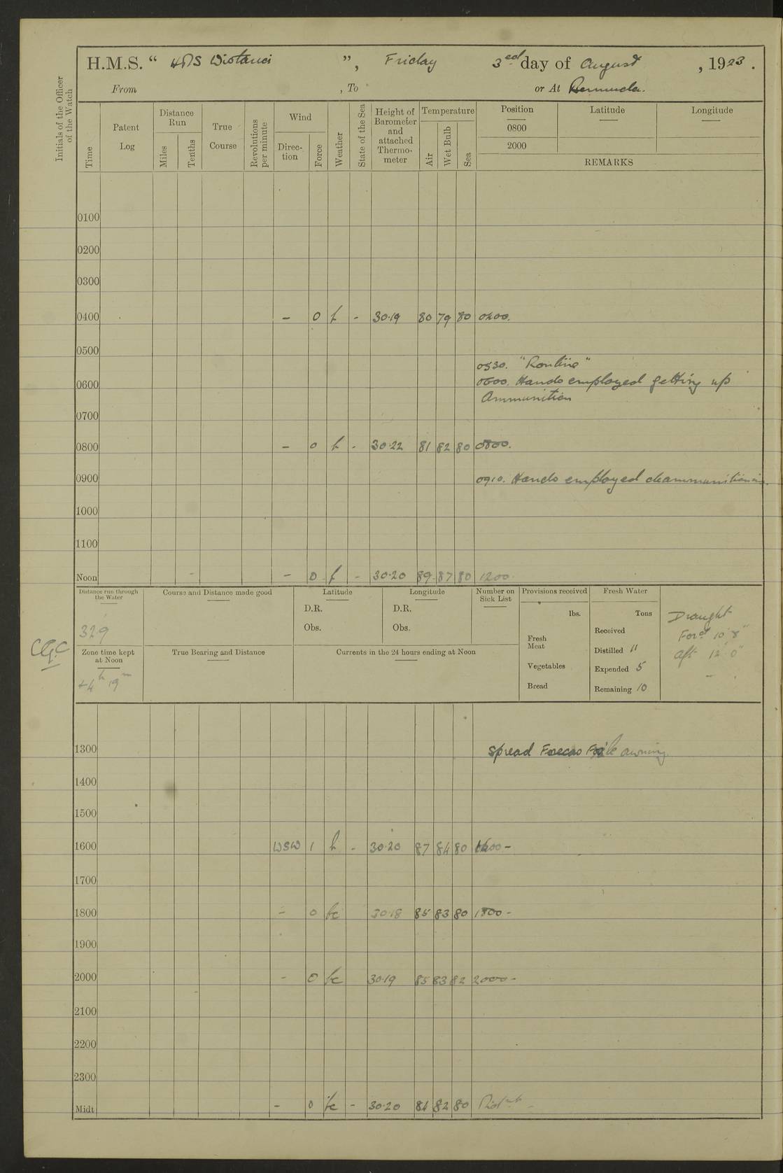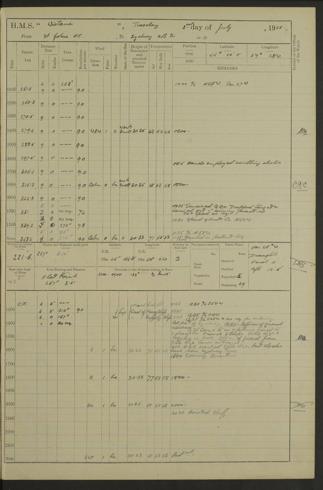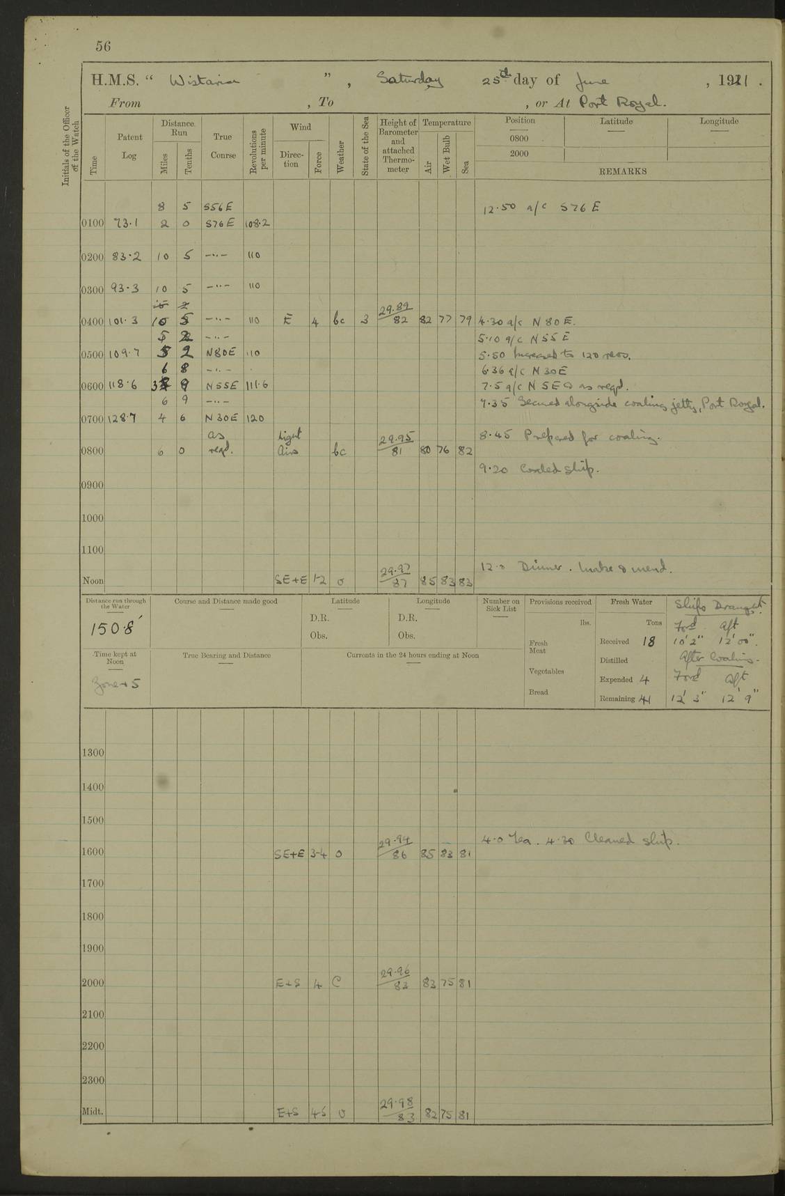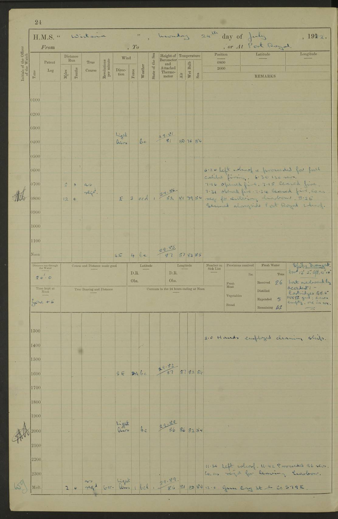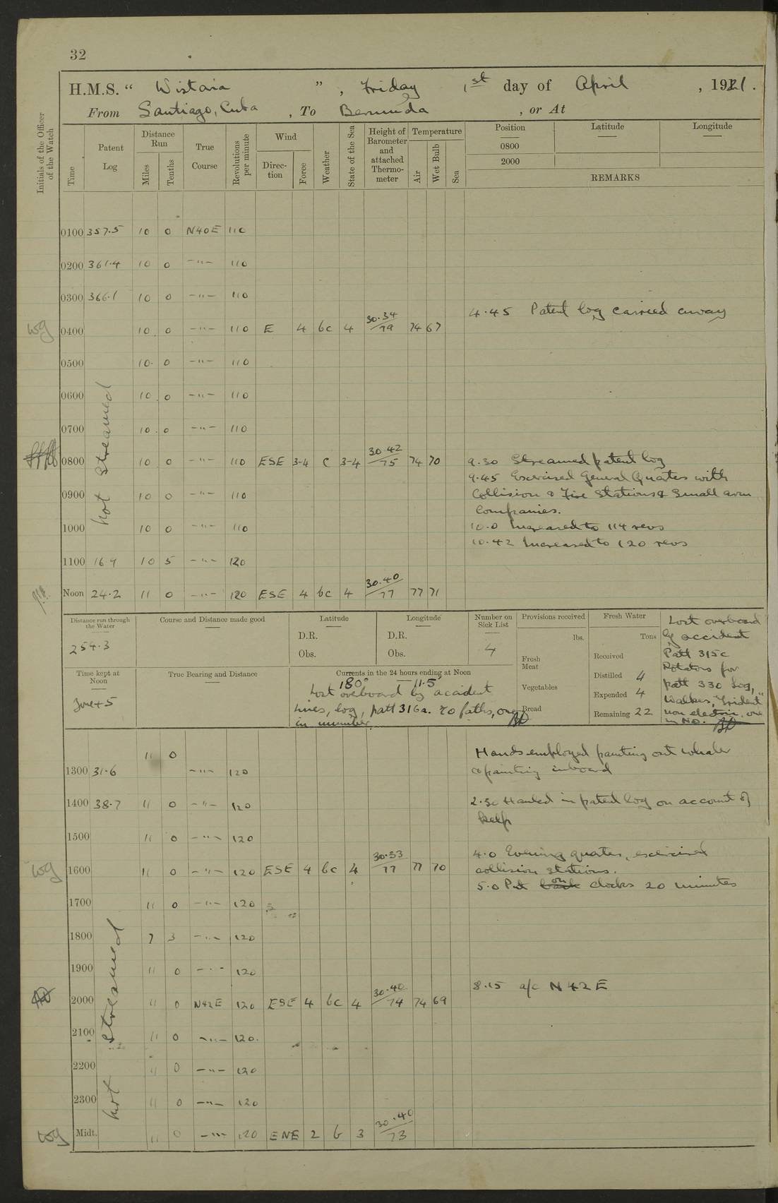 LOGS FOR JULY 1921 4f73ca38a2fc8ea903000a41: (https://s3.amazonaws.com:443/oldweather/ADM53-93262/0003_1.jpg) 1 July 1921 At Port Royal Lat 17.93, Long -76.83 8.15am: 1st whaler diving party. Clear up decks 9.30am: Ord. Seamen & boys muster bags. Remainder part of ship 1.45pm: Hands mustered for monthly payment 2.15pm: Diving party & side party employed. Rest part of ship 4f73ca38a2fc8ea903000a42: (https://s3.amazonaws.com:443/oldweather/ADM53-93262/0004_0.jpg) 2 July 1921 At Port Royal Lat 17.93, Long -76.83 8.15am: Cleaned ship 8.0pm: Concert party landed 8.45pm: Fire party landed 9.45pm: Fire party returned 10.40pm: Fire party landed 4f73ca39a2fc8ea903000a43: (https://s3.amazonaws.com:443/oldweather/ADM53-93262/0004_1.jpg) 3 July 1921 At Port Royal Lat 17.93, Long -76.83 6.30am: Cleaned ship 10.0am: Divisions Number on sick list: 2 4f73ca39a2fc8ea903000a44: (https://s3.amazonaws.com:443/oldweather/ADM53-93262/0005_0.jpg) 4 July 1921 At Port Royal Lat 17.93, Long -76.83 8.15am: Hands employed on boats & part of ship 2.0pm: Embarked 6” projectiles 10.30pm: Left harbour for Morant Cays. Course & speed as requisite 11.20pm: Dumped ammunition Number on sick list: 1 4f73ca39a2fc8ea903000a45: (https://s3.amazonaws.com:443/oldweather/ADM53-93262/0005_1.jpg) 5 July 1921 From Morant Cays-Port Royal to Port Royal-Morant Cays Lat 17.93, Long -76.83 6.20am: Sighted Morant Cays ahead 7.20am: Anchored and landed survey party am: Hands employed part of ship. Relief control parties exercised 10.40am: Weighed & proceeded 2.0pm: Hands employed chipping & painting boat deck & squaring off upper deck 3.10pm: Sighted Plum Point on Starboard bow 4.40pm: Stopped & manoeuvred as required for ship photograph to be taken 5.15pm: Secured alongside waling jetty. Leave to watch 4f73ca3aa2fc8ea903000a46: (https://s3.amazonaws.com:443/oldweather/ADM53-93262/0006_0.jpg) 6 July 1921 At Port Royal Lat 17.93, Long -76.83 9.25am: Hands employed parts of ship and six hands at small arm drill 2.0pm: Hands employed preparing ship for coaling 4.20pm: O.S. III Seabrook rejoined ship from hospital Number on sick list: 2 4f73ca3aa2fc8ea903000a47: (https://s3.amazonaws.com:443/oldweather/ADM53-93262/0006_1.jpg) 7 July 1921 At Port Royal Lat 17.93, Long -76.83 5.30am: Sanded decks 7.0am: Coaled ship with native labour 8.15am: Hands employed cleaning boats 11.20am: Finished coaling. Wash down & scrub upper deck Number on sick list: 4 4f73ca3aa2fc8ea903000a48: (https://s3.amazonaws.com:443/oldweather/ADM53-93262/0007_0.jpg) 8 July 1921 At Port Royal Lat 17.93, Long -76.83 8.15am: Hands employed cleaning paintwork & 3 hands about seine net 1.40pm: Starboard watch employed getting mine sweeping gear inboard 2.0pm: Port watch employed part of ship 3.0pm: Starboard watch employed part of ship 4.0pm: Tea. Ship put in quarantine 5.10pm: Surgeon McCallum left ship for military hospital Number on sick list: 1 [Surgeon McCallum: perhaps Surgeon Archie McCallum] 4f73ca3ba2fc8ea903000a49: (https://s3.amazonaws.com:443/oldweather/ADM53-93262/0007_1.jpg) 9 July 1921 At Port Royal Lat 17.93, Long -76.83 6.45am: Party left for isolation hospital to fumigate gear 11.50am: Air bedding 2.40pm: Bathing party landed 3.30pm: Bathing party returned 5.0pm: All hands vaccinated 4f73ca3ba2fc8ea903000a4a: (https://s3.amazonaws.com:443/oldweather/ADM53-93262/0008_0.jpg) 10 July 1921 At Port Royal Lat 17.93, Long -76.83 am: Parties sent to isolation hospital for fumigation 9.0am: Hands employed clearing mess decks & clearing up decks am: Parties sent for fumigation 1.0pm: All fumigation parties returned 5.15pm: Watch coaled picket boat Number on sick list: 1 4f73ca3ca2fc8ea903000a4b: (https://s3.amazonaws.com:443/oldweather/ADM53-93262/0008_1.jpg) 11 July 1921 From Port Royal to Bermuda and at Port Royal Lat 17.86, Long -76.63 8.15am: Furled forecastle awning 9.25am: Secured ship for sea 10.15am: Left Jetty 11.0am: Streamed patent log 11.01am: Plum Pt bearing N20E. Altered course S71E 3.15pm: Morant Pt bore N7W 3.30pm: Morant Pt bore N73W 6.45pm: Morant Pt bore S69W 9.35pm: Navassa Lt bearing S37E 10.32pm: Navassa Lt abeam 11.30pm: Navassa Lt bearing S24E True Bearing and Distance: Plum Pt Lt 294½°, 90 miles 4f73ca3ca2fc8ea903000a4c: (https://s3.amazonaws.com:443/oldweather/ADM53-93262/0009_0.jpg) 12 July 1921 From Port Royal to Bermuda Lat 20.18, Long -74.01 7.0am: Sighted Cuban mountains on Port bow 8.50am: Furled boat deck awning 9.35am: Exercised control parties, hands employed turning motor boats falls end for end, scarping & painting 2.0pm: Hands employed as forenoon 4.02pm: Sighted Great Inagua Lt Ho N48E 5.15pm: Course as required for re-charging telemotor system 5.38pm: Great Inagua Lt Ho abeam, 7 miles 6.30pm: N.W. Pt abeam, 1 mile True Bearing and Distance: Cape Maysi Lt Ho 299½°, 7¼ miles 4f73ca3ca2fc8ea903000a4d: (https://s3.amazonaws.com:443/oldweather/ADM53-93262/0009_1.jpg) 13 July 1921 From Port Royal to Bermuda Lat 23.13, Long -71.83 9.40am: Hands employed fitting new streaming light halliyards, scraping & cleaning part of ship 2.0pm: Hands employed scraping, painting & redleading parts of ship True Bearing and Distance: Gibbs Hill Lt Ho 034¼°, 672 miles 4f73ca3da2fc8ea903000a4e: (https://s3.amazonaws.com:443/oldweather/ADM53-93262/0010_0.jpg) 14 July 1921 From Port Royal to Bermuda Lat 25.91, Long -69.55 2.10am: Hauled in Patent log to clear it 2.15am: Log streamed 9.0am: Hauled in patent log 9.30am: Hands employed mustering bags & hammocks 2.0pm: Hands scrub hammocks 4.0pm: Evening Quarters. Exercised collision stations 5.0pm: Put clocks on 20 minutes True Bearing and Distance: Gibbs Hill Lt Ho 034°, 452 miles 4f73ca3da2fc8ea903000a4f: (https://s3.amazonaws.com:443/oldweather/ADM53-93262/0010_1.jpg) 15 July 1921 From Port Royal to Bermuda Lat 29.03, Long -67.18 9.40am: Exercised action stations. Fired one belt of ammunition from each pom pom 10.30am: Ord. Sea & boys to school. Pom Pom’s crews working about guns, remainders chip