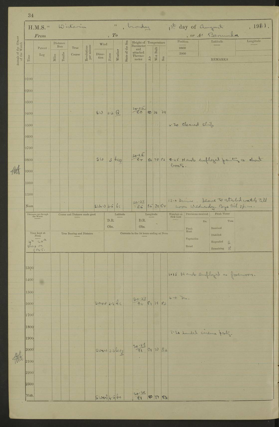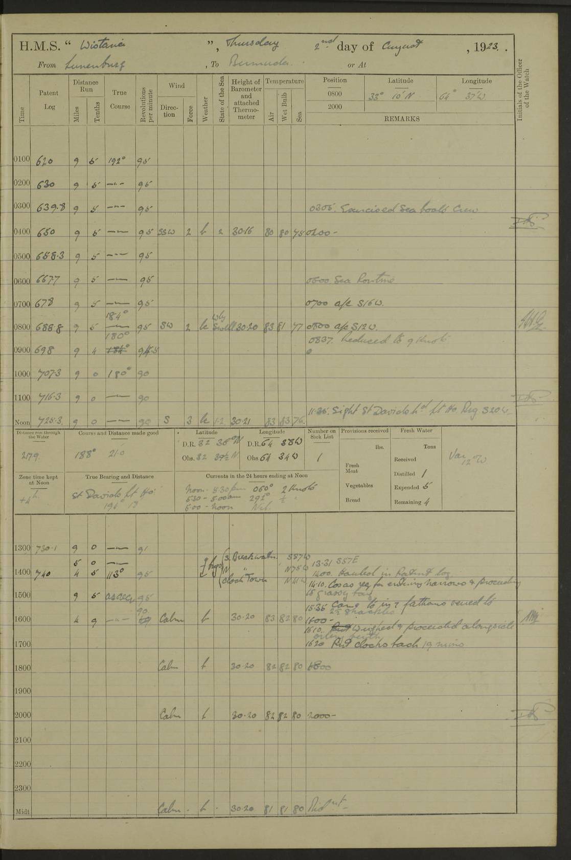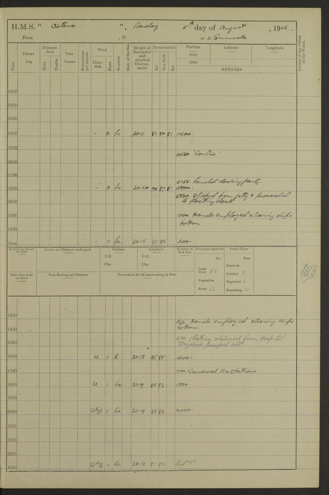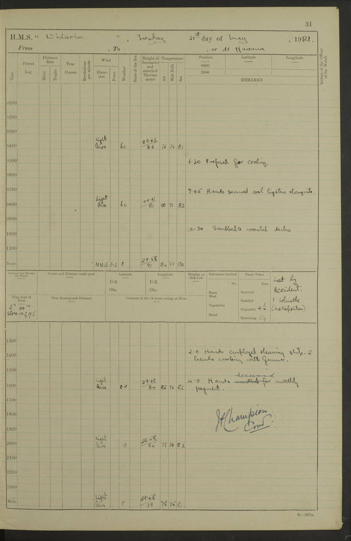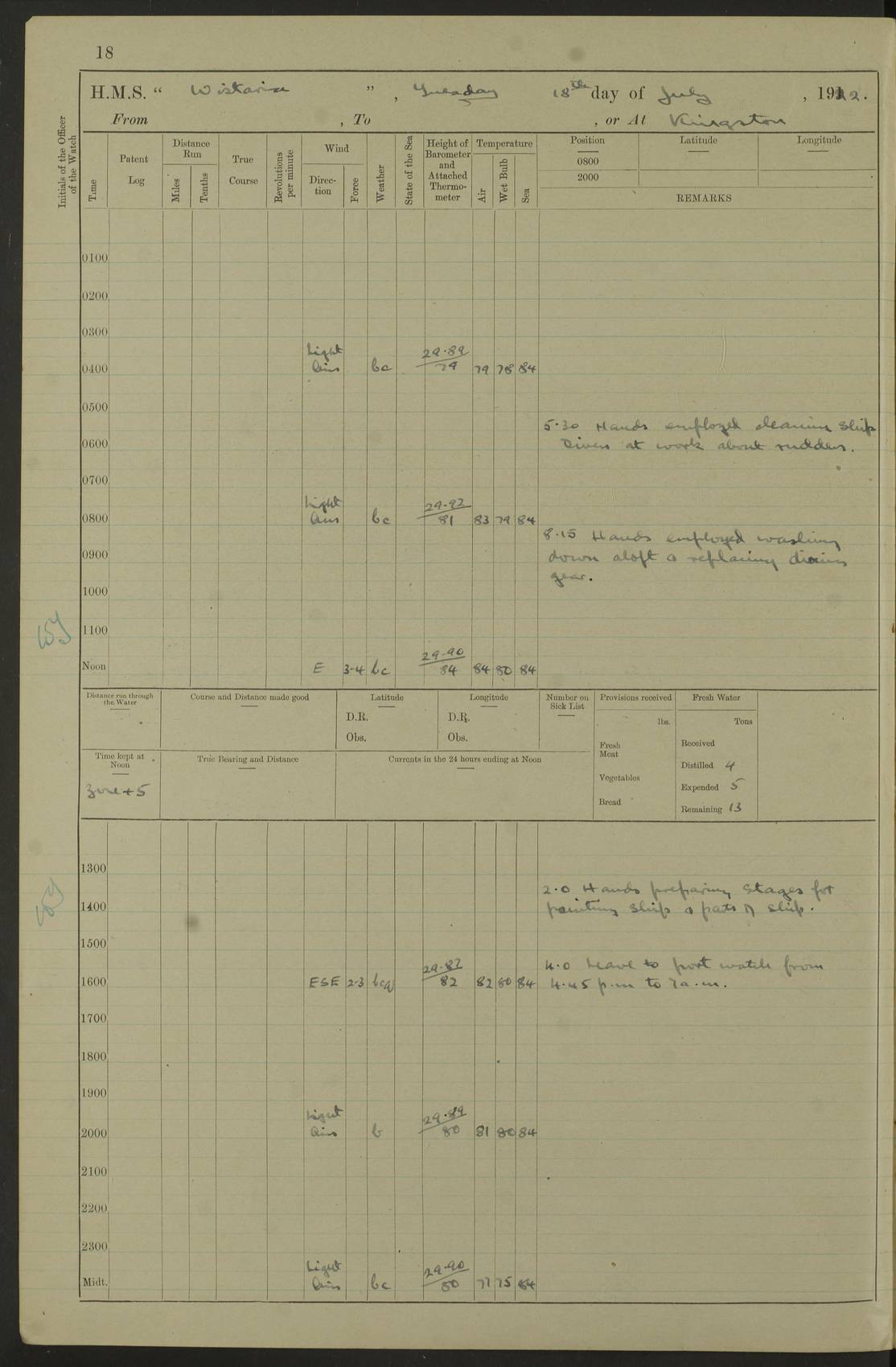 LOGS FOR JULY 1921 4f73ca38a2fc8ea903000a41: (https://s3.amazonaws.com:443/oldweather/ADM53-93262/0003_1.jpg) 1 July 1921 At Port Royal Lat 17.93, Long -76.83 8.15am: 1st whaler diving party. Clear up decks 9.30am: Ord. Seamen & boys muster bags. Remainder part of ship 1.45pm: Hands mustered for monthly payment 2.15pm: Diving party & side party employed. Rest part of ship 4f73ca38a2fc8ea903000a42: (https://s3.amazonaws.com:443/oldweather/ADM53-93262/0004_0.jpg) 2 July 1921 At Port Royal Lat 17.93, Long -76.83 8.15am: Cleaned ship 8.0pm: Concert party landed 8.45pm: Fire party landed 9.45pm: Fire party returned 10.40pm: Fire party landed 4f73ca39a2fc8ea903000a43: (https://s3.amazonaws.com:443/oldweather/ADM53-93262/0004_1.jpg) 3 July 1921 At Port Royal Lat 17.93, Long -76.83 6.30am: Cleaned ship 10.0am: Divisions Number on sick list: 2 4f73ca39a2fc8ea903000a44: (https://s3.amazonaws.com:443/oldweather/ADM53-93262/0005_0.jpg) 4 July 1921 At Port Royal Lat 17.93, Long -76.83 8.15am: Hands employed on boats & part of ship 2.0pm: Embarked 6” projectiles 10.30pm: Left harbour for Morant Cays. Course & speed as requisite 11.20pm: Dumped ammunition Number on sick list: 1 4f73ca39a2fc8ea903000a45: (https://s3.amazonaws.com:443/oldweather/ADM53-93262/0005_1.jpg) 5 July 1921 From Morant Cays-Port Royal to Port Royal-Morant Cays Lat 17.93, Long -76.83 6.20am: Sighted Morant Cays ahead 7.20am: Anchored and landed survey party am: Hands employed part of ship. Relief control parties exercised 10.40am: Weighed & proceeded 2.0pm: Hands employed chipping & painting boat deck & squaring off upper deck 3.10pm: Sighted Plum Point on Starboard bow 4.40pm: Stopped & manoeuvred as required for ship photograph to be taken 5.15pm: Secured alongside waling jetty. Leave to watch 4f73ca3aa2fc8ea903000a46: (https://s3.amazonaws.com:443/oldweather/ADM53-93262/0006_0.jpg) 6 July 1921 At Port Royal Lat 17.93, Long -76.83 9.25am: Hands employed parts of ship and six hands at small arm drill 2.0pm: Hands employed preparing ship for coaling 4.20pm: O.S. III Seabrook rejoined ship from hospital Number on sick list: 2 4f73ca3aa2fc8ea903000a47: (https://s3.amazonaws.com:443/oldweather/ADM53-93262/0006_1.jpg) 7 July 1921 At Port Royal Lat 17.93, Long -76.83 5.30am: Sanded decks 7.0am: Coaled ship with native labour 8.15am: Hands employed cleaning boats 11.20am: Finished coaling. Wash down & scrub upper deck Number on sick list: 4 4f73ca3aa2fc8ea903000a48: (https://s3.amazonaws.com:443/oldweather/ADM53-93262/0007_0.jpg) 8 July 1921 At Port Royal Lat 17.93, Long -76.83 8.15am: Hands employed cleaning paintwork & 3 hands about seine net 1.40pm: Starboard watch employed getting mine sweeping gear inboard 2.0pm: Port watch employed part of ship 3.0pm: Starboard watch employed part of ship 4.0pm: Tea. Ship put in quarantine 5.10pm: Surgeon McCallum left ship for military hospital Number on sick list: 1 [Surgeon McCallum: perhaps Surgeon Archie McCallum] 4f73ca3ba2fc8ea903000a49: (https://s3.amazonaws.com:443/oldweather/ADM53-93262/0007_1.jpg) 9 July 1921 At Port Royal Lat 17.93, Long -76.83 6.45am: Party left for isolation hospital to fumigate gear 11.50am: Air bedding 2.40pm: Bathing party landed 3.30pm: Bathing party returned 5.0pm: All hands vaccinated 4f73ca3ba2fc8ea903000a4a: (https://s3.amazonaws.com:443/oldweather/ADM53-93262/0008_0.jpg) 10 July 1921 At Port Royal Lat 17.93, Long -76.83 am: Parties sent to isolation hospital for fumigation 9.0am: Hands employed clearing mess decks & clearing up decks am: Parties sent for fumigation 1.0pm: All fumigation parties returned 5.15pm: Watch coaled picket boat Number on sick list: 1 4f73ca3ca2fc8ea903000a4b: (https://s3.amazonaws.com:443/oldweather/ADM53-93262/0008_1.jpg) 11 July 1921 From Port Royal to Bermuda and at Port Royal Lat 17.86, Long -76.63 8.15am: Furled forecastle awning 9.25am: Secured ship for sea 10.15am: Left Jetty 11.0am: Streamed patent log 11.01am: Plum Pt bearing N20E. Altered course S71E 3.15pm: Morant Pt bore N7W 3.30pm: Morant Pt bore N73W 6.45pm: Morant Pt bore S69W 9.35pm: Navassa Lt bearing S37E 10.32pm: Navassa Lt abeam 11.30pm: Navassa Lt bearing S24E True Bearing and Distance: Plum Pt Lt 294½°, 90 miles 4f73ca3ca2fc8ea903000a4c: (https://s3.amazonaws.com:443/oldweather/ADM53-93262/0009_0.jpg) 12 July 1921 From Port Royal to Bermuda Lat 20.18, Long -74.01 7.0am: Sighted Cuban mountains on Port bow 8.50am: Furled boat deck awning 9.35am: Exercised control parties, hands employed turning motor boats falls end for end, scarping & painting 2.0pm: Hands employed as forenoon 4.02pm: Sighted Great Inagua Lt Ho N48E 5.15pm: Course as required for re-charging telemotor system 5.38pm: Great Inagua Lt Ho abeam, 7 miles 6.30pm: N.W. Pt abeam, 1 mile True Bearing and Distance: Cape Maysi Lt Ho 299½°, 7¼ miles 4f73ca3ca2fc8ea903000a4d: (https://s3.amazonaws.com:443/oldweather/ADM53-93262/0009_1.jpg) 13 July 1921 From Port Royal to Bermuda Lat 23.13, Long -71.83 9.40am: Hands employed fitting new streaming light halliyards, scraping & cleaning part of ship 2.0pm: Hands employed scraping, painting & redleading parts of ship True Bearing and Distance: Gibbs Hill Lt Ho 034¼°, 672 miles 4f73ca3da2fc8ea903000a4e: (https://s3.amazonaws.com:443/oldweather/ADM53-93262/0010_0.jpg) 14 July 1921 From Port Royal to Bermuda Lat 25.91, Long -69.55 2.10am: Hauled in Patent log to clear it 2.15am: Log streamed 9.0am: Hauled in patent log 9.30am: Hands employed mustering bags & hammocks 2.0pm: Hands scrub hammocks 4.0pm: Evening Quarters. Exercised collision stations 5.0pm: Put clocks on 20 minutes True Bearing and Distance: Gibbs Hill Lt Ho 034°, 452 miles 4f73ca3da2fc8ea903000a4f: (https://s3.amazonaws.com:443/oldweather/ADM53-93262/0010_1.jpg) 15 July 1921 From Port Royal to Bermuda Lat 29.03, Long -67.18 9.40am: Exercised action stations. Fired one belt of ammunition from each pom pom 10.30am: Ord. Sea & boys to school. Pom Pom’s crews working about guns, remainders chip