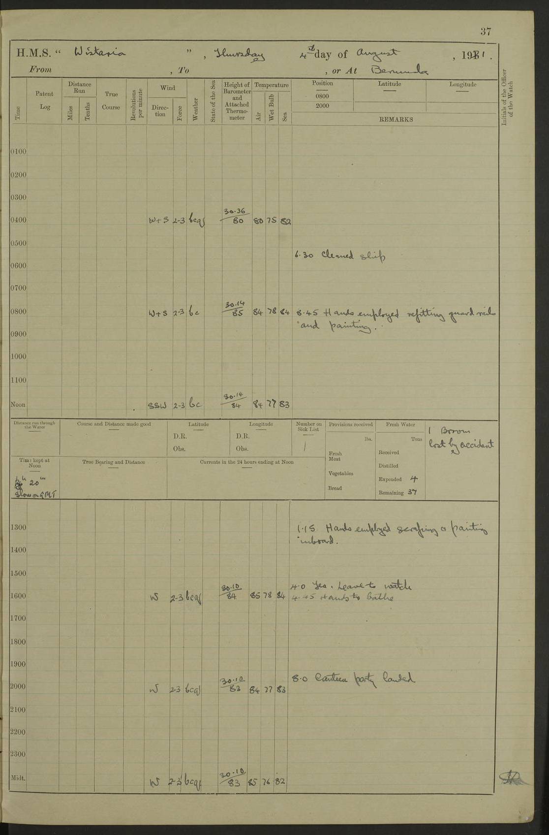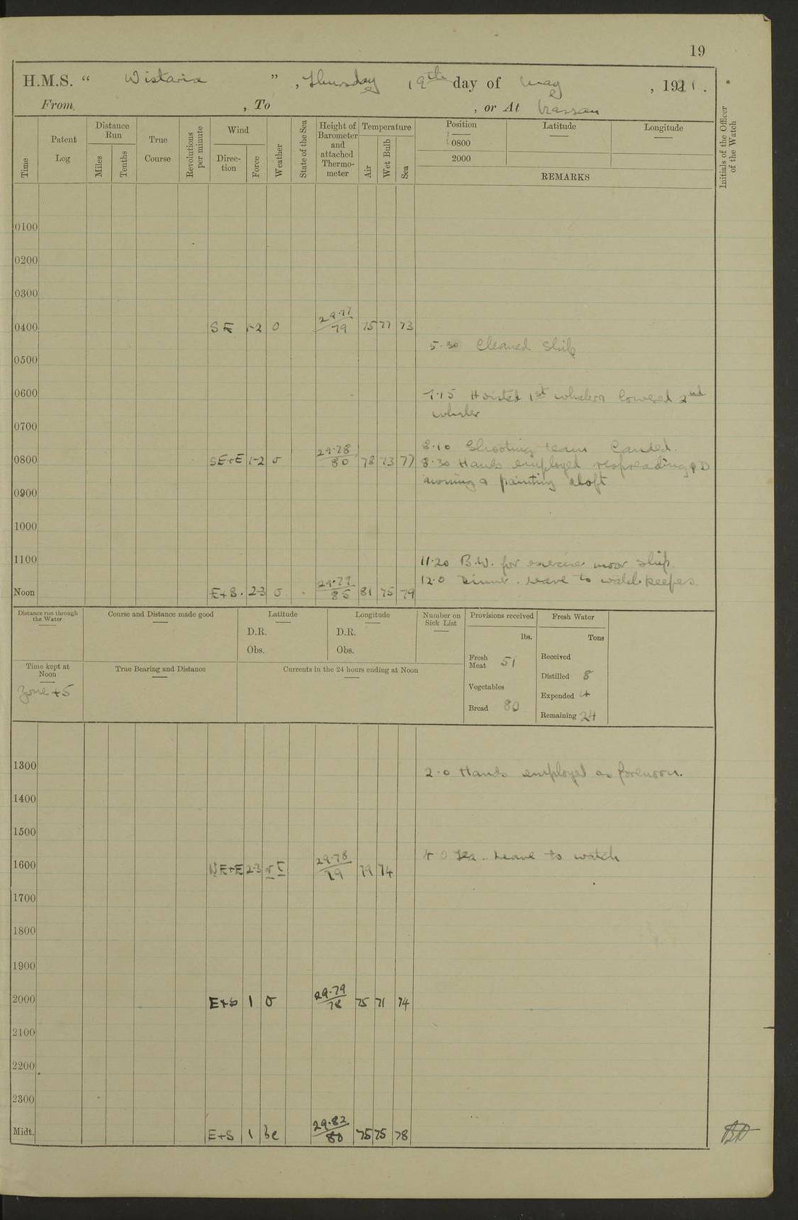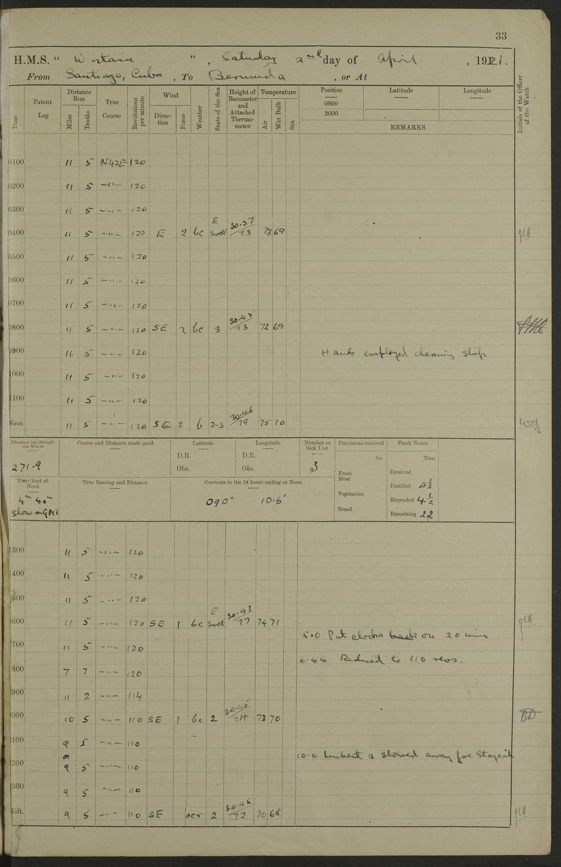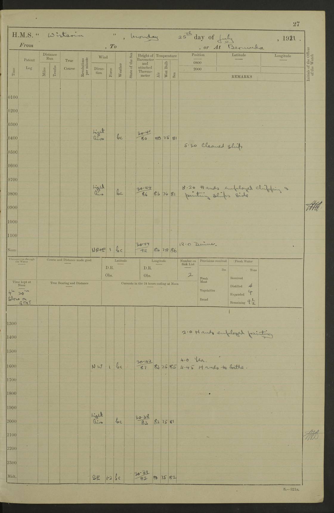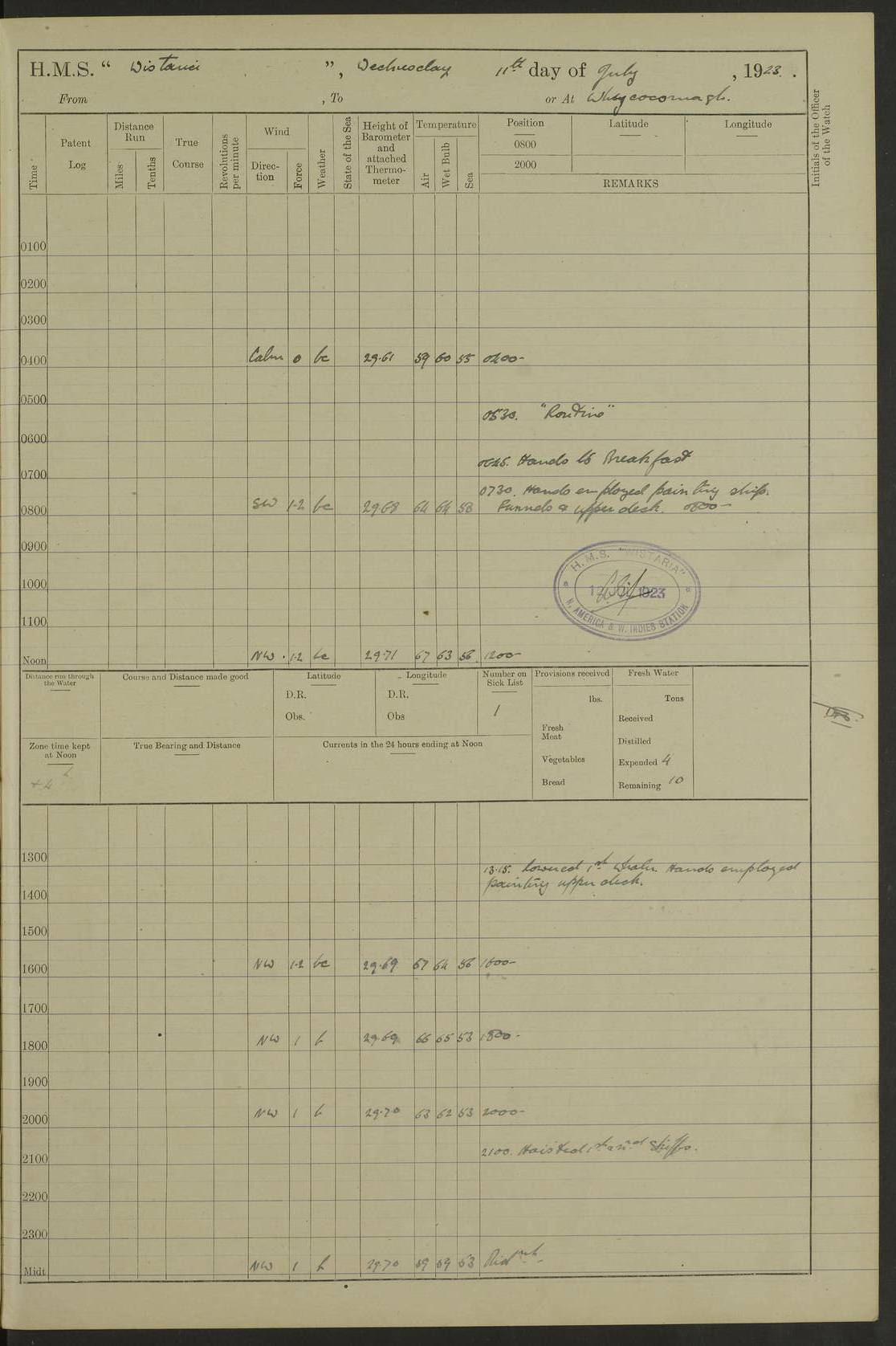 LOGS FOR JULY 1921 4f73ca38a2fc8ea903000a41: (https://s3.amazonaws.com:443/oldweather/ADM53-93262/0003_1.jpg) 1 July 1921 At Port Royal Lat 17.93, Long -76.83 8.15am: 1st whaler diving party. Clear up decks 9.30am: Ord. Seamen & boys muster bags. Remainder part of ship 1.45pm: Hands mustered for monthly payment 2.15pm: Diving party & side party employed. Rest part of ship 4f73ca38a2fc8ea903000a42: (https://s3.amazonaws.com:443/oldweather/ADM53-93262/0004_0.jpg) 2 July 1921 At Port Royal Lat 17.93, Long -76.83 8.15am: Cleaned ship 8.0pm: Concert party landed 8.45pm: Fire party landed 9.45pm: Fire party returned 10.40pm: Fire party landed 4f73ca39a2fc8ea903000a43: (https://s3.amazonaws.com:443/oldweather/ADM53-93262/0004_1.jpg) 3 July 1921 At Port Royal Lat 17.93, Long -76.83 6.30am: Cleaned ship 10.0am: Divisions Number on sick list: 2 4f73ca39a2fc8ea903000a44: (https://s3.amazonaws.com:443/oldweather/ADM53-93262/0005_0.jpg) 4 July 1921 At Port Royal Lat 17.93, Long -76.83 8.15am: Hands employed on boats & part of ship 2.0pm: Embarked 6” projectiles 10.30pm: Left harbour for Morant Cays. Course & speed as requisite 11.20pm: Dumped ammunition Number on sick list: 1 4f73ca39a2fc8ea903000a45: (https://s3.amazonaws.com:443/oldweather/ADM53-93262/0005_1.jpg) 5 July 1921 From Morant Cays-Port Royal to Port Royal-Morant Cays Lat 17.93, Long -76.83 6.20am: Sighted Morant Cays ahead 7.20am: Anchored and landed survey party am: Hands employed part of ship. Relief control parties exercised 10.40am: Weighed & proceeded 2.0pm: Hands employed chipping & painting boat deck & squaring off upper deck 3.10pm: Sighted Plum Point on Starboard bow 4.40pm: Stopped & manoeuvred as required for ship photograph to be taken 5.15pm: Secured alongside waling jetty. Leave to watch 4f73ca3aa2fc8ea903000a46: (https://s3.amazonaws.com:443/oldweather/ADM53-93262/0006_0.jpg) 6 July 1921 At Port Royal Lat 17.93, Long -76.83 9.25am: Hands employed parts of ship and six hands at small arm drill 2.0pm: Hands employed preparing ship for coaling 4.20pm: O.S. III Seabrook rejoined ship from hospital Number on sick list: 2 4f73ca3aa2fc8ea903000a47: (https://s3.amazonaws.com:443/oldweather/ADM53-93262/0006_1.jpg) 7 July 1921 At Port Royal Lat 17.93, Long -76.83 5.30am: Sanded decks 7.0am: Coaled ship with native labour 8.15am: Hands employed cleaning boats 11.20am: Finished coaling. Wash down & scrub upper deck Number on sick list: 4 4f73ca3aa2fc8ea903000a48: (https://s3.amazonaws.com:443/oldweather/ADM53-93262/0007_0.jpg) 8 July 1921 At Port Royal Lat 17.93, Long -76.83 8.15am: Hands employed cleaning paintwork & 3 hands about seine net 1.40pm: Starboard watch employed getting mine sweeping gear inboard 2.0pm: Port watch employed part of ship 3.0pm: Starboard watch employed part of ship 4.0pm: Tea. Ship put in quarantine 5.10pm: Surgeon McCallum left ship for military hospital Number on sick list: 1 [Surgeon McCallum: perhaps Surgeon Archie McCallum] 4f73ca3ba2fc8ea903000a49: (https://s3.amazonaws.com:443/oldweather/ADM53-93262/0007_1.jpg) 9 July 1921 At Port Royal Lat 17.93, Long -76.83 6.45am: Party left for isolation hospital to fumigate gear 11.50am: Air bedding 2.40pm: Bathing party landed 3.30pm: Bathing party returned 5.0pm: All hands vaccinated 4f73ca3ba2fc8ea903000a4a: (https://s3.amazonaws.com:443/oldweather/ADM53-93262/0008_0.jpg) 10 July 1921 At Port Royal Lat 17.93, Long -76.83 am: Parties sent to isolation hospital for fumigation 9.0am: Hands employed clearing mess decks & clearing up decks am: Parties sent for fumigation 1.0pm: All fumigation parties returned 5.15pm: Watch coaled picket boat Number on sick list: 1 4f73ca3ca2fc8ea903000a4b: (https://s3.amazonaws.com:443/oldweather/ADM53-93262/0008_1.jpg) 11 July 1921 From Port Royal to Bermuda and at Port Royal Lat 17.86, Long -76.63 8.15am: Furled forecastle awning 9.25am: Secured ship for sea 10.15am: Left Jetty 11.0am: Streamed patent log 11.01am: Plum Pt bearing N20E. Altered course S71E 3.15pm: Morant Pt bore N7W 3.30pm: Morant Pt bore N73W 6.45pm: Morant Pt bore S69W 9.35pm: Navassa Lt bearing S37E 10.32pm: Navassa Lt abeam 11.30pm: Navassa Lt bearing S24E True Bearing and Distance: Plum Pt Lt 294½°, 90 miles 4f73ca3ca2fc8ea903000a4c: (https://s3.amazonaws.com:443/oldweather/ADM53-93262/0009_0.jpg) 12 July 1921 From Port Royal to Bermuda Lat 20.18, Long -74.01 7.0am: Sighted Cuban mountains on Port bow 8.50am: Furled boat deck awning 9.35am: Exercised control parties, hands employed turning motor boats falls end for end, scarping & painting 2.0pm: Hands employed as forenoon 4.02pm: Sighted Great Inagua Lt Ho N48E 5.15pm: Course as required for re-charging telemotor system 5.38pm: Great Inagua Lt Ho abeam, 7 miles 6.30pm: N.W. Pt abeam, 1 mile True Bearing and Distance: Cape Maysi Lt Ho 299½°, 7¼ miles 4f73ca3ca2fc8ea903000a4d: (https://s3.amazonaws.com:443/oldweather/ADM53-93262/0009_1.jpg) 13 July 1921 From Port Royal to Bermuda Lat 23.13, Long -71.83 9.40am: Hands employed fitting new streaming light halliyards, scraping & cleaning part of ship 2.0pm: Hands employed scraping, painting & redleading parts of ship True Bearing and Distance: Gibbs Hill Lt Ho 034¼°, 672 miles 4f73ca3da2fc8ea903000a4e: (https://s3.amazonaws.com:443/oldweather/ADM53-93262/0010_0.jpg) 14 July 1921 From Port Royal to Bermuda Lat 25.91, Long -69.55 2.10am: Hauled in Patent log to clear it 2.15am: Log streamed 9.0am: Hauled in patent log 9.30am: Hands employed mustering bags & hammocks 2.0pm: Hands scrub hammocks 4.0pm: Evening Quarters. Exercised collision stations 5.0pm: Put clocks on 20 minutes True Bearing and Distance: Gibbs Hill Lt Ho 034°, 452 miles 4f73ca3da2fc8ea903000a4f: (https://s3.amazonaws.com:443/oldweather/ADM53-93262/0010_1.jpg) 15 July 1921 From Port Royal to Bermuda Lat 29.03, Long -67.18 9.40am: Exercised action stations. Fired one belt of ammunition from each pom pom 10.30am: Ord. Sea & boys to school. Pom Pom’s crews working about guns, remainders chip