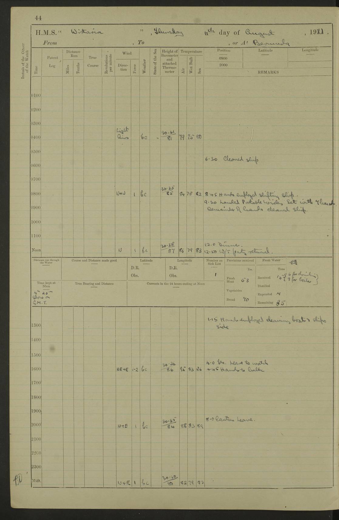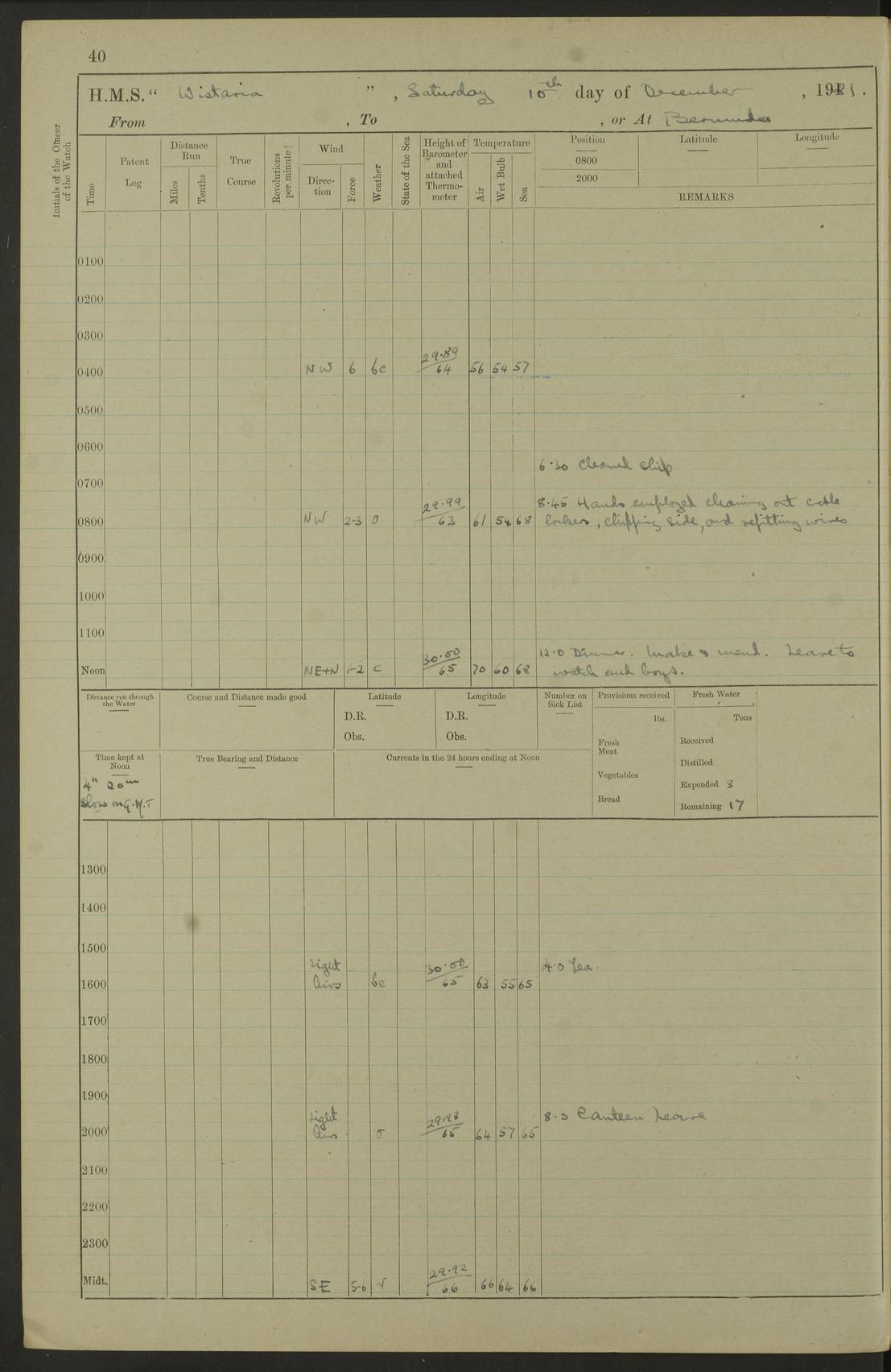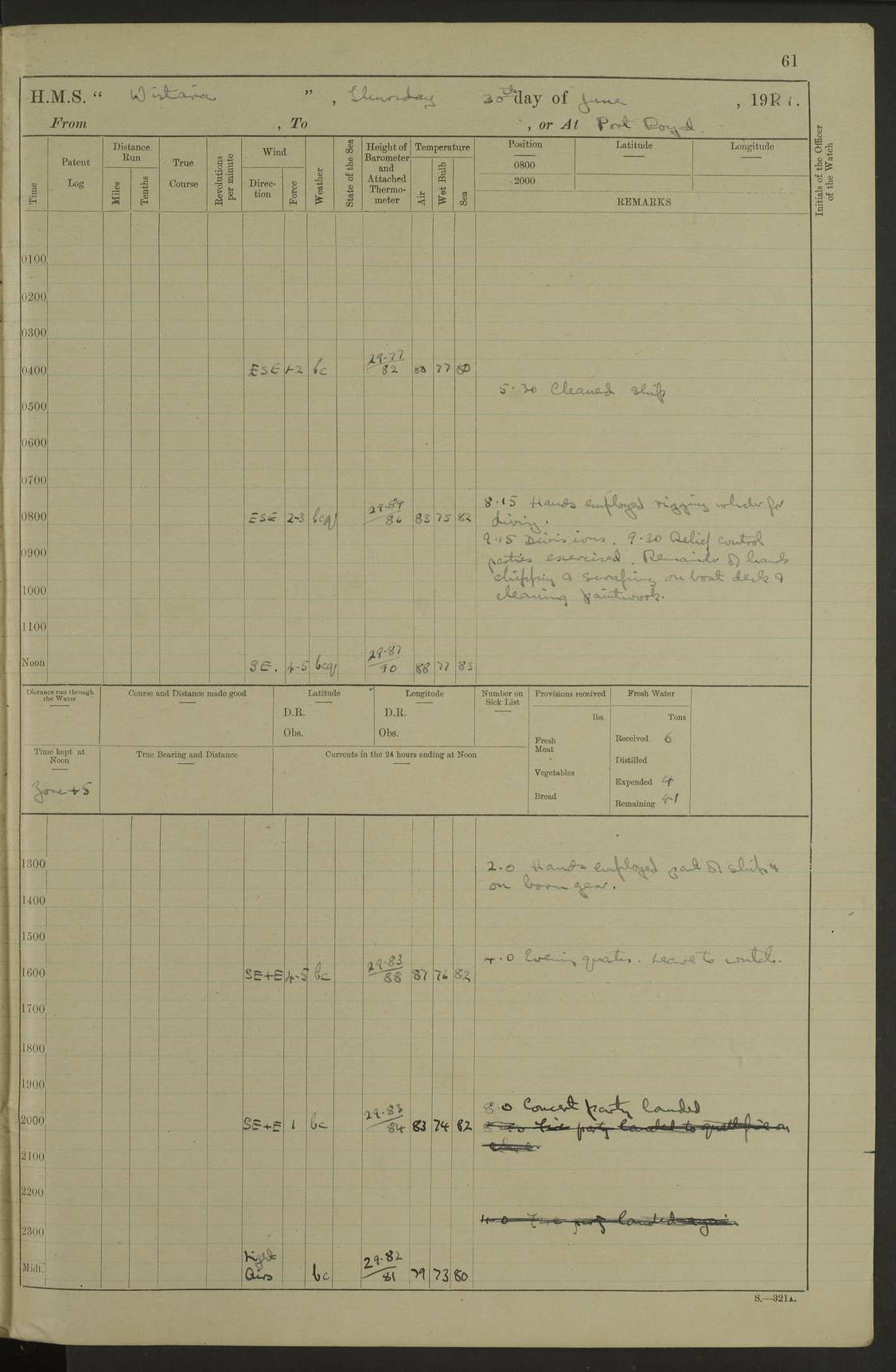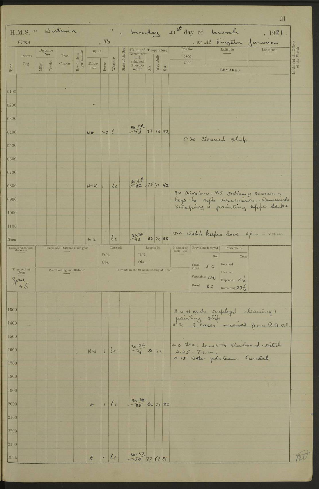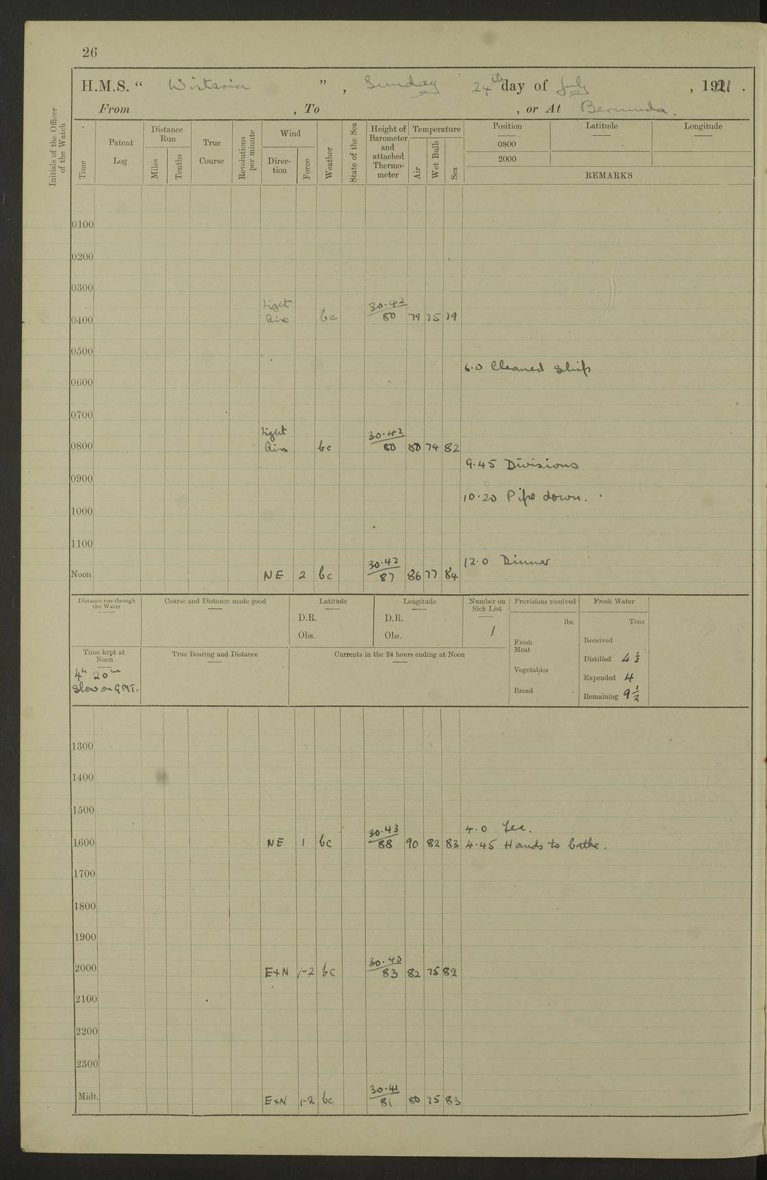 LOGS FOR JULY 1921 4f73ca38a2fc8ea903000a41: (https://s3.amazonaws.com:443/oldweather/ADM53-93262/0003_1.jpg) 1 July 1921 At Port Royal Lat 17.93, Long -76.83 8.15am: 1st whaler diving party. Clear up decks 9.30am: Ord. Seamen & boys muster bags. Remainder part of ship 1.45pm: Hands mustered for monthly payment 2.15pm: Diving party & side party employed. Rest part of ship 4f73ca38a2fc8ea903000a42: (https://s3.amazonaws.com:443/oldweather/ADM53-93262/0004_0.jpg) 2 July 1921 At Port Royal Lat 17.93, Long -76.83 8.15am: Cleaned ship 8.0pm: Concert party landed 8.45pm: Fire party landed 9.45pm: Fire party returned 10.40pm: Fire party landed 4f73ca39a2fc8ea903000a43: (https://s3.amazonaws.com:443/oldweather/ADM53-93262/0004_1.jpg) 3 July 1921 At Port Royal Lat 17.93, Long -76.83 6.30am: Cleaned ship 10.0am: Divisions Number on sick list: 2 4f73ca39a2fc8ea903000a44: (https://s3.amazonaws.com:443/oldweather/ADM53-93262/0005_0.jpg) 4 July 1921 At Port Royal Lat 17.93, Long -76.83 8.15am: Hands employed on boats & part of ship 2.0pm: Embarked 6” projectiles 10.30pm: Left harbour for Morant Cays. Course & speed as requisite 11.20pm: Dumped ammunition Number on sick list: 1 4f73ca39a2fc8ea903000a45: (https://s3.amazonaws.com:443/oldweather/ADM53-93262/0005_1.jpg) 5 July 1921 From Morant Cays-Port Royal to Port Royal-Morant Cays Lat 17.93, Long -76.83 6.20am: Sighted Morant Cays ahead 7.20am: Anchored and landed survey party am: Hands employed part of ship. Relief control parties exercised 10.40am: Weighed & proceeded 2.0pm: Hands employed chipping & painting boat deck & squaring off upper deck 3.10pm: Sighted Plum Point on Starboard bow 4.40pm: Stopped & manoeuvred as required for ship photograph to be taken 5.15pm: Secured alongside waling jetty. Leave to watch 4f73ca3aa2fc8ea903000a46: (https://s3.amazonaws.com:443/oldweather/ADM53-93262/0006_0.jpg) 6 July 1921 At Port Royal Lat 17.93, Long -76.83 9.25am: Hands employed parts of ship and six hands at small arm drill 2.0pm: Hands employed preparing ship for coaling 4.20pm: O.S. III Seabrook rejoined ship from hospital Number on sick list: 2 4f73ca3aa2fc8ea903000a47: (https://s3.amazonaws.com:443/oldweather/ADM53-93262/0006_1.jpg) 7 July 1921 At Port Royal Lat 17.93, Long -76.83 5.30am: Sanded decks 7.0am: Coaled ship with native labour 8.15am: Hands employed cleaning boats 11.20am: Finished coaling. Wash down & scrub upper deck Number on sick list: 4 4f73ca3aa2fc8ea903000a48: (https://s3.amazonaws.com:443/oldweather/ADM53-93262/0007_0.jpg) 8 July 1921 At Port Royal Lat 17.93, Long -76.83 8.15am: Hands employed cleaning paintwork & 3 hands about seine net 1.40pm: Starboard watch employed getting mine sweeping gear inboard 2.0pm: Port watch employed part of ship 3.0pm: Starboard watch employed part of ship 4.0pm: Tea. Ship put in quarantine 5.10pm: Surgeon McCallum left ship for military hospital Number on sick list: 1 [Surgeon McCallum: perhaps Surgeon Archie McCallum] 4f73ca3ba2fc8ea903000a49: (https://s3.amazonaws.com:443/oldweather/ADM53-93262/0007_1.jpg) 9 July 1921 At Port Royal Lat 17.93, Long -76.83 6.45am: Party left for isolation hospital to fumigate gear 11.50am: Air bedding 2.40pm: Bathing party landed 3.30pm: Bathing party returned 5.0pm: All hands vaccinated 4f73ca3ba2fc8ea903000a4a: (https://s3.amazonaws.com:443/oldweather/ADM53-93262/0008_0.jpg) 10 July 1921 At Port Royal Lat 17.93, Long -76.83 am: Parties sent to isolation hospital for fumigation 9.0am: Hands employed clearing mess decks & clearing up decks am: Parties sent for fumigation 1.0pm: All fumigation parties returned 5.15pm: Watch coaled picket boat Number on sick list: 1 4f73ca3ca2fc8ea903000a4b: (https://s3.amazonaws.com:443/oldweather/ADM53-93262/0008_1.jpg) 11 July 1921 From Port Royal to Bermuda and at Port Royal Lat 17.86, Long -76.63 8.15am: Furled forecastle awning 9.25am: Secured ship for sea 10.15am: Left Jetty 11.0am: Streamed patent log 11.01am: Plum Pt bearing N20E. Altered course S71E 3.15pm: Morant Pt bore N7W 3.30pm: Morant Pt bore N73W 6.45pm: Morant Pt bore S69W 9.35pm: Navassa Lt bearing S37E 10.32pm: Navassa Lt abeam 11.30pm: Navassa Lt bearing S24E True Bearing and Distance: Plum Pt Lt 294½°, 90 miles 4f73ca3ca2fc8ea903000a4c: (https://s3.amazonaws.com:443/oldweather/ADM53-93262/0009_0.jpg) 12 July 1921 From Port Royal to Bermuda Lat 20.18, Long -74.01 7.0am: Sighted Cuban mountains on Port bow 8.50am: Furled boat deck awning 9.35am: Exercised control parties, hands employed turning motor boats falls end for end, scarping & painting 2.0pm: Hands employed as forenoon 4.02pm: Sighted Great Inagua Lt Ho N48E 5.15pm: Course as required for re-charging telemotor system 5.38pm: Great Inagua Lt Ho abeam, 7 miles 6.30pm: N.W. Pt abeam, 1 mile True Bearing and Distance: Cape Maysi Lt Ho 299½°, 7¼ miles 4f73ca3ca2fc8ea903000a4d: (https://s3.amazonaws.com:443/oldweather/ADM53-93262/0009_1.jpg) 13 July 1921 From Port Royal to Bermuda Lat 23.13, Long -71.83 9.40am: Hands employed fitting new streaming light halliyards, scraping & cleaning part of ship 2.0pm: Hands employed scraping, painting & redleading parts of ship True Bearing and Distance: Gibbs Hill Lt Ho 034¼°, 672 miles 4f73ca3da2fc8ea903000a4e: (https://s3.amazonaws.com:443/oldweather/ADM53-93262/0010_0.jpg) 14 July 1921 From Port Royal to Bermuda Lat 25.91, Long -69.55 2.10am: Hauled in Patent log to clear it 2.15am: Log streamed 9.0am: Hauled in patent log 9.30am: Hands employed mustering bags & hammocks 2.0pm: Hands scrub hammocks 4.0pm: Evening Quarters. Exercised collision stations 5.0pm: Put clocks on 20 minutes True Bearing and Distance: Gibbs Hill Lt Ho 034°, 452 miles 4f73ca3da2fc8ea903000a4f: (https://s3.amazonaws.com:443/oldweather/ADM53-93262/0010_1.jpg) 15 July 1921 From Port Royal to Bermuda Lat 29.03, Long -67.18 9.40am: Exercised action stations. Fired one belt of ammunition from each pom pom 10.30am: Ord. Sea & boys to school. Pom Pom’s crews working about guns, remainders chip