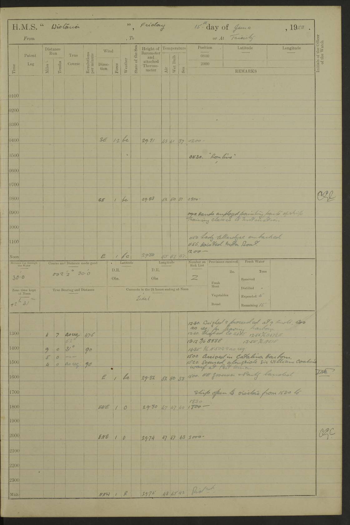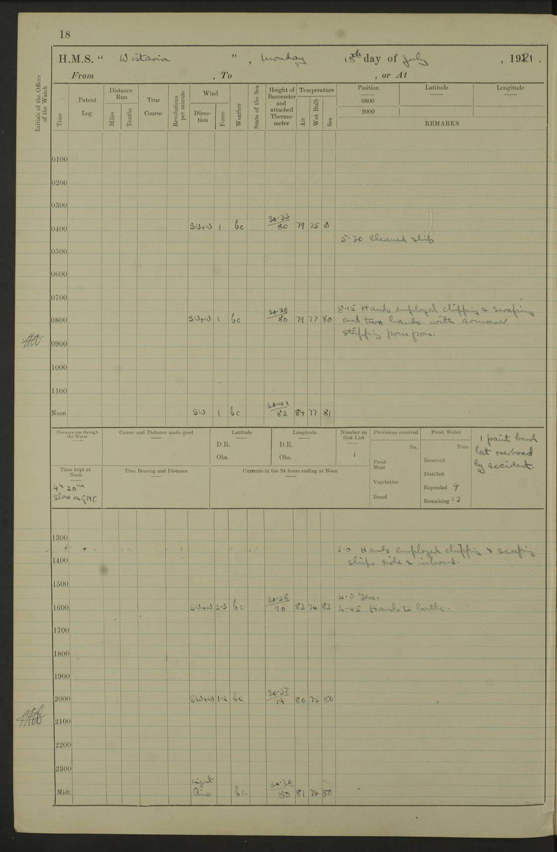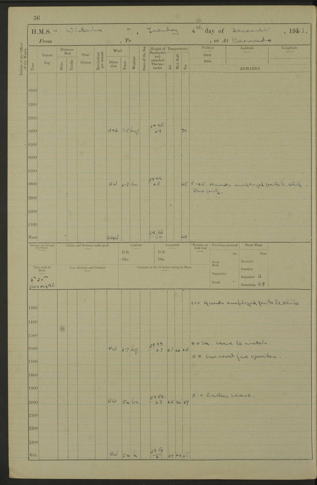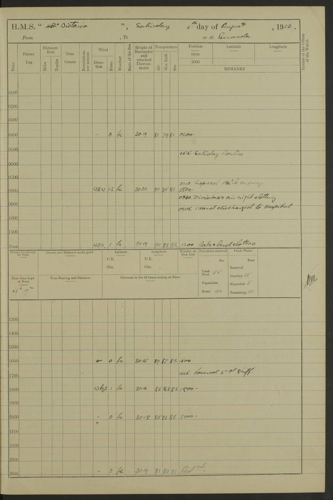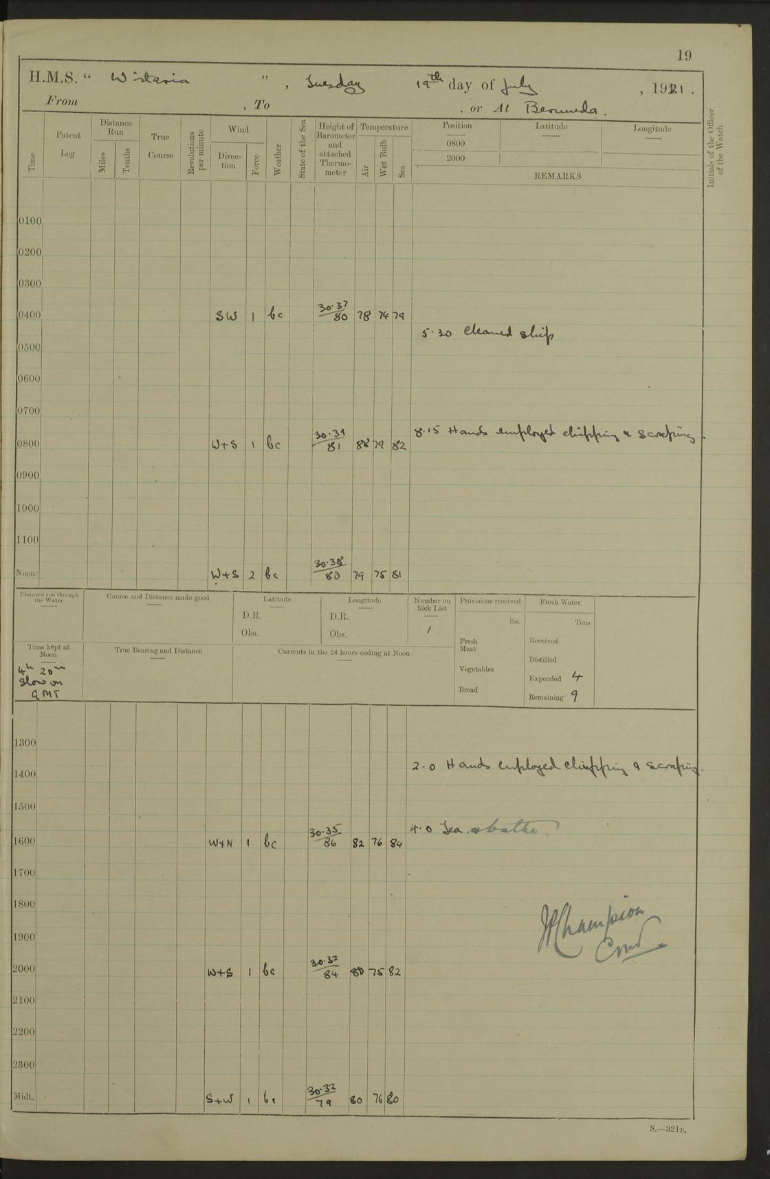 LOGS FOR JULY 1921 4f73ca38a2fc8ea903000a41: (https://s3.amazonaws.com:443/oldweather/ADM53-93262/0003_1.jpg) 1 July 1921 At Port Royal Lat 17.93, Long -76.83 8.15am: 1st whaler diving party. Clear up decks 9.30am: Ord. Seamen & boys muster bags. Remainder part of ship 1.45pm: Hands mustered for monthly payment 2.15pm: Diving party & side party employed. Rest part of ship 4f73ca38a2fc8ea903000a42: (https://s3.amazonaws.com:443/oldweather/ADM53-93262/0004_0.jpg) 2 July 1921 At Port Royal Lat 17.93, Long -76.83 8.15am: Cleaned ship 8.0pm: Concert party landed 8.45pm: Fire party landed 9.45pm: Fire party returned 10.40pm: Fire party landed 4f73ca39a2fc8ea903000a43: (https://s3.amazonaws.com:443/oldweather/ADM53-93262/0004_1.jpg) 3 July 1921 At Port Royal Lat 17.93, Long -76.83 6.30am: Cleaned ship 10.0am: Divisions Number on sick list: 2 4f73ca39a2fc8ea903000a44: (https://s3.amazonaws.com:443/oldweather/ADM53-93262/0005_0.jpg) 4 July 1921 At Port Royal Lat 17.93, Long -76.83 8.15am: Hands employed on boats & part of ship 2.0pm: Embarked 6” projectiles 10.30pm: Left harbour for Morant Cays. Course & speed as requisite 11.20pm: Dumped ammunition Number on sick list: 1 4f73ca39a2fc8ea903000a45: (https://s3.amazonaws.com:443/oldweather/ADM53-93262/0005_1.jpg) 5 July 1921 From Morant Cays-Port Royal to Port Royal-Morant Cays Lat 17.93, Long -76.83 6.20am: Sighted Morant Cays ahead 7.20am: Anchored and landed survey party am: Hands employed part of ship. Relief control parties exercised 10.40am: Weighed & proceeded 2.0pm: Hands employed chipping & painting boat deck & squaring off upper deck 3.10pm: Sighted Plum Point on Starboard bow 4.40pm: Stopped & manoeuvred as required for ship photograph to be taken 5.15pm: Secured alongside waling jetty. Leave to watch 4f73ca3aa2fc8ea903000a46: (https://s3.amazonaws.com:443/oldweather/ADM53-93262/0006_0.jpg) 6 July 1921 At Port Royal Lat 17.93, Long -76.83 9.25am: Hands employed parts of ship and six hands at small arm drill 2.0pm: Hands employed preparing ship for coaling 4.20pm: O.S. III Seabrook rejoined ship from hospital Number on sick list: 2 4f73ca3aa2fc8ea903000a47: (https://s3.amazonaws.com:443/oldweather/ADM53-93262/0006_1.jpg) 7 July 1921 At Port Royal Lat 17.93, Long -76.83 5.30am: Sanded decks 7.0am: Coaled ship with native labour 8.15am: Hands employed cleaning boats 11.20am: Finished coaling. Wash down & scrub upper deck Number on sick list: 4 4f73ca3aa2fc8ea903000a48: (https://s3.amazonaws.com:443/oldweather/ADM53-93262/0007_0.jpg) 8 July 1921 At Port Royal Lat 17.93, Long -76.83 8.15am: Hands employed cleaning paintwork & 3 hands about seine net 1.40pm: Starboard watch employed getting mine sweeping gear inboard 2.0pm: Port watch employed part of ship 3.0pm: Starboard watch employed part of ship 4.0pm: Tea. Ship put in quarantine 5.10pm: Surgeon McCallum left ship for military hospital Number on sick list: 1 [Surgeon McCallum: perhaps Surgeon Archie McCallum] 4f73ca3ba2fc8ea903000a49: (https://s3.amazonaws.com:443/oldweather/ADM53-93262/0007_1.jpg) 9 July 1921 At Port Royal Lat 17.93, Long -76.83 6.45am: Party left for isolation hospital to fumigate gear 11.50am: Air bedding 2.40pm: Bathing party landed 3.30pm: Bathing party returned 5.0pm: All hands vaccinated 4f73ca3ba2fc8ea903000a4a: (https://s3.amazonaws.com:443/oldweather/ADM53-93262/0008_0.jpg) 10 July 1921 At Port Royal Lat 17.93, Long -76.83 am: Parties sent to isolation hospital for fumigation 9.0am: Hands employed clearing mess decks & clearing up decks am: Parties sent for fumigation 1.0pm: All fumigation parties returned 5.15pm: Watch coaled picket boat Number on sick list: 1 4f73ca3ca2fc8ea903000a4b: (https://s3.amazonaws.com:443/oldweather/ADM53-93262/0008_1.jpg) 11 July 1921 From Port Royal to Bermuda and at Port Royal Lat 17.86, Long -76.63 8.15am: Furled forecastle awning 9.25am: Secured ship for sea 10.15am: Left Jetty 11.0am: Streamed patent log 11.01am: Plum Pt bearing N20E. Altered course S71E 3.15pm: Morant Pt bore N7W 3.30pm: Morant Pt bore N73W 6.45pm: Morant Pt bore S69W 9.35pm: Navassa Lt bearing S37E 10.32pm: Navassa Lt abeam 11.30pm: Navassa Lt bearing S24E True Bearing and Distance: Plum Pt Lt 294½°, 90 miles 4f73ca3ca2fc8ea903000a4c: (https://s3.amazonaws.com:443/oldweather/ADM53-93262/0009_0.jpg) 12 July 1921 From Port Royal to Bermuda Lat 20.18, Long -74.01 7.0am: Sighted Cuban mountains on Port bow 8.50am: Furled boat deck awning 9.35am: Exercised control parties, hands employed turning motor boats falls end for end, scarping & painting 2.0pm: Hands employed as forenoon 4.02pm: Sighted Great Inagua Lt Ho N48E 5.15pm: Course as required for re-charging telemotor system 5.38pm: Great Inagua Lt Ho abeam, 7 miles 6.30pm: N.W. Pt abeam, 1 mile True Bearing and Distance: Cape Maysi Lt Ho 299½°, 7¼ miles 4f73ca3ca2fc8ea903000a4d: (https://s3.amazonaws.com:443/oldweather/ADM53-93262/0009_1.jpg) 13 July 1921 From Port Royal to Bermuda Lat 23.13, Long -71.83 9.40am: Hands employed fitting new streaming light halliyards, scraping & cleaning part of ship 2.0pm: Hands employed scraping, painting & redleading parts of ship True Bearing and Distance: Gibbs Hill Lt Ho 034¼°, 672 miles 4f73ca3da2fc8ea903000a4e: (https://s3.amazonaws.com:443/oldweather/ADM53-93262/0010_0.jpg) 14 July 1921 From Port Royal to Bermuda Lat 25.91, Long -69.55 2.10am: Hauled in Patent log to clear it 2.15am: Log streamed 9.0am: Hauled in patent log 9.30am: Hands employed mustering bags & hammocks 2.0pm: Hands scrub hammocks 4.0pm: Evening Quarters. Exercised collision stations 5.0pm: Put clocks on 20 minutes True Bearing and Distance: Gibbs Hill Lt Ho 034°, 452 miles 4f73ca3da2fc8ea903000a4f: (https://s3.amazonaws.com:443/oldweather/ADM53-93262/0010_1.jpg) 15 July 1921 From Port Royal to Bermuda Lat 29.03, Long -67.18 9.40am: Exercised action stations. Fired one belt of ammunition from each pom pom 10.30am: Ord. Sea & boys to school. Pom Pom’s crews working about guns, remainders chip