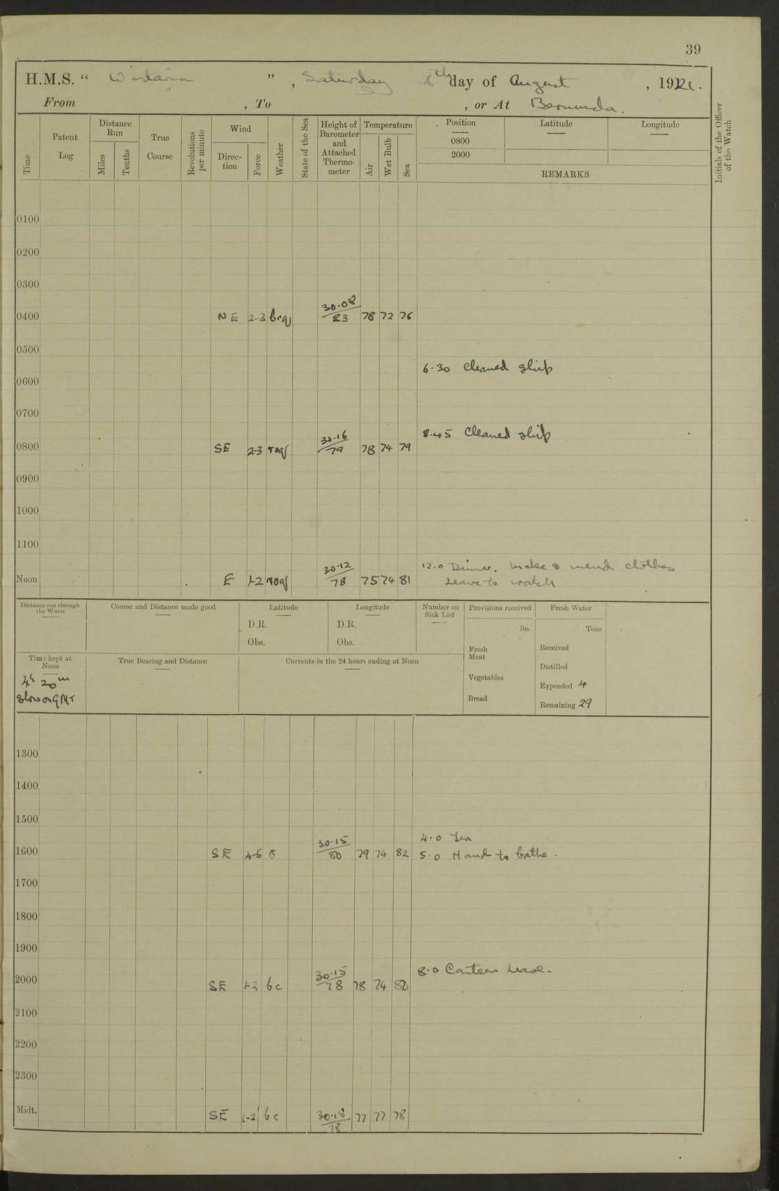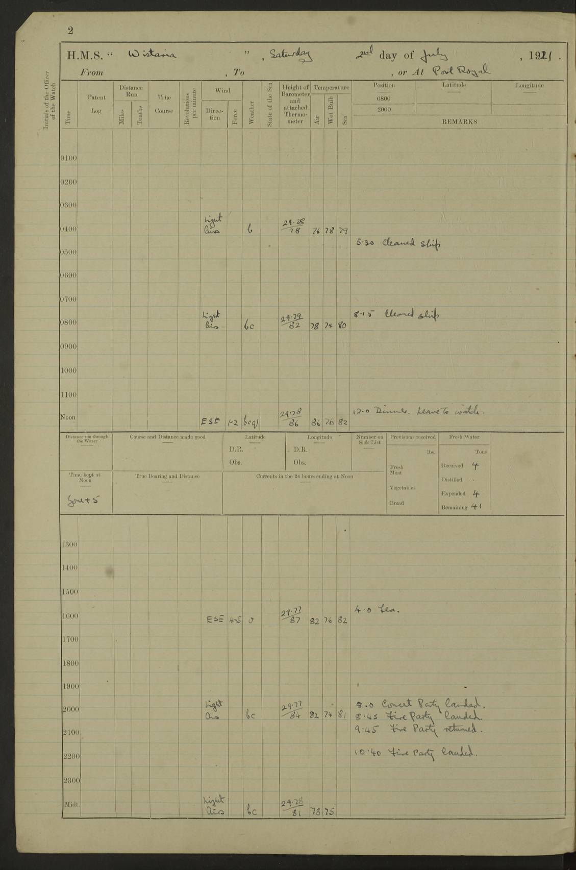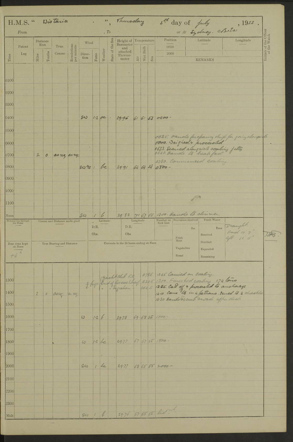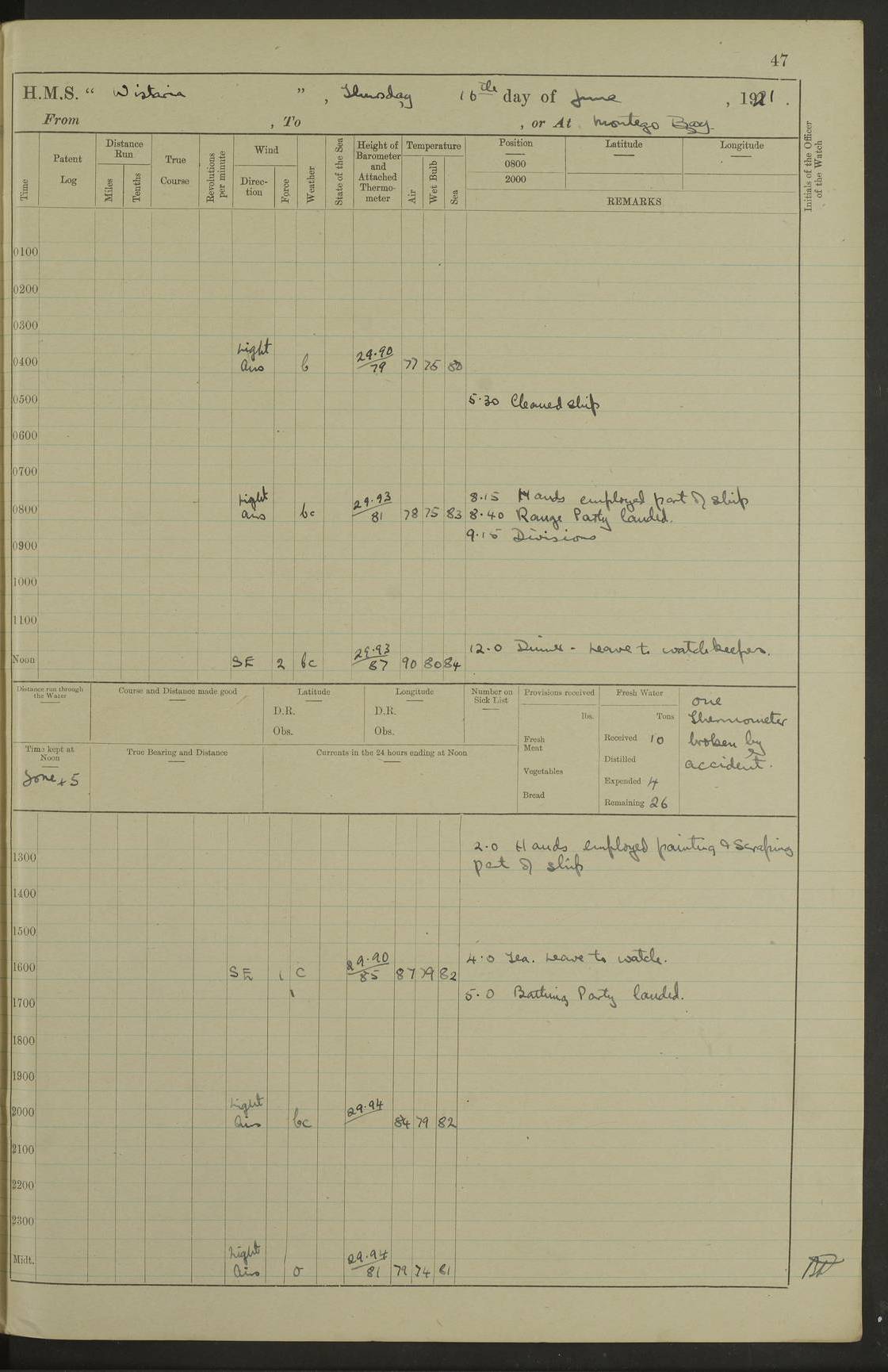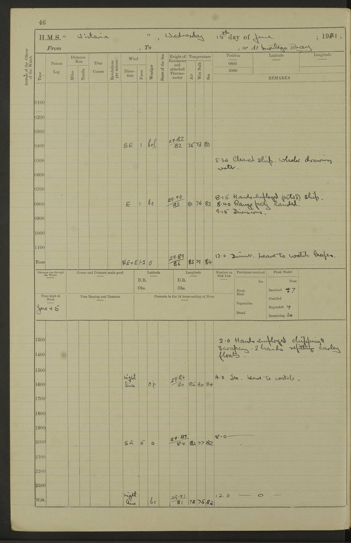 LOGS FOR JULY 1921 4f73ca38a2fc8ea903000a41: (https://s3.amazonaws.com:443/oldweather/ADM53-93262/0003_1.jpg) 1 July 1921 At Port Royal Lat 17.93, Long -76.83 8.15am: 1st whaler diving party. Clear up decks 9.30am: Ord. Seamen & boys muster bags. Remainder part of ship 1.45pm: Hands mustered for monthly payment 2.15pm: Diving party & side party employed. Rest part of ship 4f73ca38a2fc8ea903000a42: (https://s3.amazonaws.com:443/oldweather/ADM53-93262/0004_0.jpg) 2 July 1921 At Port Royal Lat 17.93, Long -76.83 8.15am: Cleaned ship 8.0pm: Concert party landed 8.45pm: Fire party landed 9.45pm: Fire party returned 10.40pm: Fire party landed 4f73ca39a2fc8ea903000a43: (https://s3.amazonaws.com:443/oldweather/ADM53-93262/0004_1.jpg) 3 July 1921 At Port Royal Lat 17.93, Long -76.83 6.30am: Cleaned ship 10.0am: Divisions Number on sick list: 2 4f73ca39a2fc8ea903000a44: (https://s3.amazonaws.com:443/oldweather/ADM53-93262/0005_0.jpg) 4 July 1921 At Port Royal Lat 17.93, Long -76.83 8.15am: Hands employed on boats & part of ship 2.0pm: Embarked 6” projectiles 10.30pm: Left harbour for Morant Cays. Course & speed as requisite 11.20pm: Dumped ammunition Number on sick list: 1 4f73ca39a2fc8ea903000a45: (https://s3.amazonaws.com:443/oldweather/ADM53-93262/0005_1.jpg) 5 July 1921 From Morant Cays-Port Royal to Port Royal-Morant Cays Lat 17.93, Long -76.83 6.20am: Sighted Morant Cays ahead 7.20am: Anchored and landed survey party am: Hands employed part of ship. Relief control parties exercised 10.40am: Weighed & proceeded 2.0pm: Hands employed chipping & painting boat deck & squaring off upper deck 3.10pm: Sighted Plum Point on Starboard bow 4.40pm: Stopped & manoeuvred as required for ship photograph to be taken 5.15pm: Secured alongside waling jetty. Leave to watch 4f73ca3aa2fc8ea903000a46: (https://s3.amazonaws.com:443/oldweather/ADM53-93262/0006_0.jpg) 6 July 1921 At Port Royal Lat 17.93, Long -76.83 9.25am: Hands employed parts of ship and six hands at small arm drill 2.0pm: Hands employed preparing ship for coaling 4.20pm: O.S. III Seabrook rejoined ship from hospital Number on sick list: 2 4f73ca3aa2fc8ea903000a47: (https://s3.amazonaws.com:443/oldweather/ADM53-93262/0006_1.jpg) 7 July 1921 At Port Royal Lat 17.93, Long -76.83 5.30am: Sanded decks 7.0am: Coaled ship with native labour 8.15am: Hands employed cleaning boats 11.20am: Finished coaling. Wash down & scrub upper deck Number on sick list: 4 4f73ca3aa2fc8ea903000a48: (https://s3.amazonaws.com:443/oldweather/ADM53-93262/0007_0.jpg) 8 July 1921 At Port Royal Lat 17.93, Long -76.83 8.15am: Hands employed cleaning paintwork & 3 hands about seine net 1.40pm: Starboard watch employed getting mine sweeping gear inboard 2.0pm: Port watch employed part of ship 3.0pm: Starboard watch employed part of ship 4.0pm: Tea. Ship put in quarantine 5.10pm: Surgeon McCallum left ship for military hospital Number on sick list: 1 [Surgeon McCallum: perhaps Surgeon Archie McCallum] 4f73ca3ba2fc8ea903000a49: (https://s3.amazonaws.com:443/oldweather/ADM53-93262/0007_1.jpg) 9 July 1921 At Port Royal Lat 17.93, Long -76.83 6.45am: Party left for isolation hospital to fumigate gear 11.50am: Air bedding 2.40pm: Bathing party landed 3.30pm: Bathing party returned 5.0pm: All hands vaccinated 4f73ca3ba2fc8ea903000a4a: (https://s3.amazonaws.com:443/oldweather/ADM53-93262/0008_0.jpg) 10 July 1921 At Port Royal Lat 17.93, Long -76.83 am: Parties sent to isolation hospital for fumigation 9.0am: Hands employed clearing mess decks & clearing up decks am: Parties sent for fumigation 1.0pm: All fumigation parties returned 5.15pm: Watch coaled picket boat Number on sick list: 1 4f73ca3ca2fc8ea903000a4b: (https://s3.amazonaws.com:443/oldweather/ADM53-93262/0008_1.jpg) 11 July 1921 From Port Royal to Bermuda and at Port Royal Lat 17.86, Long -76.63 8.15am: Furled forecastle awning 9.25am: Secured ship for sea 10.15am: Left Jetty 11.0am: Streamed patent log 11.01am: Plum Pt bearing N20E. Altered course S71E 3.15pm: Morant Pt bore N7W 3.30pm: Morant Pt bore N73W 6.45pm: Morant Pt bore S69W 9.35pm: Navassa Lt bearing S37E 10.32pm: Navassa Lt abeam 11.30pm: Navassa Lt bearing S24E True Bearing and Distance: Plum Pt Lt 294½°, 90 miles 4f73ca3ca2fc8ea903000a4c: (https://s3.amazonaws.com:443/oldweather/ADM53-93262/0009_0.jpg) 12 July 1921 From Port Royal to Bermuda Lat 20.18, Long -74.01 7.0am: Sighted Cuban mountains on Port bow 8.50am: Furled boat deck awning 9.35am: Exercised control parties, hands employed turning motor boats falls end for end, scarping & painting 2.0pm: Hands employed as forenoon 4.02pm: Sighted Great Inagua Lt Ho N48E 5.15pm: Course as required for re-charging telemotor system 5.38pm: Great Inagua Lt Ho abeam, 7 miles 6.30pm: N.W. Pt abeam, 1 mile True Bearing and Distance: Cape Maysi Lt Ho 299½°, 7¼ miles 4f73ca3ca2fc8ea903000a4d: (https://s3.amazonaws.com:443/oldweather/ADM53-93262/0009_1.jpg) 13 July 1921 From Port Royal to Bermuda Lat 23.13, Long -71.83 9.40am: Hands employed fitting new streaming light halliyards, scraping & cleaning part of ship 2.0pm: Hands employed scraping, painting & redleading parts of ship True Bearing and Distance: Gibbs Hill Lt Ho 034¼°, 672 miles 4f73ca3da2fc8ea903000a4e: (https://s3.amazonaws.com:443/oldweather/ADM53-93262/0010_0.jpg) 14 July 1921 From Port Royal to Bermuda Lat 25.91, Long -69.55 2.10am: Hauled in Patent log to clear it 2.15am: Log streamed 9.0am: Hauled in patent log 9.30am: Hands employed mustering bags & hammocks 2.0pm: Hands scrub hammocks 4.0pm: Evening Quarters. Exercised collision stations 5.0pm: Put clocks on 20 minutes True Bearing and Distance: Gibbs Hill Lt Ho 034°, 452 miles 4f73ca3da2fc8ea903000a4f: (https://s3.amazonaws.com:443/oldweather/ADM53-93262/0010_1.jpg) 15 July 1921 From Port Royal to Bermuda Lat 29.03, Long -67.18 9.40am: Exercised action stations. Fired one belt of ammunition from each pom pom 10.30am: Ord. Sea & boys to school. Pom Pom’s crews working about guns, remainders chip