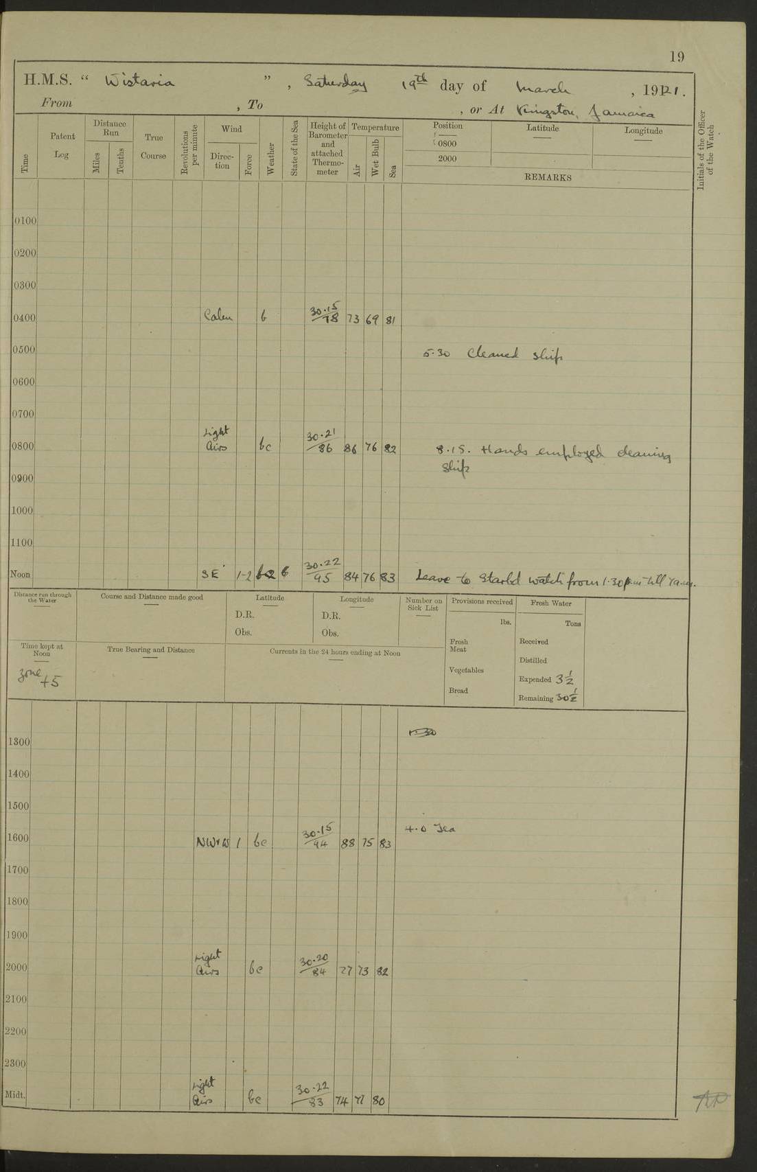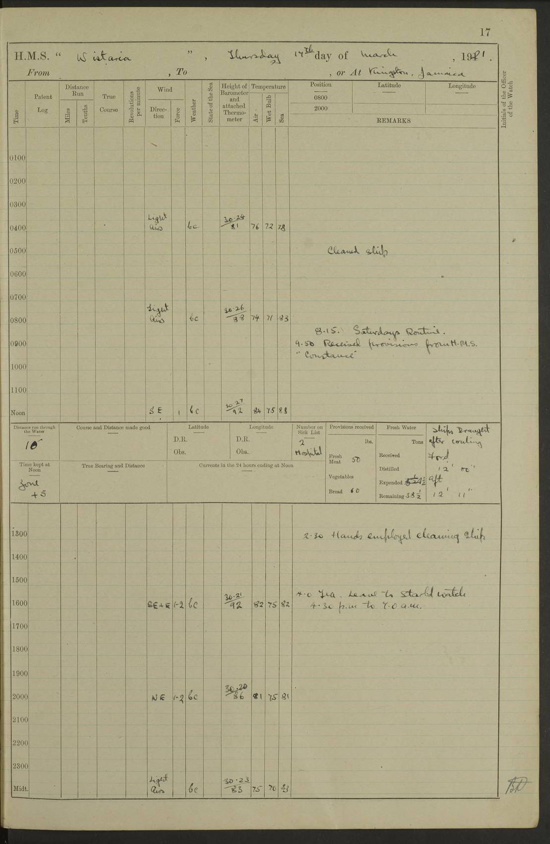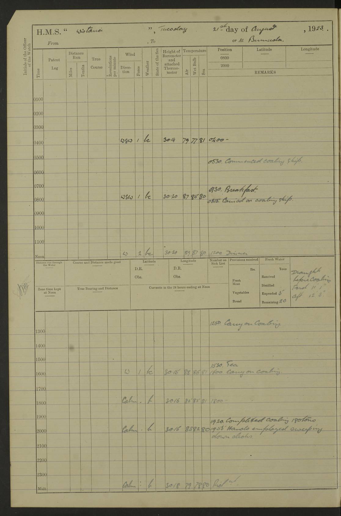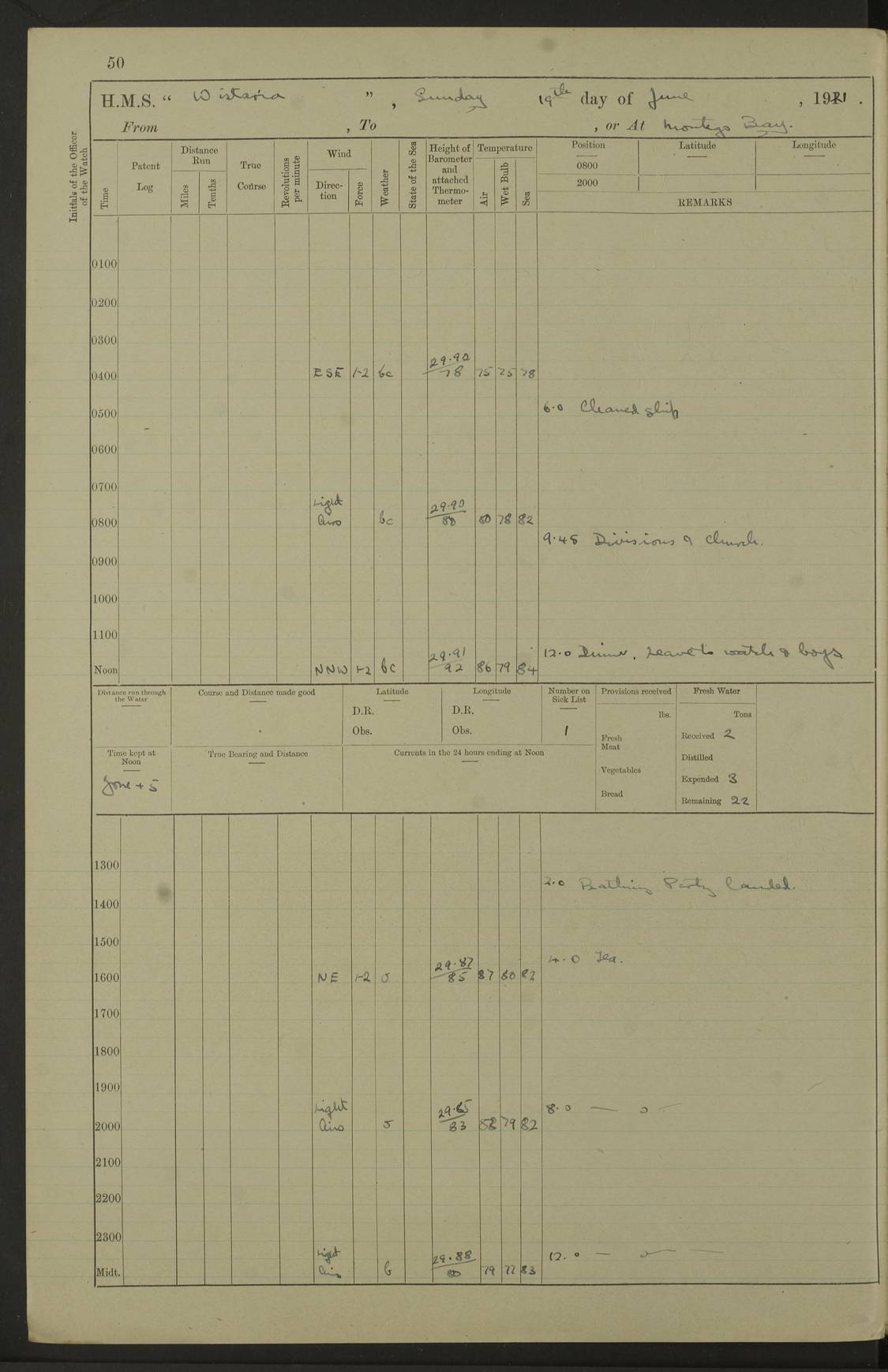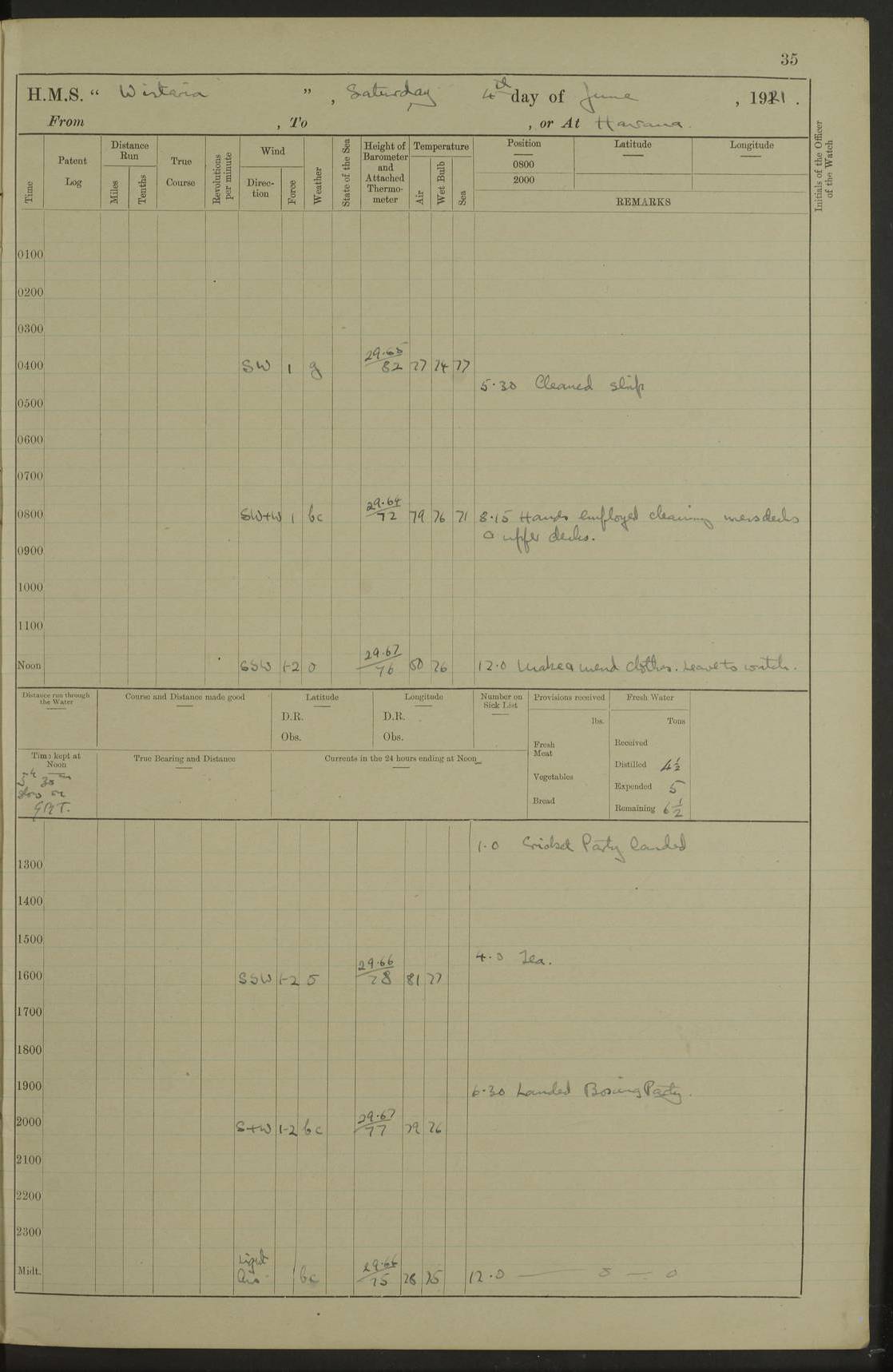 LOGS FOR JULY 1921 4f73ca38a2fc8ea903000a41: (https://s3.amazonaws.com:443/oldweather/ADM53-93262/0003_1.jpg) 1 July 1921 At Port Royal Lat 17.93, Long -76.83 8.15am: 1st whaler diving party. Clear up decks 9.30am: Ord. Seamen & boys muster bags. Remainder part of ship 1.45pm: Hands mustered for monthly payment 2.15pm: Diving party & side party employed. Rest part of ship 4f73ca38a2fc8ea903000a42: (https://s3.amazonaws.com:443/oldweather/ADM53-93262/0004_0.jpg) 2 July 1921 At Port Royal Lat 17.93, Long -76.83 8.15am: Cleaned ship 8.0pm: Concert party landed 8.45pm: Fire party landed 9.45pm: Fire party returned 10.40pm: Fire party landed 4f73ca39a2fc8ea903000a43: (https://s3.amazonaws.com:443/oldweather/ADM53-93262/0004_1.jpg) 3 July 1921 At Port Royal Lat 17.93, Long -76.83 6.30am: Cleaned ship 10.0am: Divisions Number on sick list: 2 4f73ca39a2fc8ea903000a44: (https://s3.amazonaws.com:443/oldweather/ADM53-93262/0005_0.jpg) 4 July 1921 At Port Royal Lat 17.93, Long -76.83 8.15am: Hands employed on boats & part of ship 2.0pm: Embarked 6” projectiles 10.30pm: Left harbour for Morant Cays. Course & speed as requisite 11.20pm: Dumped ammunition Number on sick list: 1 4f73ca39a2fc8ea903000a45: (https://s3.amazonaws.com:443/oldweather/ADM53-93262/0005_1.jpg) 5 July 1921 From Morant Cays-Port Royal to Port Royal-Morant Cays Lat 17.93, Long -76.83 6.20am: Sighted Morant Cays ahead 7.20am: Anchored and landed survey party am: Hands employed part of ship. Relief control parties exercised 10.40am: Weighed & proceeded 2.0pm: Hands employed chipping & painting boat deck & squaring off upper deck 3.10pm: Sighted Plum Point on Starboard bow 4.40pm: Stopped & manoeuvred as required for ship photograph to be taken 5.15pm: Secured alongside waling jetty. Leave to watch 4f73ca3aa2fc8ea903000a46: (https://s3.amazonaws.com:443/oldweather/ADM53-93262/0006_0.jpg) 6 July 1921 At Port Royal Lat 17.93, Long -76.83 9.25am: Hands employed parts of ship and six hands at small arm drill 2.0pm: Hands employed preparing ship for coaling 4.20pm: O.S. III Seabrook rejoined ship from hospital Number on sick list: 2 4f73ca3aa2fc8ea903000a47: (https://s3.amazonaws.com:443/oldweather/ADM53-93262/0006_1.jpg) 7 July 1921 At Port Royal Lat 17.93, Long -76.83 5.30am: Sanded decks 7.0am: Coaled ship with native labour 8.15am: Hands employed cleaning boats 11.20am: Finished coaling. Wash down & scrub upper deck Number on sick list: 4 4f73ca3aa2fc8ea903000a48: (https://s3.amazonaws.com:443/oldweather/ADM53-93262/0007_0.jpg) 8 July 1921 At Port Royal Lat 17.93, Long -76.83 8.15am: Hands employed cleaning paintwork & 3 hands about seine net 1.40pm: Starboard watch employed getting mine sweeping gear inboard 2.0pm: Port watch employed part of ship 3.0pm: Starboard watch employed part of ship 4.0pm: Tea. Ship put in quarantine 5.10pm: Surgeon McCallum left ship for military hospital Number on sick list: 1 [Surgeon McCallum: perhaps Surgeon Archie McCallum] 4f73ca3ba2fc8ea903000a49: (https://s3.amazonaws.com:443/oldweather/ADM53-93262/0007_1.jpg) 9 July 1921 At Port Royal Lat 17.93, Long -76.83 6.45am: Party left for isolation hospital to fumigate gear 11.50am: Air bedding 2.40pm: Bathing party landed 3.30pm: Bathing party returned 5.0pm: All hands vaccinated 4f73ca3ba2fc8ea903000a4a: (https://s3.amazonaws.com:443/oldweather/ADM53-93262/0008_0.jpg) 10 July 1921 At Port Royal Lat 17.93, Long -76.83 am: Parties sent to isolation hospital for fumigation 9.0am: Hands employed clearing mess decks & clearing up decks am: Parties sent for fumigation 1.0pm: All fumigation parties returned 5.15pm: Watch coaled picket boat Number on sick list: 1 4f73ca3ca2fc8ea903000a4b: (https://s3.amazonaws.com:443/oldweather/ADM53-93262/0008_1.jpg) 11 July 1921 From Port Royal to Bermuda and at Port Royal Lat 17.86, Long -76.63 8.15am: Furled forecastle awning 9.25am: Secured ship for sea 10.15am: Left Jetty 11.0am: Streamed patent log 11.01am: Plum Pt bearing N20E. Altered course S71E 3.15pm: Morant Pt bore N7W 3.30pm: Morant Pt bore N73W 6.45pm: Morant Pt bore S69W 9.35pm: Navassa Lt bearing S37E 10.32pm: Navassa Lt abeam 11.30pm: Navassa Lt bearing S24E True Bearing and Distance: Plum Pt Lt 294½°, 90 miles 4f73ca3ca2fc8ea903000a4c: (https://s3.amazonaws.com:443/oldweather/ADM53-93262/0009_0.jpg) 12 July 1921 From Port Royal to Bermuda Lat 20.18, Long -74.01 7.0am: Sighted Cuban mountains on Port bow 8.50am: Furled boat deck awning 9.35am: Exercised control parties, hands employed turning motor boats falls end for end, scarping & painting 2.0pm: Hands employed as forenoon 4.02pm: Sighted Great Inagua Lt Ho N48E 5.15pm: Course as required for re-charging telemotor system 5.38pm: Great Inagua Lt Ho abeam, 7 miles 6.30pm: N.W. Pt abeam, 1 mile True Bearing and Distance: Cape Maysi Lt Ho 299½°, 7¼ miles 4f73ca3ca2fc8ea903000a4d: (https://s3.amazonaws.com:443/oldweather/ADM53-93262/0009_1.jpg) 13 July 1921 From Port Royal to Bermuda Lat 23.13, Long -71.83 9.40am: Hands employed fitting new streaming light halliyards, scraping & cleaning part of ship 2.0pm: Hands employed scraping, painting & redleading parts of ship True Bearing and Distance: Gibbs Hill Lt Ho 034¼°, 672 miles 4f73ca3da2fc8ea903000a4e: (https://s3.amazonaws.com:443/oldweather/ADM53-93262/0010_0.jpg) 14 July 1921 From Port Royal to Bermuda Lat 25.91, Long -69.55 2.10am: Hauled in Patent log to clear it 2.15am: Log streamed 9.0am: Hauled in patent log 9.30am: Hands employed mustering bags & hammocks 2.0pm: Hands scrub hammocks 4.0pm: Evening Quarters. Exercised collision stations 5.0pm: Put clocks on 20 minutes True Bearing and Distance: Gibbs Hill Lt Ho 034°, 452 miles 4f73ca3da2fc8ea903000a4f: (https://s3.amazonaws.com:443/oldweather/ADM53-93262/0010_1.jpg) 15 July 1921 From Port Royal to Bermuda Lat 29.03, Long -67.18 9.40am: Exercised action stations. Fired one belt of ammunition from each pom pom 10.30am: Ord. Sea & boys to school. Pom Pom’s crews working about guns, remainders chip