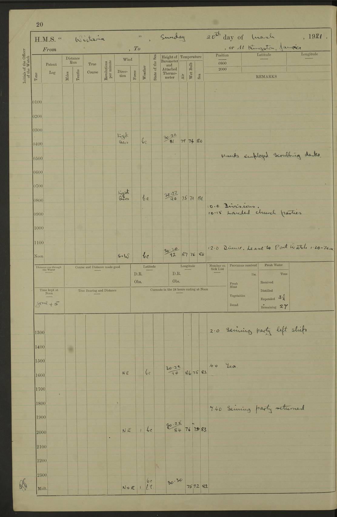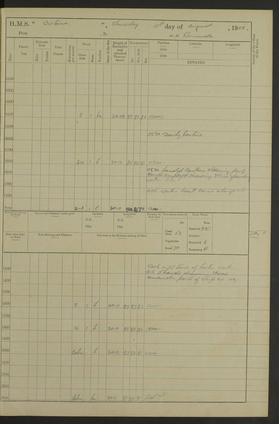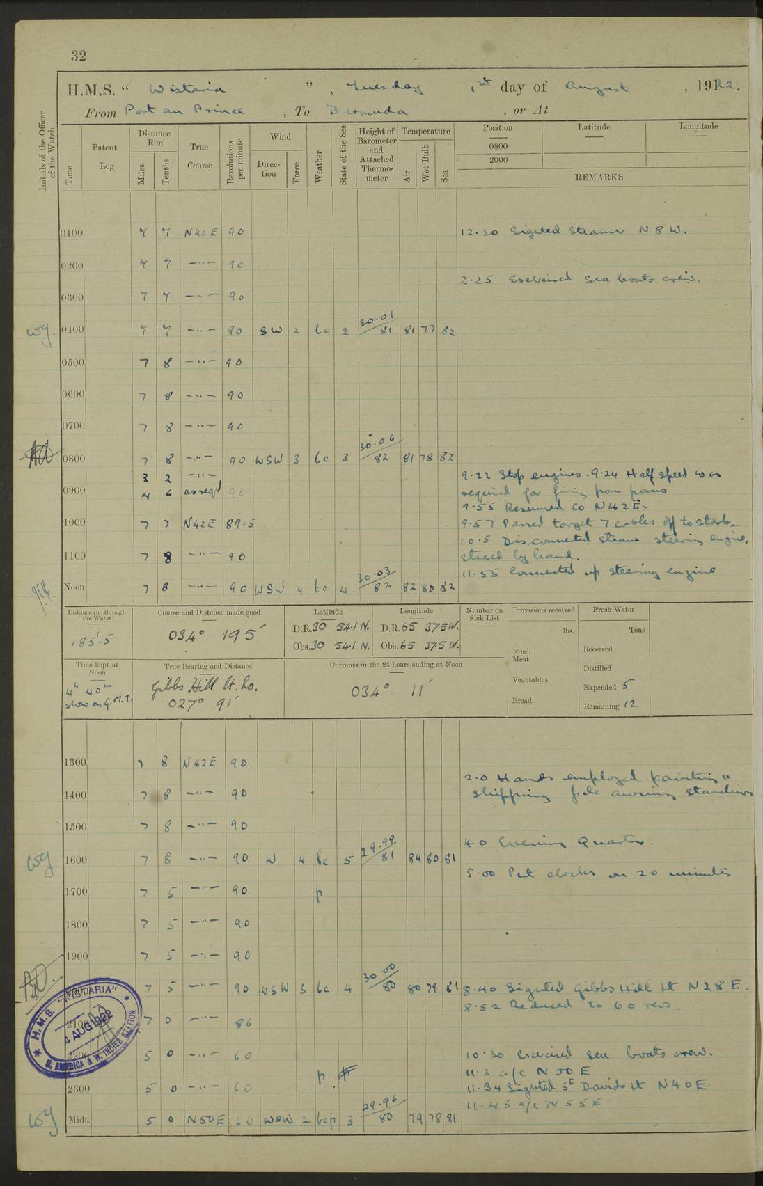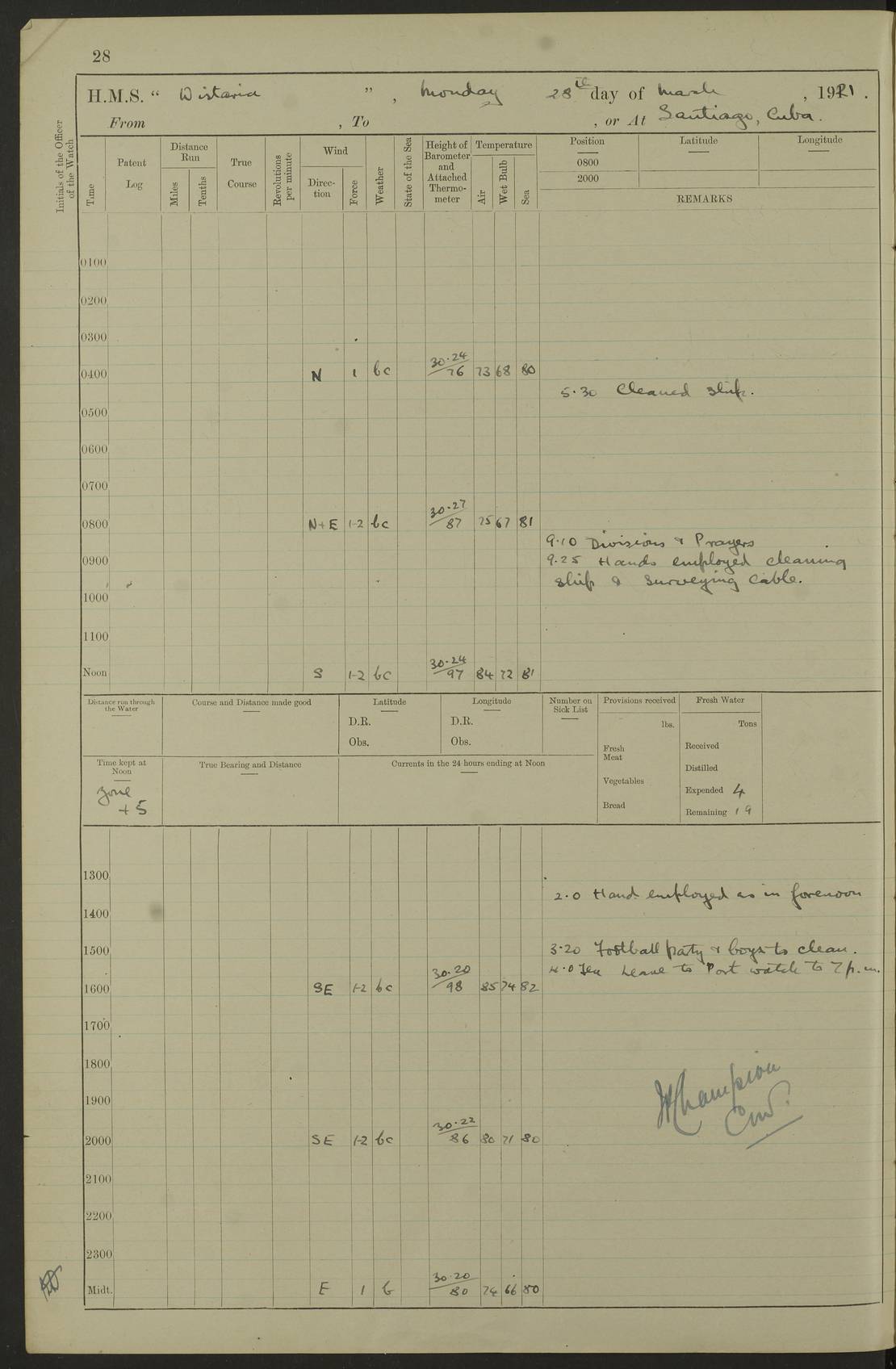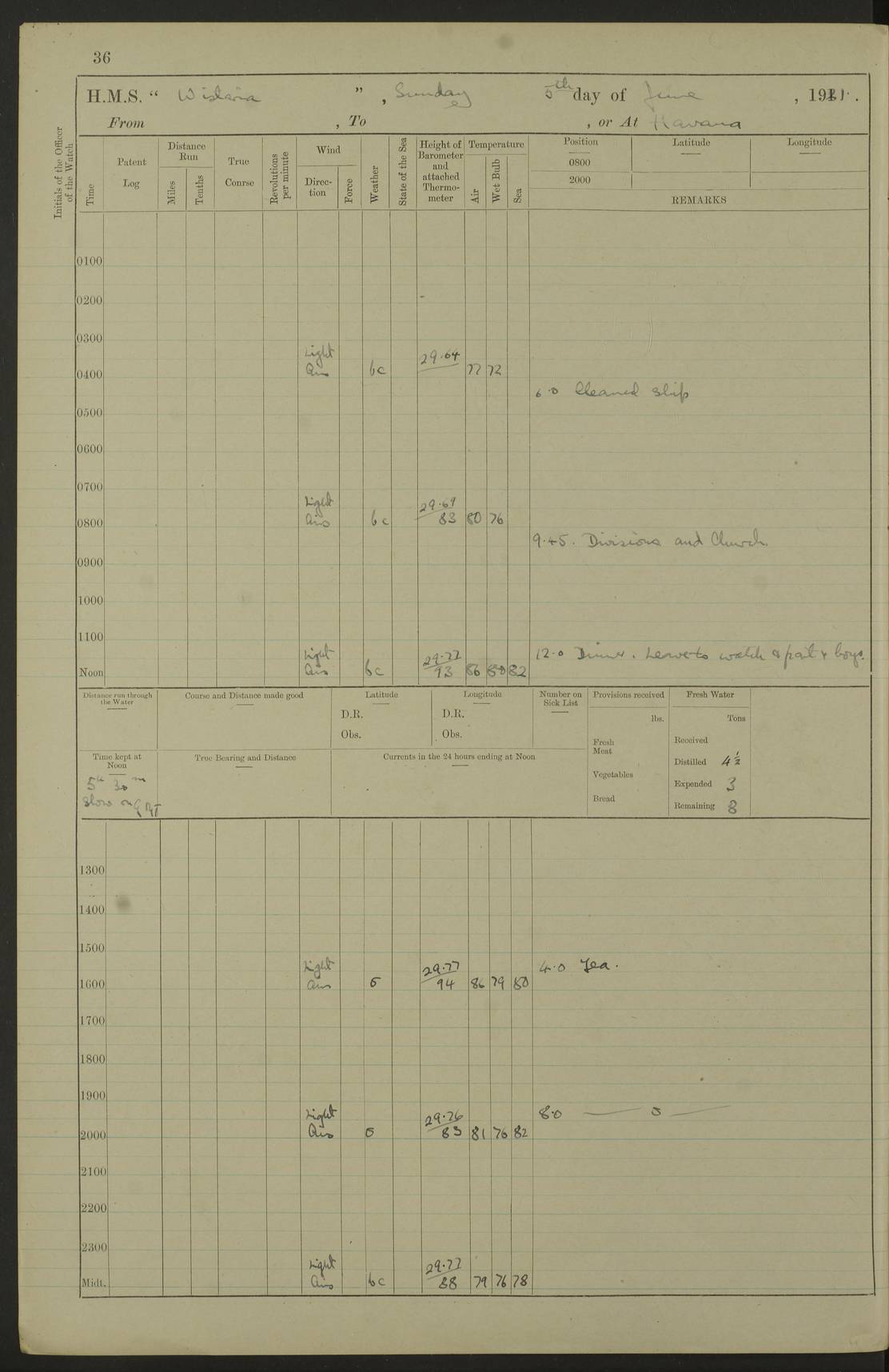 LOGS FOR JULY 1921 4f73ca38a2fc8ea903000a41: (https://s3.amazonaws.com:443/oldweather/ADM53-93262/0003_1.jpg) 1 July 1921 At Port Royal Lat 17.93, Long -76.83 8.15am: 1st whaler diving party. Clear up decks 9.30am: Ord. Seamen & boys muster bags. Remainder part of ship 1.45pm: Hands mustered for monthly payment 2.15pm: Diving party & side party employed. Rest part of ship 4f73ca38a2fc8ea903000a42: (https://s3.amazonaws.com:443/oldweather/ADM53-93262/0004_0.jpg) 2 July 1921 At Port Royal Lat 17.93, Long -76.83 8.15am: Cleaned ship 8.0pm: Concert party landed 8.45pm: Fire party landed 9.45pm: Fire party returned 10.40pm: Fire party landed 4f73ca39a2fc8ea903000a43: (https://s3.amazonaws.com:443/oldweather/ADM53-93262/0004_1.jpg) 3 July 1921 At Port Royal Lat 17.93, Long -76.83 6.30am: Cleaned ship 10.0am: Divisions Number on sick list: 2 4f73ca39a2fc8ea903000a44: (https://s3.amazonaws.com:443/oldweather/ADM53-93262/0005_0.jpg) 4 July 1921 At Port Royal Lat 17.93, Long -76.83 8.15am: Hands employed on boats & part of ship 2.0pm: Embarked 6” projectiles 10.30pm: Left harbour for Morant Cays. Course & speed as requisite 11.20pm: Dumped ammunition Number on sick list: 1 4f73ca39a2fc8ea903000a45: (https://s3.amazonaws.com:443/oldweather/ADM53-93262/0005_1.jpg) 5 July 1921 From Morant Cays-Port Royal to Port Royal-Morant Cays Lat 17.93, Long -76.83 6.20am: Sighted Morant Cays ahead 7.20am: Anchored and landed survey party am: Hands employed part of ship. Relief control parties exercised 10.40am: Weighed & proceeded 2.0pm: Hands employed chipping & painting boat deck & squaring off upper deck 3.10pm: Sighted Plum Point on Starboard bow 4.40pm: Stopped & manoeuvred as required for ship photograph to be taken 5.15pm: Secured alongside waling jetty. Leave to watch 4f73ca3aa2fc8ea903000a46: (https://s3.amazonaws.com:443/oldweather/ADM53-93262/0006_0.jpg) 6 July 1921 At Port Royal Lat 17.93, Long -76.83 9.25am: Hands employed parts of ship and six hands at small arm drill 2.0pm: Hands employed preparing ship for coaling 4.20pm: O.S. III Seabrook rejoined ship from hospital Number on sick list: 2 4f73ca3aa2fc8ea903000a47: (https://s3.amazonaws.com:443/oldweather/ADM53-93262/0006_1.jpg) 7 July 1921 At Port Royal Lat 17.93, Long -76.83 5.30am: Sanded decks 7.0am: Coaled ship with native labour 8.15am: Hands employed cleaning boats 11.20am: Finished coaling. Wash down & scrub upper deck Number on sick list: 4 4f73ca3aa2fc8ea903000a48: (https://s3.amazonaws.com:443/oldweather/ADM53-93262/0007_0.jpg) 8 July 1921 At Port Royal Lat 17.93, Long -76.83 8.15am: Hands employed cleaning paintwork & 3 hands about seine net 1.40pm: Starboard watch employed getting mine sweeping gear inboard 2.0pm: Port watch employed part of ship 3.0pm: Starboard watch employed part of ship 4.0pm: Tea. Ship put in quarantine 5.10pm: Surgeon McCallum left ship for military hospital Number on sick list: 1 [Surgeon McCallum: perhaps Surgeon Archie McCallum] 4f73ca3ba2fc8ea903000a49: (https://s3.amazonaws.com:443/oldweather/ADM53-93262/0007_1.jpg) 9 July 1921 At Port Royal Lat 17.93, Long -76.83 6.45am: Party left for isolation hospital to fumigate gear 11.50am: Air bedding 2.40pm: Bathing party landed 3.30pm: Bathing party returned 5.0pm: All hands vaccinated 4f73ca3ba2fc8ea903000a4a: (https://s3.amazonaws.com:443/oldweather/ADM53-93262/0008_0.jpg) 10 July 1921 At Port Royal Lat 17.93, Long -76.83 am: Parties sent to isolation hospital for fumigation 9.0am: Hands employed clearing mess decks & clearing up decks am: Parties sent for fumigation 1.0pm: All fumigation parties returned 5.15pm: Watch coaled picket boat Number on sick list: 1 4f73ca3ca2fc8ea903000a4b: (https://s3.amazonaws.com:443/oldweather/ADM53-93262/0008_1.jpg) 11 July 1921 From Port Royal to Bermuda and at Port Royal Lat 17.86, Long -76.63 8.15am: Furled forecastle awning 9.25am: Secured ship for sea 10.15am: Left Jetty 11.0am: Streamed patent log 11.01am: Plum Pt bearing N20E. Altered course S71E 3.15pm: Morant Pt bore N7W 3.30pm: Morant Pt bore N73W 6.45pm: Morant Pt bore S69W 9.35pm: Navassa Lt bearing S37E 10.32pm: Navassa Lt abeam 11.30pm: Navassa Lt bearing S24E True Bearing and Distance: Plum Pt Lt 294½°, 90 miles 4f73ca3ca2fc8ea903000a4c: (https://s3.amazonaws.com:443/oldweather/ADM53-93262/0009_0.jpg) 12 July 1921 From Port Royal to Bermuda Lat 20.18, Long -74.01 7.0am: Sighted Cuban mountains on Port bow 8.50am: Furled boat deck awning 9.35am: Exercised control parties, hands employed turning motor boats falls end for end, scarping & painting 2.0pm: Hands employed as forenoon 4.02pm: Sighted Great Inagua Lt Ho N48E 5.15pm: Course as required for re-charging telemotor system 5.38pm: Great Inagua Lt Ho abeam, 7 miles 6.30pm: N.W. Pt abeam, 1 mile True Bearing and Distance: Cape Maysi Lt Ho 299½°, 7¼ miles 4f73ca3ca2fc8ea903000a4d: (https://s3.amazonaws.com:443/oldweather/ADM53-93262/0009_1.jpg) 13 July 1921 From Port Royal to Bermuda Lat 23.13, Long -71.83 9.40am: Hands employed fitting new streaming light halliyards, scraping & cleaning part of ship 2.0pm: Hands employed scraping, painting & redleading parts of ship True Bearing and Distance: Gibbs Hill Lt Ho 034¼°, 672 miles 4f73ca3da2fc8ea903000a4e: (https://s3.amazonaws.com:443/oldweather/ADM53-93262/0010_0.jpg) 14 July 1921 From Port Royal to Bermuda Lat 25.91, Long -69.55 2.10am: Hauled in Patent log to clear it 2.15am: Log streamed 9.0am: Hauled in patent log 9.30am: Hands employed mustering bags & hammocks 2.0pm: Hands scrub hammocks 4.0pm: Evening Quarters. Exercised collision stations 5.0pm: Put clocks on 20 minutes True Bearing and Distance: Gibbs Hill Lt Ho 034°, 452 miles 4f73ca3da2fc8ea903000a4f: (https://s3.amazonaws.com:443/oldweather/ADM53-93262/0010_1.jpg) 15 July 1921 From Port Royal to Bermuda Lat 29.03, Long -67.18 9.40am: Exercised action stations. Fired one belt of ammunition from each pom pom 10.30am: Ord. Sea & boys to school. Pom Pom’s crews working about guns, remainders chip
