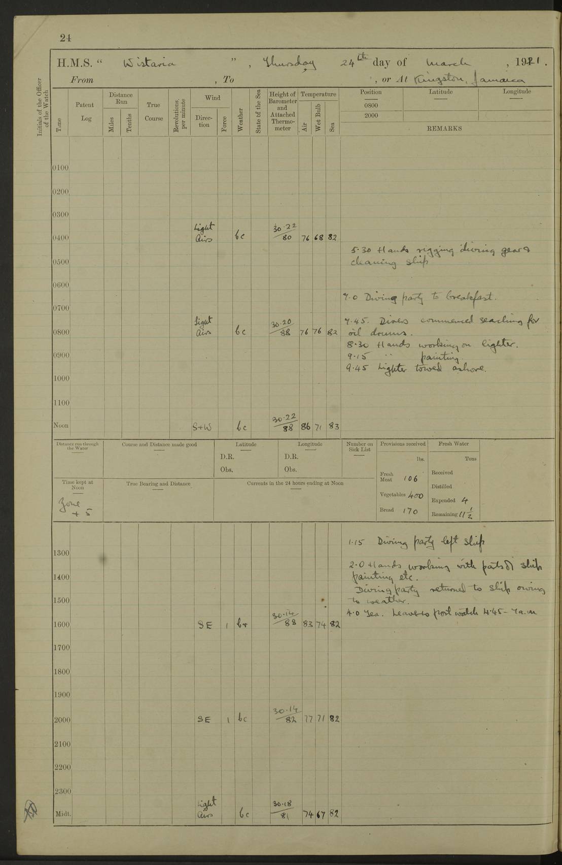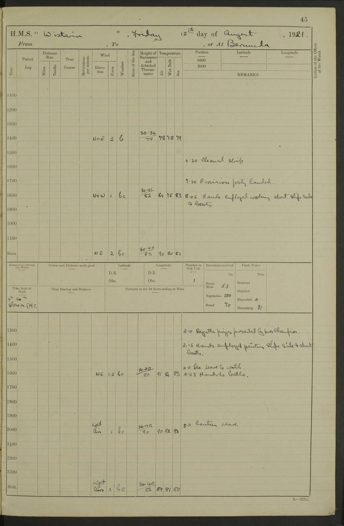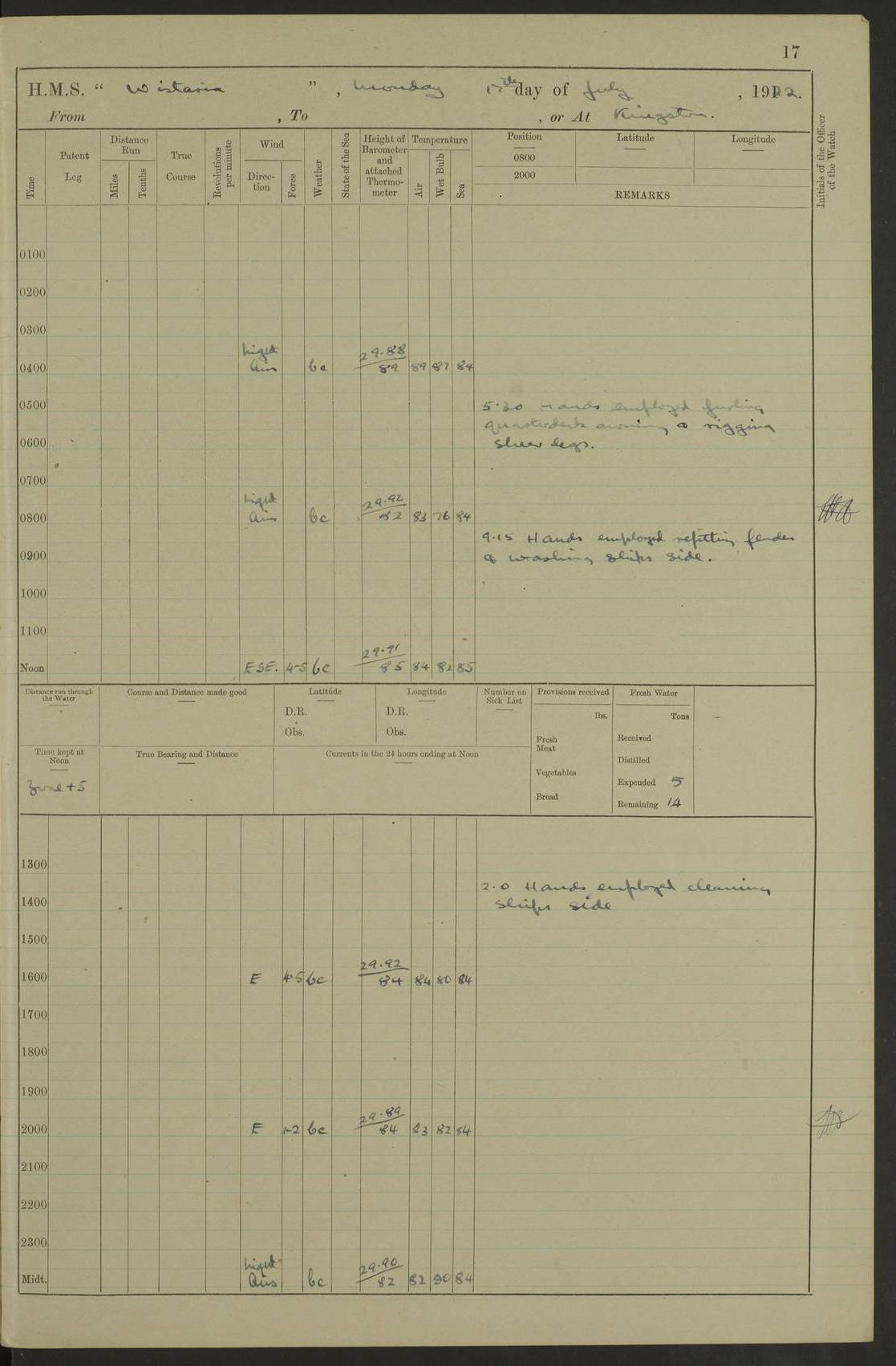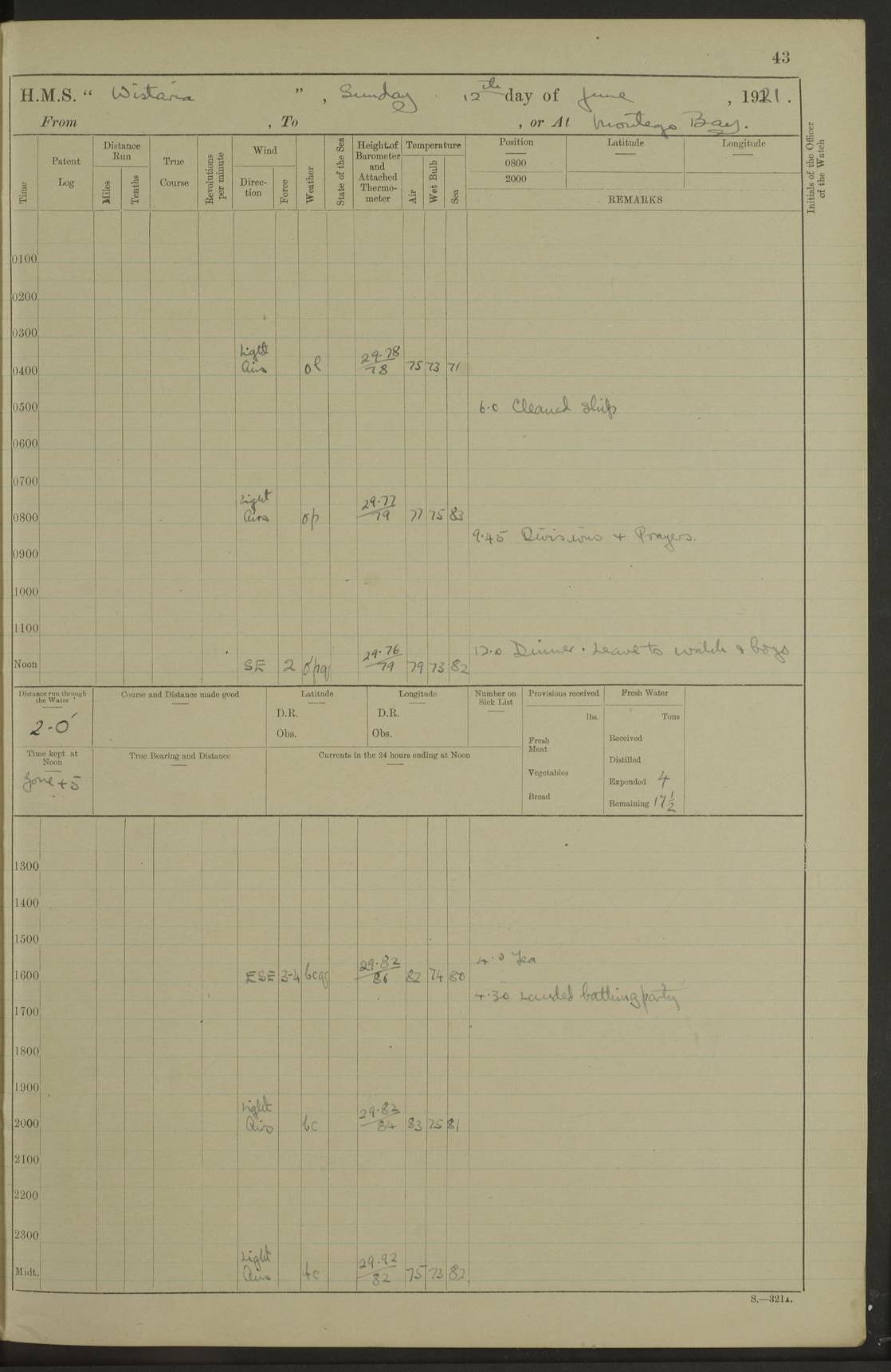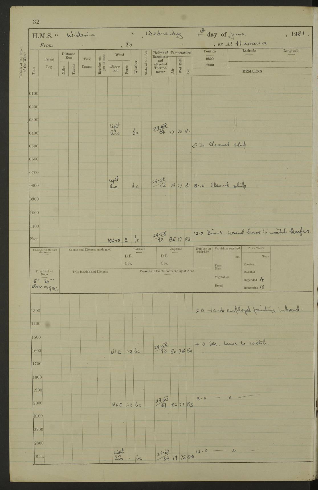 LOGS FOR JULY 1921 4f73ca38a2fc8ea903000a41: (https://s3.amazonaws.com:443/oldweather/ADM53-93262/0003_1.jpg) 1 July 1921 At Port Royal Lat 17.93, Long -76.83 8.15am: 1st whaler diving party. Clear up decks 9.30am: Ord. Seamen & boys muster bags. Remainder part of ship 1.45pm: Hands mustered for monthly payment 2.15pm: Diving party & side party employed. Rest part of ship 4f73ca38a2fc8ea903000a42: (https://s3.amazonaws.com:443/oldweather/ADM53-93262/0004_0.jpg) 2 July 1921 At Port Royal Lat 17.93, Long -76.83 8.15am: Cleaned ship 8.0pm: Concert party landed 8.45pm: Fire party landed 9.45pm: Fire party returned 10.40pm: Fire party landed 4f73ca39a2fc8ea903000a43: (https://s3.amazonaws.com:443/oldweather/ADM53-93262/0004_1.jpg) 3 July 1921 At Port Royal Lat 17.93, Long -76.83 6.30am: Cleaned ship 10.0am: Divisions Number on sick list: 2 4f73ca39a2fc8ea903000a44: (https://s3.amazonaws.com:443/oldweather/ADM53-93262/0005_0.jpg) 4 July 1921 At Port Royal Lat 17.93, Long -76.83 8.15am: Hands employed on boats & part of ship 2.0pm: Embarked 6” projectiles 10.30pm: Left harbour for Morant Cays. Course & speed as requisite 11.20pm: Dumped ammunition Number on sick list: 1 4f73ca39a2fc8ea903000a45: (https://s3.amazonaws.com:443/oldweather/ADM53-93262/0005_1.jpg) 5 July 1921 From Morant Cays-Port Royal to Port Royal-Morant Cays Lat 17.93, Long -76.83 6.20am: Sighted Morant Cays ahead 7.20am: Anchored and landed survey party am: Hands employed part of ship. Relief control parties exercised 10.40am: Weighed & proceeded 2.0pm: Hands employed chipping & painting boat deck & squaring off upper deck 3.10pm: Sighted Plum Point on Starboard bow 4.40pm: Stopped & manoeuvred as required for ship photograph to be taken 5.15pm: Secured alongside waling jetty. Leave to watch 4f73ca3aa2fc8ea903000a46: (https://s3.amazonaws.com:443/oldweather/ADM53-93262/0006_0.jpg) 6 July 1921 At Port Royal Lat 17.93, Long -76.83 9.25am: Hands employed parts of ship and six hands at small arm drill 2.0pm: Hands employed preparing ship for coaling 4.20pm: O.S. III Seabrook rejoined ship from hospital Number on sick list: 2 4f73ca3aa2fc8ea903000a47: (https://s3.amazonaws.com:443/oldweather/ADM53-93262/0006_1.jpg) 7 July 1921 At Port Royal Lat 17.93, Long -76.83 5.30am: Sanded decks 7.0am: Coaled ship with native labour 8.15am: Hands employed cleaning boats 11.20am: Finished coaling. Wash down & scrub upper deck Number on sick list: 4 4f73ca3aa2fc8ea903000a48: (https://s3.amazonaws.com:443/oldweather/ADM53-93262/0007_0.jpg) 8 July 1921 At Port Royal Lat 17.93, Long -76.83 8.15am: Hands employed cleaning paintwork & 3 hands about seine net 1.40pm: Starboard watch employed getting mine sweeping gear inboard 2.0pm: Port watch employed part of ship 3.0pm: Starboard watch employed part of ship 4.0pm: Tea. Ship put in quarantine 5.10pm: Surgeon McCallum left ship for military hospital Number on sick list: 1 [Surgeon McCallum: perhaps Surgeon Archie McCallum] 4f73ca3ba2fc8ea903000a49: (https://s3.amazonaws.com:443/oldweather/ADM53-93262/0007_1.jpg) 9 July 1921 At Port Royal Lat 17.93, Long -76.83 6.45am: Party left for isolation hospital to fumigate gear 11.50am: Air bedding 2.40pm: Bathing party landed 3.30pm: Bathing party returned 5.0pm: All hands vaccinated 4f73ca3ba2fc8ea903000a4a: (https://s3.amazonaws.com:443/oldweather/ADM53-93262/0008_0.jpg) 10 July 1921 At Port Royal Lat 17.93, Long -76.83 am: Parties sent to isolation hospital for fumigation 9.0am: Hands employed clearing mess decks & clearing up decks am: Parties sent for fumigation 1.0pm: All fumigation parties returned 5.15pm: Watch coaled picket boat Number on sick list: 1 4f73ca3ca2fc8ea903000a4b: (https://s3.amazonaws.com:443/oldweather/ADM53-93262/0008_1.jpg) 11 July 1921 From Port Royal to Bermuda and at Port Royal Lat 17.86, Long -76.63 8.15am: Furled forecastle awning 9.25am: Secured ship for sea 10.15am: Left Jetty 11.0am: Streamed patent log 11.01am: Plum Pt bearing N20E. Altered course S71E 3.15pm: Morant Pt bore N7W 3.30pm: Morant Pt bore N73W 6.45pm: Morant Pt bore S69W 9.35pm: Navassa Lt bearing S37E 10.32pm: Navassa Lt abeam 11.30pm: Navassa Lt bearing S24E True Bearing and Distance: Plum Pt Lt 294½°, 90 miles 4f73ca3ca2fc8ea903000a4c: (https://s3.amazonaws.com:443/oldweather/ADM53-93262/0009_0.jpg) 12 July 1921 From Port Royal to Bermuda Lat 20.18, Long -74.01 7.0am: Sighted Cuban mountains on Port bow 8.50am: Furled boat deck awning 9.35am: Exercised control parties, hands employed turning motor boats falls end for end, scarping & painting 2.0pm: Hands employed as forenoon 4.02pm: Sighted Great Inagua Lt Ho N48E 5.15pm: Course as required for re-charging telemotor system 5.38pm: Great Inagua Lt Ho abeam, 7 miles 6.30pm: N.W. Pt abeam, 1 mile True Bearing and Distance: Cape Maysi Lt Ho 299½°, 7¼ miles 4f73ca3ca2fc8ea903000a4d: (https://s3.amazonaws.com:443/oldweather/ADM53-93262/0009_1.jpg) 13 July 1921 From Port Royal to Bermuda Lat 23.13, Long -71.83 9.40am: Hands employed fitting new streaming light halliyards, scraping & cleaning part of ship 2.0pm: Hands employed scraping, painting & redleading parts of ship True Bearing and Distance: Gibbs Hill Lt Ho 034¼°, 672 miles 4f73ca3da2fc8ea903000a4e: (https://s3.amazonaws.com:443/oldweather/ADM53-93262/0010_0.jpg) 14 July 1921 From Port Royal to Bermuda Lat 25.91, Long -69.55 2.10am: Hauled in Patent log to clear it 2.15am: Log streamed 9.0am: Hauled in patent log 9.30am: Hands employed mustering bags & hammocks 2.0pm: Hands scrub hammocks 4.0pm: Evening Quarters. Exercised collision stations 5.0pm: Put clocks on 20 minutes True Bearing and Distance: Gibbs Hill Lt Ho 034°, 452 miles 4f73ca3da2fc8ea903000a4f: (https://s3.amazonaws.com:443/oldweather/ADM53-93262/0010_1.jpg) 15 July 1921 From Port Royal to Bermuda Lat 29.03, Long -67.18 9.40am: Exercised action stations. Fired one belt of ammunition from each pom pom 10.30am: Ord. Sea & boys to school. Pom Pom’s crews working about guns, remainders chip