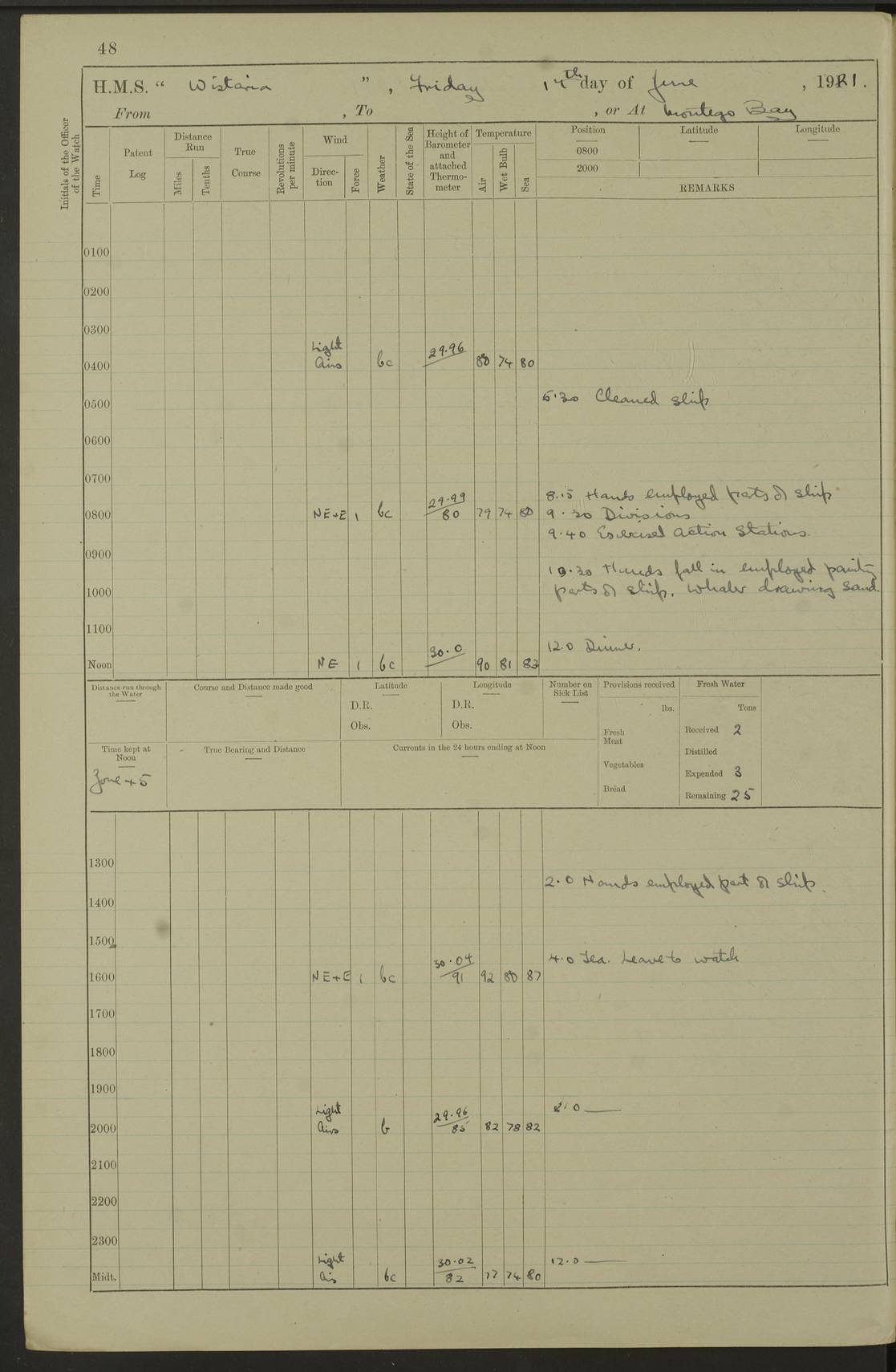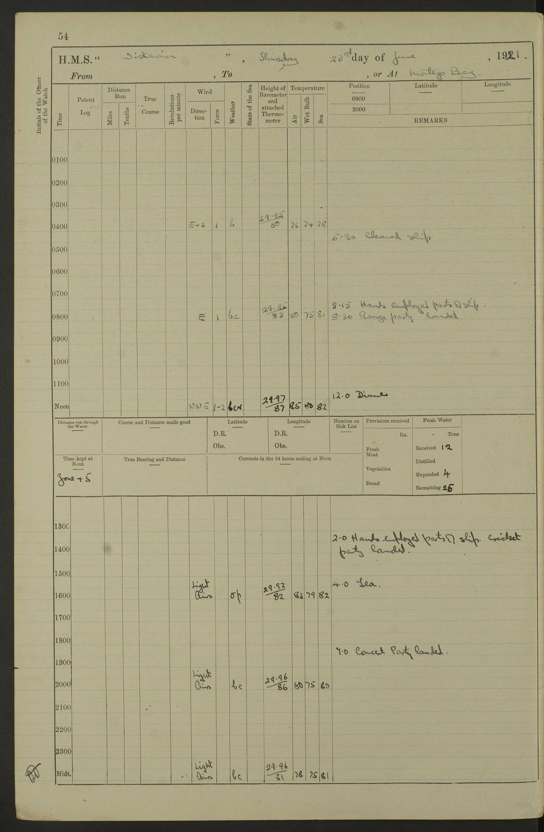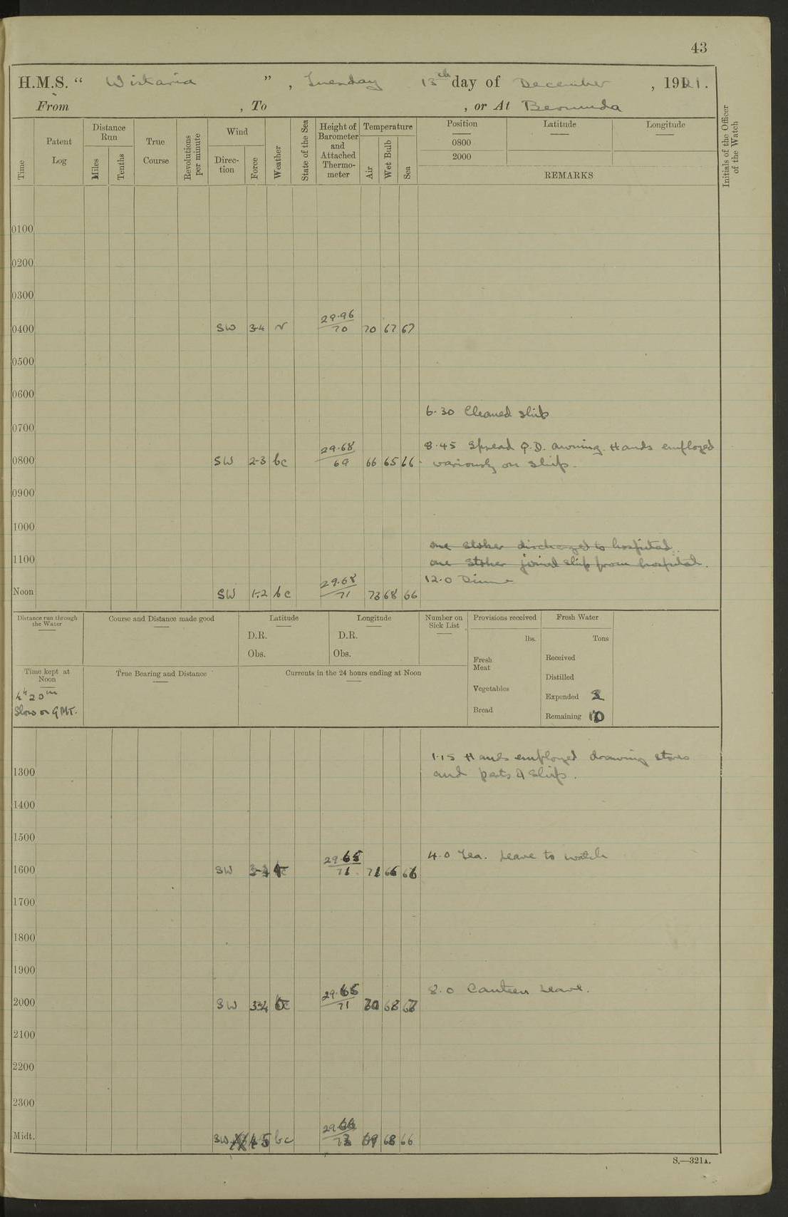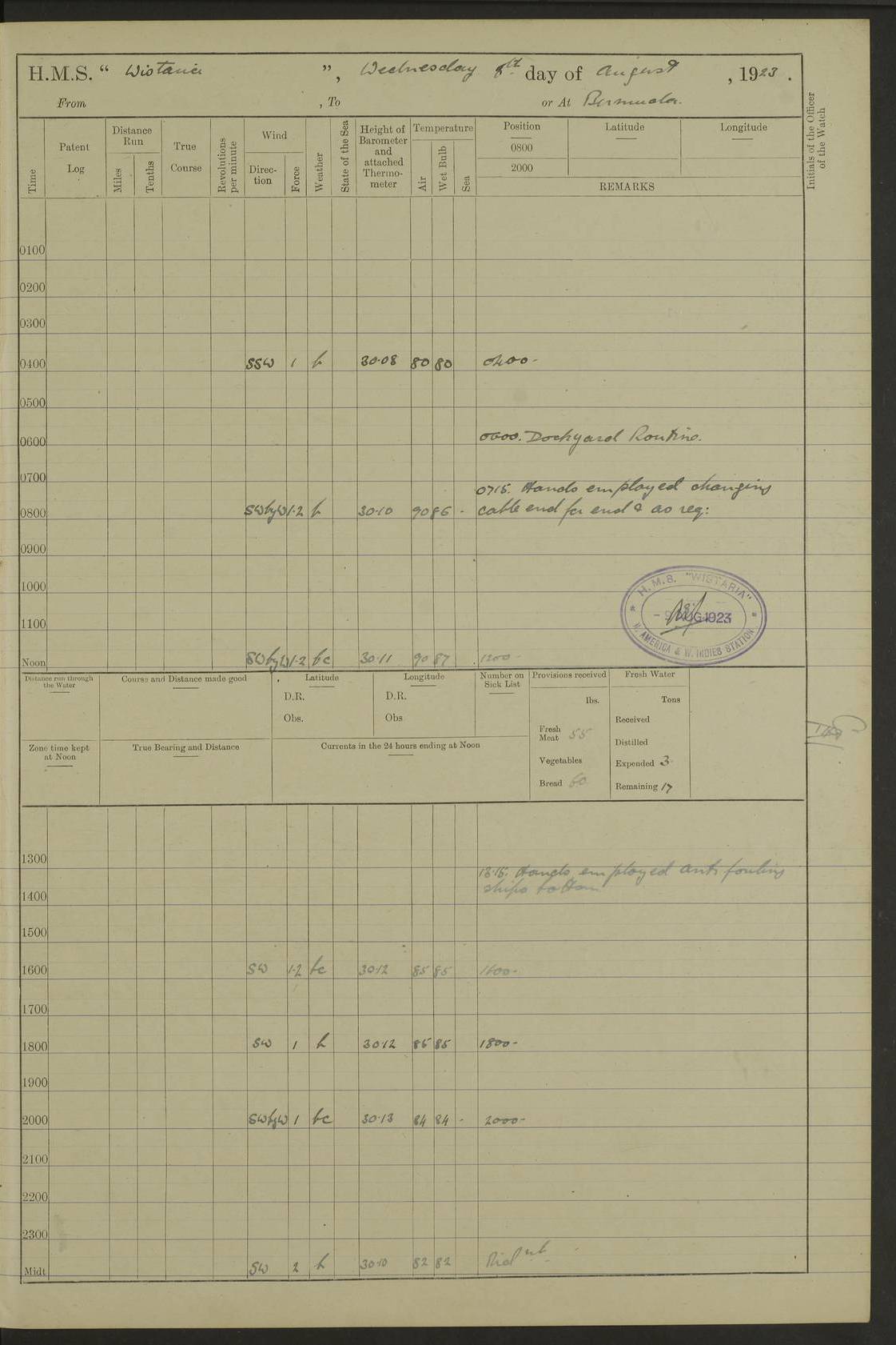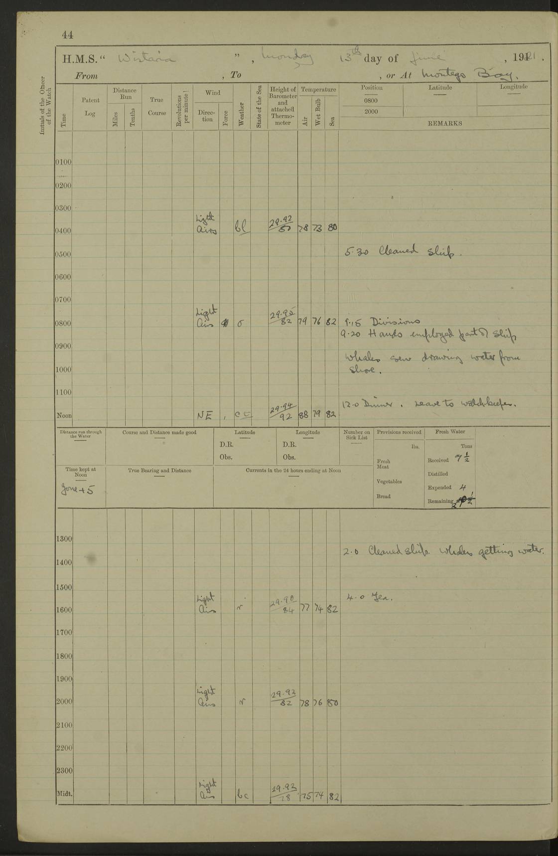 LOGS FOR JULY 1921 4f73ca38a2fc8ea903000a41: (https://s3.amazonaws.com:443/oldweather/ADM53-93262/0003_1.jpg) 1 July 1921 At Port Royal Lat 17.93, Long -76.83 8.15am: 1st whaler diving party. Clear up decks 9.30am: Ord. Seamen & boys muster bags. Remainder part of ship 1.45pm: Hands mustered for monthly payment 2.15pm: Diving party & side party employed. Rest part of ship 4f73ca38a2fc8ea903000a42: (https://s3.amazonaws.com:443/oldweather/ADM53-93262/0004_0.jpg) 2 July 1921 At Port Royal Lat 17.93, Long -76.83 8.15am: Cleaned ship 8.0pm: Concert party landed 8.45pm: Fire party landed 9.45pm: Fire party returned 10.40pm: Fire party landed 4f73ca39a2fc8ea903000a43: (https://s3.amazonaws.com:443/oldweather/ADM53-93262/0004_1.jpg) 3 July 1921 At Port Royal Lat 17.93, Long -76.83 6.30am: Cleaned ship 10.0am: Divisions Number on sick list: 2 4f73ca39a2fc8ea903000a44: (https://s3.amazonaws.com:443/oldweather/ADM53-93262/0005_0.jpg) 4 July 1921 At Port Royal Lat 17.93, Long -76.83 8.15am: Hands employed on boats & part of ship 2.0pm: Embarked 6” projectiles 10.30pm: Left harbour for Morant Cays. Course & speed as requisite 11.20pm: Dumped ammunition Number on sick list: 1 4f73ca39a2fc8ea903000a45: (https://s3.amazonaws.com:443/oldweather/ADM53-93262/0005_1.jpg) 5 July 1921 From Morant Cays-Port Royal to Port Royal-Morant Cays Lat 17.93, Long -76.83 6.20am: Sighted Morant Cays ahead 7.20am: Anchored and landed survey party am: Hands employed part of ship. Relief control parties exercised 10.40am: Weighed & proceeded 2.0pm: Hands employed chipping & painting boat deck & squaring off upper deck 3.10pm: Sighted Plum Point on Starboard bow 4.40pm: Stopped & manoeuvred as required for ship photograph to be taken 5.15pm: Secured alongside waling jetty. Leave to watch 4f73ca3aa2fc8ea903000a46: (https://s3.amazonaws.com:443/oldweather/ADM53-93262/0006_0.jpg) 6 July 1921 At Port Royal Lat 17.93, Long -76.83 9.25am: Hands employed parts of ship and six hands at small arm drill 2.0pm: Hands employed preparing ship for coaling 4.20pm: O.S. III Seabrook rejoined ship from hospital Number on sick list: 2 4f73ca3aa2fc8ea903000a47: (https://s3.amazonaws.com:443/oldweather/ADM53-93262/0006_1.jpg) 7 July 1921 At Port Royal Lat 17.93, Long -76.83 5.30am: Sanded decks 7.0am: Coaled ship with native labour 8.15am: Hands employed cleaning boats 11.20am: Finished coaling. Wash down & scrub upper deck Number on sick list: 4 4f73ca3aa2fc8ea903000a48: (https://s3.amazonaws.com:443/oldweather/ADM53-93262/0007_0.jpg) 8 July 1921 At Port Royal Lat 17.93, Long -76.83 8.15am: Hands employed cleaning paintwork & 3 hands about seine net 1.40pm: Starboard watch employed getting mine sweeping gear inboard 2.0pm: Port watch employed part of ship 3.0pm: Starboard watch employed part of ship 4.0pm: Tea. Ship put in quarantine 5.10pm: Surgeon McCallum left ship for military hospital Number on sick list: 1 [Surgeon McCallum: perhaps Surgeon Archie McCallum] 4f73ca3ba2fc8ea903000a49: (https://s3.amazonaws.com:443/oldweather/ADM53-93262/0007_1.jpg) 9 July 1921 At Port Royal Lat 17.93, Long -76.83 6.45am: Party left for isolation hospital to fumigate gear 11.50am: Air bedding 2.40pm: Bathing party landed 3.30pm: Bathing party returned 5.0pm: All hands vaccinated 4f73ca3ba2fc8ea903000a4a: (https://s3.amazonaws.com:443/oldweather/ADM53-93262/0008_0.jpg) 10 July 1921 At Port Royal Lat 17.93, Long -76.83 am: Parties sent to isolation hospital for fumigation 9.0am: Hands employed clearing mess decks & clearing up decks am: Parties sent for fumigation 1.0pm: All fumigation parties returned 5.15pm: Watch coaled picket boat Number on sick list: 1 4f73ca3ca2fc8ea903000a4b: (https://s3.amazonaws.com:443/oldweather/ADM53-93262/0008_1.jpg) 11 July 1921 From Port Royal to Bermuda and at Port Royal Lat 17.86, Long -76.63 8.15am: Furled forecastle awning 9.25am: Secured ship for sea 10.15am: Left Jetty 11.0am: Streamed patent log 11.01am: Plum Pt bearing N20E. Altered course S71E 3.15pm: Morant Pt bore N7W 3.30pm: Morant Pt bore N73W 6.45pm: Morant Pt bore S69W 9.35pm: Navassa Lt bearing S37E 10.32pm: Navassa Lt abeam 11.30pm: Navassa Lt bearing S24E True Bearing and Distance: Plum Pt Lt 294½°, 90 miles 4f73ca3ca2fc8ea903000a4c: (https://s3.amazonaws.com:443/oldweather/ADM53-93262/0009_0.jpg) 12 July 1921 From Port Royal to Bermuda Lat 20.18, Long -74.01 7.0am: Sighted Cuban mountains on Port bow 8.50am: Furled boat deck awning 9.35am: Exercised control parties, hands employed turning motor boats falls end for end, scarping & painting 2.0pm: Hands employed as forenoon 4.02pm: Sighted Great Inagua Lt Ho N48E 5.15pm: Course as required for re-charging telemotor system 5.38pm: Great Inagua Lt Ho abeam, 7 miles 6.30pm: N.W. Pt abeam, 1 mile True Bearing and Distance: Cape Maysi Lt Ho 299½°, 7¼ miles 4f73ca3ca2fc8ea903000a4d: (https://s3.amazonaws.com:443/oldweather/ADM53-93262/0009_1.jpg) 13 July 1921 From Port Royal to Bermuda Lat 23.13, Long -71.83 9.40am: Hands employed fitting new streaming light halliyards, scraping & cleaning part of ship 2.0pm: Hands employed scraping, painting & redleading parts of ship True Bearing and Distance: Gibbs Hill Lt Ho 034¼°, 672 miles 4f73ca3da2fc8ea903000a4e: (https://s3.amazonaws.com:443/oldweather/ADM53-93262/0010_0.jpg) 14 July 1921 From Port Royal to Bermuda Lat 25.91, Long -69.55 2.10am: Hauled in Patent log to clear it 2.15am: Log streamed 9.0am: Hauled in patent log 9.30am: Hands employed mustering bags & hammocks 2.0pm: Hands scrub hammocks 4.0pm: Evening Quarters. Exercised collision stations 5.0pm: Put clocks on 20 minutes True Bearing and Distance: Gibbs Hill Lt Ho 034°, 452 miles 4f73ca3da2fc8ea903000a4f: (https://s3.amazonaws.com:443/oldweather/ADM53-93262/0010_1.jpg) 15 July 1921 From Port Royal to Bermuda Lat 29.03, Long -67.18 9.40am: Exercised action stations. Fired one belt of ammunition from each pom pom 10.30am: Ord. Sea & boys to school. Pom Pom’s crews working about guns, remainders chip