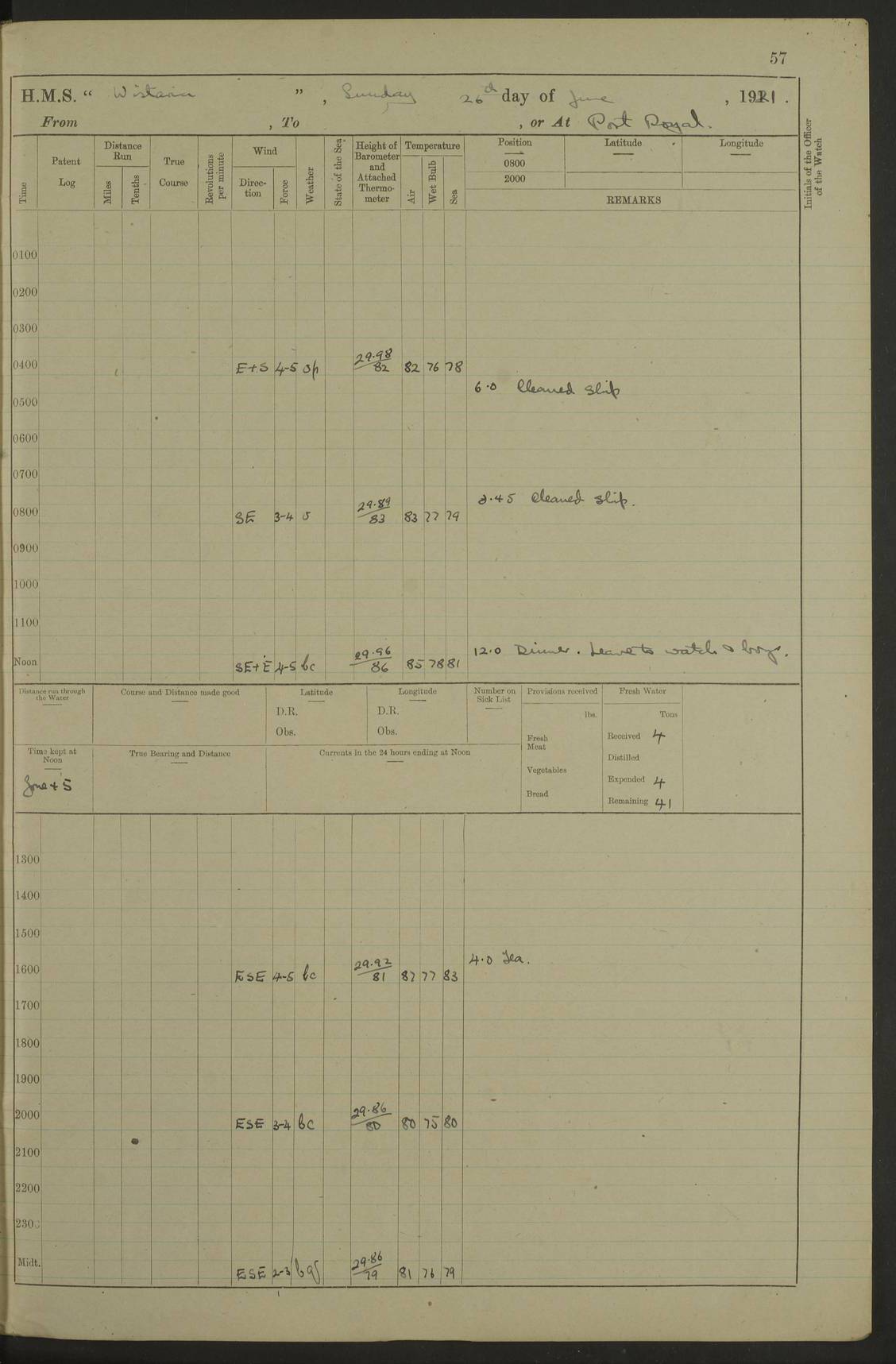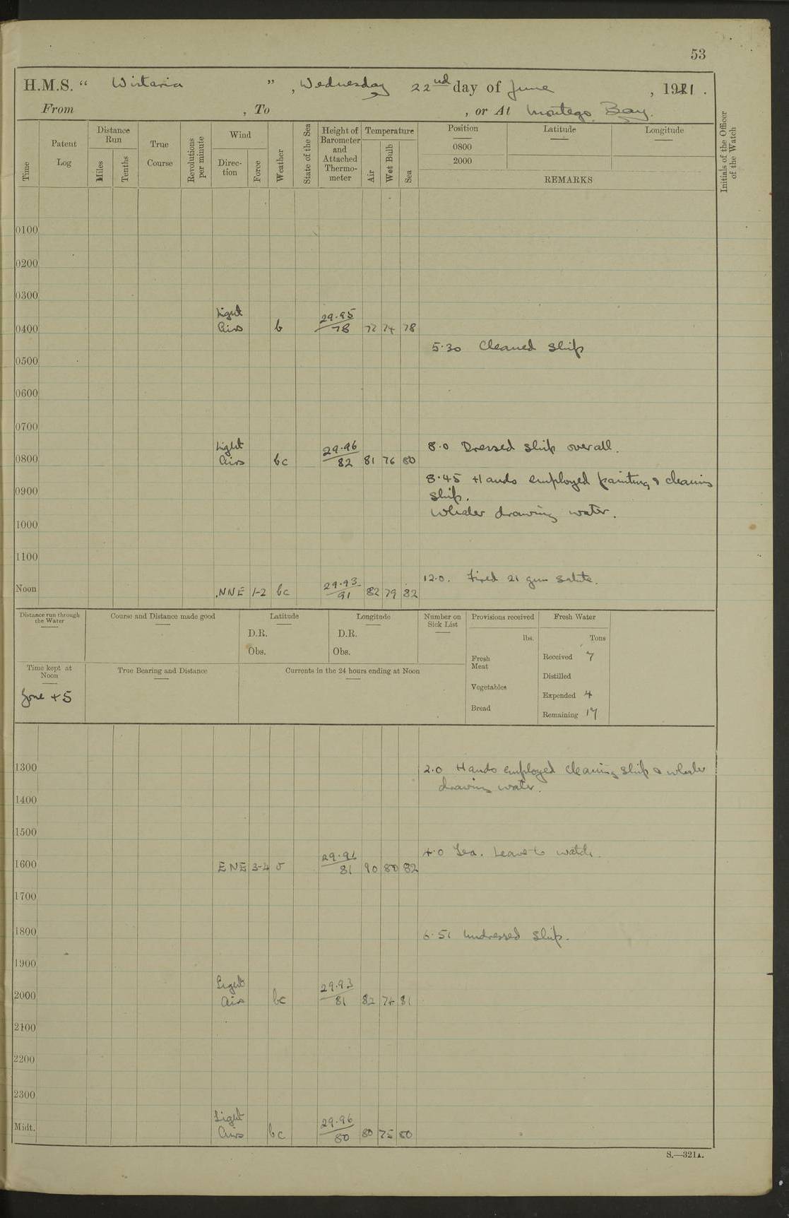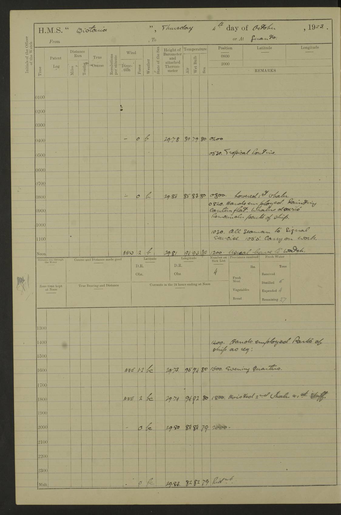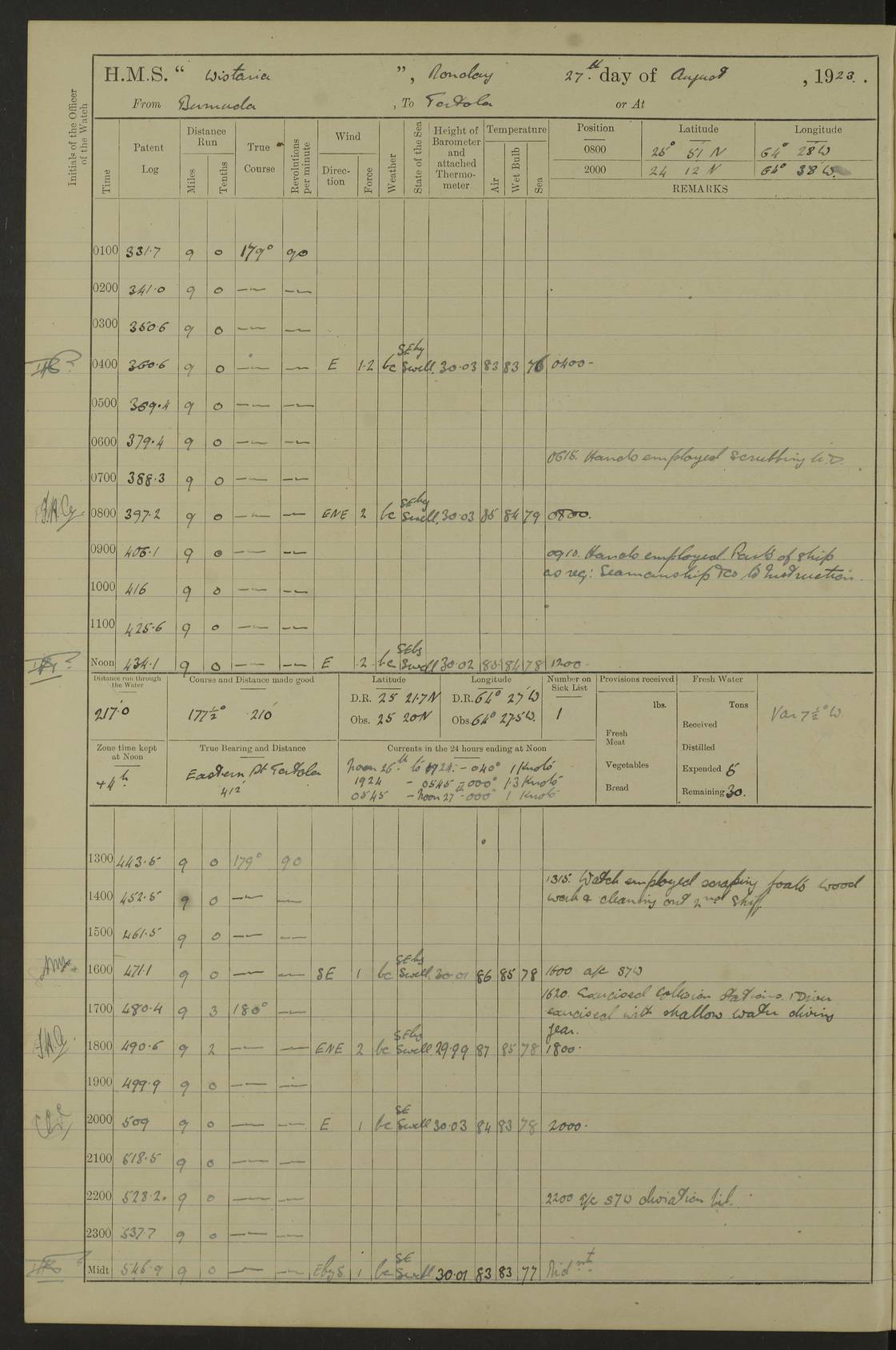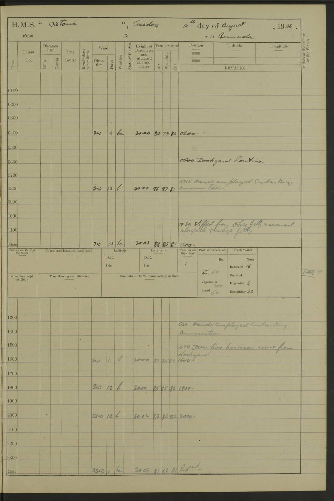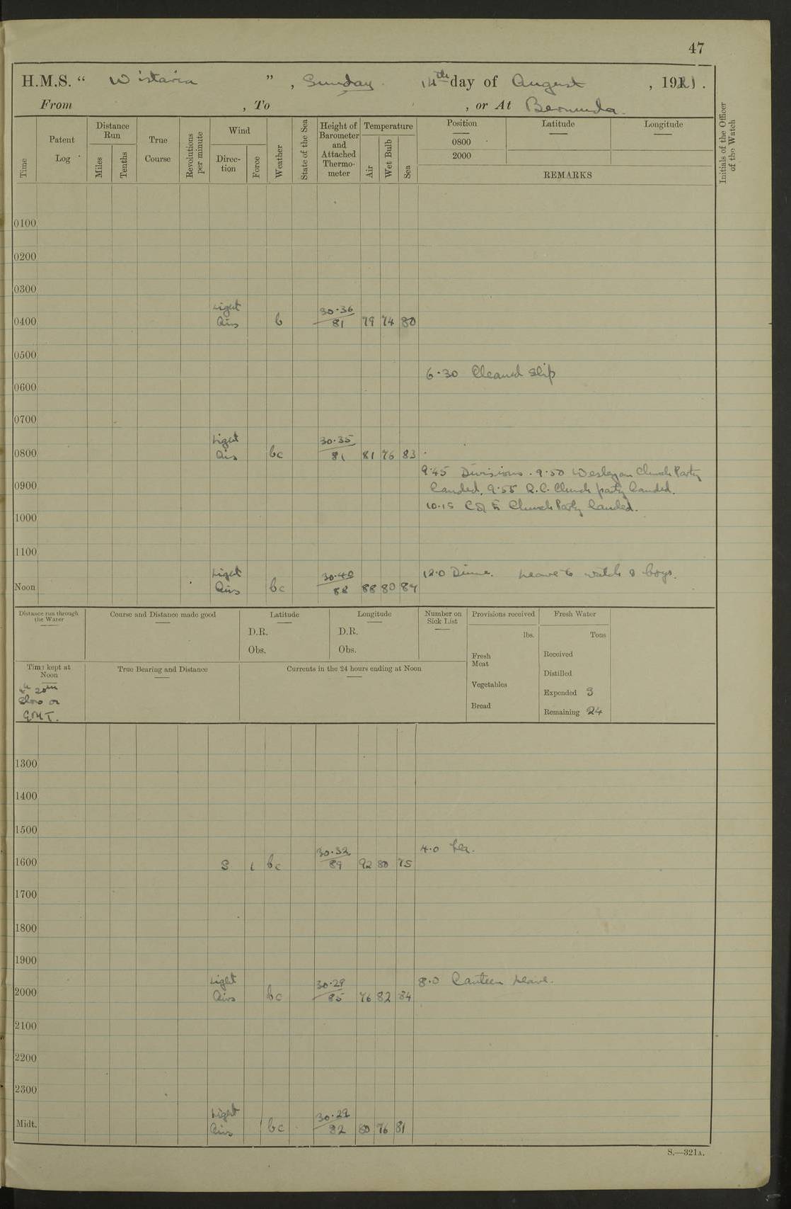 LOGS FOR JULY 1921 4f73ca38a2fc8ea903000a41: (https://s3.amazonaws.com:443/oldweather/ADM53-93262/0003_1.jpg) 1 July 1921 At Port Royal Lat 17.93, Long -76.83 8.15am: 1st whaler diving party. Clear up decks 9.30am: Ord. Seamen & boys muster bags. Remainder part of ship 1.45pm: Hands mustered for monthly payment 2.15pm: Diving party & side party employed. Rest part of ship 4f73ca38a2fc8ea903000a42: (https://s3.amazonaws.com:443/oldweather/ADM53-93262/0004_0.jpg) 2 July 1921 At Port Royal Lat 17.93, Long -76.83 8.15am: Cleaned ship 8.0pm: Concert party landed 8.45pm: Fire party landed 9.45pm: Fire party returned 10.40pm: Fire party landed 4f73ca39a2fc8ea903000a43: (https://s3.amazonaws.com:443/oldweather/ADM53-93262/0004_1.jpg) 3 July 1921 At Port Royal Lat 17.93, Long -76.83 6.30am: Cleaned ship 10.0am: Divisions Number on sick list: 2 4f73ca39a2fc8ea903000a44: (https://s3.amazonaws.com:443/oldweather/ADM53-93262/0005_0.jpg) 4 July 1921 At Port Royal Lat 17.93, Long -76.83 8.15am: Hands employed on boats & part of ship 2.0pm: Embarked 6” projectiles 10.30pm: Left harbour for Morant Cays. Course & speed as requisite 11.20pm: Dumped ammunition Number on sick list: 1 4f73ca39a2fc8ea903000a45: (https://s3.amazonaws.com:443/oldweather/ADM53-93262/0005_1.jpg) 5 July 1921 From Morant Cays-Port Royal to Port Royal-Morant Cays Lat 17.93, Long -76.83 6.20am: Sighted Morant Cays ahead 7.20am: Anchored and landed survey party am: Hands employed part of ship. Relief control parties exercised 10.40am: Weighed & proceeded 2.0pm: Hands employed chipping & painting boat deck & squaring off upper deck 3.10pm: Sighted Plum Point on Starboard bow 4.40pm: Stopped & manoeuvred as required for ship photograph to be taken 5.15pm: Secured alongside waling jetty. Leave to watch 4f73ca3aa2fc8ea903000a46: (https://s3.amazonaws.com:443/oldweather/ADM53-93262/0006_0.jpg) 6 July 1921 At Port Royal Lat 17.93, Long -76.83 9.25am: Hands employed parts of ship and six hands at small arm drill 2.0pm: Hands employed preparing ship for coaling 4.20pm: O.S. III Seabrook rejoined ship from hospital Number on sick list: 2 4f73ca3aa2fc8ea903000a47: (https://s3.amazonaws.com:443/oldweather/ADM53-93262/0006_1.jpg) 7 July 1921 At Port Royal Lat 17.93, Long -76.83 5.30am: Sanded decks 7.0am: Coaled ship with native labour 8.15am: Hands employed cleaning boats 11.20am: Finished coaling. Wash down & scrub upper deck Number on sick list: 4 4f73ca3aa2fc8ea903000a48: (https://s3.amazonaws.com:443/oldweather/ADM53-93262/0007_0.jpg) 8 July 1921 At Port Royal Lat 17.93, Long -76.83 8.15am: Hands employed cleaning paintwork & 3 hands about seine net 1.40pm: Starboard watch employed getting mine sweeping gear inboard 2.0pm: Port watch employed part of ship 3.0pm: Starboard watch employed part of ship 4.0pm: Tea. Ship put in quarantine 5.10pm: Surgeon McCallum left ship for military hospital Number on sick list: 1 [Surgeon McCallum: perhaps Surgeon Archie McCallum] 4f73ca3ba2fc8ea903000a49: (https://s3.amazonaws.com:443/oldweather/ADM53-93262/0007_1.jpg) 9 July 1921 At Port Royal Lat 17.93, Long -76.83 6.45am: Party left for isolation hospital to fumigate gear 11.50am: Air bedding 2.40pm: Bathing party landed 3.30pm: Bathing party returned 5.0pm: All hands vaccinated 4f73ca3ba2fc8ea903000a4a: (https://s3.amazonaws.com:443/oldweather/ADM53-93262/0008_0.jpg) 10 July 1921 At Port Royal Lat 17.93, Long -76.83 am: Parties sent to isolation hospital for fumigation 9.0am: Hands employed clearing mess decks & clearing up decks am: Parties sent for fumigation 1.0pm: All fumigation parties returned 5.15pm: Watch coaled picket boat Number on sick list: 1 4f73ca3ca2fc8ea903000a4b: (https://s3.amazonaws.com:443/oldweather/ADM53-93262/0008_1.jpg) 11 July 1921 From Port Royal to Bermuda and at Port Royal Lat 17.86, Long -76.63 8.15am: Furled forecastle awning 9.25am: Secured ship for sea 10.15am: Left Jetty 11.0am: Streamed patent log 11.01am: Plum Pt bearing N20E. Altered course S71E 3.15pm: Morant Pt bore N7W 3.30pm: Morant Pt bore N73W 6.45pm: Morant Pt bore S69W 9.35pm: Navassa Lt bearing S37E 10.32pm: Navassa Lt abeam 11.30pm: Navassa Lt bearing S24E True Bearing and Distance: Plum Pt Lt 294½°, 90 miles 4f73ca3ca2fc8ea903000a4c: (https://s3.amazonaws.com:443/oldweather/ADM53-93262/0009_0.jpg) 12 July 1921 From Port Royal to Bermuda Lat 20.18, Long -74.01 7.0am: Sighted Cuban mountains on Port bow 8.50am: Furled boat deck awning 9.35am: Exercised control parties, hands employed turning motor boats falls end for end, scarping & painting 2.0pm: Hands employed as forenoon 4.02pm: Sighted Great Inagua Lt Ho N48E 5.15pm: Course as required for re-charging telemotor system 5.38pm: Great Inagua Lt Ho abeam, 7 miles 6.30pm: N.W. Pt abeam, 1 mile True Bearing and Distance: Cape Maysi Lt Ho 299½°, 7¼ miles 4f73ca3ca2fc8ea903000a4d: (https://s3.amazonaws.com:443/oldweather/ADM53-93262/0009_1.jpg) 13 July 1921 From Port Royal to Bermuda Lat 23.13, Long -71.83 9.40am: Hands employed fitting new streaming light halliyards, scraping & cleaning part of ship 2.0pm: Hands employed scraping, painting & redleading parts of ship True Bearing and Distance: Gibbs Hill Lt Ho 034¼°, 672 miles 4f73ca3da2fc8ea903000a4e: (https://s3.amazonaws.com:443/oldweather/ADM53-93262/0010_0.jpg) 14 July 1921 From Port Royal to Bermuda Lat 25.91, Long -69.55 2.10am: Hauled in Patent log to clear it 2.15am: Log streamed 9.0am: Hauled in patent log 9.30am: Hands employed mustering bags & hammocks 2.0pm: Hands scrub hammocks 4.0pm: Evening Quarters. Exercised collision stations 5.0pm: Put clocks on 20 minutes True Bearing and Distance: Gibbs Hill Lt Ho 034°, 452 miles 4f73ca3da2fc8ea903000a4f: (https://s3.amazonaws.com:443/oldweather/ADM53-93262/0010_1.jpg) 15 July 1921 From Port Royal to Bermuda Lat 29.03, Long -67.18 9.40am: Exercised action stations. Fired one belt of ammunition from each pom pom 10.30am: Ord. Sea & boys to school. Pom Pom’s crews working about guns, remainders chip