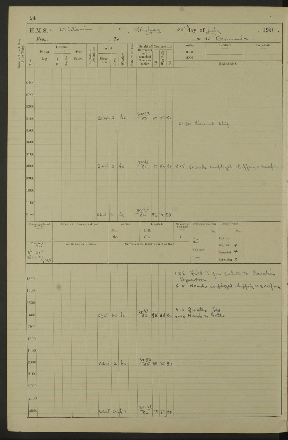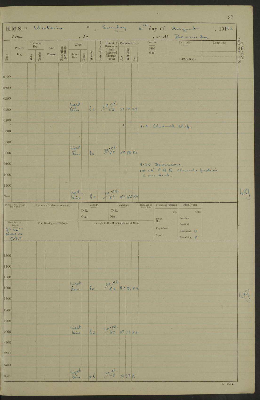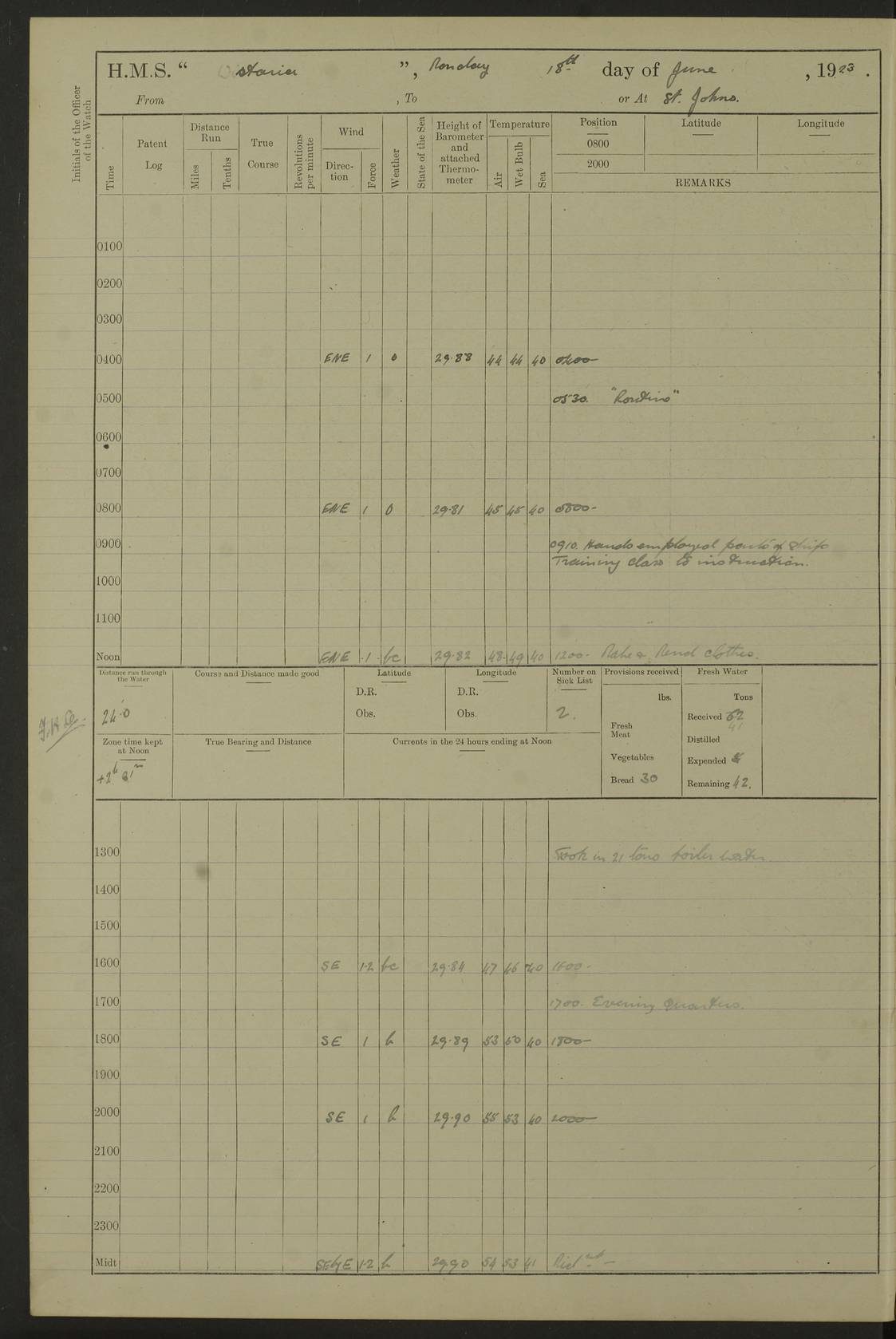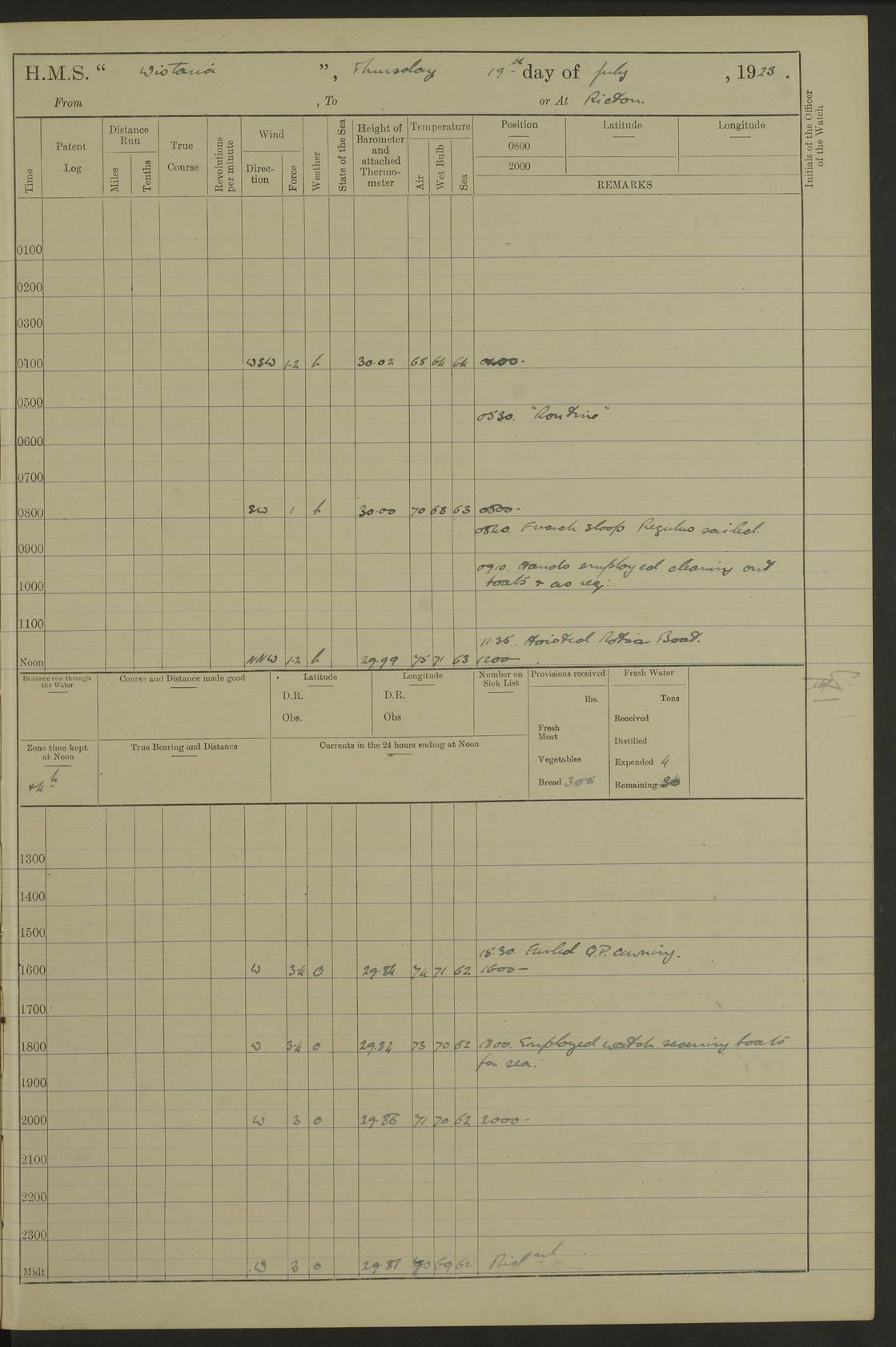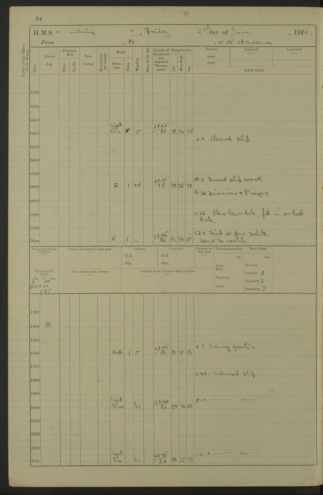 LOGS FOR JULY 1921 4f73ca38a2fc8ea903000a41: (https://s3.amazonaws.com:443/oldweather/ADM53-93262/0003_1.jpg) 1 July 1921 At Port Royal Lat 17.93, Long -76.83 8.15am: 1st whaler diving party. Clear up decks 9.30am: Ord. Seamen & boys muster bags. Remainder part of ship 1.45pm: Hands mustered for monthly payment 2.15pm: Diving party & side party employed. Rest part of ship 4f73ca38a2fc8ea903000a42: (https://s3.amazonaws.com:443/oldweather/ADM53-93262/0004_0.jpg) 2 July 1921 At Port Royal Lat 17.93, Long -76.83 8.15am: Cleaned ship 8.0pm: Concert party landed 8.45pm: Fire party landed 9.45pm: Fire party returned 10.40pm: Fire party landed 4f73ca39a2fc8ea903000a43: (https://s3.amazonaws.com:443/oldweather/ADM53-93262/0004_1.jpg) 3 July 1921 At Port Royal Lat 17.93, Long -76.83 6.30am: Cleaned ship 10.0am: Divisions Number on sick list: 2 4f73ca39a2fc8ea903000a44: (https://s3.amazonaws.com:443/oldweather/ADM53-93262/0005_0.jpg) 4 July 1921 At Port Royal Lat 17.93, Long -76.83 8.15am: Hands employed on boats & part of ship 2.0pm: Embarked 6” projectiles 10.30pm: Left harbour for Morant Cays. Course & speed as requisite 11.20pm: Dumped ammunition Number on sick list: 1 4f73ca39a2fc8ea903000a45: (https://s3.amazonaws.com:443/oldweather/ADM53-93262/0005_1.jpg) 5 July 1921 From Morant Cays-Port Royal to Port Royal-Morant Cays Lat 17.93, Long -76.83 6.20am: Sighted Morant Cays ahead 7.20am: Anchored and landed survey party am: Hands employed part of ship. Relief control parties exercised 10.40am: Weighed & proceeded 2.0pm: Hands employed chipping & painting boat deck & squaring off upper deck 3.10pm: Sighted Plum Point on Starboard bow 4.40pm: Stopped & manoeuvred as required for ship photograph to be taken 5.15pm: Secured alongside waling jetty. Leave to watch 4f73ca3aa2fc8ea903000a46: (https://s3.amazonaws.com:443/oldweather/ADM53-93262/0006_0.jpg) 6 July 1921 At Port Royal Lat 17.93, Long -76.83 9.25am: Hands employed parts of ship and six hands at small arm drill 2.0pm: Hands employed preparing ship for coaling 4.20pm: O.S. III Seabrook rejoined ship from hospital Number on sick list: 2 4f73ca3aa2fc8ea903000a47: (https://s3.amazonaws.com:443/oldweather/ADM53-93262/0006_1.jpg) 7 July 1921 At Port Royal Lat 17.93, Long -76.83 5.30am: Sanded decks 7.0am: Coaled ship with native labour 8.15am: Hands employed cleaning boats 11.20am: Finished coaling. Wash down & scrub upper deck Number on sick list: 4 4f73ca3aa2fc8ea903000a48: (https://s3.amazonaws.com:443/oldweather/ADM53-93262/0007_0.jpg) 8 July 1921 At Port Royal Lat 17.93, Long -76.83 8.15am: Hands employed cleaning paintwork & 3 hands about seine net 1.40pm: Starboard watch employed getting mine sweeping gear inboard 2.0pm: Port watch employed part of ship 3.0pm: Starboard watch employed part of ship 4.0pm: Tea. Ship put in quarantine 5.10pm: Surgeon McCallum left ship for military hospital Number on sick list: 1 [Surgeon McCallum: perhaps Surgeon Archie McCallum] 4f73ca3ba2fc8ea903000a49: (https://s3.amazonaws.com:443/oldweather/ADM53-93262/0007_1.jpg) 9 July 1921 At Port Royal Lat 17.93, Long -76.83 6.45am: Party left for isolation hospital to fumigate gear 11.50am: Air bedding 2.40pm: Bathing party landed 3.30pm: Bathing party returned 5.0pm: All hands vaccinated 4f73ca3ba2fc8ea903000a4a: (https://s3.amazonaws.com:443/oldweather/ADM53-93262/0008_0.jpg) 10 July 1921 At Port Royal Lat 17.93, Long -76.83 am: Parties sent to isolation hospital for fumigation 9.0am: Hands employed clearing mess decks & clearing up decks am: Parties sent for fumigation 1.0pm: All fumigation parties returned 5.15pm: Watch coaled picket boat Number on sick list: 1 4f73ca3ca2fc8ea903000a4b: (https://s3.amazonaws.com:443/oldweather/ADM53-93262/0008_1.jpg) 11 July 1921 From Port Royal to Bermuda and at Port Royal Lat 17.86, Long -76.63 8.15am: Furled forecastle awning 9.25am: Secured ship for sea 10.15am: Left Jetty 11.0am: Streamed patent log 11.01am: Plum Pt bearing N20E. Altered course S71E 3.15pm: Morant Pt bore N7W 3.30pm: Morant Pt bore N73W 6.45pm: Morant Pt bore S69W 9.35pm: Navassa Lt bearing S37E 10.32pm: Navassa Lt abeam 11.30pm: Navassa Lt bearing S24E True Bearing and Distance: Plum Pt Lt 294½°, 90 miles 4f73ca3ca2fc8ea903000a4c: (https://s3.amazonaws.com:443/oldweather/ADM53-93262/0009_0.jpg) 12 July 1921 From Port Royal to Bermuda Lat 20.18, Long -74.01 7.0am: Sighted Cuban mountains on Port bow 8.50am: Furled boat deck awning 9.35am: Exercised control parties, hands employed turning motor boats falls end for end, scarping & painting 2.0pm: Hands employed as forenoon 4.02pm: Sighted Great Inagua Lt Ho N48E 5.15pm: Course as required for re-charging telemotor system 5.38pm: Great Inagua Lt Ho abeam, 7 miles 6.30pm: N.W. Pt abeam, 1 mile True Bearing and Distance: Cape Maysi Lt Ho 299½°, 7¼ miles 4f73ca3ca2fc8ea903000a4d: (https://s3.amazonaws.com:443/oldweather/ADM53-93262/0009_1.jpg) 13 July 1921 From Port Royal to Bermuda Lat 23.13, Long -71.83 9.40am: Hands employed fitting new streaming light halliyards, scraping & cleaning part of ship 2.0pm: Hands employed scraping, painting & redleading parts of ship True Bearing and Distance: Gibbs Hill Lt Ho 034¼°, 672 miles 4f73ca3da2fc8ea903000a4e: (https://s3.amazonaws.com:443/oldweather/ADM53-93262/0010_0.jpg) 14 July 1921 From Port Royal to Bermuda Lat 25.91, Long -69.55 2.10am: Hauled in Patent log to clear it 2.15am: Log streamed 9.0am: Hauled in patent log 9.30am: Hands employed mustering bags & hammocks 2.0pm: Hands scrub hammocks 4.0pm: Evening Quarters. Exercised collision stations 5.0pm: Put clocks on 20 minutes True Bearing and Distance: Gibbs Hill Lt Ho 034°, 452 miles 4f73ca3da2fc8ea903000a4f: (https://s3.amazonaws.com:443/oldweather/ADM53-93262/0010_1.jpg) 15 July 1921 From Port Royal to Bermuda Lat 29.03, Long -67.18 9.40am: Exercised action stations. Fired one belt of ammunition from each pom pom 10.30am: Ord. Sea & boys to school. Pom Pom’s crews working about guns, remainders chip