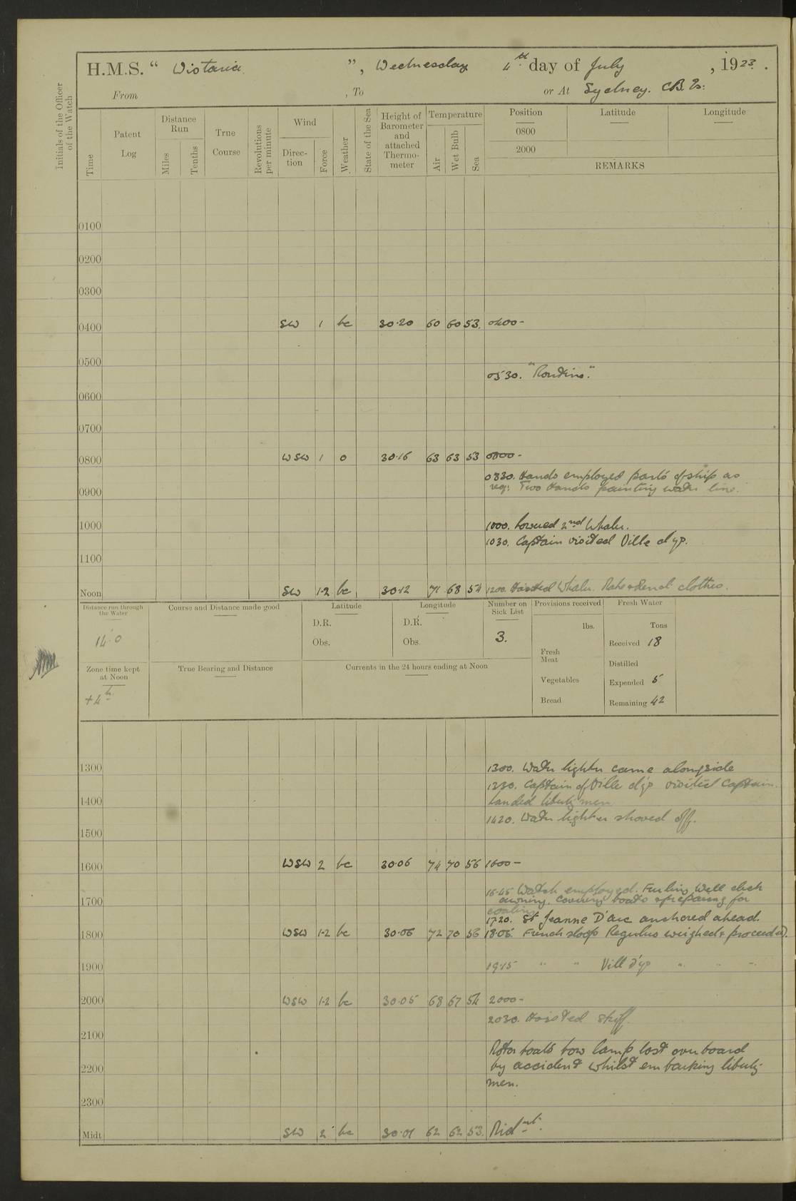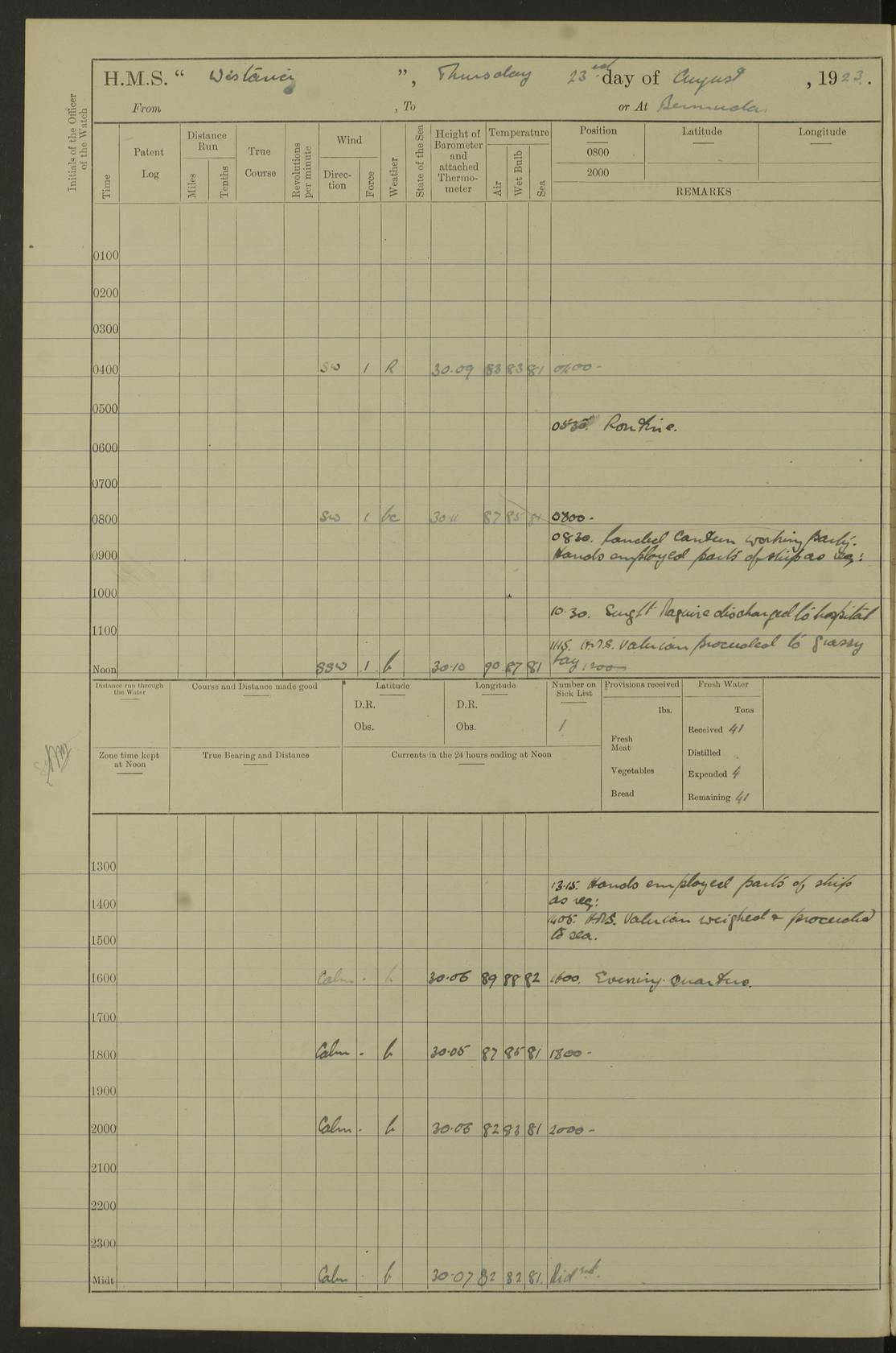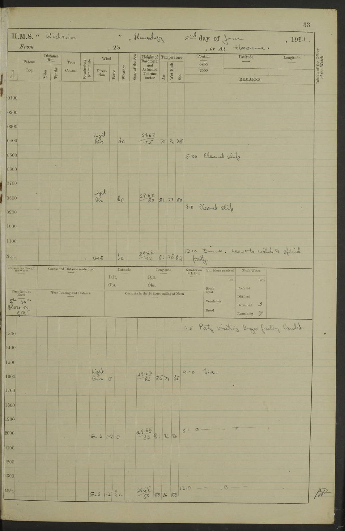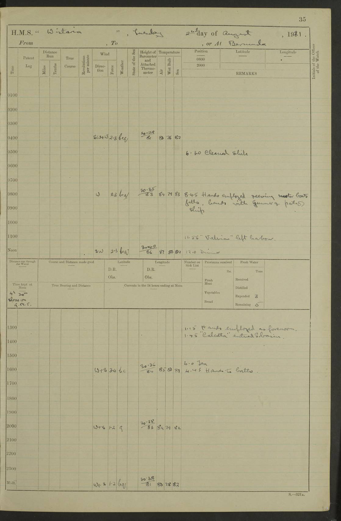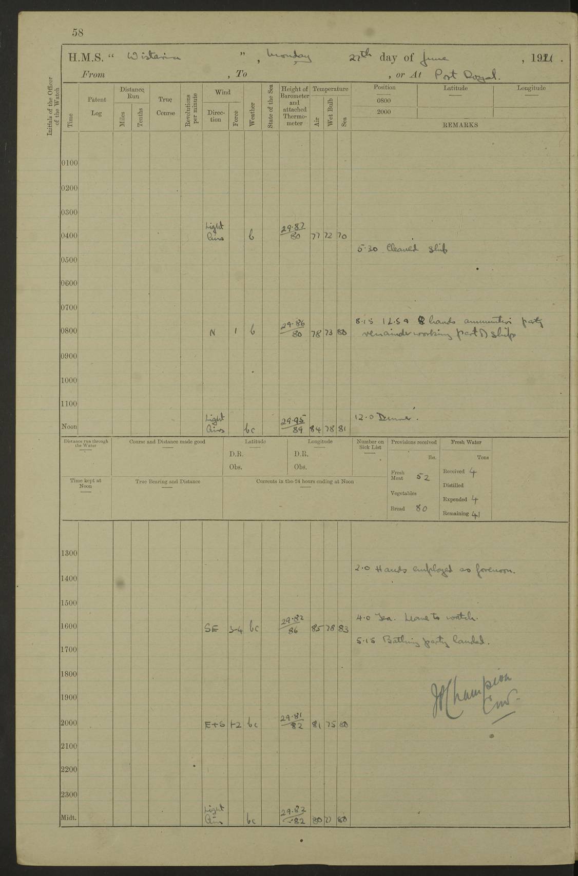 LOGS FOR JULY 1921 4f73ca38a2fc8ea903000a41: (https://s3.amazonaws.com:443/oldweather/ADM53-93262/0003_1.jpg) 1 July 1921 At Port Royal Lat 17.93, Long -76.83 8.15am: 1st whaler diving party. Clear up decks 9.30am: Ord. Seamen & boys muster bags. Remainder part of ship 1.45pm: Hands mustered for monthly payment 2.15pm: Diving party & side party employed. Rest part of ship 4f73ca38a2fc8ea903000a42: (https://s3.amazonaws.com:443/oldweather/ADM53-93262/0004_0.jpg) 2 July 1921 At Port Royal Lat 17.93, Long -76.83 8.15am: Cleaned ship 8.0pm: Concert party landed 8.45pm: Fire party landed 9.45pm: Fire party returned 10.40pm: Fire party landed 4f73ca39a2fc8ea903000a43: (https://s3.amazonaws.com:443/oldweather/ADM53-93262/0004_1.jpg) 3 July 1921 At Port Royal Lat 17.93, Long -76.83 6.30am: Cleaned ship 10.0am: Divisions Number on sick list: 2 4f73ca39a2fc8ea903000a44: (https://s3.amazonaws.com:443/oldweather/ADM53-93262/0005_0.jpg) 4 July 1921 At Port Royal Lat 17.93, Long -76.83 8.15am: Hands employed on boats & part of ship 2.0pm: Embarked 6” projectiles 10.30pm: Left harbour for Morant Cays. Course & speed as requisite 11.20pm: Dumped ammunition Number on sick list: 1 4f73ca39a2fc8ea903000a45: (https://s3.amazonaws.com:443/oldweather/ADM53-93262/0005_1.jpg) 5 July 1921 From Morant Cays-Port Royal to Port Royal-Morant Cays Lat 17.93, Long -76.83 6.20am: Sighted Morant Cays ahead 7.20am: Anchored and landed survey party am: Hands employed part of ship. Relief control parties exercised 10.40am: Weighed & proceeded 2.0pm: Hands employed chipping & painting boat deck & squaring off upper deck 3.10pm: Sighted Plum Point on Starboard bow 4.40pm: Stopped & manoeuvred as required for ship photograph to be taken 5.15pm: Secured alongside waling jetty. Leave to watch 4f73ca3aa2fc8ea903000a46: (https://s3.amazonaws.com:443/oldweather/ADM53-93262/0006_0.jpg) 6 July 1921 At Port Royal Lat 17.93, Long -76.83 9.25am: Hands employed parts of ship and six hands at small arm drill 2.0pm: Hands employed preparing ship for coaling 4.20pm: O.S. III Seabrook rejoined ship from hospital Number on sick list: 2 4f73ca3aa2fc8ea903000a47: (https://s3.amazonaws.com:443/oldweather/ADM53-93262/0006_1.jpg) 7 July 1921 At Port Royal Lat 17.93, Long -76.83 5.30am: Sanded decks 7.0am: Coaled ship with native labour 8.15am: Hands employed cleaning boats 11.20am: Finished coaling. Wash down & scrub upper deck Number on sick list: 4 4f73ca3aa2fc8ea903000a48: (https://s3.amazonaws.com:443/oldweather/ADM53-93262/0007_0.jpg) 8 July 1921 At Port Royal Lat 17.93, Long -76.83 8.15am: Hands employed cleaning paintwork & 3 hands about seine net 1.40pm: Starboard watch employed getting mine sweeping gear inboard 2.0pm: Port watch employed part of ship 3.0pm: Starboard watch employed part of ship 4.0pm: Tea. Ship put in quarantine 5.10pm: Surgeon McCallum left ship for military hospital Number on sick list: 1 [Surgeon McCallum: perhaps Surgeon Archie McCallum] 4f73ca3ba2fc8ea903000a49: (https://s3.amazonaws.com:443/oldweather/ADM53-93262/0007_1.jpg) 9 July 1921 At Port Royal Lat 17.93, Long -76.83 6.45am: Party left for isolation hospital to fumigate gear 11.50am: Air bedding 2.40pm: Bathing party landed 3.30pm: Bathing party returned 5.0pm: All hands vaccinated 4f73ca3ba2fc8ea903000a4a: (https://s3.amazonaws.com:443/oldweather/ADM53-93262/0008_0.jpg) 10 July 1921 At Port Royal Lat 17.93, Long -76.83 am: Parties sent to isolation hospital for fumigation 9.0am: Hands employed clearing mess decks & clearing up decks am: Parties sent for fumigation 1.0pm: All fumigation parties returned 5.15pm: Watch coaled picket boat Number on sick list: 1 4f73ca3ca2fc8ea903000a4b: (https://s3.amazonaws.com:443/oldweather/ADM53-93262/0008_1.jpg) 11 July 1921 From Port Royal to Bermuda and at Port Royal Lat 17.86, Long -76.63 8.15am: Furled forecastle awning 9.25am: Secured ship for sea 10.15am: Left Jetty 11.0am: Streamed patent log 11.01am: Plum Pt bearing N20E. Altered course S71E 3.15pm: Morant Pt bore N7W 3.30pm: Morant Pt bore N73W 6.45pm: Morant Pt bore S69W 9.35pm: Navassa Lt bearing S37E 10.32pm: Navassa Lt abeam 11.30pm: Navassa Lt bearing S24E True Bearing and Distance: Plum Pt Lt 294½°, 90 miles 4f73ca3ca2fc8ea903000a4c: (https://s3.amazonaws.com:443/oldweather/ADM53-93262/0009_0.jpg) 12 July 1921 From Port Royal to Bermuda Lat 20.18, Long -74.01 7.0am: Sighted Cuban mountains on Port bow 8.50am: Furled boat deck awning 9.35am: Exercised control parties, hands employed turning motor boats falls end for end, scarping & painting 2.0pm: Hands employed as forenoon 4.02pm: Sighted Great Inagua Lt Ho N48E 5.15pm: Course as required for re-charging telemotor system 5.38pm: Great Inagua Lt Ho abeam, 7 miles 6.30pm: N.W. Pt abeam, 1 mile True Bearing and Distance: Cape Maysi Lt Ho 299½°, 7¼ miles 4f73ca3ca2fc8ea903000a4d: (https://s3.amazonaws.com:443/oldweather/ADM53-93262/0009_1.jpg) 13 July 1921 From Port Royal to Bermuda Lat 23.13, Long -71.83 9.40am: Hands employed fitting new streaming light halliyards, scraping & cleaning part of ship 2.0pm: Hands employed scraping, painting & redleading parts of ship True Bearing and Distance: Gibbs Hill Lt Ho 034¼°, 672 miles 4f73ca3da2fc8ea903000a4e: (https://s3.amazonaws.com:443/oldweather/ADM53-93262/0010_0.jpg) 14 July 1921 From Port Royal to Bermuda Lat 25.91, Long -69.55 2.10am: Hauled in Patent log to clear it 2.15am: Log streamed 9.0am: Hauled in patent log 9.30am: Hands employed mustering bags & hammocks 2.0pm: Hands scrub hammocks 4.0pm: Evening Quarters. Exercised collision stations 5.0pm: Put clocks on 20 minutes True Bearing and Distance: Gibbs Hill Lt Ho 034°, 452 miles 4f73ca3da2fc8ea903000a4f: (https://s3.amazonaws.com:443/oldweather/ADM53-93262/0010_1.jpg) 15 July 1921 From Port Royal to Bermuda Lat 29.03, Long -67.18 9.40am: Exercised action stations. Fired one belt of ammunition from each pom pom 10.30am: Ord. Sea & boys to school. Pom Pom’s crews working about guns, remainders chip