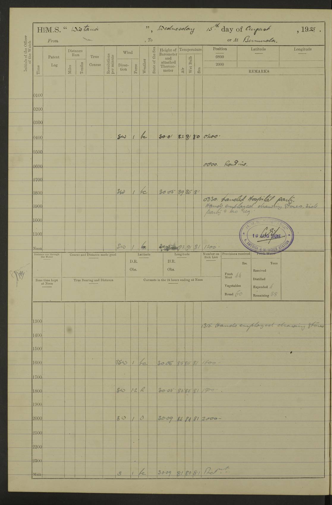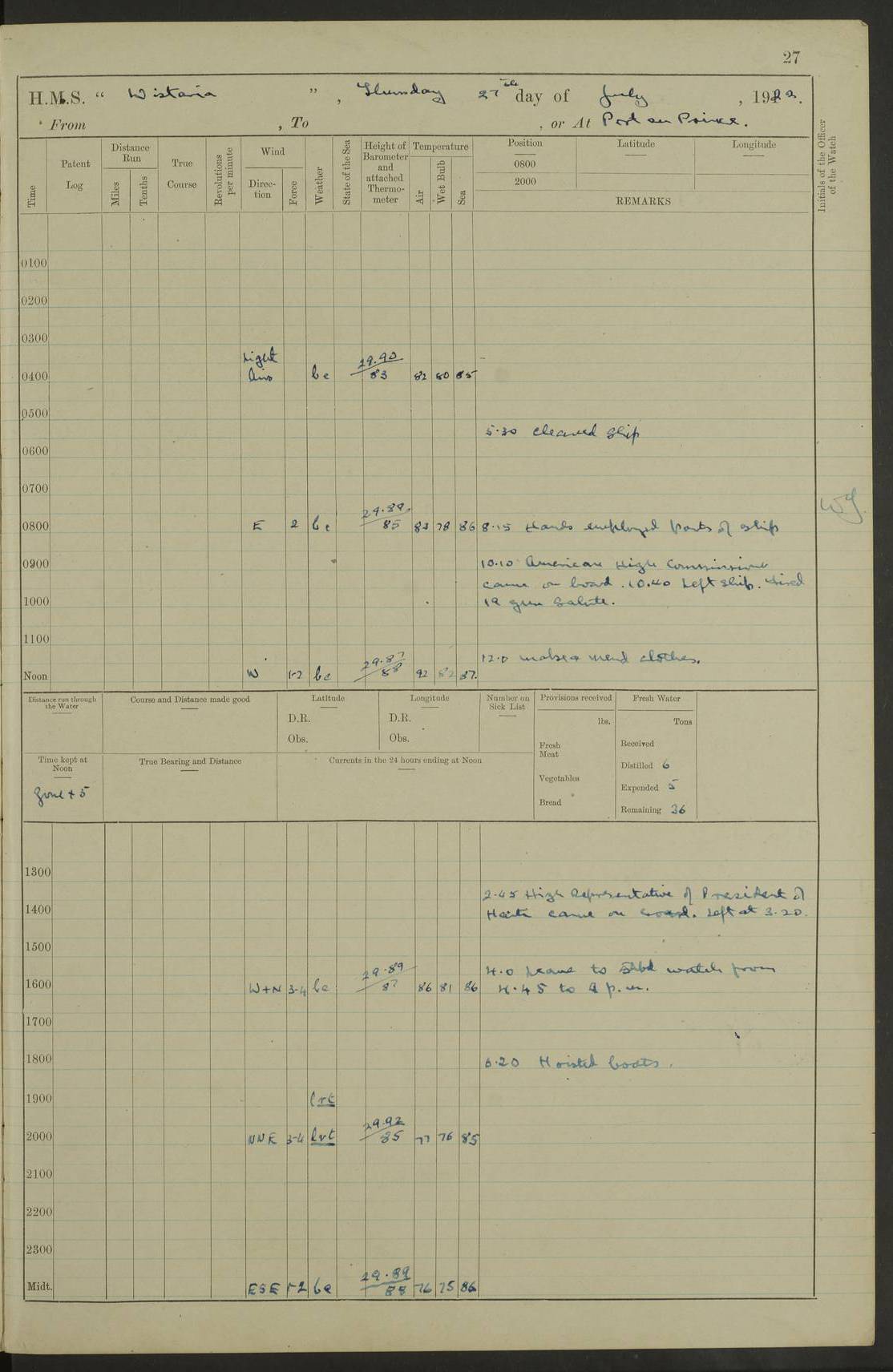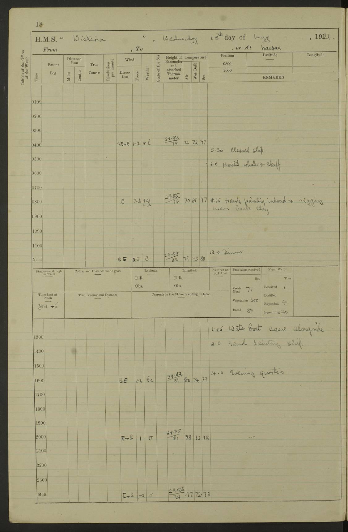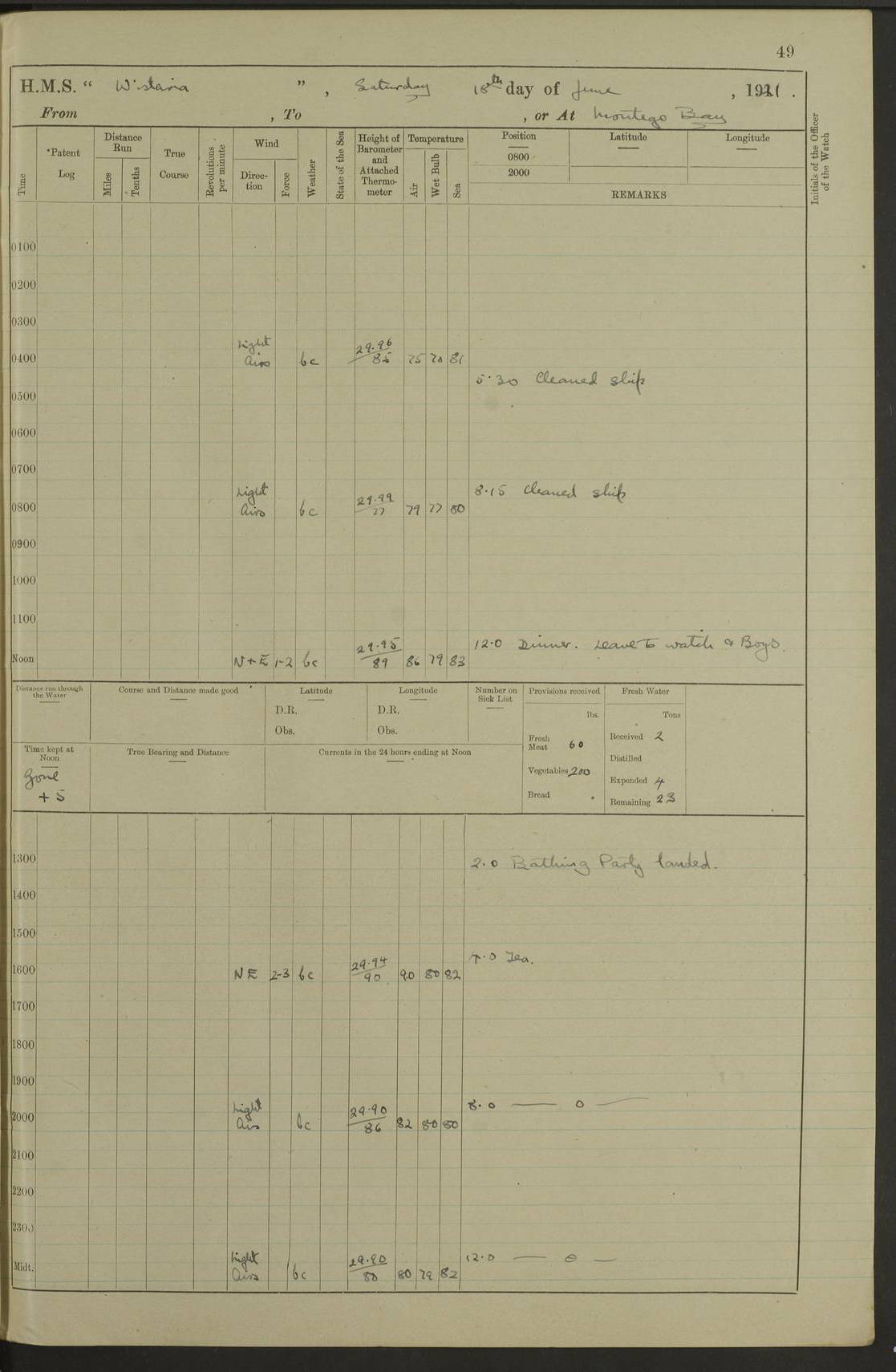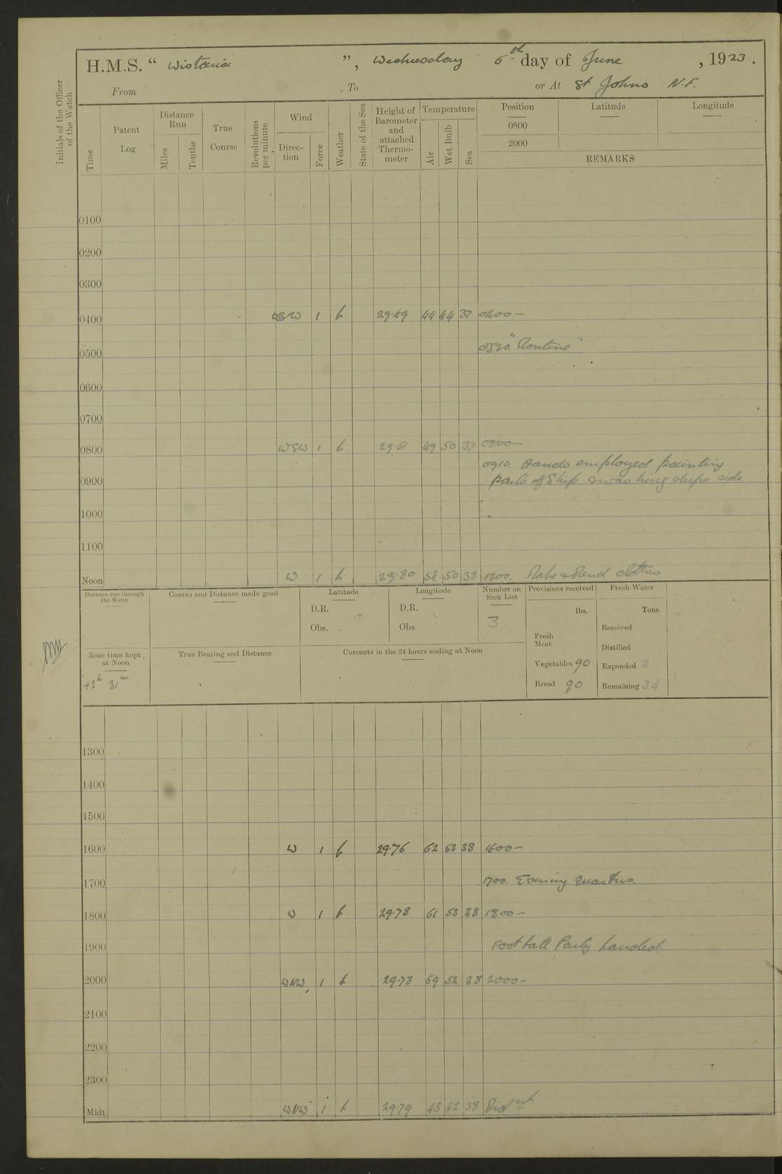 LOGS FOR JULY 1921 4f73ca38a2fc8ea903000a41: (https://s3.amazonaws.com:443/oldweather/ADM53-93262/0003_1.jpg) 1 July 1921 At Port Royal Lat 17.93, Long -76.83 8.15am: 1st whaler diving party. Clear up decks 9.30am: Ord. Seamen & boys muster bags. Remainder part of ship 1.45pm: Hands mustered for monthly payment 2.15pm: Diving party & side party employed. Rest part of ship 4f73ca38a2fc8ea903000a42: (https://s3.amazonaws.com:443/oldweather/ADM53-93262/0004_0.jpg) 2 July 1921 At Port Royal Lat 17.93, Long -76.83 8.15am: Cleaned ship 8.0pm: Concert party landed 8.45pm: Fire party landed 9.45pm: Fire party returned 10.40pm: Fire party landed 4f73ca39a2fc8ea903000a43: (https://s3.amazonaws.com:443/oldweather/ADM53-93262/0004_1.jpg) 3 July 1921 At Port Royal Lat 17.93, Long -76.83 6.30am: Cleaned ship 10.0am: Divisions Number on sick list: 2 4f73ca39a2fc8ea903000a44: (https://s3.amazonaws.com:443/oldweather/ADM53-93262/0005_0.jpg) 4 July 1921 At Port Royal Lat 17.93, Long -76.83 8.15am: Hands employed on boats & part of ship 2.0pm: Embarked 6” projectiles 10.30pm: Left harbour for Morant Cays. Course & speed as requisite 11.20pm: Dumped ammunition Number on sick list: 1 4f73ca39a2fc8ea903000a45: (https://s3.amazonaws.com:443/oldweather/ADM53-93262/0005_1.jpg) 5 July 1921 From Morant Cays-Port Royal to Port Royal-Morant Cays Lat 17.93, Long -76.83 6.20am: Sighted Morant Cays ahead 7.20am: Anchored and landed survey party am: Hands employed part of ship. Relief control parties exercised 10.40am: Weighed & proceeded 2.0pm: Hands employed chipping & painting boat deck & squaring off upper deck 3.10pm: Sighted Plum Point on Starboard bow 4.40pm: Stopped & manoeuvred as required for ship photograph to be taken 5.15pm: Secured alongside waling jetty. Leave to watch 4f73ca3aa2fc8ea903000a46: (https://s3.amazonaws.com:443/oldweather/ADM53-93262/0006_0.jpg) 6 July 1921 At Port Royal Lat 17.93, Long -76.83 9.25am: Hands employed parts of ship and six hands at small arm drill 2.0pm: Hands employed preparing ship for coaling 4.20pm: O.S. III Seabrook rejoined ship from hospital Number on sick list: 2 4f73ca3aa2fc8ea903000a47: (https://s3.amazonaws.com:443/oldweather/ADM53-93262/0006_1.jpg) 7 July 1921 At Port Royal Lat 17.93, Long -76.83 5.30am: Sanded decks 7.0am: Coaled ship with native labour 8.15am: Hands employed cleaning boats 11.20am: Finished coaling. Wash down & scrub upper deck Number on sick list: 4 4f73ca3aa2fc8ea903000a48: (https://s3.amazonaws.com:443/oldweather/ADM53-93262/0007_0.jpg) 8 July 1921 At Port Royal Lat 17.93, Long -76.83 8.15am: Hands employed cleaning paintwork & 3 hands about seine net 1.40pm: Starboard watch employed getting mine sweeping gear inboard 2.0pm: Port watch employed part of ship 3.0pm: Starboard watch employed part of ship 4.0pm: Tea. Ship put in quarantine 5.10pm: Surgeon McCallum left ship for military hospital Number on sick list: 1 [Surgeon McCallum: perhaps Surgeon Archie McCallum] 4f73ca3ba2fc8ea903000a49: (https://s3.amazonaws.com:443/oldweather/ADM53-93262/0007_1.jpg) 9 July 1921 At Port Royal Lat 17.93, Long -76.83 6.45am: Party left for isolation hospital to fumigate gear 11.50am: Air bedding 2.40pm: Bathing party landed 3.30pm: Bathing party returned 5.0pm: All hands vaccinated 4f73ca3ba2fc8ea903000a4a: (https://s3.amazonaws.com:443/oldweather/ADM53-93262/0008_0.jpg) 10 July 1921 At Port Royal Lat 17.93, Long -76.83 am: Parties sent to isolation hospital for fumigation 9.0am: Hands employed clearing mess decks & clearing up decks am: Parties sent for fumigation 1.0pm: All fumigation parties returned 5.15pm: Watch coaled picket boat Number on sick list: 1 4f73ca3ca2fc8ea903000a4b: (https://s3.amazonaws.com:443/oldweather/ADM53-93262/0008_1.jpg) 11 July 1921 From Port Royal to Bermuda and at Port Royal Lat 17.86, Long -76.63 8.15am: Furled forecastle awning 9.25am: Secured ship for sea 10.15am: Left Jetty 11.0am: Streamed patent log 11.01am: Plum Pt bearing N20E. Altered course S71E 3.15pm: Morant Pt bore N7W 3.30pm: Morant Pt bore N73W 6.45pm: Morant Pt bore S69W 9.35pm: Navassa Lt bearing S37E 10.32pm: Navassa Lt abeam 11.30pm: Navassa Lt bearing S24E True Bearing and Distance: Plum Pt Lt 294½°, 90 miles 4f73ca3ca2fc8ea903000a4c: (https://s3.amazonaws.com:443/oldweather/ADM53-93262/0009_0.jpg) 12 July 1921 From Port Royal to Bermuda Lat 20.18, Long -74.01 7.0am: Sighted Cuban mountains on Port bow 8.50am: Furled boat deck awning 9.35am: Exercised control parties, hands employed turning motor boats falls end for end, scarping & painting 2.0pm: Hands employed as forenoon 4.02pm: Sighted Great Inagua Lt Ho N48E 5.15pm: Course as required for re-charging telemotor system 5.38pm: Great Inagua Lt Ho abeam, 7 miles 6.30pm: N.W. Pt abeam, 1 mile True Bearing and Distance: Cape Maysi Lt Ho 299½°, 7¼ miles 4f73ca3ca2fc8ea903000a4d: (https://s3.amazonaws.com:443/oldweather/ADM53-93262/0009_1.jpg) 13 July 1921 From Port Royal to Bermuda Lat 23.13, Long -71.83 9.40am: Hands employed fitting new streaming light halliyards, scraping & cleaning part of ship 2.0pm: Hands employed scraping, painting & redleading parts of ship True Bearing and Distance: Gibbs Hill Lt Ho 034¼°, 672 miles 4f73ca3da2fc8ea903000a4e: (https://s3.amazonaws.com:443/oldweather/ADM53-93262/0010_0.jpg) 14 July 1921 From Port Royal to Bermuda Lat 25.91, Long -69.55 2.10am: Hauled in Patent log to clear it 2.15am: Log streamed 9.0am: Hauled in patent log 9.30am: Hands employed mustering bags & hammocks 2.0pm: Hands scrub hammocks 4.0pm: Evening Quarters. Exercised collision stations 5.0pm: Put clocks on 20 minutes True Bearing and Distance: Gibbs Hill Lt Ho 034°, 452 miles 4f73ca3da2fc8ea903000a4f: (https://s3.amazonaws.com:443/oldweather/ADM53-93262/0010_1.jpg) 15 July 1921 From Port Royal to Bermuda Lat 29.03, Long -67.18 9.40am: Exercised action stations. Fired one belt of ammunition from each pom pom 10.30am: Ord. Sea & boys to school. Pom Pom’s crews working about guns, remainders chip